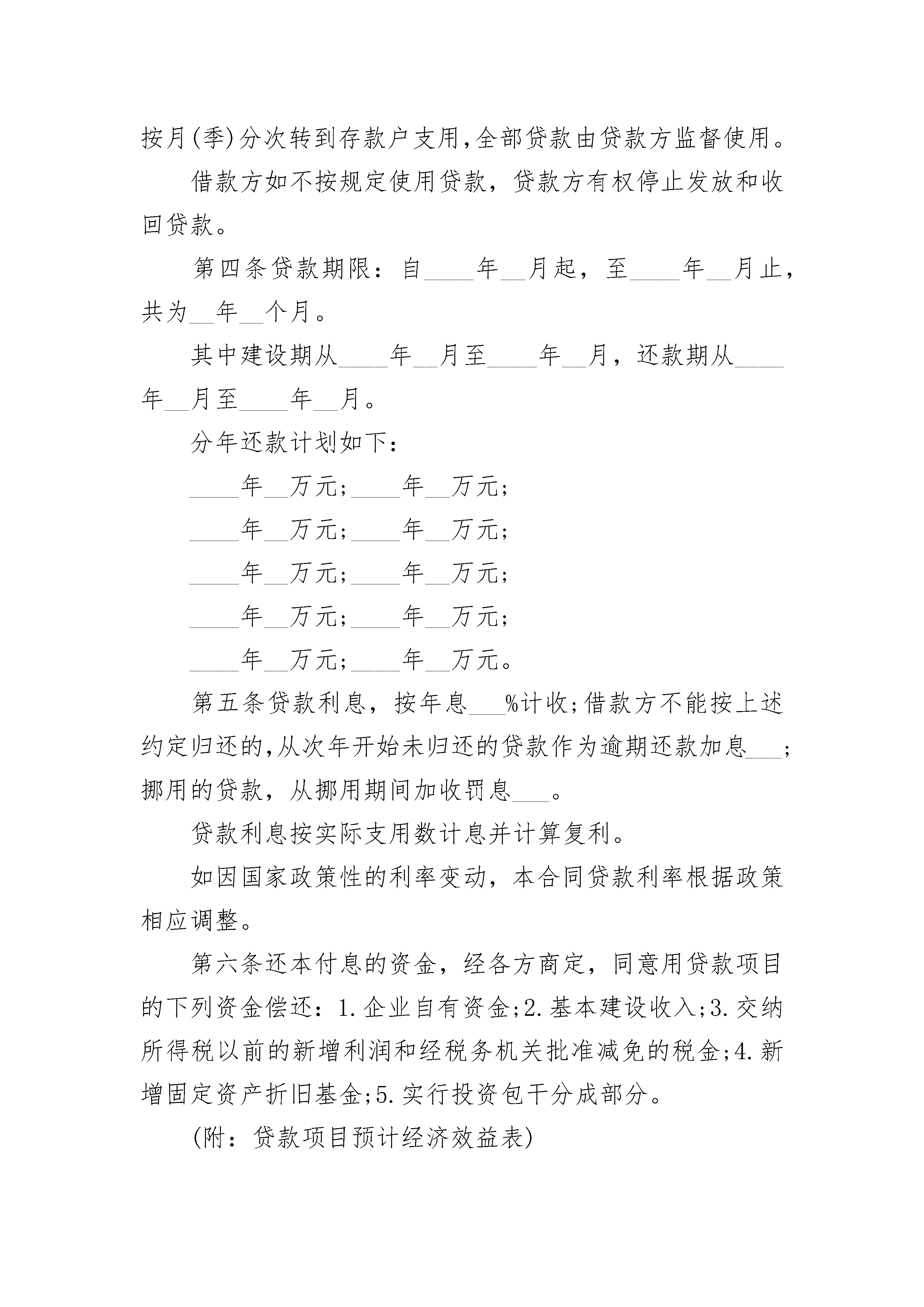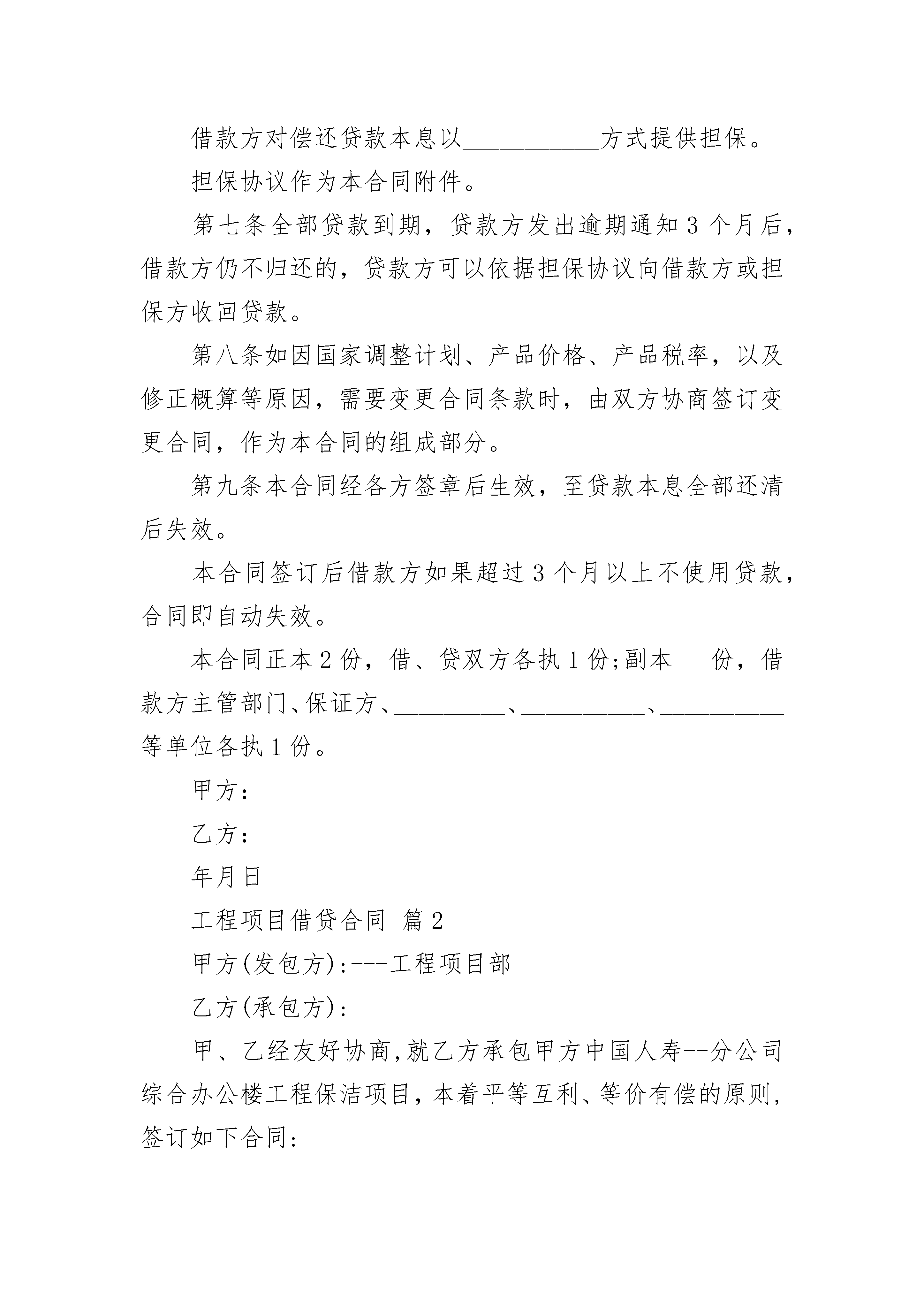 工程项目借贷合同工程项目借贷合同(精选19篇)工程项目借贷合同篇1建设项目_________________________立合同单位:借款方:____________________贷款方中国人民建设银行___________根据___________,经借款方申请,贷款方审查同意发放贷款。为明确各方责任,恪守信用,特签订本合同,共同遵守。第一条借款方向贷款方借人民币(大写)_____万元。用于_______,预计分年用款为:____年__万元;____年__万元;____年__万元;____年__万元;____年__万元;____年__万元;第二条借款方在本合同规定的贷款总额内,根据批准的年度计划和建设进度编制年、季度用款计划,送贷款方审查凭以供应资金。贷款方保证在核定的年度贷款计划内,按基本建设贷款的有关规定及时供应资金。如因贷款方责任,资金供应不及时,应承担由此造成的经济损失。第三条借款方在贷款方开立账户,根据工程情况将贷款按月(季)分次转到存款户支用,全部贷款由贷款方监督使用。借款方如不按规定使用贷款,贷款方有权停止发放和收回贷款。第四条贷款期限:自____年__月起,至____年__月止,共为__年__个月。其中建设期从____年__月至____年__月,还款期从____年__月至____年__月。分年还款计划如下:____年__万元;____年__万元;____年__万元;____年__万元;____年__万元;____年__万元;____年__万元;____年__万元;____年__万元;____年__万元。第五条贷款利息,按年息___%计收;借款方不能按上述约定归还的,从次年开始未归还的贷款作为逾期还款加息___;挪用的贷款,从挪用期间加收罚息___。贷款利息按实际支用数计息并计算复利。如因国家政策性的利率变动,本合同贷款利率根据政策相应调整。第六条还本付息的资金,经各方商定,同意用贷款项目的下列资金偿还:1.企业自有资金;2.基本建设收入;3.交纳所得税以前的新增利润和经税务机关批准减免的税金;4.新增固定资产折旧基金;5.实行投资包干分成部分。(附:贷款项目预计经济效益表)借款方对偿还贷款本息以___________方式提供担保。担保协议作为本合同附件。第七条全部贷款到期,贷款方发出逾期通知3个月后,借款方仍不归还的,贷款方可以依据担保协议向借款方或担保方收回贷款。第八条如因国家调整计划、产品价格、产品税率,以及修正概算等原因,需要变更合同条款时,由双方协商签订变更合同,作为本合同的组成部分。第九条本合同经各方签章后生效,至贷款本息全部还清后失效。本合同签订后借款方如果超过3个月以上不使用贷款,合同即自动失效。本合同正本2份,借、贷双方各执1份;副本___份,借款方主管部门、保证方、_________、__________、__________等单位各执1份。甲方:乙方:年月日工程项目借贷合同篇2甲方(发包方):---工程项目部乙方(承包方):甲、乙经友好协商,就乙方承包甲方中国人寿--分公司综合办公楼工程保洁项目,本着平等互利、等价有偿的原则,签订如下合同:第一条、工程概况1、工程名称:中国人寿--分公司综合办公楼工程室内保洁2、工程地点:--3、承包范围:二至十六楼室内所有清洁面保洁4、承包方式:保洁工具、洗洁剂、人工等由乙方提供。5、本工程先做二楼保洁作为其它楼层样板;自20--年7月20日开工,于当日完工。如果保洁工程按甲方要求按时、按质顺利完成,则其它楼层按甲方的时间要求交给乙方施工。第二条、双方权利及义务(一)甲方权利及义务1、按合同约定向乙方支付保洁服务费。2、全部腾空或部分腾空房屋,清除影响施工的障碍物。3、无偿为乙方提供保洁用水、用电,并说明使用注意事项。3、对乙方保洁质量应及时监督检查,发现质量问题及时要求乙方返工,直至达到质量标准。(二)乙方权利及义务1、认真完成保洁项目,确保工作质量,达到甲方满意。2、乙方派出一名主管负责人负责日常保洁工作质量检查和保洁工作紧急情况的处理,接受甲方主管保洁负责人的监督指导,并按甲方的保洁工作标准进行检查。3、乙方在作业中应严格要求工作人员,爱护建筑物及室内外各种设施,注意节水节电。4、乙方作业应遵守甲方规定的时间要求,如有变更,双方协商解决。5、乙方作业中发生损坏成品及半成品则造价赔偿。6、乙方在作业中做好劳动保护及岗前安全教育措施、严禁出现大小安全事故,听从现场安全员的指挥,若出现安全事故由乙方负全部责任。第三条、工程质量及验收1、乙方做出工程样板,经甲方验收合格后,作为甲方验收标准。2、乙方在工程完工后通知甲方验收,甲方自接到验收通知一日内组织验收,并办理验收手续。如甲方在规定时间内未能组织验收,需及时通知乙方,另定验收日期。但甲方应承认完