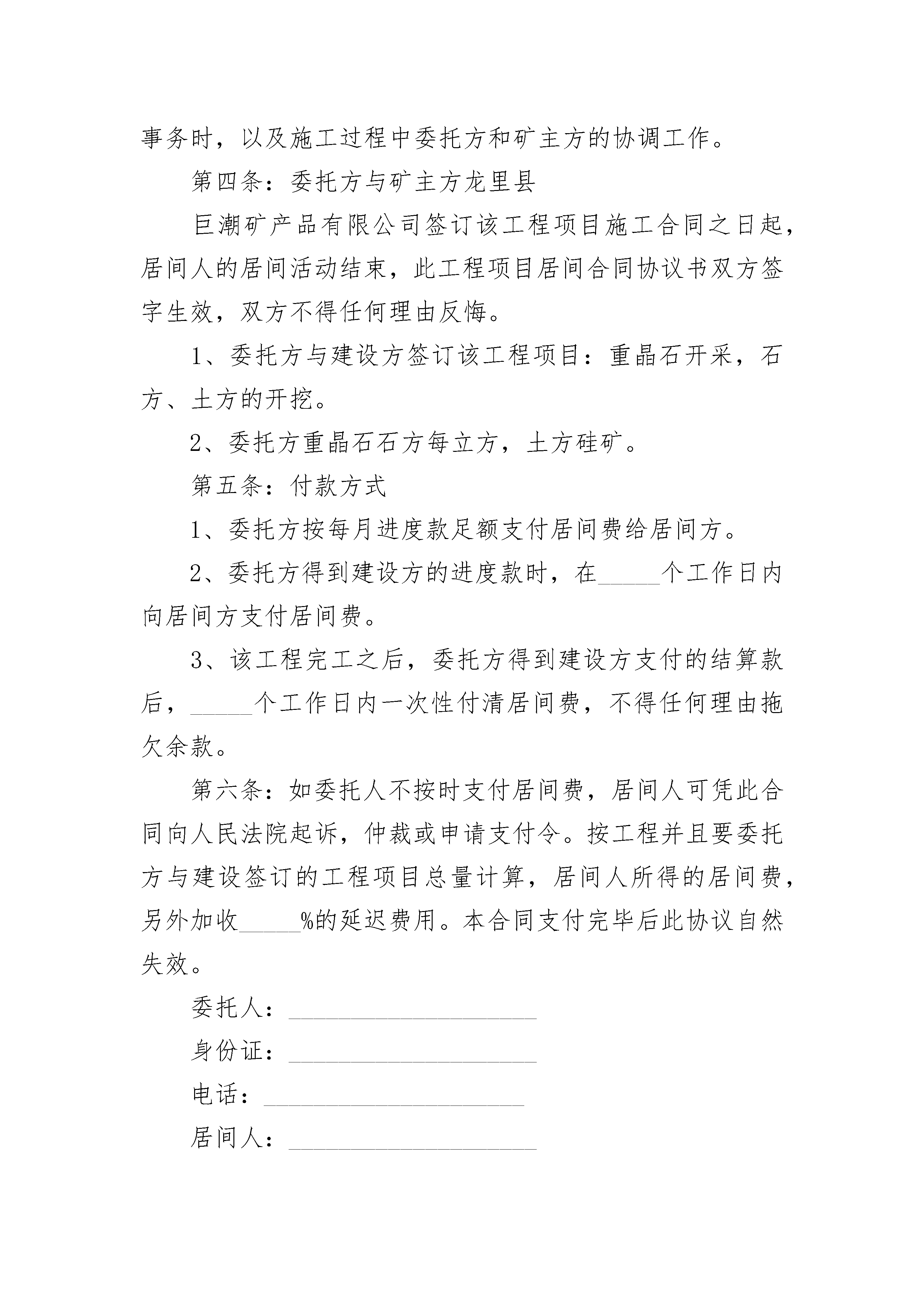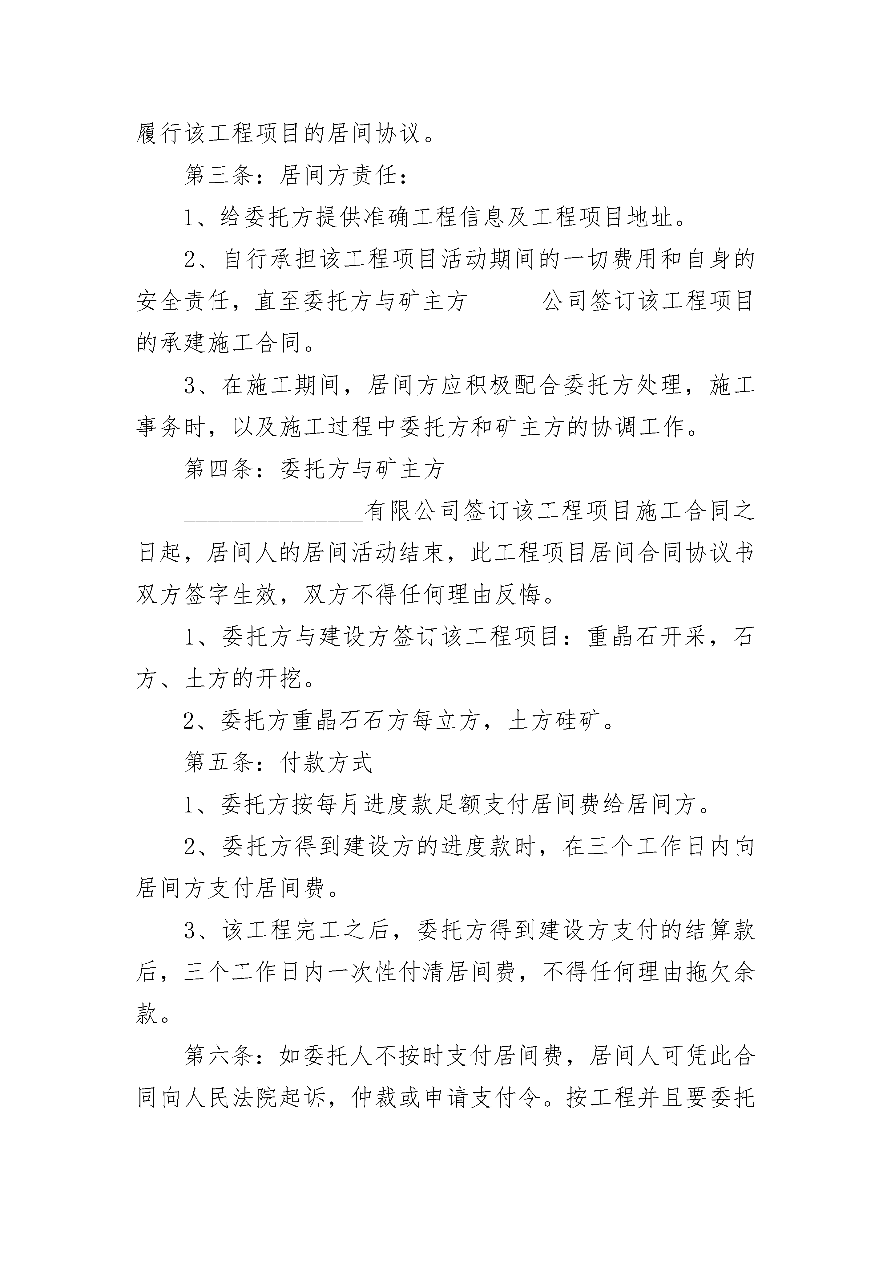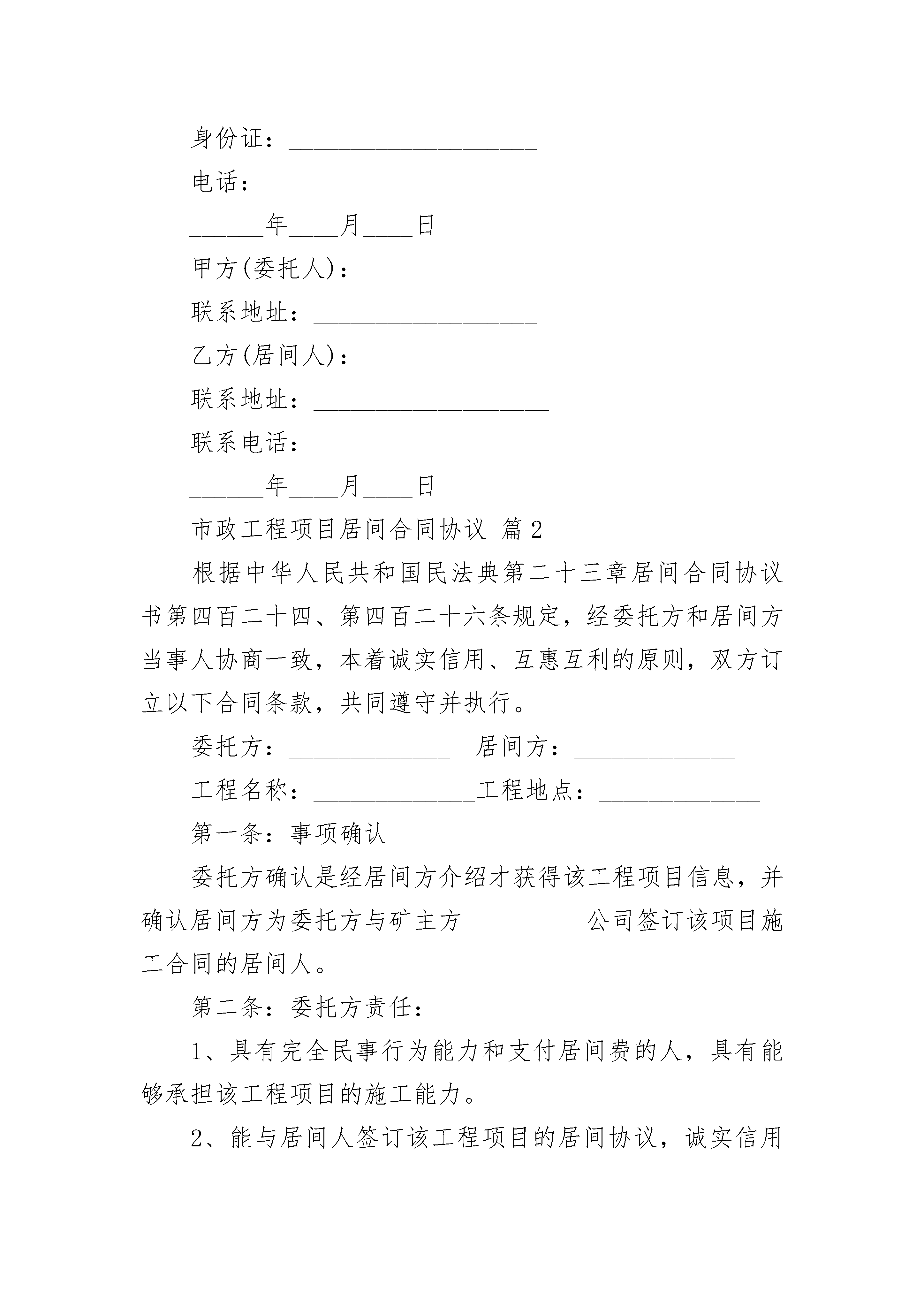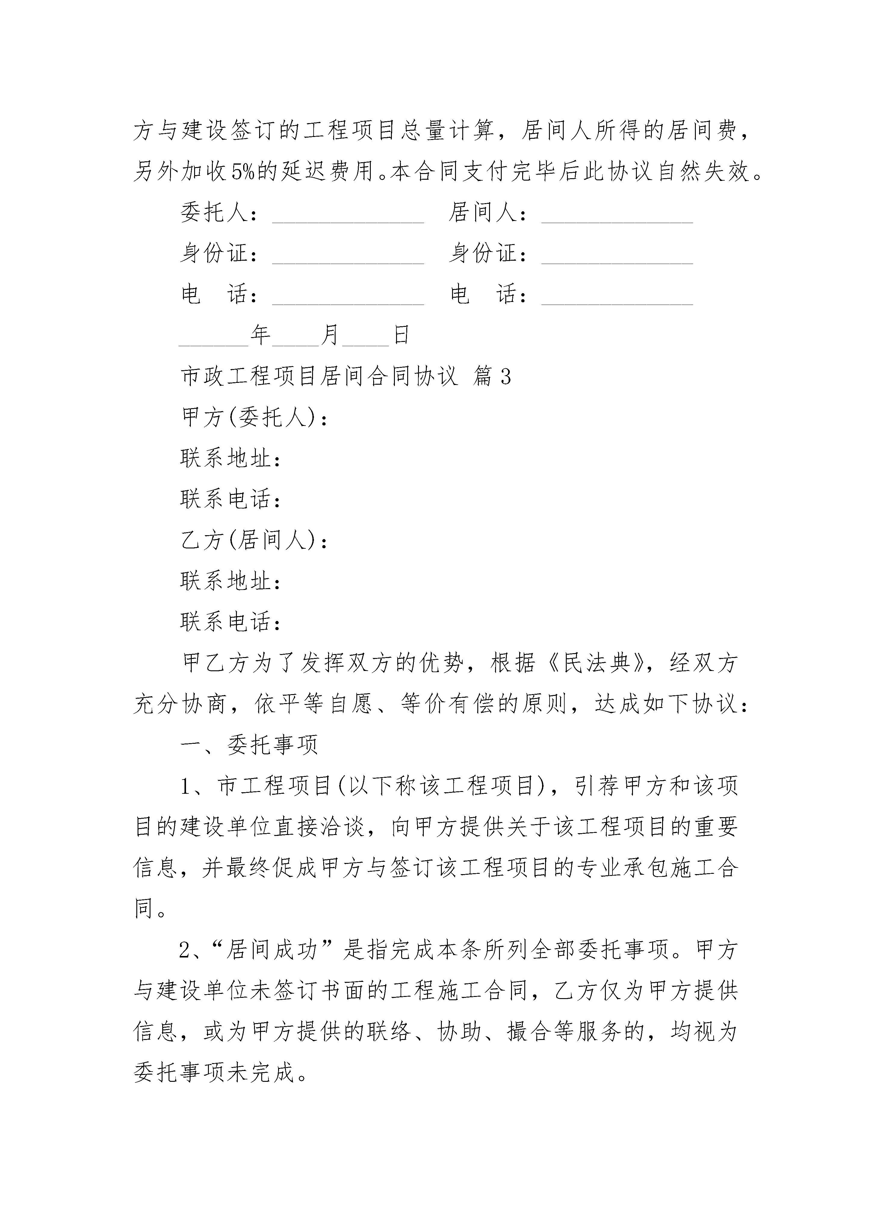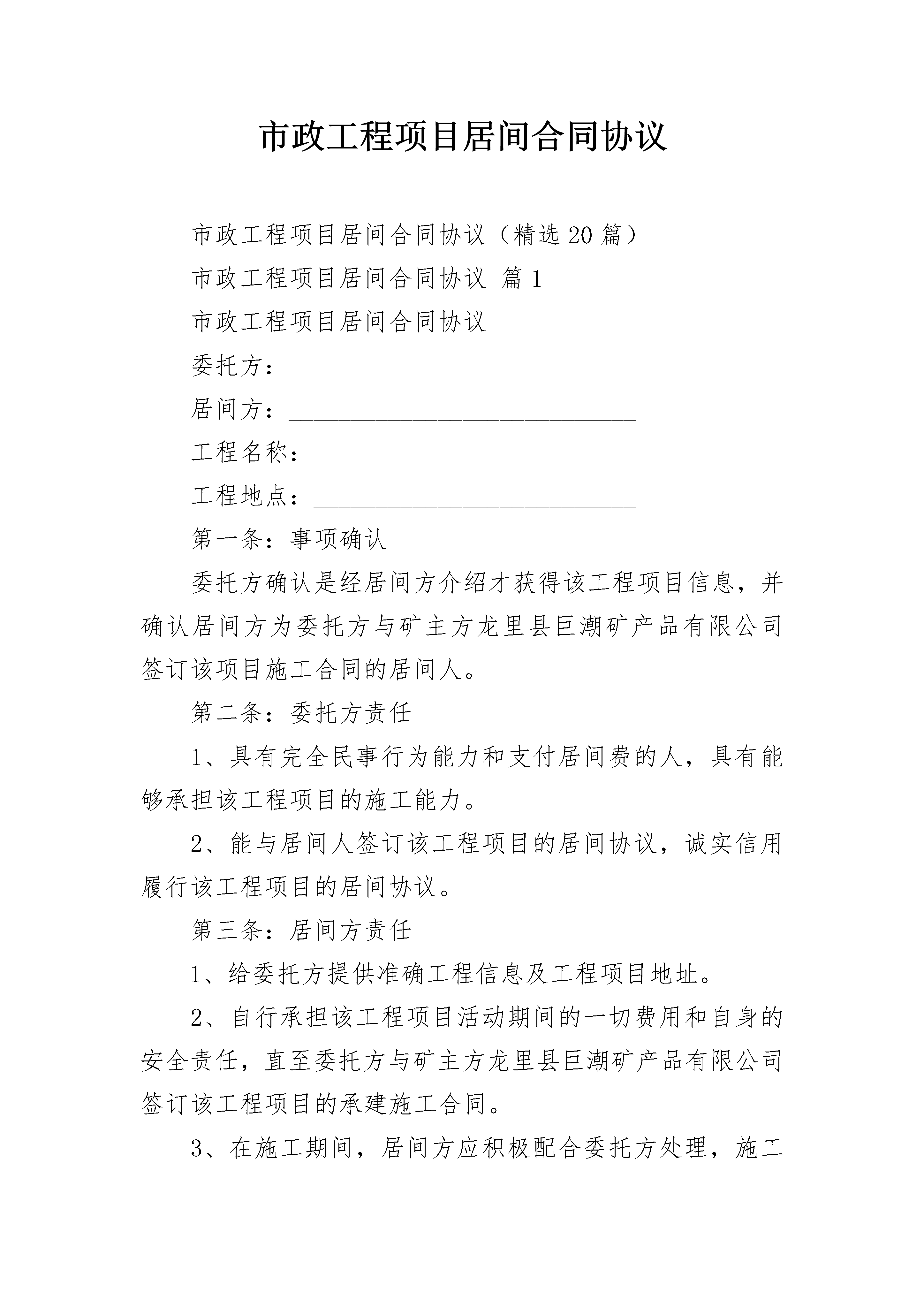 市政工程项目居间合同协议市政工程项目居间合同协议(精选20篇)市政工程项目居间合同协议篇1市政工程项目居间合同协议委托方:____________________________居间方:____________________________工程名称:__________________________工程地点:__________________________第一条:事项确认委托方确认是经居间方介绍才获得该工程项目信息,并确认居间方为委托方与矿主方龙里县巨潮矿产品有限公司签订该项目施工合同的居间人。第二条:委托方责任1、具有完全民事行为能力和支付居间费的人,具有能够承担该工程项目的施工能力。2、能与居间人签订该工程项目的居间协议,诚实信用履行该工程项目的居间协议。第三条:居间方责任1、给委托方提供准确工程信息及工程项目地址。2、自行承担该工程项目活动期间的一切费用和自身的安全责任,直至委托方与矿主方龙里县巨潮矿产品有限公司签订该工程项目的承建施工合同。3、在施工期间,居间方应积极配合委托方处理,施工事务时,以及施工过程中委托方和矿主方的协调工作。第四条:委托方与矿主方龙里县巨潮矿产品有限公司签订该工程项目施工合同之日起,居间人的居间活动结束,此工程项目居间合同协议书双方签字生效,双方不得任何理由反悔。1、委托方与建设方签订该工程项目:重晶石开采,石方、土方的开挖。2、委托方重晶石石方每立方,土方硅矿。第五条:付款方式1、委托方按每月进度款足额支付居间费给居间方。2、委托方得到建设方的进度款时,在_____个工作日内向居间方支付居间费。3、该工程完工之后,委托方得到建设方支付的结算款后,_____个工作日内一次性付清居间费,不得任何理由拖欠余款。第六条:如委托人不按时支付居间费,居间人可凭此合同向人民法院起诉,仲裁或申请支付令。按工程并且要委托方与建设签订的工程项目总量计算,居间人所得的居间费,另外加收_____%的延迟费用。本合同支付完毕后此协议自然失效。委托人:____________________身份证:____________________电话:_____________________居间人:____________________身份证:____________________电话:___________________________年____月____日甲方(委托人):_______________联系地址:__________________乙方(居间人):_______________联系地址:___________________联系电话:_________________________年____月____日市政工程项目居间合同协议篇2根据中华人民共和国民法典第二十三章居间合同协议书第四百二十四、第四百二十六条规定,经委托方和居间方当事人协商一致,本着诚实信用、互惠互利的原则,双方订立以下合同条款,共同遵守并执行。委托方:_____________居间方:_____________工程名称:_____________工程地点:_____________第一条:事项确认委托方确认是经居间方介绍才获得该工程项目信息,并确认居间方为委托方与矿主方__________公司签订该项目施工合同的居间人。第二条:委托方责任:1、具有完全民事行为能力和支付居间费的人,具有能够承担该工程项目的施工能力。2、能与居间人签订该工程项目的居间协议,诚实信用履行该工程项目的居间协议。第三条:居间方责任:1、给委托方提供准确工程信息及工程项目地址。2、自行承担该工程项目活动期间的一切费用和自身的安全责任,直至委托方与矿主方______公司签订该工程项目的承建施工合同。3、在施工期间,居间方应积极配合委托方处理,施工事务时,以及施工过程中委托方和矿主方的协调工作。第四条:委托方与矿主方_______________有限公司签订该工程项目施工合同之日起,居间人的居间活动结束,此工程项目居间合同协议书双方签字生效,双方不得任何理由反悔。1、委托方与建设方签订该工程项目:重晶石开采,石方、土方的开挖。2、委托方重晶石石方每立方,土方硅矿。第五条:付款方式1、委托方按每月进度款足额支付居间费给居间方。2、委托方得到建设方的进度款时,在三个工作日内向居间方支付居间费。3、该工程完工之后,委托方得到建设方支付的结算款后,三个工作日内一次性付清居间费,不得任何理由拖欠余款。第六条:如委托人不按时支付居间费,居间人可凭此合同向人民法院起诉,仲裁或申请支付令。按工程并且要委托方与建设签订的工程项目总量计算,居间人所得的居间费,另外加收5%的延迟费用。本合同支付完毕后此协议自然失效。委托人:_____________居间人:_______