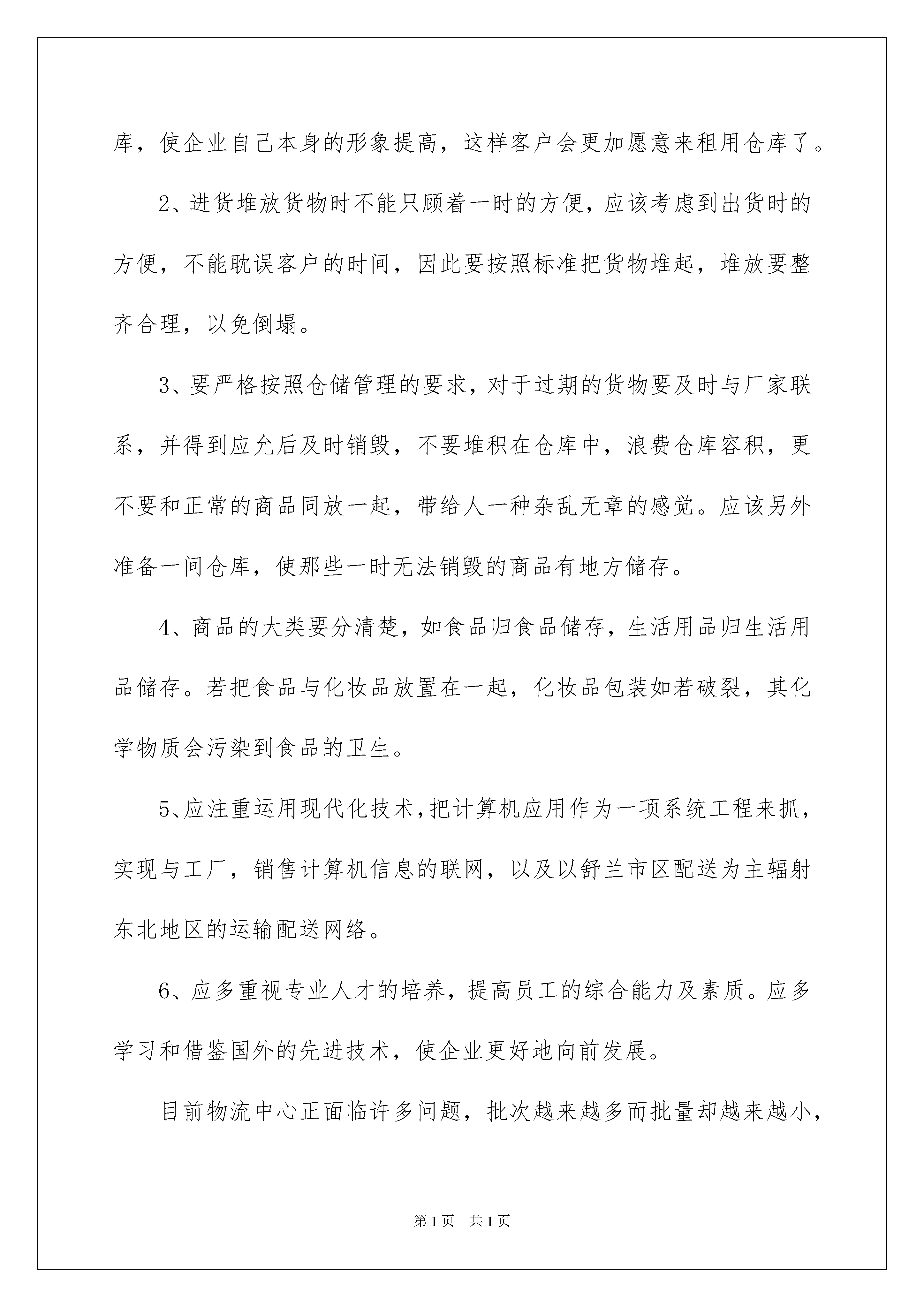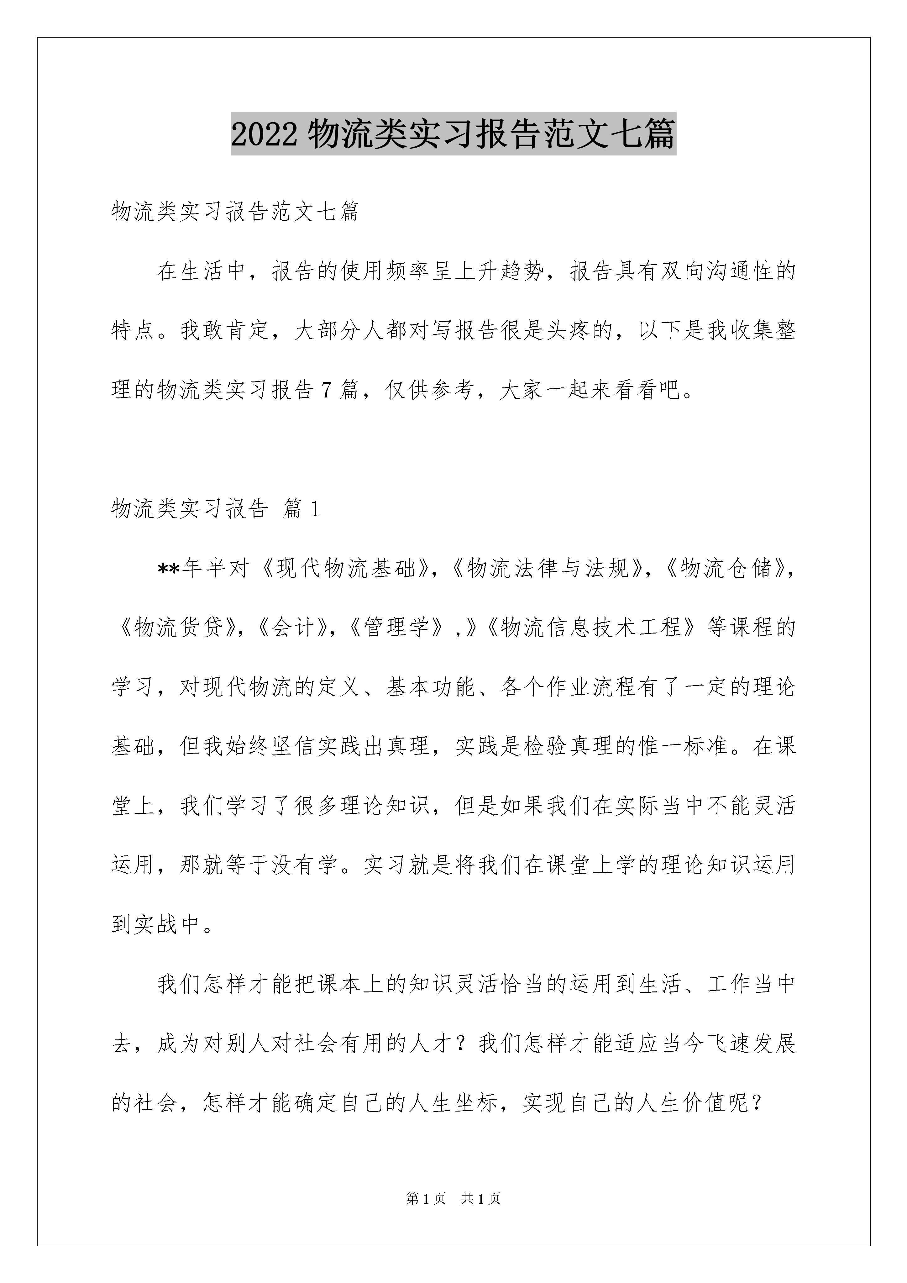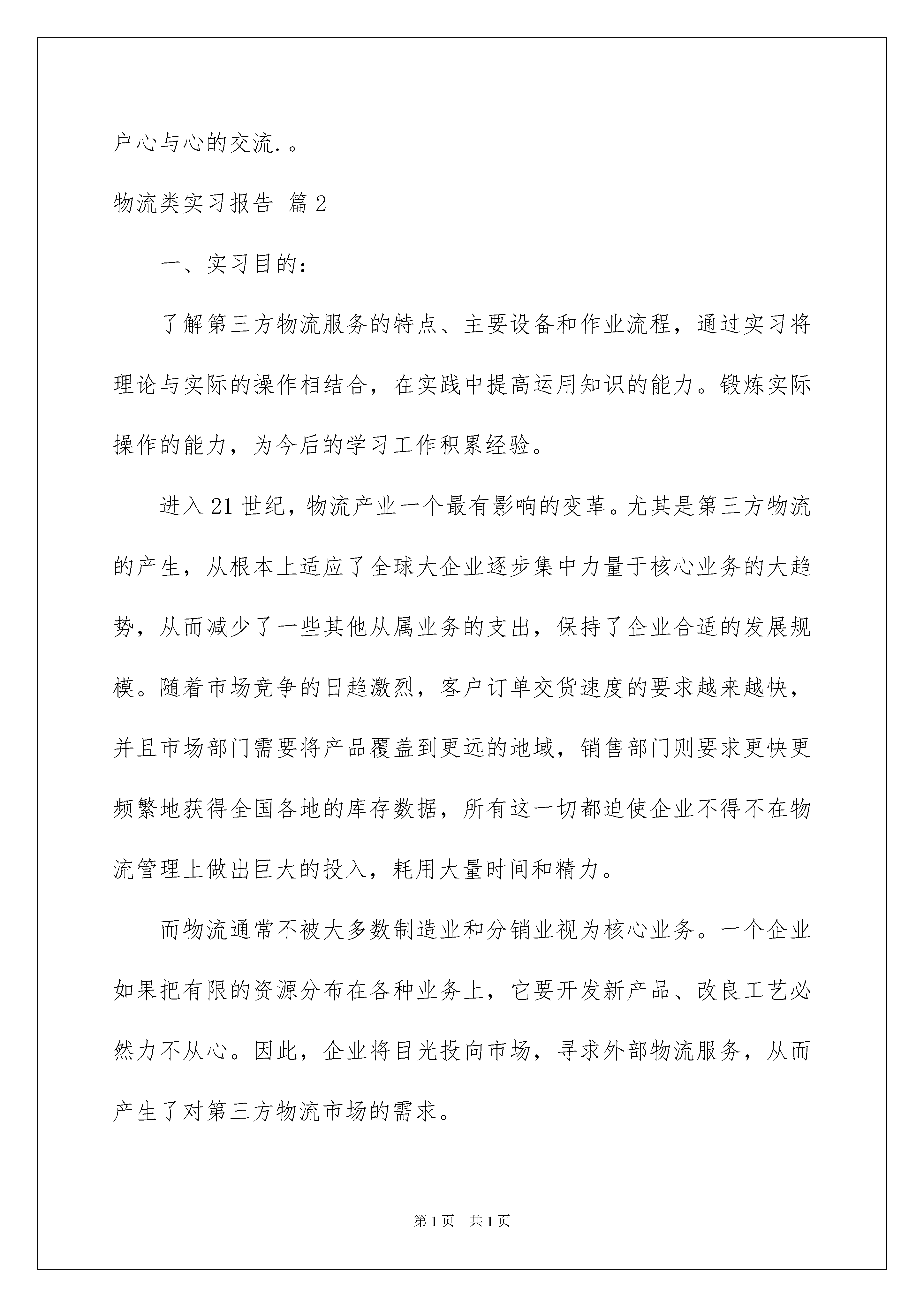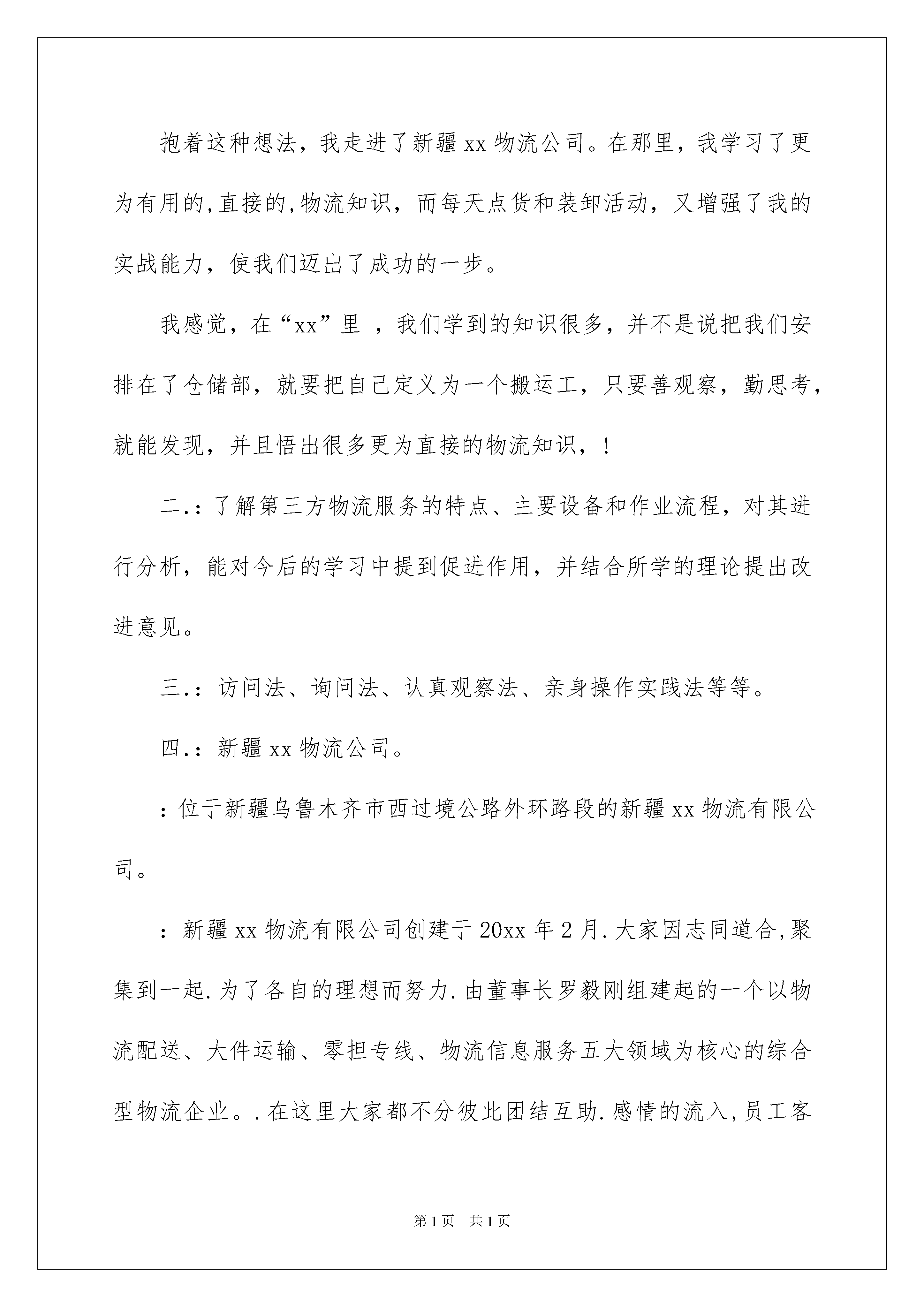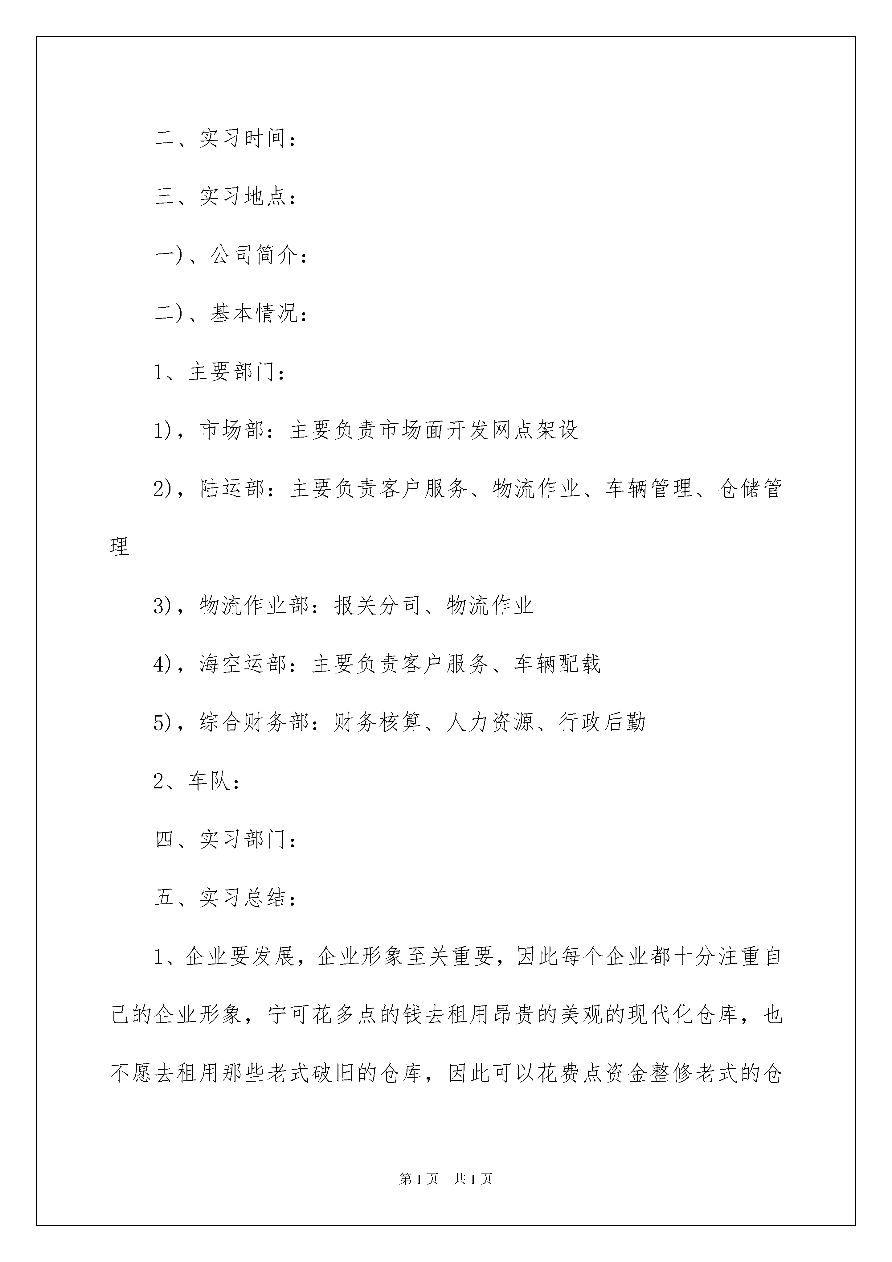 2022物流类实习报告范文七篇物流类实习报告范文七篇在生活中,报告的使用频率呈上升趋势,报告具有双向沟通性的特点。我敢肯定,大部分人都对写报告很是头疼的,以下是我收集整理的物流类实习报告7篇,仅供参考,大家一起来看看吧。物流类实习报告篇1**年半对《现代物流基础》,《物流法律与法规》,《物流仓储》,《物流货贷》,《会计》,《管理学》,》《物流信息技术工程》等课程的学习,对现代物流的定义、基本功能、各个作业流程有了一定的理论基础,但我始终坚信实践出真理,实践是检验真理的惟一标准。在课堂上,我们学习了很多理论知识,但是如果我们在实际当中不能灵活运用,那就等于没有学。实习就是将我们在课堂上学的理论知识运用到实战中。我们怎样才能把课本上的知识灵活恰当的运用到生活、工作当中去,成为对别人对社会有用的人才?我们怎样才能适应当今飞速发展的社会,怎样才能确定自己的人生坐标,实现自己的人生价值呢?抱着这种想法,我走进了新疆xx物流公司。在那里,我学习了更为有用的,直接的,物流知识,而每天点货和装卸活动,又增强了我的实战能力,使我们迈出了成功的一步。我感觉,在“xx”里,我们学到的知识很多,并不是说把我们安排在了仓储部,就要把自己定义为一个搬运工,只要善观察,勤思考,就能发现,并且悟出很多更为直接的物流知识,!二.:了解第三方物流服务的特点、主要设备和作业流程,对其进行分析,能对今后的学习中提到促进作用,并结合所学的理论提出改进意见。三.:访问法、询问法、认真观察法、亲身操作实践法等等。四.:新疆xx物流公司。:位于新疆乌鲁木齐市西过境公路外环路段的新疆xx物流有限公司。:新疆xx物流有限公司创建于20xx年2月.大家因志同道合,聚集到一起.为了各自的理想而努力.由董事长罗毅刚组建起的一个以物流配送、大件运输、零担专线、物流信息服务五大领域为核心的综合型物流企业。.在这里大家都不分彼此团结互助.感情的流入,员工客户心与心的交流.。物流类实习报告篇2一、实习目的:了解第三方物流服务的特点、主要设备和作业流程,通过实习将理论与实际的操作相结合,在实践中提高运用知识的能力。锻炼实际操作的能力,为今后的学习工作积累经验。进入21世纪,物流产业一个最有影响的变革。尤其是第三方物流的产生,从根本上适应了全球大企业逐步集中力量于核心业务的大趋势,从而减少了一些其他从属业务的支出,保持了企业合适的发展规模。随着市场竞争的日趋激烈,客户订单交货速度的要求越来越快,并且市场部门需要将产品覆盖到更远的地域,销售部门则要求更快更频繁地获得全国各地的库存数据,所有这一切都迫使企业不得不在物流管理上做出巨大的投入,耗用大量时间和精力。而物流通常不被大多数制造业和分销业视为核心业务。一个企业如果把有限的资源分布在各种业务上,它要开发新产品、改良工艺必然力不从心。因此,企业将目光投向市场,寻求外部物流服务,从而产生了对第三方物流市场的需求。二、实习时间:三、实习地点:一)、公司简介:二)、基本情况:1、主要部门:1),市场部:主要负责市场面开发网点架设2),陆运部:主要负责客户服务、物流作业、车辆管理、仓储管理3),物流作业部:报关分司、物流作业4),海空运部:主要负责客户服务、车辆配载5),综合财务部:财务核算、人力资源、行政后勤2、车队:四、实习部门:五、实习总结:1、企业要发展,企业形象至关重要,因此每个企业都十分注重自己的企业形象,宁可花多点的钱去租用昂贵的美观的现代化仓库,也不愿去租用那些老式破旧的仓库,因此可以花费点资金整修老式的仓库,使企业自己本身的形象提高,这样客户会更加愿意来租用仓库了。2、进货堆放货物时不能只顾着一时的方便,应该考虑到出货时的方便,不能耽误客户的时间,因此要按照标准把货物堆起,堆放要整齐合理,以免倒塌。3、要严格按照仓储管理的要求,对于过期的货物要及时与厂家联系,并得到应允后及时销毁,不要堆积在仓库中,浪费仓库容积,更不要和正常的商品同放一起,带给人一种杂乱无章的感觉。应该另外准备一间仓库,使那些一时无法销毁的商品有地方储存。4、商品的大类要分清楚,如食品归食品储存,生活用品归生活用品储存。若把食品与化妆品放置在一起,化妆品包装如若破裂,其化学物质会污染到食品的卫生。5、应注重运用现代化技术,把计算机应用作为一项系统工程来抓,实现与工厂,销售计算机信息的联网,以及以舒兰市区配送为主辐射东北地区的运输配送网络。6、应多重视专业人才的培养,提高员工的综合能力及素质。应多学习和借鉴国外的先进技术,使企业更好地向前发展。目前物流中心正面临许多问题,批次越来越多而批量却越来越小,造成物流管理上的一