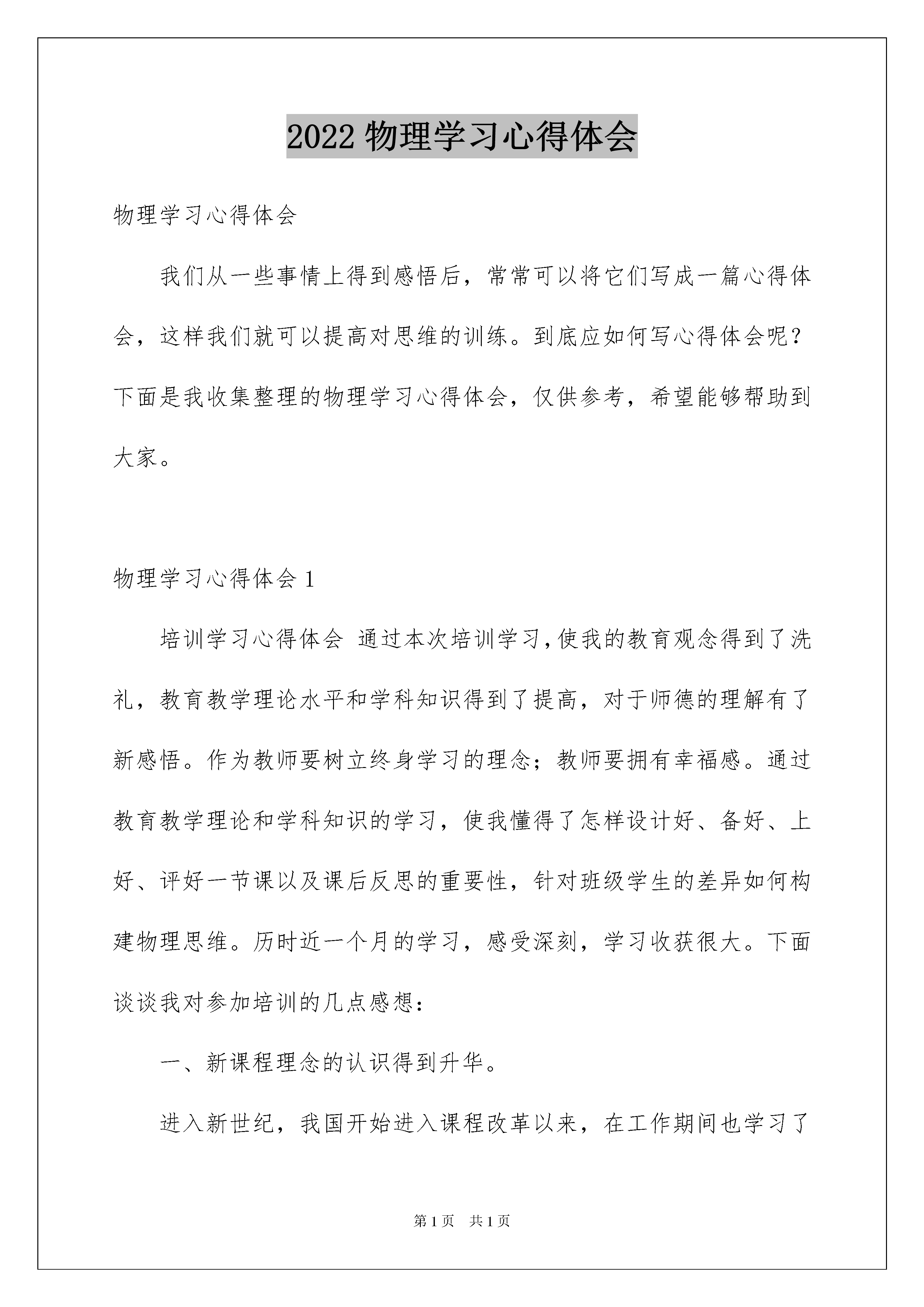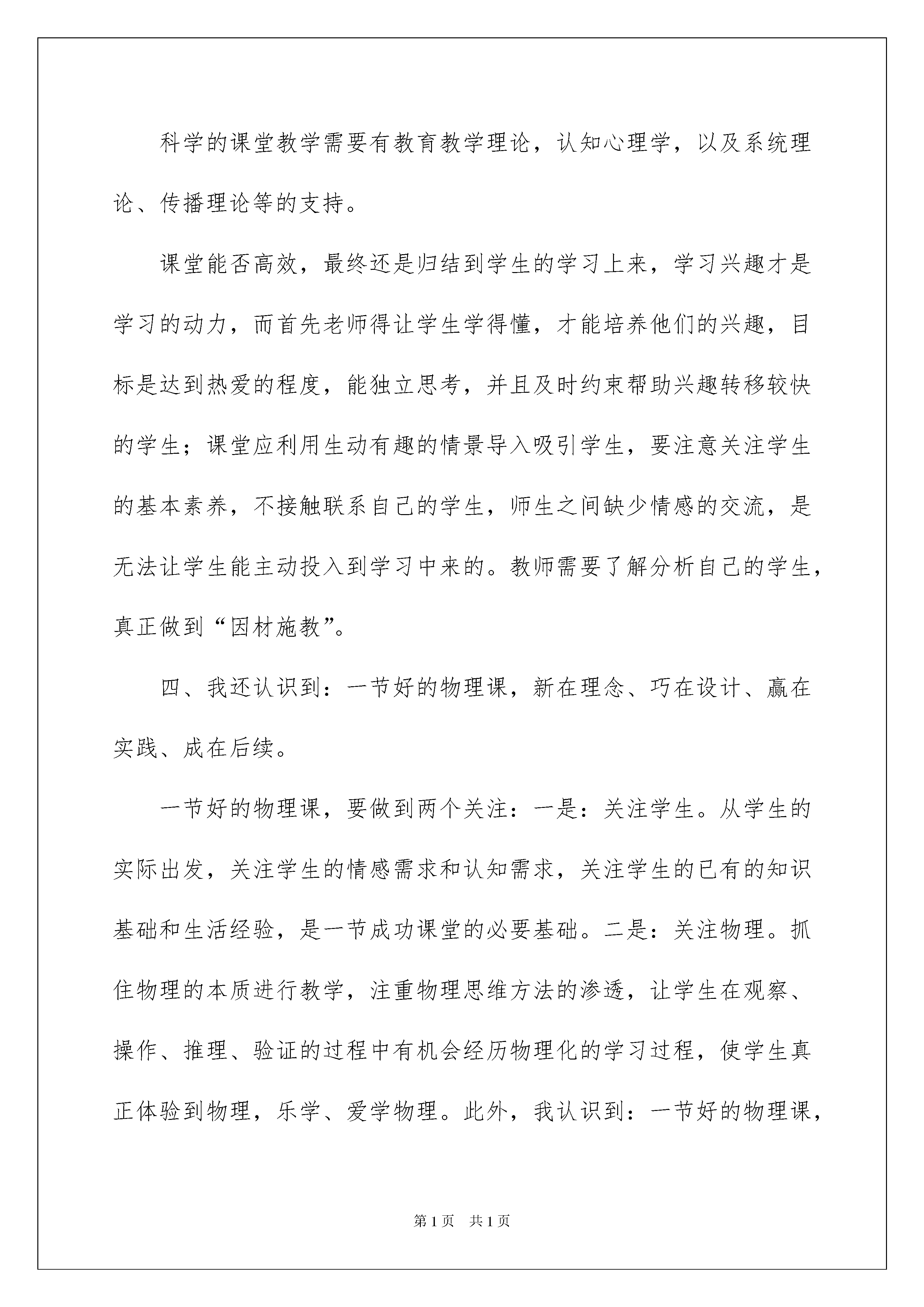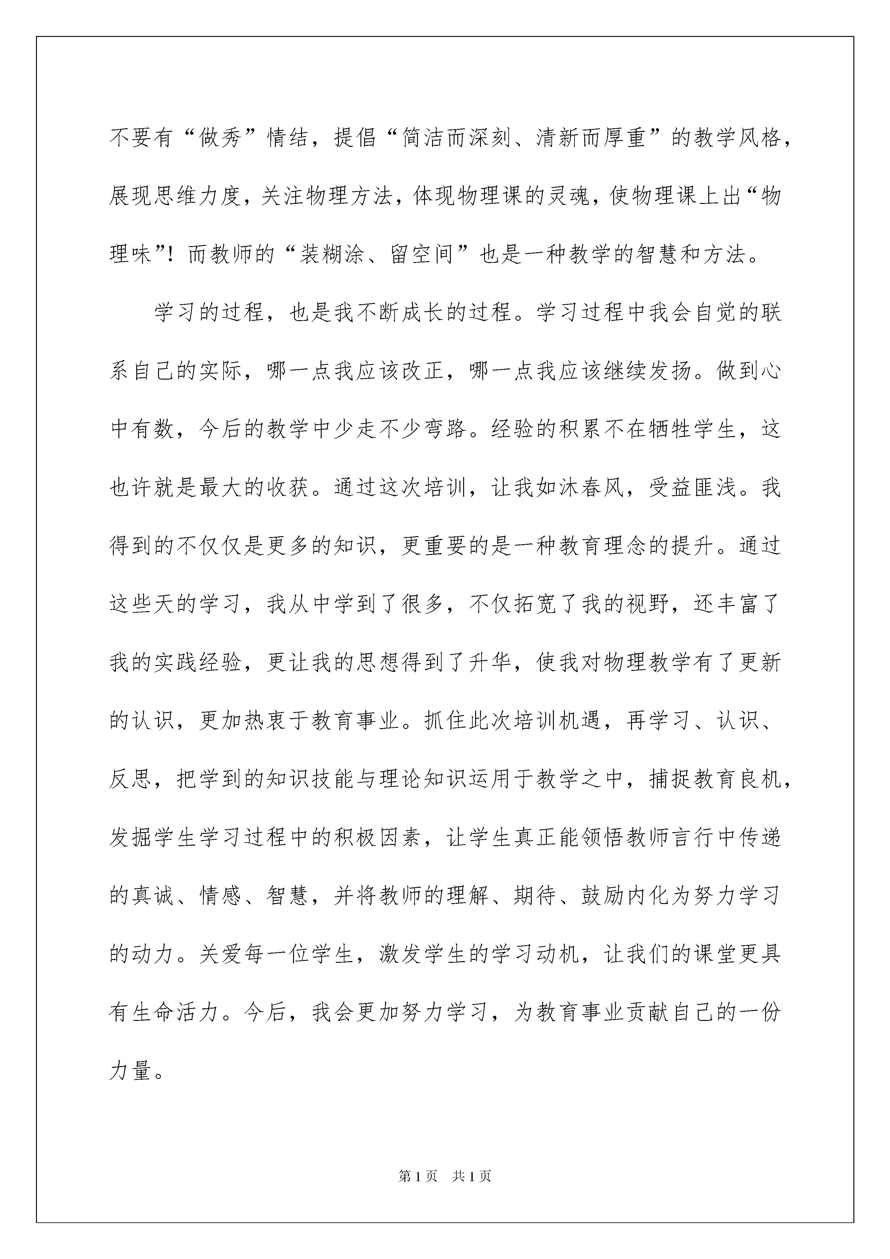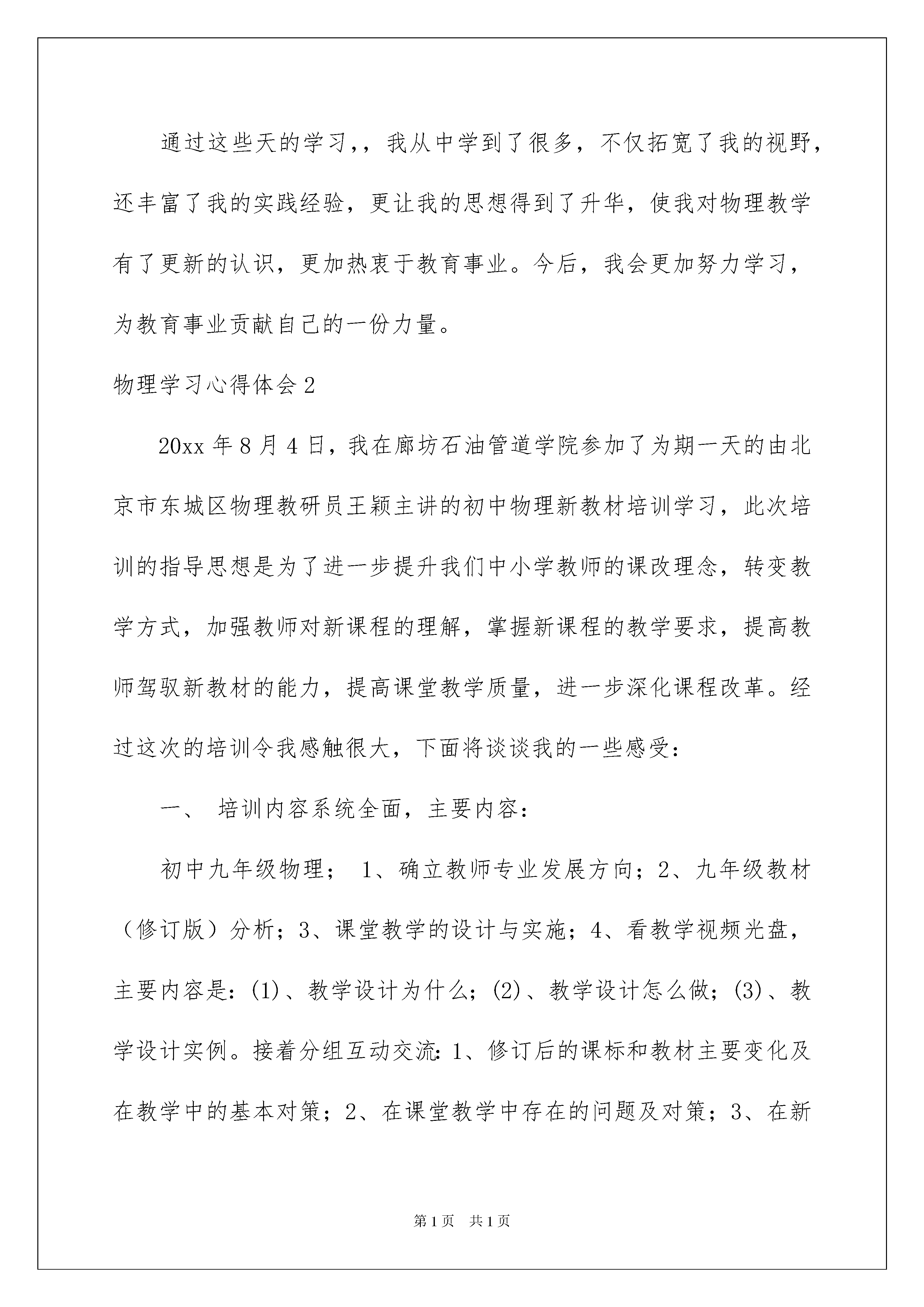 2022物理学习心得体会物理学习心得体会我们从一些事情上得到感悟后,常常可以将它们写成一篇心得体会,这样我们就可以提高对思维的训练。到底应如何写心得体会呢?下面是我收集整理的物理学习心得体会,仅供参考,希望能够帮助到大家。物理学习心得体会1培训学习心得体会通过本次培训学习,使我的教育观念得到了洗礼,教育教学理论水平和学科知识得到了提高,对于师德的理解有了新感悟。作为教师要树立终身学习的理念;教师要拥有幸福感。通过教育教学理论和学科知识的学习,使我懂得了怎样设计好、备好、上好、评好一节课以及课后反思的重要性,针对班级学生的差异如何构建物理思维。历时近一个月的学习,感受深刻,学习收获很大。下面谈谈我对参加培训的几点感想:一、新课程理念的认识得到升华。进入新世纪,我国开始进入课程改革以来,在工作期间也学习了许多新课程的理论知识。学习期间,有幸聆听了教育部教育发展研究中心主任张力的讲座,对深化教育改革的认识得到了进一步的升华。课程是关注我们实施教育教学中“教什么?”的问题,教学内容大于教材内容,我们通用的教材只不过是教学内容的一个重要组成部分而已,不是唯一的。教学内容还应该包括学生学习习惯的培养,学习方法的指导,特别是学生不良行为的矫正等等。作为教育实施者的教师,自身认知素养、教育能力也是隐形的课程资源,这一点对我感触很深,也正是我们往日教学中所忽视的问题。二、教育学生,从爱出发。平等的爱,理解的爱,尊重的爱,信任的爱,这些都是老师爱的真谛。不论在生活上,还是在学习上,都要给予学生必要的关心和帮助。只要有了问题时及时处理,处理的方法得当,注意和学生沟通,学生就会信任你,喜欢你。爱学生,还表现在老师对学生的尊重和信任,以及对学生的严格要求,又要注意对学生的个体差异,区别对待。对成绩比较差的学生,我们老师要采用不同的教育方法,因材施教。师爱要全面、公平。三、高效课堂的认识。科学的课堂教学需要有教育教学理论,认知心理学,以及系统理论、传播理论等的支持。课堂能否高效,最终还是归结到学生的学习上来,学习兴趣才是学习的动力,而首先老师得让学生学得懂,才能培养他们的兴趣,目标是达到热爱的程度,能独立思考,并且及时约束帮助兴趣转移较快的学生;课堂应利用生动有趣的情景导入吸引学生,要注意关注学生的基本素养,不接触联系自己的学生,师生之间缺少情感的交流,是无法让学生能主动投入到学习中来的。教师需要了解分析自己的学生,真正做到“因材施教”。四、我还认识到:一节好的物理课,新在理念、巧在设计、赢在实践、成在后续。一节好的物理课,要做到两个关注:一是:关注学生。从学生的实际出发,关注学生的情感需求和认知需求,关注学生的已有的知识基础和生活经验,是一节成功课堂的必要基础。二是:关注物理。抓住物理的本质进行教学,注重物理思维方法的渗透,让学生在观察、操作、推理、验证的过程中有机会经历物理化的学习过程,使学生真正体验到物理,乐学、爱学物理。此外,我认识到:一节好的物理课,不要有“做秀”情结,提倡“简洁而深刻、清新而厚重”的教学风格,展现思维力度,关注物理方法,体现物理课的灵魂,使物理课上出“物理味”!而教师的“装糊涂、留空间”也是一种教学的智慧和方法。学习的过程,也是我不断成长的过程。学习过程中我会自觉的联系自己的实际,哪一点我应该改正,哪一点我应该继续发扬。做到心中有数,今后的教学中少走不少弯路。经验的积累不在牺牲学生,这也许就是最大的收获。通过这次培训,让我如沐春风,受益匪浅。我得到的不仅仅是更多的知识,更重要的是一种教育理念的提升。通过这些天的学习,我从中学到了很多,不仅拓宽了我的视野,还丰富了我的实践经验,更让我的思想得到了升华,使我对物理教学有了更新的认识,更加热衷于教育事业。抓住此次培训机遇,再学习、认识、反思,把学到的知识技能与理论知识运用于教学之中,捕捉教育良机,发掘学生学习过程中的积极因素,让学生真正能领悟教师言行中传递的真诚、情感、智慧,并将教师的理解、期待、鼓励内化为努力学习的动力。关爱每一位学生,激发学生的学习动机,让我们的课堂更具有生命活力。今后,我会更加努力学习,为教育事业贡献自己的一份力量。通过这些天的学习,,我从中学到了很多,不仅拓宽了我的视野,还丰富了我的实践经验,更让我的思想得到了升华,使我对物理教学有了更新的认识,更加热衷于教育事业。今后,我会更加努力学习,为教育事业贡献自己的一份力量。物理学习心得体会220xx年8月4日,我在廊坊石油管道学院参加了为期一天的由北京市东城区物理教研员王颖主讲的初中物理新教材培训学习,此次培训的指导思想是为了进一步提升我们中小学教师的课改理念
