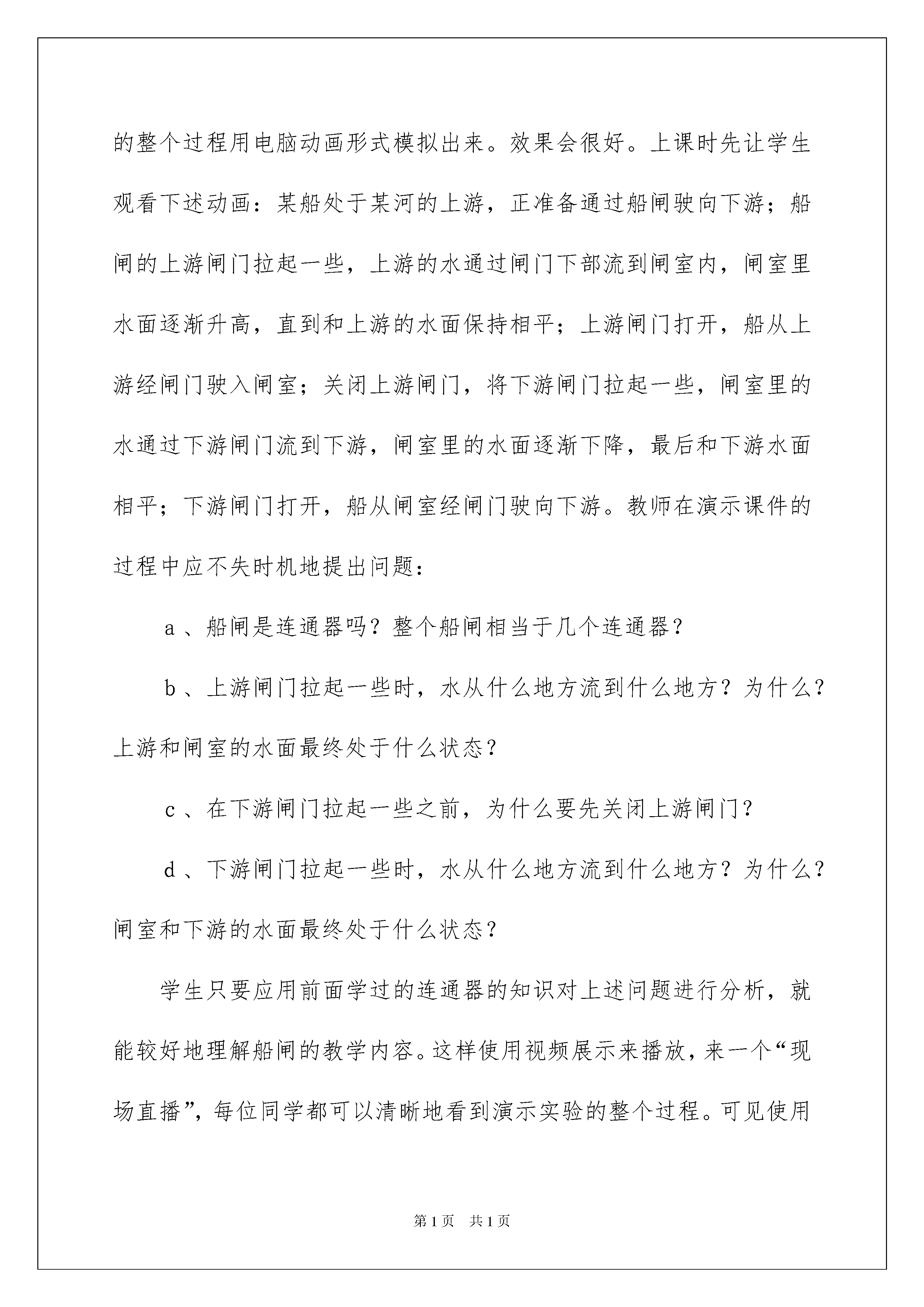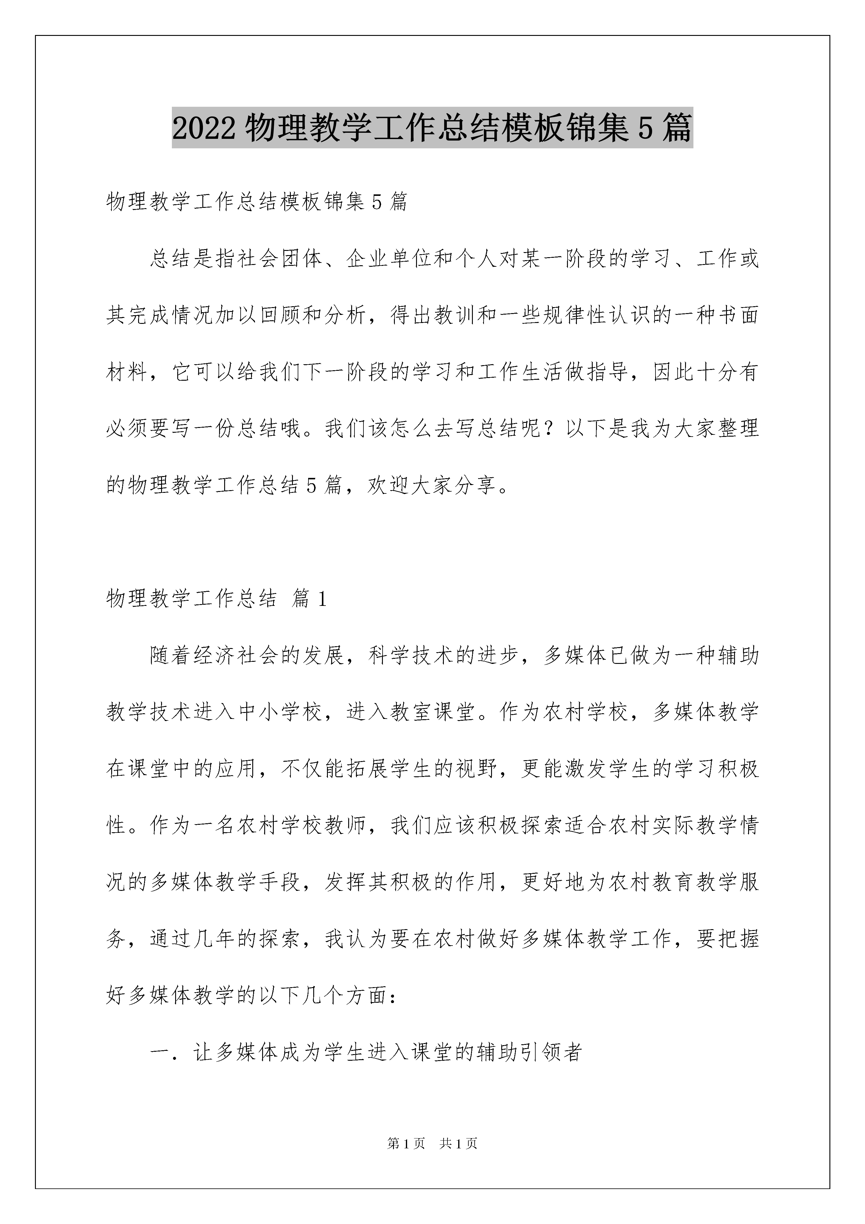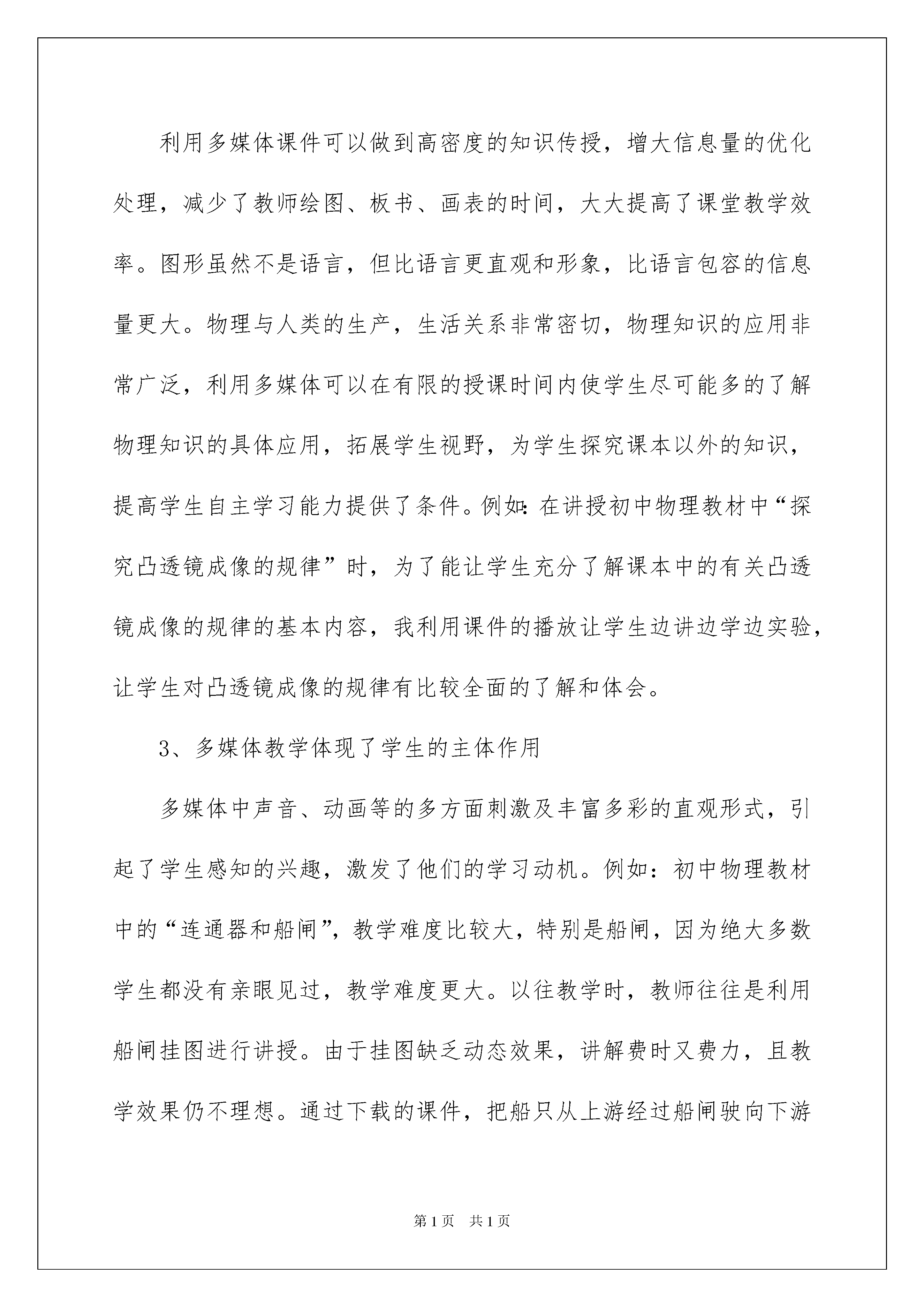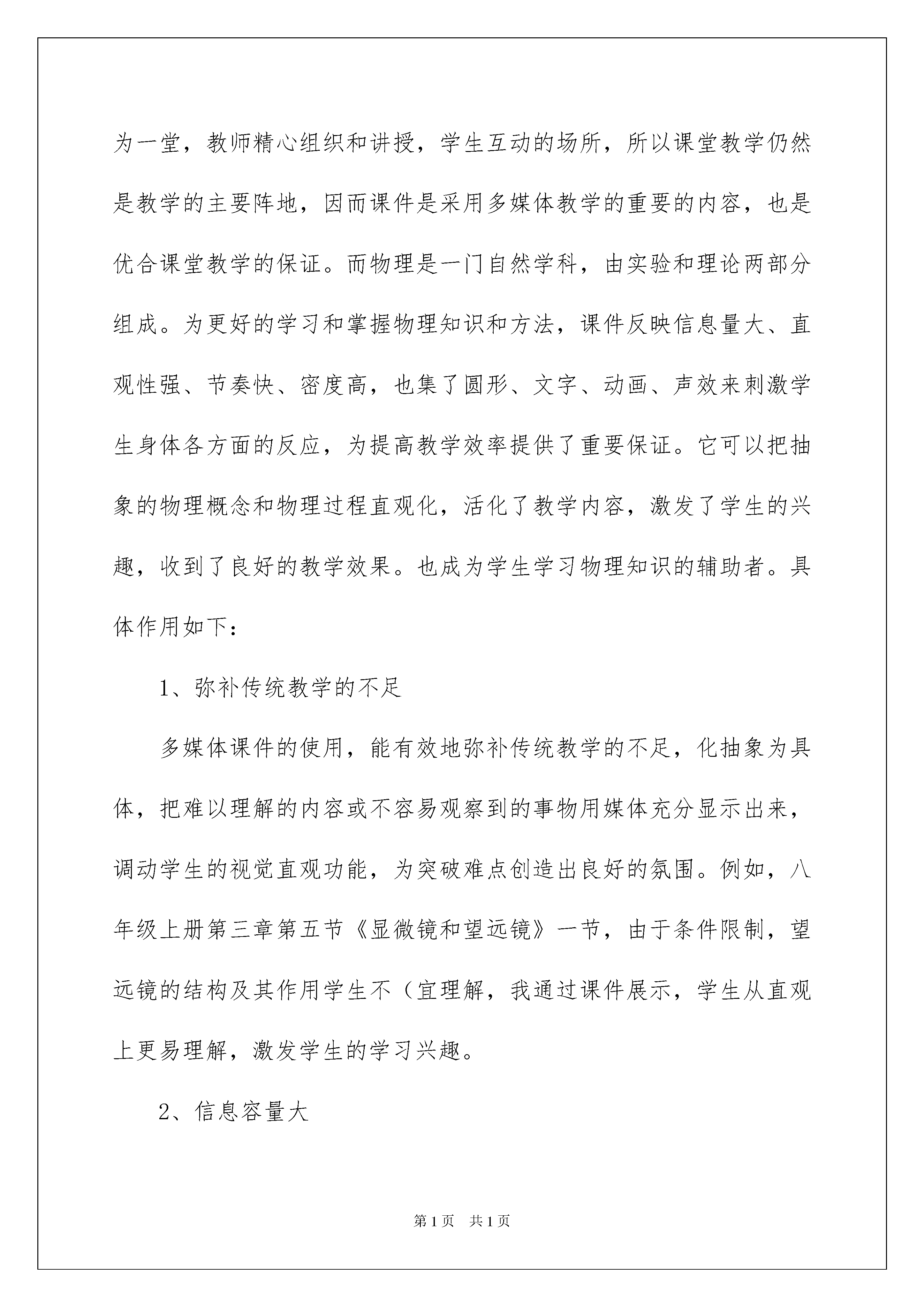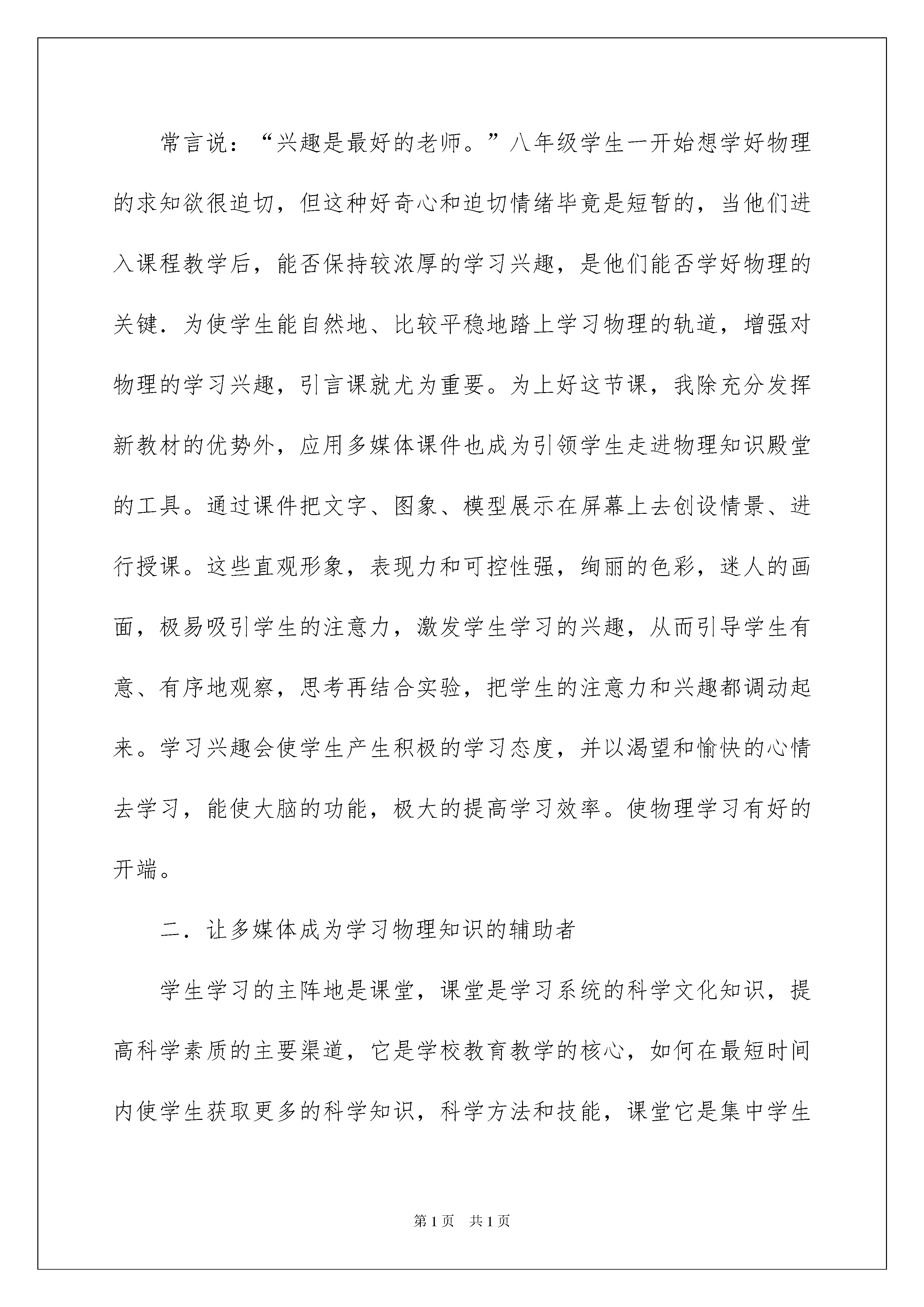 2022物理教学工作总结模板锦集5篇物理教学工作总结模板锦集5篇总结是指社会团体、企业单位和个人对某一阶段的学习、工作或其完成情况加以回顾和分析,得出教训和一些规律性认识的一种书面材料,它可以给我们下一阶段的学习和工作生活做指导,因此十分有必须要写一份总结哦。我们该怎么去写总结呢?以下是我为大家整理的物理教学工作总结5篇,欢迎大家分享。物理教学工作总结篇1随着经济社会的发展,科学技术的进步,多媒体已做为一种辅助教学技术进入中小学校,进入教室课堂。作为农村学校,多媒体教学在课堂中的应用,不仅能拓展学生的视野,更能激发学生的学习积极性。作为一名农村学校教师,我们应该积极探索适合农村实际教学情况的多媒体教学手段,发挥其积极的作用,更好地为农村教育教学服务,通过几年的探索,我认为要在农村做好多媒体教学工作,要把握好多媒体教学的以下几个方面:一.让多媒体成为学生进入课堂的辅助引领者常言说:“兴趣是最好的老师。”八年级学生一开始想学好物理的求知欲很迫切,但这种好奇心和迫切情绪毕竟是短暂的,当他们进入课程教学后,能否保持较浓厚的学习兴趣,是他们能否学好物理的关键.为使学生能自然地、比较平稳地踏上学习物理的轨道,增强对物理的学习兴趣,引言课就尤为重要。为上好这节课,我除充分发挥新教材的优势外,应用多媒体课件也成为引领学生走进物理知识殿堂的工具。通过课件把文字、图象、模型展示在屏幕上去创设情景、进行授课。这些直观形象,表现力和可控性强,绚丽的色彩,迷人的画面,极易吸引学生的注意力,激发学生学习的兴趣,从而引导学生有意、有序地观察,思考再结合实验,把学生的注意力和兴趣都调动起来。学习兴趣会使学生产生积极的学习态度,并以渴望和愉快的心情去学习,能使大脑的功能,极大的提高学习效率。使物理学习有好的开端。二.让多媒体成为学习物理知识的辅助者学生学习的主阵地是课堂,课堂是学习系统的科学文化知识,提高科学素质的主要渠道,它是学校教育教学的核心,如何在最短时间内使学生获取更多的科学知识,科学方法和技能,课堂它是集中学生为一堂,教师精心组织和讲授,学生互动的场所,所以课堂教学仍然是教学的主要阵地,因而课件是采用多媒体教学的重要的内容,也是优合课堂教学的保证。而物理是一门自然学科,由实验和理论两部分组成。为更好的学习和掌握物理知识和方法,课件反映信息量大、直观性强、节奏快、密度高,也集了圆形、文字、动画、声效来刺激学生身体各方面的反应,为提高教学效率提供了重要保证。它可以把抽象的物理概念和物理过程直观化,活化了教学内容,激发了学生的兴趣,收到了良好的教学效果。也成为学生学习物理知识的辅助者。具体作用如下:1、弥补传统教学的不足多媒体课件的使用,能有效地弥补传统教学的不足,化抽象为具体,把难以理解的内容或不容易观察到的事物用媒体充分显示出来,调动学生的视觉直观功能,为突破难点创造出良好的氛围。例如,八年级上册第三章第五节《显微镜和望远镜》一节,由于条件限制,望远镜的结构及其作用学生不(宜理解,我通过课件展示,学生从直观上更易理解,激发学生的学习兴趣。2、信息容量大利用多媒体课件可以做到高密度的知识传授,增大信息量的优化处理,减少了教师绘图、板书、画表的时间,大大提高了课堂教学效率。图形虽然不是语言,但比语言更直观和形象,比语言包容的信息量更大。物理与人类的生产,生活关系非常密切,物理知识的应用非常广泛,利用多媒体可以在有限的授课时间内使学生尽可能多的了解物理知识的具体应用,拓展学生视野,为学生探究课本以外的知识,提高学生自主学习能力提供了条件。例如:在讲授初中物理教材中“探究凸透镜成像的规律”时,为了能让学生充分了解课本中的有关凸透镜成像的规律的基本内容,我利用课件的播放让学生边讲边学边实验,让学生对凸透镜成像的规律有比较全面的了解和体会。3、多媒体教学体现了学生的主体作用多媒体中声音、动画等的多方面刺激及丰富多彩的直观形式,引起了学生感知的兴趣,激发了他们的学习动机。例如:初中物理教材中的“连通器和船闸”,教学难度比较大,特别是船闸,因为绝大多数学生都没有亲眼见过,教学难度更大。以往教学时,教师往往是利用船闸挂图进行讲授。由于挂图缺乏动态效果,讲解费时又费力,且教学效果仍不理想。通过下载的课件,把船只从上游经过船闸驶向下游的整个过程用电脑动画形式模拟出来。效果会很好。上课时先让学生观看下述动画:某船处于某河的上游,正准备通过船闸驶向下游;船闸的上游闸门拉起一些,上游的水通过闸门下部流到闸室内,闸室里水面逐渐升高,直到和上游的水面保持相平;上游闸门打开,船从上游经闸门驶入闸室;关闭上游闸门,将下游闸门拉起一些