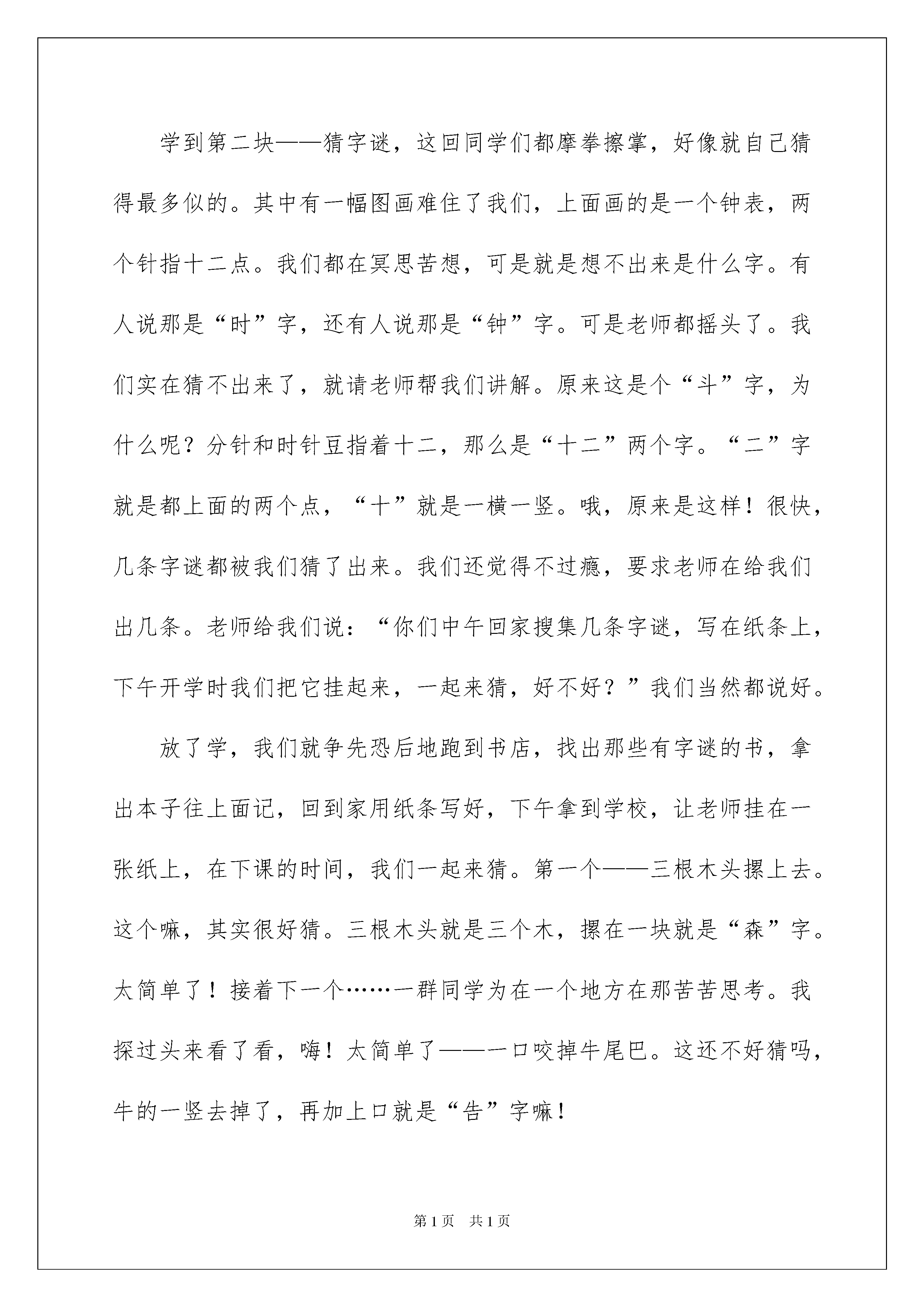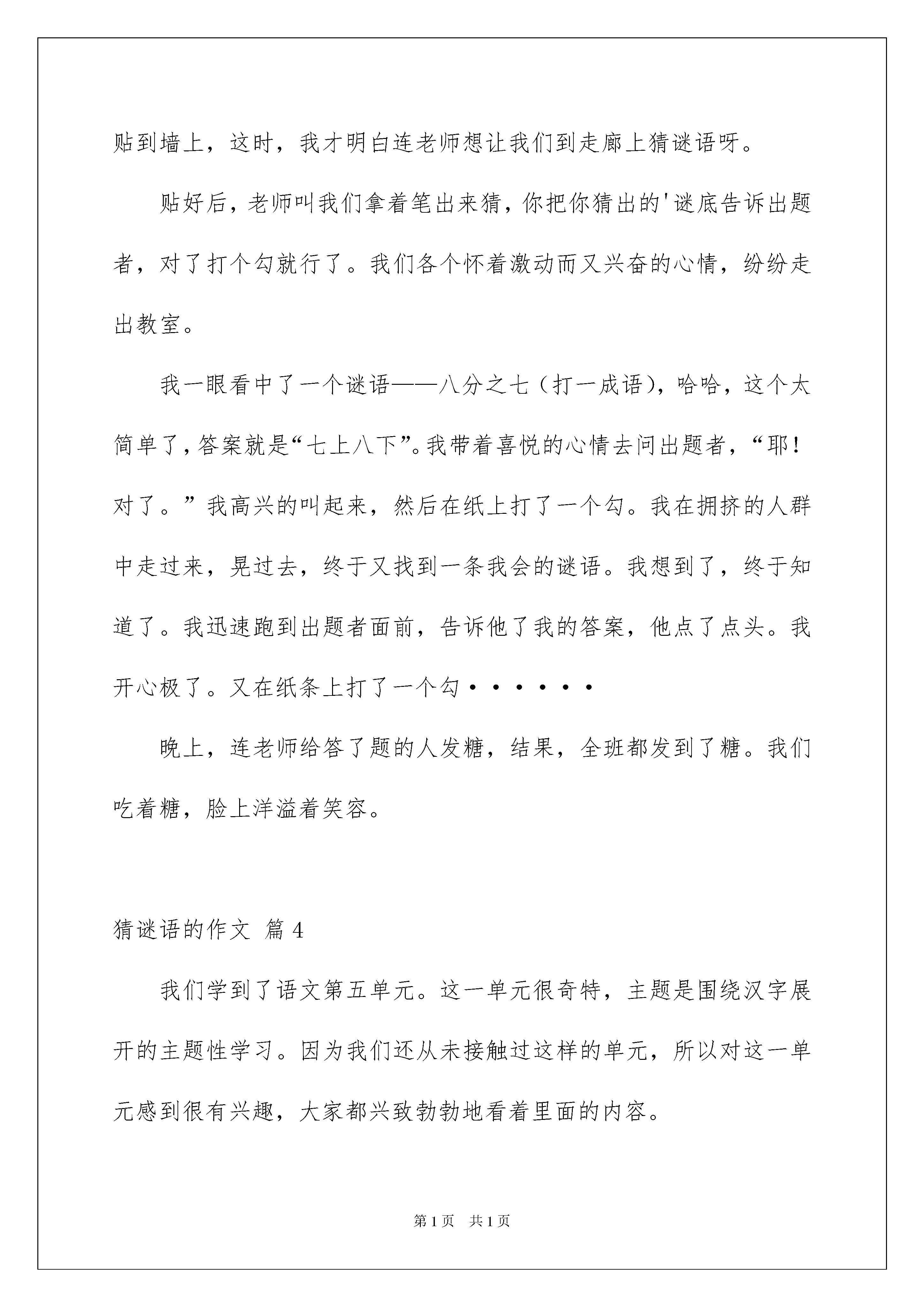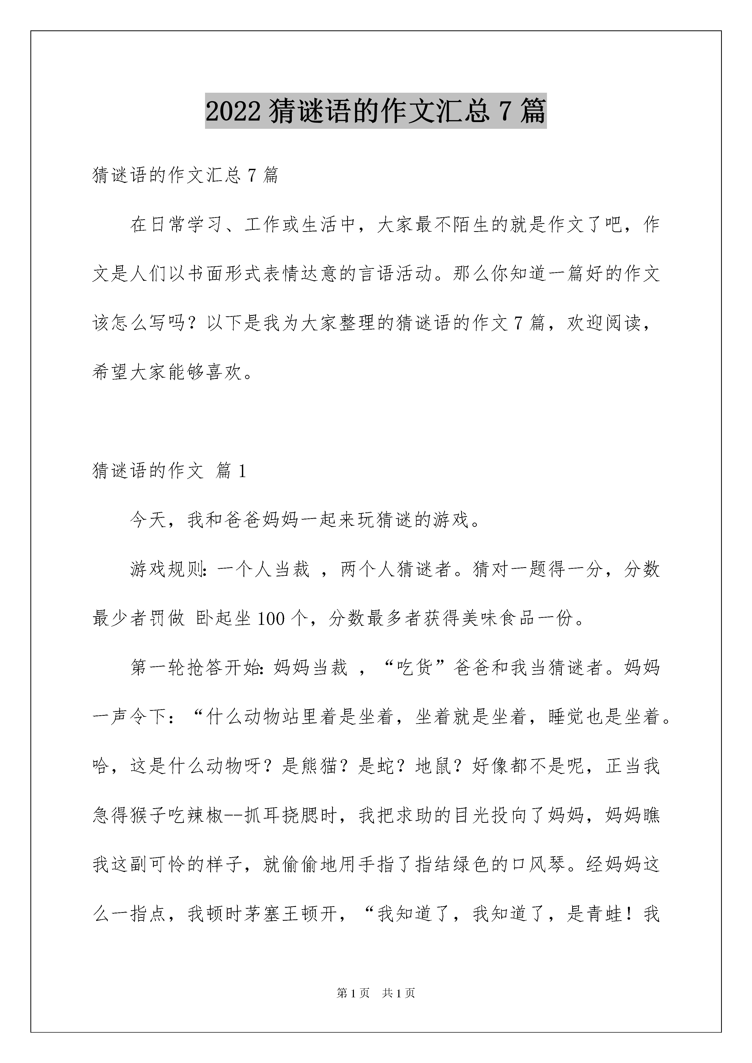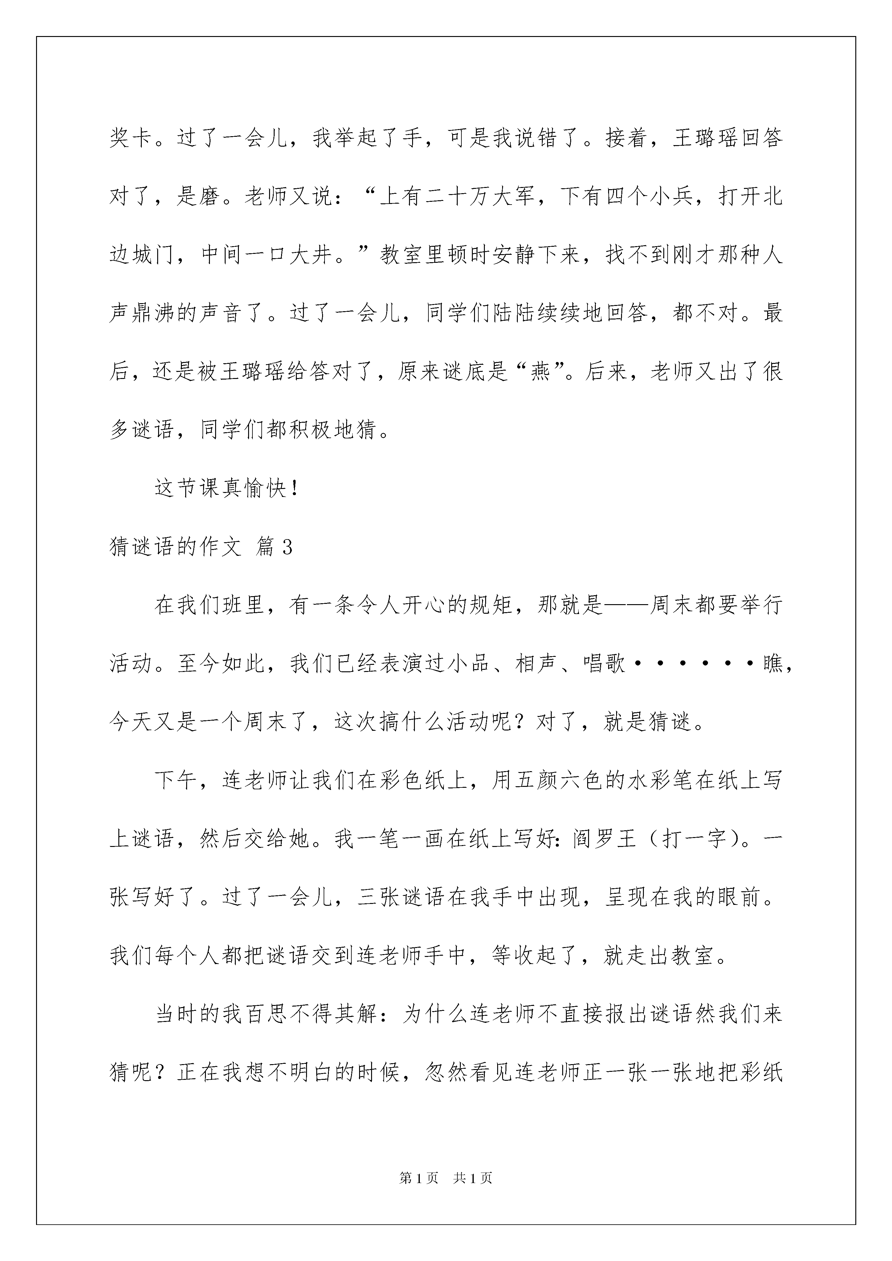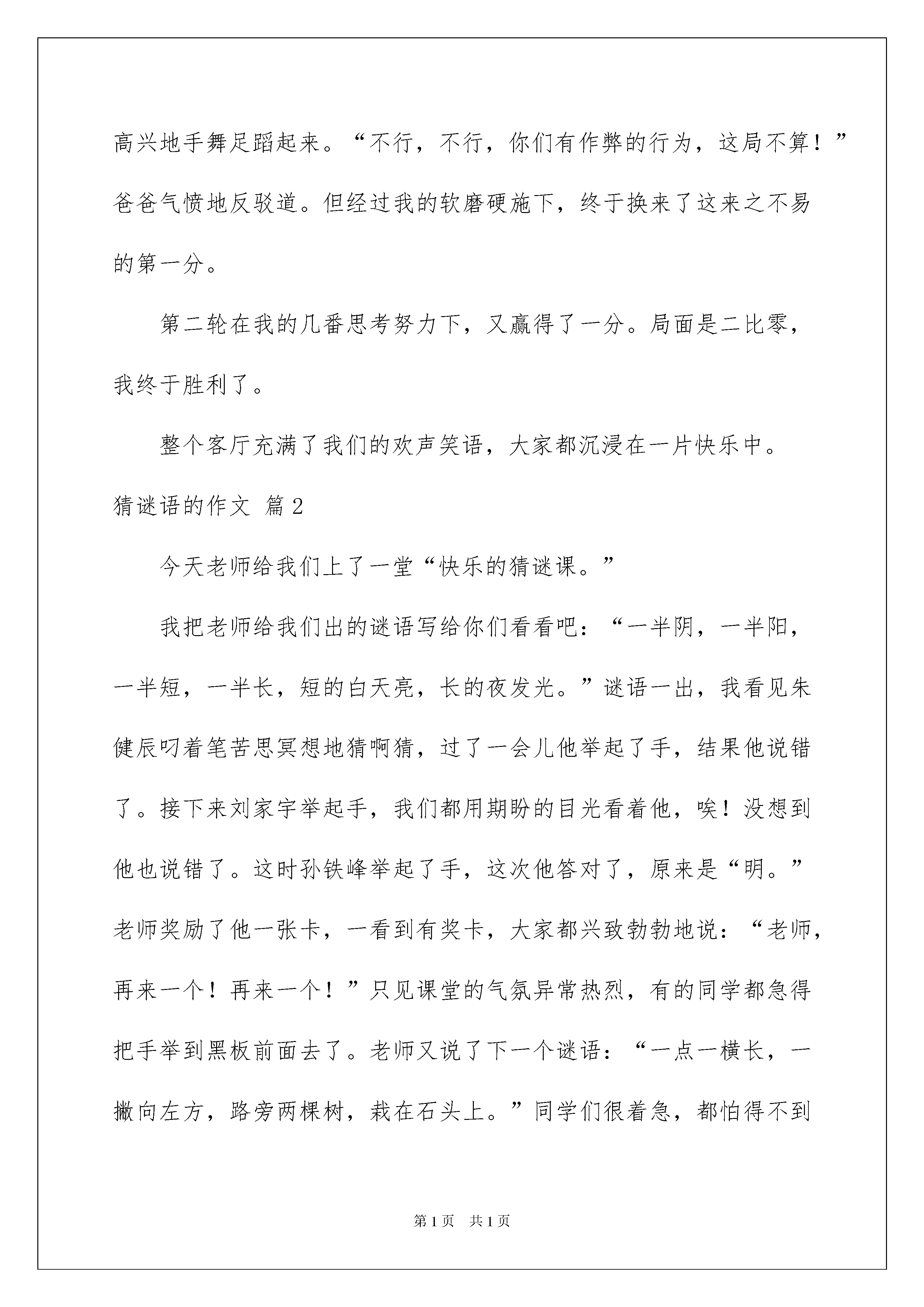 2022猜谜语的作文汇总7篇猜谜语的作文汇总7篇在日常学习、工作或生活中,大家最不陌生的就是作文了吧,作文是人们以书面形式表情达意的言语活动。那么你知道一篇好的作文该怎么写吗?以下是我为大家整理的猜谜语的作文7篇,欢迎阅读,希望大家能够喜欢。猜谜语的作文篇1今天,我和爸爸妈妈一起来玩猜谜的游戏。游戏规则:一个人当裁,两个人猜谜者。猜对一题得一分,分数最少者罚做卧起坐100个,分数最多者获得美味食品一份。第一轮抢答开始:妈妈当裁,“吃货”爸爸和我当猜谜者。妈妈一声令下:“什么动物站里着是坐着,坐着就是坐着,睡觉也是坐着。哈,这是什么动物呀?是熊猫?是蛇?地鼠?好像都不是呢,正当我急得猴子吃辣椒--抓耳挠腮时,我把求助的目光投向了妈妈,妈妈瞧我这副可怜的样子,就偷偷地用手指了指结绿色的口风琴。经妈妈这么一指点,我顿时茅塞王顿开,“我知道了,我知道了,是青蛙!我高兴地手舞足蹈起来。“不行,不行,你们有作弊的行为,这局不算!”爸爸气愤地反驳道。但经过我的软磨硬施下,终于换来了这来之不易的第一分。第二轮在我的几番思考努力下,又赢得了一分。局面是二比零,我终于胜利了。整个客厅充满了我们的欢声笑语,大家都沉浸在一片快乐中。猜谜语的作文篇2今天老师给我们上了一堂“快乐的猜谜课。”我把老师给我们出的谜语写给你们看看吧:“一半阴,一半阳,一半短,一半长,短的白天亮,长的夜发光。”谜语一出,我看见朱健辰叼着笔苦思冥想地猜啊猜,过了一会儿他举起了手,结果他说错了。接下来刘家宇举起手,我们都用期盼的目光看着他,唉!没想到他也说错了。这时孙铁峰举起了手,这次他答对了,原来是“明。”老师奖励了他一张卡,一看到有奖卡,大家都兴致勃勃地说:“老师,再来一个!再来一个!”只见课堂的气氛异常热烈,有的同学都急得把手举到黑板前面去了。老师又说了下一个谜语:“一点一横长,一撇向左方,路旁两棵树,栽在石头上。”同学们很着急,都怕得不到奖卡。过了一会儿,我举起了手,可是我说错了。接着,王璐瑶回答对了,是磨。老师又说:“上有二十万大军,下有四个小兵,打开北边城门,中间一口大井。”教室里顿时安静下来,找不到刚才那种人声鼎沸的声音了。过了一会儿,同学们陆陆续续地回答,都不对。最后,还是被王璐瑶给答对了,原来谜底是“燕”。后来,老师又出了很多谜语,同学们都积极地猜。这节课真愉快!猜谜语的作文篇3在我们班里,有一条令人开心的规矩,那就是——周末都要举行活动。至今如此,我们已经表演过小品、相声、唱歌······瞧,今天又是一个周末了,这次搞什么活动呢?对了,就是猜谜。下午,连老师让我们在彩色纸上,用五颜六色的水彩笔在纸上写上谜语,然后交给她。我一笔一画在纸上写好:阎罗王(打一字)。一张写好了。过了一会儿,三张谜语在我手中出现,呈现在我的眼前。我们每个人都把谜语交到连老师手中,等收起了,就走出教室。当时的我百思不得其解:为什么连老师不直接报出谜语然我们来猜呢?正在我想不明白的时候,忽然看见连老师正一张一张地把彩纸贴到墙上,这时,我才明白连老师想让我们到走廊上猜谜语呀。贴好后,老师叫我们拿着笔出来猜,你把你猜出的'谜底告诉出题者,对了打个勾就行了。我们各个怀着激动而又兴奋的心情,纷纷走出教室。我一眼看中了一个谜语——八分之七(打一成语),哈哈,这个太简单了,答案就是“七上八下”。我带着喜悦的心情去问出题者,“耶!对了。”我高兴的叫起来,然后在纸上打了一个勾。我在拥挤的人群中走过来,晃过去,终于又找到一条我会的谜语。我想到了,终于知道了。我迅速跑到出题者面前,告诉他了我的答案,他点了点头。我开心极了。又在纸条上打了一个勾······晚上,连老师给答了题的人发糖,结果,全班都发到了糖。我们吃着糖,脸上洋溢着笑容。猜谜语的作文篇4我们学到了语文第五单元。这一单元很奇特,主题是围绕汉字展开的主题性学习。因为我们还从未接触过这样的单元,所以对这一单元感到很有兴趣,大家都兴致勃勃地看着里面的内容。学到第二块——猜字谜,这回同学们都摩拳擦掌,好像就自己猜得最多似的。其中有一幅图画难住了我们,上面画的是一个钟表,两个针指十二点。我们都在冥思苦想,可是就是想不出来是什么字。有人说那是“时”字,还有人说那是“钟”字。可是老师都摇头了。我们实在猜不出来了,就请老师帮我们讲解。原来这是个“斗”字,为什么呢?分针和时针豆指着十二,那么是“十二”两个字。“二”字就是都上面的两个点,“十”就是一横一竖。哦,原来是这样!很快,几条字谜都被我们猜了出来。我们还觉得不过瘾,要求老师在给我们出几条。老师给我们说:“你们中午回家搜集几条字谜,写在纸条上,下午开学时我们把它