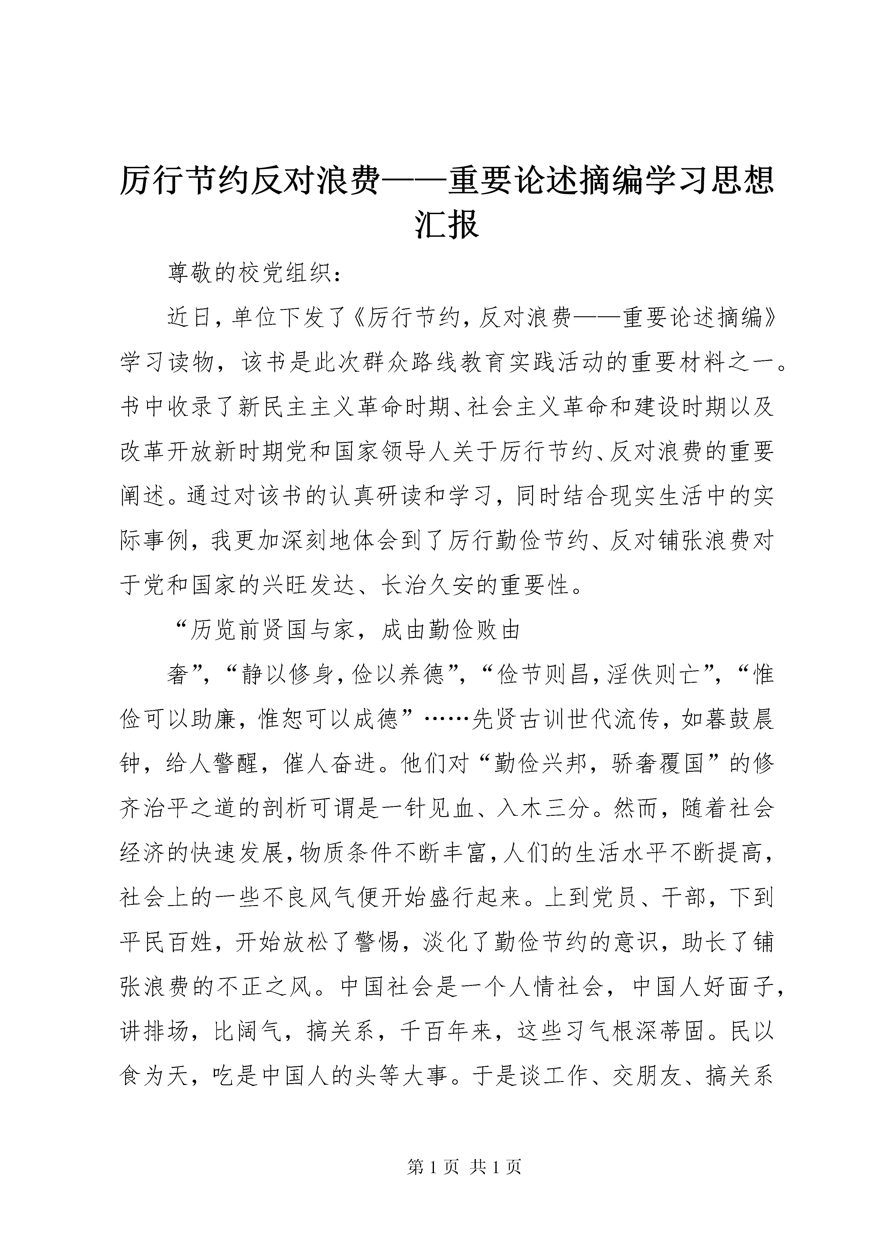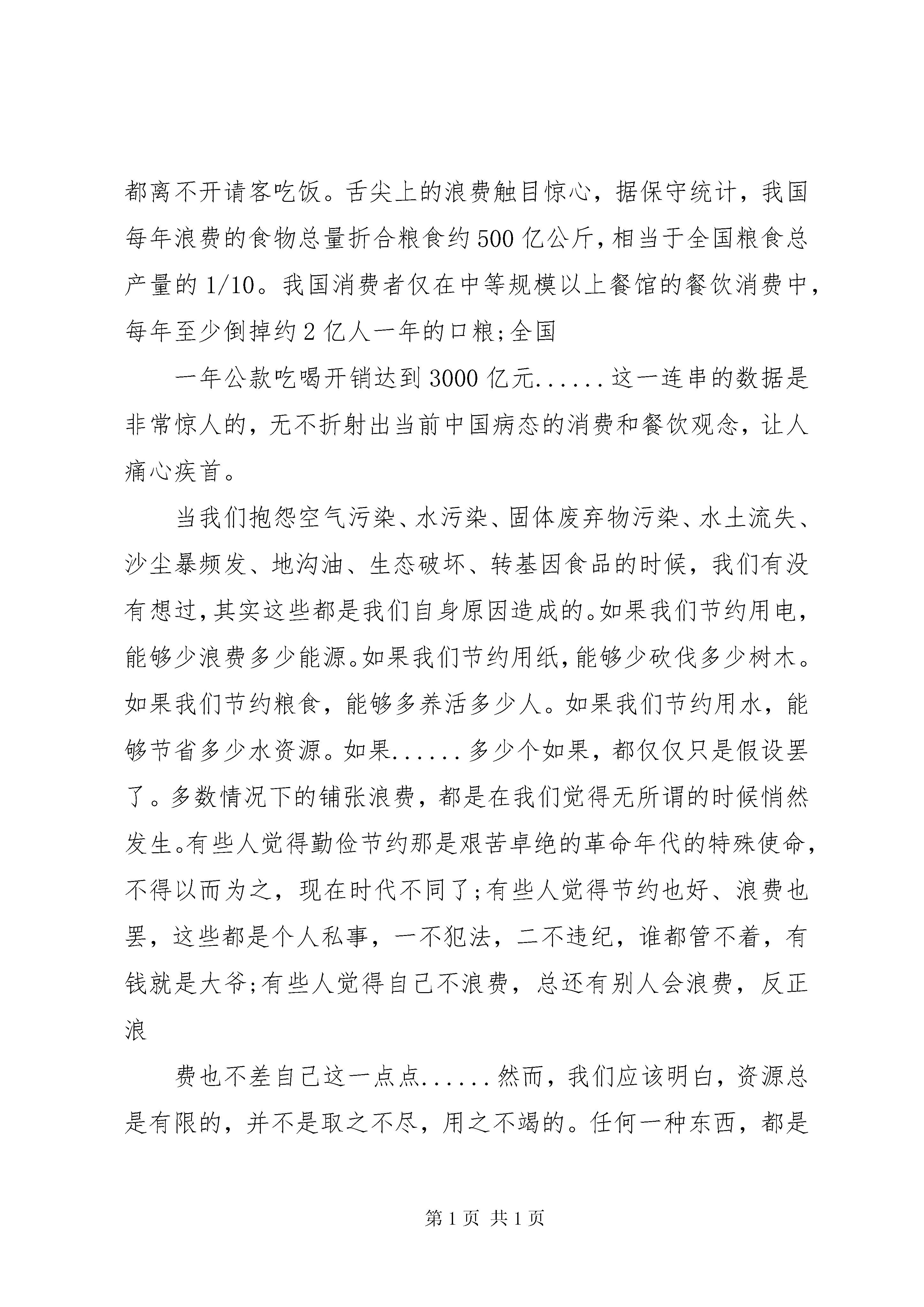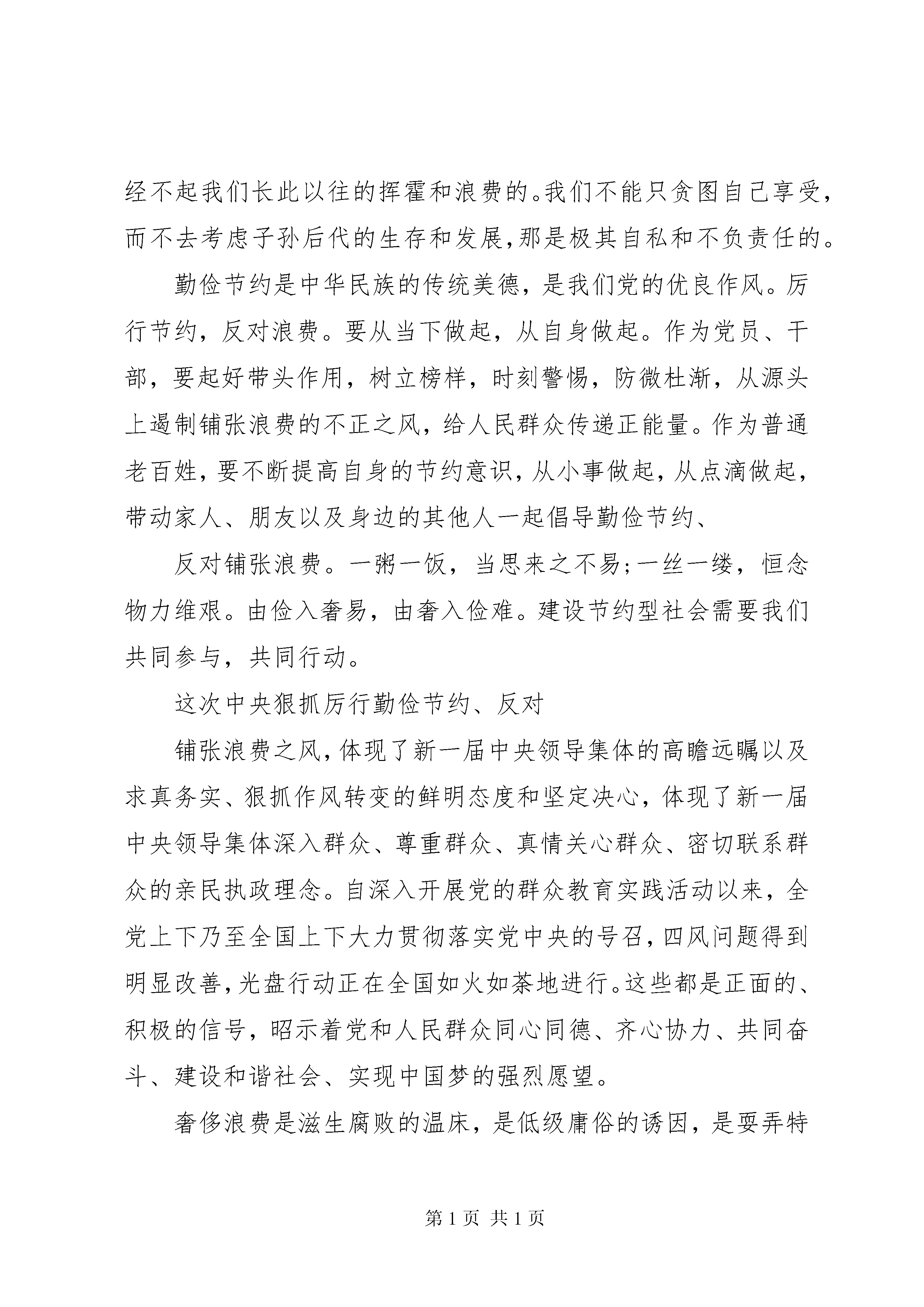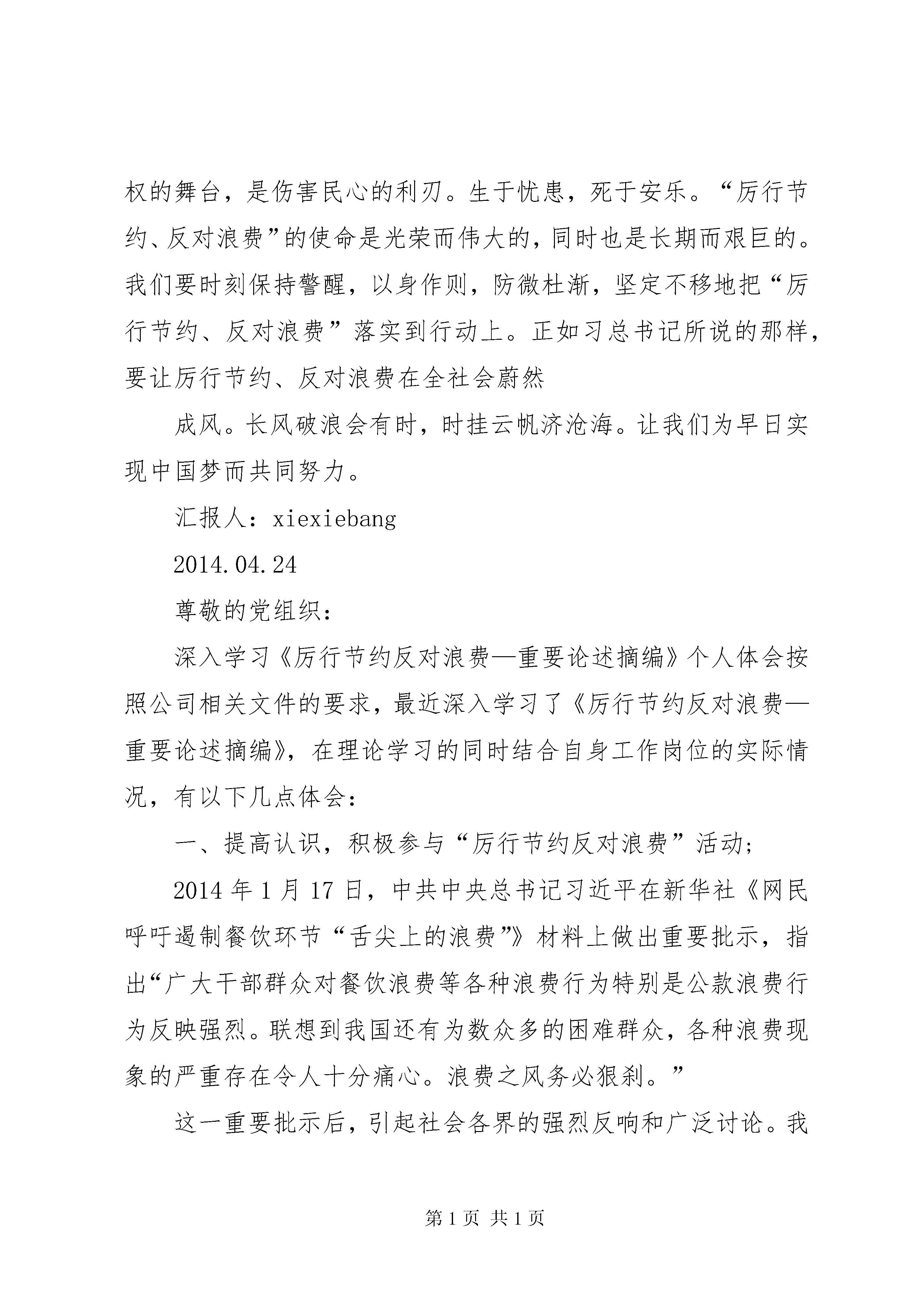 厉行节约反对浪费——重要论述摘编学习思想汇报尊敬的校党组织:近日,单位下发了《厉行节约,反对浪费——重要论述摘编》学习读物,该书是此次群众路线教育实践活动的重要材料之一。书中收录了新民主主义革命时期、社会主义革命和建设时期以及改革开放新时期党和国家领导人关于厉行节约、反对浪费的重要阐述。通过对该书的认真研读和学习,同时结合现实生活中的实际事例,我更加深刻地体会到了厉行勤俭节约、反对铺张浪费对于党和国家的兴旺发达、长治久安的重要性。“历览前贤国与家,成由勤俭败由奢”,“静以修身,俭以养德”,“俭节则昌,淫佚则亡”,“惟俭可以助廉,惟恕可以成德”……先贤古训世代流传,如暮鼓晨钟,给人警醒,催人奋进。他们对“勤俭兴邦,骄奢覆国”的修齐治平之道的剖析可谓是一针见血、入木三分。然而,随着社会经济的快速发展,物质条件不断丰富,人们的生活水平不断提高,社会上的一些不良风气便开始盛行起来。上到党员、干部,下到平民百姓,开始放松了警惕,淡化了勤俭节约的意识,助长了铺张浪费的不正之风。中国社会是一个人情社会,中国人好面子,讲排场,比阔气,搞关系,千百年来,这些习气根深蒂固。民以食为天,吃是中国人的头等大事。于是谈工作、交朋友、搞关系都离不开请客吃饭。舌尖上的浪费触目惊心,据保守统计,我国每年浪费的食物总量折合粮食约500亿公斤,相当于全国粮食总产量的1/10。我国消费者仅在中等规模以上餐馆的餐饮消费中,每年至少倒掉约2亿人一年的口粮;全国一年公款吃喝开销达到3000亿元......这一连串的数据是非常惊人的,无不折射出当前中国病态的消费和餐饮观念,让人痛心疾首。当我们抱怨空气污染、水污染、固体废弃物污染、水土流失、沙尘暴频发、地沟油、生态破坏、转基因食品的时候,我们有没有想过,其实这些都是我们自身原因造成的。如果我们节约用电,能够少浪费多少能源。如果我们节约用纸,能够少砍伐多少树木。如果我们节约粮食,能够多养活多少人。如果我们节约用水,能够节省多少水资源。如果......多少个如果,都仅仅只是假设罢了。多数情况下的铺张浪费,都是在我们觉得无所谓的时候悄然发生。有些人觉得勤俭节约那是艰苦卓绝的革命年代的特殊使命,不得以而为之,现在时代不同了;有些人觉得节约也好、浪费也罢,这些都是个人私事,一不犯法,二不违纪,谁都管不着,有钱就是大爷;有些人觉得自己不浪费,总还有别人会浪费,反正浪费也不差自己这一点点......然而,我们应该明白,资源总是有限的,并不是取之不尽,用之不竭的。任何一种东西,都是经不起我们长此以往的挥霍和浪费的。我们不能只贪图自己享受,而不去考虑子孙后代的生存和发展,那是极其自私和不负责任的。勤俭节约是中华民族的传统美德,是我们党的优良作风。厉行节约,反对浪费。要从当下做起,从自身做起。作为党员、干部,要起好带头作用,树立榜样,时刻警惕,防微杜渐,从源头上遏制铺张浪费的不正之风,给人民群众传递正能量。作为普通老百姓,要不断提高自身的节约意识,从小事做起,从点滴做起,带动家人、朋友以及身边的其他人一起倡导勤俭节约、反对铺张浪费。一粥一饭,当思来之不易;一丝一缕,恒念物力维艰。由俭入奢易,由奢入俭难。建设节约型社会需要我们共同参与,共同行动。这次中央狠抓厉行勤俭节约、反对铺张浪费之风,体现了新一届中央领导集体的高瞻远瞩以及求真务实、狠抓作风转变的鲜明态度和坚定决心,体现了新一届中央领导集体深入群众、尊重群众、真情关心群众、密切联系群众的亲民执政理念。自深入开展党的群众教育实践活动以来,全党上下乃至全国上下大力贯彻落实党中央的号召,四风问题得到明显改善,光盘行动正在全国如火如荼地进行。这些都是正面的、积极的信号,昭示着党和人民群众同心同德、齐心协力、共同奋斗、建设和谐社会、实现中国梦的强烈愿望。奢侈浪费是滋生腐败的温床,是低级庸俗的诱因,是耍弄特权的舞台,是伤害民心的利刃。生于忧患,死于安乐。“厉行节约、反对浪费”的使命是光荣而伟大的,同时也是长期而艰巨的。我们要时刻保持警醒,以身作则,防微杜渐,坚定不移地把“厉行节约、反对浪费”落实到行动上。正如习总书记所说的那样,要让厉行节约、反对浪费在全社会蔚然成风。长风破浪会有时,时挂云帆济沧海。让我们为早日实现中国梦而共同努力。汇报人:xiexiebang2014.04.24尊敬的党组织:深入学习《厉行节约反对浪费—重要论述摘编》个人体会按照公司相关文件的要求,最近深入学习了《厉行节约反对浪费—重要论述摘编》,在理论学习的同时结合自身工作岗位的实际情况,有以下几点体会:一、提高认识,积极参与“厉行节约反对浪费”活动;2014年1月17日,中共中央总书记习近平在新华社《网民呼吁遏制餐饮环节“舌尖上的浪费”》材料上做出重要批示,指出“广大干部群众对餐饮浪费等各种浪费行为特别是公