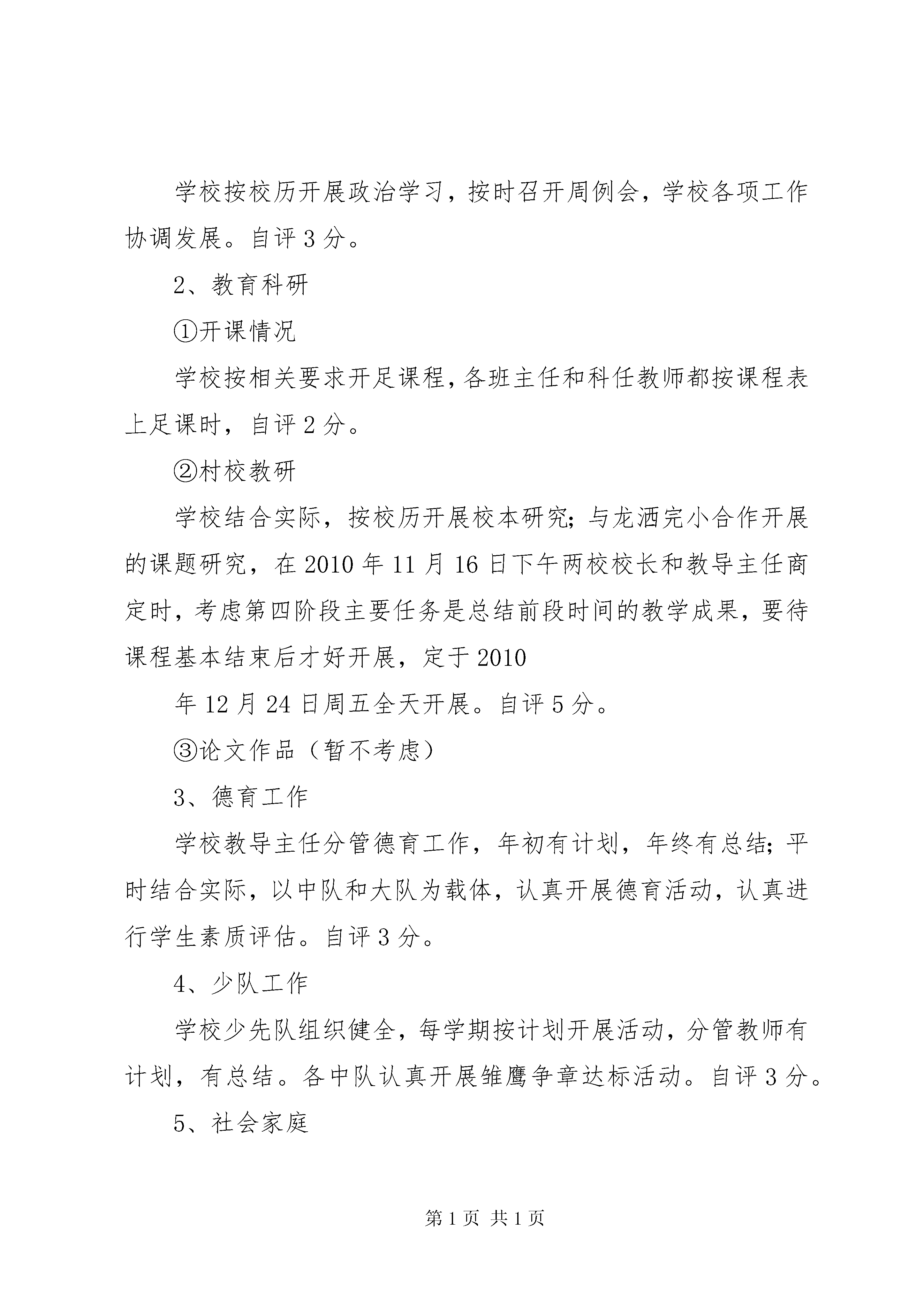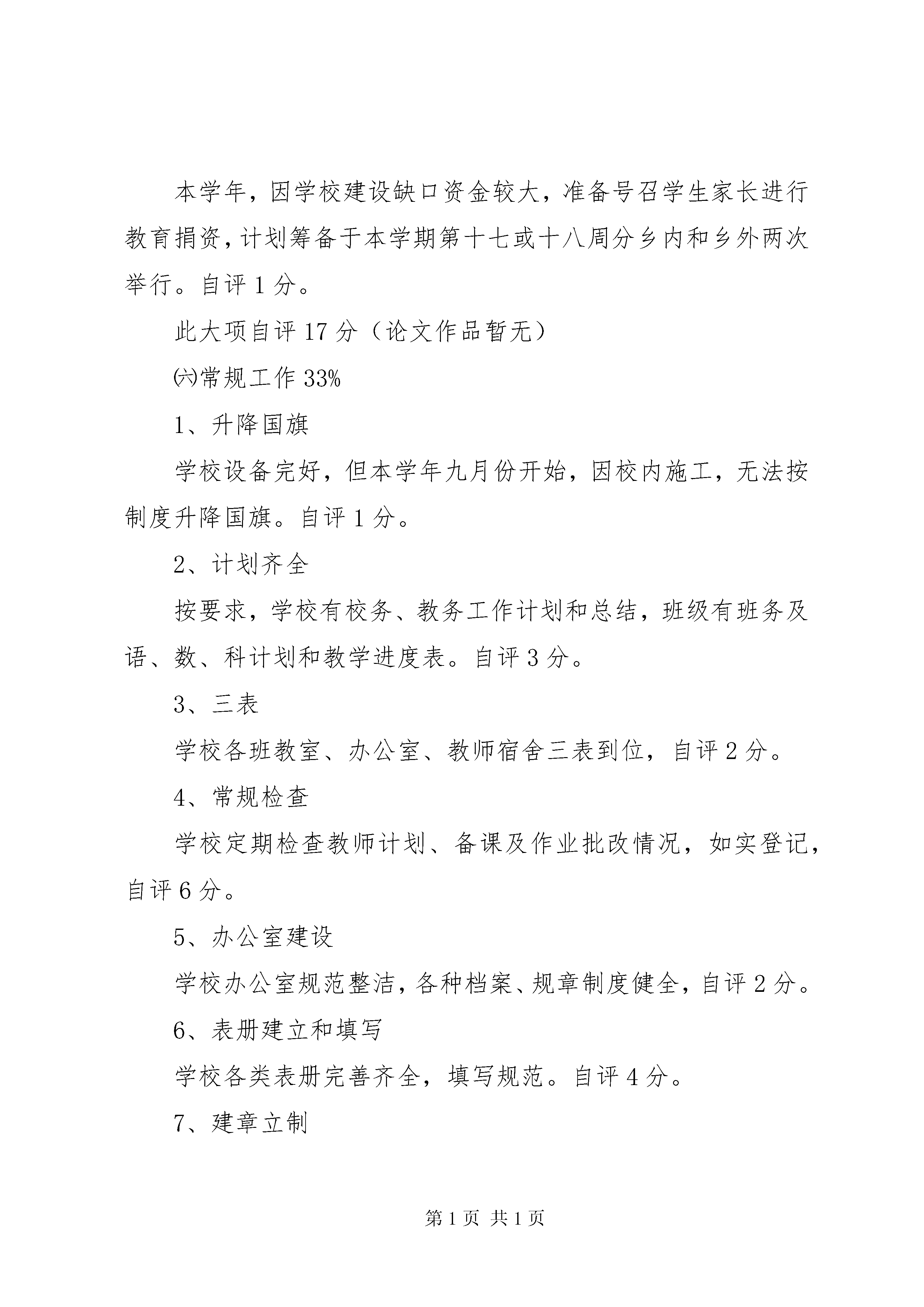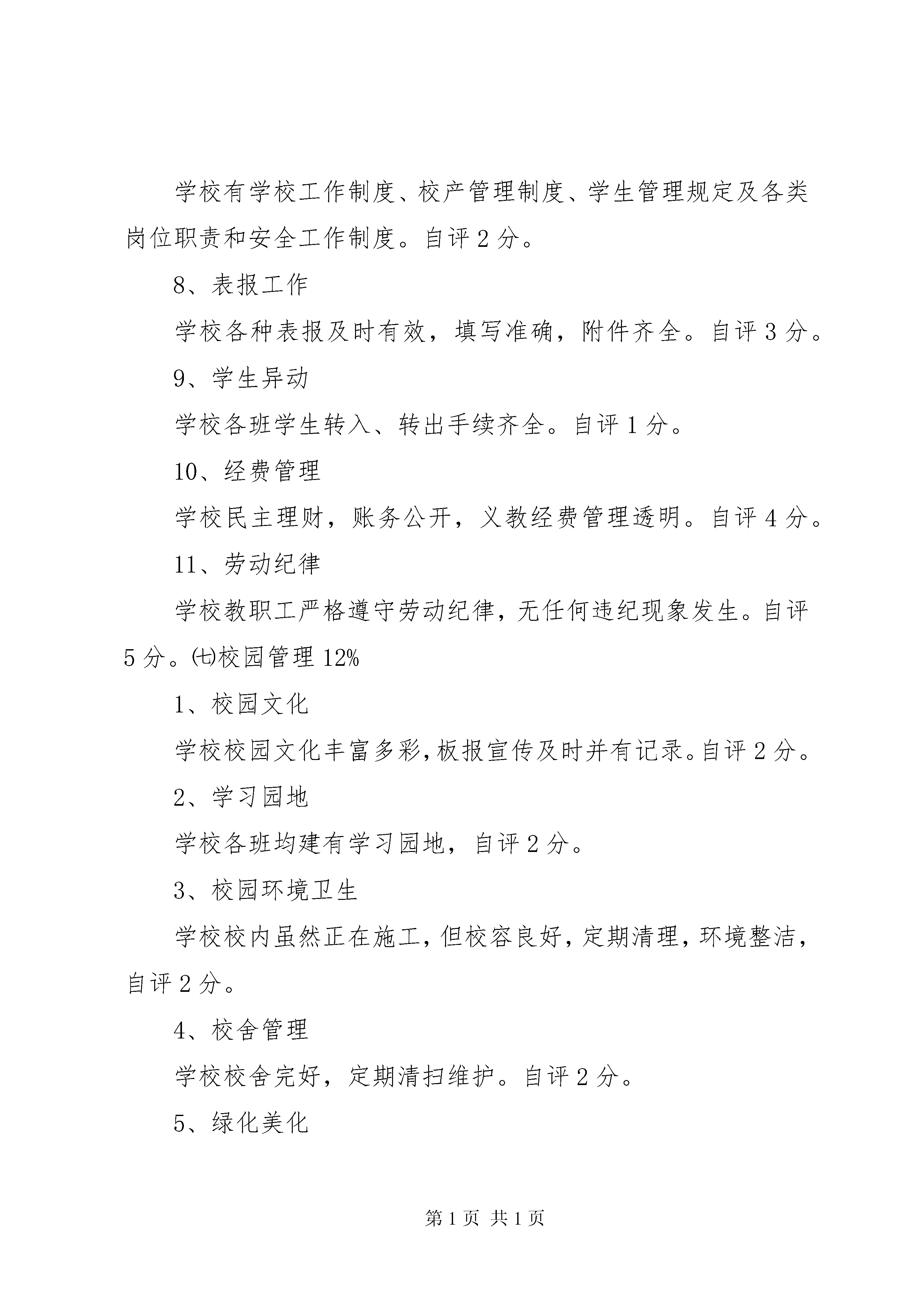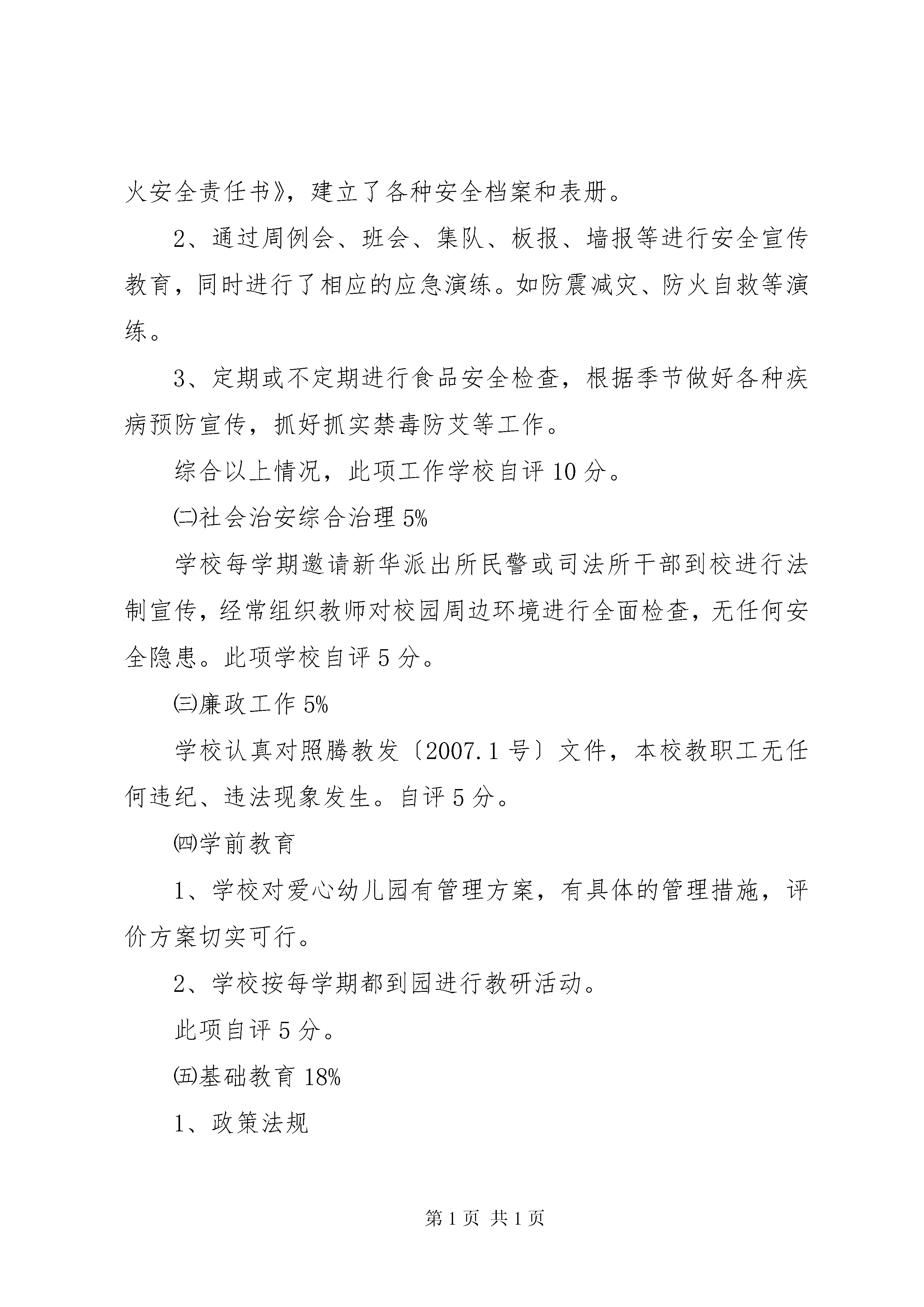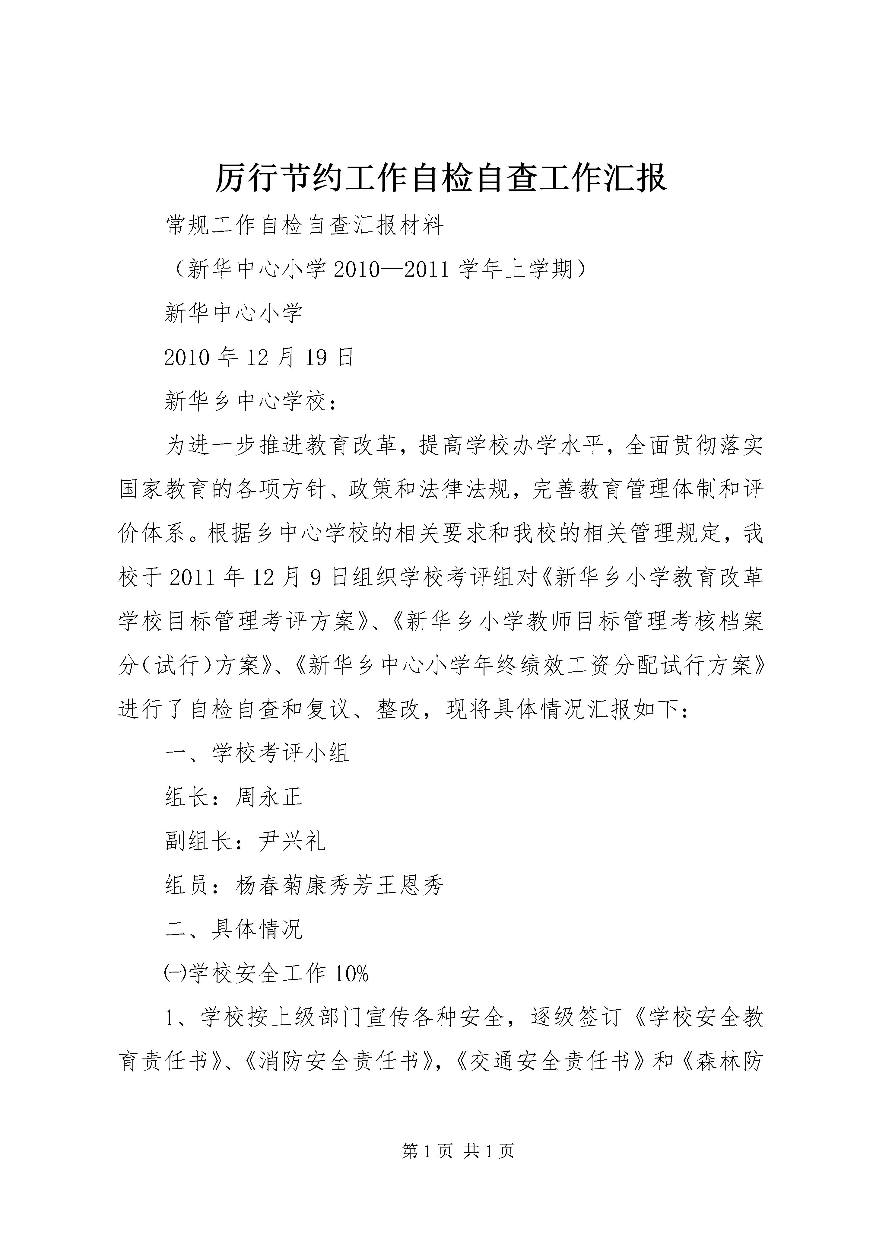 厉行节约工作自检自查工作汇报常规工作自检自查汇报材料(新华中心小学2010—2011学年上学期)新华中心小学2010年12月19日新华乡中心学校:为进一步推进教育改革,提高学校办学水平,全面贯彻落实国家教育的各项方针、政策和法律法规,完善教育管理体制和评价体系。根据乡中心学校的相关要求和我校的相关管理规定,我校于2011年12月9日组织学校考评组对《新华乡小学教育改革学校目标管理考评方案》、《新华乡小学教师目标管理考核档案分(试行)方案》、《新华乡中心小学年终绩效工资分配试行方案》进行了自检自查和复议、整改,现将具体情况汇报如下:一、学校考评小组组长:周永正副组长:尹兴礼组员:杨春菊康秀芳王恩秀二、具体情况㈠学校安全工作10%1、学校按上级部门宣传各种安全,逐级签订《学校安全教育责任书》、《消防安全责任书》,《交通安全责任书》和《森林防火安全责任书》,建立了各种安全档案和表册。2、通过周例会、班会、集队、板报、墙报等进行安全宣传教育,同时进行了相应的应急演练。如防震减灾、防火自救等演练。3、定期或不定期进行食品安全检查,根据季节做好各种疾病预防宣传,抓好抓实禁毒防艾等工作。综合以上情况,此项工作学校自评10分。㈡社会治安综合治理5%学校每学期邀请新华派出所民警或司法所干部到校进行法制宣传,经常组织教师对校园周边环境进行全面检查,无任何安全隐患。此项学校自评5分。㈢廉政工作5%学校认真对照腾教发〔2007.1号〕文件,本校教职工无任何违纪、违法现象发生。自评5分。㈣学前教育1、学校对爱心幼儿园有管理方案,有具体的管理措施,评价方案切实可行。2、学校按每学期都到园进行教研活动。此项自评5分。㈤基础教育18%1、政策法规学校按校历开展政治学习,按时召开周例会,学校各项工作协调发展。自评3分。2、教育科研①开课情况学校按相关要求开足课程,各班主任和科任教师都按课程表上足课时,自评2分。②村校教研学校结合实际,按校历开展校本研究;与龙洒完小合作开展的课题研究,在2010年11月16日下午两校校长和教导主任商定时,考虑第四阶段主要任务是总结前段时间的教学成果,要待课程基本结束后才好开展,定于2010年12月24日周五全天开展。自评5分。③论文作品(暂不考虑)3、德育工作学校教导主任分管德育工作,年初有计划,年终有总结;平时结合实际,以中队和大队为载体,认真开展德育活动,认真进行学生素质评估。自评3分。4、少队工作学校少先队组织健全,每学期按计划开展活动,分管教师有计划,有总结。各中队认真开展雏鹰争章达标活动。自评3分。5、社会家庭本学年,因学校建设缺口资金较大,准备号召学生家长进行教育捐资,计划筹备于本学期第十七或十八周分乡内和乡外两次举行。自评1分。此大项自评17分(论文作品暂无)㈥常规工作33%1、升降国旗学校设备完好,但本学年九月份开始,因校内施工,无法按制度升降国旗。自评1分。2、计划齐全按要求,学校有校务、教务工作计划和总结,班级有班务及语、数、科计划和教学进度表。自评3分。3、三表学校各班教室、办公室、教师宿舍三表到位,自评2分。4、常规检查学校定期检查教师计划、备课及作业批改情况,如实登记,自评6分。5、办公室建设学校办公室规范整洁,各种档案、规章制度健全,自评2分。6、表册建立和填写学校各类表册完善齐全,填写规范。自评4分。7、建章立制学校有学校工作制度、校产管理制度、学生管理规定及各类岗位职责和安全工作制度。自评2分。8、表报工作学校各种表报及时有效,填写准确,附件齐全。自评3分。9、学生异动学校各班学生转入、转出手续齐全。自评1分。10、经费管理学校民主理财,账务公开,义教经费管理透明。自评4分。11、劳动纪律学校教职工严格遵守劳动纪律,无任何违纪现象发生。自评5分。㈦校园管理12%1、校园文化学校校园文化丰富多彩,板报宣传及时并有记录。自评2分。2、学习园地学校各班均建有学习园地,自评2分。3、校园环境卫生学校校内虽然正在施工,但校容良好,定期清理,环境整洁,自评2分。4、校舍管理学校校舍完好,定期清扫维护。自评2分。5、绿化美化学校现有绿化布局合理,管理规范,自评2分。此项自评综合10分。㈧完成工作任务1、教师培训学校教师认真参加各种培训,自评2分。2、临时性工作学校积极参加中心校安排的各项活动,完成乡党委、政府交给的中心任务,自评3分。3、年终水平测试(暂无)4、社区评价干群、社会、学生对学校及教师评价良好,自评3分。此项自评综合8分(年终水平测试暂无)㈨远程教育管理4%学校有计划,有总结,有记录,但本学期情况特殊,无法开展。自评4分。通过自查自评,我们看到学校管理的逐步完善和教师常规工作的进步,但也看到了许多的不足,请中心学校对我校工作给予更多的指导。新华中心小学2010年12月19日