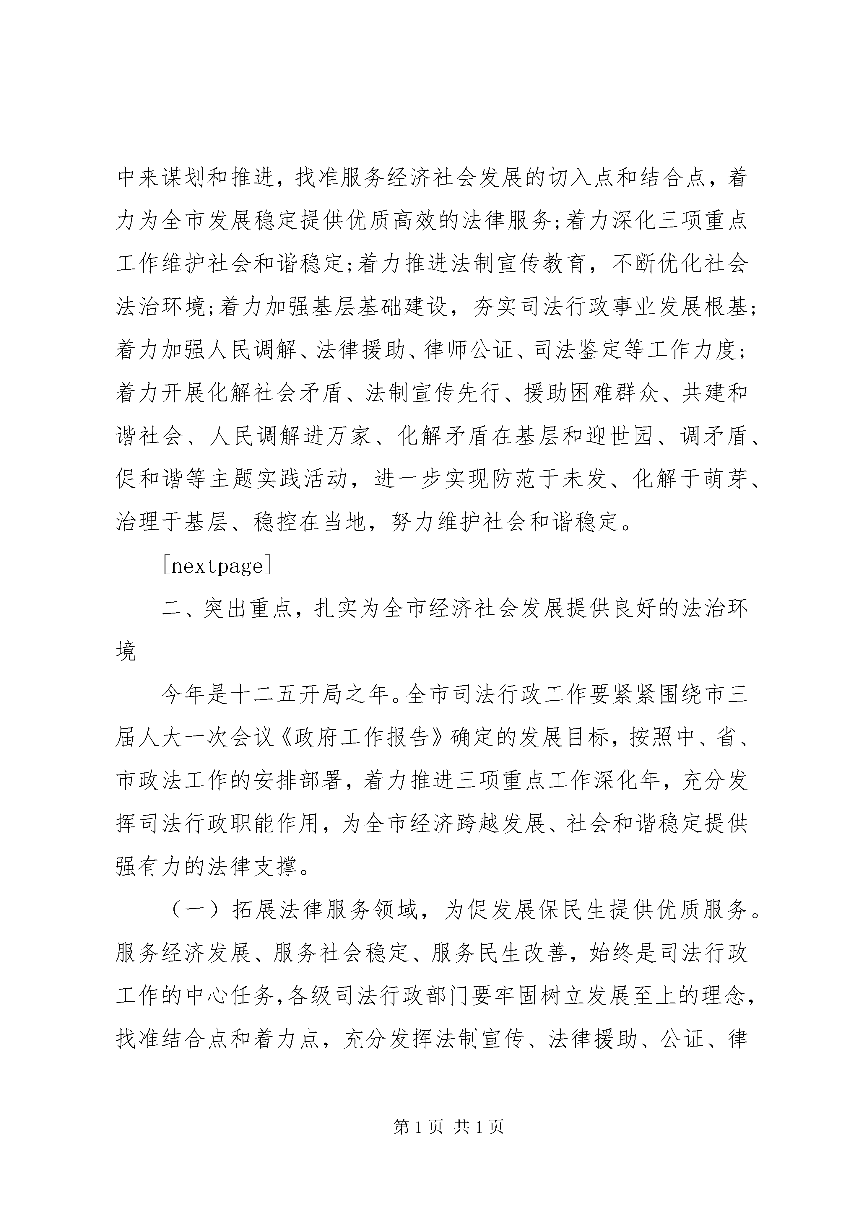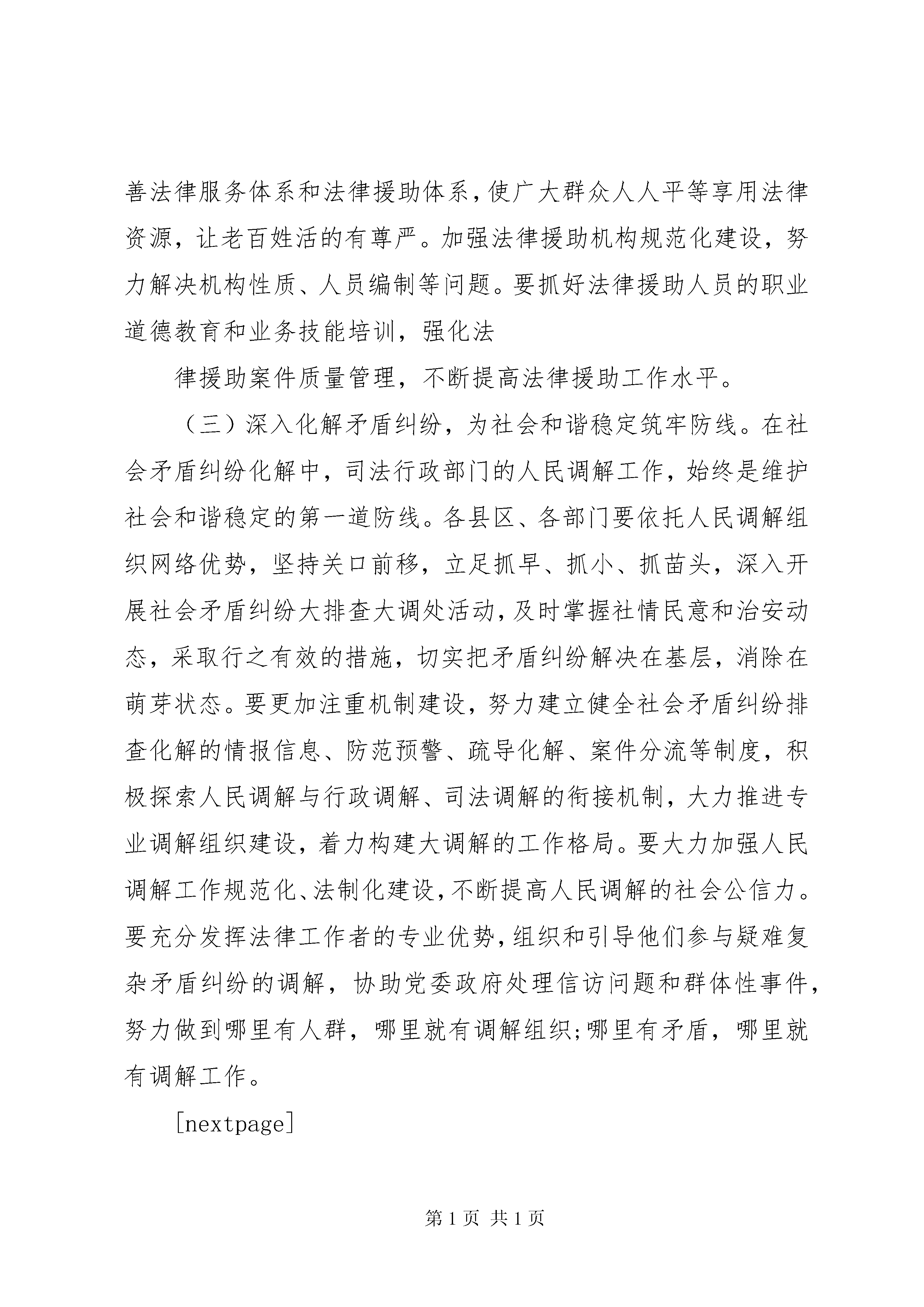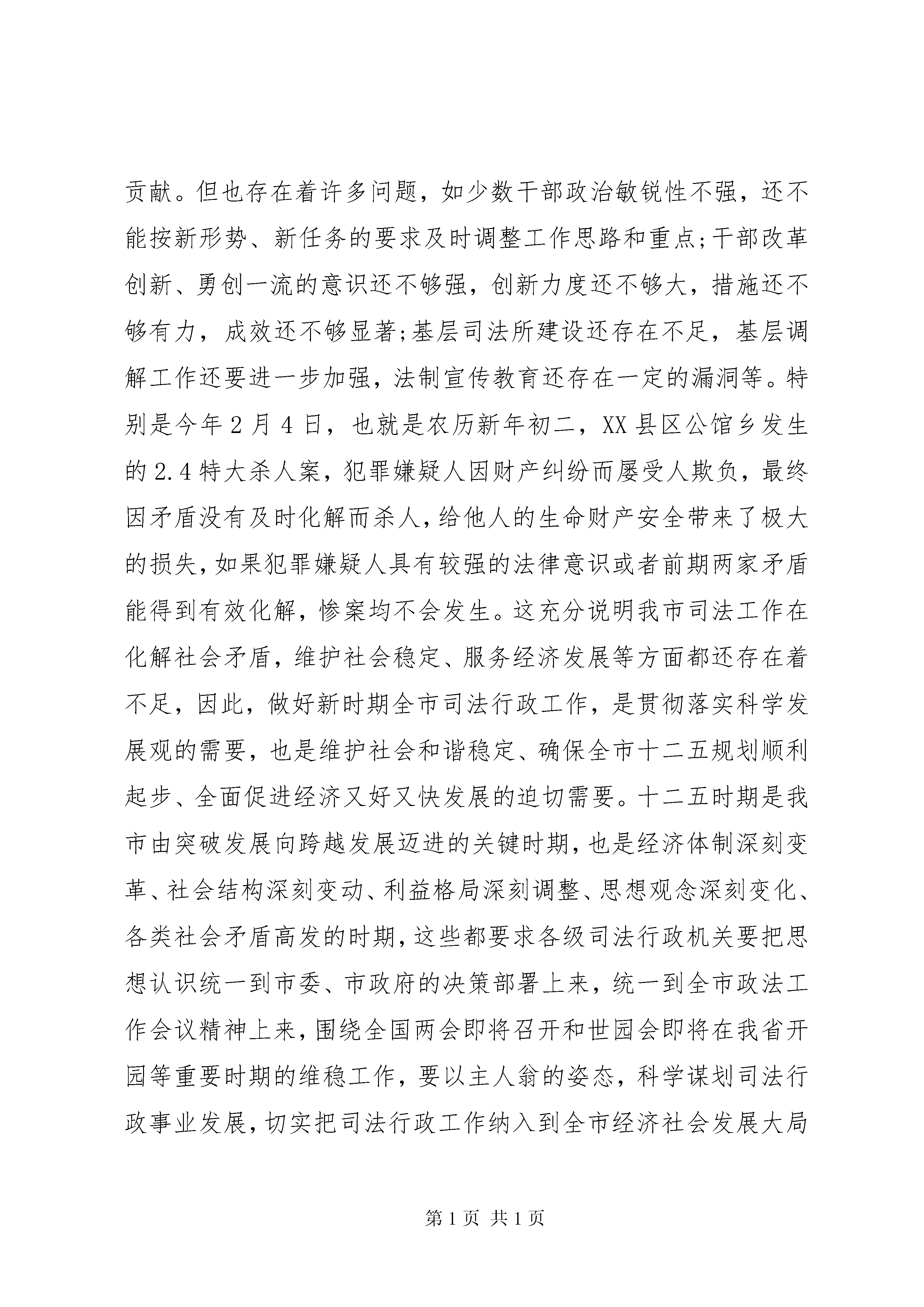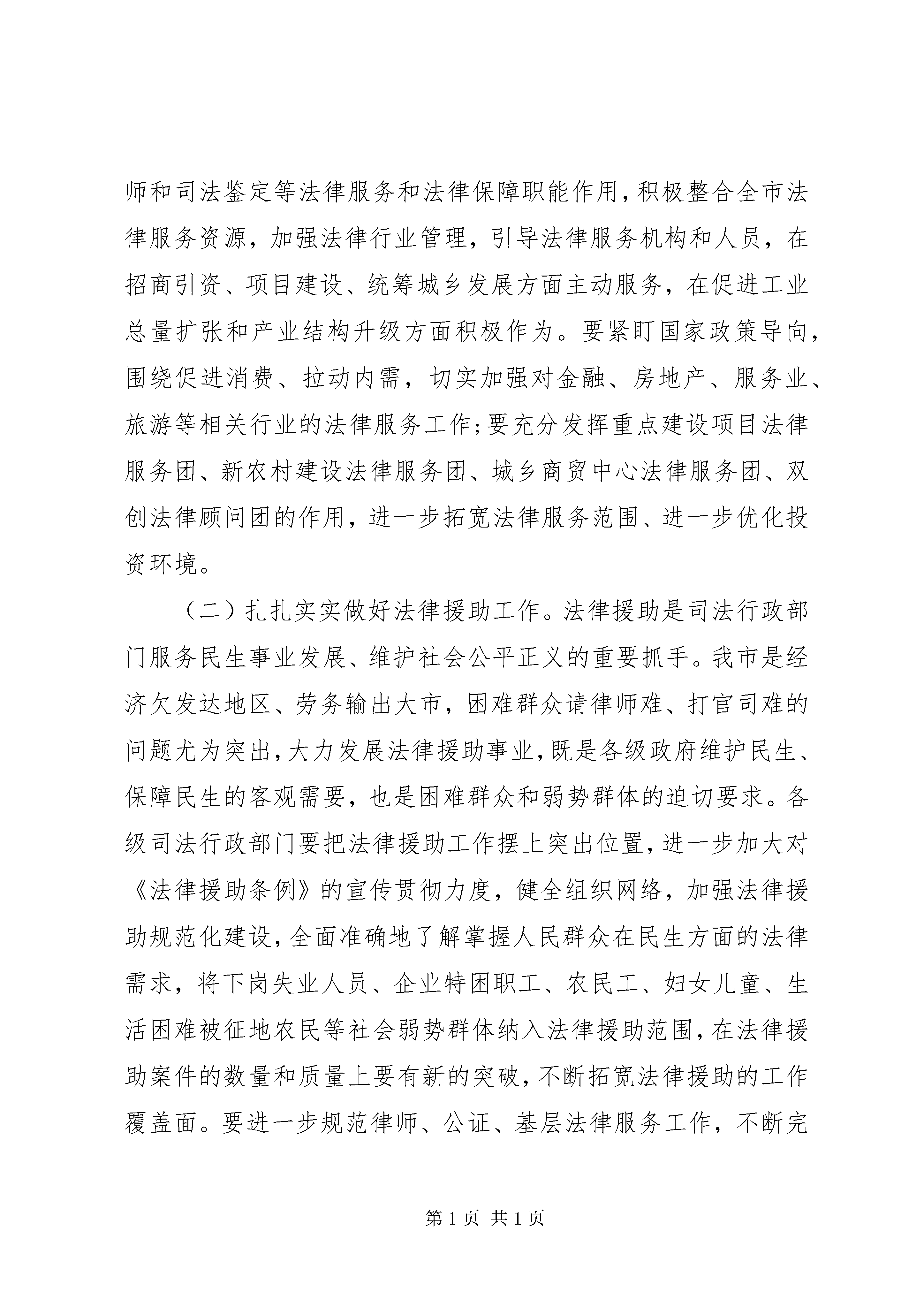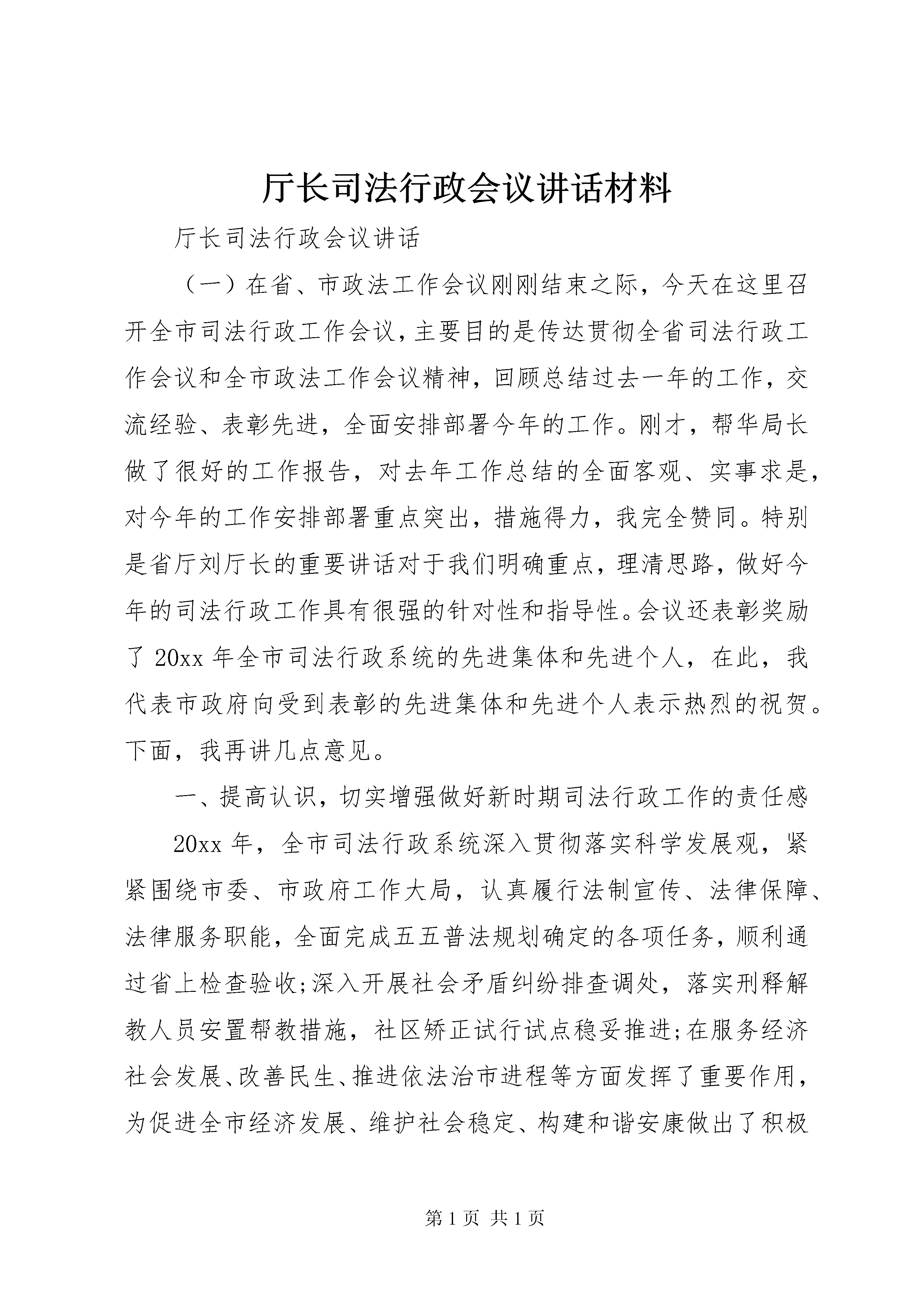 厅长司法行政会议讲话材料厅长司法行政会议讲话(一)在省、市政法工作会议刚刚结束之际,今天在这里召开全市司法行政工作会议,主要目的是传达贯彻全省司法行政工作会议和全市政法工作会议精神,回顾总结过去一年的工作,交流经验、表彰先进,全面安排部署今年的工作。刚才,帮华局长做了很好的工作报告,对去年工作总结的全面客观、实事求是,对今年的工作安排部署重点突出,措施得力,我完全赞同。特别是省厅刘厅长的重要讲话对于我们明确重点,理清思路,做好今年的司法行政工作具有很强的针对性和指导性。会议还表彰奖励了20xx年全市司法行政系统的先进集体和先进个人,在此,我代表市政府向受到表彰的先进集体和先进个人表示热烈的祝贺。下面,我再讲几点意见。一、提高认识,切实增强做好新时期司法行政工作的责任感20xx年,全市司法行政系统深入贯彻落实科学发展观,紧紧围绕市委、市政府工作大局,认真履行法制宣传、法律保障、法律服务职能,全面完成五五普法规划确定的各项任务,顺利通过省上检查验收;深入开展社会矛盾纠纷排查调处,落实刑释解教人员安置帮教措施,社区矫正试行试点稳妥推进;在服务经济社会发展、改善民生、推进依法治市进程等方面发挥了重要作用,为促进全市经济发展、维护社会稳定、构建和谐安康做出了积极贡献。但也存在着许多问题,如少数干部政治敏锐性不强,还不能按新形势、新任务的要求及时调整工作思路和重点;干部改革创新、勇创一流的意识还不够强,创新力度还不够大,措施还不够有力,成效还不够显著;基层司法所建设还存在不足,基层调解工作还要进一步加强,法制宣传教育还存在一定的漏洞等。特别是今年2月4日,也就是农历新年初二,XX县区公馆乡发生的2.4特大杀人案,犯罪嫌疑人因财产纠纷而屡受人欺负,最终因矛盾没有及时化解而杀人,给他人的生命财产安全带来了极大的损失,如果犯罪嫌疑人具有较强的法律意识或者前期两家矛盾能得到有效化解,惨案均不会发生。这充分说明我市司法工作在化解社会矛盾,维护社会稳定、服务经济发展等方面都还存在着不足,因此,做好新时期全市司法行政工作,是贯彻落实科学发展观的需要,也是维护社会和谐稳定、确保全市十二五规划顺利起步、全面促进经济又好又快发展的迫切需要。十二五时期是我市由突破发展向跨越发展迈进的关键时期,也是经济体制深刻变革、社会结构深刻变动、利益格局深刻调整、思想观念深刻变化、各类社会矛盾高发的时期,这些都要求各级司法行政机关要把思想认识统一到市委、市政府的决策部署上来,统一到全市政法工作会议精神上来,围绕全国两会即将召开和世园会即将在我省开园等重要时期的维稳工作,要以主人翁的姿态,科学谋划司法行政事业发展,切实把司法行政工作纳入到全市经济社会发展大局中来谋划和推进,找准服务经济社会发展的切入点和结合点,着力为全市发展稳定提供优质高效的法律服务;着力深化三项重点工作维护社会和谐稳定;着力推进法制宣传教育,不断优化社会法治环境;着力加强基层基础建设,夯实司法行政事业发展根基;着力加强人民调解、法律援助、律师公证、司法鉴定等工作力度;着力开展化解社会矛盾、法制宣传先行、援助困难群众、共建和谐社会、人民调解进万家、化解矛盾在基层和迎世园、调矛盾、促和谐等主题实践活动,进一步实现防范于未发、化解于萌芽、治理于基层、稳控在当地,努力维护社会和谐稳定。[nextpage]二、突出重点,扎实为全市经济社会发展提供良好的法治环境今年是十二五开局之年。全市司法行政工作要紧紧围绕市三届人大一次会议《政府工作报告》确定的发展目标,按照中、省、市政法工作的安排部署,着力推进三项重点工作深化年,充分发挥司法行政职能作用,为全市经济跨越发展、社会和谐稳定提供强有力的法律支撑。(一)拓展法律服务领域,为促发展保民生提供优质服务。服务经济发展、服务社会稳定、服务民生改善,始终是司法行政工作的中心任务,各级司法行政部门要牢固树立发展至上的理念,找准结合点和着力点,充分发挥法制宣传、法律援助、公证、律师和司法鉴定等法律服务和法律保障职能作用,积极整合全市法律服务资源,加强法律行业管理,引导法律服务机构和人员,在招商引资、项目建设、统筹城乡发展方面主动服务,在促进工业总量扩张和产业结构升级方面积极作为。要紧盯国家政策导向,围绕促进消费、拉动内需,切实加强对金融、房地产、服务业、旅游等相关行业的法律服务工作;要充分发挥重点建设项目法律服务团、新农村建设法律服务团、城乡商贸中心法律服务团、双创法律顾问团的作用,进一步拓宽法律服务范围、进一步优化投资环境。(二)扎扎实实做好法律援助工作。法律援助是司法行政部门服务民生事业发展、维护社会公平正义的重要抓手。我市是经济欠发达地区、劳务输出大市,困难群众请律师难、打官司难的问题尤为突出,大力发展法律援助事业,既是各级政府维护民生、保障民生的客观