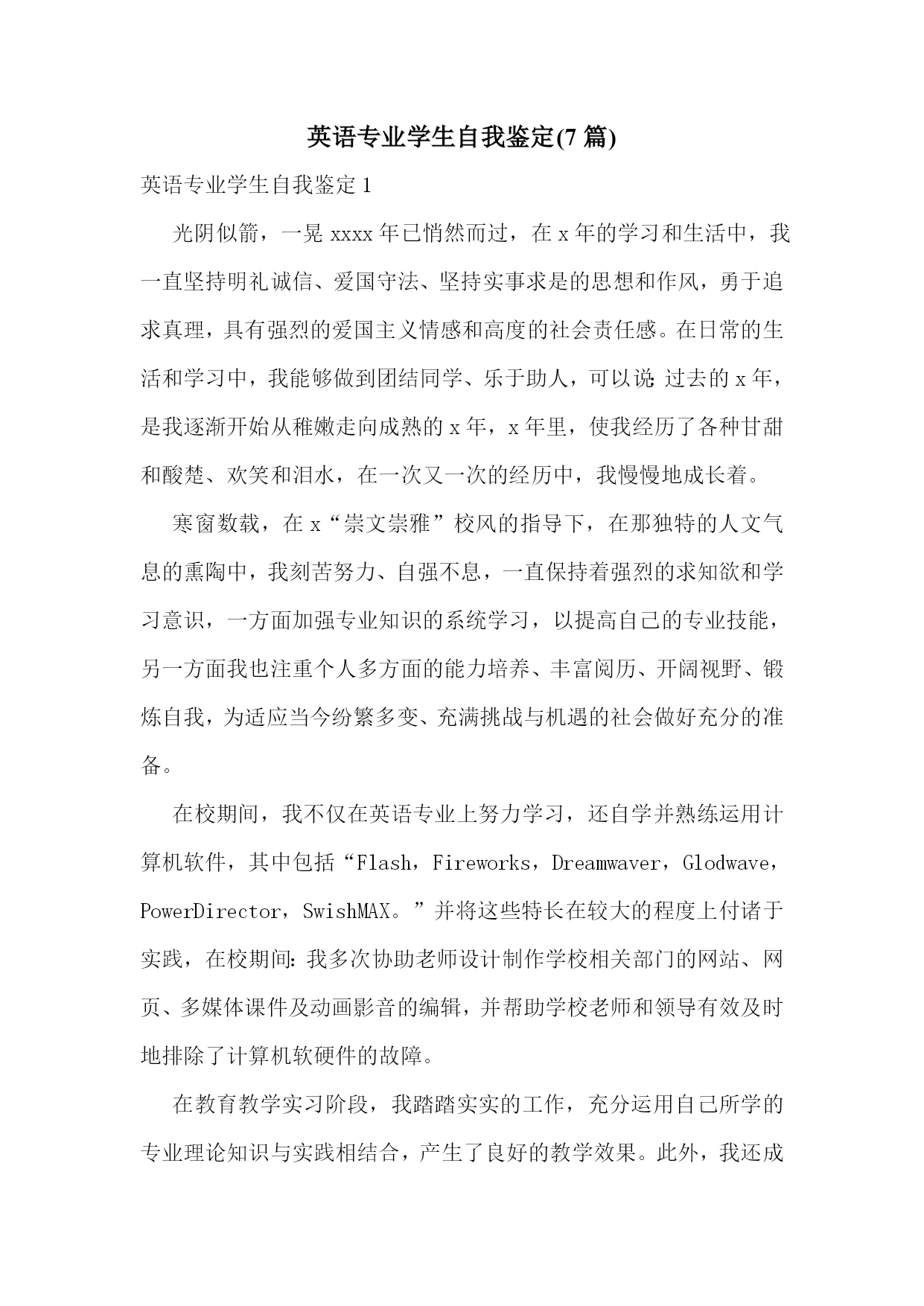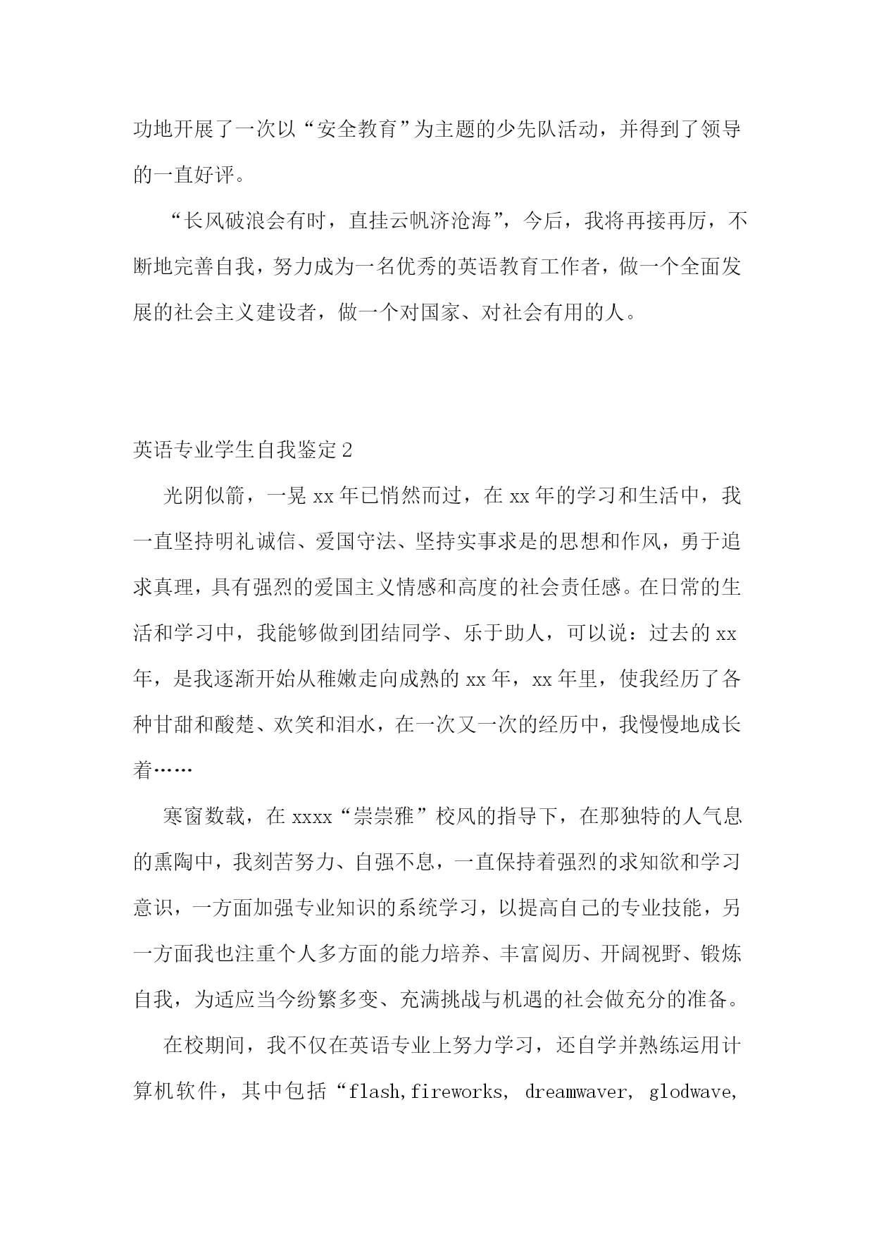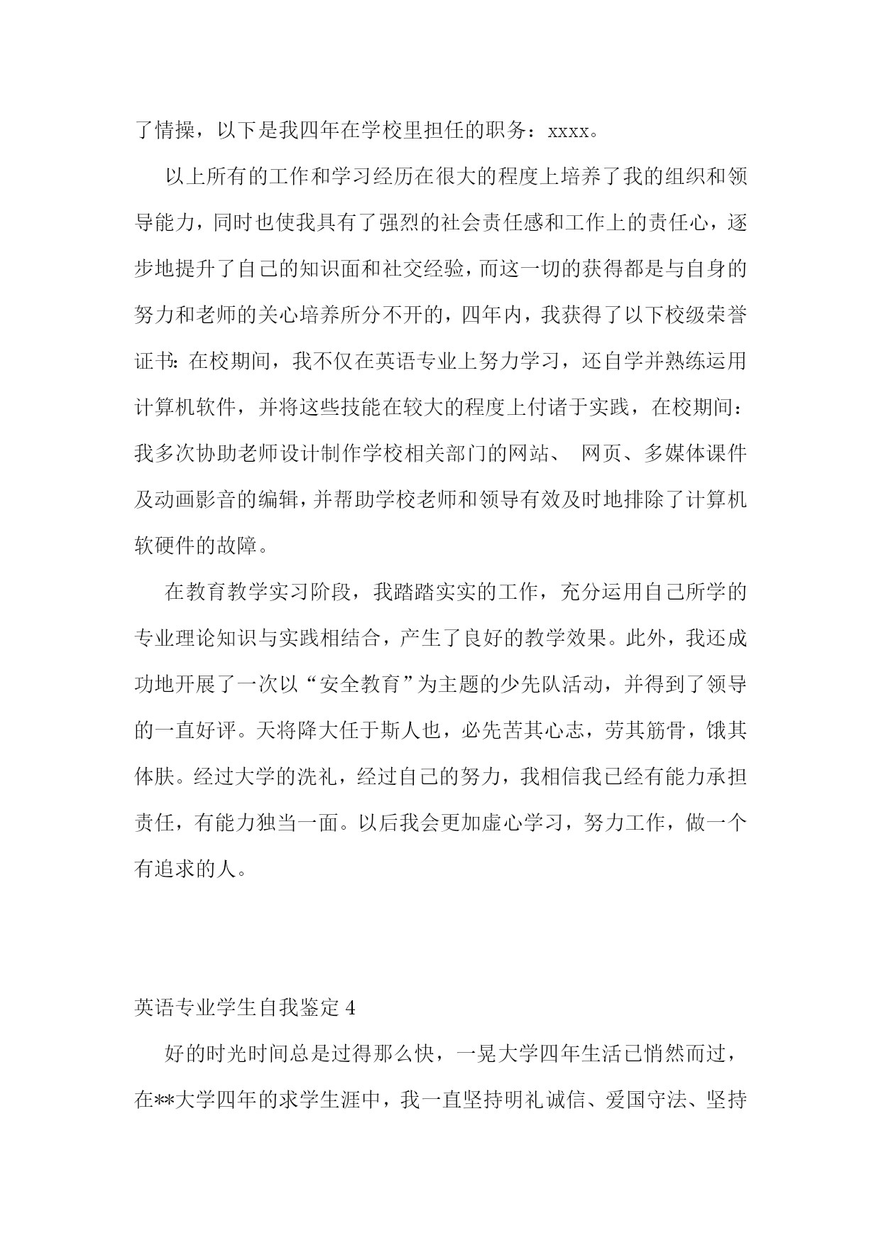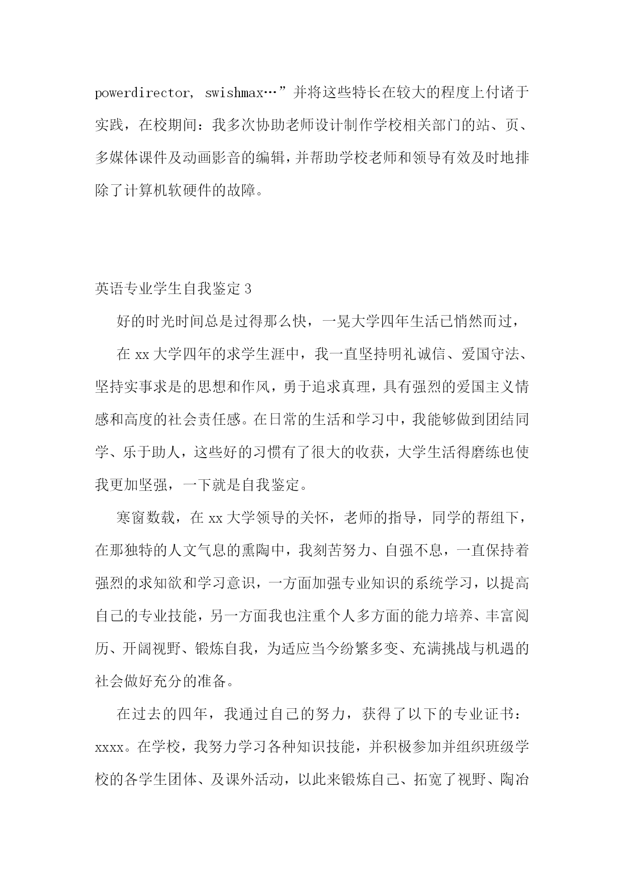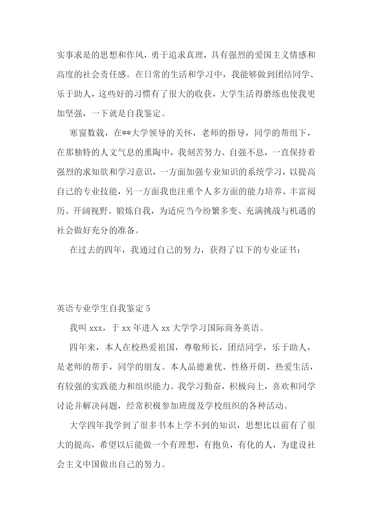 英语专业学生自我鉴定(7篇) 英语专业学生自我鉴定1 光阴似箭,一晃xxxx年已悄然而过,在x年的学习和生活中,我一直坚持明礼诚信、爱国守法、坚持实事求是的思想和作风,勇于追求真理,具有强烈的爱国主义情感和高度的社会责任感。在日常的生活和学习中,我能够做到团结同学、乐于助人,可以说:过去的x年,是我逐渐开始从稚嫩走向成熟的x年,x年里,使我经历了各种甘甜和酸楚、欢笑和泪水,在一次又一次的经历中,我慢慢地成长着。 寒窗数载,在x“崇文崇雅”校风的指导下,在那独特的人文气息的熏陶中,我刻苦努力、自强不息,一直保持着强烈的求知欲和学习意识,一方面加强专业知识的系统学习,以提高自己的专业技能,另一方面我也注重个人多方面的能力培养、丰富阅历、开阔视野、锻炼自我,为适应当今纷繁多变、充满挑战与机遇的社会做好充分的准备。 在校期间,我不仅在英语专业上努力学习,还自学并熟练运用计算机软件,其中包括“Flash,Fireworks,Dreamwaver,Glodwave,PowerDirector,SwishMAX。”并将这些特长在较大的程度上付诸于实践,在校期间:我多次协助老师设计制作学校相关部门的网站、网页、多媒体课件及动画影音的编辑,并帮助学校老师和领导有效及时地排除了计算机软硬件的故障。 在教育教学实习阶段,我踏踏实实的工作,充分运用自己所学的专业理论知识与实践相结合,产生了良好的教学效果。此外,我还成功地开展了一次以“安全教育”为主题的少先队活动,并得到了领导的一直好评。 “长风破浪会有时,直挂云帆济沧海”,今后,我将再接再厉,不断地完善自我,努力成为一名优秀的英语教育工作者,做一个全面发展的社会主义建设者,做一个对国家、对社会有用的人。 英语专业学生自我鉴定2 光阴似箭,一晃xx年已悄然而过,在xx年的学习和生活中,我一直坚持明礼诚信、爱国守法、坚持实事求是的思想和作风,勇于追求真理,具有强烈的爱国主义情感和高度的社会责任感。在日常的生活和学习中,我能够做到团结同学、乐于助人,可以说:过去的xx年,是我逐渐开始从稚嫩走向成熟的xx年,xx年里,使我经历了各种甘甜和酸楚、欢笑和泪水,在一次又一次的经历中,我慢慢地成长着…… 寒窗数载,在xxxx“崇崇雅”校风的指导下,在那独特的人气息的熏陶中,我刻苦努力、自强不息,一直保持着强烈的求知欲和学习意识,一方面加强专业知识的系统学习,以提高自己的专业技能,另一方面我也注重个人多方面的能力培养、丰富阅历、开阔视野、锻炼自我,为适应当今纷繁多变、充满挑战与机遇的社会做充分的准备。 在校期间,我不仅在英语专业上努力学习,还自学并熟练运用计算机软件,其中包括“flash,fireworks,dreamwaver,glodwave,powerdirector,swishmax…”并将这些特长在较大的程度上付诸于实践,在校期间:我多次协助老师设计制作学校相关部门的站、页、多媒体课件及动画影音的编辑,并帮助学校老师和领导有效及时地排除了计算机软硬件的故障。 英语专业学生自我鉴定3 好的时光时间总是过得那么快,一晃大学四年生活已悄然而过, 在xx大学四年的求学生涯中,我一直坚持明礼诚信、爱国守法、坚持实事求是的思想和作风,勇于追求真理,具有强烈的爱国主义情感和高度的社会责任感。在日常的生活和学习中,我能够做到团结同学、乐于助人,这些好的习惯有了很大的收获,大学生活得磨练也使我更加坚强,一下就是自我鉴定。 寒窗数载,在xx大学领导的关怀,老师的指导,同学的帮组下,在那独特的人文气息的熏陶中,我刻苦努力、自强不息,一直保持着强烈的求知欲和学习意识,一方面加强专业知识的系统学习,以提高自己的专业技能,另一方面我也注重个人多方面的能力培养、丰富阅历、开阔视野、锻炼自我,为适应当今纷繁多变、充满挑战与机遇的社会做好充分的准备。 在过去的四年,我通过自己的努力,获得了以下的专业证书:xxxx。在学校,我努力学习各种知识技能,并积极参加并组织班级学校的各学生团体、及课外活动,以此来锻炼自己、拓宽了视野、陶冶了情操,以下是我四年在学校里担任的职务:xxxx。 以上所有的工作和学习经历在很大的程度上培养了我的组织和领导能力,同时也使我具有了强烈的社会责任感和工作上的责任心,逐步地提升了自己的知识面和社交经验,而这一切的获得都是与自身的努力和老师的关心培养所分不开的,四年内,我获得了以下校级荣誉证书:在校期间,我不仅在英语专业上努力学习,还自学并熟练运用计算机软件,并将这些技能在较大的程度上付诸于实践,在校期间:我多次协助老师设计制作学校相关部门的网站、网页、多媒体课件及动画影音的编辑,并帮助学校老师和领导有效及时地排除了计算机软硬件的故障。 在教育教学实习阶段,我踏踏实实的工作,充分运用自己所学的专业理论知识与实践相