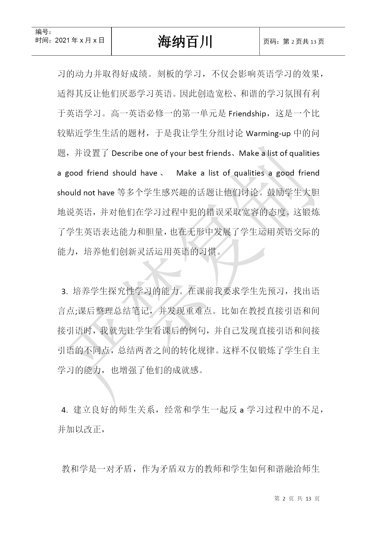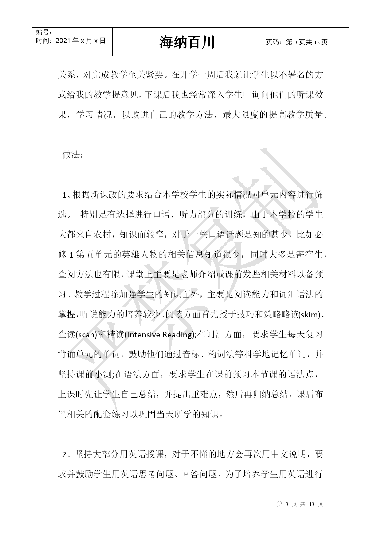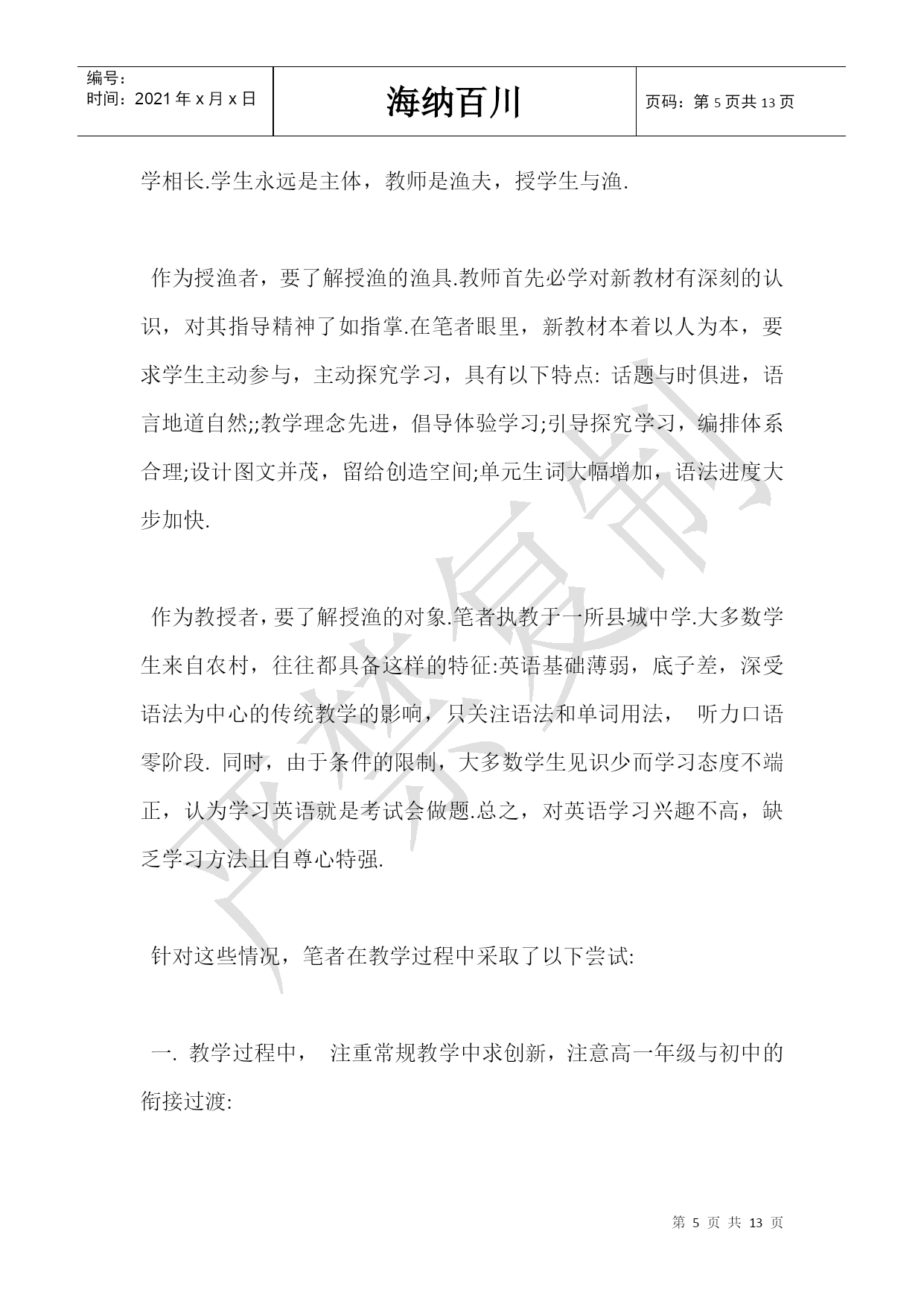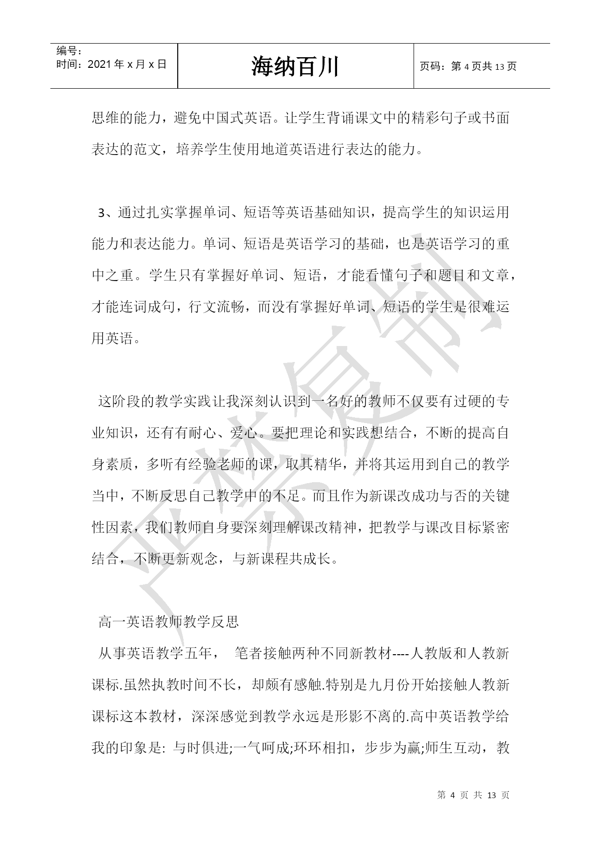 编号: 时间:2021年x月x日 海纳百川页码:第页共NUMPAGES13页 第PAGE\*MERGEFORMAT13页共NUMPAGES\*MERGEFORMAT13页 高一英语教师教学反思 高中新课程改革,这对我们来说既是机遇,又是挑战,新课改强调课程教学要促进每个学生身心健康的发展,培养学生良好的品质的终身学习的能力;新课改倡导建设性学习,注重科学探究的学习,提倡交流与合作、自主创新学习。这对教师的教学能力提出了更高的要求。 体会: 1.面向全体学生,满足不同的需求,为学生全面发展和终身发展奠定基础。学生在学习中存在智力、兴趣性格、态度、语言基础能力、学习方式等方面的差异,因此在教学中我根据不同学生个体的差异,对他们提出不同的要求。比如对差生,我尽量用难度较易的问题问他们,尽量让他们回答有把握的问题,当他们回答正确时我总会说Verygood,如果回答错误我也会说Thankyouallthesame.Itdoesntmatter.这样他们会因为得到鼓励而信心大增,加强了参与意识,逐渐消除畏惧心理。而对较好一点的学生,我则对他们提高要求,如单词小测的错误率不得超过20%,课后要多做题,增加阅读量等。 2.创造宽松、和谐的气氛。在教学过程中,注重与学生沟通,让学生消除对英语学习的恐惧感,只有对英语感兴趣,才能保持英语学习的动力并取得好成绩。刻板的学习,不仅会影响英语学习的效果,适得其反让他们厌恶学习英语。因此创造宽松、和谐的学习氛围有利于英语学习。高一英语必修一的第一单元是Friendship,这是一个比较贴近学生生活的题材,于是我让学生分组讨论Warming-up中的问题,并设置了Describeoneofyourbestfriends、Makealistofqualitiesagoodfriendshouldhave、Makealistofqualitiesagoodfriendshouldnothave等多个学生感兴趣的话题让他们讨论。鼓励学生大胆地说英语,并对他们在学习过程中犯的错误采取宽容的态度。这锻炼了学生英语表达能力和胆量,也在无形中发展了学生运用英语交际的能力,培养他们创新灵活运用英语的习惯。 3.培养学生探究性学习的能力。在课前我要求学生先预习,找出语言点;课后整理总结笔记,并发现重难点。比如在教授直接引语和间接引语时,我就先让学生看课后的例句,并自己发现直接引语和间接引语的不同点,总结两者之间的转化规律。这样不仅锻炼了学生自主学习的能力,也增强了他们的成就感。 4.建立良好的师生关系,经常和学生一起反a学习过程中的不足,并加以改正, 教和学是一对矛盾,作为矛盾双方的教师和学生如何和谐融洽师生关系,对完成教学至关紧要。在开学一周后我就让学生以不署名的方式给我的教学提意见,下课后我也经常深入学生中询问他们的听课效果,学习情况,以改进自己的教学方法,最大限度的提高教学质量。 做法: 1、根据新课改的要求结合本学校学生的实际情况对单元内容进行筛选。特别是有选择进行口语、听力部分的训练,由于本学校的学生大都来自农村,知识面较窄,对于一些口语话题是知的甚少,比如必修1第五单元的英雄人物的相关信息知道很少,同时大多是寄宿生,查阅方法也有限,课堂上主要是老师介绍或课前发些相关材料以备预习。教学过程除加强学生的知识面外,主要是阅读能力和词汇语法的掌握,听说能力的培养较少。阅读方面首先授于技巧和策略略读(skim)、查读(scan)和精读(IntensiveReading);在词汇方面,要求学生每天复习背诵单元的单词,鼓励他们通过音标、构词法等科学地记忆单词,并坚持课前小测;在语法方面,要求学生在课前预习本节课的语法点,上课时先让学生自己总结,并提出重难点,然后再归纳总结,课后布置相关的配套练习以巩固当天所学的知识。 2、坚持大部分用英语授课,对于不懂的地方会再次用中文说明,要求并鼓励学生用英语思考问题、回答问题。为了培养学生用英语进行思维的能力,避免中国式英语。让学生背诵课文中的精彩句子或书面表达的范文,培养学生使用地道英语进行表达的能力。 3、通过扎实掌握单词、短语等英语基础知识,提高学生的知识运用能力和表达能力。单词、短语是英语学习的基础,也是英语学习的重中之重。学生只有掌握好单词、短语,才能看懂句子和题目和文章,才能连词成句,行文流畅,而没有掌握好单词、短语的学生是很难运用英语。 这阶段的教学实践让我深刻认识到一名好的教师不仅要有过硬的专业知识,还有有耐心、爱心。要把理论和实践想结合,不断的提高自身素质,多听有经验老师的课,取其精华,并将其运用到自己的教学当中,不断反思自己教学中的不足。而且作为新课改成功与否的关键性因素,我们教师自身要深刻理解课改精神,把教学与课改目标紧密结