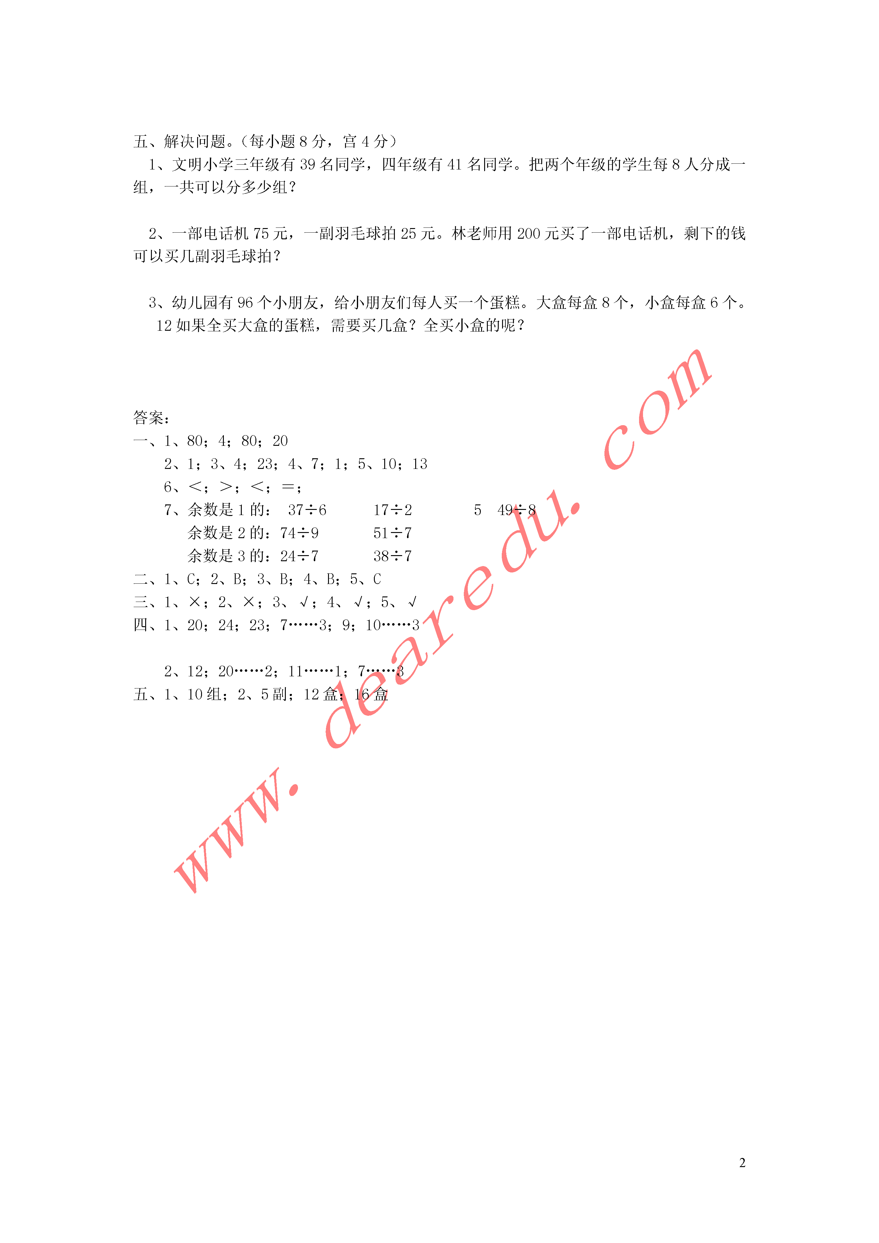 2有余数的除法单元测试题一、认真填空。(第7题9分,其余每空1分,共24分)1、80÷4表示把()平均分成()份,也就是()里有4个()。2、200÷4商的末尾有()个0.3、○÷□=5……3,□最小是(),○最小是()。4、一个两位数除以8,如果有余数,其中最大的余数是(),最小的余数是()。5、水果店运来40千克苹果,如果每4千克装在一个篮子里,需要()个篮子才能装完这些苹果。如果是50千克苹果,需要()个篮子才能装完这些苹果。6、在○里填上“>”、“<”或“=”。54÷6○1068÷2○58÷272÷6○72÷499÷9○117、按要求将下面式子分类。24÷737÷674÷917÷238÷751÷749÷8二、慎重选择。(每小题3分,共15分)1、右面除法算式中,商的个位上是0的算式是()。A.86÷3B.76÷6C.54÷52、●■◆▲●■◆▲●■◆▲……按图形依次排列,第22个图形是()。A.▲B.■C.◆3、除数是一位数,商是9,余数是8,被除数是()。A.98B.89C.804、三(1)班35名同学在水上公园坐船游玩,每条船最多可以乘坐8人,至少需要乘坐()条船。A.6B.5C.45、如果□5÷6,商的最高位是1,那么,□里最小应该填()。A.5B.4C.6三、准确判断。(对的画“√”,错的画“×”)(每小题2分,共10分)1、32÷3,商的个位上是0.()2、64÷21=3……1,正确的验算方法是1×3+21()3、从72里连续减去8个9,正好减完。()4、□□÷□=12……1,除数共有7种可能。()5、36÷3÷2与36÷6的结果相等。()四、我是计算小能手。(共27分)1、直接写得数。(6分)60÷3=72÷3=46÷2=38÷5=72÷8=53÷5=2、列竖式计算。(带*号的要验算)(9分)84÷7=*62÷3=*78÷7=59÷8=五、解决问题。(每小题8分,宫4分)1、文明小学三年级有39名同学,四年级有41名同学。把两个年级的学生每8人分成一组,一共可以分多少组?2、一部电话机75元,一副羽毛球拍25元。林老师用200元买了一部电话机,剩下的钱可以买几副羽毛球拍?3、幼儿园有96个小朋友,给小朋友们每人买一个蛋糕。大盒每盒8个,小盒每盒6个。12如果全买大盒的蛋糕,需要买几盒?全买小盒的呢?答案:一、1、80;4;80;202、1;3、4;23;4、7;1;5、10;13<;>;<;=;余数是1的:37÷617÷2549÷8余数是2的:74÷951÷7余数是3的:24÷738÷7二、1、C;2、B;3、B;4、B;5、C三、1、×;2、×;3、√;4、√;5、√四、1、20;24;23;7……3;9;10……32、12;20……2;11……1;7……3五、1、10组;2、5副;12盒;16盒