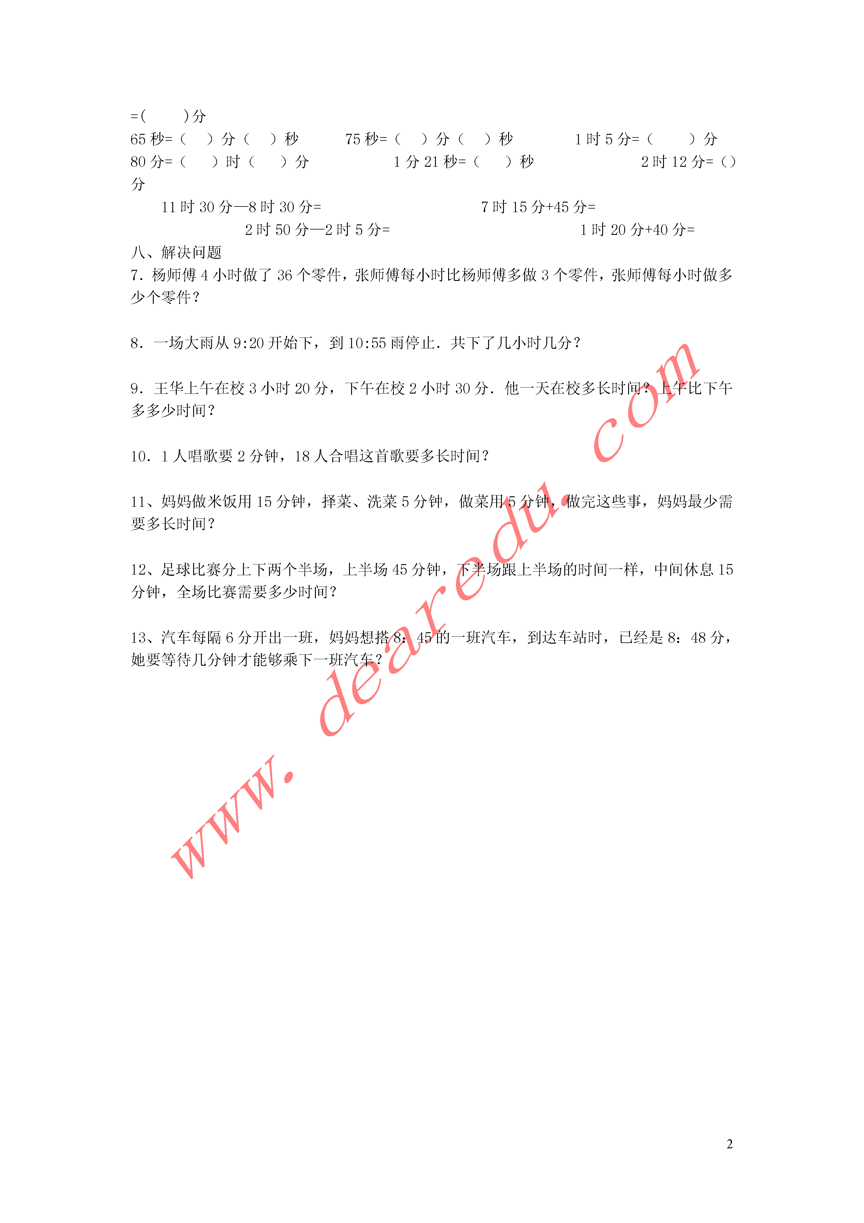 2时分秒的练习题一、在()里填上时间单位。7.从教室前面走到后面用了5()。夏天午睡大约1()。8.脉搏跳10次用了8()。跑100米需要13()。9.小红下午在学校的时间是2()。一集电视剧的播放时间是50()。10.小惠每天晚上睡觉9()。小芳早晨起床穿衣服大约用了5()。11.学生一天在校时间大约是6()。爷爷每天晨练1()。12.运动会上,小明跑60米用了12()。二、填空9.分针走半圈是()分,时针走半圈是()时,秒针走半圈是()秒。10.时针从12走到1,分钟走了()小格,是()分;秒针走60小格,分钟走了()小格,是()分。时针从()走到6,走了5小时。11.从8:40到9:30经过了()时()分;从2:30到4:40经过了()时()分;从6:10到6:45经过了()分。12.从上海开往南京的火车,甲车是6:50开,乙车是7:30开,()车开的早.13.小军每天6:20起床,小青每天6:25起床,()起床早.14.跑60米,小红用14秒,小英用12秒,小云用13秒.三人中()跑的最快.15.月亮每秒绕地球行8千米,地球绕太阳每秒行29千米.地球比月亮每秒多行()千米.16.声音每秒在空气中行332米,炮弹每秒比声音快667米,炮弹每秒飞行()米.三、比较大小1时()60分1分()100秒10分()1时4时()4分5分()50秒4时()300分200秒()4分400分()6时1时40分()100分150秒()2分30秒150秒()2分30秒五、选择题.(把正确答案的字母填在括号里)1.分针从一个数字走到下一个数字,经过的时间是().A.1分钟B.5分钟C.1小时2.秒针走一圈经过的时间是().A.1秒B.1分C.1小时3.小红1分钟写5个字,6分钟可以写()个字.A.6B.5C.304.第一节课在8时15分上课,8时50分下课.这节课上了().A.半小时B.35分C.40分5.工人小李和小王各做24个零件,小王用了6小时,小李用了8小时.()A.做的一样快B.小王做的快C.小李做的快六算一算,填一填1时=()分1分=()秒60秒=()分60分=()时118秒=()分()秒1分70秒=()秒1分12秒=()秒90分=()时()分100分=()时()分2小时=()分2分=()秒1时35分=()分65秒=()分()秒75秒=()分()秒1时5分=()分80分=()时()分1分21秒=()秒2时12分=()分11时30分—8时30分=7时15分+45分=2时50分—2时5分=1时20分+40分=八、解决问题7.杨师傅4小时做了36个零件,张师傅每小时比杨师傅多做3个零件,张师傅每小时做多少个零件?8.一场大雨从9:20开始下,到10:55雨停止.共下了几小时几分?9.王华上午在校3小时20分,下午在校2小时30分.他一天在校多长时间?上午比下午多多少时间?10.1人唱歌要2分钟,18人合唱这首歌要多长时间?11、妈妈做米饭用15分钟,择菜、洗菜5分钟,做菜用5分钟,做完这些事,妈妈最少需要多长时间?12、足球比赛分上下两个半场,上半场45分钟,下半场跟上半场的时间一样,中间休息15分钟,全场比赛需要多少时间?13、汽车每隔6分开出一班,妈妈想搭8:45的一班汽车,到达车站时,已经是8:48分,她要等待几分钟才能够乘下一班汽车?