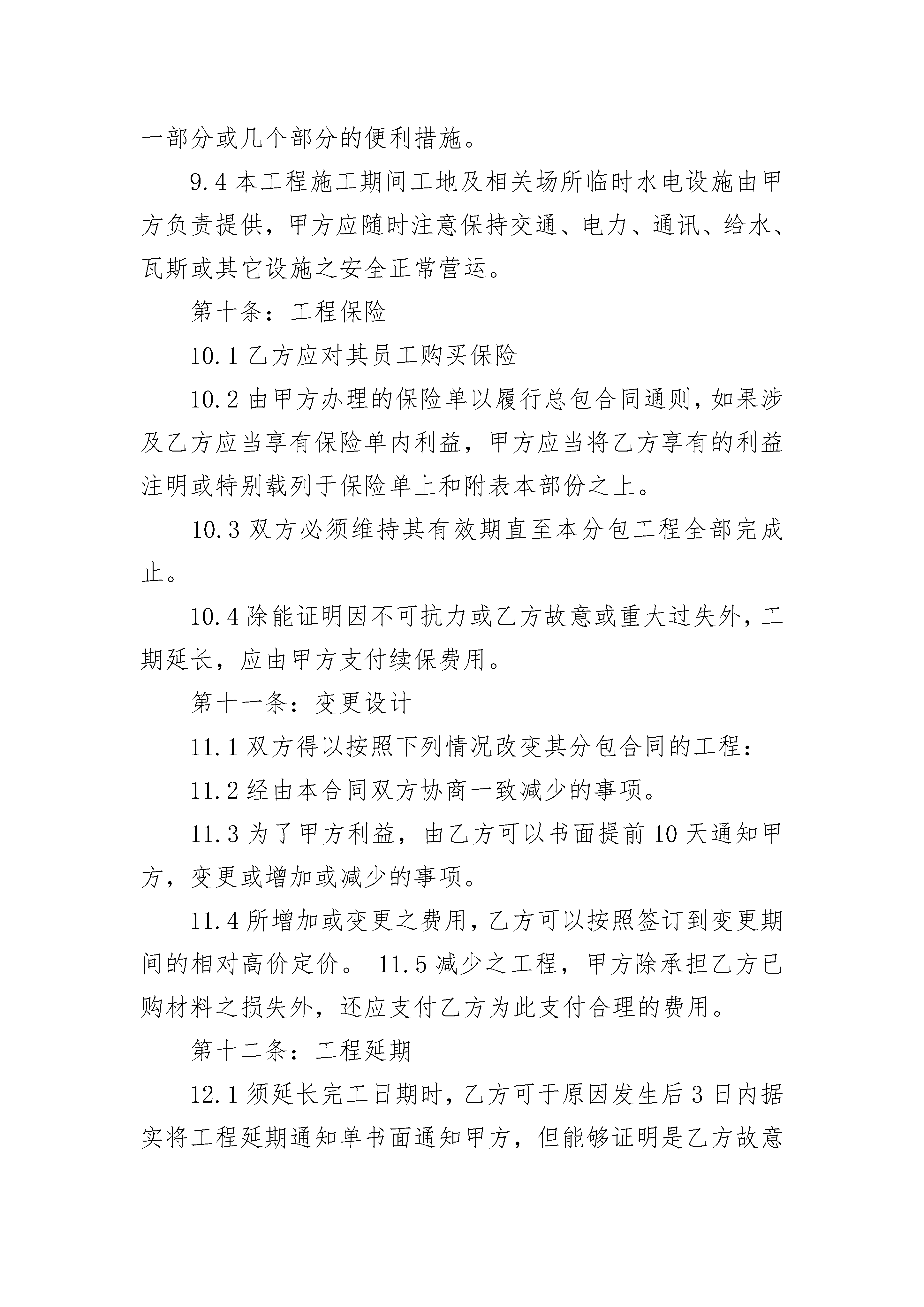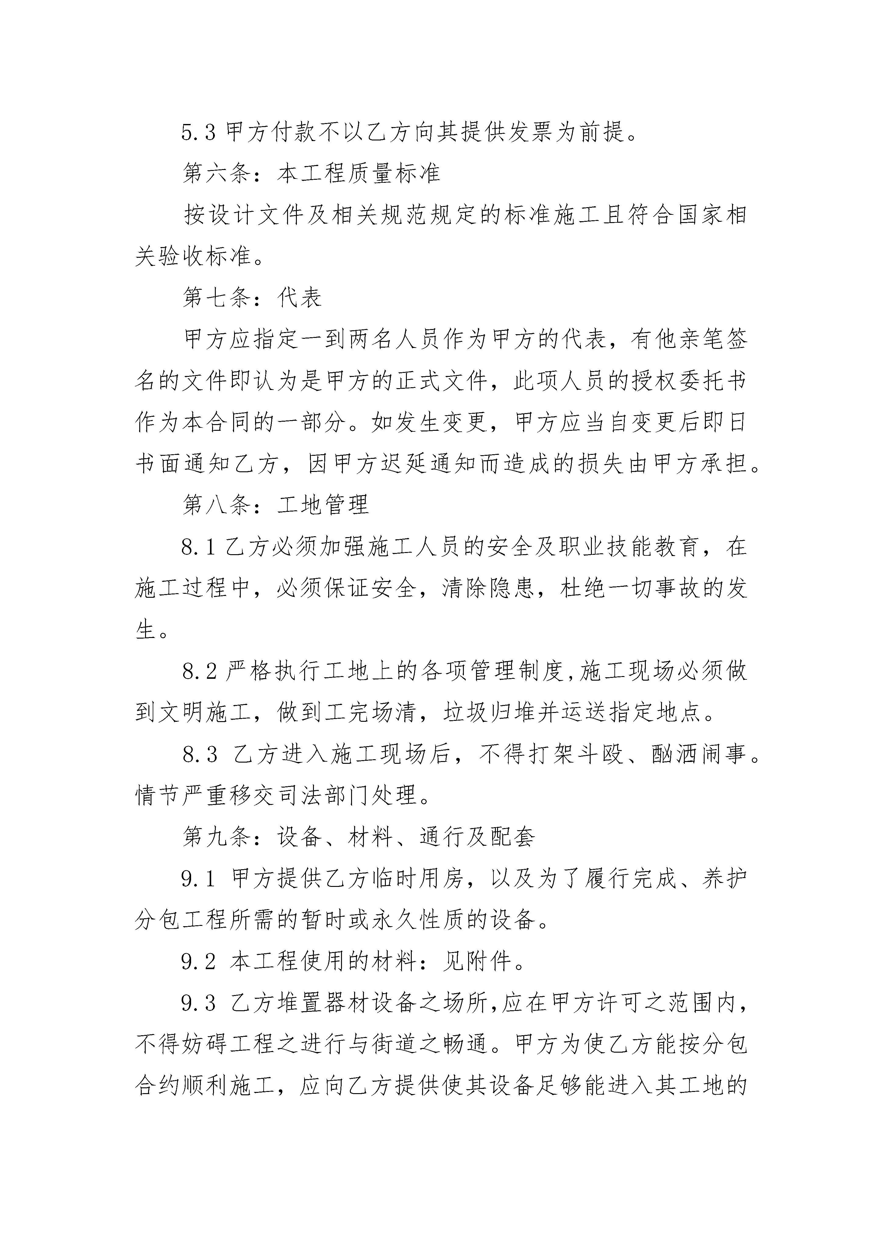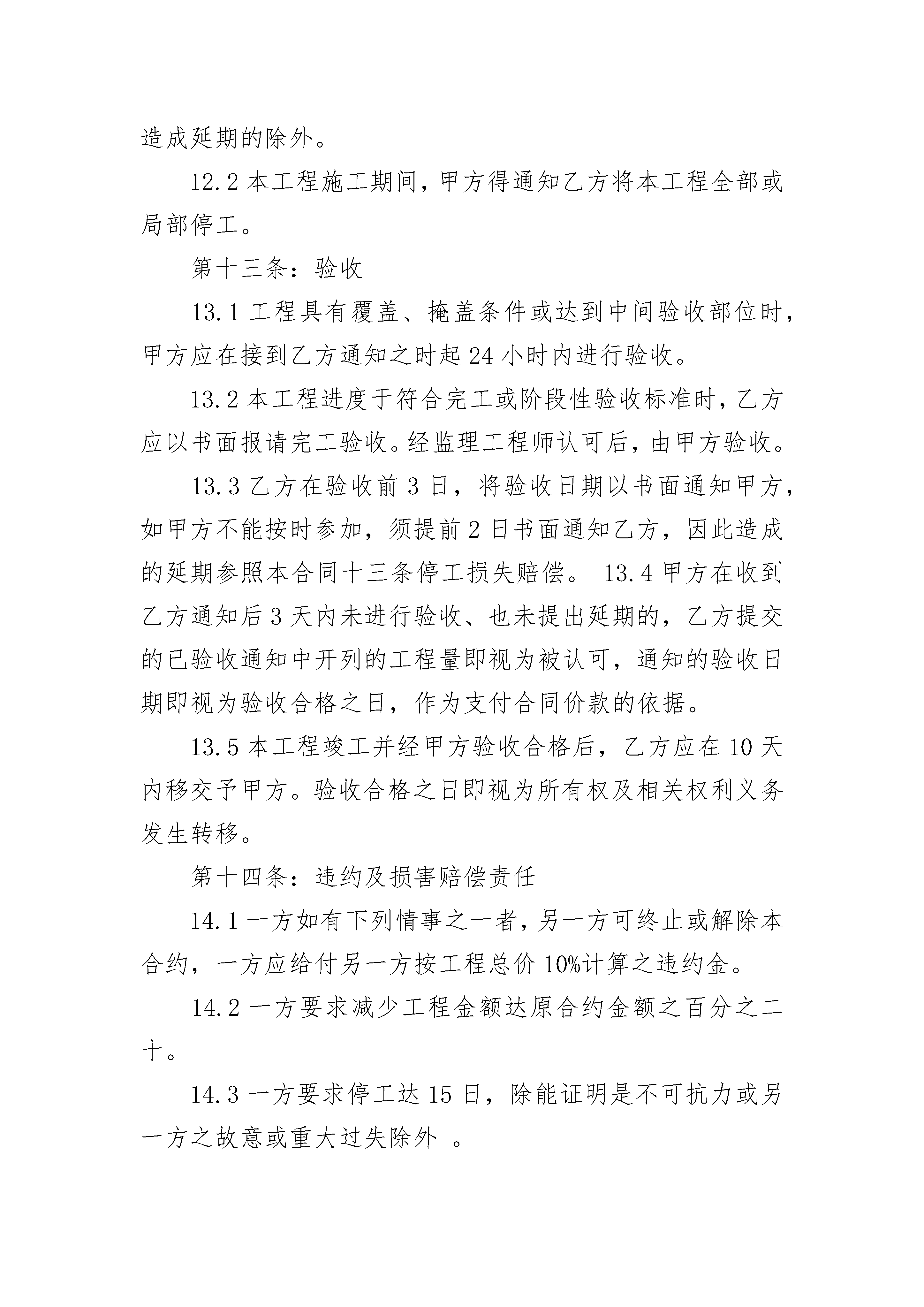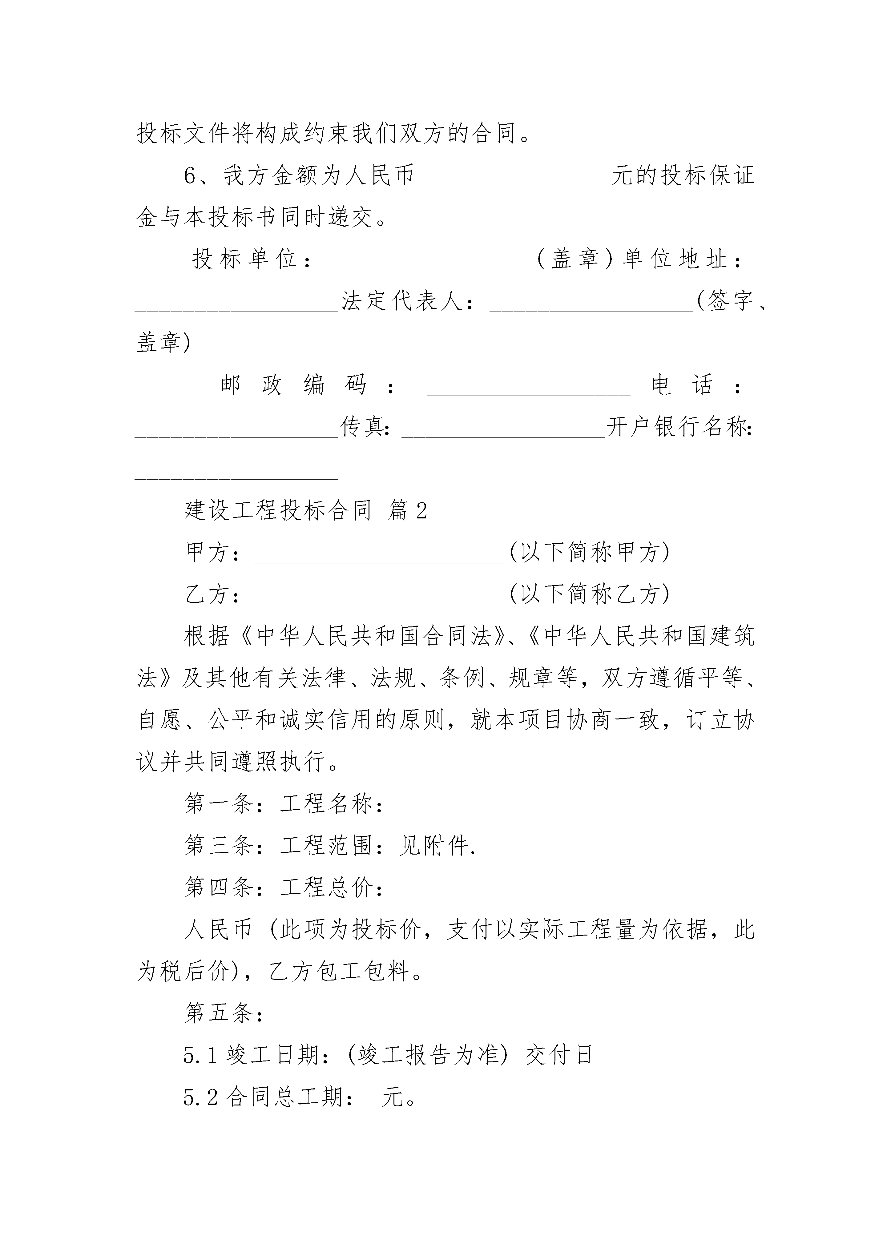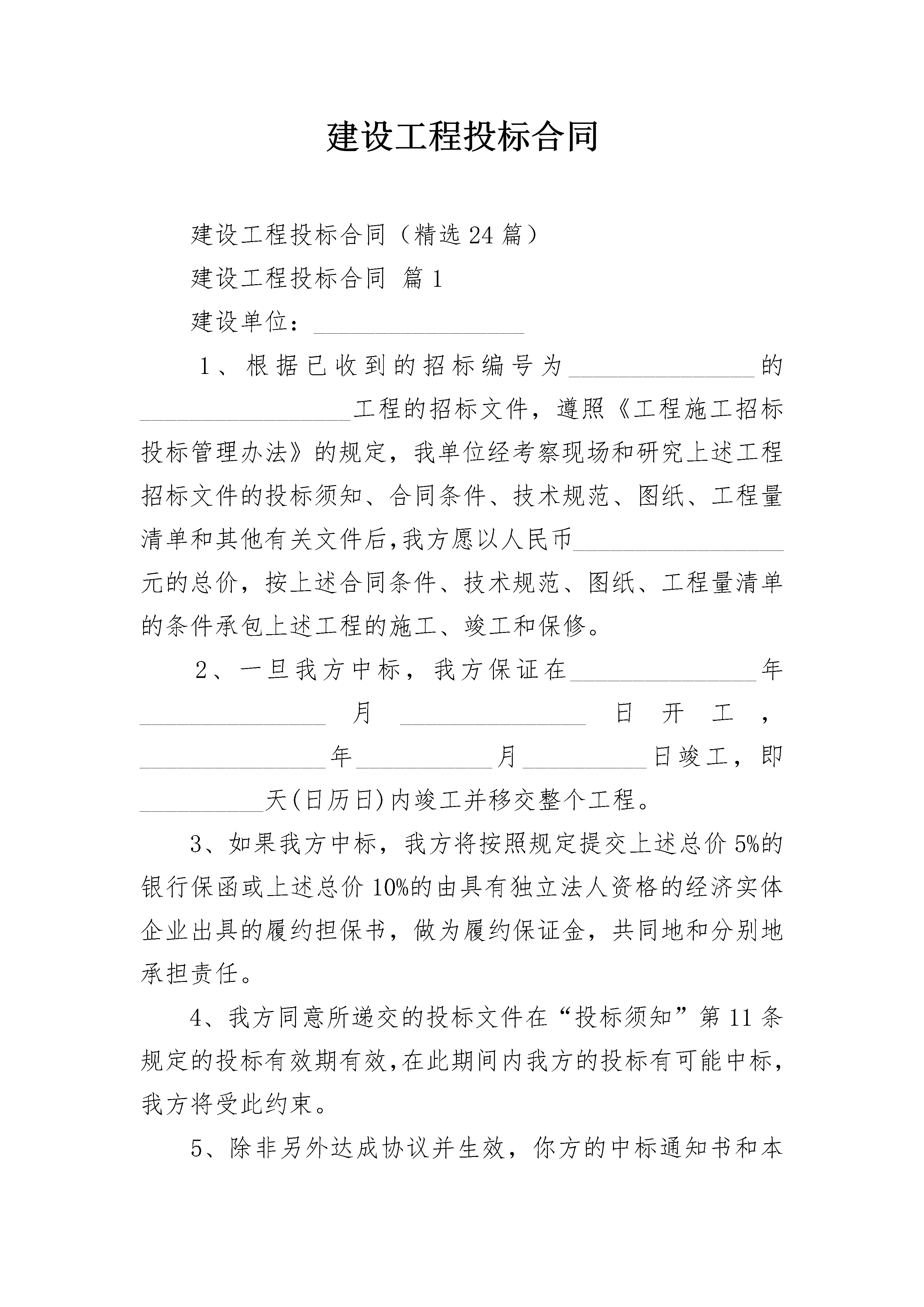 建设工程投标合同建设工程投标合同(精选24篇)建设工程投标合同篇1建设单位:_________________1、根据已收到的招标编号为_______________的_________________工程的招标文件,遵照《工程施工招标投标管理办法》的规定,我单位经考察现场和研究上述工程招标文件的投标须知、合同条件、技术规范、图纸、工程量清单和其他有关文件后,我方愿以人民币_________________元的总价,按上述合同条件、技术规范、图纸、工程量清单的条件承包上述工程的施工、竣工和保修。2、一旦我方中标,我方保证在_______________年_______________月_______________日开工,_______________年___________月__________日竣工,即__________天(日历日)内竣工并移交整个工程。3、如果我方中标,我方将按照规定提交上述总价5%的银行保函或上述总价10%的由具有独立法人资格的经济实体企业出具的履约担保书,做为履约保证金,共同地和分别地承担责任。4、我方同意所递交的投标文件在“投标须知”第11条规定的投标有效期有效,在此期间内我方的投标有可能中标,我方将受此约束。5、除非另外达成协议并生效,你方的中标通知书和本投标文件将构成约束我们双方的合同。6、我方金额为人民币________________元的投标保证金与本投标书同时递交。投标单位:_________________(盖章)单位地址:_________________法定代表人:_________________(签字、盖章)邮政编码:_________________电话:_________________传真:_________________开户银行名称:_________________建设工程投标合同篇2甲方:_____________________(以下简称甲方)乙方:_____________________(以下简称乙方)根据《中华人民共和国合同法》、《中华人民共和国建筑法》及其他有关法律、法规、条例、规章等,双方遵循平等、自愿、公平和诚实信用的原则,就本项目协商一致,订立协议并共同遵照执行。第一条:工程名称:第三条:工程范围:见附件.第四条:工程总价:人民币(此项为投标价,支付以实际工程量为依据,此为税后价),乙方包工包料。第五条:5.1竣工日期:(竣工报告为准)交付日5.2合同总工期:元。5.3甲方付款不以乙方向其提供发票为前提。第六条:本工程质量标准按设计文件及相关规范规定的标准施工且符合国家相关验收标准。第七条:代表甲方应指定一到两名人员作为甲方的代表,有他亲笔签名的文件即认为是甲方的正式文件,此项人员的授权委托书作为本合同的一部分。如发生变更,甲方应当自变更后即日书面通知乙方,因甲方迟延通知而造成的损失由甲方承担。第八条:工地管理8.1乙方必须加强施工人员的安全及职业技能教育,在施工过程中,必须保证安全,清除隐患,杜绝一切事故的发生。8.2严格执行工地上的各项管理制度,施工现场必须做到文明施工,做到工完场清,垃圾归堆并运送指定地点。8.3乙方进入施工现场后,不得打架斗殴、酗洒闹事。情节严重移交司法部门处理。第九条:设备、材料、通行及配套9.1甲方提供乙方临时用房,以及为了履行完成、养护分包工程所需的暂时或永久性质的设备。9.2本工程使用的材料:见附件。9.3乙方堆置器材设备之场所,应在甲方许可之范围内,不得妨碍工程之进行与街道之畅通。甲方为使乙方能按分包合约顺利施工,应向乙方提供使其设备足够能进入其工地的一部分或几个部分的便利措施。9.4本工程施工期间工地及相关场所临时水电设施由甲方负责提供,甲方应随时注意保持交通、电力、通讯、给水、瓦斯或其它设施之安全正常营运。第十条:工程保险10.1乙方应对其员工购买保险10.2由甲方办理的保险单以履行总包合同通则,如果涉及乙方应当享有保险单内利益,甲方应当将乙方享有的利益注明或特别载列于保险单上和附表本部份之上。10.3双方必须维持其有效期直至本分包工程全部完成止。10.4除能证明因不可抗力或乙方故意或重大过失外,工期延长,应由甲方支付续保费用。第十一条:变更设计11.1双方得以按照下列情况改变其分包合同的工程:11.2经由本合同双方协商一致减少的事项。11.3为了甲方利益,由乙方可以书面提前10天通知甲方,变更或增加或减少的事项。11.4所增加或变更之费用,乙方可以按照签订到变更期间的相对高价定价。11.5减少之工程,甲方除承担乙方已购材料之损失外,还应支付乙方为此支付合理的费用。第十二条:工程延期12.1须延长完工日期时,乙方可于原因发生后3日内据实将工程延期通知单书面通知甲方,但能够证明是乙方故意造成延期的除外。12.