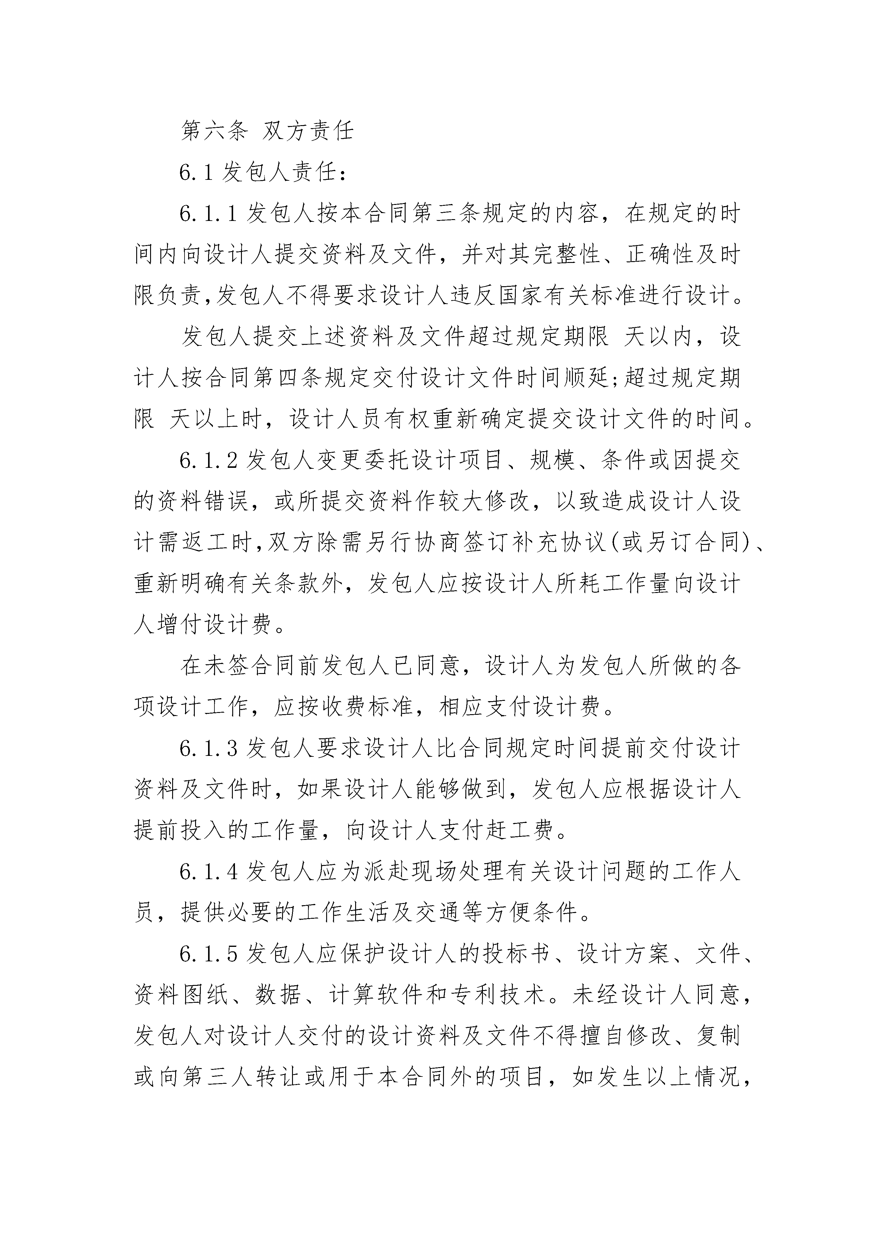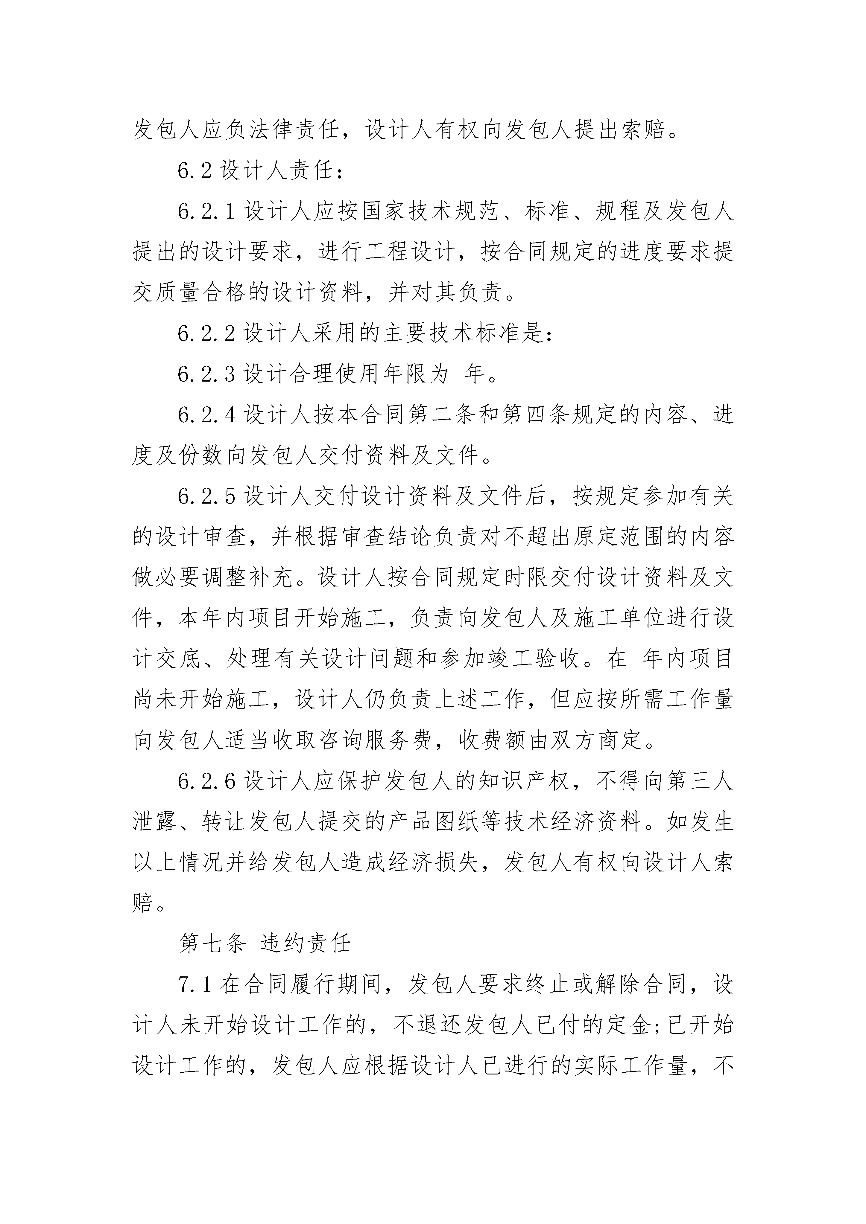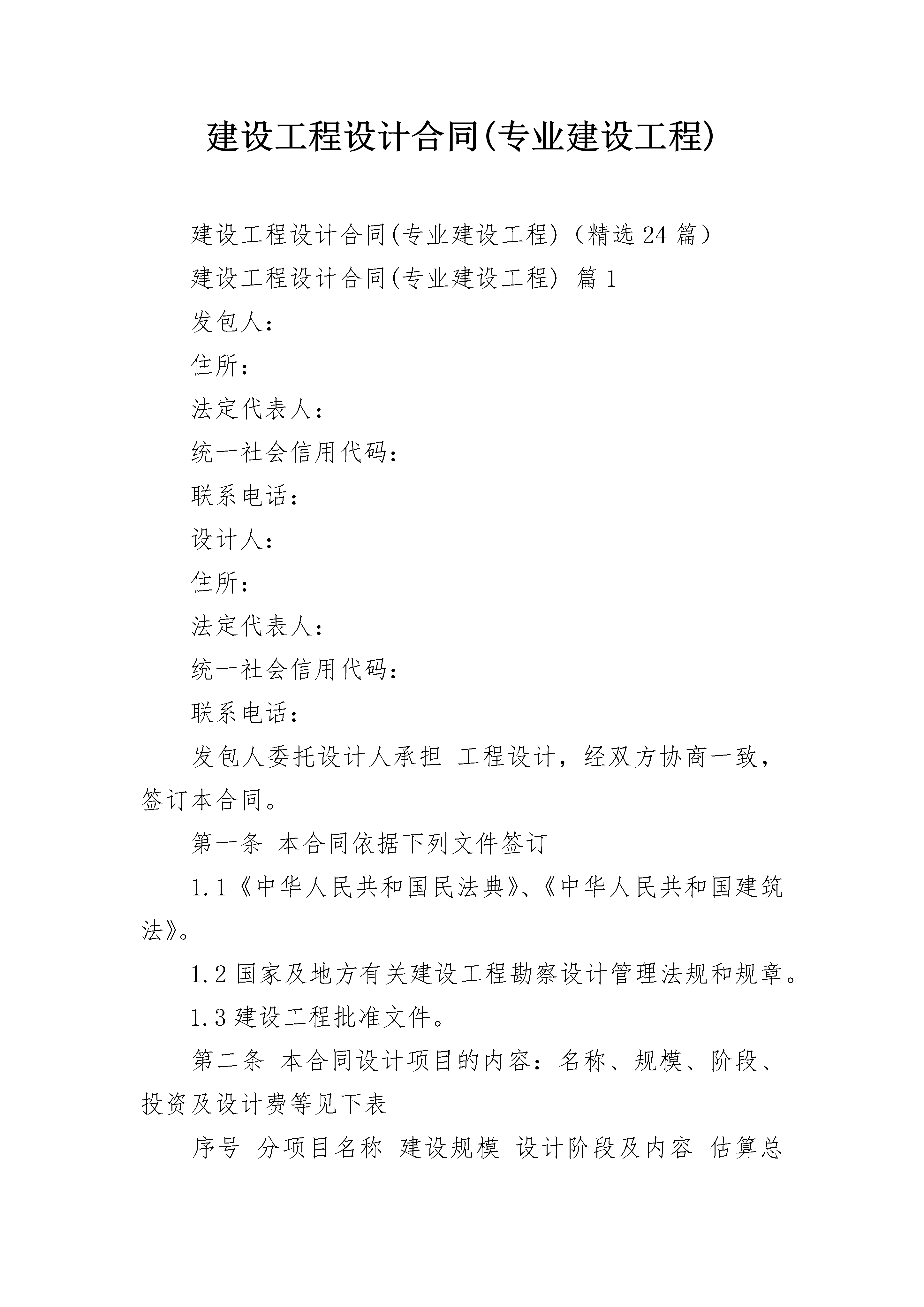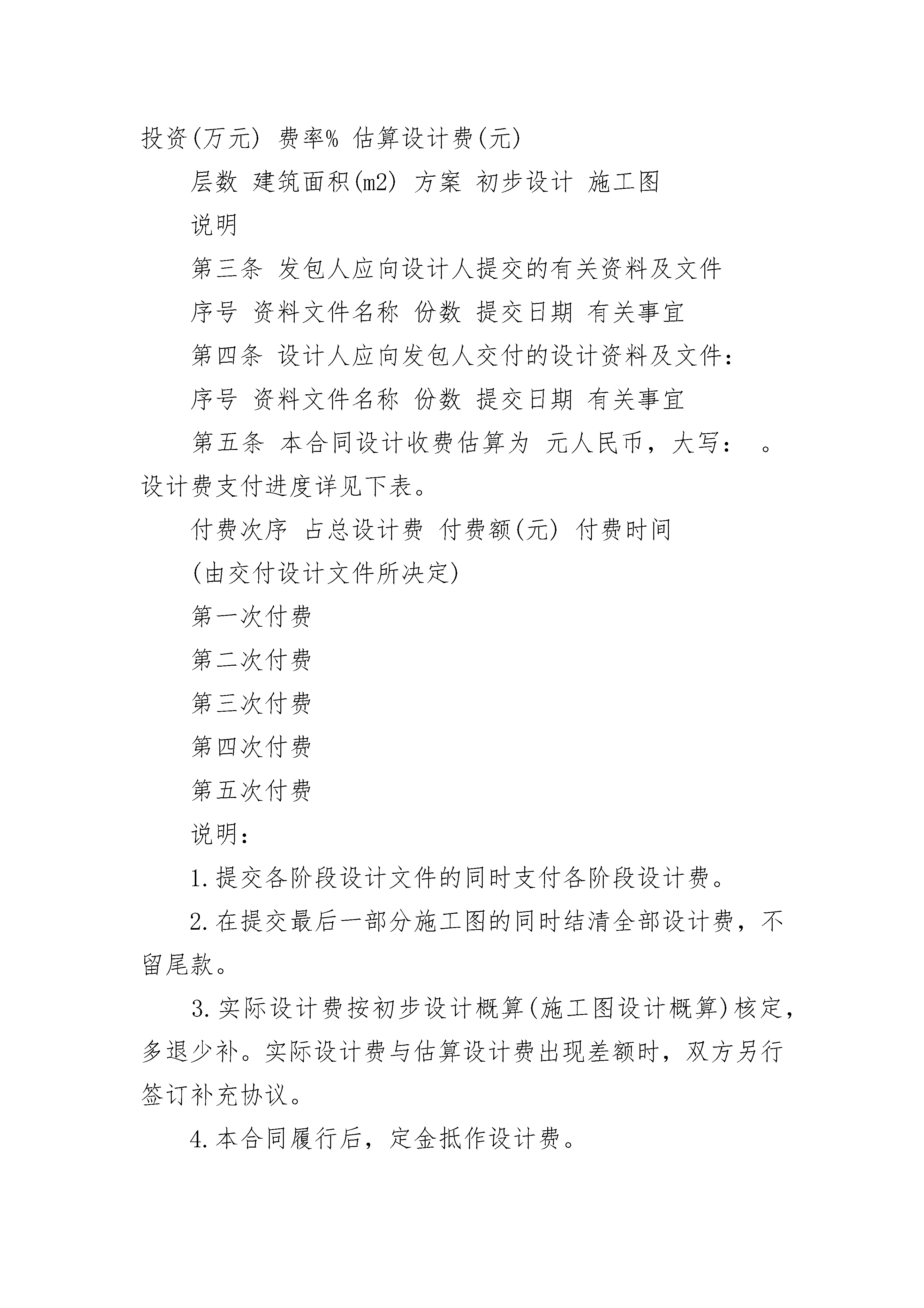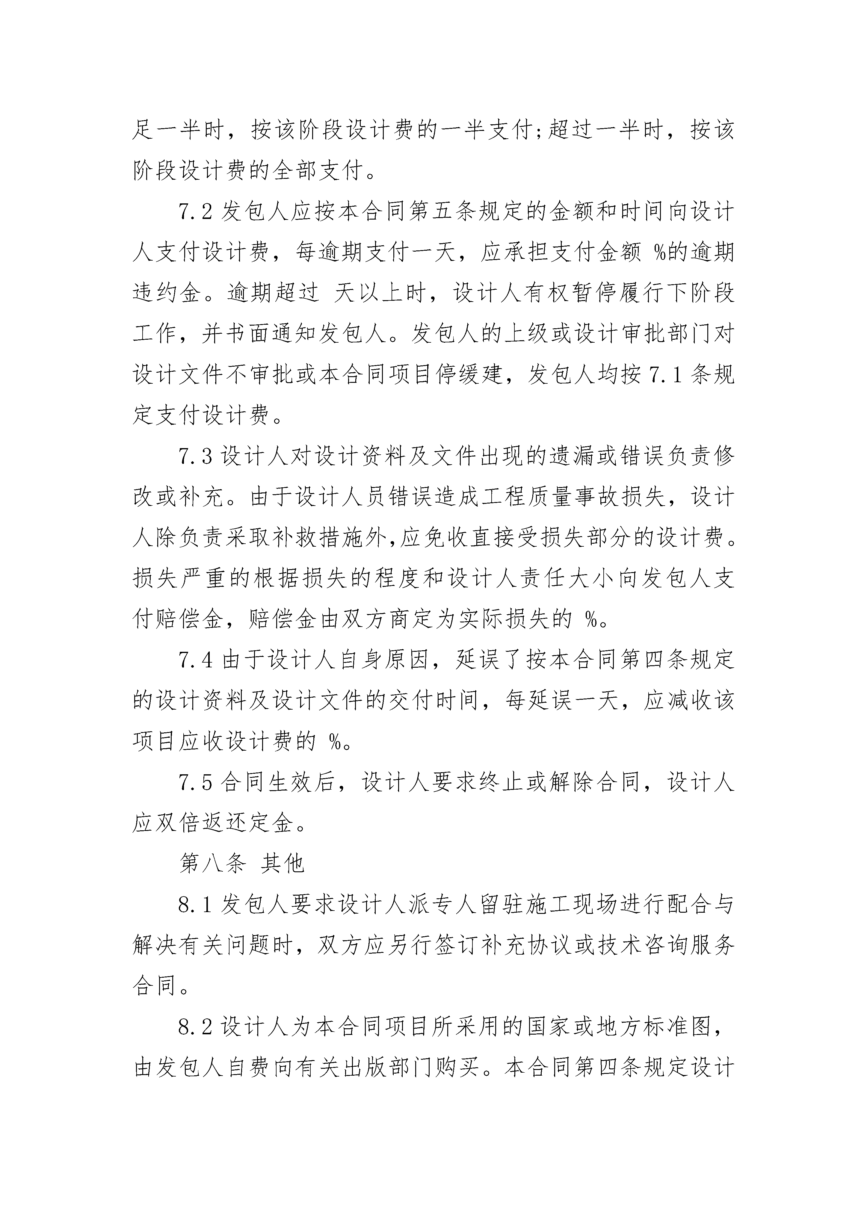 建设工程设计合同(专业建设工程)建设工程设计合同(专业建设工程)(精选24篇)建设工程设计合同(专业建设工程)篇1发包人:住所:法定代表人:统一社会信用代码:联系电话:设计人:住所:法定代表人:统一社会信用代码:联系电话:发包人委托设计人承担工程设计,经双方协商一致,签订本合同。第一条本合同依据下列文件签订1.1《中华人民共和国民法典》、《中华人民共和国建筑法》。1.2国家及地方有关建设工程勘察设计管理法规和规章。1.3建设工程批准文件。第二条本合同设计项目的内容:名称、规模、阶段、投资及设计费等见下表序号分项目名称建设规模设计阶段及内容估算总投资(万元)费率%估算设计费(元)层数建筑面积(m2)方案初步设计施工图说明第三条发包人应向设计人提交的有关资料及文件序号资料文件名称份数提交日期有关事宜第四条设计人应向发包人交付的设计资料及文件:序号资料文件名称份数提交日期有关事宜第五条本合同设计收费估算为元人民币,大写:。设计费支付进度详见下表。付费次序占总设计费付费额(元)付费时间(由交付设计文件所决定)第一次付费第二次付费第三次付费第四次付费第五次付费说明:1.提交各阶段设计文件的同时支付各阶段设计费。2.在提交最后一部分施工图的同时结清全部设计费,不留尾款。3.实际设计费按初步设计概算(施工图设计概算)核定,多退少补。实际设计费与估算设计费出现差额时,双方另行签订补充协议。4.本合同履行后,定金抵作设计费。第六条双方责任6.1发包人责任:6.1.1发包人按本合同第三条规定的内容,在规定的时间内向设计人提交资料及文件,并对其完整性、正确性及时限负责,发包人不得要求设计人违反国家有关标准进行设计。发包人提交上述资料及文件超过规定期限天以内,设计人按合同第四条规定交付设计文件时间顺延;超过规定期限天以上时,设计人员有权重新确定提交设计文件的时间。6.1.2发包人变更委托设计项目、规模、条件或因提交的资料错误,或所提交资料作较大修改,以致造成设计人设计需返工时,双方除需另行协商签订补充协议(或另订合同)、重新明确有关条款外,发包人应按设计人所耗工作量向设计人增付设计费。在未签合同前发包人已同意,设计人为发包人所做的各项设计工作,应按收费标准,相应支付设计费。6.1.3发包人要求设计人比合同规定时间提前交付设计资料及文件时,如果设计人能够做到,发包人应根据设计人提前投入的工作量,向设计人支付赶工费。6.1.4发包人应为派赴现场处理有关设计问题的工作人员,提供必要的工作生活及交通等方便条件。6.1.5发包人应保护设计人的投标书、设计方案、文件、资料图纸、数据、计算软件和专利技术。未经设计人同意,发包人对设计人交付的设计资料及文件不得擅自修改、复制或向第三人转让或用于本合同外的项目,如发生以上情况,发包人应负法律责任,设计人有权向发包人提出索赔。6.2设计人责任:6.2.1设计人应按国家技术规范、标准、规程及发包人提出的设计要求,进行工程设计,按合同规定的进度要求提交质量合格的设计资料,并对其负责。6.2.2设计人采用的主要技术标准是:6.2.3设计合理使用年限为年。6.2.4设计人按本合同第二条和第四条规定的内容、进度及份数向发包人交付资料及文件。6.2.5设计人交付设计资料及文件后,按规定参加有关的设计审查,并根据审查结论负责对不超出原定范围的内容做必要调整补充。设计人按合同规定时限交付设计资料及文件,本年内项目开始施工,负责向发包人及施工单位进行设计交底、处理有关设计问题和参加竣工验收。在年内项目尚未开始施工,设计人仍负责上述工作,但应按所需工作量向发包人适当收取咨询服务费,收费额由双方商定。6.2.6设计人应保护发包人的知识产权,不得向第三人泄露、转让发包人提交的产品图纸等技术经济资料。如发生以上情况并给发包人造成经济损失,发包人有权向设计人索赔。第七条违约责任7.1在合同履行期间,发包人要求终止或解除合同,设计人未开始设计工作的,不退还发包人已付的定金;已开始设计工作的,发包人应根据设计人已进行的实际工作量,不足一半时,按该阶段设计费的一半支付;超过一半时,按该阶段设计费的全部支付。7.2发包人应按本合同第五条规定的金额和时间向设计人支付设计费,每逾期支付一天,应承担支付金额%的逾期违约金。逾期超过天以上时,设计人有权暂停履行下阶段工作,并书面通知发包人。发包人的上级或设计审批部门对设计文件不审批或本合同项目停缓建,发包人均按7.1条规定支付设计费。7.3设计人对设计资料及文件出现的遗漏或错误负责修改或补充。由于设计人员错误造成工程质量事故损失,设计人除负责采取补救措施外,应免收直接受损失部分的设计费。损失严重的根据损失的程度和设计人责任大小向发包人支付赔偿金,赔偿金由双方商定为实际损失的%。7.4由于设计人自身原因,延误了按