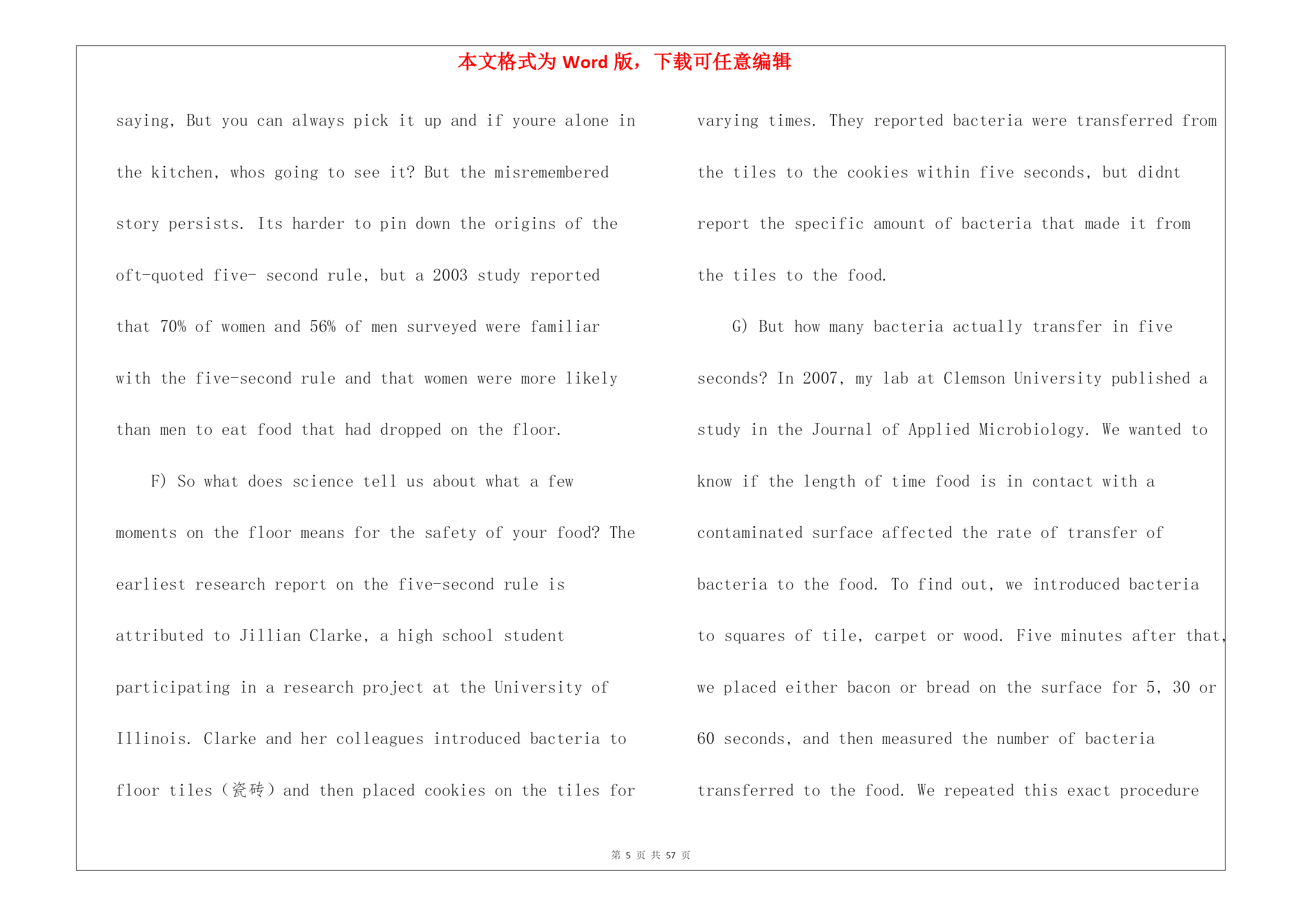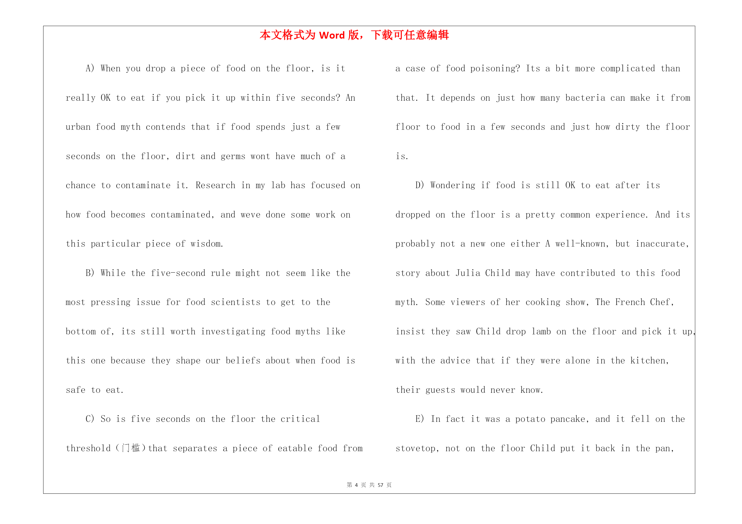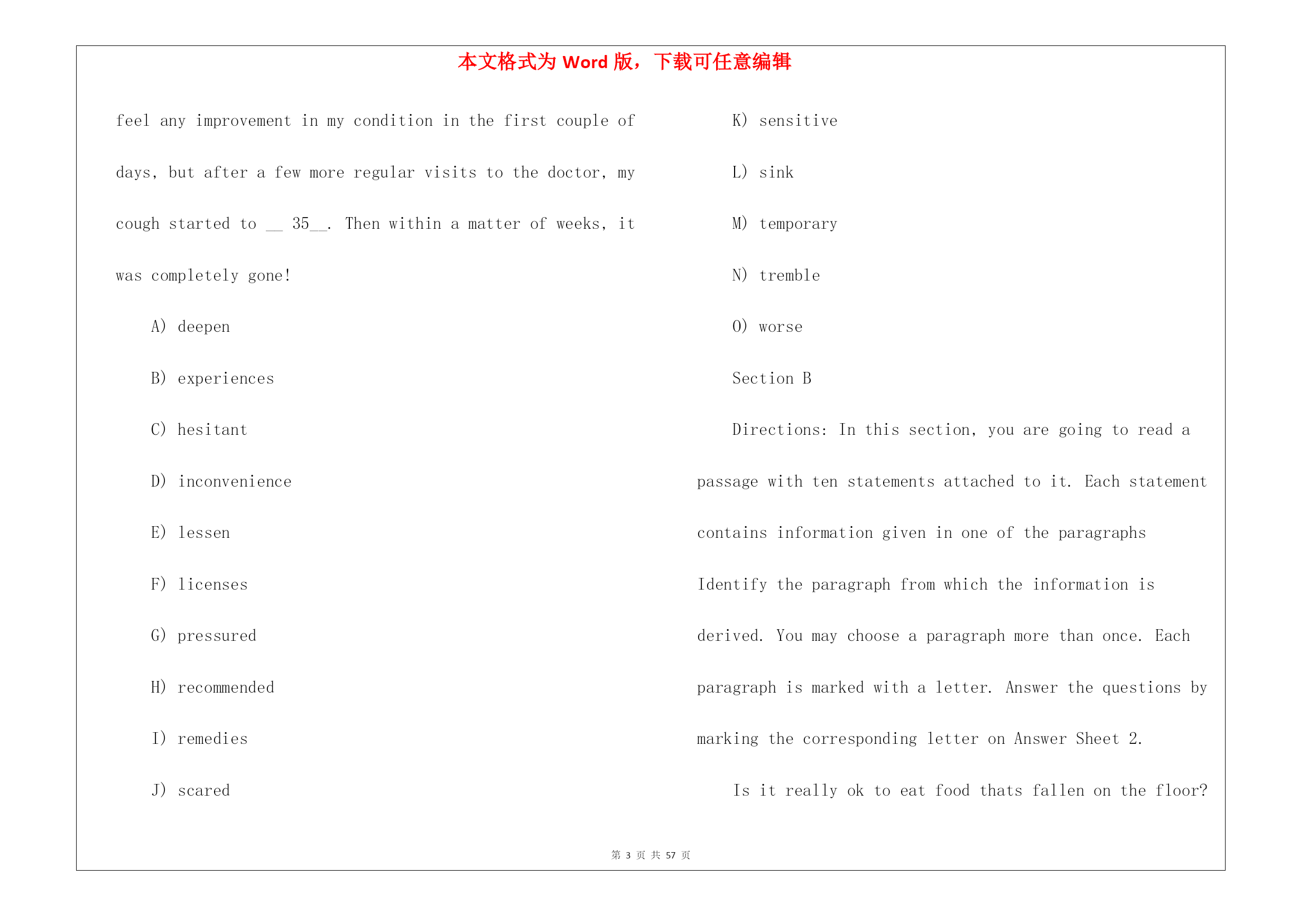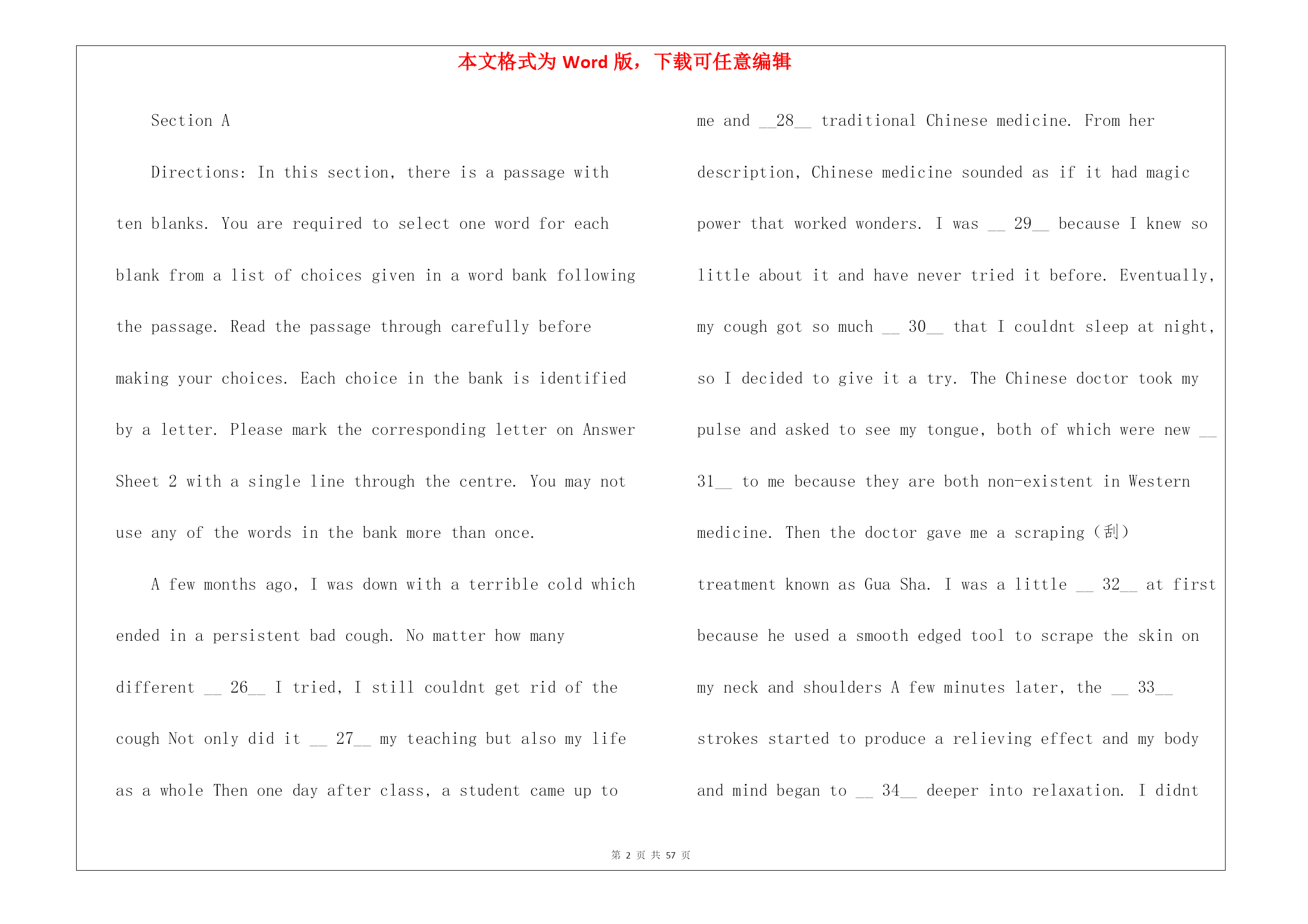 本文格式为Word版,下载可任意编辑 第PAGE\*MERGEFORMAT57页共NUMPAGES\*MERGEFORMAT57页 大学英语专业历年四级真题 真题中的每一部分都是完整的一个模式,如果太过于细化讲解每篇句子,罗列很多看起来很“专业”的讲解,很容易使考生陷入不知所措的混沌状态,效果会适得其反。下面是编写推荐的大学英语专业历年四级真题,仅供参考,欢迎阅读。20XX年12月英语四级考试真题(第3套)四级写作PartIWriting(30minutes)Directions:Forthispart,youareallowed30minutestowriteashortessayonthechallengesofstartingacareeraftergraduation.Youshouldwriteatleast120wordsbutnomorethan180words.________________________________________________________________________________________________________________________________________________________________________________________________________________________四级听力PartIIListeningComprehension(30minutes)说明:由于20XX年6月四级考试全国共考了两套听力,本套真题听力与前两套内容相同,只是选项顺序不同,因此在本套真题中不再重复出现。四级阅读PartIIIReadingComprehension(40minutes)SectionADirections:Inthissection,thereisapassagewithtenblanks.Youarerequiredtoselectonewordforeachblankfromalistofchoicesgiveninawordbankfollowingthepassage.Readthepassagethroughcarefullybeforemakingyourchoices.Eachchoiceinthebankisidentifiedbyaletter.PleasemarkthecorrespondingletteronAnswerSheet2withasinglelinethroughthecentre.Youmaynotuseanyofthewordsinthebankmorethanonce.Afewmonthsago,Iwasdownwithaterriblecoldwhichendedinapersistentbadcough.Nomatterhowmanydifferent__26__Itried,IstillcouldntgetridofthecoughNotonlydidit__27__myteachingbutalsomylifeasawholeThenonedayafterclass,astudentcameuptomeand__28__traditionalChinesemedicine.Fromherdescription,Chinesemedicinesoundedasifithadmagicpowerthatworkedwonders.Iwas__29__becauseIknewsolittleaboutitandhavenevertrieditbefore.Eventually,mycoughgotsomuch__30__thatIcouldntsleepatnight,soIdecidedtogiveitatry.TheChinesedoctortookmypulseandaskedtoseemytongue,bothofwhichwerenew__31__tomebecausetheyarebothnon-existentinWesternmedicine.Thenthedoctorgavemeascraping(刮)treatmentknownasGuaSha.Iwasalittle__32__atfirstbecauseheusedasmoothedgedtooltoscrapetheskinonmyneckandshouldersAfewminuteslater,the__33__strokesstartedtoproducearelievingeffectandmybodyandmindbeganto__34__deeperintore