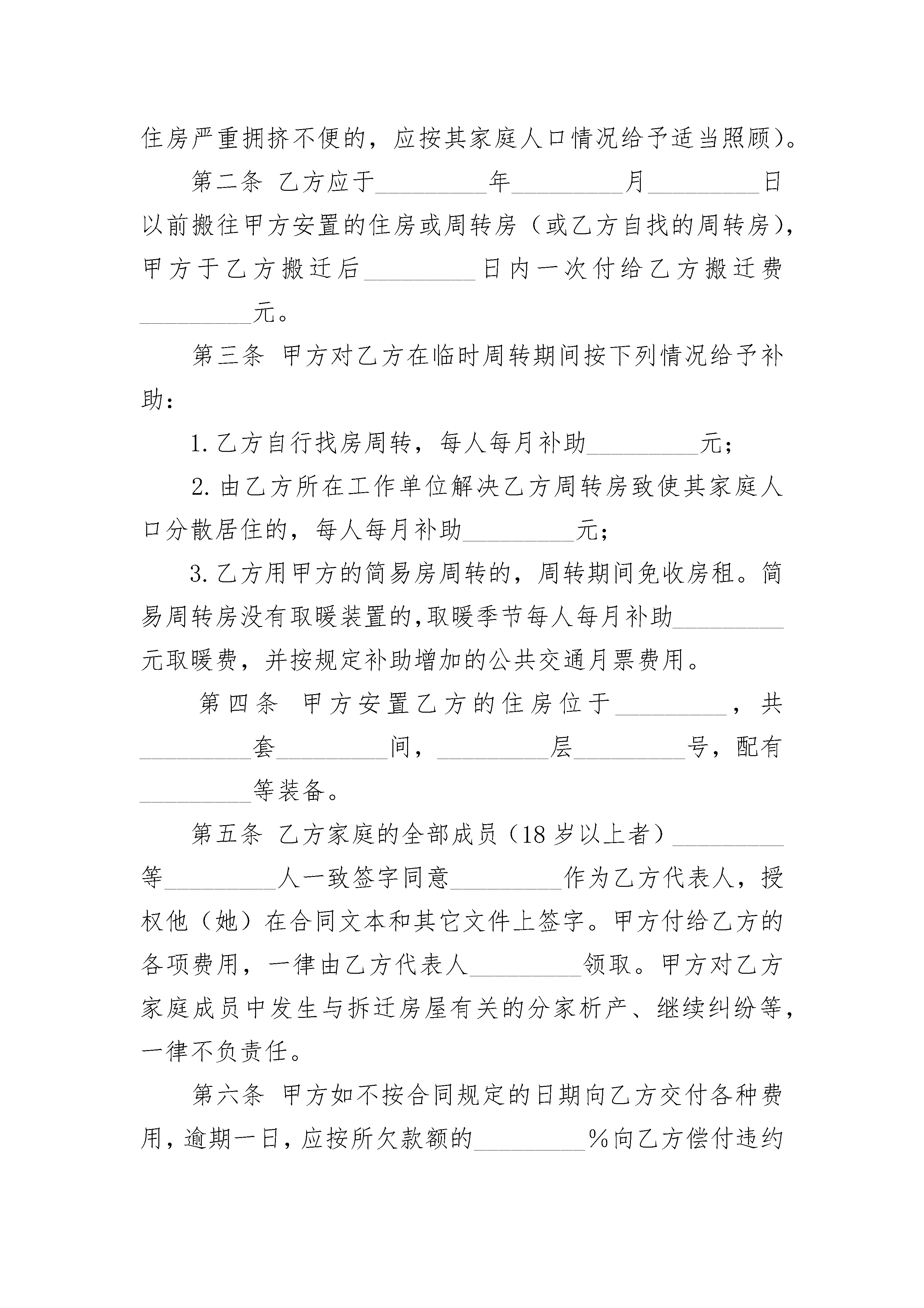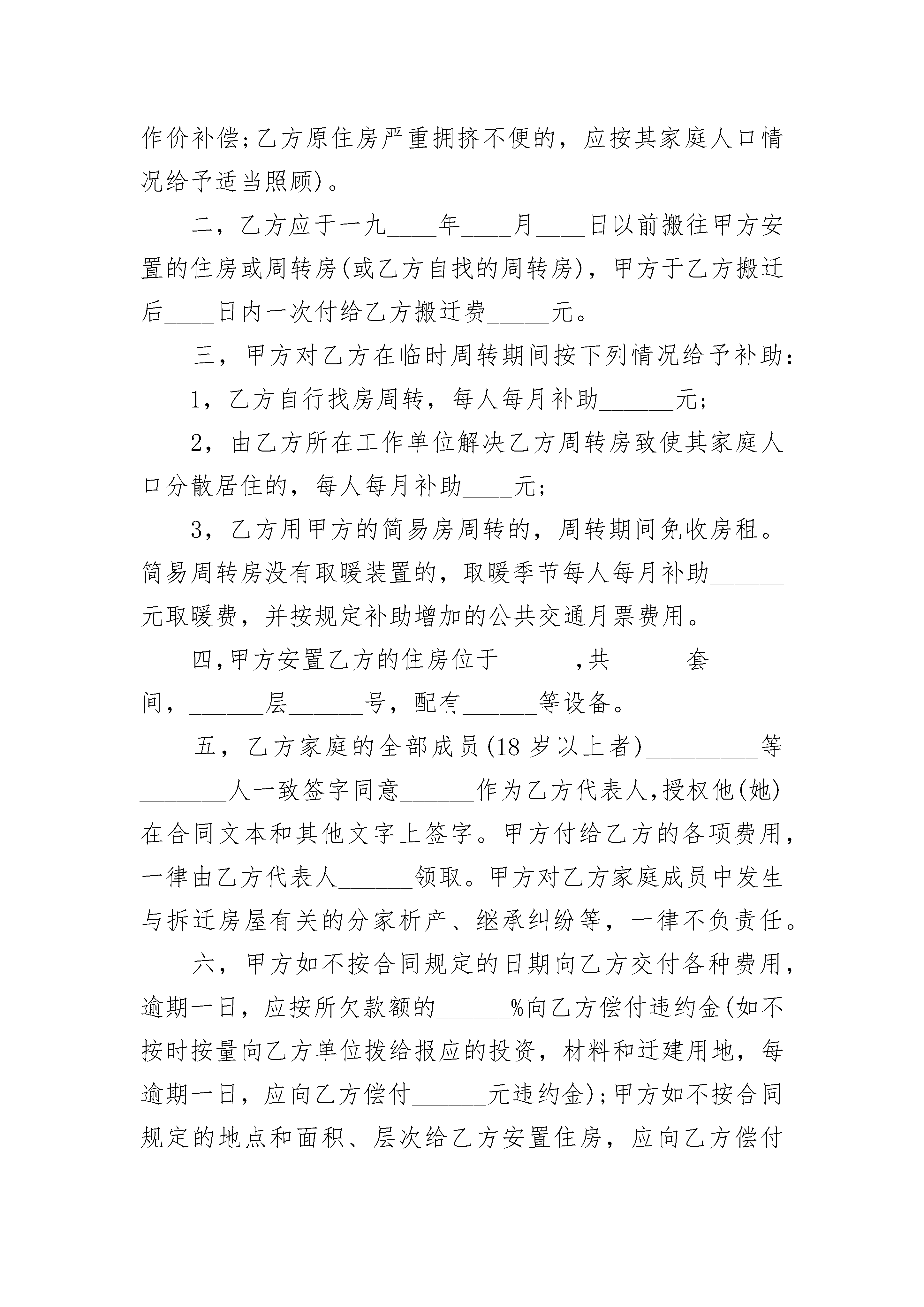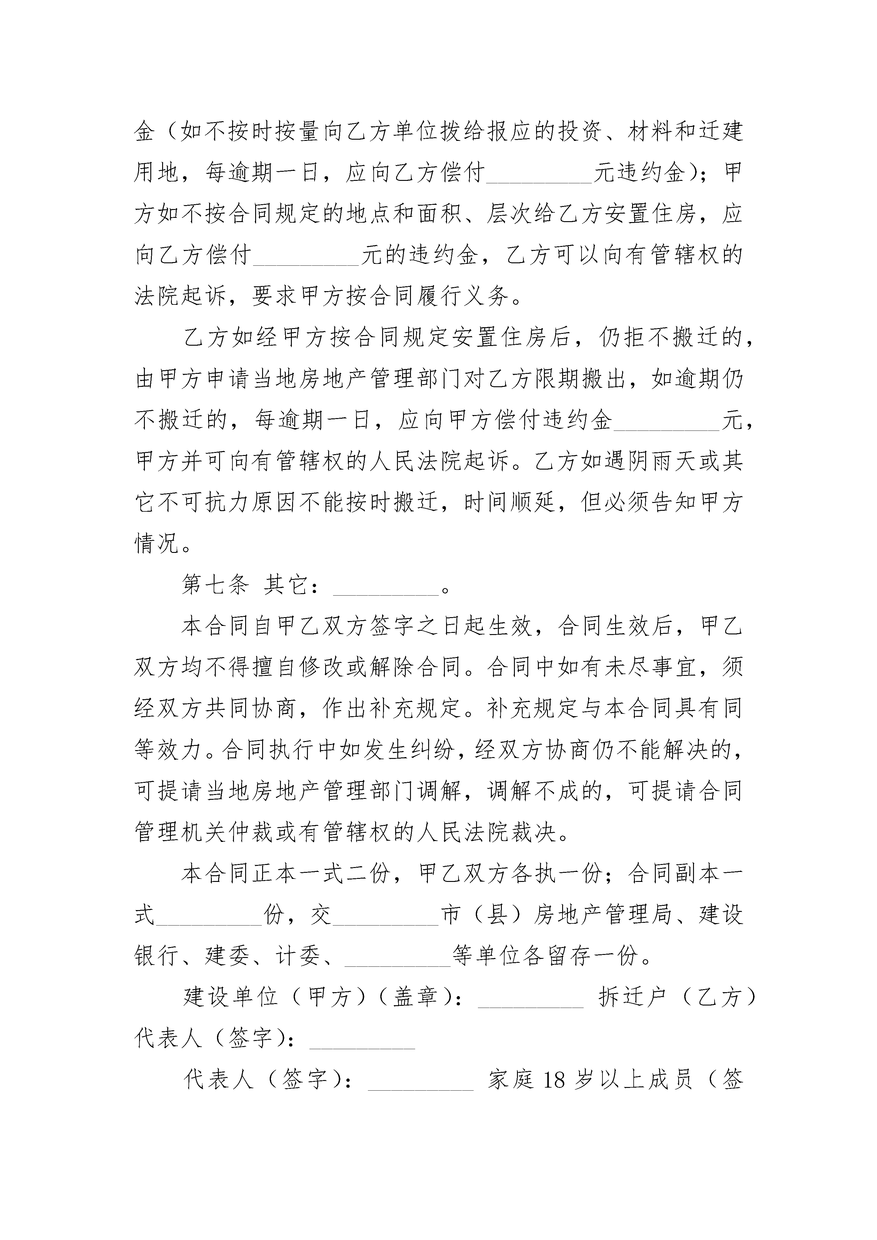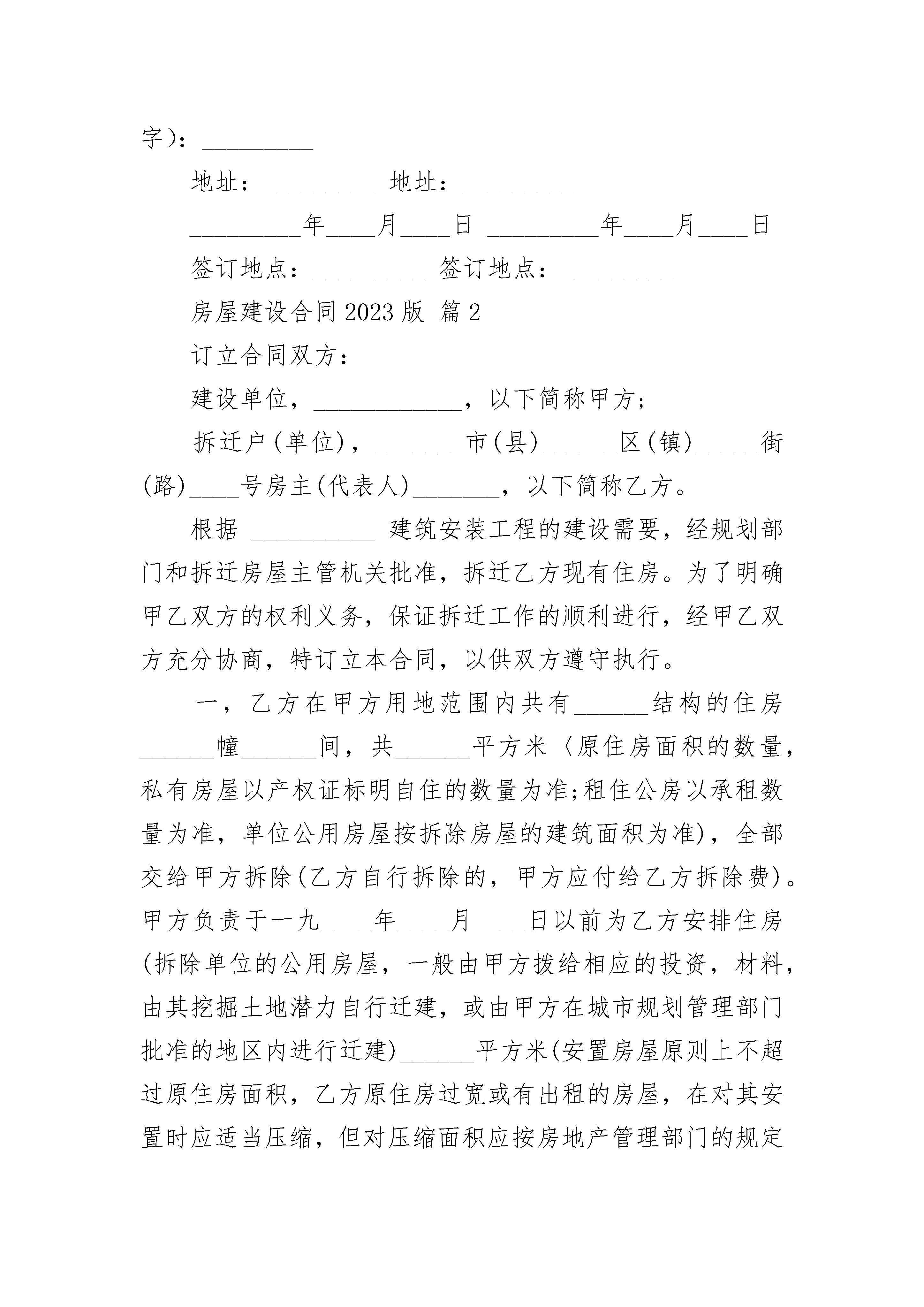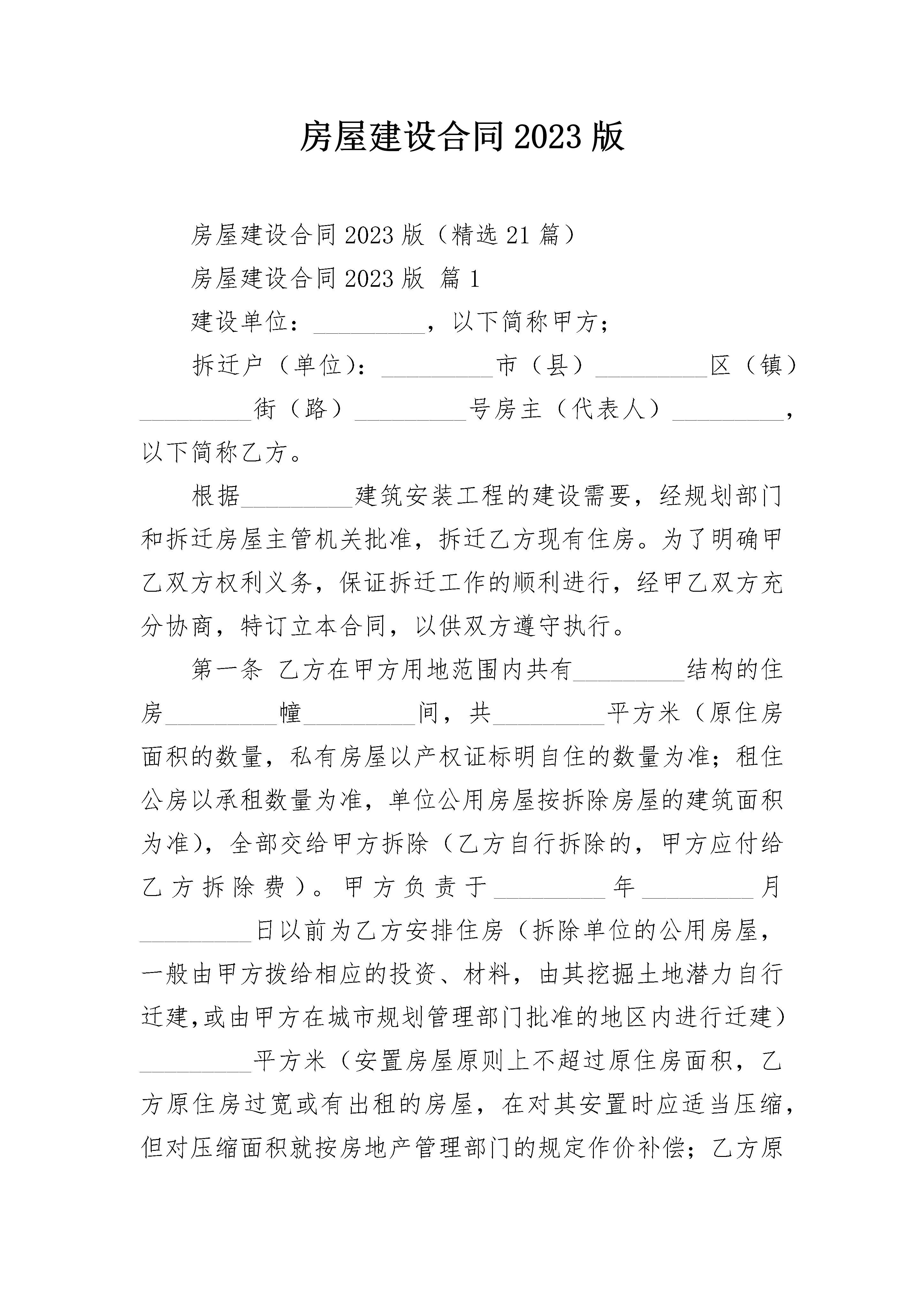 房屋建设合同2023版房屋建设合同2023版(精选21篇)房屋建设合同2023版篇1建设单位:_________,以下简称甲方;拆迁户(单位):_________市(县)_________区(镇)_________街(路)_________号房主(代表人)_________,以下简称乙方。根据_________建筑安装工程的建设需要,经规划部门和拆迁房屋主管机关批准,拆迁乙方现有住房。为了明确甲乙双方权利义务,保证拆迁工作的顺利进行,经甲乙双方充分协商,特订立本合同,以供双方遵守执行。第一条乙方在甲方用地范围内共有_________结构的住房_________幢_________间,共_________平方米(原住房面积的数量,私有房屋以产权证标明自住的数量为准;租住公房以承租数量为准,单位公用房屋按拆除房屋的建筑面积为准),全部交给甲方拆除(乙方自行拆除的,甲方应付给乙方拆除费)。甲方负责于_________年_________月_________日以前为乙方安排住房(拆除单位的公用房屋,一般由甲方拨给相应的投资、材料,由其挖掘土地潜力自行迁建,或由甲方在城市规划管理部门批准的地区内进行迁建)_________平方米(安置房屋原则上不超过原住房面积,乙方原住房过宽或有出租的房屋,在对其安置时应适当压缩,但对压缩面积就按房地产管理部门的规定作价补偿;乙方原住房严重拥挤不便的,应按其家庭人口情况给予适当照顾)。第二条乙方应于_________年_________月_________日以前搬往甲方安置的住房或周转房(或乙方自找的周转房),甲方于乙方搬迁后_________日内一次付给乙方搬迁费_________元。第三条甲方对乙方在临时周转期间按下列情况给予补助:1.乙方自行找房周转,每人每月补助_________元;2.由乙方所在工作单位解决乙方周转房致使其家庭人口分散居住的,每人每月补助_________元;3.乙方用甲方的简易房周转的,周转期间免收房租。简易周转房没有取暖装置的,取暖季节每人每月补助_________元取暖费,并按规定补助增加的公共交通月票费用。第四条甲方安置乙方的住房位于_________,共_________套_________间,_________层_________号,配有_________等装备。第五条乙方家庭的全部成员(18岁以上者)_________等_________人一致签字同意_________作为乙方代表人,授权他(她)在合同文本和其它文件上签字。甲方付给乙方的各项费用,一律由乙方代表人_________领取。甲方对乙方家庭成员中发生与拆迁房屋有关的分家析产、继续纠纷等,一律不负责任。第六条甲方如不按合同规定的日期向乙方交付各种费用,逾期一日,应按所欠款额的_________%向乙方偿付违约金(如不按时按量向乙方单位拨给报应的投资、材料和迁建用地,每逾期一日,应向乙方偿付_________元违约金);甲方如不按合同规定的地点和面积、层次给乙方安置住房,应向乙方偿付_________元的违约金,乙方可以向有管辖权的法院起诉,要求甲方按合同履行义务。乙方如经甲方按合同规定安置住房后,仍拒不搬迁的,由甲方申请当地房地产管理部门对乙方限期搬出,如逾期仍不搬迁的,每逾期一日,应向甲方偿付违约金_________元,甲方并可向有管辖权的人民法院起诉。乙方如遇阴雨天或其它不可抗力原因不能按时搬迁,时间顺延,但必须告知甲方情况。第七条其它:_________。本合同自甲乙双方签字之日起生效,合同生效后,甲乙双方均不得擅自修改或解除合同。合同中如有未尽事宜,须经双方共同协商,作出补充规定。补充规定与本合同具有同等效力。合同执行中如发生纠纷,经双方协商仍不能解决的,可提请当地房地产管理部门调解,调解不成的,可提请合同管理机关仲裁或有管辖权的人民法院裁决。本合同正本一式二份,甲乙双方各执一份;合同副本一式_________份,交_________市(县)房地产管理局、建设银行、建委、计委、_________等单位各留存一份。建设单位(甲方)(盖章):_________拆迁户(乙方)代表人(签字):_________代表人(签字):_________家庭18岁以上成员(签字):_________地址:_________地址:__________________年____月____日_________年____月____日签订地点:_________签订地点:_________房屋建设合同2023版篇2订立合同双方:建设单位,____________,以下简称甲方;拆迁户(单位),_______市(县)______区(镇)_____街(路)____号房主(代表人)_______,以下简称乙方。根据______