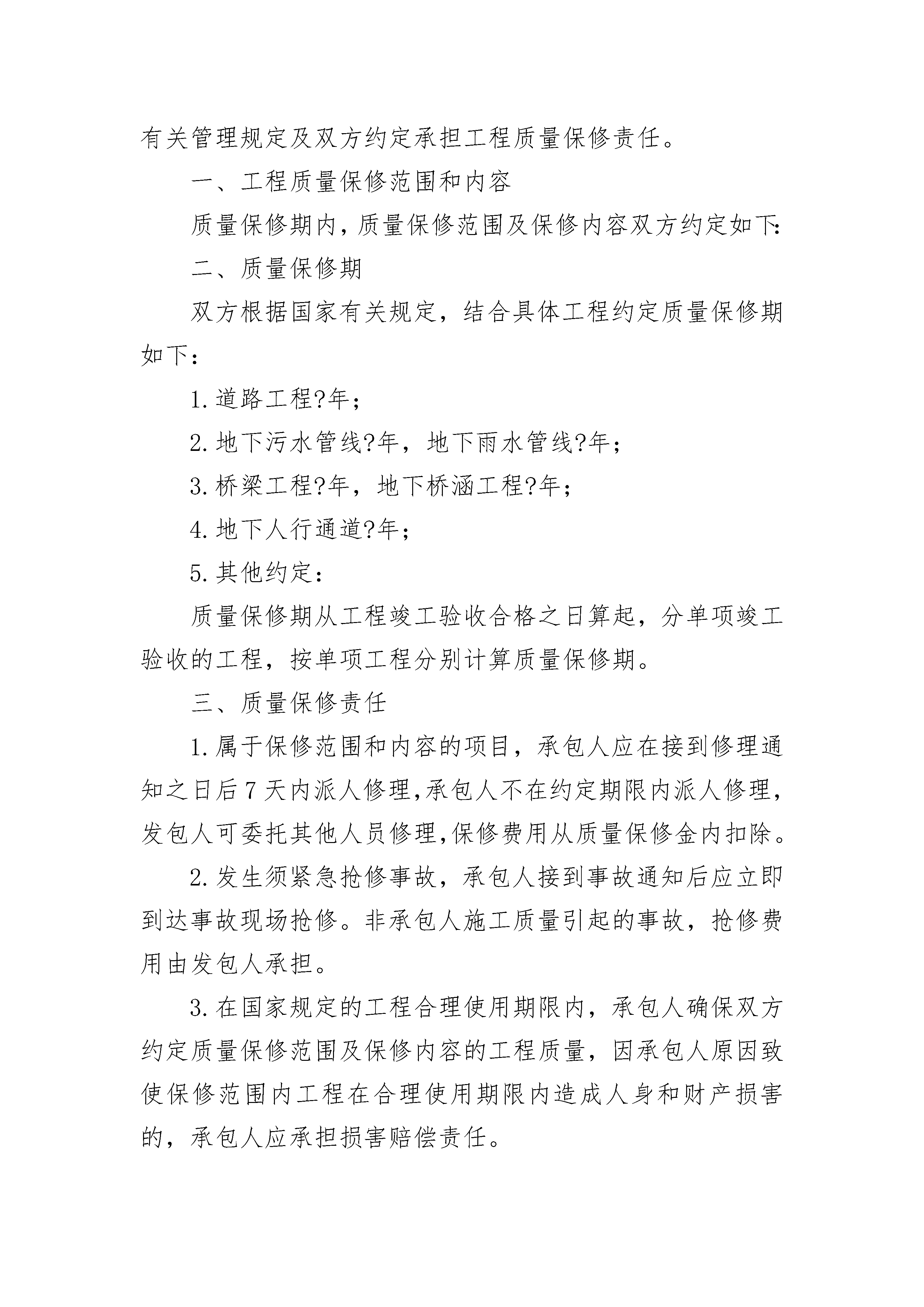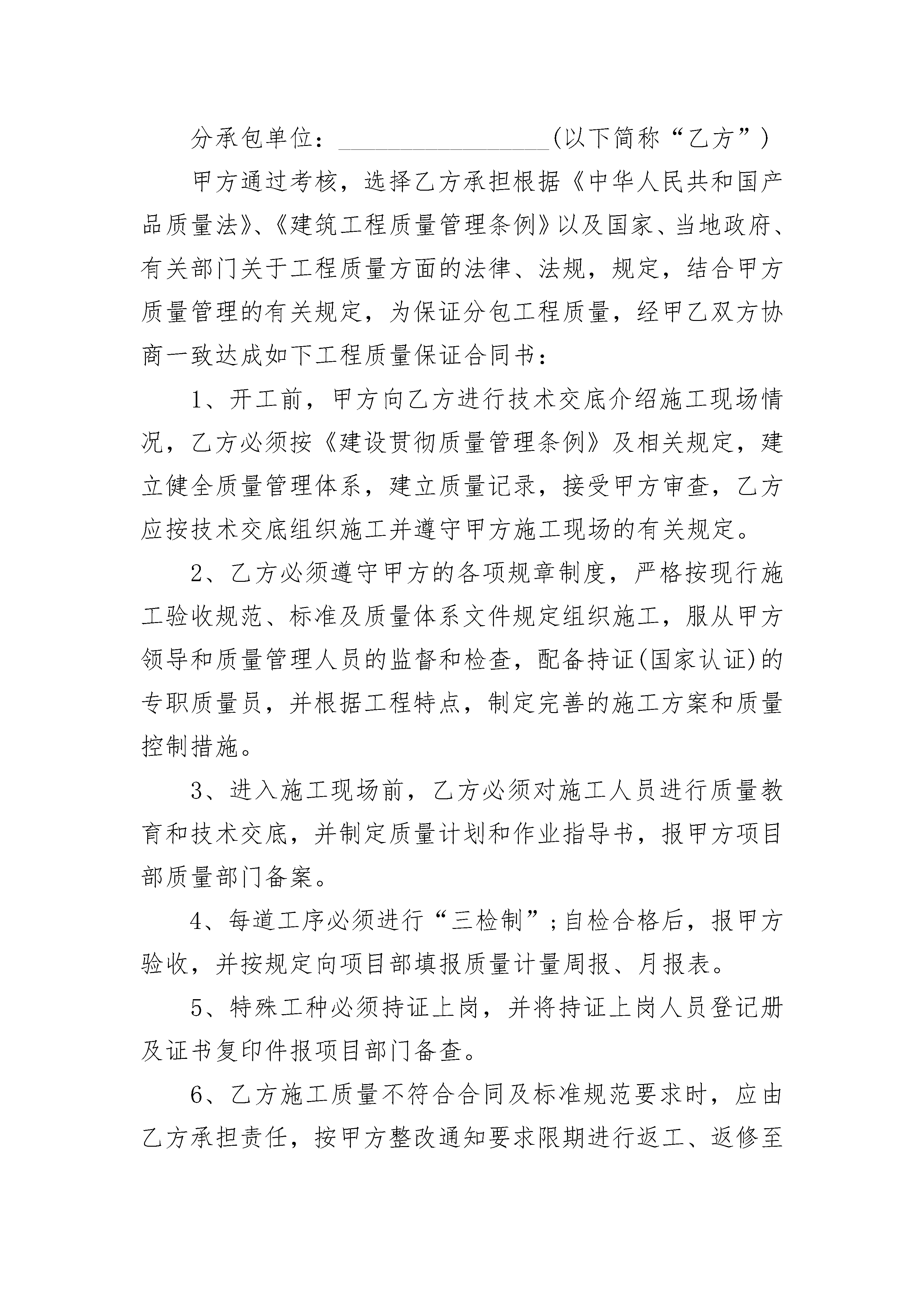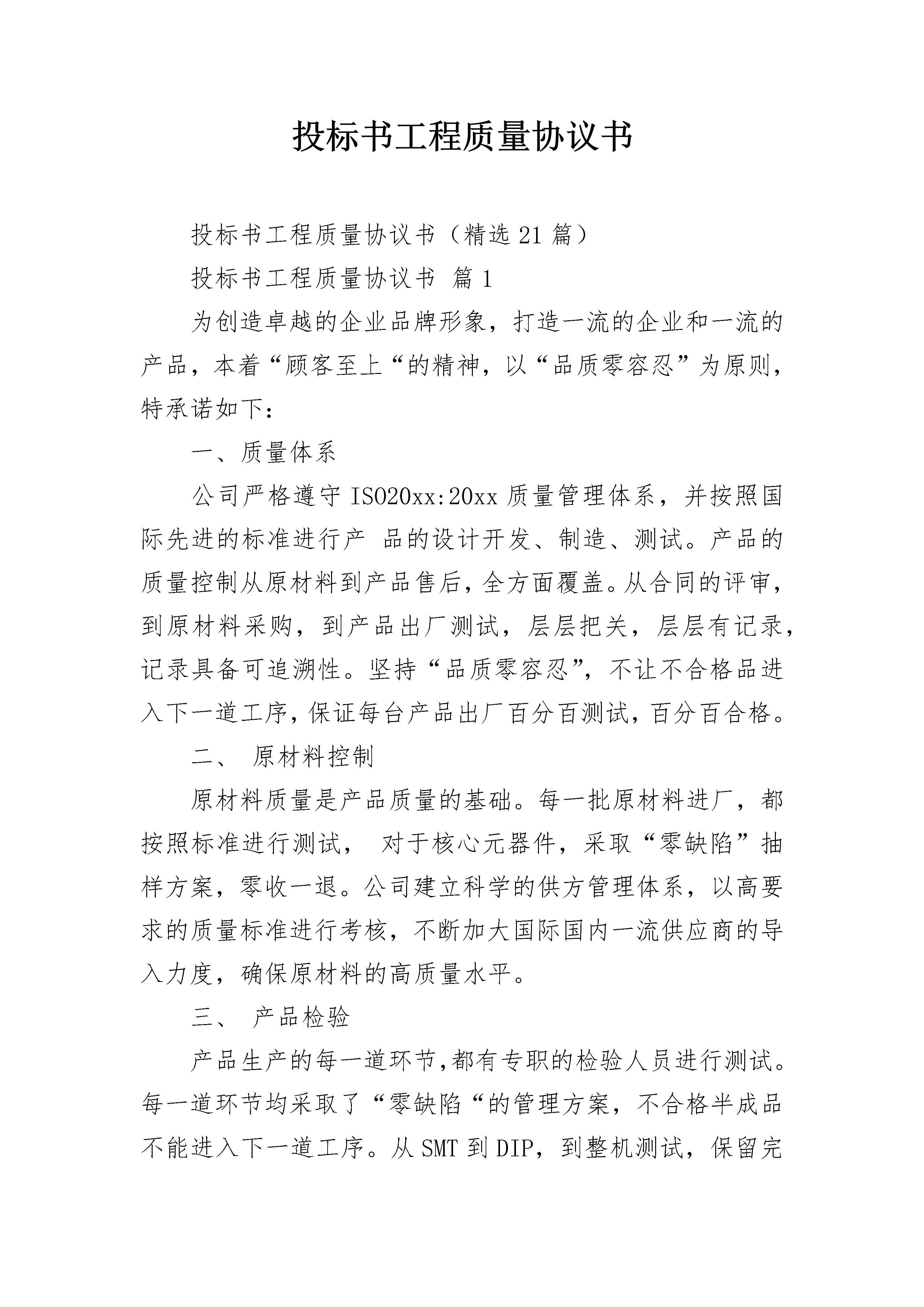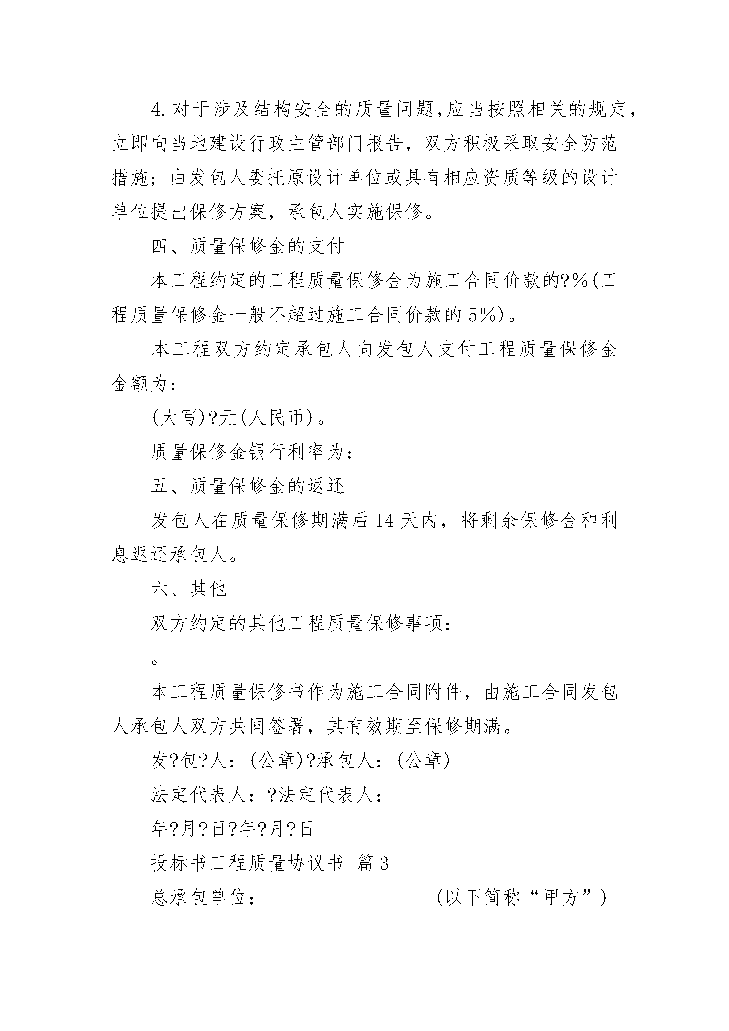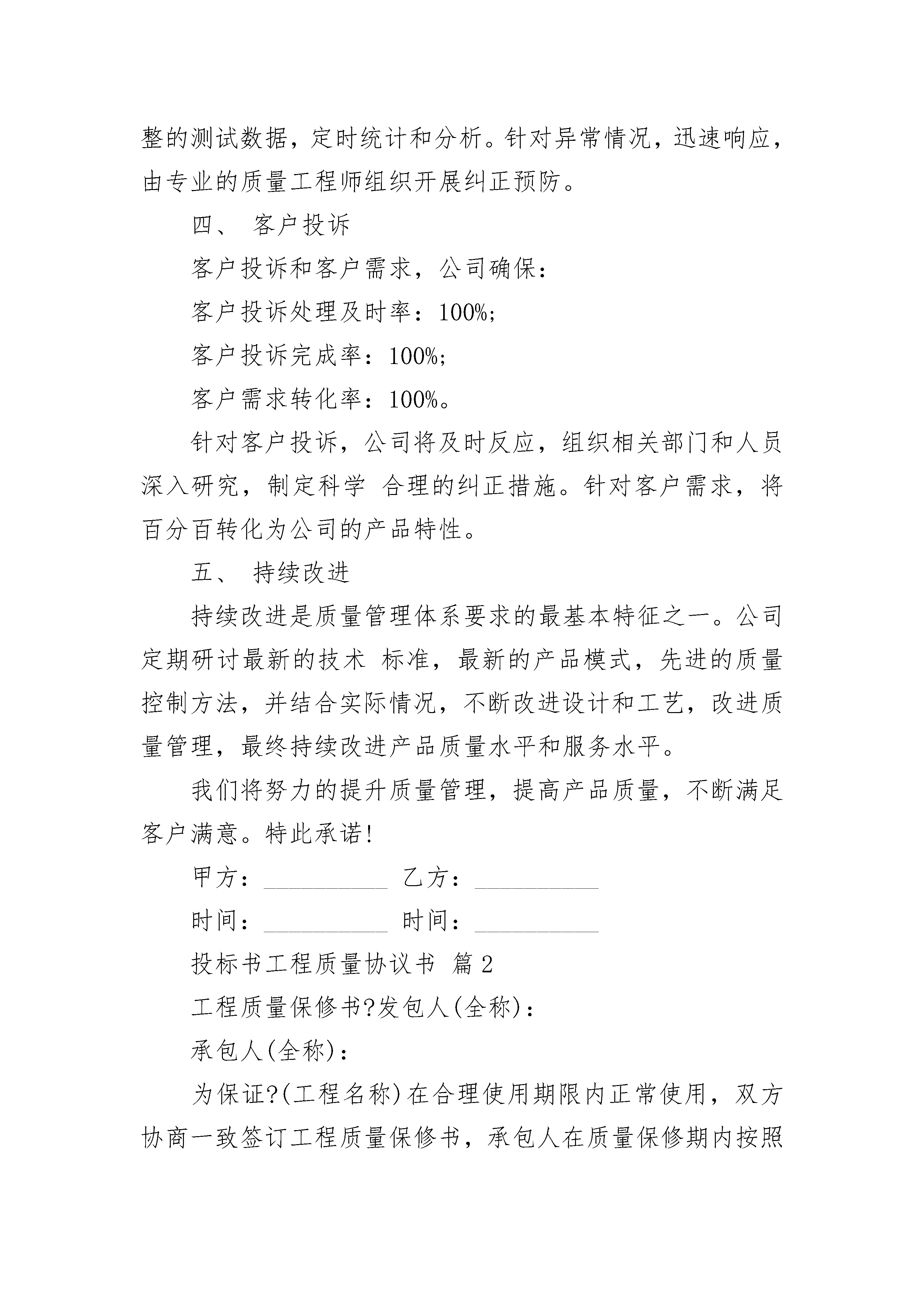 投标书工程质量协议书投标书工程质量协议书(精选21篇)投标书工程质量协议书篇1为创造卓越的企业品牌形象,打造一流的企业和一流的产品,本着“顾客至上“的精神,以“品质零容忍”为原则,特承诺如下:一、质量体系公司严格遵守ISO20xx:20xx质量管理体系,并按照国际先进的标准进行产品的设计开发、制造、测试。产品的质量控制从原材料到产品售后,全方面覆盖。从合同的评审,到原材料采购,到产品出厂测试,层层把关,层层有记录,记录具备可追溯性。坚持“品质零容忍”,不让不合格品进入下一道工序,保证每台产品出厂百分百测试,百分百合格。二、原材料控制原材料质量是产品质量的基础。每一批原材料进厂,都按照标准进行测试,对于核心元器件,采取“零缺陷”抽样方案,零收一退。公司建立科学的供方管理体系,以高要求的质量标准进行考核,不断加大国际国内一流供应商的导入力度,确保原材料的高质量水平。三、产品检验产品生产的每一道环节,都有专职的检验人员进行测试。每一道环节均采取了“零缺陷“的管理方案,不合格半成品不能进入下一道工序。从SMT到DIP,到整机测试,保留完整的测试数据,定时统计和分析。针对异常情况,迅速响应,由专业的质量工程师组织开展纠正预防。四、客户投诉客户投诉和客户需求,公司确保:客户投诉处理及时率:100%;客户投诉完成率:100%;客户需求转化率:100%。针对客户投诉,公司将及时反应,组织相关部门和人员深入研究,制定科学合理的纠正措施。针对客户需求,将百分百转化为公司的产品特性。五、持续改进持续改进是质量管理体系要求的最基本特征之一。公司定期研讨最新的技术标准,最新的产品模式,先进的质量控制方法,并结合实际情况,不断改进设计和工艺,改进质量管理,最终持续改进产品质量水平和服务水平。我们将努力的提升质量管理,提高产品质量,不断满足客户满意。特此承诺!甲方:__________乙方:__________时间:__________时间:__________投标书工程质量协议书篇2工程质量保修书?发包人(全称):承包人(全称):为保证?(工程名称)在合理使用期限内正常使用,双方协商一致签订工程质量保修书,承包人在质量保修期内按照有关管理规定及双方约定承担工程质量保修责任。一、工程质量保修范围和内容质量保修期内,质量保修范围及保修内容双方约定如下:二、质量保修期双方根据国家有关规定,结合具体工程约定质量保修期如下:1.道路工程?年;2.地下污水管线?年,地下雨水管线?年;3.桥梁工程?年,地下桥涵工程?年;4.地下人行通道?年;5.其他约定:质量保修期从工程竣工验收合格之日算起,分单项竣工验收的工程,按单项工程分别计算质量保修期。三、质量保修责任1.属于保修范围和内容的项目,承包人应在接到修理通知之日后7天内派人修理,承包人不在约定期限内派人修理,发包人可委托其他人员修理,保修费用从质量保修金内扣除。2.发生须紧急抢修事故,承包人接到事故通知后应立即到达事故现场抢修。非承包人施工质量引起的事故,抢修费用由发包人承担。3.在国家规定的工程合理使用期限内,承包人确保双方约定质量保修范围及保修内容的工程质量,因承包人原因致使保修范围内工程在合理使用期限内造成人身和财产损害的,承包人应承担损害赔偿责任。4.对于涉及结构安全的质量问题,应当按照相关的规定,立即向当地建设行政主管部门报告,双方积极采取安全防范措施;由发包人委托原设计单位或具有相应资质等级的设计单位提出保修方案,承包人实施保修。四、质量保修金的支付本工程约定的工程质量保修金为施工合同价款的?%(工程质量保修金一般不超过施工合同价款的5%)。本工程双方约定承包人向发包人支付工程质量保修金金额为:(大写)?元(人民币)。质量保修金银行利率为:五、质量保修金的返还发包人在质量保修期满后14天内,将剩余保修金和利息返还承包人。六、其他双方约定的其他工程质量保修事项:。本工程质量保修书作为施工合同附件,由施工合同发包人承包人双方共同签署,其有效期至保修期满。发?包?人:(公章)?承包人:(公章)法定代表人:?法定代表人:年?月?日?年?月?日投标书工程质量协议书篇3总承包单位:_________________(以下简称“甲方”)分承包单位:_________________(以下简称“乙方”)甲方通过考核,选择乙方承担根据《中华人民共和国产品质量法》、《建筑工程质量管理条例》以及国家、当地政府、有关部门关于工程质量方面的法律、法规,规定,结合甲方质量管理的有关规定,为保证分包工程质量,经甲乙双方协商一致达成如下工程质量保证合同书:1、开工前,甲方向乙方进行技术交底介绍施工现场情况,乙方必须按《建设贯彻质量管理条例》及相关规定,建立健全质量管理体系,建立质量记录,接受甲方审查,乙方应按技术交底组织施工并遵守