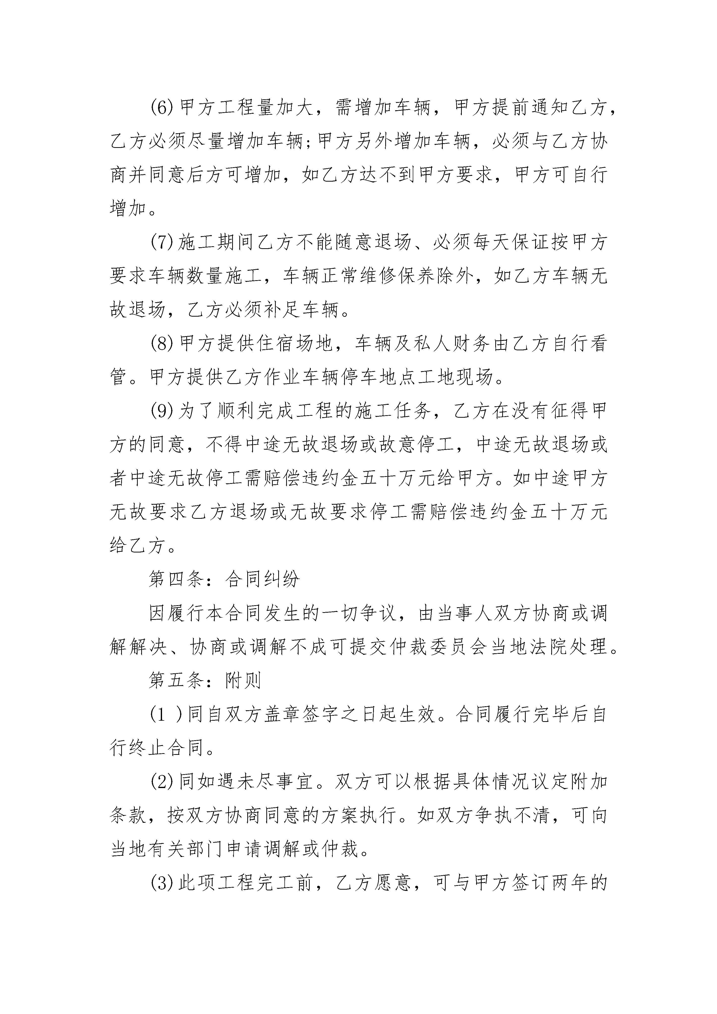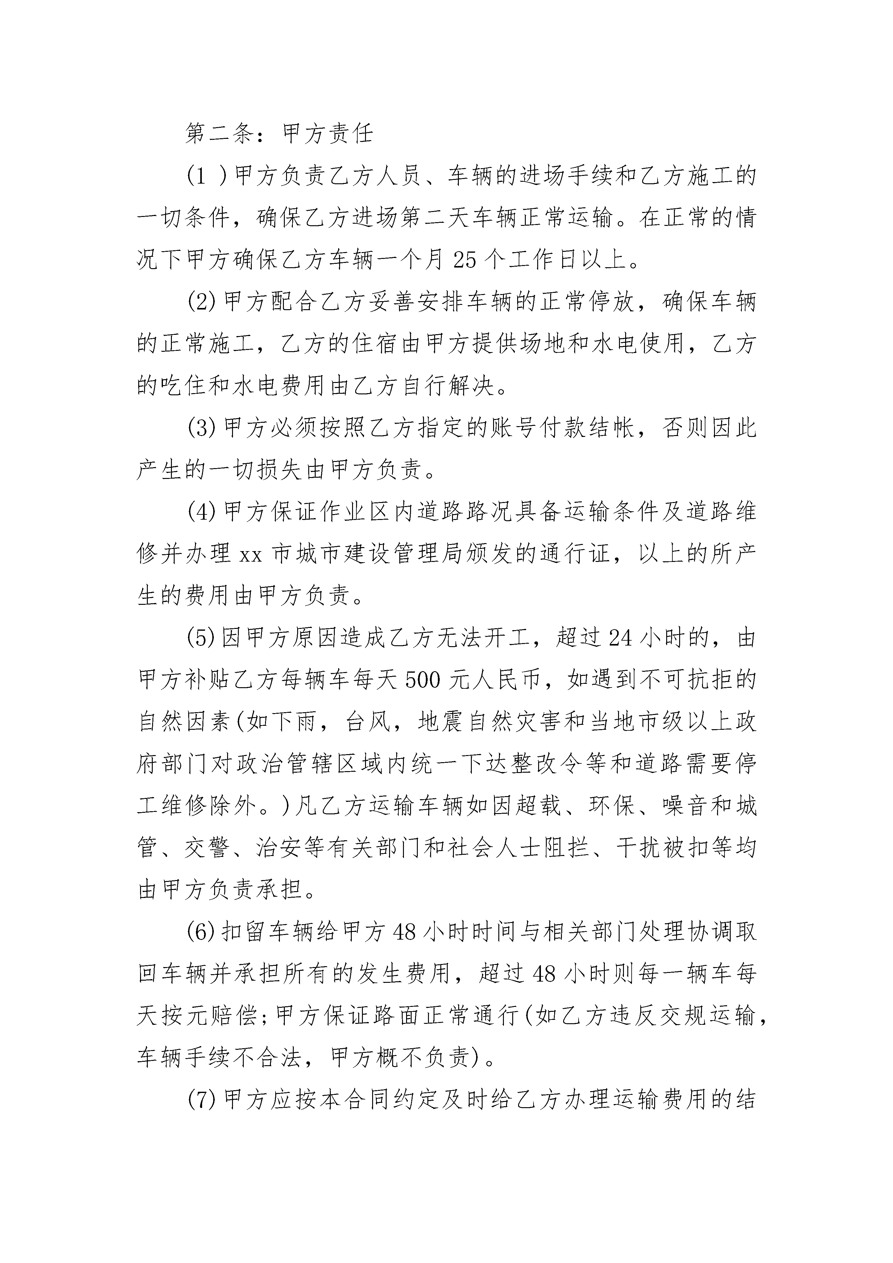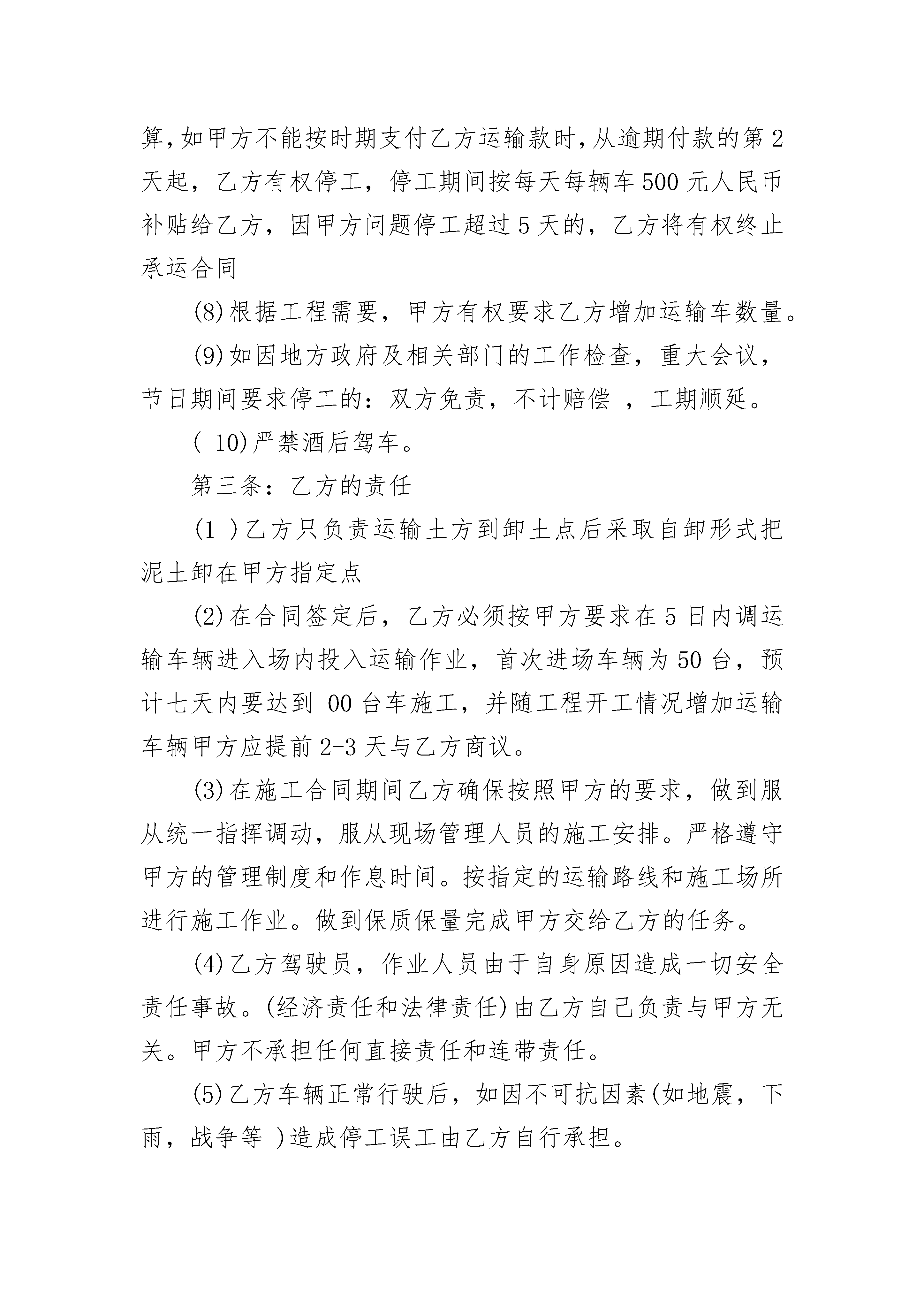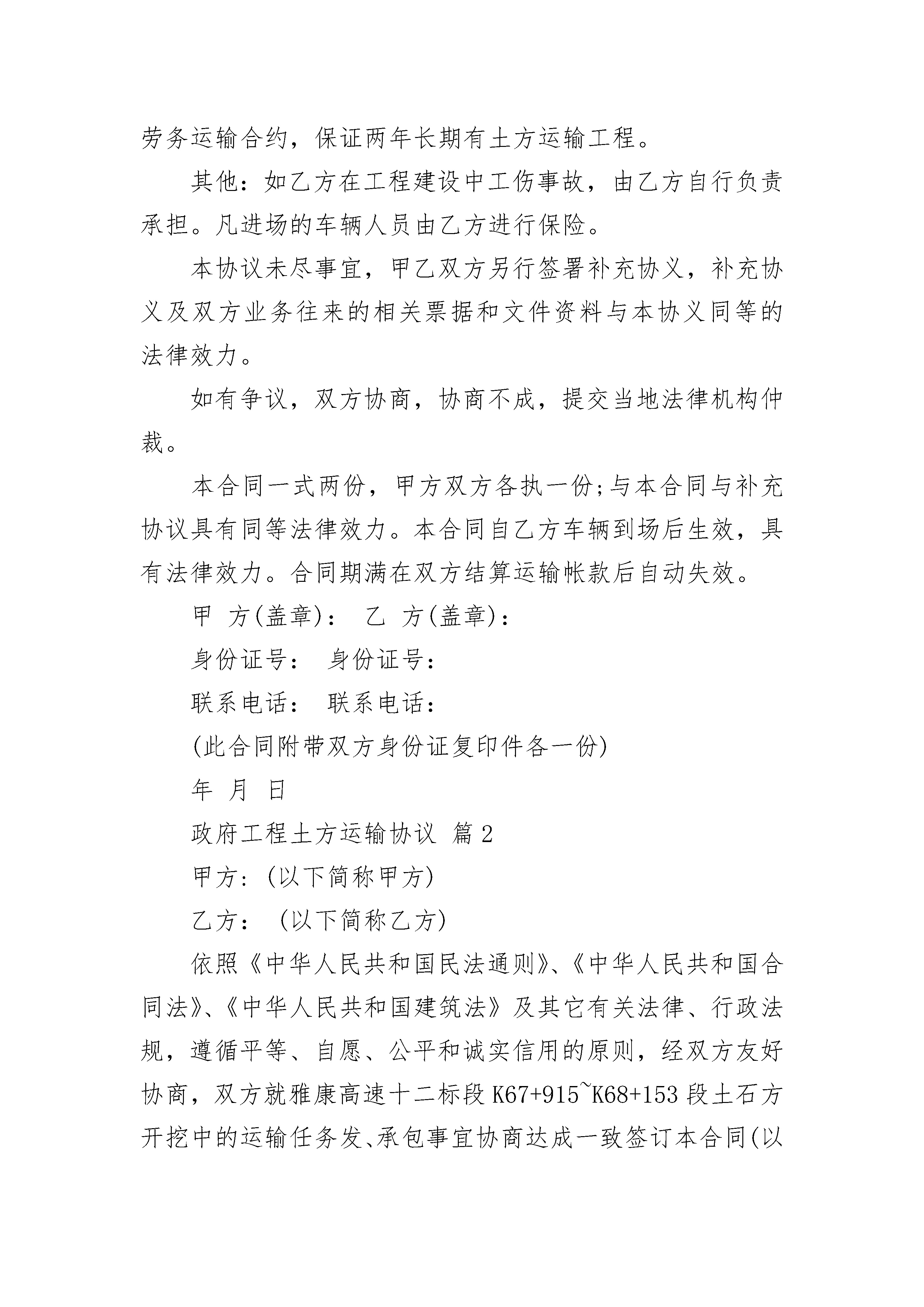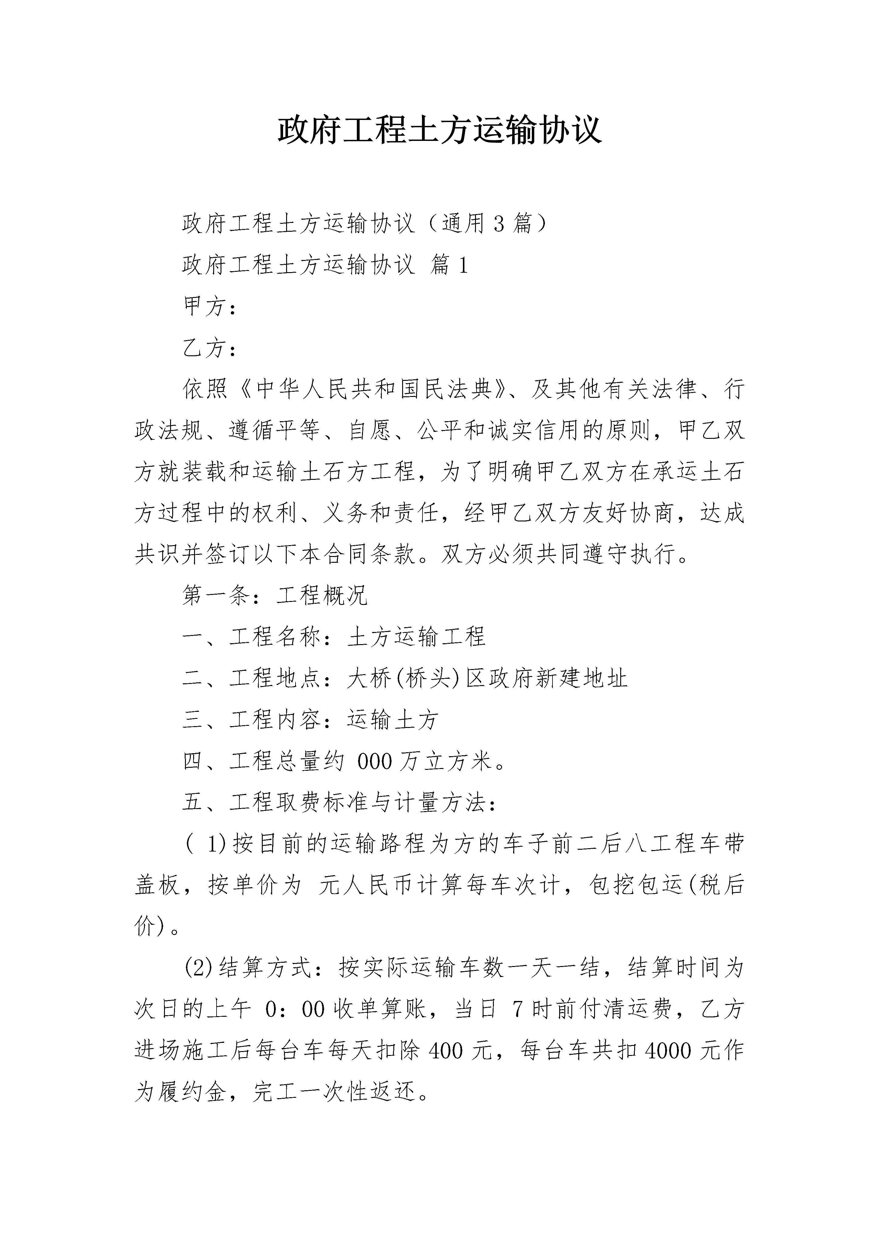 政府工程土方运输协议政府工程土方运输协议(通用3篇)政府工程土方运输协议篇1甲方:乙方:依照《中华人民共和国民法典》、及其他有关法律、行政法规、遵循平等、自愿、公平和诚实信用的原则,甲乙双方就装载和运输土石方工程,为了明确甲乙双方在承运土石方过程中的权利、义务和责任,经甲乙双方友好协商,达成共识并签订以下本合同条款。双方必须共同遵守执行。第一条:工程概况一、工程名称:土方运输工程二、工程地点:大桥(桥头)区政府新建地址三、工程内容:运输土方四、工程总量约000万立方米。五、工程取费标准与计量方法:(1)按目前的运输路程为方的车子前二后八工程车带盖板,按单价为元人民币计算每车次计,包挖包运(税后价)。(2)结算方式:按实际运输车数一天一结,结算时间为次日的上午0:00收单算账,当日7时前付清运费,乙方进场施工后每台车每天扣除400元,每台车共扣4000元作为履约金,完工一次性返还。第二条:甲方责任(1)甲方负责乙方人员、车辆的进场手续和乙方施工的一切条件,确保乙方进场第二天车辆正常运输。在正常的情况下甲方确保乙方车辆一个月25个工作日以上。(2)甲方配合乙方妥善安排车辆的正常停放,确保车辆的正常施工,乙方的住宿由甲方提供场地和水电使用,乙方的吃住和水电费用由乙方自行解决。(3)甲方必须按照乙方指定的账号付款结帐,否则因此产生的一切损失由甲方负责。(4)甲方保证作业区内道路路况具备运输条件及道路维修并办理xx市城市建设管理局颁发的通行证,以上的所产生的费用由甲方负责。(5)因甲方原因造成乙方无法开工,超过24小时的,由甲方补贴乙方每辆车每天500元人民币,如遇到不可抗拒的自然因素(如下雨,台风,地震自然灾害和当地市级以上政府部门对政治管辖区域内统一下达整改令等和道路需要停工维修除外。)凡乙方运输车辆如因超载、环保、噪音和城管、交警、治安等有关部门和社会人士阻拦、干扰被扣等均由甲方负责承担。(6)扣留车辆给甲方48小时时间与相关部门处理协调取回车辆并承担所有的发生费用,超过48小时则每一辆车每天按元赔偿;甲方保证路面正常通行(如乙方违反交规运输,车辆手续不合法,甲方概不负责)。(7)甲方应按本合同约定及时给乙方办理运输费用的结算,如甲方不能按时期支付乙方运输款时,从逾期付款的第2天起,乙方有权停工,停工期间按每天每辆车500元人民币补贴给乙方,因甲方问题停工超过5天的,乙方将有权终止承运合同(8)根据工程需要,甲方有权要求乙方增加运输车数量。(9)如因地方政府及相关部门的工作检查,重大会议,节日期间要求停工的:双方免责,不计赔偿,工期顺延。(10)严禁酒后驾车。第三条:乙方的责任(1)乙方只负责运输土方到卸土点后采取自卸形式把泥土卸在甲方指定点(2)在合同签定后,乙方必须按甲方要求在5日内调运输车辆进入场内投入运输作业,首次进场车辆为50台,预计七天内要达到00台车施工,并随工程开工情况增加运输车辆甲方应提前2-3天与乙方商议。(3)在施工合同期间乙方确保按照甲方的要求,做到服从统一指挥调动,服从现场管理人员的施工安排。严格遵守甲方的管理制度和作息时间。按指定的运输路线和施工场所进行施工作业。做到保质保量完成甲方交给乙方的任务。(4)乙方驾驶员,作业人员由于自身原因造成一切安全责任事故。(经济责任和法律责任)由乙方自己负责与甲方无关。甲方不承担任何直接责任和连带责任。(5)乙方车辆正常行驶后,如因不可抗因素(如地震,下雨,战争等)造成停工误工由乙方自行承担。(6)甲方工程量加大,需增加车辆,甲方提前通知乙方,乙方必须尽量增加车辆;甲方另外增加车辆,必须与乙方协商并同意后方可增加,如乙方达不到甲方要求,甲方可自行增加。(7)施工期间乙方不能随意退场、必须每天保证按甲方要求车辆数量施工,车辆正常维修保养除外,如乙方车辆无故退场,乙方必须补足车辆。(8)甲方提供住宿场地,车辆及私人财务由乙方自行看管。甲方提供乙方作业车辆停车地点工地现场。(9)为了顺利完成工程的施工任务,乙方在没有征得甲方的同意,不得中途无故退场或故意停工,中途无故退场或者中途无故停工需赔偿违约金五十万元给甲方。如中途甲方无故要求乙方退场或无故要求停工需赔偿违约金五十万元给乙方。第四条:合同纠纷因履行本合同发生的一切争议,由当事人双方协商或调解解决、协商或调解不成可提交仲裁委员会当地法院处理。第五条:附则(1)同自双方盖章签字之日起生效。合同履行完毕后自行终止合同。(2)同如遇未尽事宜。双方可以根据具体情况议定附加条款,按双方协商同意的方案执行。如双方争执不清,可向当地有关部门申请调解或仲裁。(3)此项工程完工前,乙方愿意,可与甲方签订两年的劳务运输合约,保证两年长期有土方运输工程。其他:如乙方在工程建设中工伤事故,由乙方自行负责承担。凡进场的车辆人员由乙方进行保险。