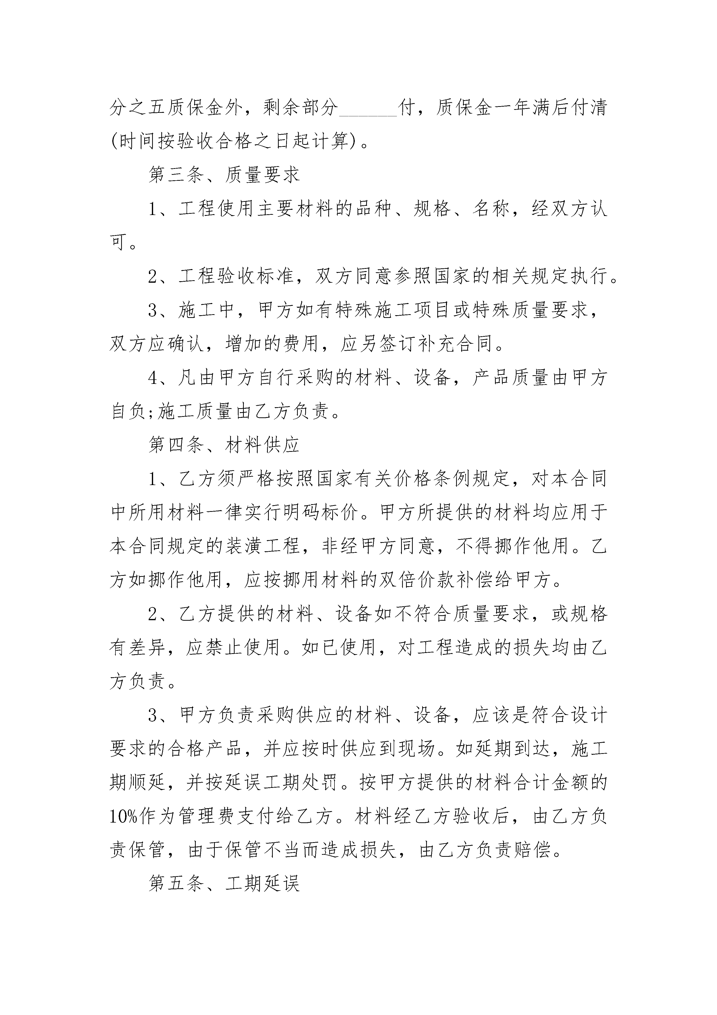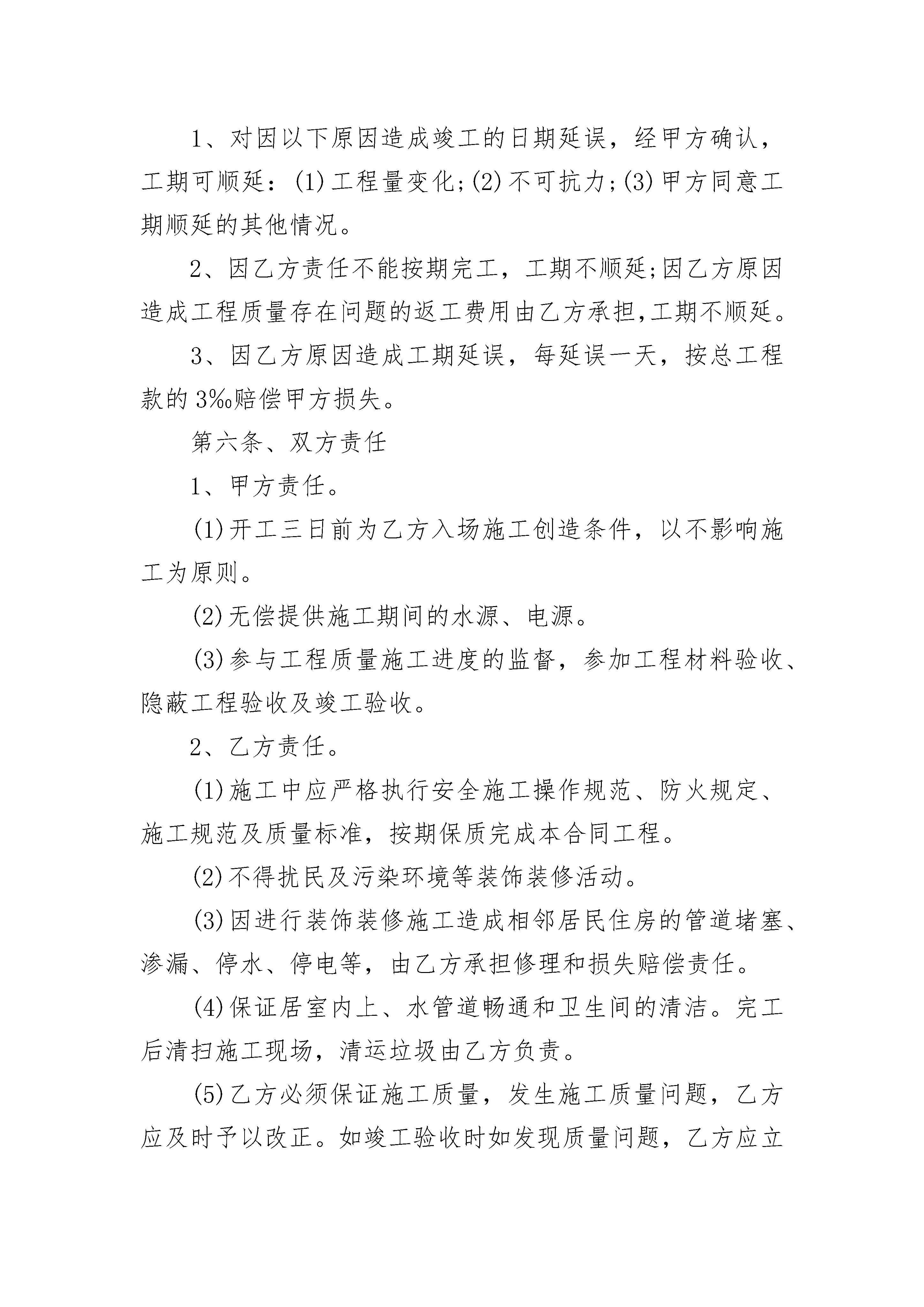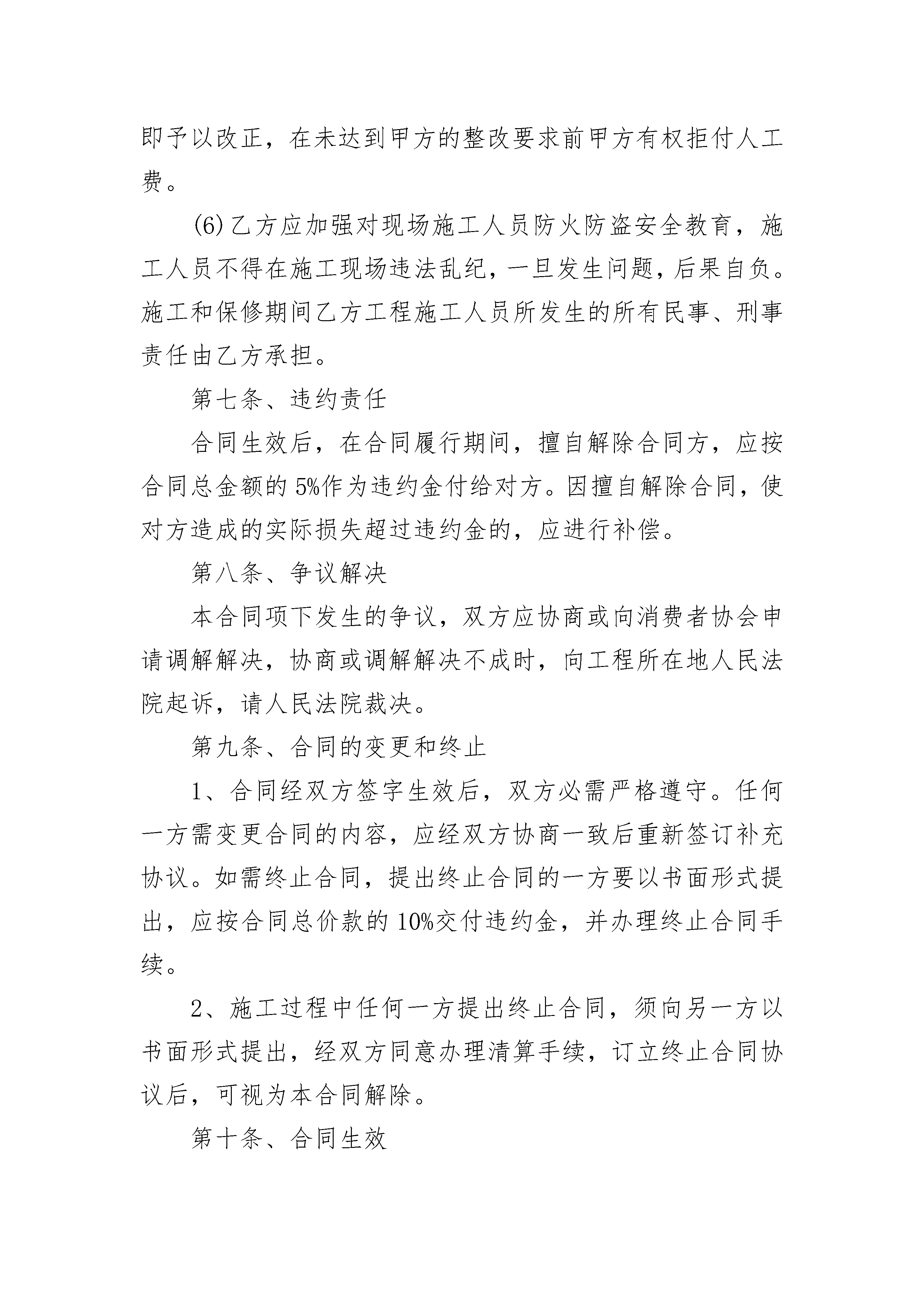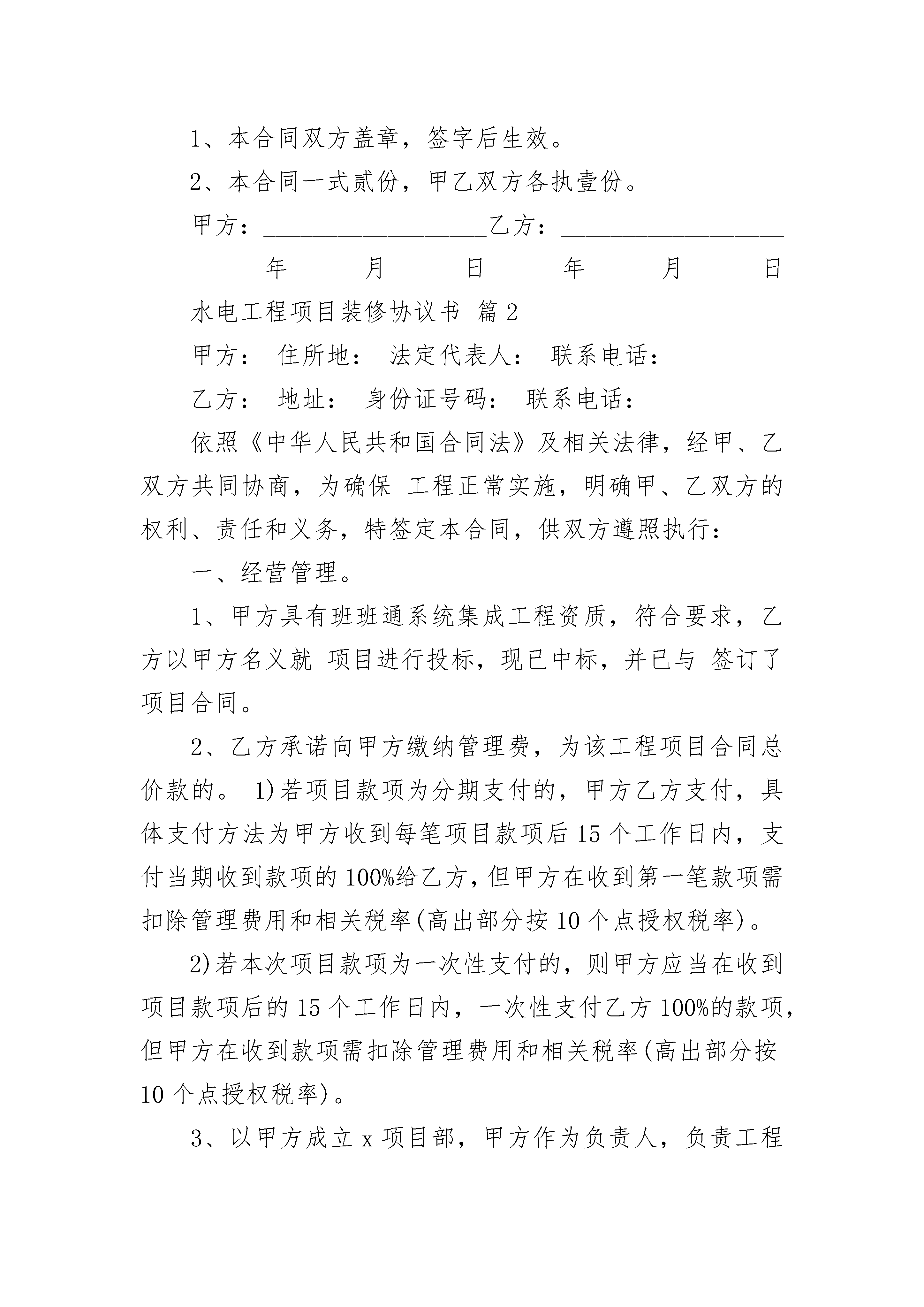 水电工程项目装修协议书水电工程项目装修协议书(精选3篇)水电工程项目装修协议书篇1委托方(甲方):______________承接方(乙方):______________依照《中华人民共和国民法典》及其它有关法律、法规,遵循平等自愿、公平和诚实信用的原则,双方就本工程承包事项协商一致,签订本合同。第一条、工程概况1、工程地址:______________2、工程范围:该工程总面积为______平方米,施工面积为______平方米。3、工程内容:______________4、承包方式:包工包料大包干交钥匙工程。5、工程期限:工程期限为______天,开工日期是______年______月______日,竣工日期是______年______月______日。第二条、工程价款及付款方式1、工程总承包价为______元。2、上述总承包价为包干价,包含本合同所有工作内容,包工包料及其它一切费用(包括拆房,打围墙),甲方无需再向乙方支付任何费用。3、付款方式:竣工验收后付______元,除总金额的百分之五质保金外,剩余部分______付,质保金一年满后付清(时间按验收合格之日起计算)。第三条、质量要求1、工程使用主要材料的品种、规格、名称,经双方认可。2、工程验收标准,双方同意参照国家的相关规定执行。3、施工中,甲方如有特殊施工项目或特殊质量要求,双方应确认,增加的费用,应另签订补充合同。4、凡由甲方自行采购的材料、设备,产品质量由甲方自负;施工质量由乙方负责。第四条、材料供应1、乙方须严格按照国家有关价格条例规定,对本合同中所用材料一律实行明码标价。甲方所提供的材料均应用于本合同规定的装潢工程,非经甲方同意,不得挪作他用。乙方如挪作他用,应按挪用材料的双倍价款补偿给甲方。2、乙方提供的材料、设备如不符合质量要求,或规格有差异,应禁止使用。如已使用,对工程造成的损失均由乙方负责。3、甲方负责采购供应的材料、设备,应该是符合设计要求的合格产品,并应按时供应到现场。如延期到达,施工期顺延,并按延误工期处罚。按甲方提供的材料合计金额的10%作为管理费支付给乙方。材料经乙方验收后,由乙方负责保管,由于保管不当而造成损失,由乙方负责赔偿。第五条、工期延误1、对因以下原因造成竣工的日期延误,经甲方确认,工期可顺延:(1)工程量变化;(2)不可抗力;(3)甲方同意工期顺延的其他情况。2、因乙方责任不能按期完工,工期不顺延;因乙方原因造成工程质量存在问题的返工费用由乙方承担,工期不顺延。3、因乙方原因造成工期延误,每延误一天,按总工程款的3‰赔偿甲方损失。第六条、双方责任1、甲方责任。(1)开工三日前为乙方入场施工创造条件,以不影响施工为原则。(2)无偿提供施工期间的水源、电源。(3)参与工程质量施工进度的监督,参加工程材料验收、隐蔽工程验收及竣工验收。2、乙方责任。(1)施工中应严格执行安全施工操作规范、防火规定、施工规范及质量标准,按期保质完成本合同工程。(2)不得扰民及污染环境等装饰装修活动。(3)因进行装饰装修施工造成相邻居民住房的管道堵塞、渗漏、停水、停电等,由乙方承担修理和损失赔偿责任。(4)保证居室内上、水管道畅通和卫生间的清洁。完工后清扫施工现场,清运垃圾由乙方负责。(5)乙方必须保证施工质量,发生施工质量问题,乙方应及时予以改正。如竣工验收时如发现质量问题,乙方应立即予以改正,在未达到甲方的整改要求前甲方有权拒付人工费。(6)乙方应加强对现场施工人员防火防盗安全教育,施工人员不得在施工现场违法乱纪,一旦发生问题,后果自负。施工和保修期间乙方工程施工人员所发生的所有民事、刑事责任由乙方承担。第七条、违约责任合同生效后,在合同履行期间,擅自解除合同方,应按合同总金额的5%作为违约金付给对方。因擅自解除合同,使对方造成的实际损失超过违约金的,应进行补偿。第八条、争议解决本合同项下发生的争议,双方应协商或向消费者协会申请调解解决,协商或调解解决不成时,向工程所在地人民法院起诉,请人民法院裁决。第九条、合同的变更和终止1、合同经双方签字生效后,双方必需严格遵守。任何一方需变更合同的内容,应经双方协商一致后重新签订补充协议。如需终止合同,提出终止合同的一方要以书面形式提出,应按合同总价款的10%交付违约金,并办理终止合同手续。2、施工过程中任何一方提出终止合同,须向另一方以书面形式提出,经双方同意办理清算手续,订立终止合同协议后,可视为本合同解除。第十条、合同生效1、本合同双方盖章,签字后生效。2、本合同一式贰份,甲乙双方各执壹份。甲方:__________________乙方:________________________年______月______日______年______月______日水电工程项目装修协议书篇2甲方:住所地:法定代