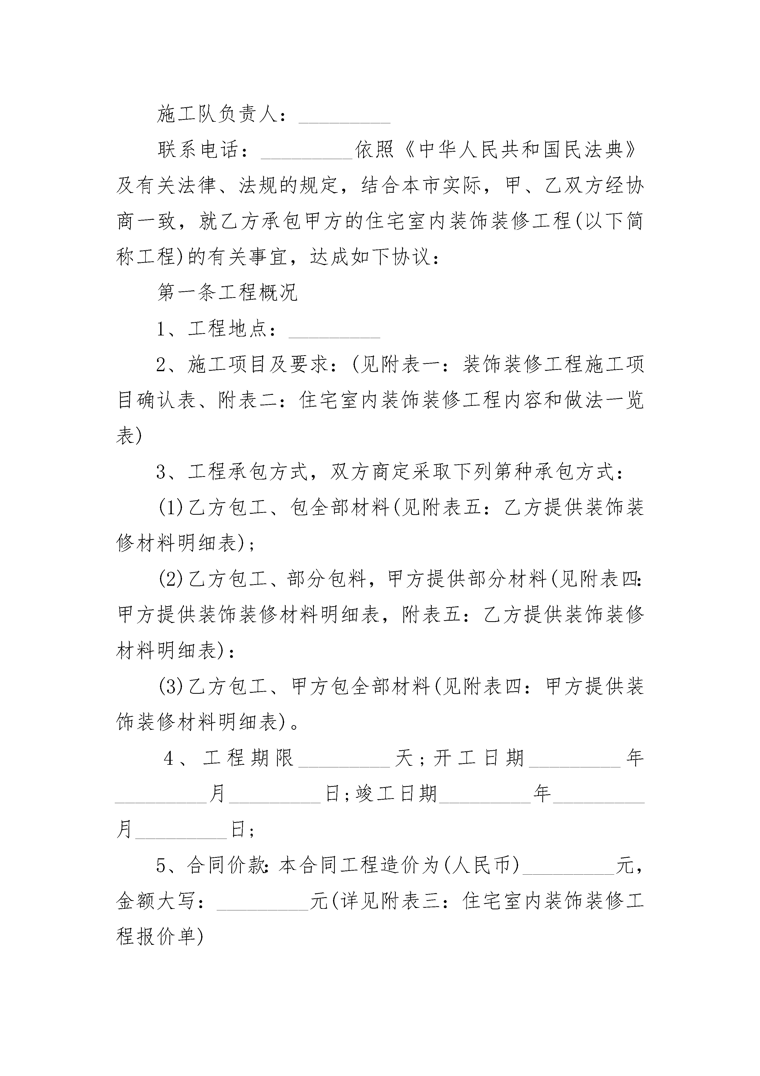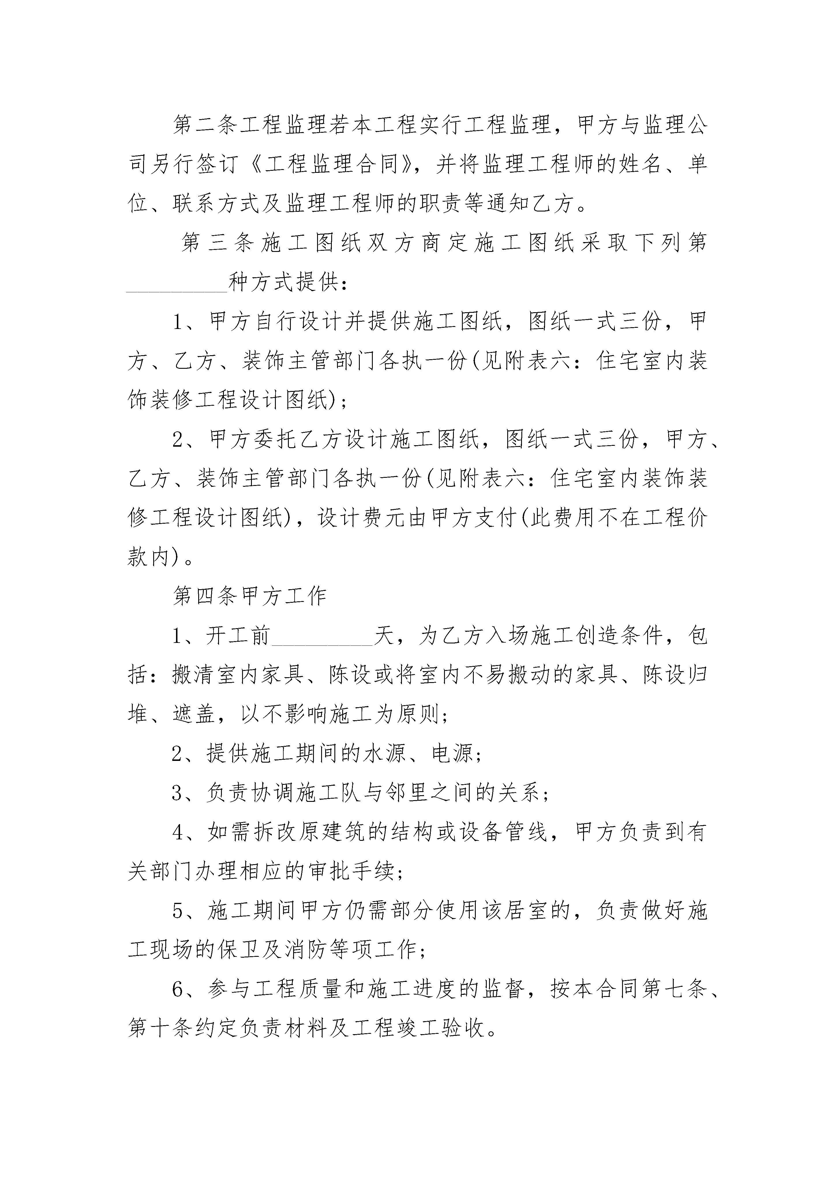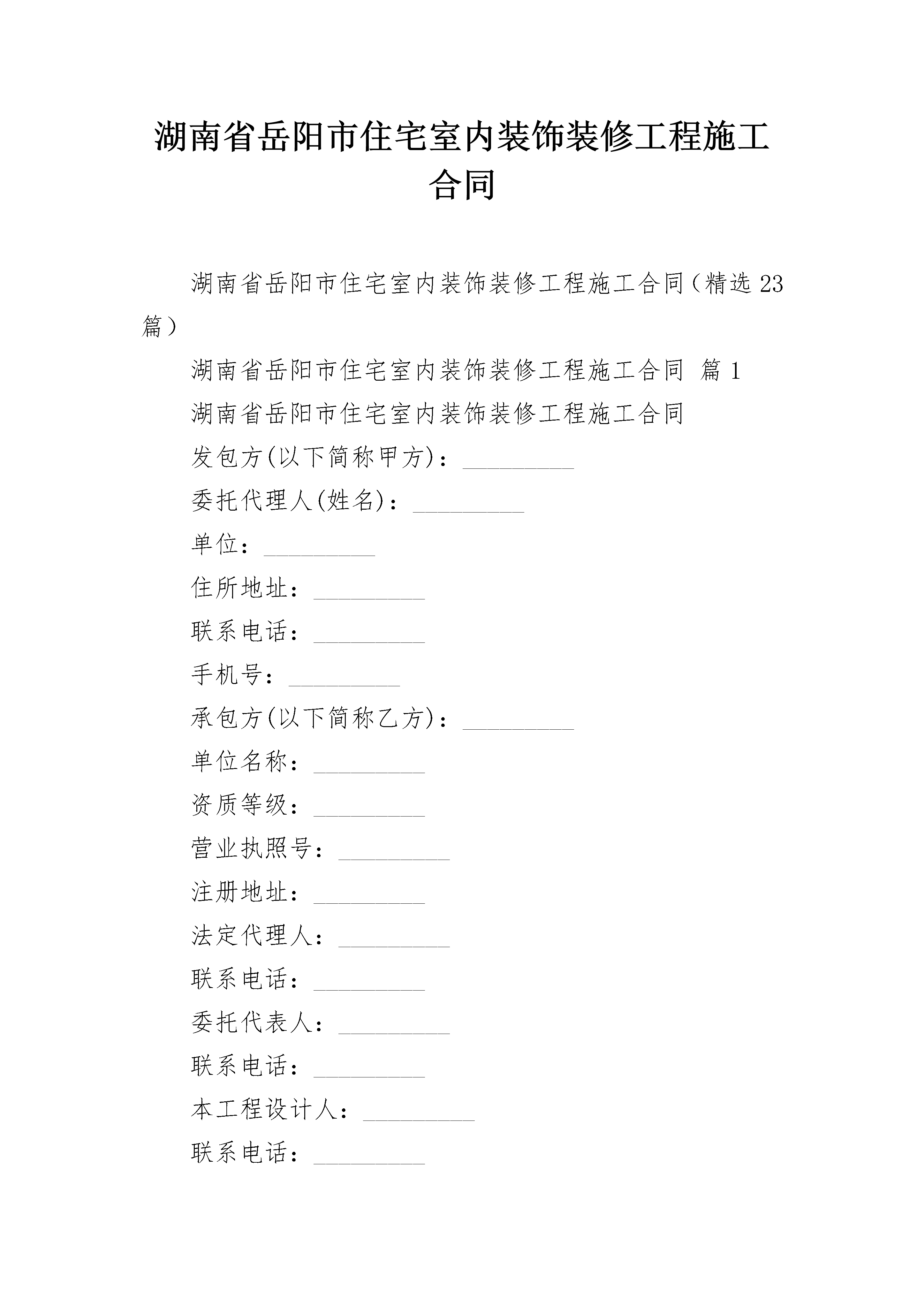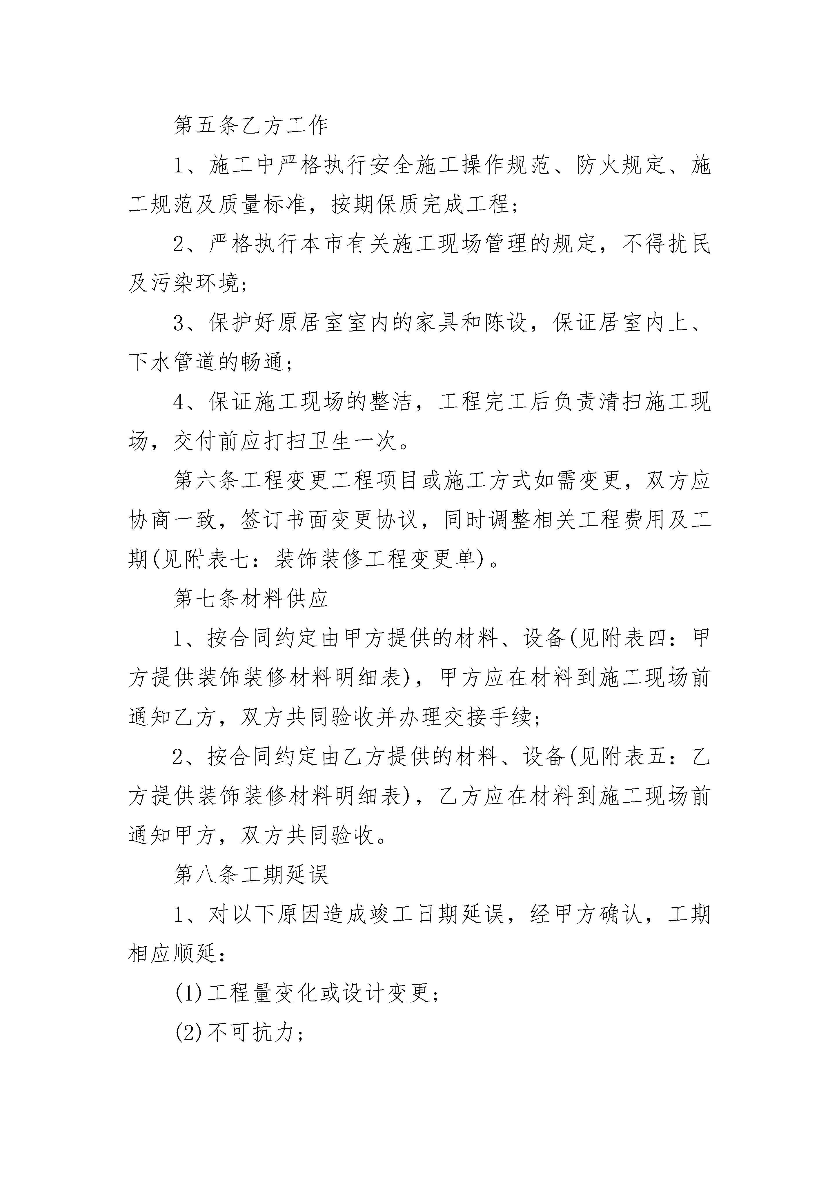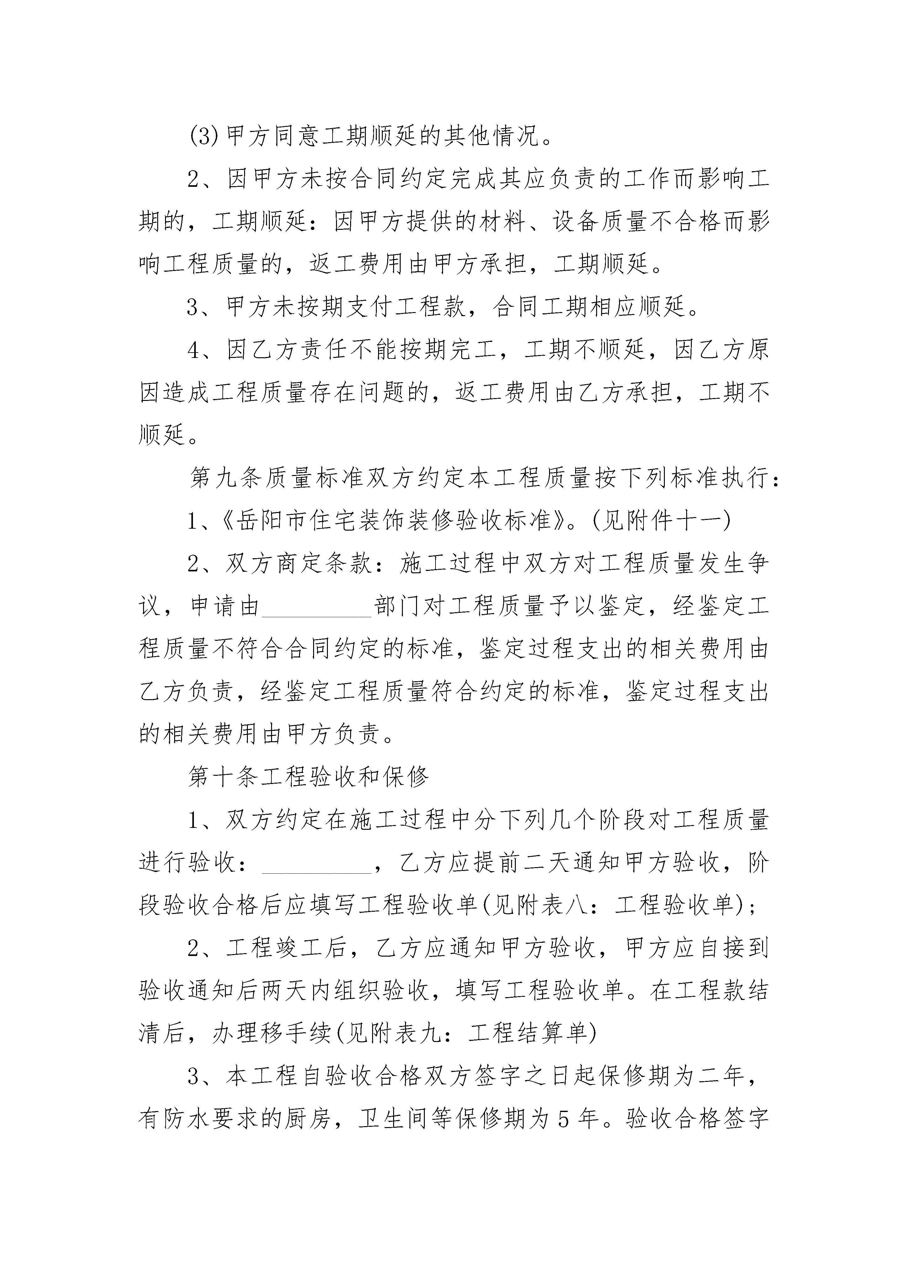 湖南省岳阳市住宅室内装饰装修工程施工合同湖南省岳阳市住宅室内装饰装修工程施工合同(精选23篇)湖南省岳阳市住宅室内装饰装修工程施工合同篇1湖南省岳阳市住宅室内装饰装修工程施工合同发包方(以下简称甲方):_________委托代理人(姓名):_________单位:_________住所地址:_________联系电话:_________手机号:_________承包方(以下简称乙方):_________单位名称:_________资质等级:_________营业执照号:_________注册地址:_________法定代理人:_________联系电话:_________委托代表人:_________联系电话:_________本工程设计人:_________联系电话:_________施工队负责人:_________联系电话:_________依照《中华人民共和国民法典》及有关法律、法规的规定,结合本市实际,甲、乙双方经协商一致,就乙方承包甲方的住宅室内装饰装修工程(以下简称工程)的有关事宜,达成如下协议:第一条工程概况1、工程地点:_________2、施工项目及要求:(见附表一:装饰装修工程施工项目确认表、附表二:住宅室内装饰装修工程内容和做法一览表)3、工程承包方式,双方商定采取下列第种承包方式:(1)乙方包工、包全部材料(见附表五:乙方提供装饰装修材料明细表);(2)乙方包工、部分包料,甲方提供部分材料(见附表四:甲方提供装饰装修材料明细表,附表五:乙方提供装饰装修材料明细表):(3)乙方包工、甲方包全部材料(见附表四:甲方提供装饰装修材料明细表)。4、工程期限_________天;开工日期_________年_________月_________日;竣工日期_________年_________月_________日;5、合同价款:本合同工程造价为(人民币)_________元,金额大写:_________元(详见附表三:住宅室内装饰装修工程报价单)第二条工程监理若本工程实行工程监理,甲方与监理公司另行签订《工程监理合同》,并将监理工程师的姓名、单位、联系方式及监理工程师的职责等通知乙方。第三条施工图纸双方商定施工图纸采取下列第_________种方式提供:1、甲方自行设计并提供施工图纸,图纸一式三份,甲方、乙方、装饰主管部门各执一份(见附表六:住宅室内装饰装修工程设计图纸);2、甲方委托乙方设计施工图纸,图纸一式三份,甲方、乙方、装饰主管部门各执一份(见附表六:住宅室内装饰装修工程设计图纸),设计费元由甲方支付(此费用不在工程价款内)。第四条甲方工作1、开工前_________天,为乙方入场施工创造条件,包括:搬清室内家具、陈设或将室内不易搬动的家具、陈设归堆、遮盖,以不影响施工为原则;2、提供施工期间的水源、电源;3、负责协调施工队与邻里之间的关系;4、如需拆改原建筑的结构或设备管线,甲方负责到有关部门办理相应的审批手续;5、施工期间甲方仍需部分使用该居室的,负责做好施工现场的保卫及消防等项工作;6、参与工程质量和施工进度的监督,按本合同第七条、第十条约定负责材料及工程竣工验收。第五条乙方工作1、施工中严格执行安全施工操作规范、防火规定、施工规范及质量标准,按期保质完成工程;2、严格执行本市有关施工现场管理的规定,不得扰民及污染环境;3、保护好原居室室内的家具和陈设,保证居室内上、下水管道的畅通;4、保证施工现场的整洁,工程完工后负责清扫施工现场,交付前应打扫卫生一次。第六条工程变更工程项目或施工方式如需变更,双方应协商一致,签订书面变更协议,同时调整相关工程费用及工期(见附表七:装饰装修工程变更单)。第七条材料供应1、按合同约定由甲方提供的材料、设备(见附表四:甲方提供装饰装修材料明细表),甲方应在材料到施工现场前通知乙方,双方共同验收并办理交接手续;2、按合同约定由乙方提供的材料、设备(见附表五:乙方提供装饰装修材料明细表),乙方应在材料到施工现场前通知甲方,双方共同验收。第八条工期延误1、对以下原因造成竣工日期延误,经甲方确认,工期相应顺延:(1)工程量变化或设计变更;(2)不可抗力;(3)甲方同意工期顺延的其他情况。2、因甲方未按合同约定完成其应负责的工作而影响工期的,工期顺延:因甲方提供的材料、设备质量不合格而影响工程质量的,返工费用由甲方承担,工期顺延。3、甲方未按期支付工程款,合同工期相应顺延。4、因乙方责任不能按期完工,工期不顺延,因乙方原因造成工程质量存在问题的,返工费用由乙方承担,工期不顺延。第九条质量标准双方约定本工程质量按下列标准执行:1、《岳阳市住宅装饰装修验收标准》。(见附件十一)2、双方商定条款:施工过程中双方对工程质量发生争议,申请由_________部门对工程质量予以鉴定,
