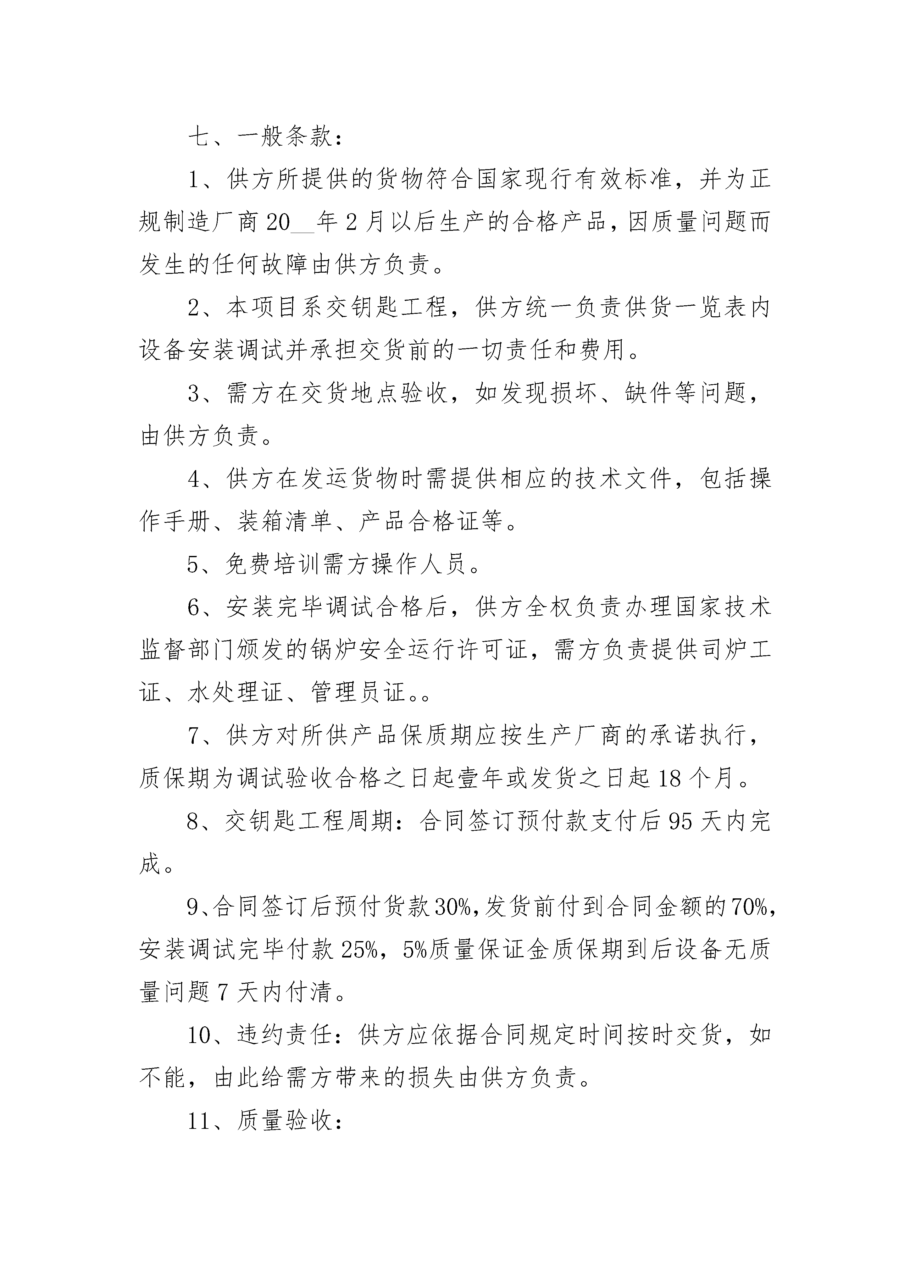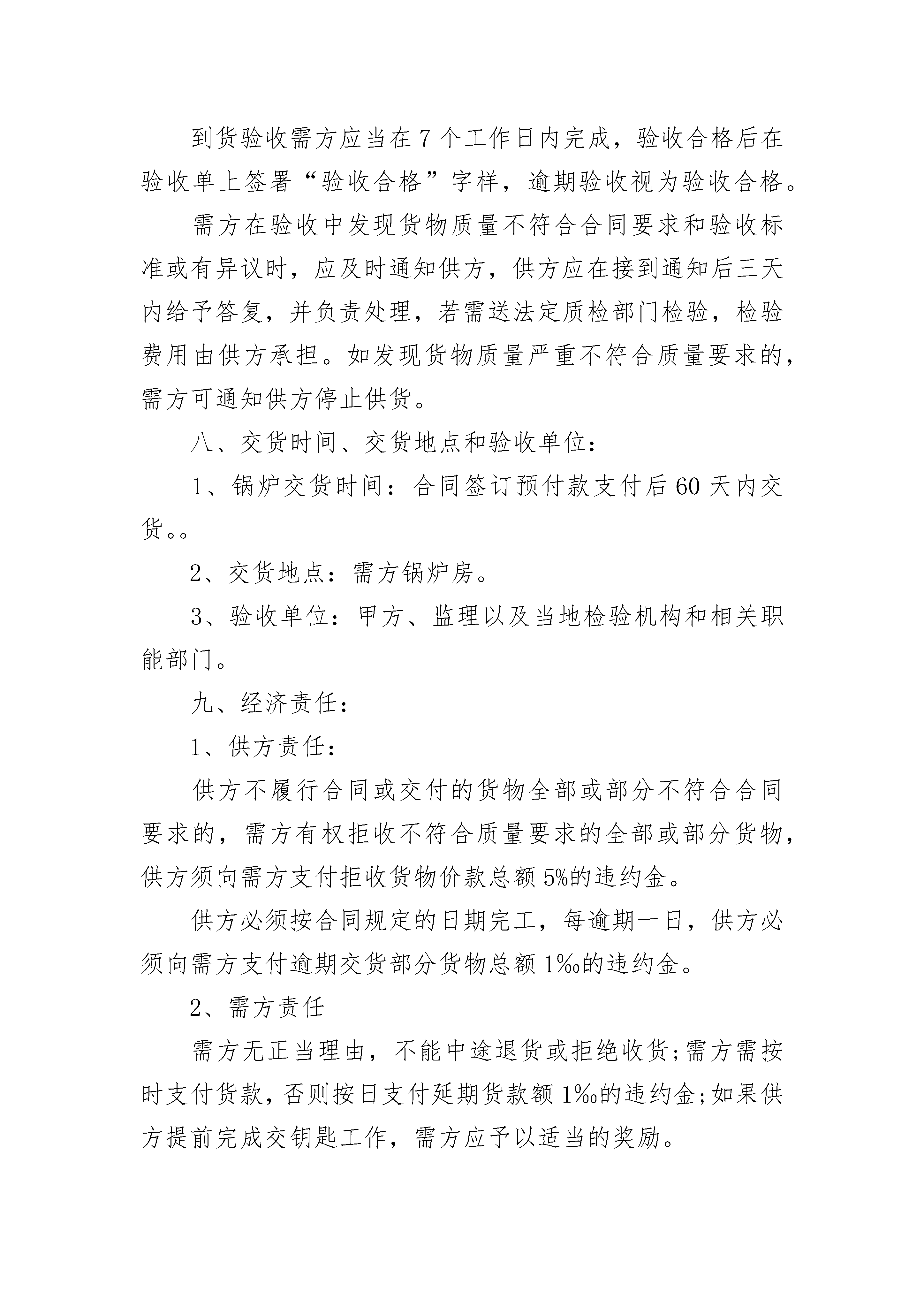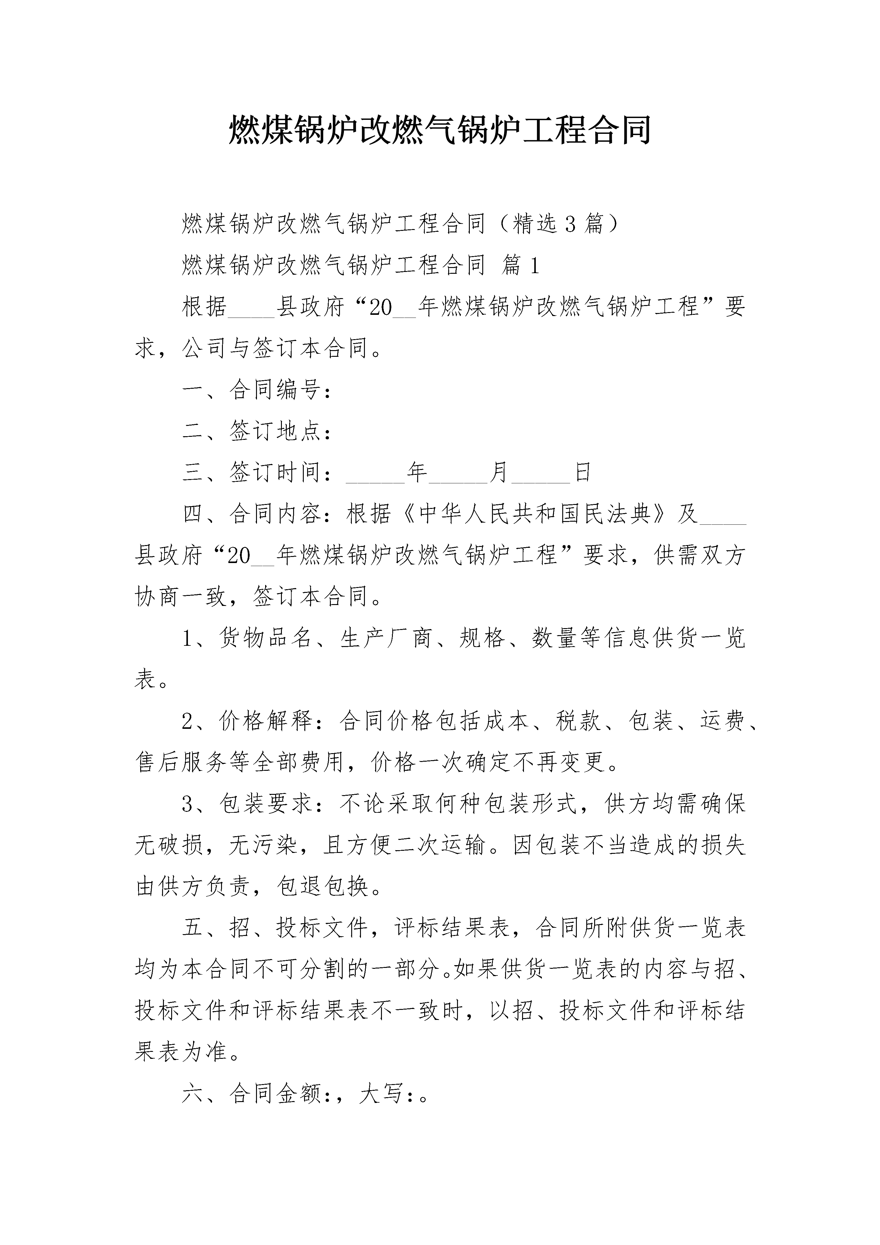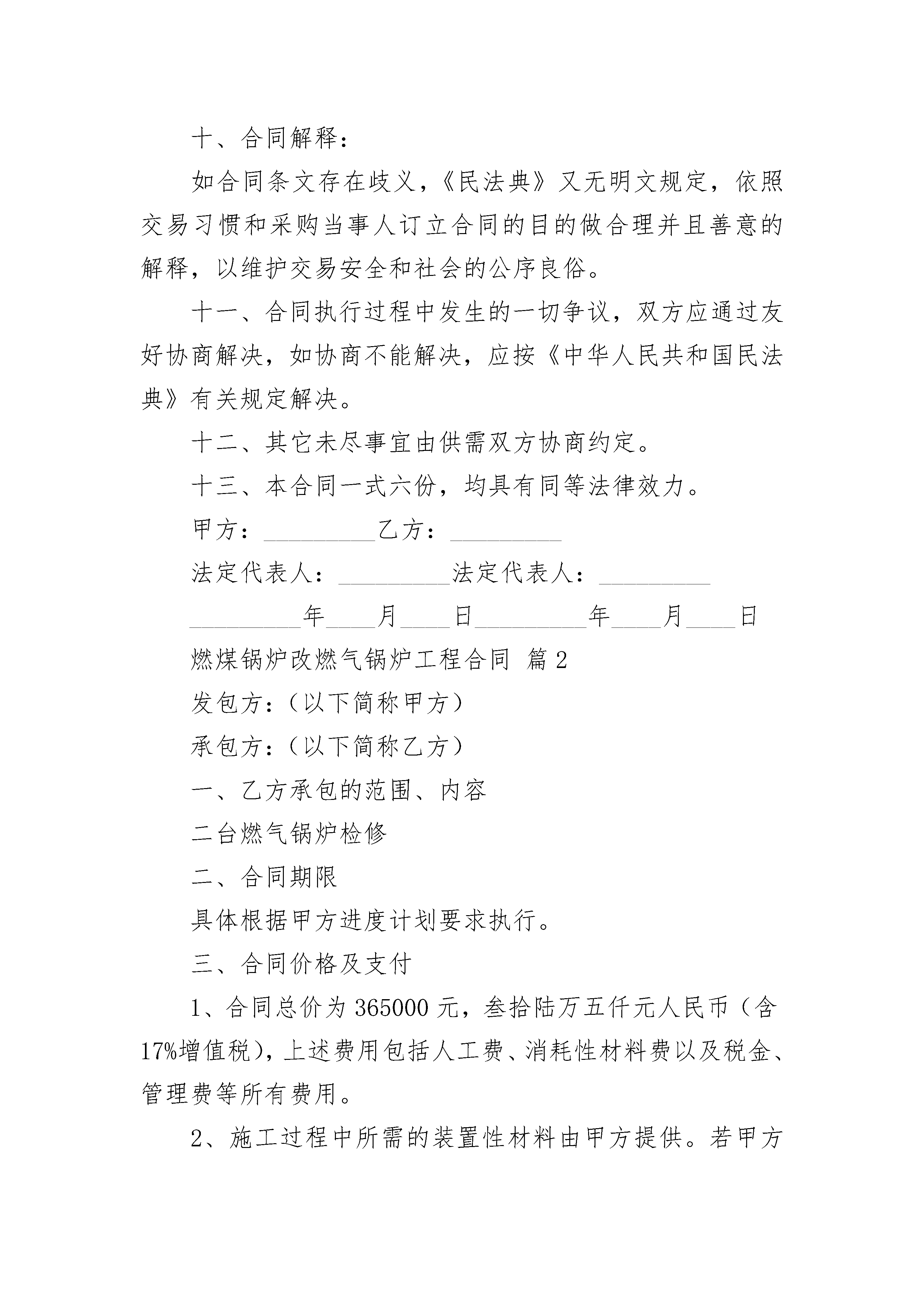 燃煤锅炉改燃气锅炉工程合同燃煤锅炉改燃气锅炉工程合同(精选3篇)燃煤锅炉改燃气锅炉工程合同篇1根据____县政府“20__年燃煤锅炉改燃气锅炉工程”要求,公司与签订本合同。一、合同编号:二、签订地点:三、签订时间:_____年_____月_____日四、合同内容:根据《中华人民共和国民法典》及____县政府“20__年燃煤锅炉改燃气锅炉工程”要求,供需双方协商一致,签订本合同。1、货物品名、生产厂商、规格、数量等信息供货一览表。2、价格解释:合同价格包括成本、税款、包装、运费、售后服务等全部费用,价格一次确定不再变更。3、包装要求:不论采取何种包装形式,供方均需确保无破损,无污染,且方便二次运输。因包装不当造成的损失由供方负责,包退包换。五、招、投标文件,评标结果表,合同所附供货一览表均为本合同不可分割的一部分。如果供货一览表的内容与招、投标文件和评标结果表不一致时,以招、投标文件和评标结果表为准。六、合同金额:,大写:。七、一般条款:1、供方所提供的货物符合国家现行有效标准,并为正规制造厂商20__年2月以后生产的合格产品,因质量问题而发生的任何故障由供方负责。2、本项目系交钥匙工程,供方统一负责供货一览表内设备安装调试并承担交货前的一切责任和费用。3、需方在交货地点验收,如发现损坏、缺件等问题,由供方负责。4、供方在发运货物时需提供相应的技术文件,包括操作手册、装箱清单、产品合格证等。5、免费培训需方操作人员。6、安装完毕调试合格后,供方全权负责办理国家技术监督部门颁发的锅炉安全运行许可证,需方负责提供司炉工证、水处理证、管理员证。。7、供方对所供产品保质期应按生产厂商的承诺执行,质保期为调试验收合格之日起壹年或发货之日起18个月。8、交钥匙工程周期:合同签订预付款支付后95天内完成。9、合同签订后预付货款30%,发货前付到合同金额的70%,安装调试完毕付款25%,5%质量保证金质保期到后设备无质量问题7天内付清。10、违约责任:供方应依据合同规定时间按时交货,如不能,由此给需方带来的损失由供方负责。11、质量验收:到货验收需方应当在7个工作日内完成,验收合格后在验收单上签署“验收合格”字样,逾期验收视为验收合格。需方在验收中发现货物质量不符合合同要求和验收标准或有异议时,应及时通知供方,供方应在接到通知后三天内给予答复,并负责处理,若需送法定质检部门检验,检验费用由供方承担。如发现货物质量严重不符合质量要求的,需方可通知供方停止供货。八、交货时间、交货地点和验收单位:1、锅炉交货时间:合同签订预付款支付后60天内交货。。2、交货地点:需方锅炉房。3、验收单位:甲方、监理以及当地检验机构和相关职能部门。九、经济责任:1、供方责任:供方不履行合同或交付的货物全部或部分不符合合同要求的,需方有权拒收不符合质量要求的全部或部分货物,供方须向需方支付拒收货物价款总额5%的违约金。供方必须按合同规定的日期完工,每逾期一日,供方必须向需方支付逾期交货部分货物总额1‰的违约金。2、需方责任需方无正当理由,不能中途退货或拒绝收货;需方需按时支付货款,否则按日支付延期货款额1‰的违约金;如果供方提前完成交钥匙工作,需方应予以适当的奖励。十、合同解释:如合同条文存在歧义,《民法典》又无明文规定,依照交易习惯和采购当事人订立合同的目的做合理并且善意的解释,以维护交易安全和社会的公序良俗。十一、合同执行过程中发生的一切争议,双方应通过友好协商解决,如协商不能解决,应按《中华人民共和国民法典》有关规定解决。十二、其它未尽事宜由供需双方协商约定。十三、本合同一式六份,均具有同等法律效力。甲方:_________乙方:_________法定代表人:_________法定代表人:__________________年____月____日_________年____月____日燃煤锅炉改燃气锅炉工程合同篇2发包方:(以下简称甲方)承包方:(以下简称乙方)一、乙方承包的范围、内容二台燃气锅炉检修二、合同期限具体根据甲方进度计划要求执行。三、合同价格及支付1、合同总价为365000元,叁拾陆万五仟元人民币(含17%增值税),上述费用包括人工费、消耗性材料费以及税金、管理费等所有费用。2、施工过程中所需的装置性材料由甲方提供。若甲方需委托乙方采购,以委出具托单的形式委托乙方采购。3、费用支付付款的形式:合同履行完毕后,乙方向甲方提交全额增值税发票,甲方向乙方支付全部的合同价款。四、双方的权利和义务4.1甲方的权利与义务4.11甲方及时为乙方提供图纸和有关技术资料,并解决乙方提出或遇到与本工程相关的问题;4.12甲方有对工程施工进行过程检查、安全监督、质量检验、全面考核的权利;4.13甲方对乙方的施工、技术方案等有审查批准权;4.14甲方有权纠正并制止乙方在施