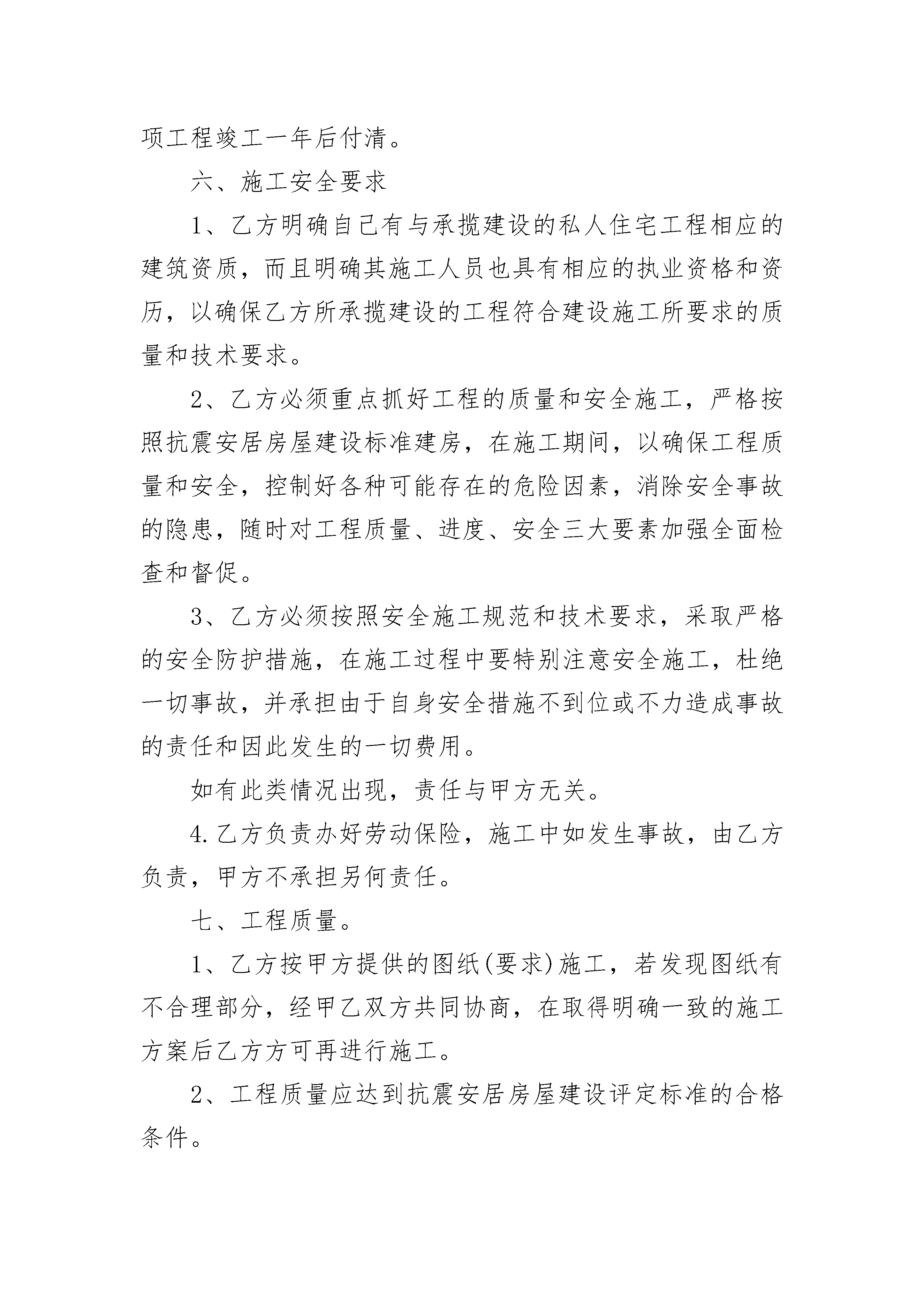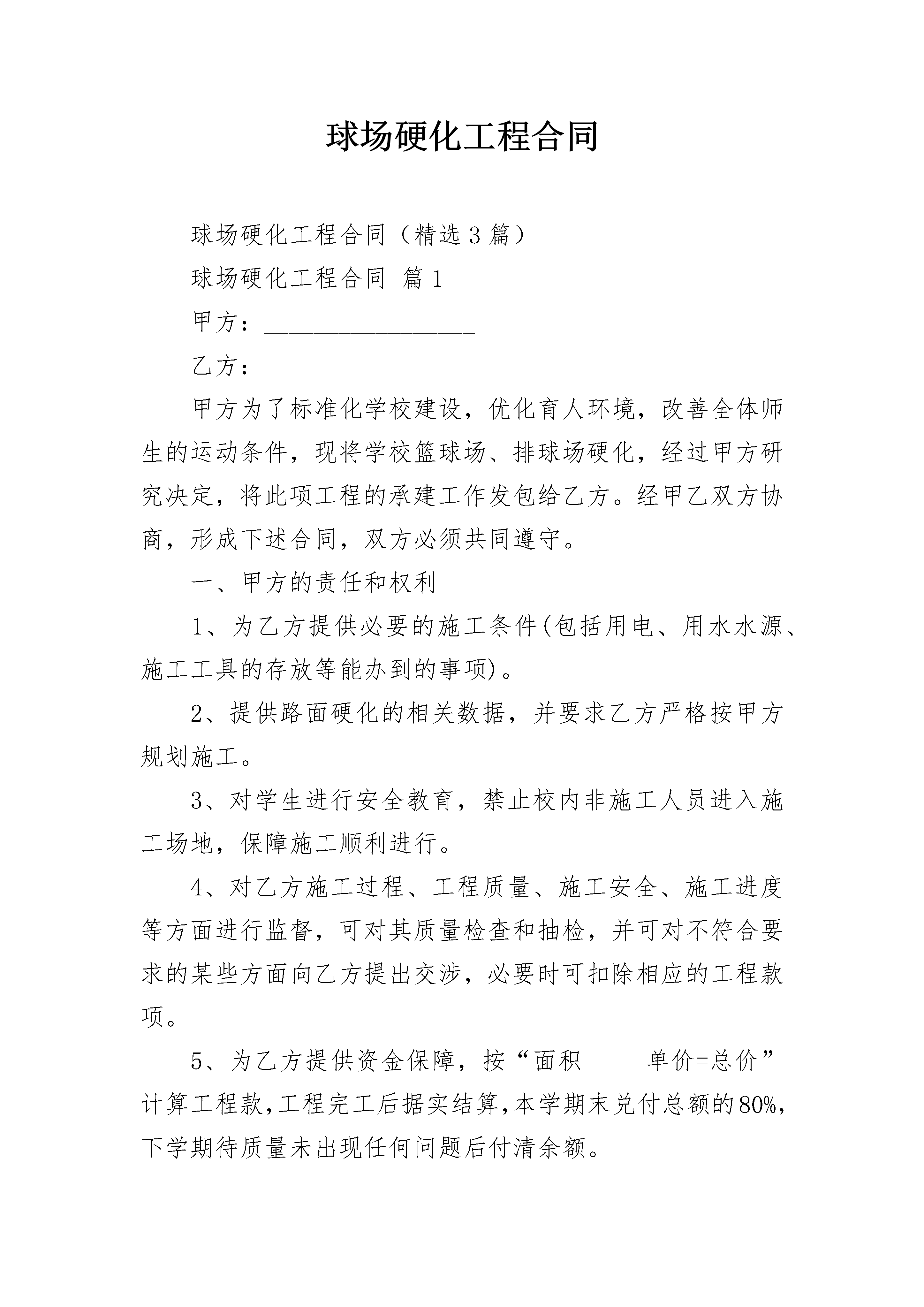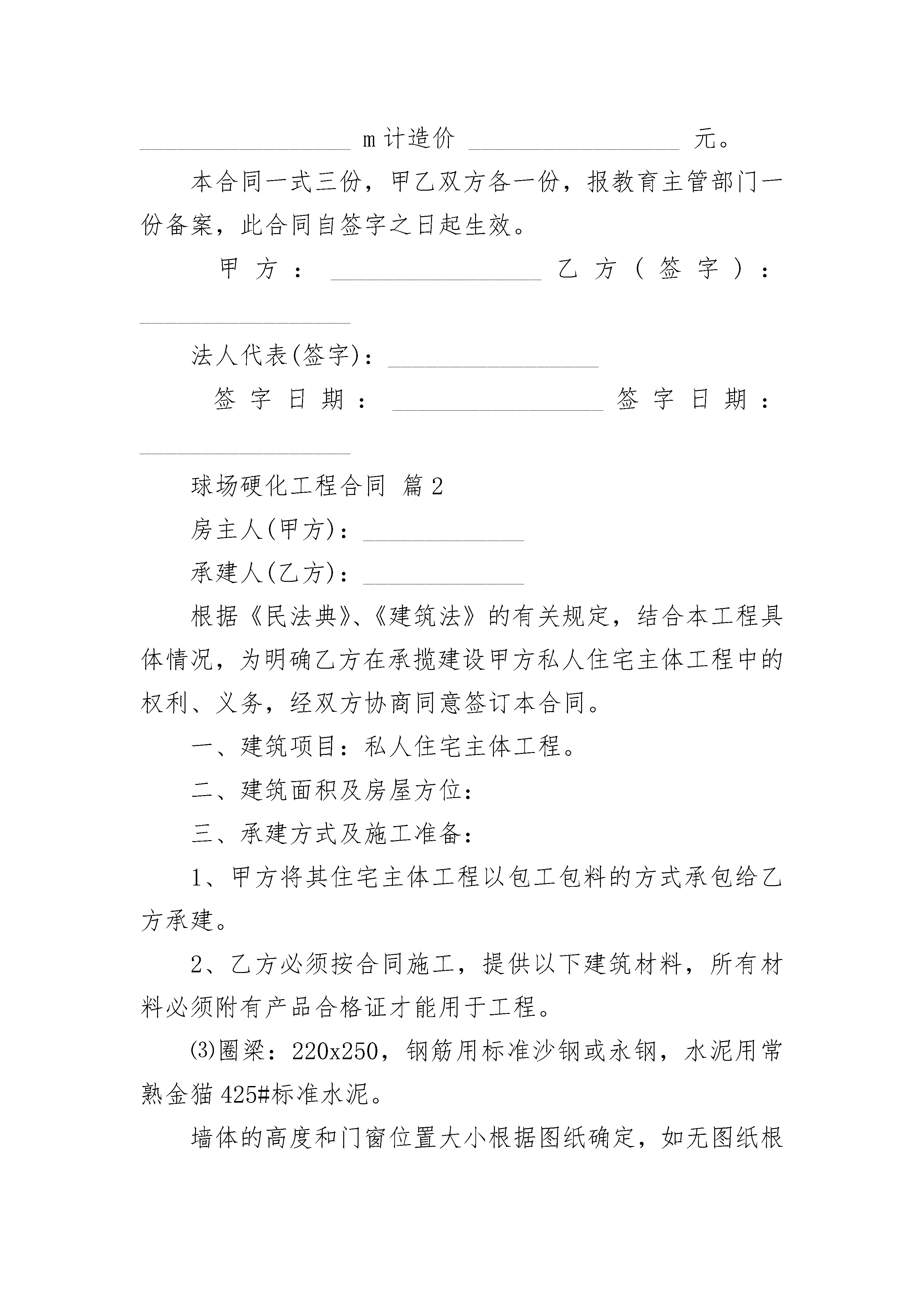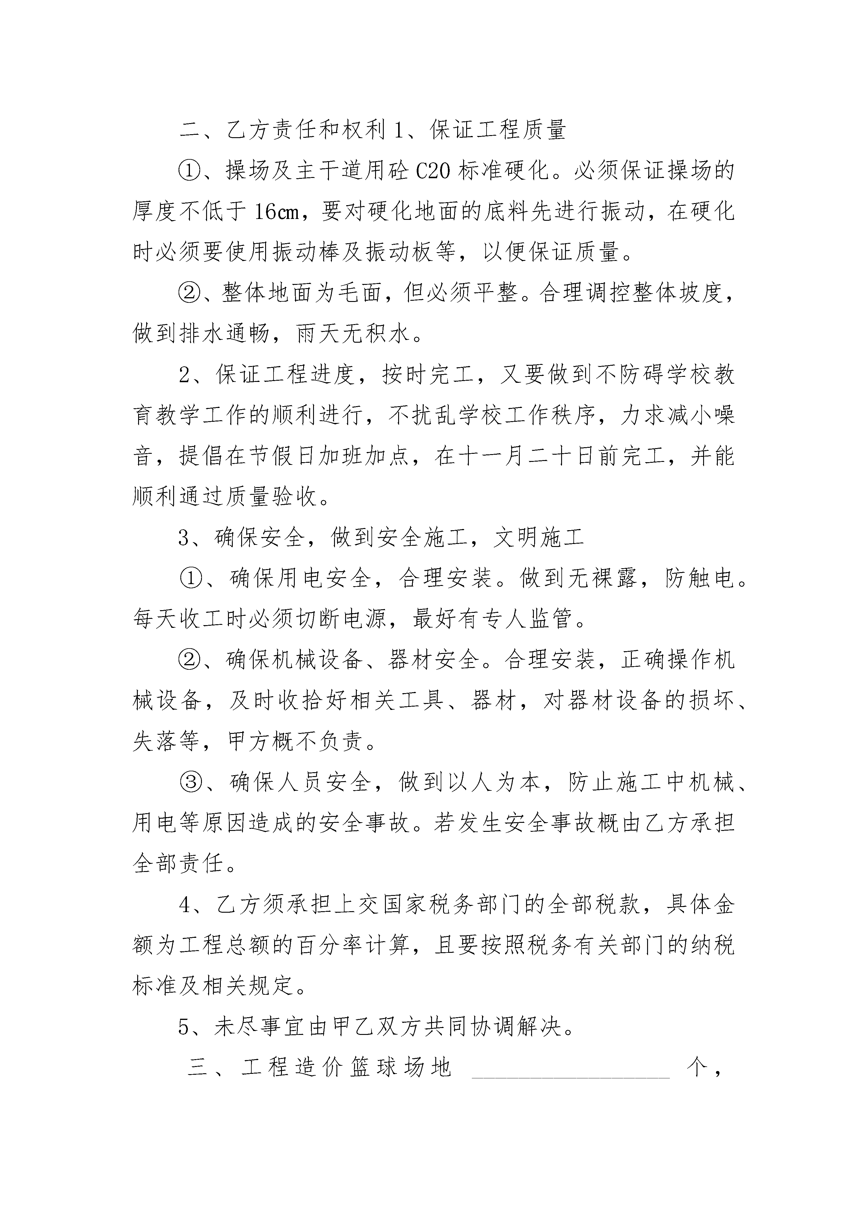 球场硬化工程合同球场硬化工程合同(精选3篇)球场硬化工程合同篇1甲方:_________________乙方:_________________甲方为了标准化学校建设,优化育人环境,改善全体师生的运动条件,现将学校篮球场、排球场硬化,经过甲方研究决定,将此项工程的承建工作发包给乙方。经甲乙双方协商,形成下述合同,双方必须共同遵守。一、甲方的责任和权利1、为乙方提供必要的施工条件(包括用电、用水水源、施工工具的存放等能办到的事项)。2、提供路面硬化的相关数据,并要求乙方严格按甲方规划施工。3、对学生进行安全教育,禁止校内非施工人员进入施工场地,保障施工顺利进行。4、对乙方施工过程、工程质量、施工安全、施工进度等方面进行监督,可对其质量检查和抽检,并可对不符合要求的某些方面向乙方提出交涉,必要时可扣除相应的工程款项。5、为乙方提供资金保障,按“面积_____单价=总价”计算工程款,工程完工后据实结算,本学期末兑付总额的80%,下学期待质量未出现任何问题后付清余额。二、乙方责任和权利1、保证工程质量①、操场及主干道用砼C20标准硬化。必须保证操场的厚度不低于16㎝,要对硬化地面的底料先进行振动,在硬化时必须要使用振动棒及振动板等,以便保证质量。②、整体地面为毛面,但必须平整。合理调控整体坡度,做到排水通畅,雨天无积水。2、保证工程进度,按时完工,又要做到不防碍学校教育教学工作的顺利进行,不扰乱学校工作秩序,力求减小噪音,提倡在节假日加班加点,在十一月二十日前完工,并能顺利通过质量验收。3、确保安全,做到安全施工,文明施工①、确保用电安全,合理安装。做到无裸露,防触电。每天收工时必须切断电源,最好有专人监管。②、确保机械设备、器材安全。合理安装,正确操作机械设备,及时收拾好相关工具、器材,对器材设备的损坏、失落等,甲方概不负责。③、确保人员安全,做到以人为本,防止施工中机械、用电等原因造成的安全事故。若发生安全事故概由乙方承担全部责任。4、乙方须承担上交国家税务部门的全部税款,具体金额为工程总额的百分率计算,且要按照税务有关部门的纳税标准及相关规定。5、未尽事宜由甲乙双方共同协调解决。三、工程造价篮球场地_________________个,_________________m计造价_________________元。本合同一式三份,甲乙双方各一份,报教育主管部门一份备案,此合同自签字之日起生效。甲方:_________________乙方(签字):_________________法人代表(签字):_________________签字日期:_________________签字日期:_________________球场硬化工程合同篇2房主人(甲方):_____________承建人(乙方):_____________根据《民法典》、《建筑法》的有关规定,结合本工程具体情况,为明确乙方在承揽建设甲方私人住宅主体工程中的权利、义务,经双方协商同意签订本合同。一、建筑项目:私人住宅主体工程。二、建筑面积及房屋方位:三、承建方式及施工准备:1、甲方将其住宅主体工程以包工包料的方式承包给乙方承建。2、乙方必须按合同施工,提供以下建筑材料,所有材料必须附有产品合格证才能用于工程。⑶圈梁:220x250,钢筋用标准沙钢或永钢,水泥用常熟金猫425#标准水泥。墙体的高度和门窗位置大小根据图纸确定,如无图纸根据双方协商决定。⑹工程中用到的所有黄沙用中沙和粗沙,不允许用细沙石子用符合标准的石子砖头用质量优良符合标准的砖头,其它副料也应用符合标准的材料。乙方应做到水泥与其它材料配比合理,所有材料不得影响工程质量。⑺除水电村料及安装,门窗材料及安装由甲方负责卫生间,厨房的贴面,以及围墙波形瓦和外墙涂料,防水涂料由甲方提供材料,乙方负责施工。除此条以外的任何材料及人工都包含在工程总价内。乙方不得在工程期间任意加价,或未经甲方同意擅自更改材料及工程结构,由此所产生的一切后果由乙方负责。3、乙方自带建筑所需的一切工具,包括施工用的搅拌机、震动器等施工机械以及模板、搭架用的竹木等,必须备有遮雨帆布,避免在捣制楼面时下雨影响楼面质量。四、建房工期:建房工期为150天。五、承建工程价格及付款方式:1.本住宅工程总造价为18.6万元人民币,大写:拾捌万陆仟元整。2.付款方式:开工时首付3万,基础完成并经甲方验收合格后付2万,第一层楼面完工并经甲方验收合格后付4万,第二层楼面完工并经甲方验收合格后付2万,屋面封顶并经甲方验收合格后付3万,工程竣工后并经甲方验收合格后付2万,其余款项工程竣工一年后付清。六、施工安全要求1、乙方明确自己有与承揽建设的私人住宅工程相应的建筑资质,而且明确其施工人员也具有相应的执业资格和资历,以确保乙方所承揽建设的工程符合建设施工所要求