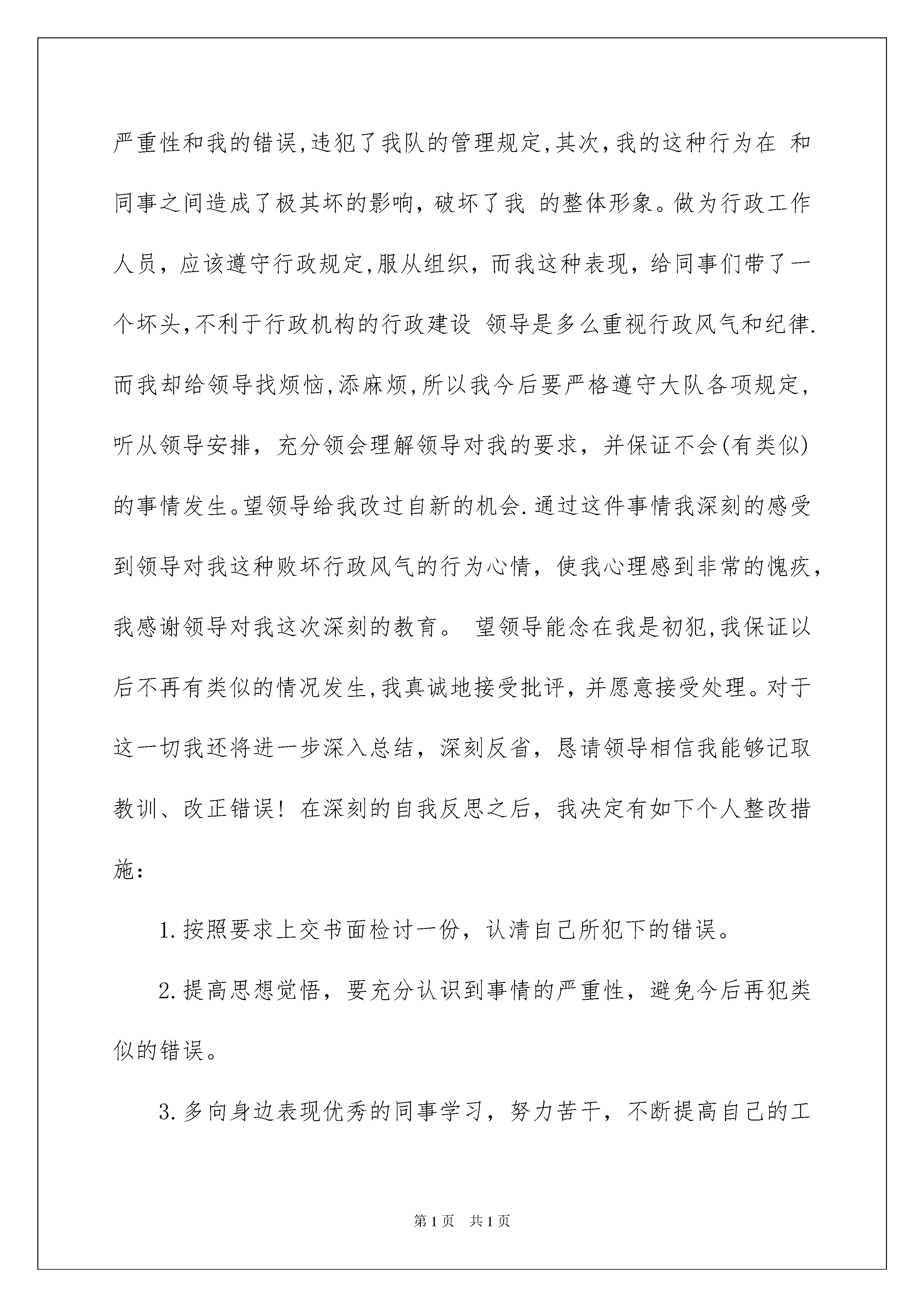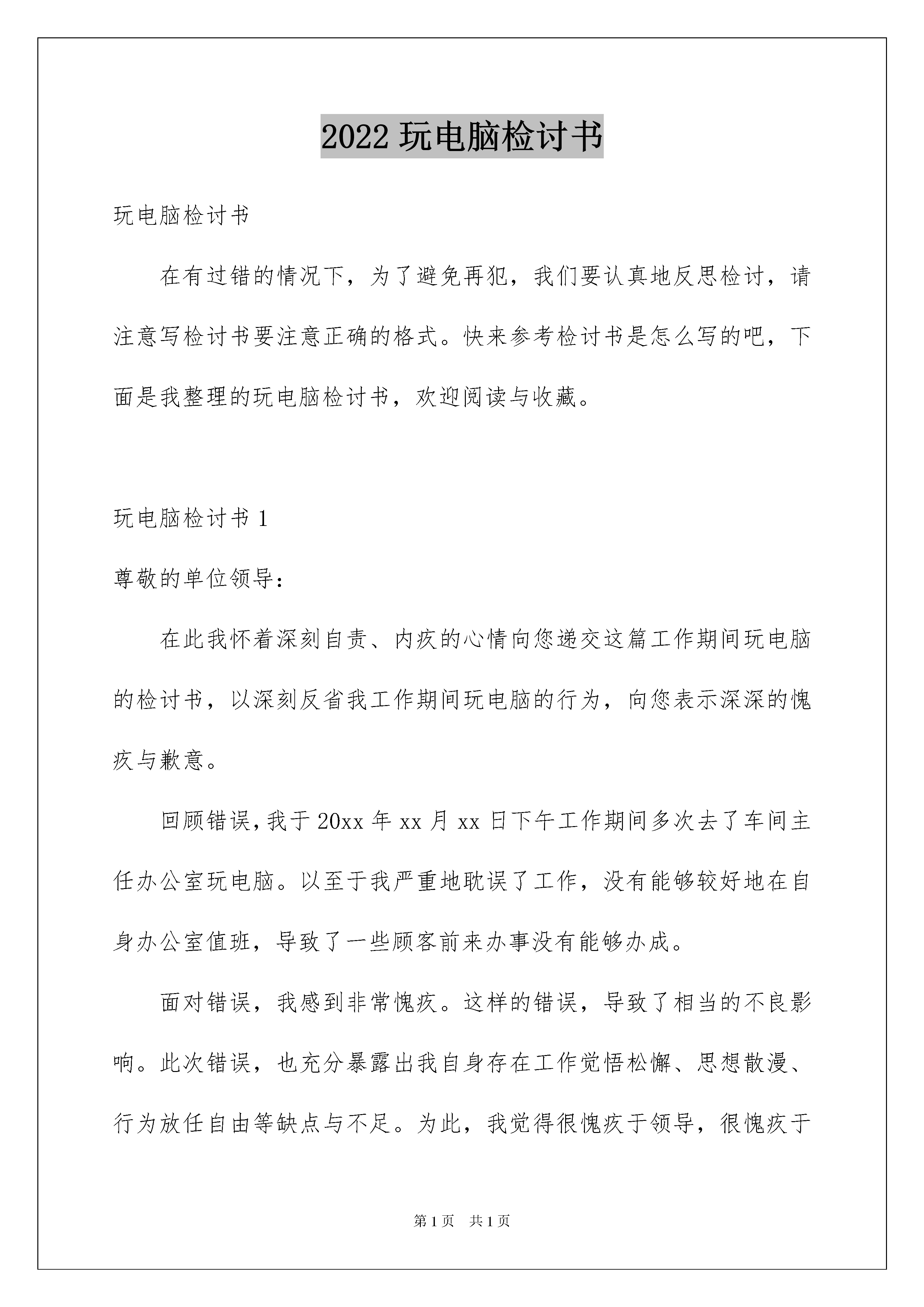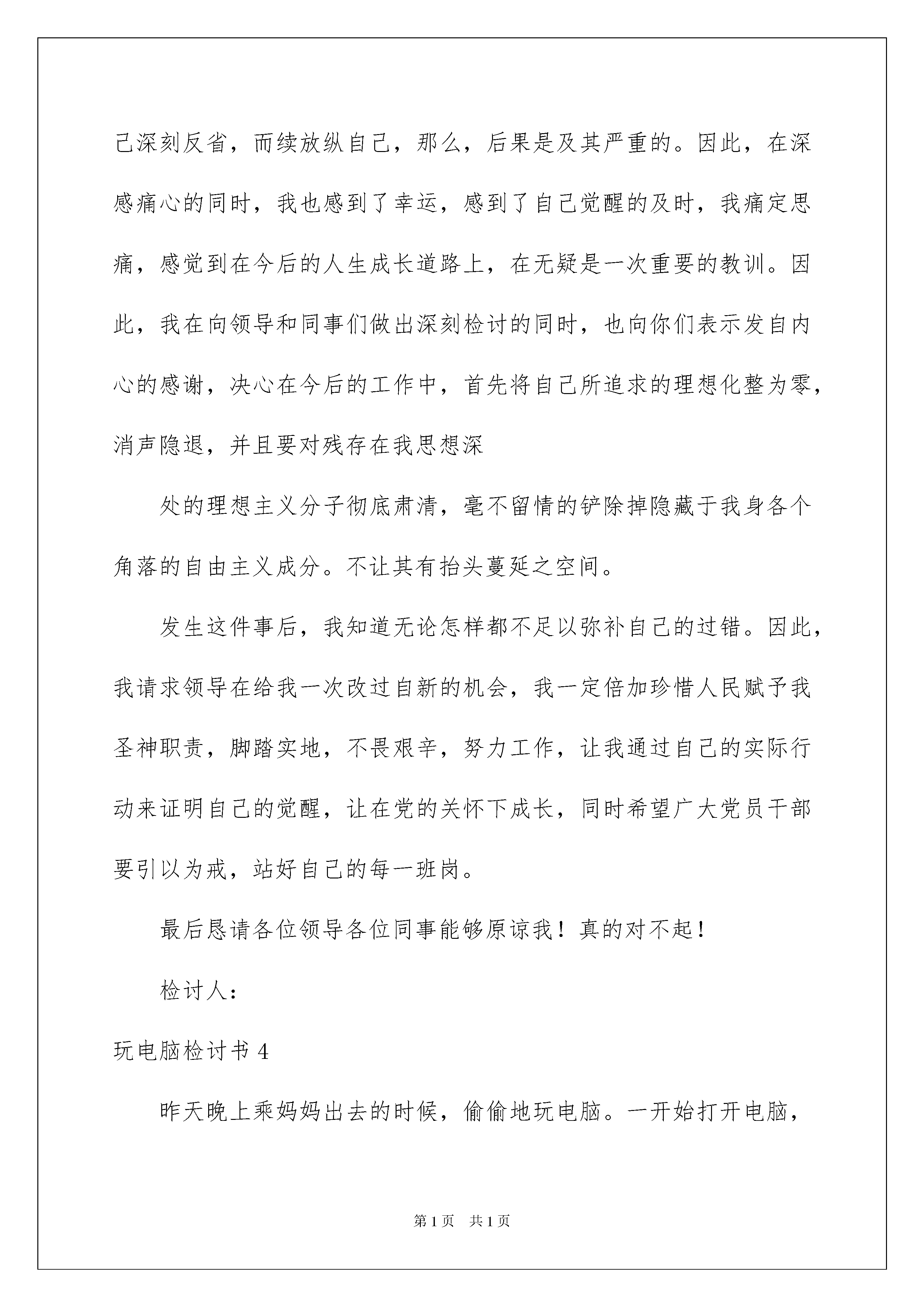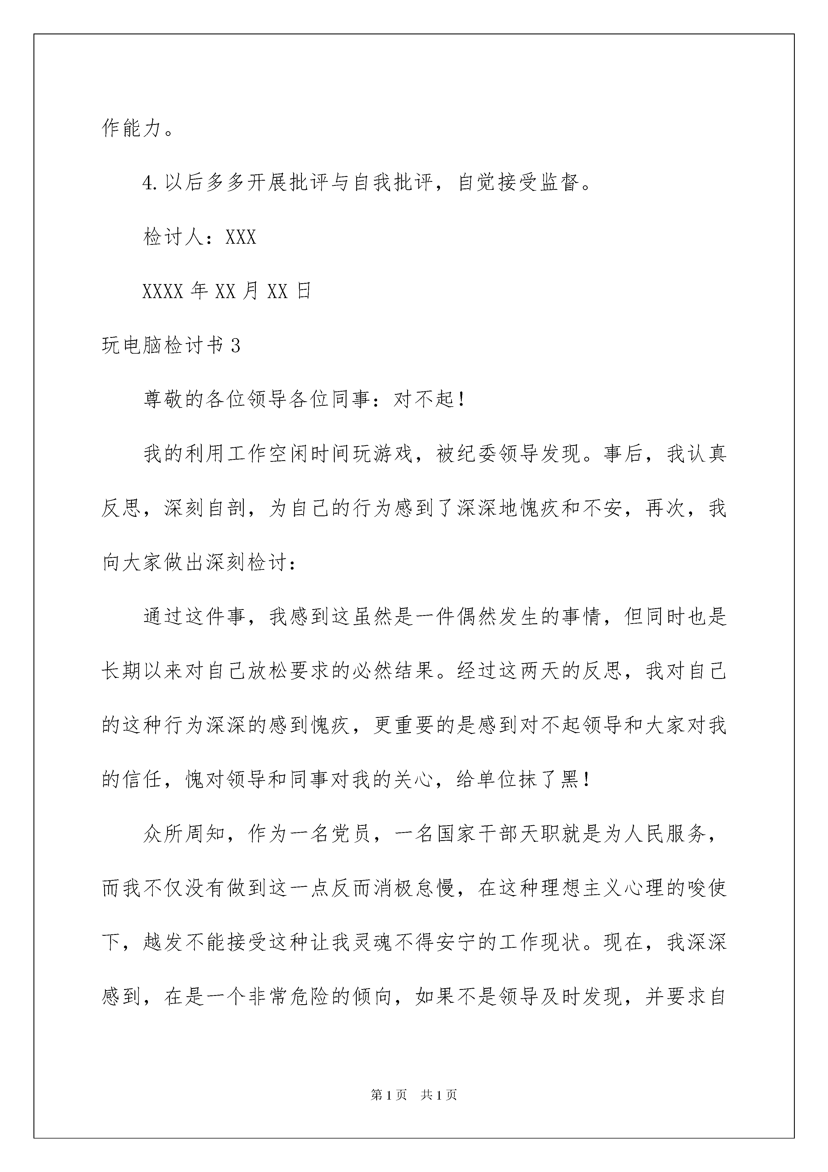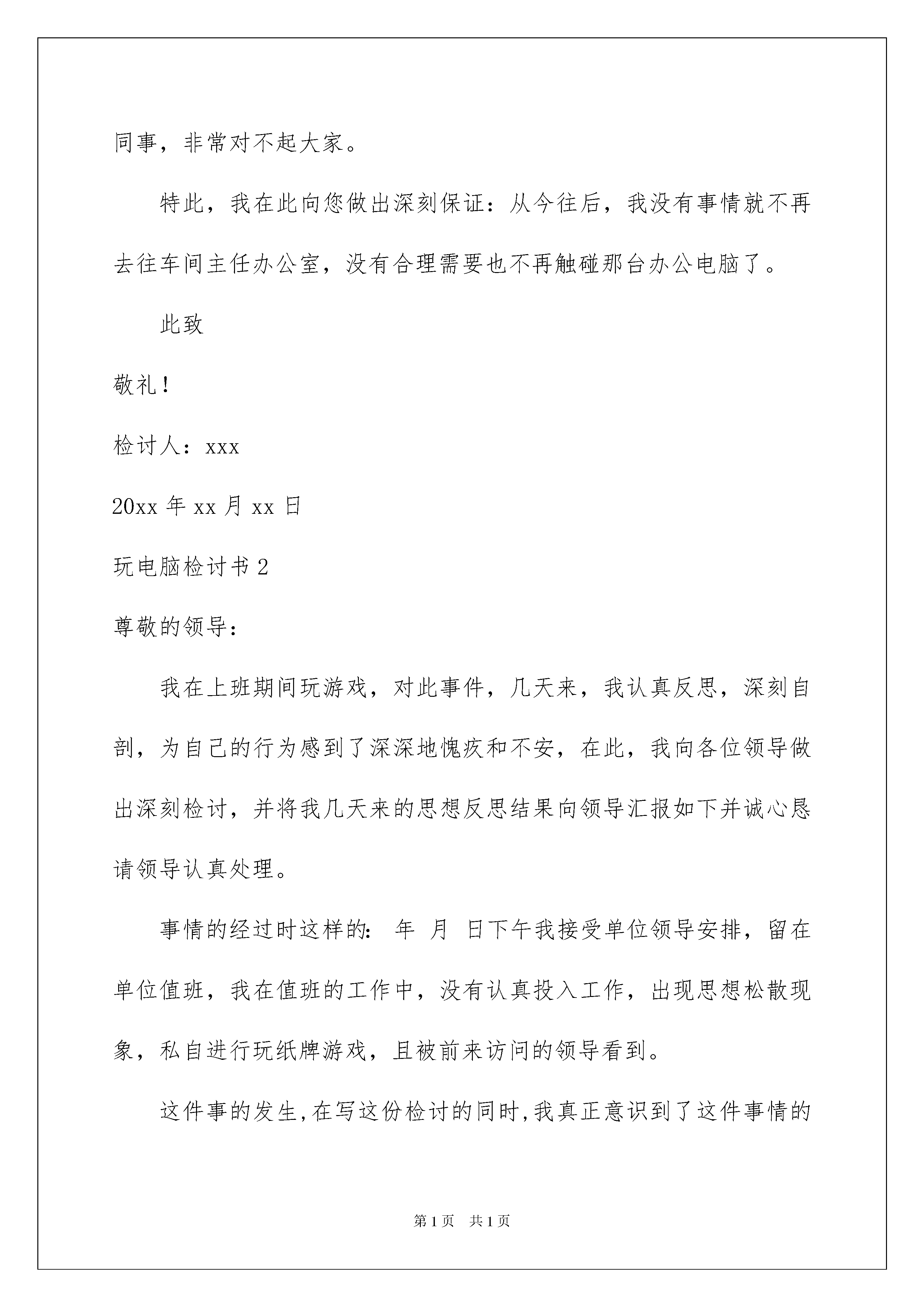 2022玩电脑检讨书玩电脑检讨书在有过错的情况下,为了避免再犯,我们要认真地反思检讨,请注意写检讨书要注意正确的格式。快来参考检讨书是怎么写的吧,下面是我整理的玩电脑检讨书,欢迎阅读与收藏。玩电脑检讨书1尊敬的单位领导:在此我怀着深刻自责、内疚的心情向您递交这篇工作期间玩电脑的检讨书,以深刻反省我工作期间玩电脑的行为,向您表示深深的愧疚与歉意。回顾错误,我于20xx年xx月xx日下午工作期间多次去了车间主任办公室玩电脑。以至于我严重地耽误了工作,没有能够较好地在自身办公室值班,导致了一些顾客前来办事没有能够办成。面对错误,我感到非常愧疚。这样的错误,导致了相当的不良影响。此次错误,也充分暴露出我自身存在工作觉悟松懈、思想散漫、行为放任自由等缺点与不足。为此,我觉得很愧疚于领导,很愧疚于同事,非常对不起大家。特此,我在此向您做出深刻保证:从今往后,我没有事情就不再去往车间主任办公室,没有合理需要也不再触碰那台办公电脑了。此致敬礼!检讨人:xxx20xx年xx月xx日玩电脑检讨书2尊敬的领导:我在上班期间玩游戏,对此事件,几天来,我认真反思,深刻自剖,为自己的行为感到了深深地愧疚和不安,在此,我向各位领导做出深刻检讨,并将我几天来的思想反思结果向领导汇报如下并诚心恳请领导认真处理。事情的经过时这样的:年月日下午我接受单位领导安排,留在单位值班,我在值班的工作中,没有认真投入工作,出现思想松散现象,私自进行玩纸牌游戏,且被前来访问的领导看到。这件事的发生,在写这份检讨的同时,我真正意识到了这件事情的严重性和我的错误,违犯了我队的管理规定,其次,我的这种行为在和同事之间造成了极其坏的影响,破坏了我的整体形象。做为行政工作人员,应该遵守行政规定,服从组织,而我这种表现,给同事们带了一个坏头,不利于行政机构的行政建设领导是多么重视行政风气和纪律.而我却给领导找烦恼,添麻烦,所以我今后要严格遵守大队各项规定,听从领导安排,充分领会理解领导对我的要求,并保证不会(有类似)的事情发生。望领导给我改过自新的机会.通过这件事情我深刻的感受到领导对我这种败坏行政风气的行为心情,使我心理感到非常的愧疚,我感谢领导对我这次深刻的教育。望领导能念在我是初犯,我保证以后不再有类似的情况发生,我真诚地接受批评,并愿意接受处理。对于这一切我还将进一步深入总结,深刻反省,恳请领导相信我能够记取教训、改正错误!在深刻的自我反思之后,我决定有如下个人整改措施:1.按照要求上交书面检讨一份,认清自己所犯下的错误。2.提高思想觉悟,要充分认识到事情的严重性,避免今后再犯类似的错误。3.多向身边表现优秀的同事学习,努力苦干,不断提高自己的工作能力。4.以后多多开展批评与自我批评,自觉接受监督。检讨人:XXXXXXX年XX月XX日玩电脑检讨书3尊敬的各位领导各位同事:对不起!我的利用工作空闲时间玩游戏,被纪委领导发现。事后,我认真反思,深刻自剖,为自己的行为感到了深深地愧疚和不安,再次,我向大家做出深刻检讨:通过这件事,我感到这虽然是一件偶然发生的事情,但同时也是长期以来对自己放松要求的必然结果。经过这两天的反思,我对自己的这种行为深深的感到愧疚,更重要的是感到对不起领导和大家对我的信任,愧对领导和同事对我的关心,给单位抹了黑!众所周知,作为一名党员,一名国家干部天职就是为人民服务,而我不仅没有做到这一点反而消极怠慢,在这种理想主义心理的唆使下,越发不能接受这种让我灵魂不得安宁的工作现状。现在,我深深感到,在是一个非常危险的倾向,如果不是领导及时发现,并要求自己深刻反省,而续放纵自己,那么,后果是及其严重的。因此,在深感痛心的同时,我也感到了幸运,感到了自己觉醒的及时,我痛定思痛,感觉到在今后的人生成长道路上,在无疑是一次重要的教训。因此,我在向领导和同事们做出深刻检讨的同时,也向你们表示发自内心的感谢,决心在今后的工作中,首先将自己所追求的理想化整为零,消声隐退,并且要对残存在我思想深处的理想主义分子彻底肃清,毫不留情的铲除掉隐藏于我身各个角落的自由主义成分。不让其有抬头蔓延之空间。发生这件事后,我知道无论怎样都不足以弥补自己的过错。因此,我请求领导在给我一次改过自新的机会,我一定倍加珍惜人民赋予我圣神职责,脚踏实地,不畏艰辛,努力工作,让我通过自己的实际行动来证明自己的觉醒,让在党的关怀下成长,同时希望广大党员干部要引以为戒,站好自己的每一班岗。最后恳请各位领导各位同事能够原谅我!真的对不起!检讨人:玩电脑检讨书4昨天晚上乘妈妈出去的时候,偷偷地玩电脑。一开始打开电脑,会想:“就玩一下子,等我把‘任务’做完了以后,就