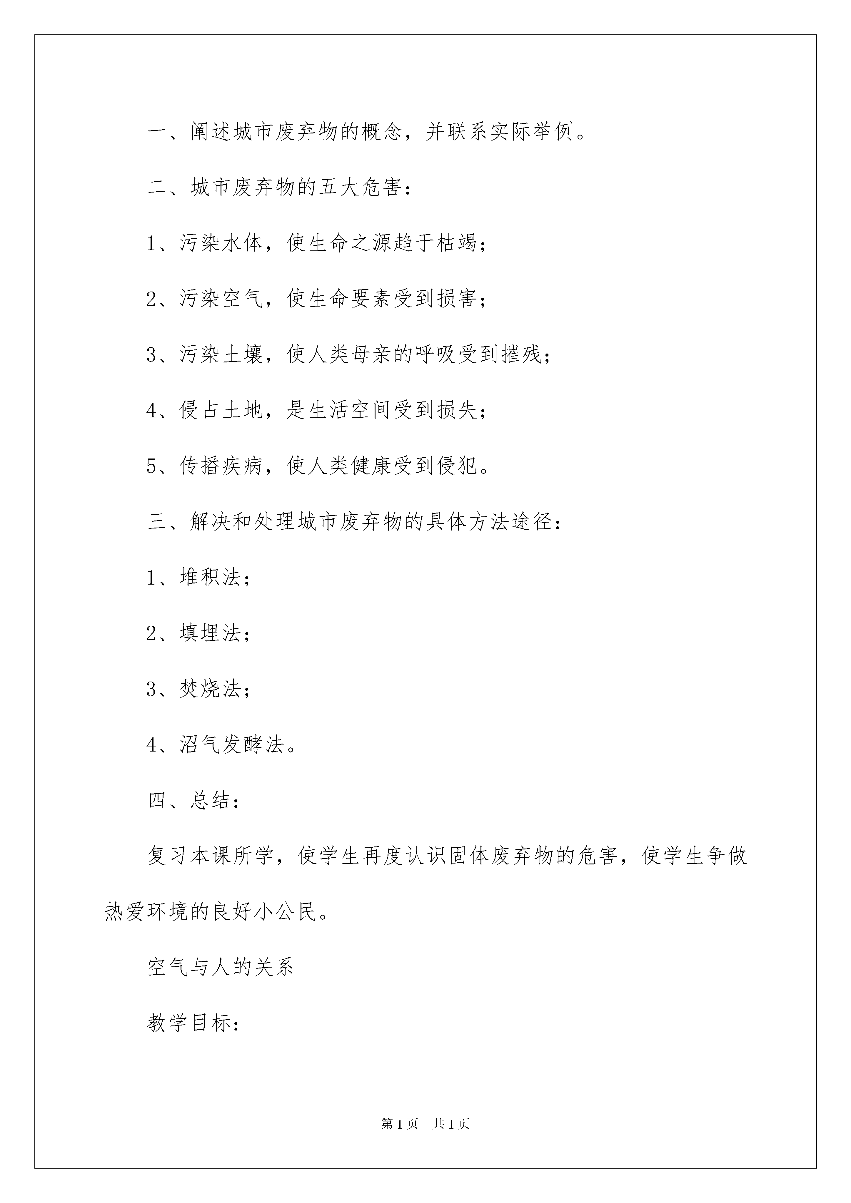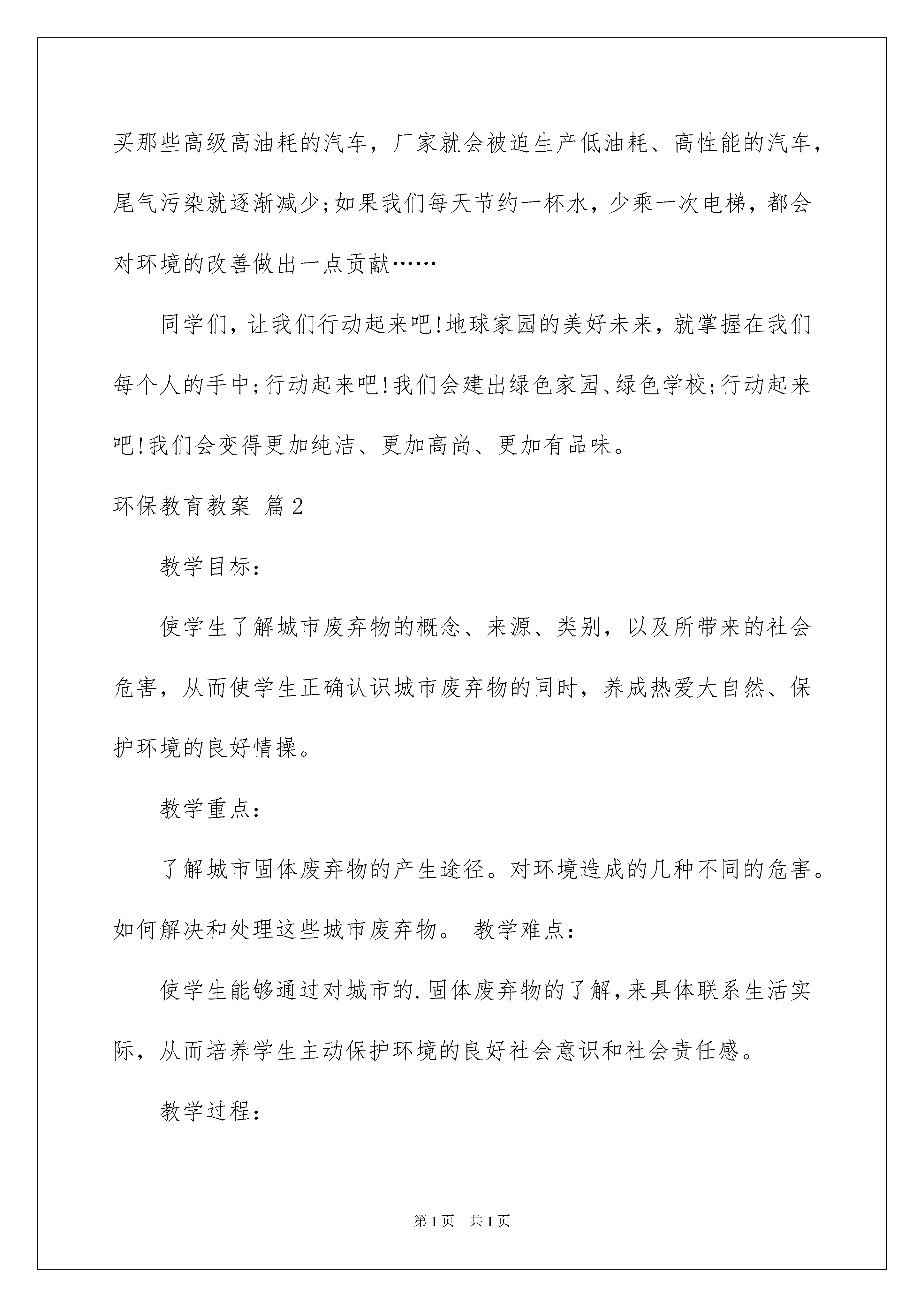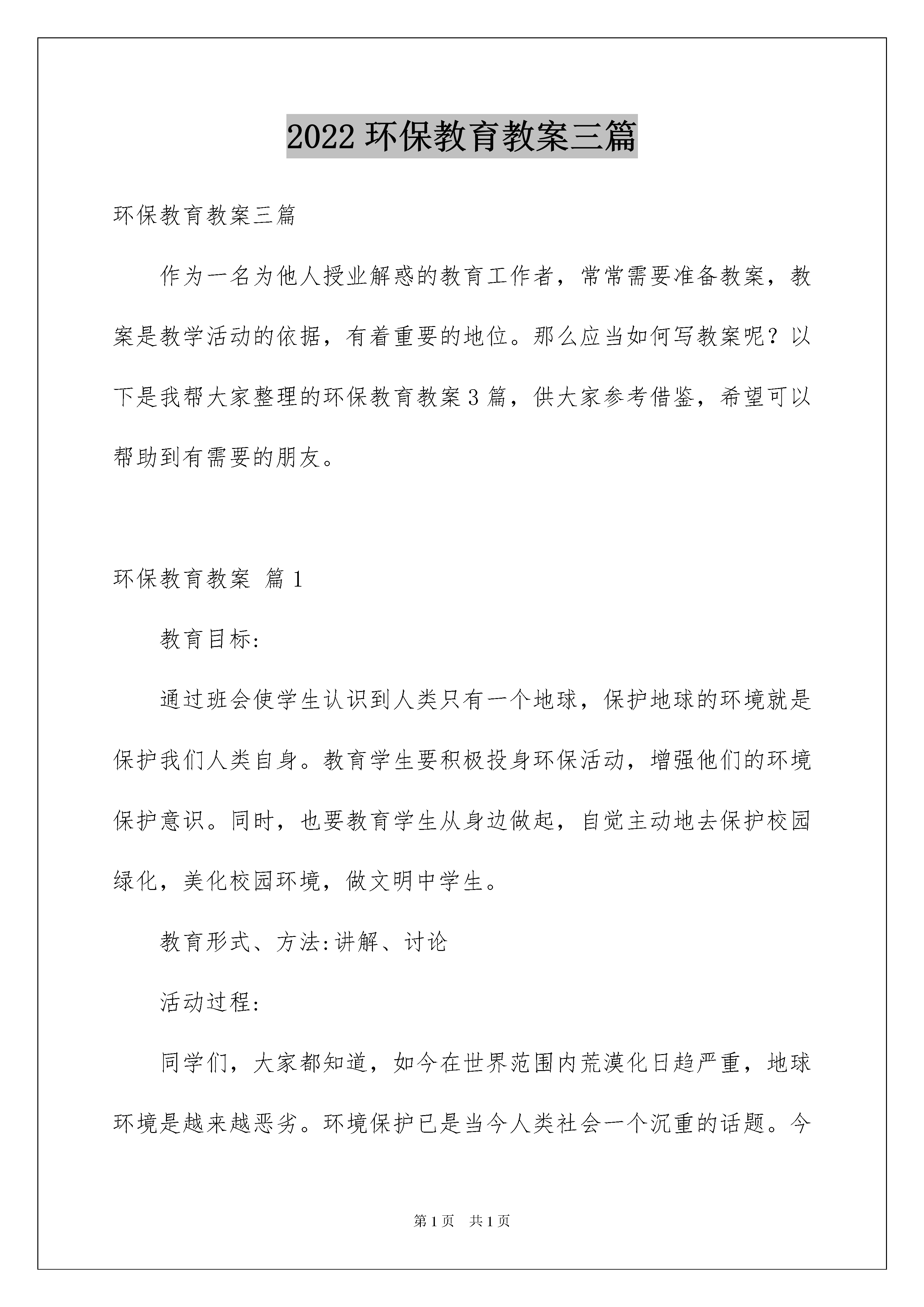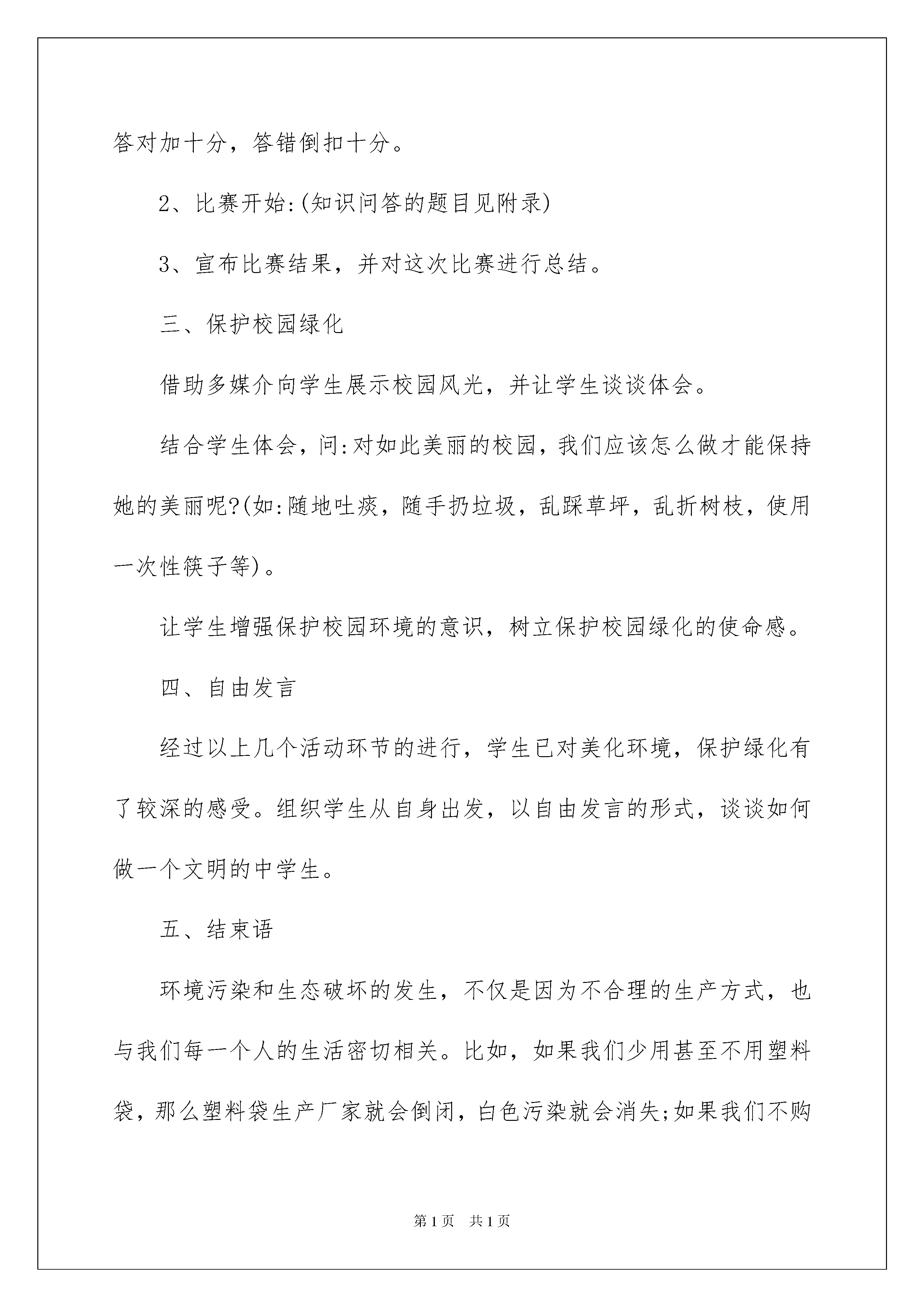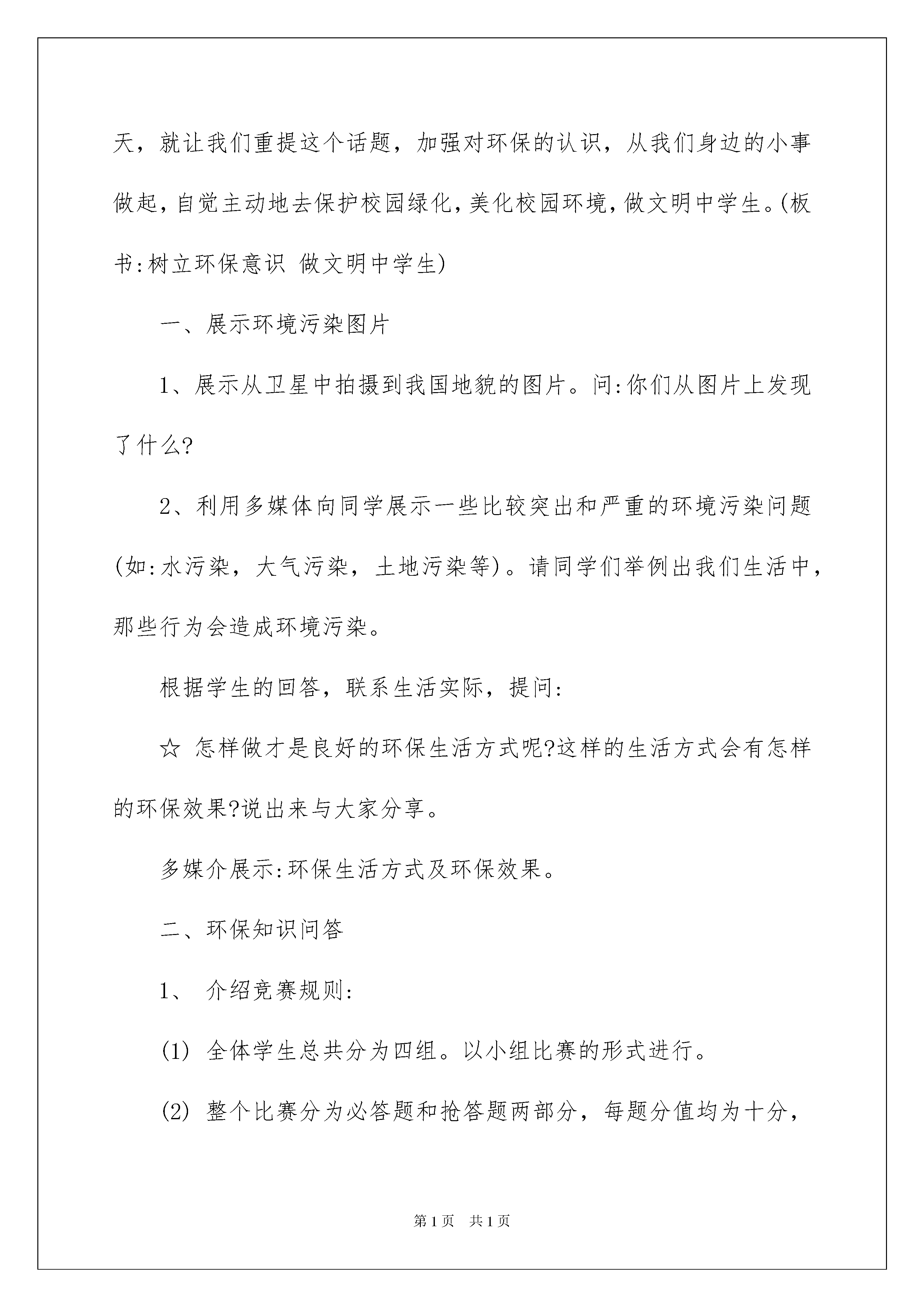2022环保教育教案三篇环保教育教案三篇作为一名为他人授业解惑的教育工作者,常常需要准备教案,教案是教学活动的依据,有着重要的地位。那么应当如何写教案呢?以下是我帮大家整理的环保教育教案3篇,供大家参考借鉴,希望可以帮助到有需要的朋友。环保教育教案篇1教育目标:通过班会使学生认识到人类只有一个地球,保护地球的环境就是保护我们人类自身。教育学生要积极投身环保活动,增强他们的环境保护意识。同时,也要教育学生从身边做起,自觉主动地去保护校园绿化,美化校园环境,做文明中学生。教育形式、方法:讲解、讨论活动过程:同学们,大家都知道,如今在世界范围内荒漠化日趋严重,地球环境是越来越恶劣。环境保护已是当今人类社会一个沉重的话题。今天,就让我们重提这个话题,加强对环保的认识,从我们身边的小事做起,自觉主动地去保护校园绿化,美化校园环境,做文明中学生。(板书:树立环保意识做文明中学生)一、展示环境污染图片1、展示从卫星中拍摄到我国地貌的图片。问:你们从图片上发现了什么?2、利用多媒体向同学展示一些比较突出和严重的环境污染问题(如:水污染,大气污染,土地污染等)。请同学们举例出我们生活中,那些行为会造成环境污染。根据学生的回答,联系生活实际,提问:☆怎样做才是良好的环保生活方式呢?这样的生活方式会有怎样的环保效果?说出来与大家分享。多媒介展示:环保生活方式及环保效果。二、环保知识问答1、介绍竞赛规则:(1)全体学生总共分为四组。以小组比赛的形式进行。(2)整个比赛分为必答题和抢答题两部分,每题分值均为十分,答对加十分,答错倒扣十分。2、比赛开始:(知识问答的题目见附录)3、宣布比赛结果,并对这次比赛进行总结。三、保护校园绿化借助多媒介向学生展示校园风光,并让学生谈谈体会。结合学生体会,问:对如此美丽的校园,我们应该怎么做才能保持她的美丽呢?(如:随地吐痰,随手扔垃圾,乱踩草坪,乱折树枝,使用一次性筷子等)。让学生增强保护校园环境的意识,树立保护校园绿化的使命感。四、自由发言经过以上几个活动环节的进行,学生已对美化环境,保护绿化有了较深的感受。组织学生从自身出发,以自由发言的形式,谈谈如何做一个文明的中学生。五、结束语环境污染和生态破坏的发生,不仅是因为不合理的生产方式,也与我们每一个人的生活密切相关。比如,如果我们少用甚至不用塑料袋,那么塑料袋生产厂家就会倒闭,白色污染就会消失;如果我们不购买那些高级高油耗的汽车,厂家就会被迫生产低油耗、高性能的汽车,尾气污染就逐渐减少;如果我们每天节约一杯水,少乘一次电梯,都会对环境的改善做出一点贡献……同学们,让我们行动起来吧!地球家园的美好未来,就掌握在我们每个人的手中;行动起来吧!我们会建出绿色家园、绿色学校;行动起来吧!我们会变得更加纯洁、更加高尚、更加有品味。环保教育教案篇2教学目标:使学生了解城市废弃物的概念、来源、类别,以及所带来的社会危害,从而使学生正确认识城市废弃物的同时,养成热爱大自然、保护环境的良好情操。教学重点:了解城市固体废弃物的产生途径。对环境造成的几种不同的危害。如何解决和处理这些城市废弃物。教学难点:使学生能够通过对城市的.固体废弃物的了解,来具体联系生活实际,从而培养学生主动保护环境的良好社会意识和社会责任感。教学过程:一、阐述城市废弃物的概念,并联系实际举例。二、城市废弃物的五大危害:1、污染水体,使生命之源趋于枯竭;2、污染空气,使生命要素受到损害;3、污染土壤,使人类母亲的呼吸受到摧残;4、侵占土地,是生活空间受到损失;5、传播疾病,使人类健康受到侵犯。三、解决和处理城市废弃物的具体方法途径:1、堆积法;2、填埋法;3、焚烧法;4、沼气发酵法。四、总结:复习本课所学,使学生再度认识固体废弃物的危害,使学生争做热爱环境的良好小公民。空气与人的关系教学目标:1、让学生都有环保意识。知道净化空气人人有责。2、人人行动起来,保护我们的学校,保护我们的家园。教学准备:两只较大的塑料袋,一只装有助动车尾气,一只装有普通空气的塑料袋。教学过程:1、师讲述空气对我们的作用:人要生存,就要呼吸空气,一个人只要几分钟不呼吸空气就会死亡。可见,空气与人的关系是何等的密切和重要。但是,不是什么样的空气都有人所需要的人所需要的是洁净的空气。人如果吸进被污染的空气就会感到不适,甚至生病,严重的还会死亡。如助动车尾气,含有大量的有毒有害物质,长期吸入被助动车尾气污染的空气,那么,我们人体血液中的含铅量等有毒有害物质将明显增加,会导致积累性中毒。很明显,被污染的空气对人类有直接的危害。大气污染物分为气体状态污染物和固体颗粒状态污染物。2、让学生思考