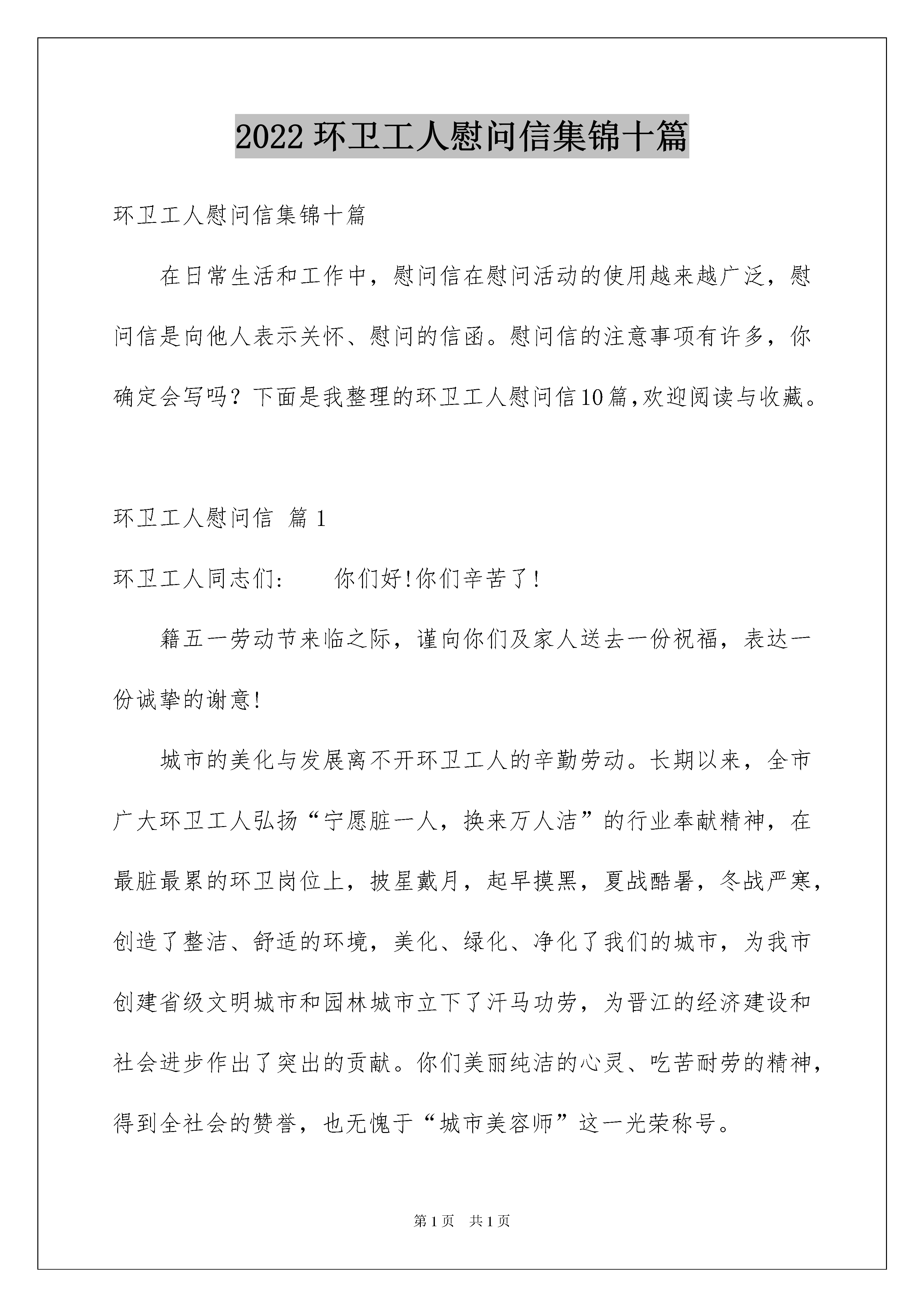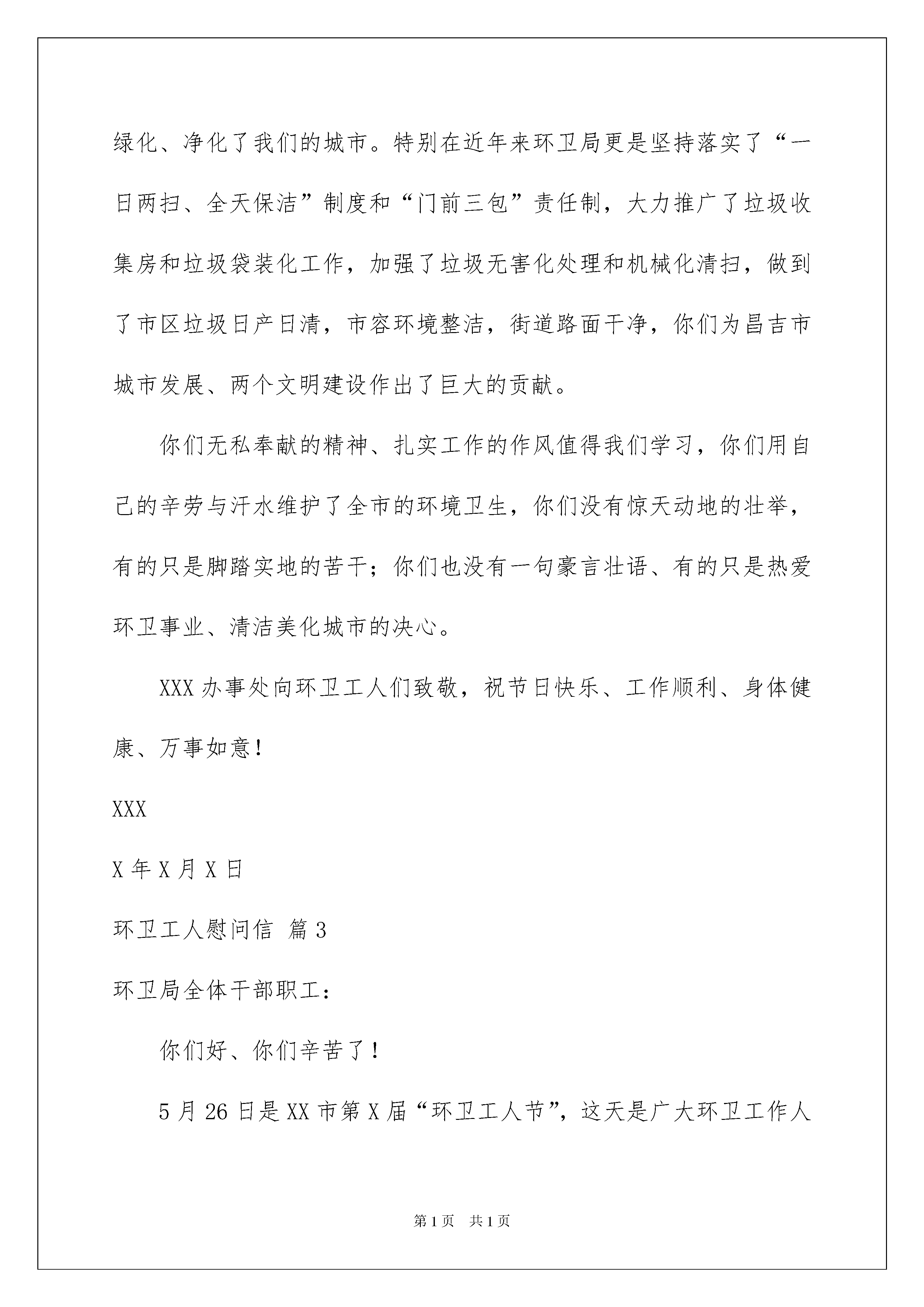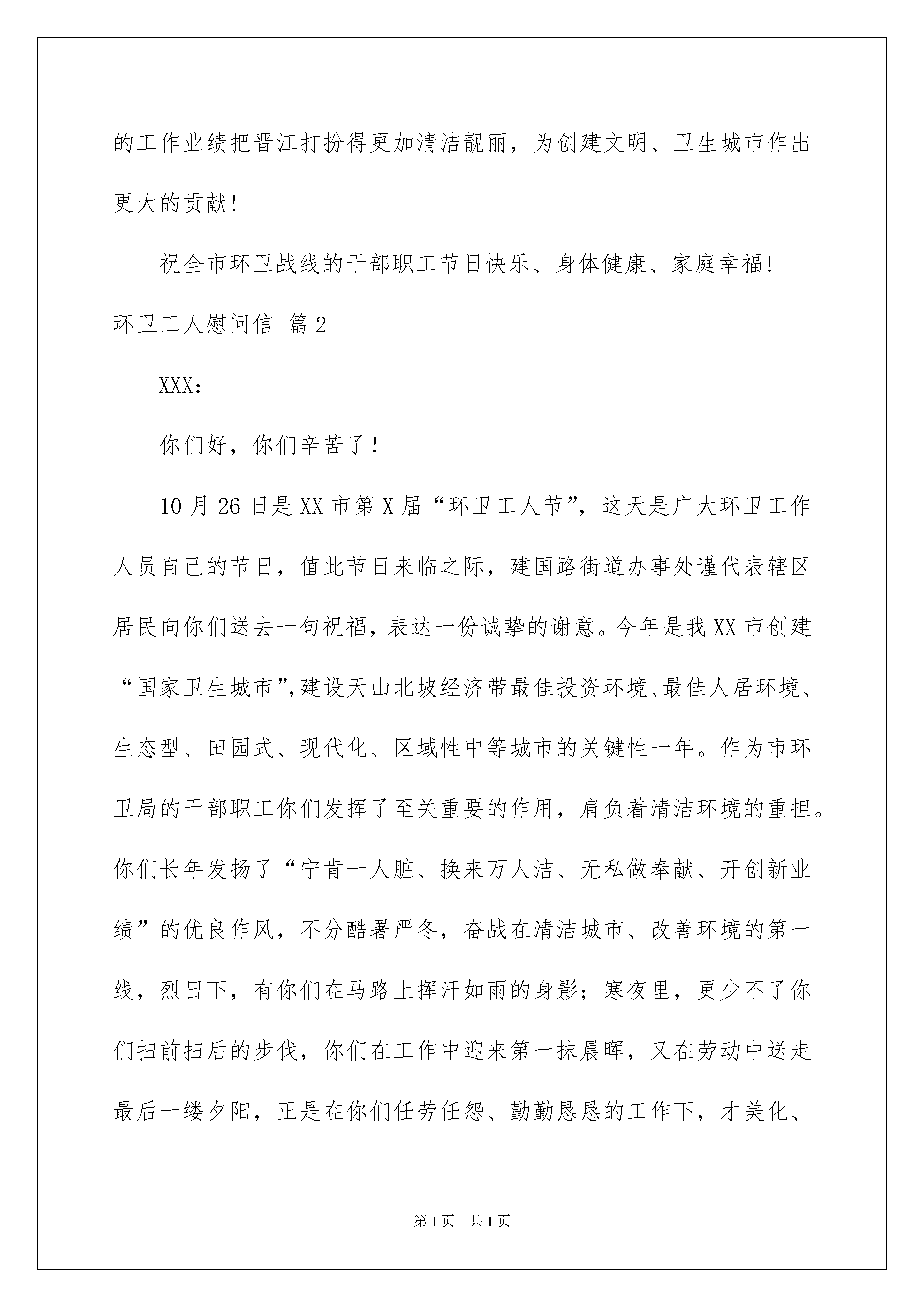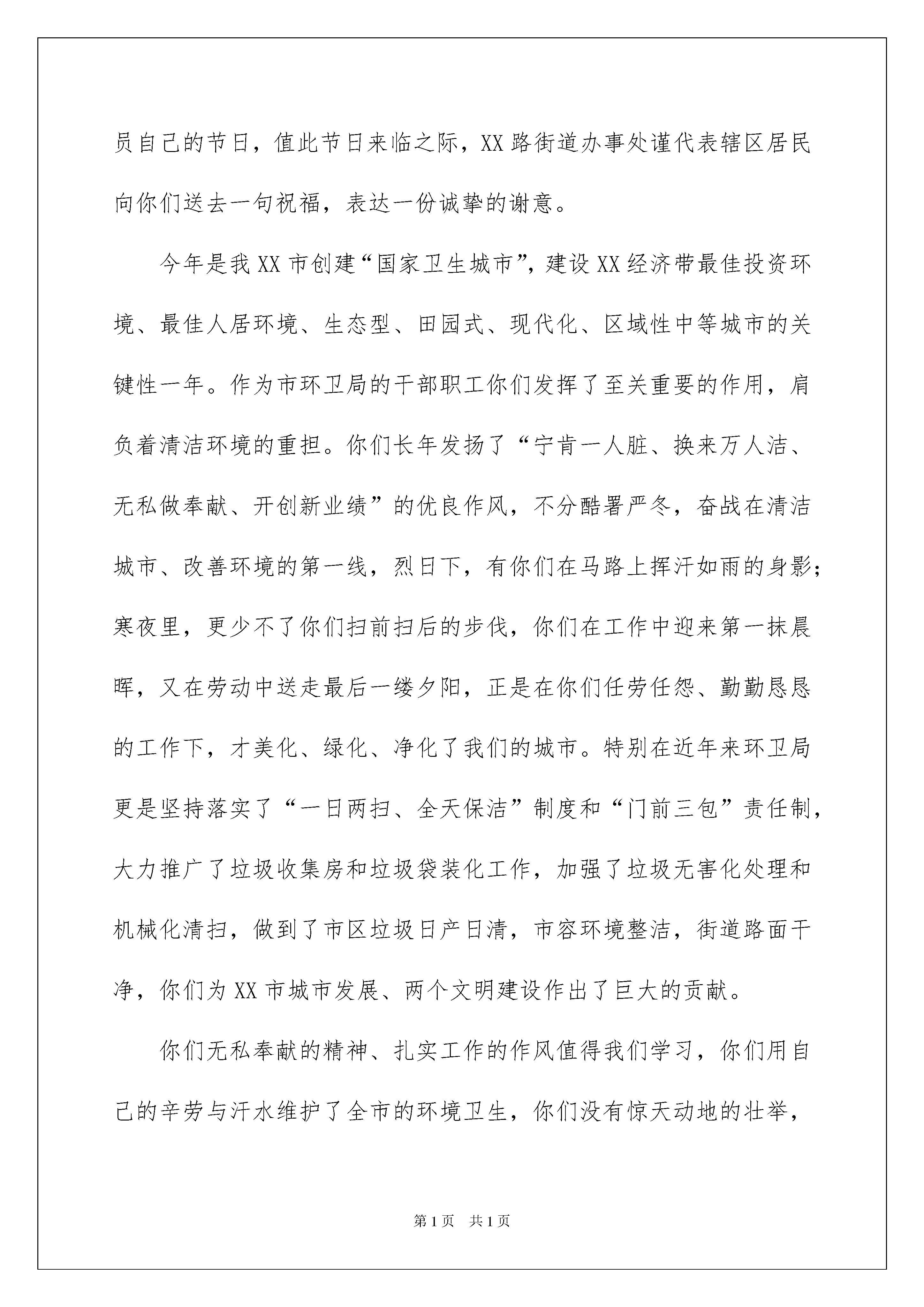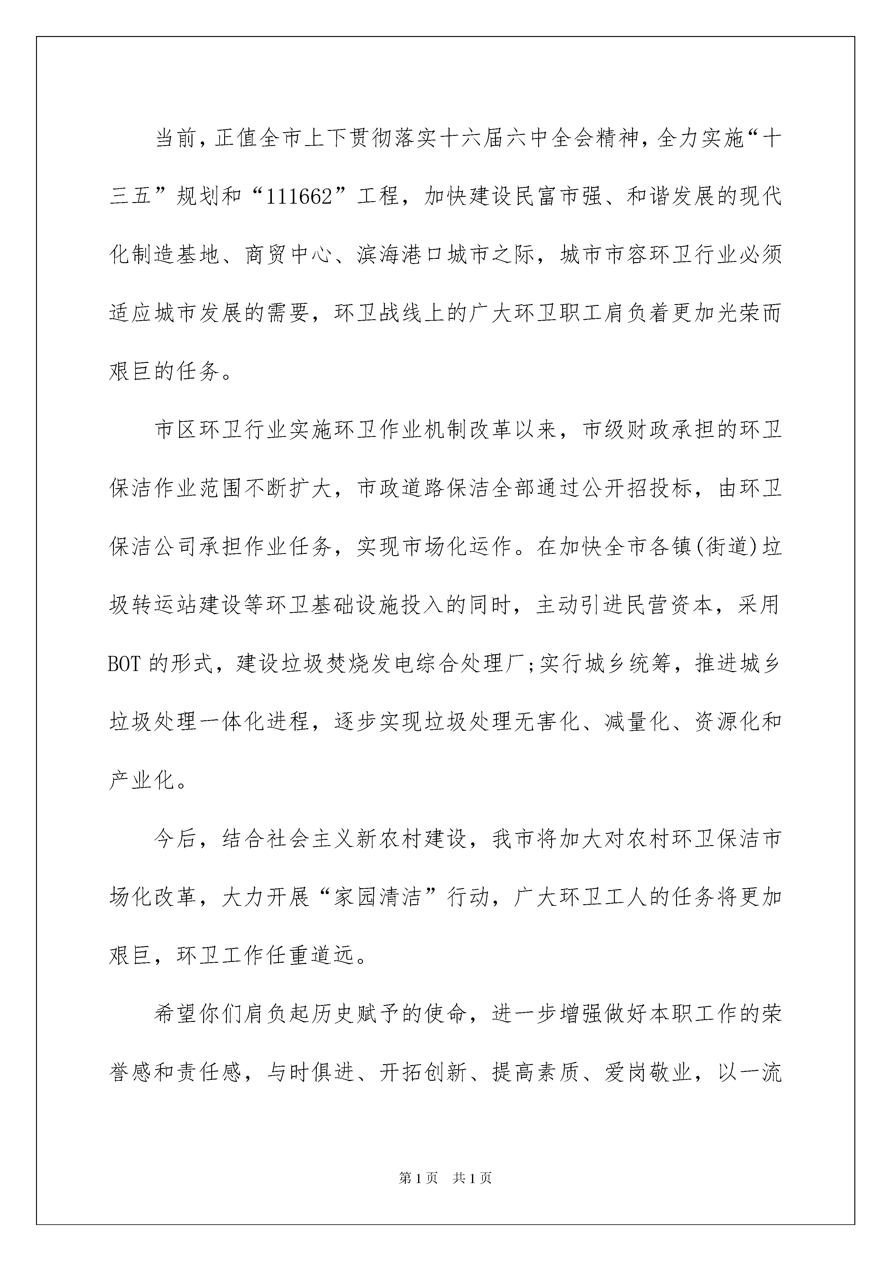 2022环卫工人慰问信集锦十篇环卫工人慰问信集锦十篇在日常生活和工作中,慰问信在慰问活动的使用越来越广泛,慰问信是向他人表示关怀、慰问的信函。慰问信的注意事项有许多,你确定会写吗?下面是我整理的环卫工人慰问信10篇,欢迎阅读与收藏。环卫工人慰问信篇1环卫工人同志们:你们好!你们辛苦了!籍五一劳动节来临之际,谨向你们及家人送去一份祝福,表达一份诚挚的谢意!城市的美化与发展离不开环卫工人的辛勤劳动。长期以来,全市广大环卫工人弘扬“宁愿脏一人,换来万人洁”的行业奉献精神,在最脏最累的环卫岗位上,披星戴月,起早摸黑,夏战酷暑,冬战严寒,创造了整洁、舒适的环境,美化、绿化、净化了我们的城市,为我市创建省级文明城市和园林城市立下了汗马功劳,为晋江的经济建设和社会进步作出了突出的贡献。你们美丽纯洁的心灵、吃苦耐劳的精神,得到全社会的赞誉,也无愧于“城市美容师”这一光荣称号。当前,正值全市上下贯彻落实十六届六中全会精神,全力实施“十三五”规划和“111662”工程,加快建设民富市强、和谐发展的现代化制造基地、商贸中心、滨海港口城市之际,城市市容环卫行业必须适应城市发展的需要,环卫战线上的广大环卫职工肩负着更加光荣而艰巨的任务。市区环卫行业实施环卫作业机制改革以来,市级财政承担的环卫保洁作业范围不断扩大,市政道路保洁全部通过公开招投标,由环卫保洁公司承担作业任务,实现市场化运作。在加快全市各镇(街道)垃圾转运站建设等环卫基础设施投入的同时,主动引进民营资本,采用BOT的形式,建设垃圾焚烧发电综合处理厂;实行城乡统筹,推进城乡垃圾处理一体化进程,逐步实现垃圾处理无害化、减量化、资源化和产业化。今后,结合社会主义新农村建设,我市将加大对农村环卫保洁市场化改革,大力开展“家园清洁”行动,广大环卫工人的任务将更加艰巨,环卫工作任重道远。希望你们肩负起历史赋予的使命,进一步增强做好本职工作的荣誉感和责任感,与时俱进、开拓创新、提高素质、爱岗敬业,以一流的工作业绩把晋江打扮得更加清洁靓丽,为创建文明、卫生城市作出更大的贡献!祝全市环卫战线的干部职工节日快乐、身体健康、家庭幸福!环卫工人慰问信篇2XXX:你们好,你们辛苦了!10月26日是XX市第X届“环卫工人节”,这天是广大环卫工作人员自己的节日,值此节日来临之际,建国路街道办事处谨代表辖区居民向你们送去一句祝福,表达一份诚挚的谢意。今年是我XX市创建“国家卫生城市”,建设天山北坡经济带最佳投资环境、最佳人居环境、生态型、田园式、现代化、区域性中等城市的关键性一年。作为市环卫局的干部职工你们发挥了至关重要的作用,肩负着清洁环境的重担。你们长年发扬了“宁肯一人脏、换来万人洁、无私做奉献、开创新业绩”的优良作风,不分酷署严冬,奋战在清洁城市、改善环境的第一线,烈日下,有你们在马路上挥汗如雨的身影;寒夜里,更少不了你们扫前扫后的步伐,你们在工作中迎来第一抹晨晖,又在劳动中送走最后一缕夕阳,正是在你们任劳任怨、勤勤恳恳的工作下,才美化、绿化、净化了我们的城市。特别在近年来环卫局更是坚持落实了“一日两扫、全天保洁”制度和“门前三包”责任制,大力推广了垃圾收集房和垃圾袋装化工作,加强了垃圾无害化处理和机械化清扫,做到了市区垃圾日产日清,市容环境整洁,街道路面干净,你们为昌吉市城市发展、两个文明建设作出了巨大的贡献。你们无私奉献的精神、扎实工作的作风值得我们学习,你们用自己的辛劳与汗水维护了全市的环境卫生,你们没有惊天动地的壮举,有的只是脚踏实地的苦干;你们也没有一句豪言壮语、有的只是热爱环卫事业、清洁美化城市的决心。XXX办事处向环卫工人们致敬,祝节日快乐、工作顺利、身体健康、万事如意!XXXX年X月X日环卫工人慰问信篇3环卫局全体干部职工:你们好、你们辛苦了!5月26日是XX市第X届“环卫工人节”,这天是广大环卫工作人员自己的节日,值此节日来临之际,XX路街道办事处谨代表辖区居民向你们送去一句祝福,表达一份诚挚的谢意。今年是我XX市创建“国家卫生城市”,建设XX经济带最佳投资环境、最佳人居环境、生态型、田园式、现代化、区域性中等城市的关键性一年。作为市环卫局的干部职工你们发挥了至关重要的作用,肩负着清洁环境的重担。你们长年发扬了“宁肯一人脏、换来万人洁、无私做奉献、开创新业绩”的优良作风,不分酷署严冬,奋战在清洁城市、改善环境的第一线,烈日下,有你们在马路上挥汗如雨的身影;寒夜里,更少不了你们扫前扫后的步伐,你们在工作中迎来第一抹晨晖,又在劳动中送走最后一缕夕阳,正是在你们任劳任怨、勤勤恳恳的工作下,才美化、绿化、净化了我们的城市。特别在近年来环卫局更是坚持落实