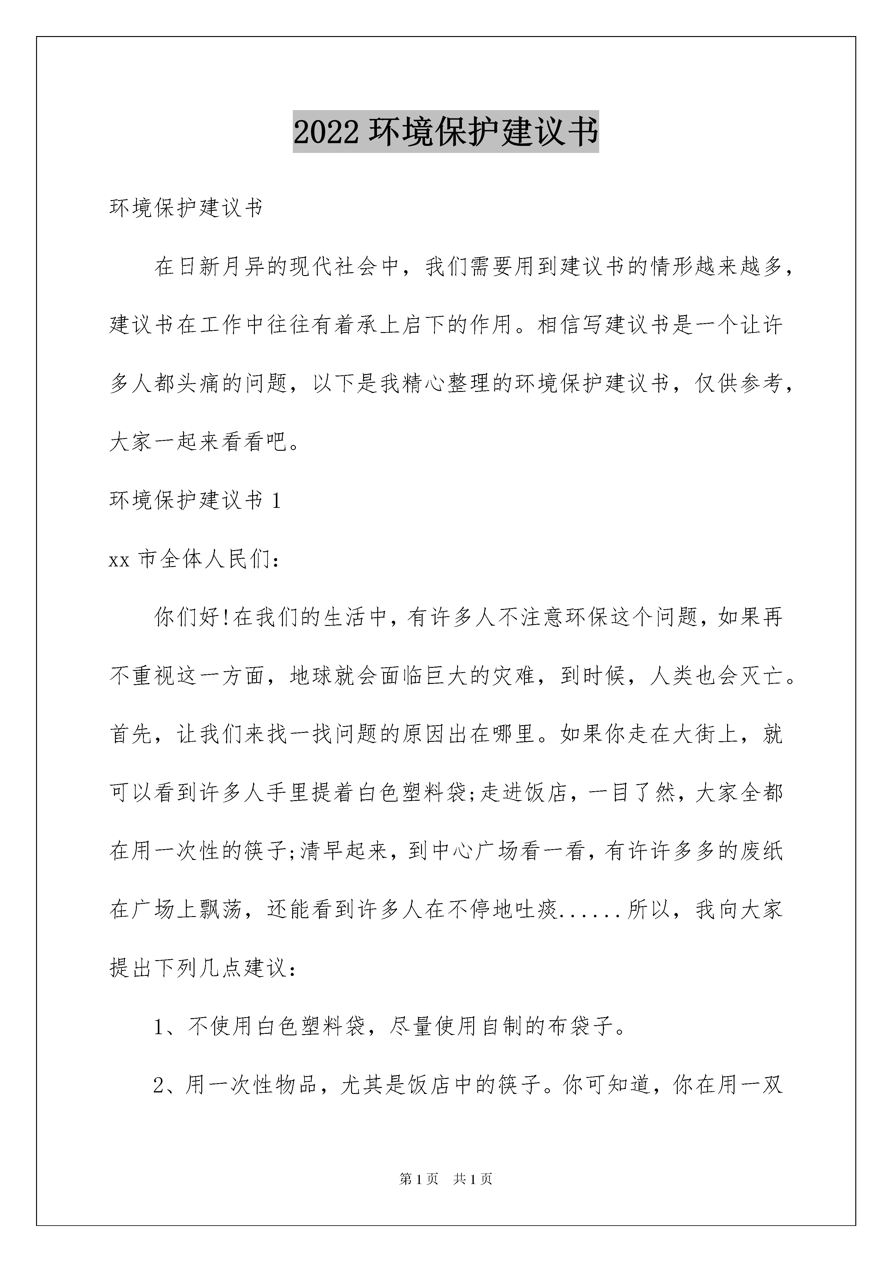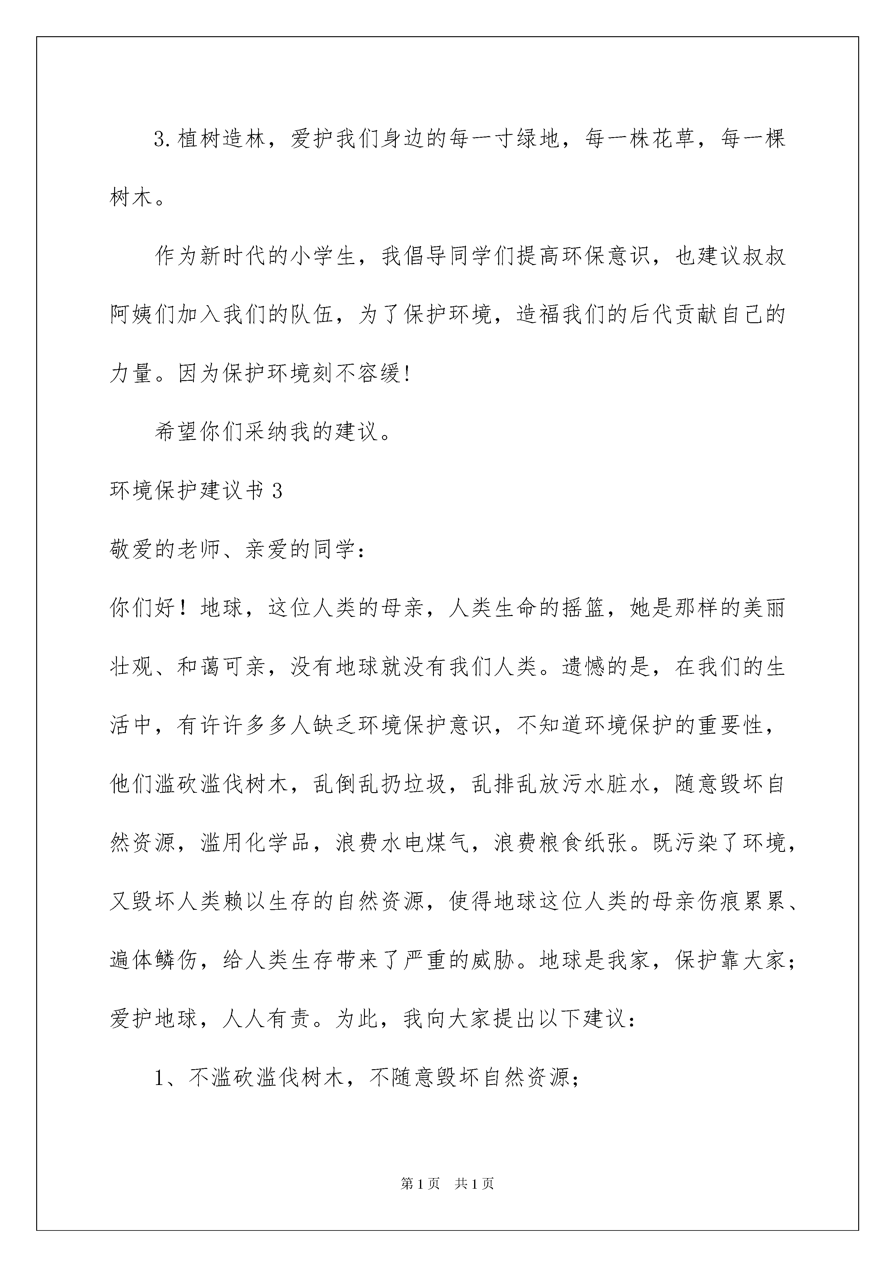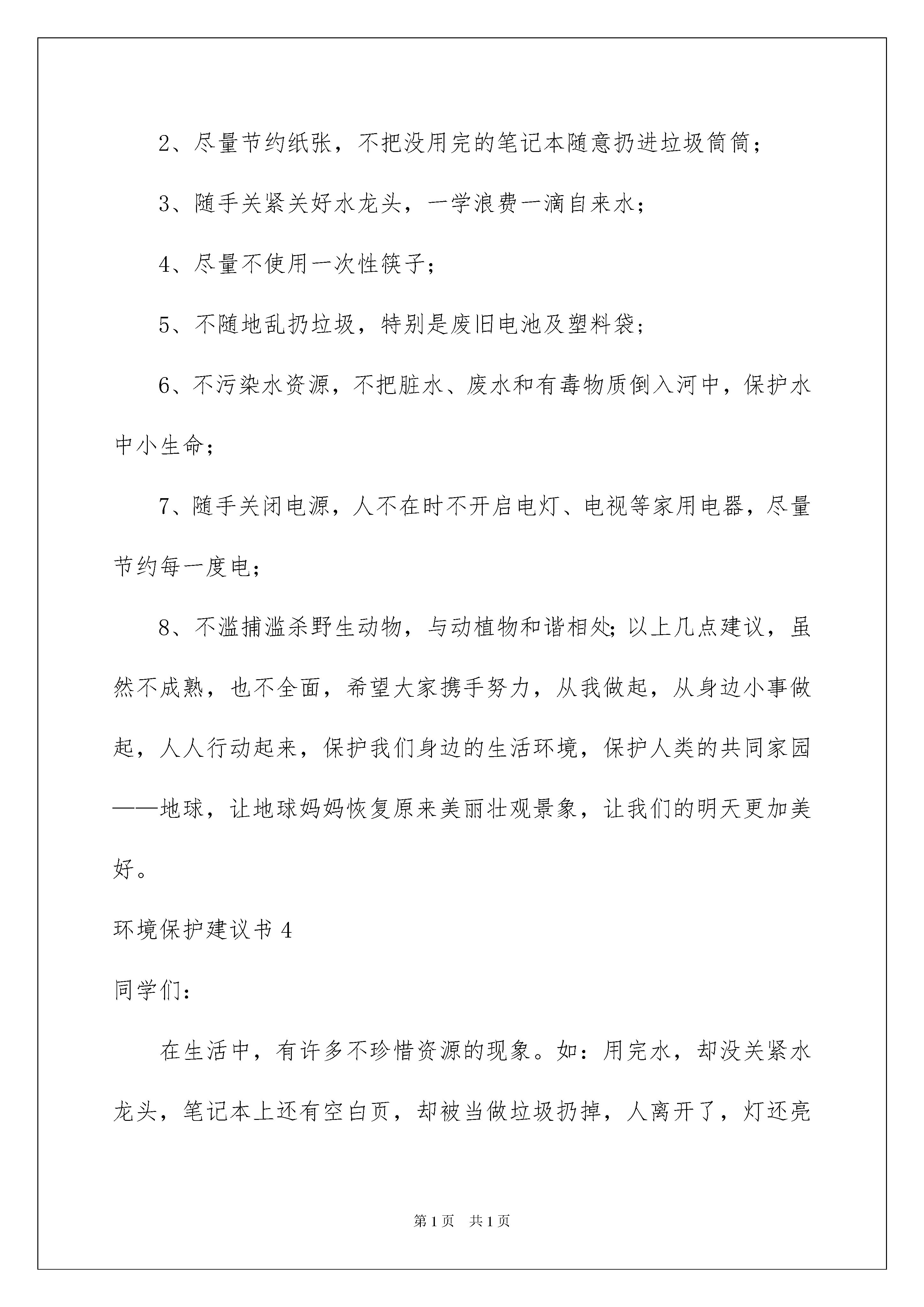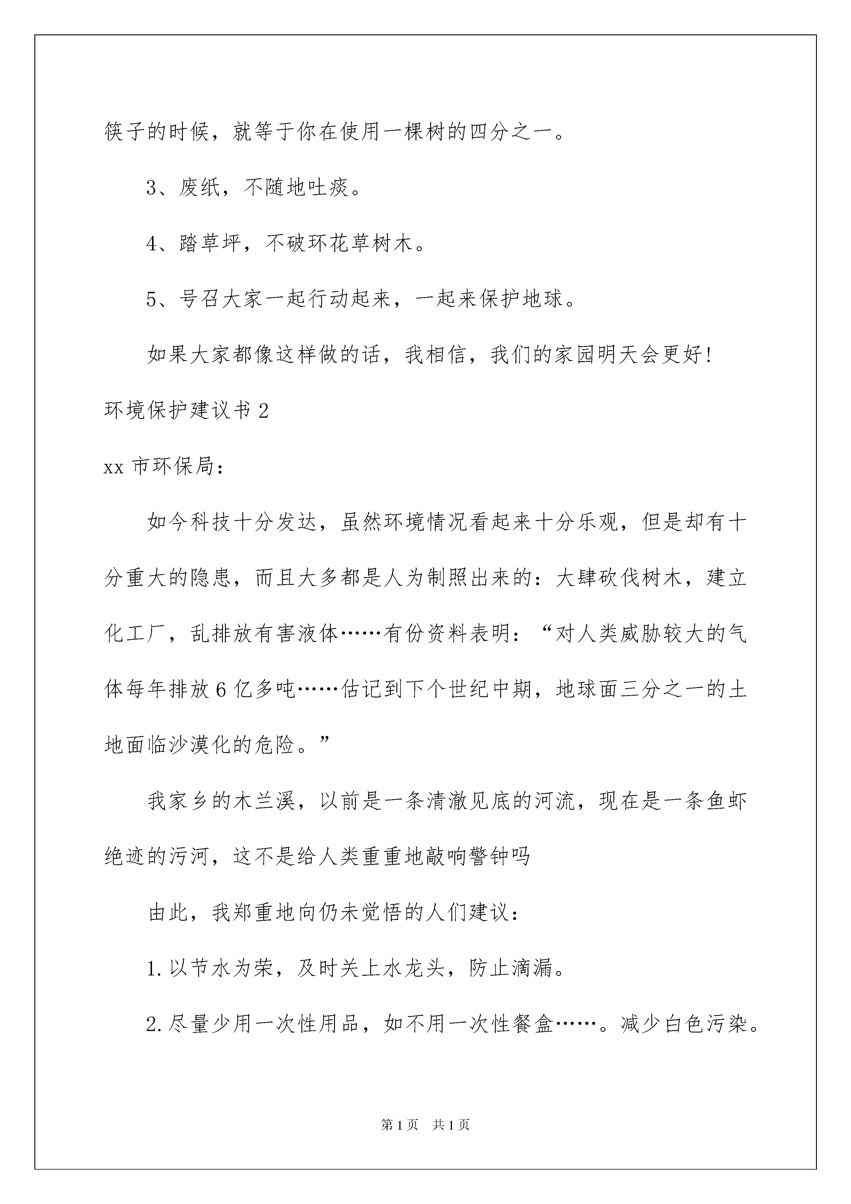 2022环境保护建议书环境保护建议书在日新月异的现代社会中,我们需要用到建议书的情形越来越多,建议书在工作中往往有着承上启下的作用。相信写建议书是一个让许多人都头痛的问题,以下是我精心整理的环境保护建议书,仅供参考,大家一起来看看吧。环境保护建议书1xx市全体人民们:你们好!在我们的生活中,有许多人不注意环保这个问题,如果再不重视这一方面,地球就会面临巨大的灾难,到时候,人类也会灭亡。首先,让我们来找一找问题的原因出在哪里。如果你走在大街上,就可以看到许多人手里提着白色塑料袋;走进饭店,一目了然,大家全都在用一次性的筷子;清早起来,到中心广场看一看,有许许多多的废纸在广场上飘荡,还能看到许多人在不停地吐痰......所以,我向大家提出下列几点建议:1、不使用白色塑料袋,尽量使用自制的布袋子。2、用一次性物品,尤其是饭店中的筷子。你可知道,你在用一双筷子的时候,就等于你在使用一棵树的四分之一。3、废纸,不随地吐痰。4、踏草坪,不破环花草树木。5、号召大家一起行动起来,一起来保护地球。如果大家都像这样做的话,我相信,我们的家园明天会更好!环境保护建议书2xx市环保局:如今科技十分发达,虽然环境情况看起来十分乐观,但是却有十分重大的隐患,而且大多都是人为制照出来的:大肆砍伐树木,建立化工厂,乱排放有害液体……有份资料表明:“对人类威胁较大的气体每年排放6亿多吨……估记到下个世纪中期,地球面三分之一的土地面临沙漠化的危险。”我家乡的木兰溪,以前是一条清澈见底的河流,现在是一条鱼虾绝迹的污河,这不是给人类重重地敲响警钟吗由此,我郑重地向仍未觉悟的人们建议:1.以节水为荣,及时关上水龙头,防止滴漏。2.尽量少用一次性用品,如不用一次性餐盒……。减少白色污染。3.植树造林,爱护我们身边的每一寸绿地,每一株花草,每一棵树木。作为新时代的小学生,我倡导同学们提高环保意识,也建议叔叔阿姨们加入我们的队伍,为了保护环境,造福我们的后代贡献自己的力量。因为保护环境刻不容缓!希望你们采纳我的建议。环境保护建议书3敬爱的老师、亲爱的同学:你们好!地球,这位人类的母亲,人类生命的摇篮,她是那样的美丽壮观、和蔼可亲,没有地球就没有我们人类。遗憾的是,在我们的生活中,有许许多多人缺乏环境保护意识,不知道环境保护的重要性,他们滥砍滥伐树木,乱倒乱扔垃圾,乱排乱放污水脏水,随意毁坏自然资源,滥用化学品,浪费水电煤气,浪费粮食纸张。既污染了环境,又毁坏人类赖以生存的自然资源,使得地球这位人类的母亲伤痕累累、遍体鳞伤,给人类生存带来了严重的威胁。地球是我家,保护靠大家;爱护地球,人人有责。为此,我向大家提出以下建议:1、不滥砍滥伐树木,不随意毁坏自然资源;2、尽量节约纸张,不把没用完的笔记本随意扔进垃圾筒筒;3、随手关紧关好水龙头,一学浪费一滴自来水;4、尽量不使用一次性筷子;5、不随地乱扔垃圾,特别是废旧电池及塑料袋;6、不污染水资源,不把脏水、废水和有毒物质倒入河中,保护水中小生命;7、随手关闭电源,人不在时不开启电灯、电视等家用电器,尽量节约每一度电;8、不滥捕滥杀野生动物,与动植物和谐相处;以上几点建议,虽然不成熟,也不全面,希望大家携手努力,从我做起,从身边小事做起,人人行动起来,保护我们身边的生活环境,保护人类的共同家园——地球,让地球妈妈恢复原来美丽壮观景象,让我们的明天更加美好。环境保护建议书4同学们:在生活中,有许多不珍惜资源的现象。如:用完水,却没关紧水龙头,笔记本上还有空白页,却被当做垃圾扔掉,人离开了,灯还亮着等。而这些现象是在我们生活中司空见惯。可是,同学们你们知道吗?这些看似是生活中的平淡无奇的小事,却有可能会给地球带来严重的后果:资源浪费,环境污染,温室效应等等。给大家举个例子吧:大家都知道树木是大自然的资源,在我们的生活中起到净化环境、制造氧气、减少噪音、。防风固沙、抵抗泥石流等作用。再看看上面哪一条是我们不是与我们生活息息相关?现在有很多商家大量的砍伐树木,导致树木森林覆盖率下降。如果再不加以节制的话,终有一天,树木会消失的。没有了树木就守不住,土地就会沙化,造成尘土飞扬,空气污浊,山体滑坡等,正像《这片土地是神圣的》所说的“降临在大地上的事终究会降临在人类身上”。我们现在的雾霾天气,就是大自然对我们人类的惩罚。现在你还觉得珍惜资源是一件小事了吗?那我们应该怎么保护环境,保护自然自然资源呢?下面是我关于一些保护自然资源建议:1、节省每张纸充分利用每一张纸。纸可是用树木做成的,少用一张纸,就可能保护一棵树不被砍伐。2、节省每一度电电是用煤等燃烧发出来的,节约用电,就是减少碳排放。我