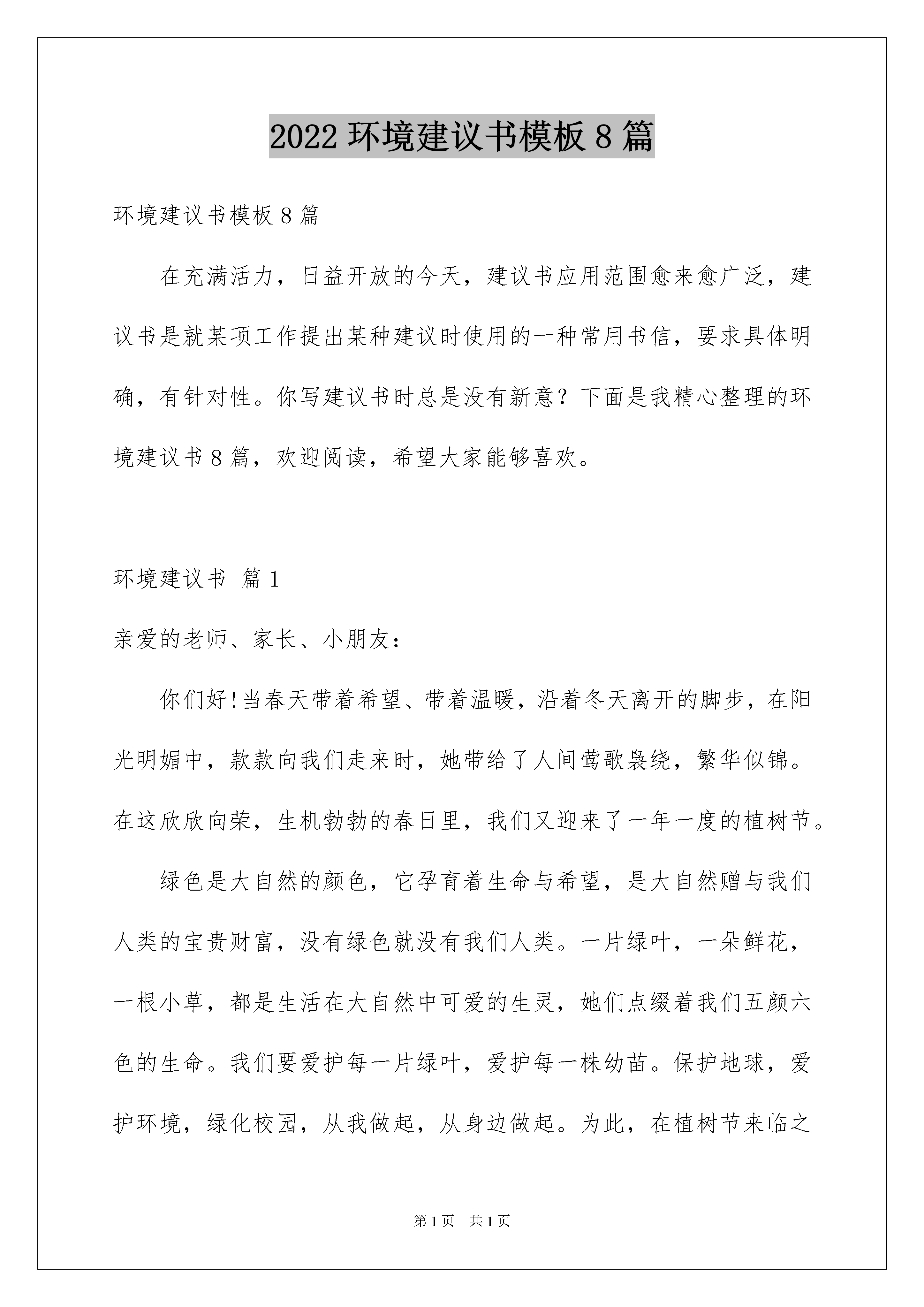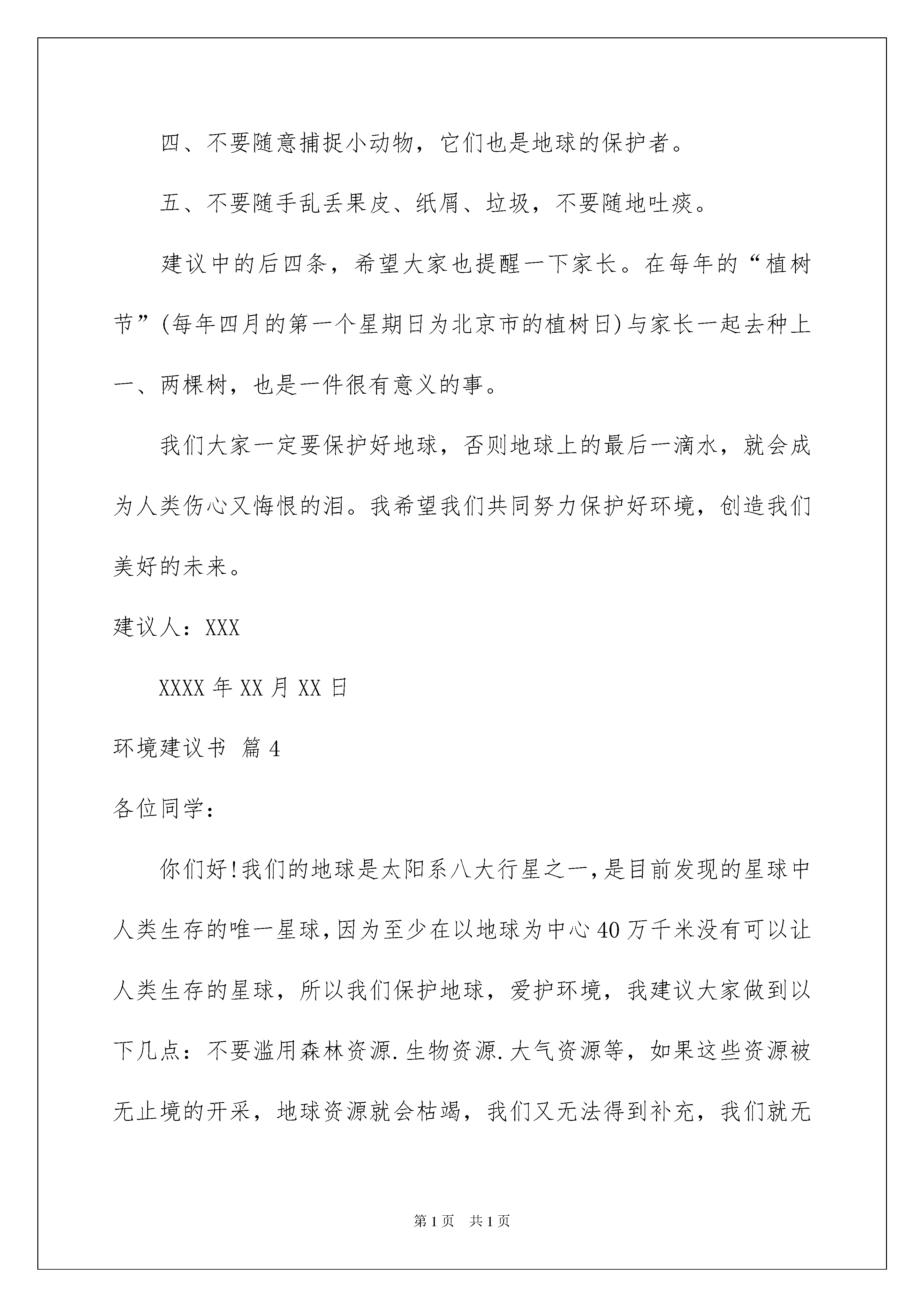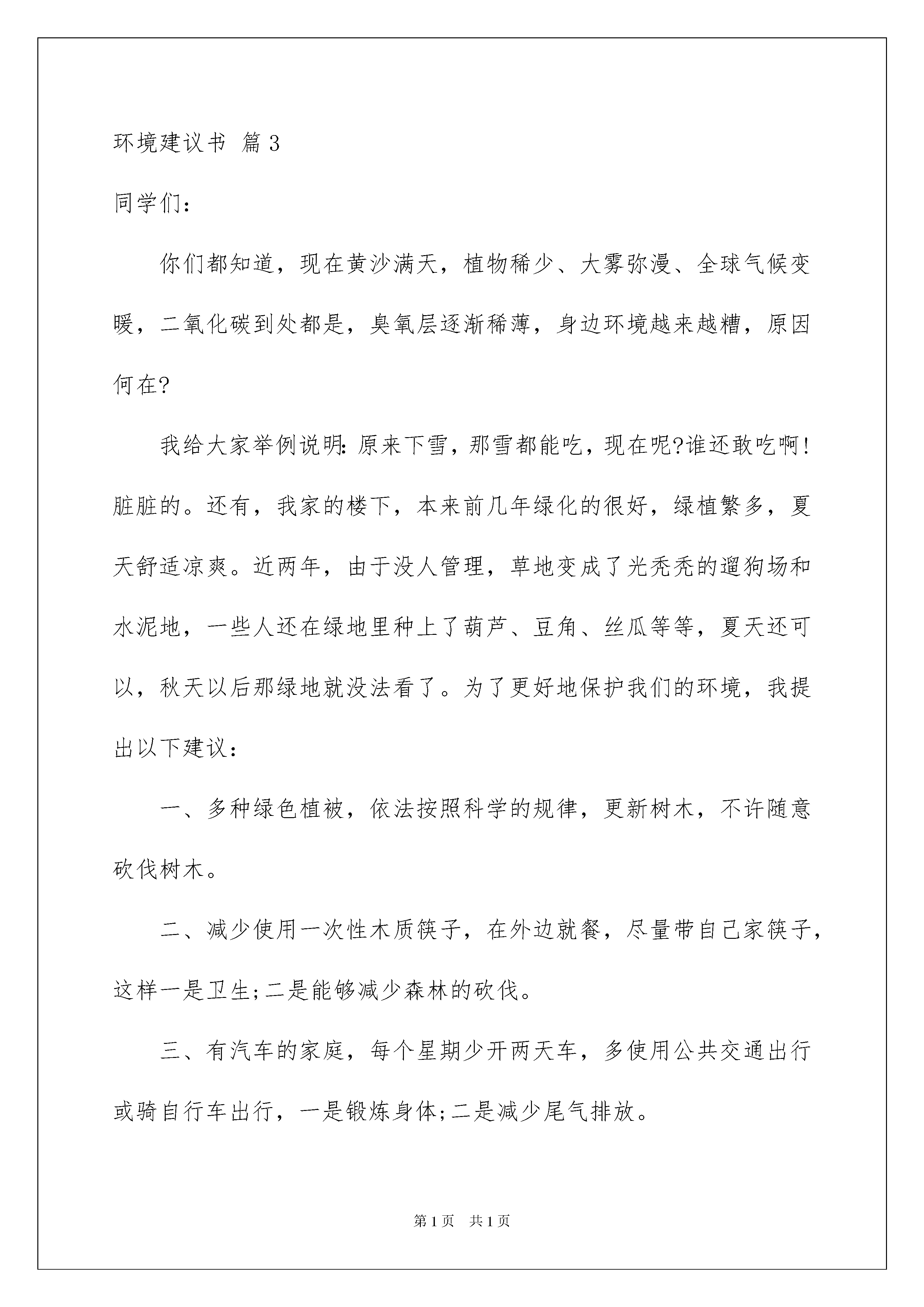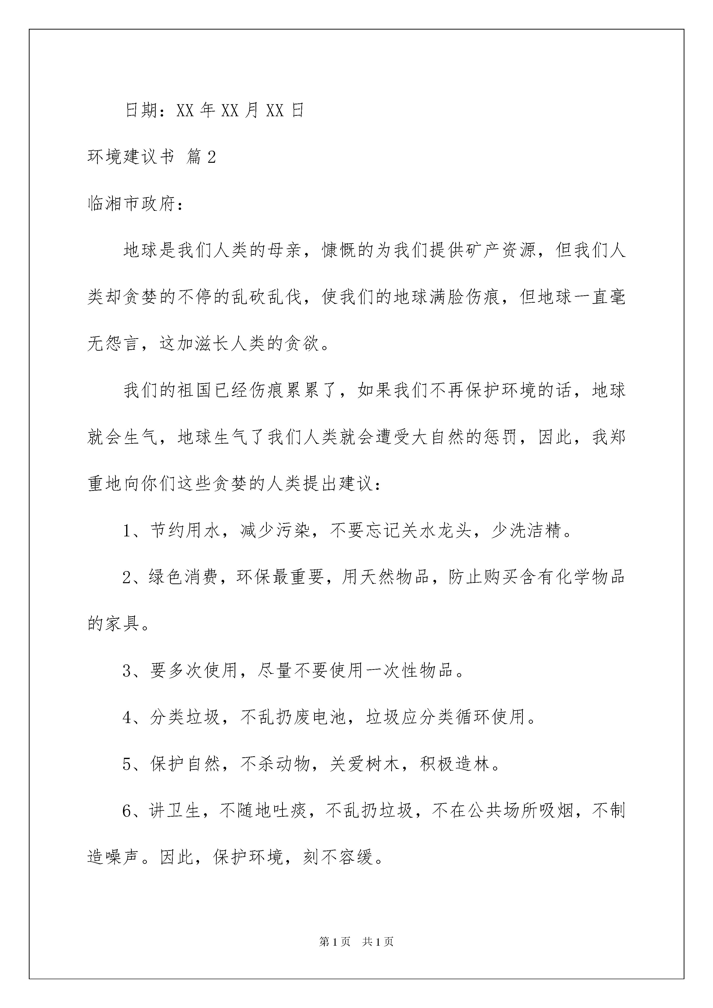 2022环境建议书模板8篇环境建议书模板8篇在充满活力,日益开放的今天,建议书应用范围愈来愈广泛,建议书是就某项工作提出某种建议时使用的一种常用书信,要求具体明确,有针对性。你写建议书时总是没有新意?下面是我精心整理的环境建议书8篇,欢迎阅读,希望大家能够喜欢。环境建议书篇1亲爱的老师、家长、小朋友:你们好!当春天带着希望、带着温暖,沿着冬天离开的脚步,在阳光明媚中,款款向我们走来时,她带给了人间莺歌袅绕,繁华似锦。在这欣欣向荣,生机勃勃的春日里,我们又迎来了一年一度的植树节。绿色是大自然的颜色,它孕育着生命与希望,是大自然赠与我们人类的宝贵财富,没有绿色就没有我们人类。一片绿叶,一朵鲜花,一根小草,都是生活在大自然中可爱的生灵,她们点缀着我们五颜六色的生命。我们要爱护每一片绿叶,爱护每一株幼苗。保护地球,爱护环境,绿化校园,从我做起,从身边做起。为此,在植树节来临之际,我们向全体教职员工、家长、小朋友们发出以下倡议:1.不破坏绿化,这包括:不采摘花朵,不攀折树木,不践踏绿化带、不穿越开放式草坪,做游戏时远离花木等。2.参加社区、幼儿园的护绿活动,到社区、幼儿园附近的绿化地做保洁工作,看到不文明的行为及时劝阻。3.积极开展家庭植树、养花活动,使自己的家变成一个绿色家园。选择一些适合在家种植的植物,种在阳台上、房间里。(成活率较高的植物),有条件的,在家门口和您的孩子一起种植一棵或更多您喜欢的树苗。并将您和孩子的“护绿”行动以照片形式拍摄下来,和大家交流与分享植树的快乐。(交至本班老师处)4.积极学习植树护绿知识。5.活动时间:3月12日至3月16日家长们、小朋友们让我们行动起来,从现在做起,爱护大自然的一草一木;从身边做起,种几棵树,养几盆花……让我们用实际行动投入到“3.12”植树节的“植树、护绿、环保、健康”活动中去,为建设美丽、文明、和谐的家园贡献自己的力量吧!倡议人:xxx日期:XX年XX月XX日环境建议书篇2临湘市政府:地球是我们人类的母亲,慷慨的为我们提供矿产资源,但我们人类却贪婪的不停的乱砍乱伐,使我们的地球满脸伤痕,但地球一直毫无怨言,这加滋长人类的贪欲。我们的祖国已经伤痕累累了,如果我们不再保护环境的话,地球就会生气,地球生气了我们人类就会遭受大自然的惩罚,因此,我郑重地向你们这些贪婪的人类提出建议:1、节约用水,减少污染,不要忘记关水龙头,少洗洁精。2、绿色消费,环保最重要,用天然物品,防止购买含有化学物品的家具。3、要多次使用,尽量不要使用一次性物品。4、分类垃圾,不乱扔废电池,垃圾应分类循环使用。5、保护自然,不杀动物,关爱树木,积极造林。6、讲卫生,不随地吐痰,不乱扔垃圾,不在公共场所吸烟,不制造噪声。因此,保护环境,刻不容缓。环境建议书篇3同学们:你们都知道,现在黄沙满天,植物稀少、大雾弥漫、全球气候变暖,二氧化碳到处都是,臭氧层逐渐稀薄,身边环境越来越糟,原因何在?我给大家举例说明:原来下雪,那雪都能吃,现在呢?谁还敢吃啊!脏脏的。还有,我家的楼下,本来前几年绿化的很好,绿植繁多,夏天舒适凉爽。近两年,由于没人管理,草地变成了光秃秃的遛狗场和水泥地,一些人还在绿地里种上了葫芦、豆角、丝瓜等等,夏天还可以,秋天以后那绿地就没法看了。为了更好地保护我们的环境,我提出以下建议:一、多种绿色植被,依法按照科学的规律,更新树木,不许随意砍伐树木。二、减少使用一次性木质筷子,在外边就餐,尽量带自己家筷子,这样一是卫生;二是能够减少森林的砍伐。三、有汽车的家庭,每个星期少开两天车,多使用公共交通出行或骑自行车出行,一是锻炼身体;二是减少尾气排放。四、不要随意捕捉小动物,它们也是地球的保护者。五、不要随手乱丢果皮、纸屑、垃圾,不要随地吐痰。建议中的后四条,希望大家也提醒一下家长。在每年的“植树节”(每年四月的第一个星期日为北京市的植树日)与家长一起去种上一、两棵树,也是一件很有意义的事。我们大家一定要保护好地球,否则地球上的最后一滴水,就会成为人类伤心又悔恨的泪。我希望我们共同努力保护好环境,创造我们美好的未来。建议人:XXXXXXX年XX月XX日环境建议书篇4各位同学:你们好!我们的地球是太阳系八大行星之一,是目前发现的星球中人类生存的唯一星球,因为至少在以地球为中心40万千米没有可以让人类生存的星球,所以我们保护地球,爱护环境,我建议大家做到以下几点:不要滥用森林资源.生物资源.大气资源等,如果这些资源被无止境的开采,地球资源就会枯竭,我们又无法得到补充,我们就无法生存了。水是生命的源泉,但是它又实在太少了。如果地球只有一桶水,那我们只能用其中的一滴而以