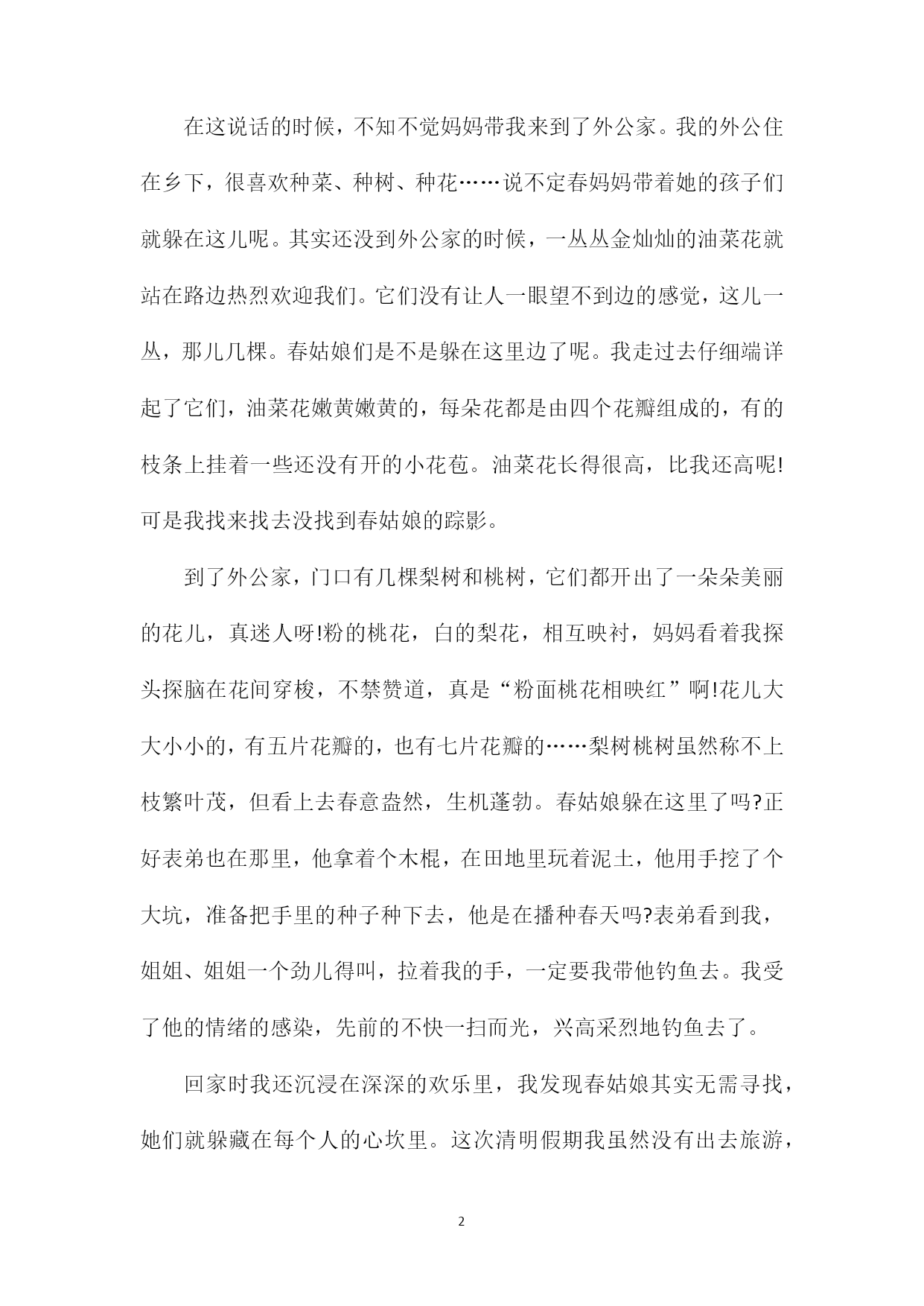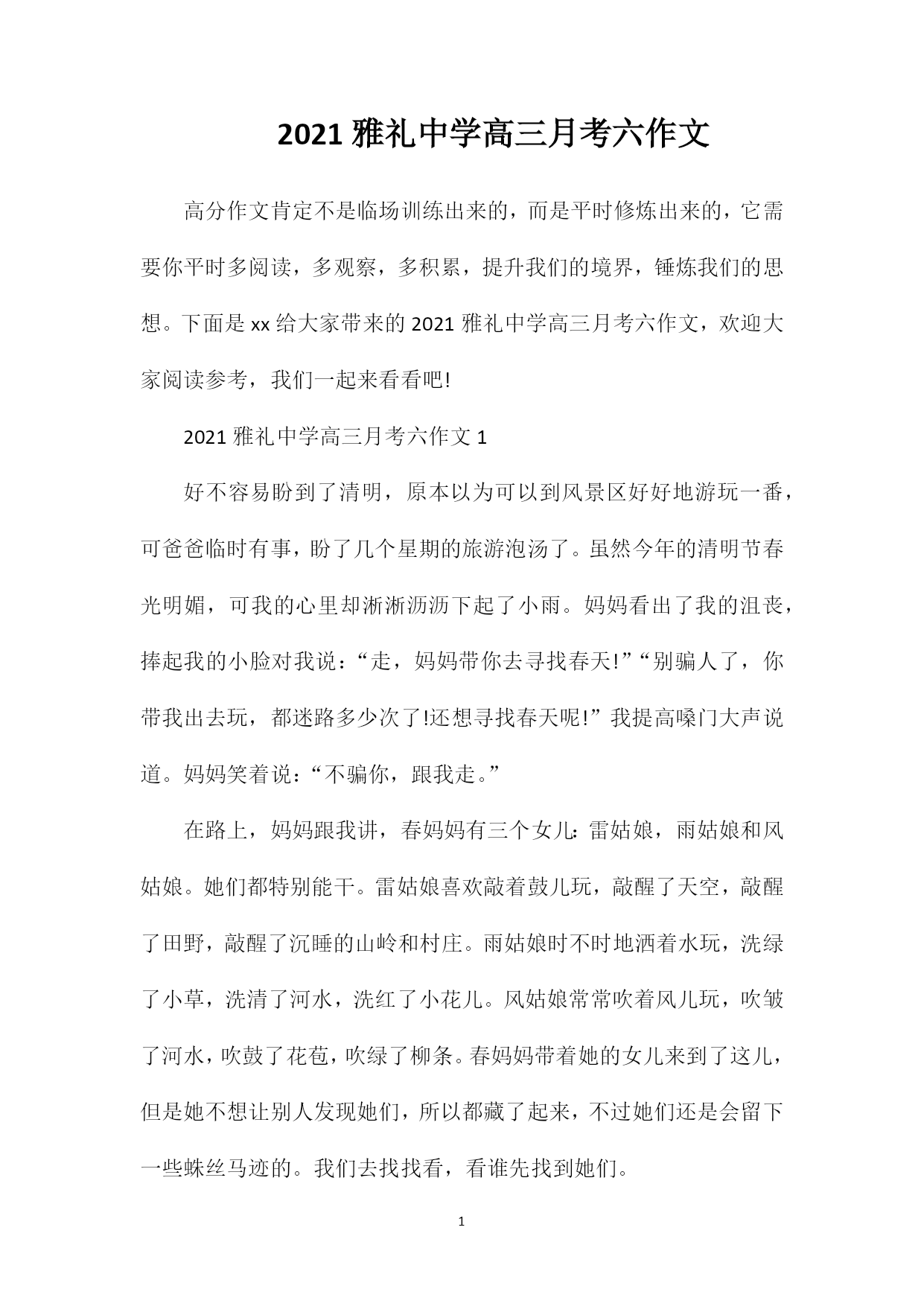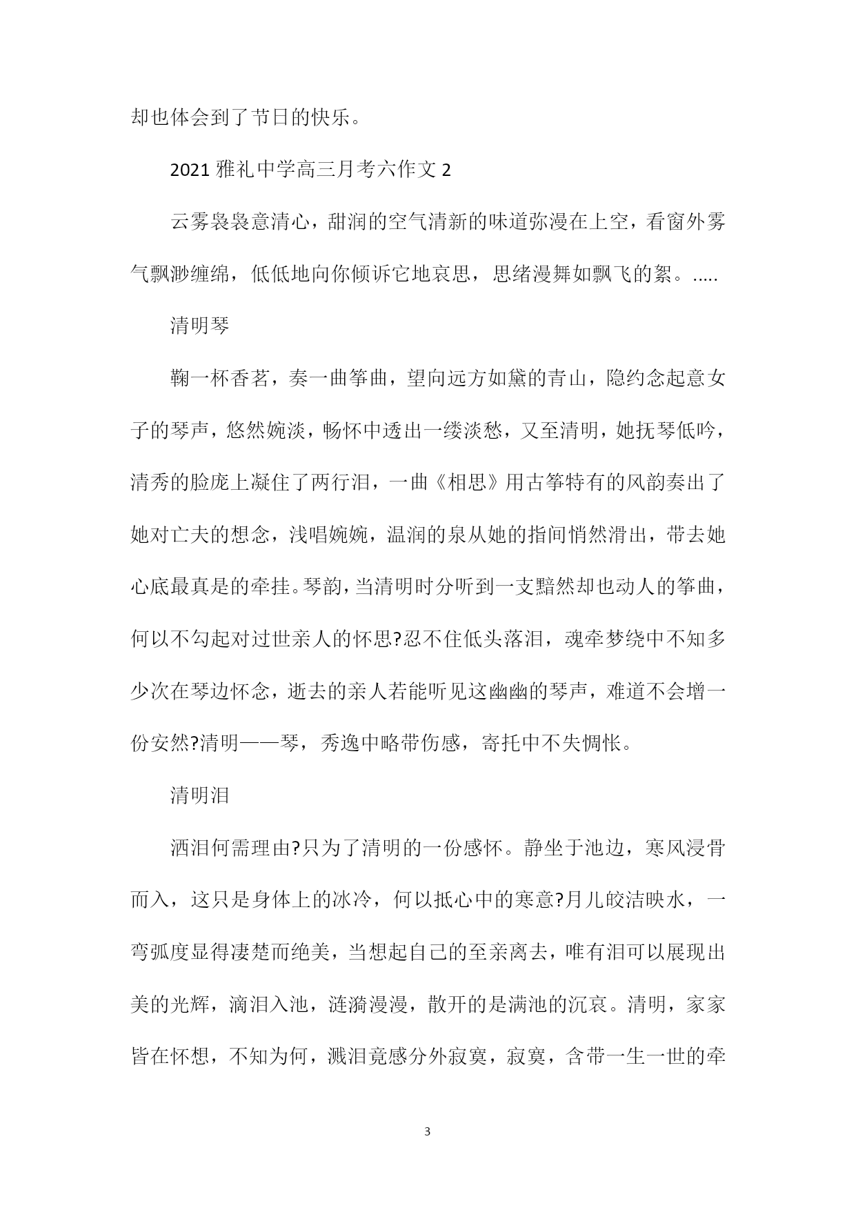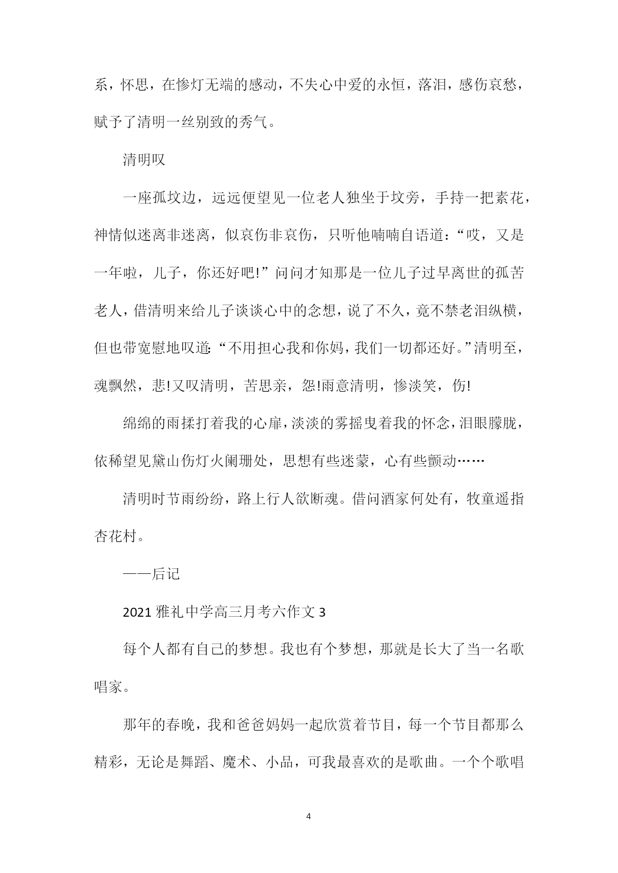 2021雅礼中学高三月考六作文 高分作文肯定不是临场训练出来的,而是平时修炼出来的,它需要你平时多阅读,多观察,多积累,提升我们的境界,锤炼我们的思想。下面是xx给大家带来的2021雅礼中学高三月考六作文,欢迎大家阅读参考,我们一起来看看吧! 2021雅礼中学高三月考六作文1 好不容易盼到了清明,原本以为可以到风景区好好地游玩一番,可爸爸临时有事,盼了几个星期的旅游泡汤了。虽然今年的清明节春光明媚,可我的心里却淅淅沥沥下起了小雨。妈妈看出了我的沮丧,捧起我的小脸对我说:“走,妈妈带你去寻找春天!”“别骗人了,你带我出去玩,都迷路多少次了!还想寻找春天呢!”我提高嗓门大声说道。妈妈笑着说:“不骗你,跟我走。” 在路上,妈妈跟我讲,春妈妈有三个女儿:雷姑娘,雨姑娘和风姑娘。她们都特别能干。雷姑娘喜欢敲着鼓儿玩,敲醒了天空,敲醒了田野,敲醒了沉睡的山岭和村庄。雨姑娘时不时地洒着水玩,洗绿了小草,洗清了河水,洗红了小花儿。风姑娘常常吹着风儿玩,吹皱了河水,吹鼓了花苞,吹绿了柳条。春妈妈带着她的女儿来到了这儿,但是她不想让别人发现她们,所以都藏了起来,不过她们还是会留下一些蛛丝马迹的。我们去找找看,看谁先找到她们。 在这说话的时候,不知不觉妈妈带我来到了外公家。我的外公住在乡下,很喜欢种菜、种树、种花……说不定春妈妈带着她的孩子们就躲在这儿呢。其实还没到外公家的时候,一丛丛金灿灿的油菜花就站在路边热烈欢迎我们。它们没有让人一眼望不到边的感觉,这儿一丛,那儿几棵。春姑娘们是不是躲在这里边了呢。我走过去仔细端详起了它们,油菜花嫩黄嫩黄的,每朵花都是由四个花瓣组成的,有的枝条上挂着一些还没有开的小花苞。油菜花长得很高,比我还高呢!可是我找来找去没找到春姑娘的踪影。 到了外公家,门口有几棵梨树和桃树,它们都开出了一朵朵美丽的花儿,真迷人呀!粉的桃花,白的梨花,相互映衬,妈妈看着我探头探脑在花间穿梭,不禁赞道,真是“粉面桃花相映红”啊!花儿大大小小的,有五片花瓣的,也有七片花瓣的……梨树桃树虽然称不上枝繁叶茂,但看上去春意盎然,生机蓬勃。春姑娘躲在这里了吗?正好表弟也在那里,他拿着个木棍,在田地里玩着泥土,他用手挖了个大坑,准备把手里的种子种下去,他是在播种春天吗?表弟看到我,姐姐、姐姐一个劲儿得叫,拉着我的手,一定要我带他钓鱼去。我受了他的情绪的感染,先前的不快一扫而光,兴高采烈地钓鱼去了。 回家时我还沉浸在深深的欢乐里,我发现春姑娘其实无需寻找,她们就躲藏在每个人的心坎里。这次清明假期我虽然没有出去旅游,却也体会到了节日的快乐。 2021雅礼中学高三月考六作文2 云雾袅袅意清心,甜润的空气清新的味道弥漫在上空,看窗外雾气飘渺缠绵,低低地向你倾诉它地哀思,思绪漫舞如飘飞的絮。..... 清明琴 鞠一杯香茗,奏一曲筝曲,望向远方如黛的青山,隐约念起意女子的琴声,悠然婉淡,畅怀中透出一缕淡愁,又至清明,她抚琴低吟,清秀的脸庞上凝住了两行泪,一曲《相思》用古筝特有的风韵奏出了她对亡夫的想念,浅唱婉婉,温润的泉从她的指间悄然滑出,带去她心底最真是的牵挂。琴韵,当清明时分听到一支黯然却也动人的筝曲,何以不勾起对过世亲人的怀思?忍不住低头落泪,魂牵梦绕中不知多少次在琴边怀念,逝去的亲人若能听见这幽幽的琴声,难道不会增一份安然?清明——琴,秀逸中略带伤感,寄托中不失惆怅。 清明泪 洒泪何需理由?只为了清明的一份感怀。静坐于池边,寒风浸骨而入,这只是身体上的冰冷,何以抵心中的寒意?月儿皎洁映水,一弯弧度显得凄楚而绝美,当想起自己的至亲离去,唯有泪可以展现出美的光辉,滴泪入池,涟漪漫漫,散开的是满池的沉哀。清明,家家皆在怀想,不知为何,溅泪竟感分外寂寞,寂寞,含带一生一世的牵系,怀思,在惨灯无端的感动,不失心中爱的永恒,落泪,感伤哀愁,赋予了清明一丝别致的秀气。 清明叹 一座孤坟边,远远便望见一位老人独坐于坟旁,手持一把素花,神情似迷离非迷离,似哀伤非哀伤,只听他喃喃自语道:“哎,又是一年啦,儿子,你还好吧!”问问才知那是一位儿子过早离世的孤苦老人,借清明来给儿子谈谈心中的念想,说了不久,竟不禁老泪纵横,但也带宽慰地叹道:“不用担心我和你妈,我们一切都还好。”清明至,魂飘然,悲!又叹清明,苦思亲,怨!雨意清明,惨淡笑,伤! 绵绵的雨揉打着我的心扉,淡淡的雾摇曳着我的怀念,泪眼朦胧,依稀望见黛山伤灯火阑珊处,思想有些迷蒙,心有些颤动…… 清明时节雨纷纷,路上行人欲断魂。借问酒家何处有,牧童遥指杏花村。 ——后记 2021雅礼中学高三月考六作文3 每个人都有自己的梦想。我也有个梦想,那就是长大了当一名歌唱家。 那年的春晚,我和爸爸妈妈一起欣赏着节目,每一个节目都那么精彩,无论是舞蹈、魔术、小品,可我最喜欢的是歌曲。一个个歌唱演员都面带笑容,声情并茂地