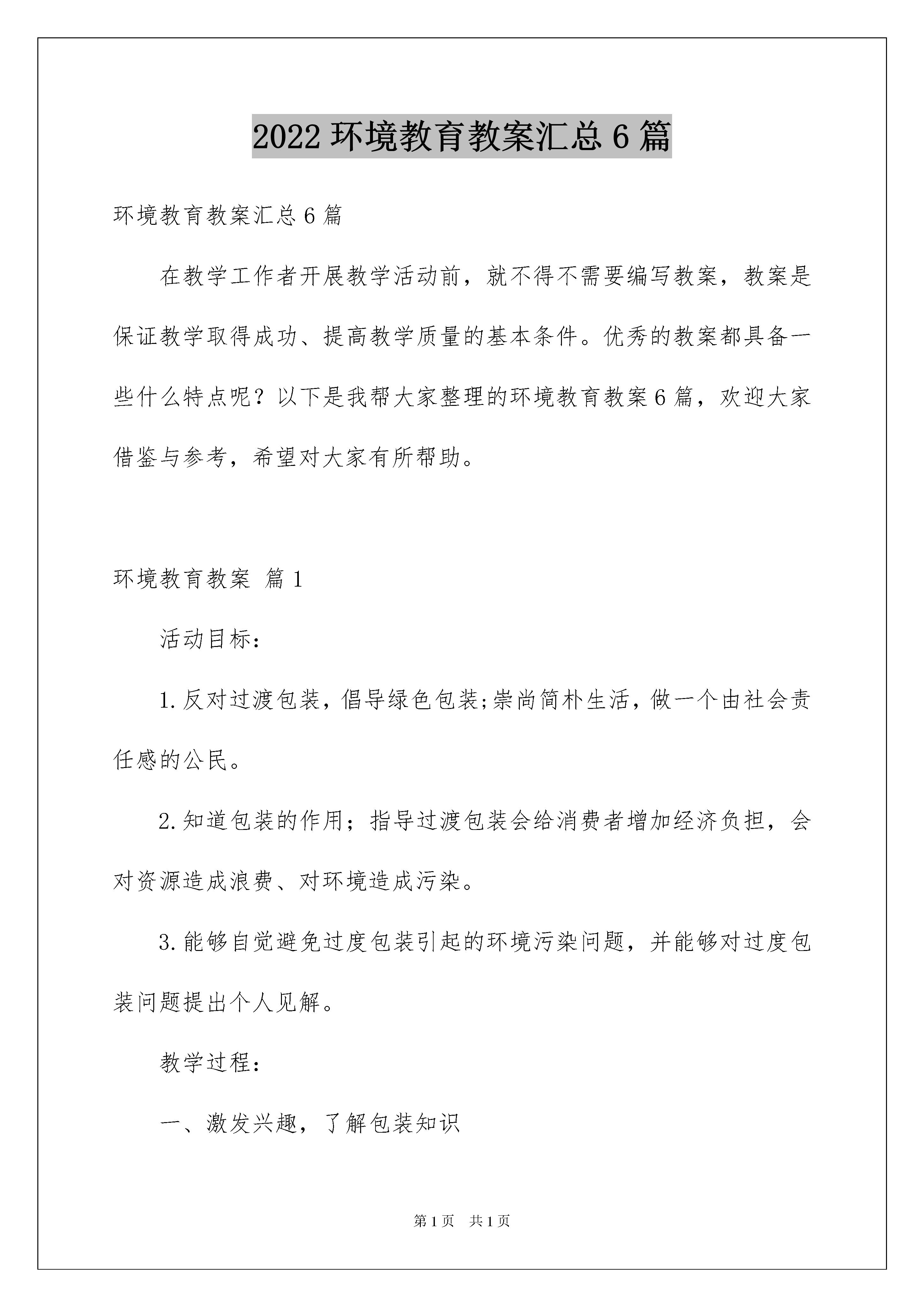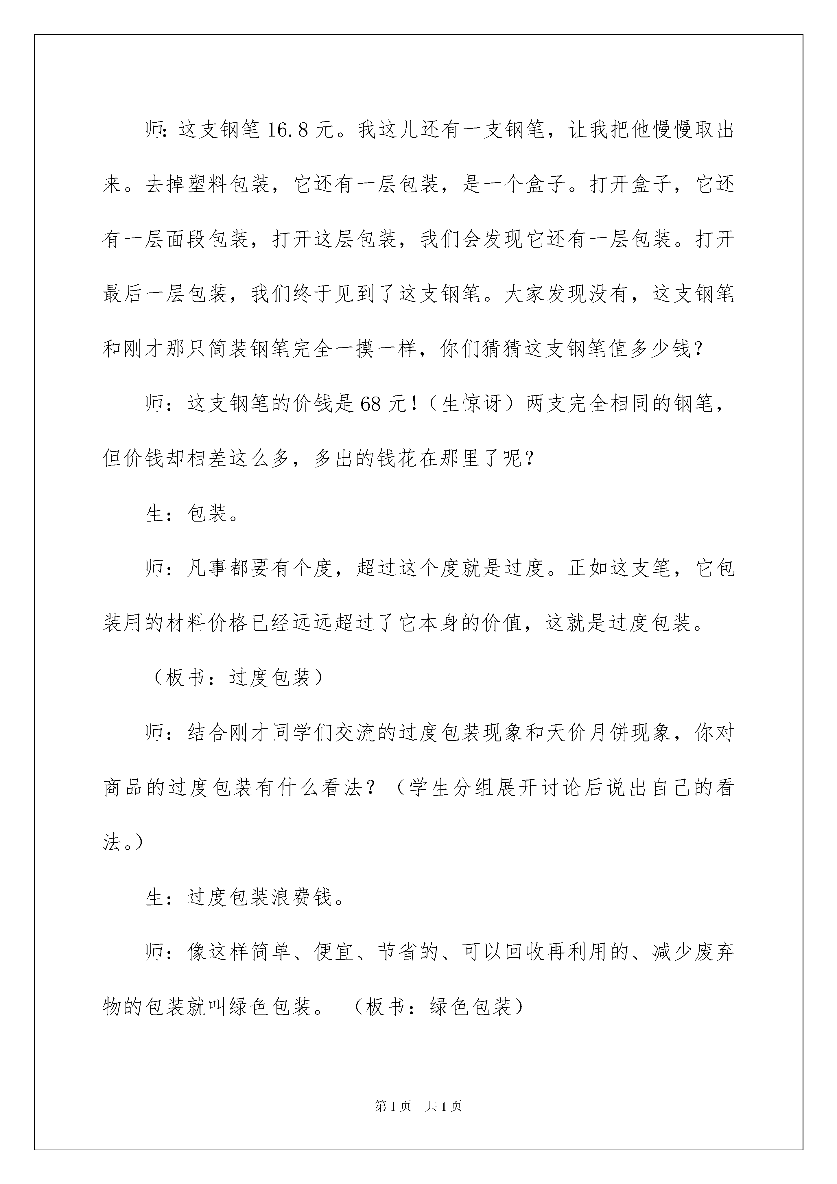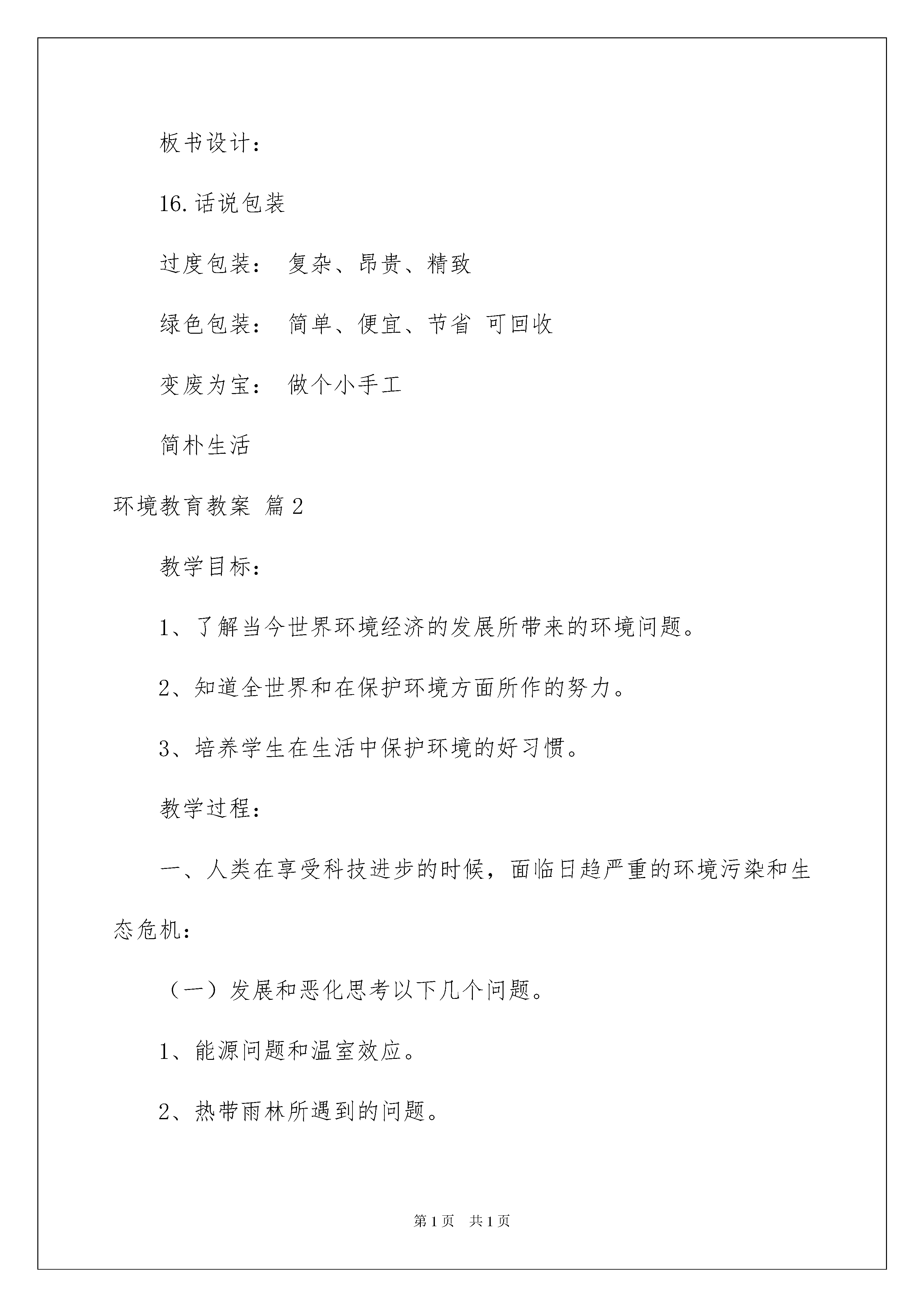 2022环境教育教案汇总6篇环境教育教案汇总6篇在教学工作者开展教学活动前,就不得不需要编写教案,教案是保证教学取得成功、提高教学质量的基本条件。优秀的教案都具备一些什么特点呢?以下是我帮大家整理的环境教育教案6篇,欢迎大家借鉴与参考,希望对大家有所帮助。环境教育教案篇1活动目标:1.反对过渡包装,倡导绿色包装;崇尚简朴生活,做一个由社会责任感的公民。2.知道包装的作用;指导过渡包装会给消费者增加经济负担,会对资源造成浪费、对环境造成污染。3.能够自觉避免过度包装引起的环境污染问题,并能够对过度包装问题提出个人见解。教学过程:一、激发兴趣,了解包装知识师:同学们,喜欢看动画片吗?今天,老师诶大家带来一个好看的动画片,不过再看完动画片后,老师又个小问题,看谁看得认真、听得仔细,能回答出老师的小问题。(课件呈现:播放动画片《买椟还珠》。)师:珠宝店老板在生意不好时,想出了什么办法?生:他把珠宝进行了包装。师:对,老伴把它的珠宝进行了包装,很快有了买主,看来这包装还真有学问,今天我们就来说一说关于包装的话题。师:包装和我们的生活密不可分,同学们一定也深有体会。课前,老师布置大家利用周末的时间去做商品包装小调查,下面交流你们的调查结果。生分小组交流。二、了解过渡包装及其危害,倡导绿色包装师:今天老师也准备了两件不同包装的商品。想看吗?我们来玩一个猜一猜的游戏。师:(师出示简装钢笔)这是一支钢笔,大家来猜一猜它的价钱是多少?师:这支钢笔16.8元。我这儿还有一支钢笔,让我把他慢慢取出来。去掉塑料包装,它还有一层包装,是一个盒子。打开盒子,它还有一层面段包装,打开这层包装,我们会发现它还有一层包装。打开最后一层包装,我们终于见到了这支钢笔。大家发现没有,这支钢笔和刚才那只简装钢笔完全一摸一样,你们猜猜这支钢笔值多少钱?师:这支钢笔的价钱是68元!(生惊讶)两支完全相同的钢笔,但价钱却相差这么多,多出的钱花在那里了呢?生:包装。师:凡事都要有个度,超过这个度就是过度。正如这支笔,它包装用的材料价格已经远远超过了它本身的价值,这就是过度包装。(板书:过度包装)师:结合刚才同学们交流的过度包装现象和天价月饼现象,你对商品的过度包装有什么看法?(学生分组展开讨论后说出自己的看法。)生:过度包装浪费钱。师:像这样简单、便宜、节省的、可以回收再利用的、减少废弃物的包装就叫绿色包装。(板书:绿色包装)师:通过刚才交流,老师看出来了,你们每个人都是节约小能手。但倡导绿色包装不仅仅是个人得事,老师想请你们帮个忙,让更多的人认识到过度包装的危害,倡导绿色包装。下面拿起笔,给你周围的人或者给商品生产厂家提点建议,出个小点子,把你想说的卸载“我的小倡议”一栏里面。来,让我们写一写吧!学生写小倡议。班级交流小倡议。三、包装盒的妙用师:这些精美的包装扔了多可惜啊,可不可以让他们在发挥作用呢?你有妙招吗?学生交流:可以做小工艺品。师:你们也可以尝试着自己做一做,记住:只要肯动脑,废物也能变成宝!四、课堂小结通过这节课的学习,我们懂得了过度包装的危害,作为一名小消费者,我们一定要购买绿色包装的商品。这就是提倡我们过简朴生活!(板书简朴生活)板书设计:16.话说包装过度包装:复杂、昂贵、精致绿色包装:简单、便宜、节省可回收变废为宝:做个小手工简朴生活环境教育教案篇2教学目标:1、了解当今世界环境经济的发展所带来的环境问题。2、知道全世界和在保护环境方面所作的努力。3、培养学生在生活中保护环境的好习惯。教学过程:一、人类在享受科技进步的时候,面临日趋严重的环境污染和生态危机:(一)发展和恶化思考以下几个问题。1、能源问题和温室效应。2、热带雨林所遇到的问题。3、物种消失的阴影。4、自然资源的过量消耗。二、全球的绿色行动。1、斯德哥尔摩会议——人类保护环境德里程碑。了解雷彻尔卡逊这个人。斯德哥尔摩会议德时间、地点、人物、事件。“世界环境日”《联合国人类环境宣言》以及会议口号“只有一个地球”2、一个全新德发展观——可持续发展了解斯德哥尔摩会议后世界环境变化。三、德绿色行动1、《环境保护法》颁布,(绿色德保证)《环境保护法》颁布德背景(1)制订《中华人民共和国环境保护法》,使环境保护工作有法可依。(2)设立环境保护机构,加强环境管理。(3)加强环境保护德宣传教育工作,提高人们德环境保护意识。2、可持续发展在。“环境与发展十大对策”《21世纪议程》环境科学德产生。三北防护林体系工程、沿海防护林体系过程。生态农业。四、保护环境,从我做起我们作为新世纪德环境教育教案篇3教学目的:1、了解水污染、水体污染、水体污染元的含义,理解三者