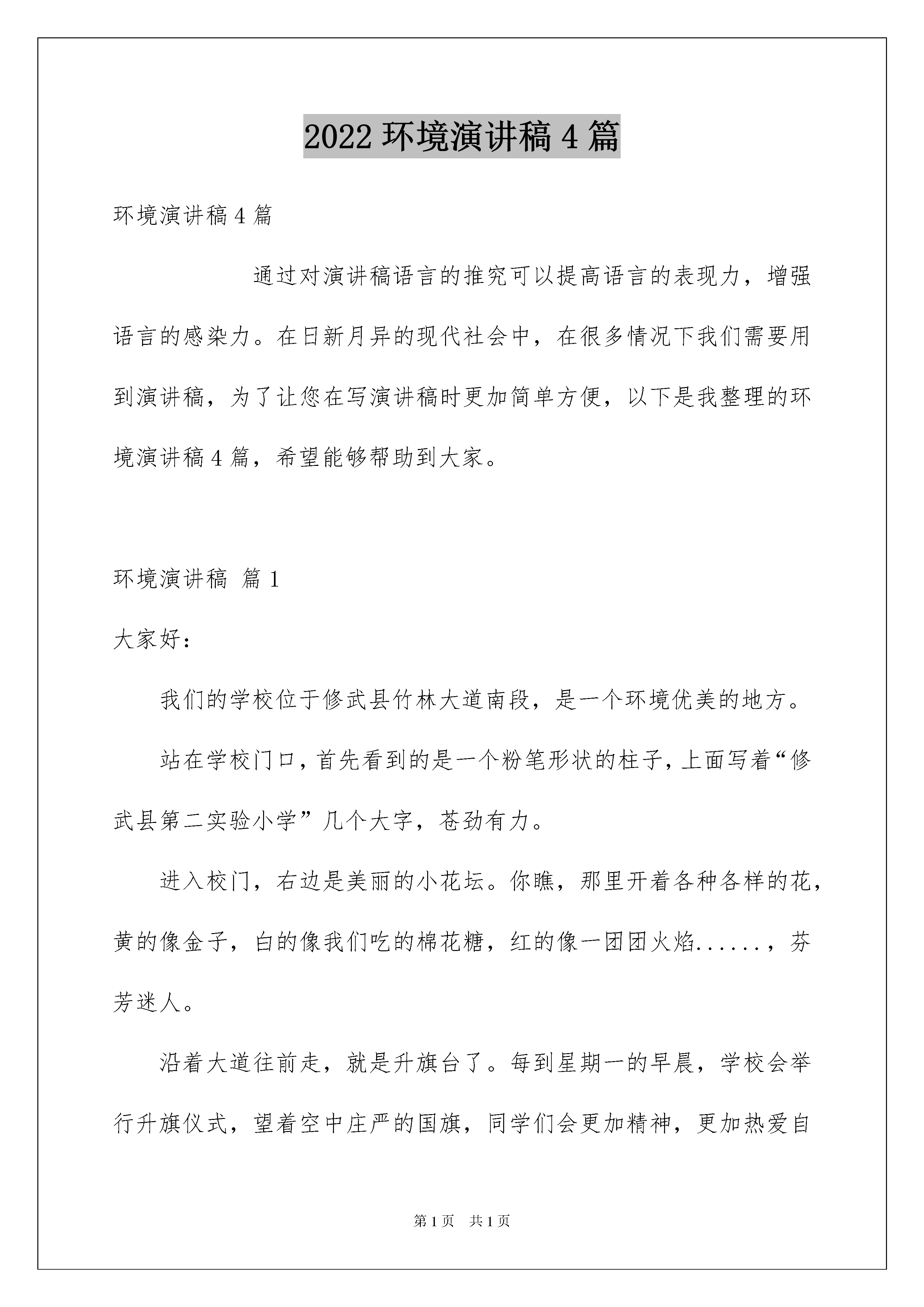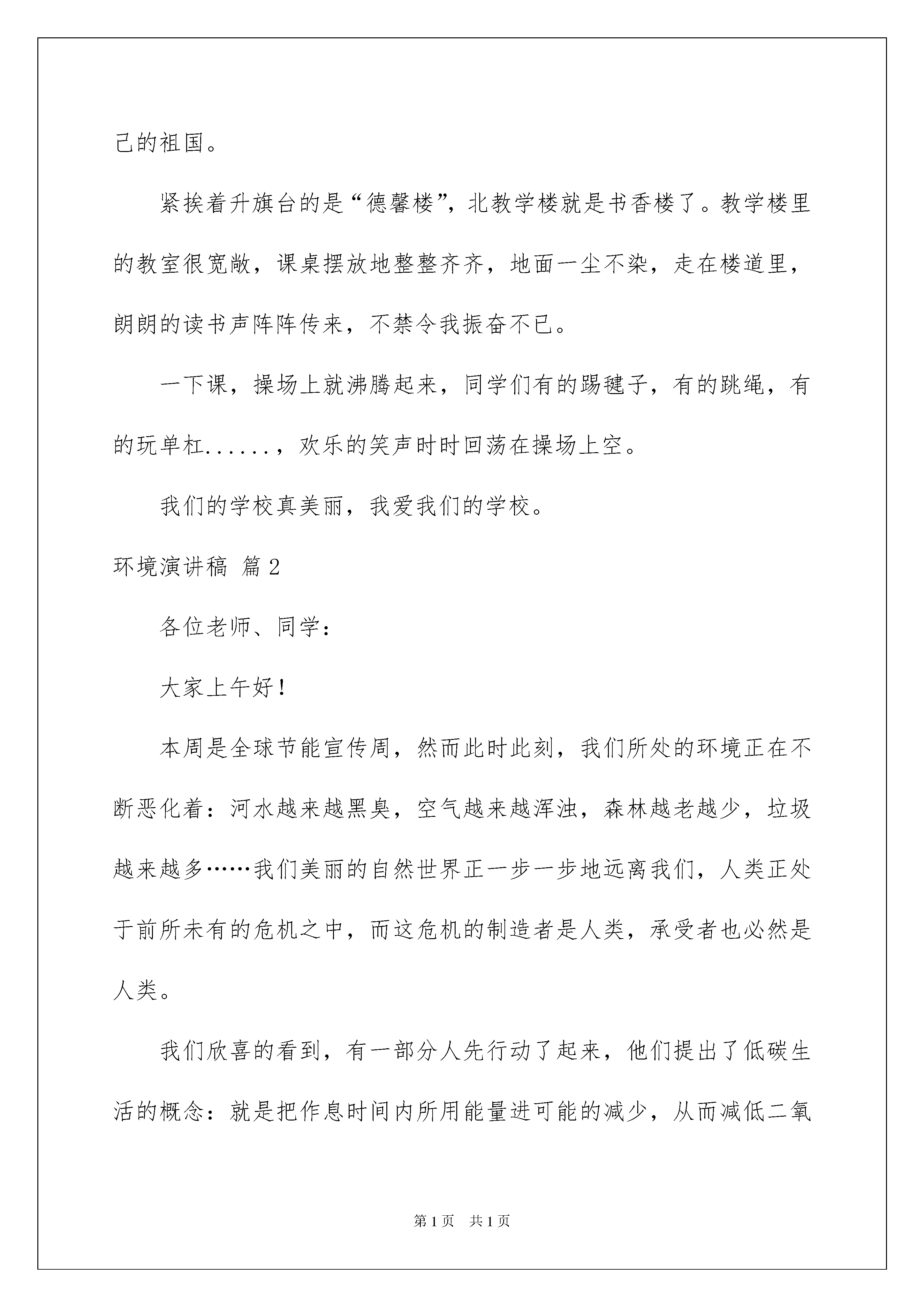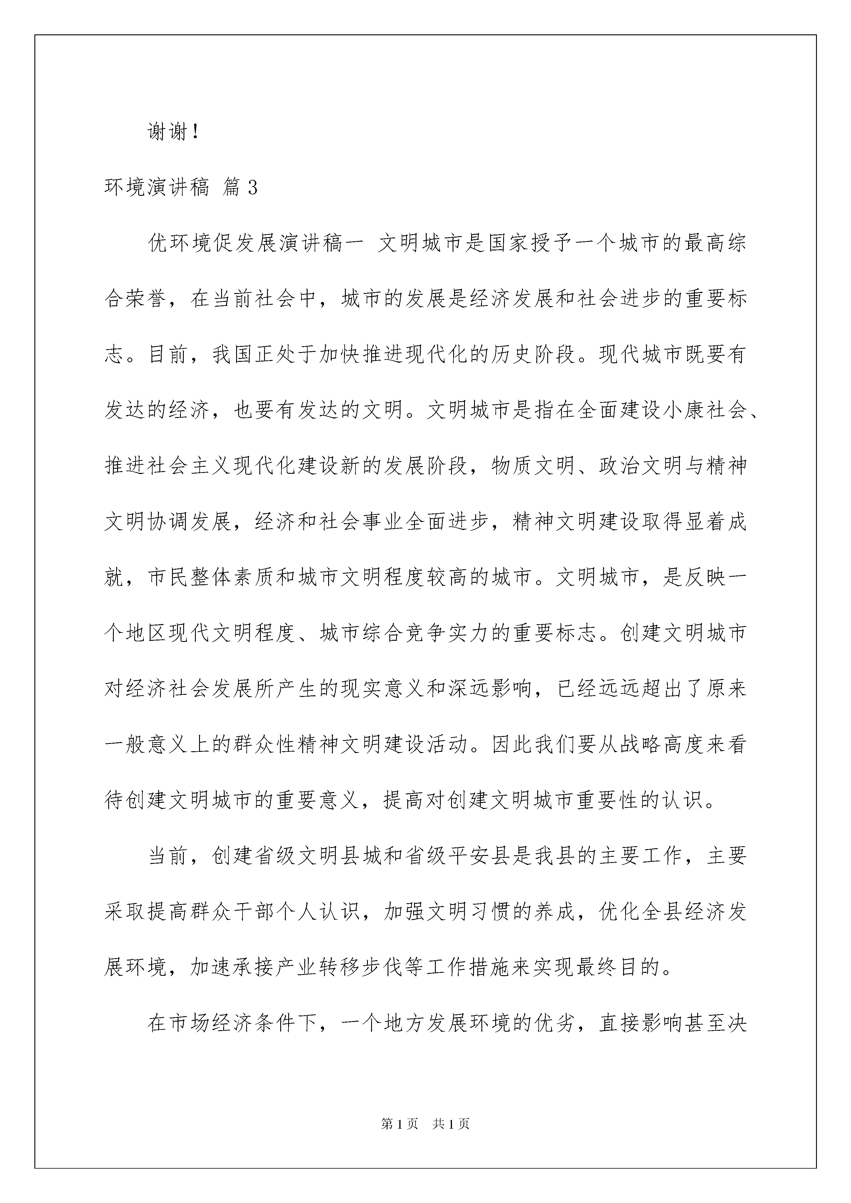 2022环境演讲稿4篇环境演讲稿4篇通过对演讲稿语言的推究可以提高语言的表现力,增强语言的感染力。在日新月异的现代社会中,在很多情况下我们需要用到演讲稿,为了让您在写演讲稿时更加简单方便,以下是我整理的环境演讲稿4篇,希望能够帮助到大家。环境演讲稿篇1大家好:我们的学校位于修武县竹林大道南段,是一个环境优美的地方。站在学校门口,首先看到的是一个粉笔形状的柱子,上面写着“修武县第二实验小学”几个大字,苍劲有力。进入校门,右边是美丽的小花坛。你瞧,那里开着各种各样的花,黄的像金子,白的像我们吃的棉花糖,红的像一团团火焰......,芬芳迷人。沿着大道往前走,就是升旗台了。每到星期一的早晨,学校会举行升旗仪式,望着空中庄严的国旗,同学们会更加精神,更加热爱自己的祖国。紧挨着升旗台的是“德馨楼”,北教学楼就是书香楼了。教学楼里的教室很宽敞,课桌摆放地整整齐齐,地面一尘不染,走在楼道里,朗朗的读书声阵阵传来,不禁令我振奋不已。一下课,操场上就沸腾起来,同学们有的踢毽子,有的跳绳,有的玩单杠......,欢乐的笑声时时回荡在操场上空。我们的学校真美丽,我爱我们的学校。环境演讲稿篇2各位老师、同学:大家上午好!本周是全球节能宣传周,然而此时此刻,我们所处的环境正在不断恶化着:河水越来越黑臭,空气越来越浑浊,森林越老越少,垃圾越来越多……我们美丽的自然世界正一步一步地远离我们,人类正处于前所未有的危机之中,而这危机的制造者是人类,承受者也必然是人类。我们欣喜的看到,有一部分人先行动了起来,他们提出了低碳生活的概念:就是把作息时间内所用能量进可能的减少,从而减低二氧化碳的排放量。低碳生活对我们来说应是一种生活态度。做好生活中的每一件小事,比如说少吃一次快餐,就减少0。48kg的碳排放量,少丢1kg垃圾,就减少2。66kg的碳排放量。虽然每个人可以做的事很小很小,可是如果全世界的人都加入低碳生活的行列,地球上每天便可减少1。1x10^8吨的碳排放量。加入低碳生活仅仅是保护环境的一个部分,我们可以为地球做的还有很多很多,减少对于一次性商品的使用便是很重要的一项。人们都说“十年树木,百年树人。”可树木在辛辛苦苦成长几十年后便被无情地砍伐掉,成了植被使用一次就被丢弃掉的废品。正因为人类对大自然无尽的索取,生态才会越来越不平衡。同学们,你们知道吗?德国的生态学家马悠已经在云南进行热带雨林的修复工作13年了。不知不觉间,300多万课树苗已经被种下,人类对森林的破坏正在一点一点的被修补。马悠并非中国人,却为了我国的环境而付出,正因为他明白环保是不分国界的,每个人所做的都是为了全球的环境。所以,为了保护这美丽的而脆弱的世界,威力弥补人类对地球犯下的错误,让我们加入低碳生活的行列吧,让我们是地球的明天更加美好。谢谢!环境演讲稿篇3优环境促发展演讲稿一文明城市是国家授予一个城市的最高综合荣誉,在当前社会中,城市的发展是经济发展和社会进步的重要标志。目前,我国正处于加快推进现代化的历史阶段。现代城市既要有发达的经济,也要有发达的文明。文明城市是指在全面建设小康社会、推进社会主义现代化建设新的发展阶段,物质文明、政治文明与精神文明协调发展,经济和社会事业全面进步,精神文明建设取得显着成就,市民整体素质和城市文明程度较高的城市。文明城市,是反映一个地区现代文明程度、城市综合竞争实力的重要标志。创建文明城市对经济社会发展所产生的现实意义和深远影响,已经远远超出了原来一般意义上的群众性精神文明建设活动。因此我们要从战略高度来看待创建文明城市的重要意义,提高对创建文明城市重要性的认识。当前,创建省级文明县城和省级平安县是我县的主要工作,主要采取提高群众干部个人认识,加强文明习惯的养成,优化全县经济发展环境,加速承接产业转移步伐等工作措施来实现最终目的。在市场经济条件下,一个地方发展环境的优劣,直接影响甚至决定着经济增长的速度、社会发展的进程。当前,我倒发展能力较其它先进地区较弱,基础设施条件差,优化发展环境工作就显得更为重要。优化发展环境、塑造良好形象,是推进全县经济社会大开放、大建设、大发展的迫切需要。优化环境工作是一项系统的工作,开展优化发展环境、塑造良好形象活动,重在教育引导,贵在人人参与,关键在解决突出问题,目标在形成长效机制。我们要坚持从这一要求出发,把开展优化发展环境、塑造良好形象活动与科学发展观学习实践活动紧密结合起来,明确活动载体与主体,有针对性地设置载体,明确主体,丰富载体内涵,靠实主体责任,统筹推进,抓好落实。(一)坚持以学习实践科学发展观活动为契机,促进优化发展环境活动深入推进科学发展观学习实践活动