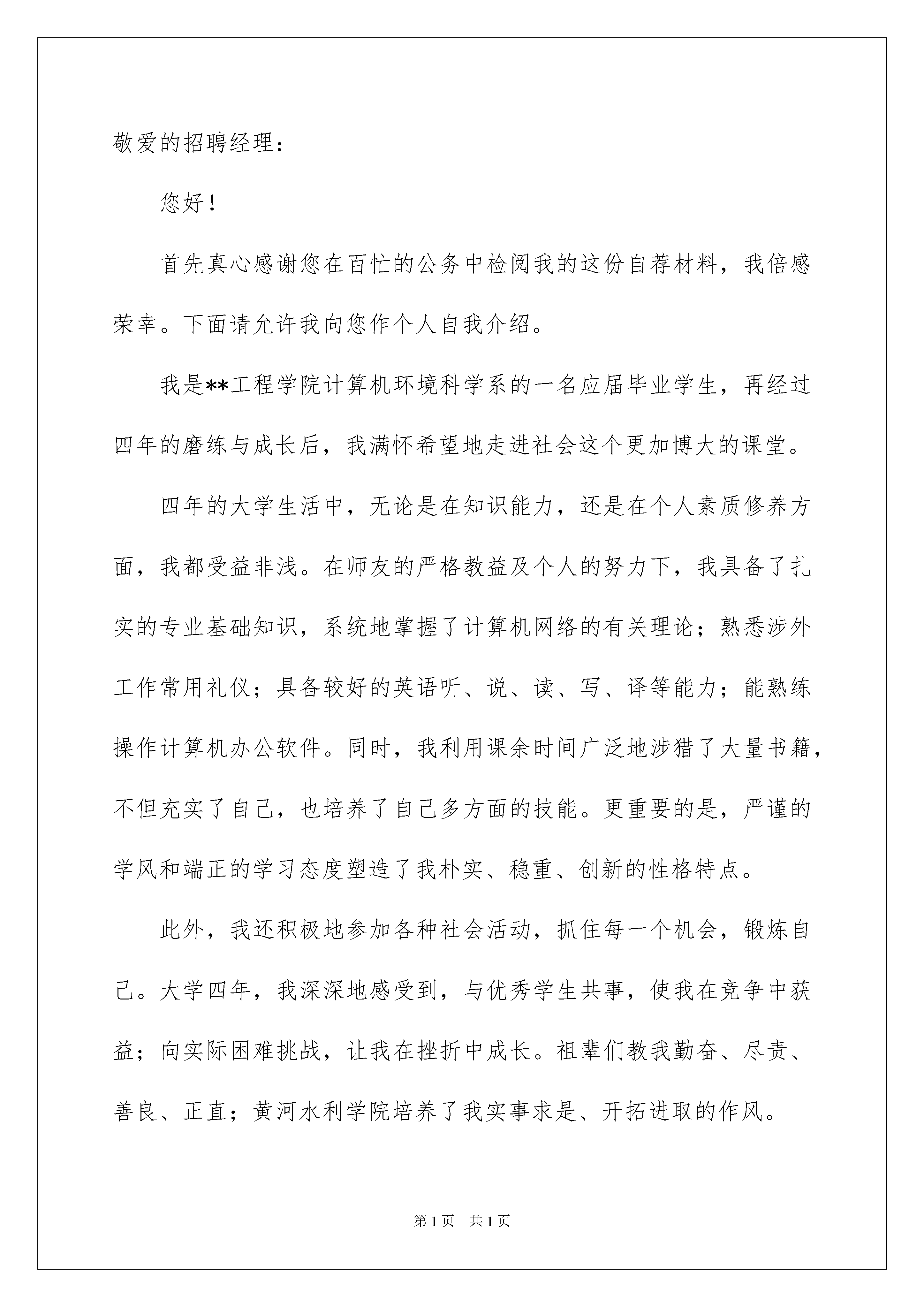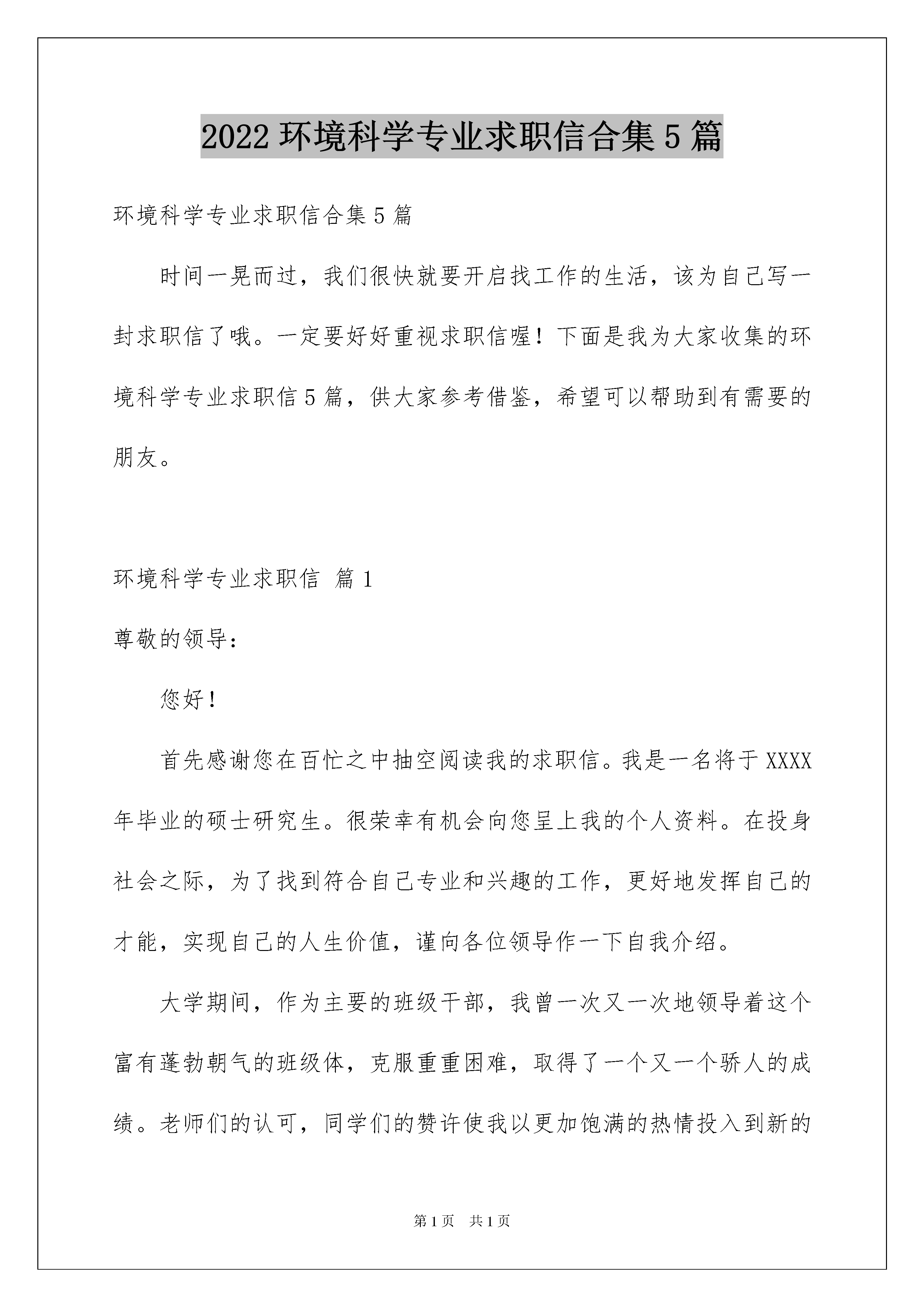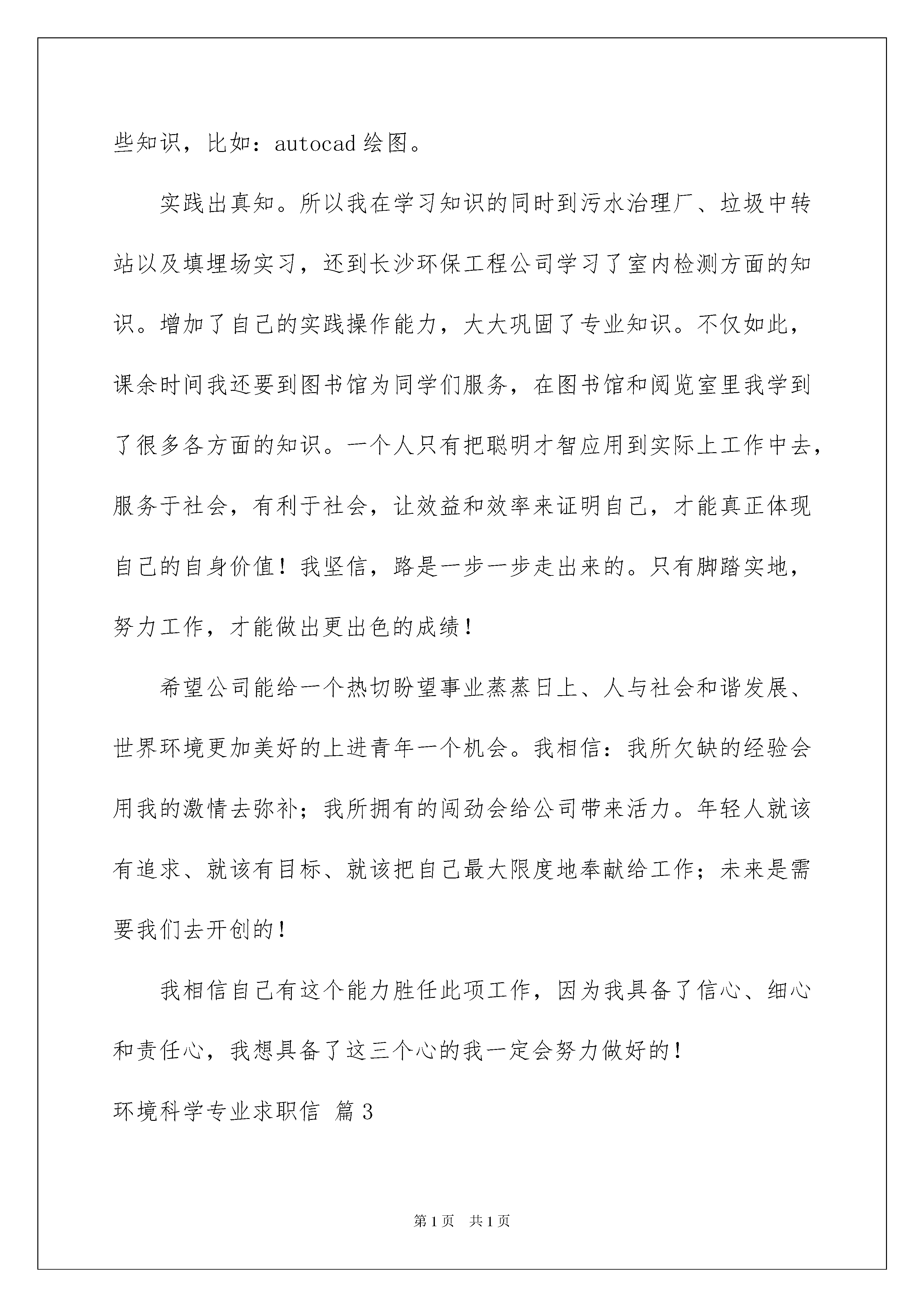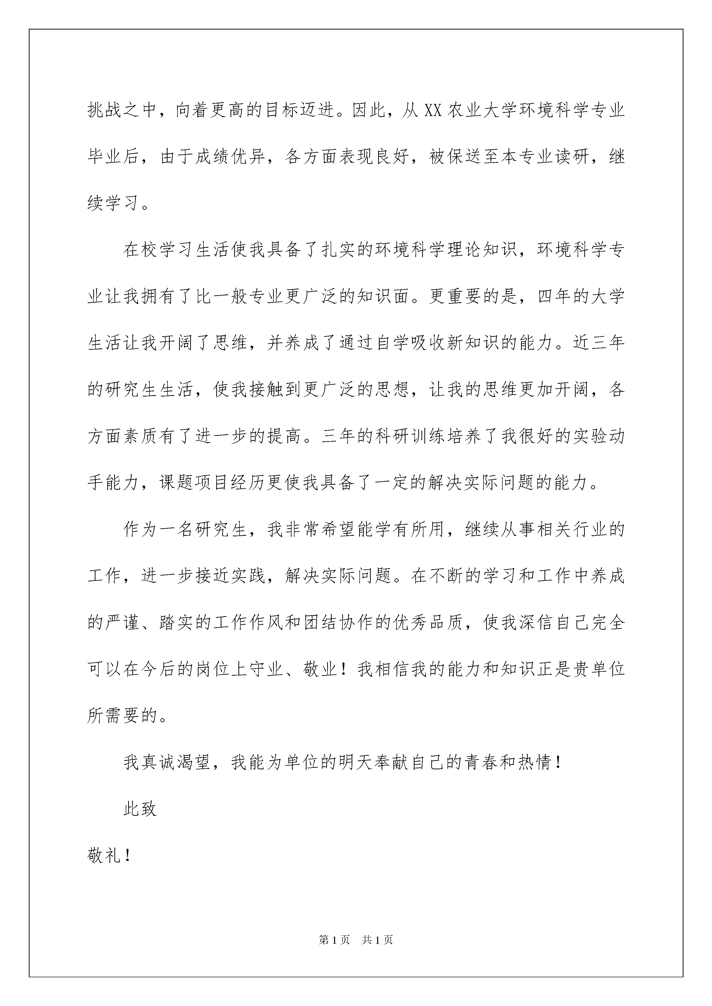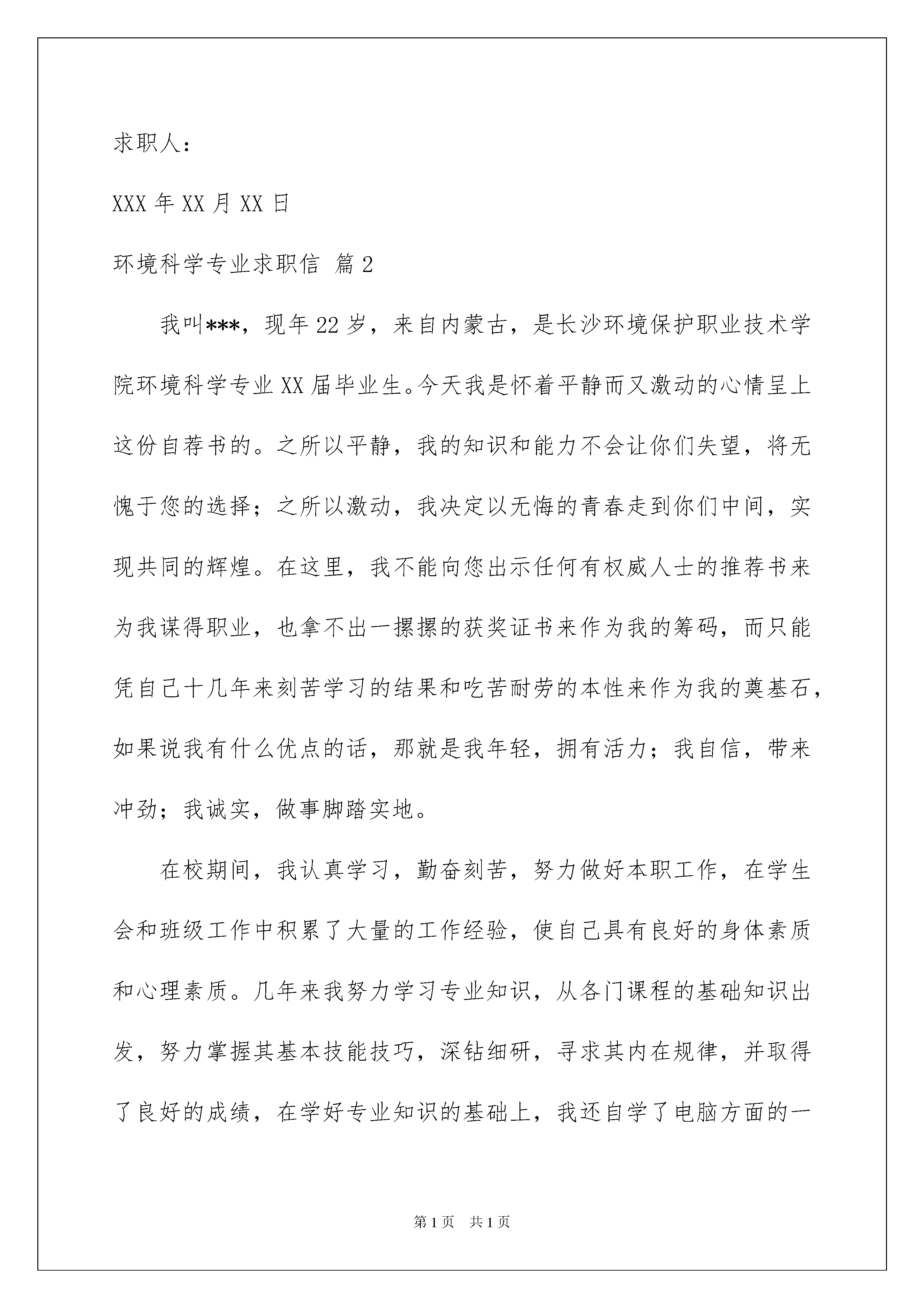 2022环境科学专业求职信合集5篇环境科学专业求职信合集5篇时间一晃而过,我们很快就要开启找工作的生活,该为自己写一封求职信了哦。一定要好好重视求职信喔!下面是我为大家收集的环境科学专业求职信5篇,供大家参考借鉴,希望可以帮助到有需要的朋友。环境科学专业求职信篇1尊敬的领导:您好!首先感谢您在百忙之中抽空阅读我的求职信。我是一名将于XXXX年毕业的硕士研究生。很荣幸有机会向您呈上我的个人资料。在投身社会之际,为了找到符合自己专业和兴趣的工作,更好地发挥自己的才能,实现自己的人生价值,谨向各位领导作一下自我介绍。大学期间,作为主要的班级干部,我曾一次又一次地领导着这个富有蓬勃朝气的班级体,克服重重困难,取得了一个又一个骄人的成绩。老师们的认可,同学们的赞许使我以更加饱满的热情投入到新的挑战之中,向着更高的目标迈进。因此,从XX农业大学环境科学专业毕业后,由于成绩优异,各方面表现良好,被保送至本专业读研,继续学习。在校学习生活使我具备了扎实的环境科学理论知识,环境科学专业让我拥有了比一般专业更广泛的知识面。更重要的是,四年的大学生活让我开阔了思维,并养成了通过自学吸收新知识的能力。近三年的研究生生活,使我接触到更广泛的思想,让我的思维更加开阔,各方面素质有了进一步的提高。三年的科研训练培养了我很好的实验动手能力,课题项目经历更使我具备了一定的解决实际问题的能力。作为一名研究生,我非常希望能学有所用,继续从事相关行业的工作,进一步接近实践,解决实际问题。在不断的学习和工作中养成的严谨、踏实的工作作风和团结协作的优秀品质,使我深信自己完全可以在今后的岗位上守业、敬业!我相信我的能力和知识正是贵单位所需要的。我真诚渴望,我能为单位的明天奉献自己的青春和热情!此致敬礼!求职人:XXX年XX月XX日环境科学专业求职信篇2我叫***,现年22岁,来自内蒙古,是长沙环境保护职业技术学院环境科学专业XX届毕业生。今天我是怀着平静而又激动的心情呈上这份自荐书的。之所以平静,我的知识和能力不会让你们失望,将无愧于您的选择;之所以激动,我决定以无悔的青春走到你们中间,实现共同的辉煌。在这里,我不能向您出示任何有权威人士的推荐书来为我谋得职业,也拿不出一摞摞的获奖证书来作为我的筹码,而只能凭自己十几年来刻苦学习的结果和吃苦耐劳的本性来作为我的奠基石,如果说我有什么优点的话,那就是我年轻,拥有活力;我自信,带来冲劲;我诚实,做事脚踏实地。在校期间,我认真学习,勤奋刻苦,努力做好本职工作,在学生会和班级工作中积累了大量的工作经验,使自己具有良好的身体素质和心理素质。几年来我努力学习专业知识,从各门课程的基础知识出发,努力掌握其基本技能技巧,深钻细研,寻求其内在规律,并取得了良好的成绩,在学好专业知识的基础上,我还自学了电脑方面的一些知识,比如:autocad绘图。实践出真知。所以我在学习知识的同时到污水治理厂、垃圾中转站以及填埋场实习,还到长沙环保工程公司学习了室内检测方面的知识。增加了自己的实践操作能力,大大巩固了专业知识。不仅如此,课余时间我还要到图书馆为同学们服务,在图书馆和阅览室里我学到了很多各方面的知识。一个人只有把聪明才智应用到实际上工作中去,服务于社会,有利于社会,让效益和效率来证明自己,才能真正体现自己的自身价值!我坚信,路是一步一步走出来的。只有脚踏实地,努力工作,才能做出更出色的成绩!希望公司能给一个热切盼望事业蒸蒸日上、人与社会和谐发展、世界环境更加美好的上进青年一个机会。我相信:我所欠缺的经验会用我的激情去弥补;我所拥有的闯劲会给公司带来活力。年轻人就该有追求、就该有目标、就该把自己最大限度地奉献给工作;未来是需要我们去开创的!我相信自己有这个能力胜任此项工作,因为我具备了信心、细心和责任心,我想具备了这三个心的我一定会努力做好的!环境科学专业求职信篇3敬爱的招聘经理:您好!首先真心感谢您在百忙的公务中检阅我的这份自荐材料,我倍感荣幸。下面请允许我向您作个人自我介绍。我是**工程学院计算机环境科学系的一名应届毕业学生,再经过四年的磨练与成长后,我满怀希望地走进社会这个更加博大的课堂。四年的大学生活中,无论是在知识能力,还是在个人素质修养方面,我都受益非浅。在师友的严格教益及个人的努力下,我具备了扎实的专业基础知识,系统地掌握了计算机网络的有关理论;熟悉涉外工作常用礼仪;具备较好的英语听、说、读、写、译等能力;能熟练操作计算机办公软件。同时,我利用课余时间广泛地涉猎了大量书籍,不但充实了自己,也培养了自己多方面的技能。更重要的是,严谨的学风和端正的学习态度塑造了我朴实、稳重、创新的