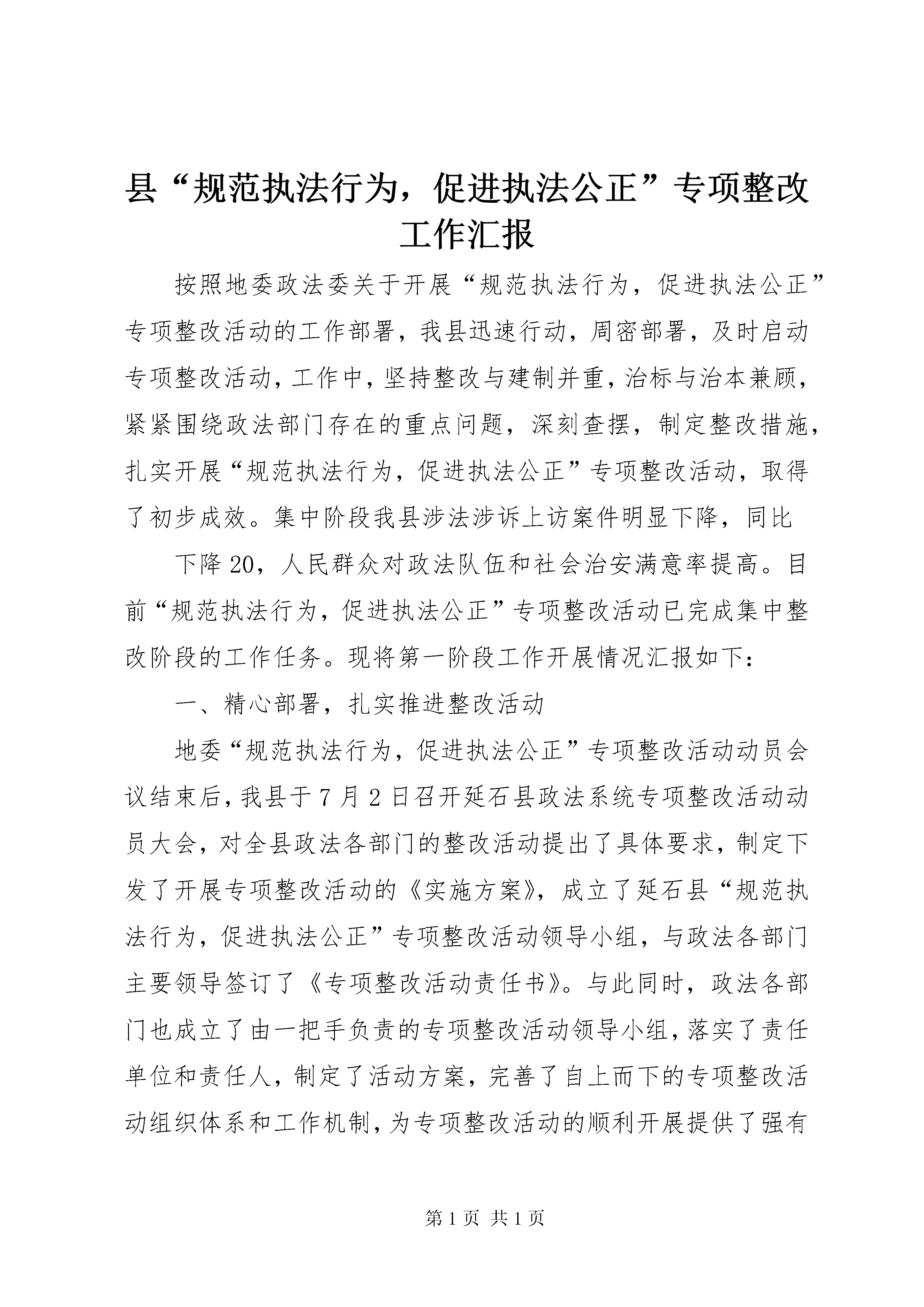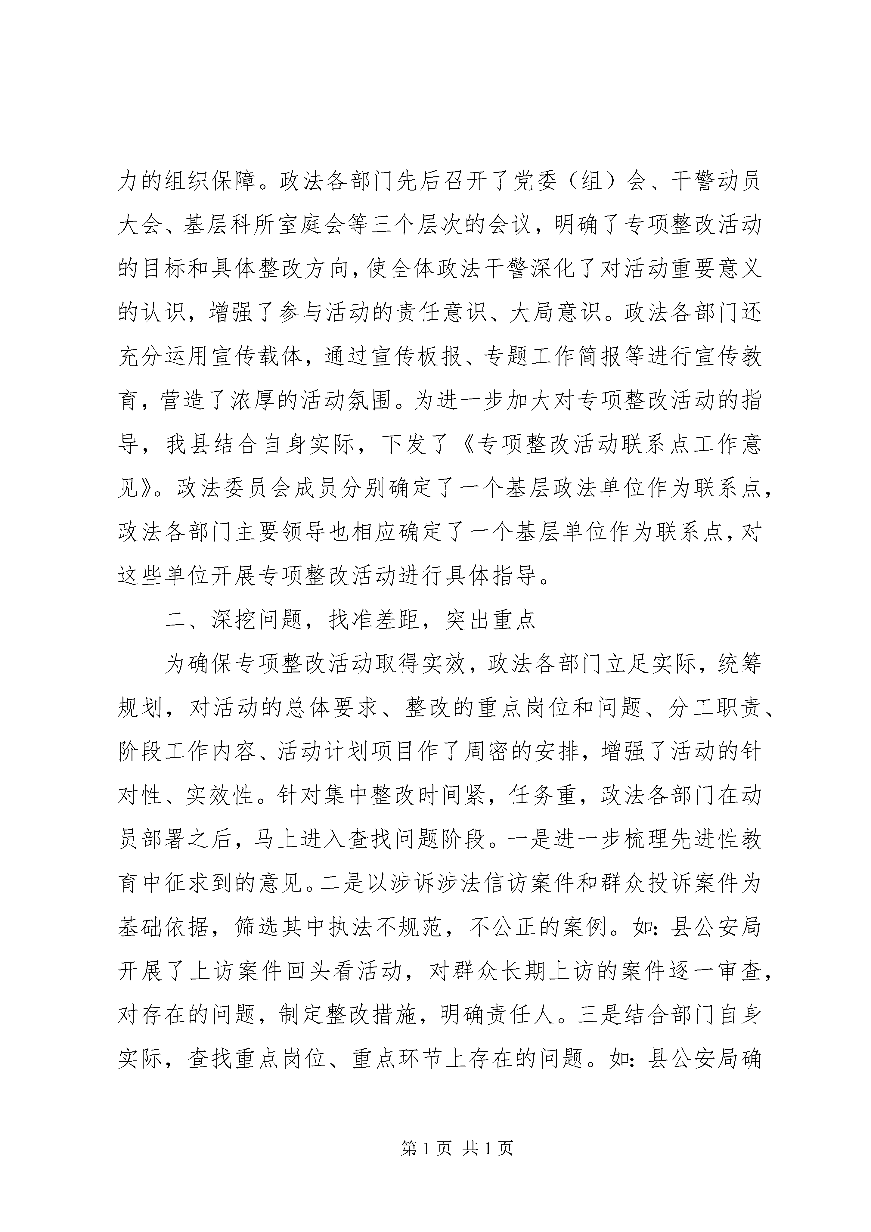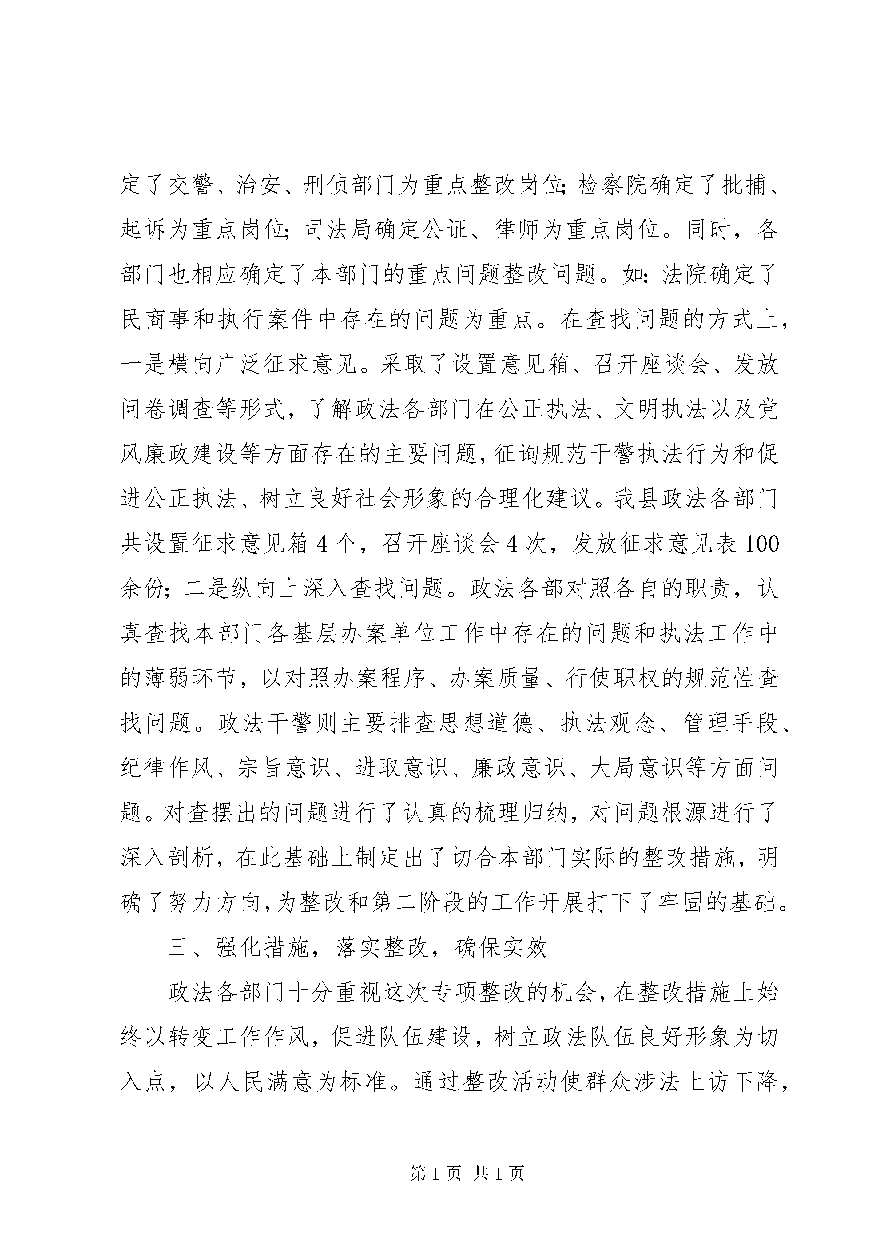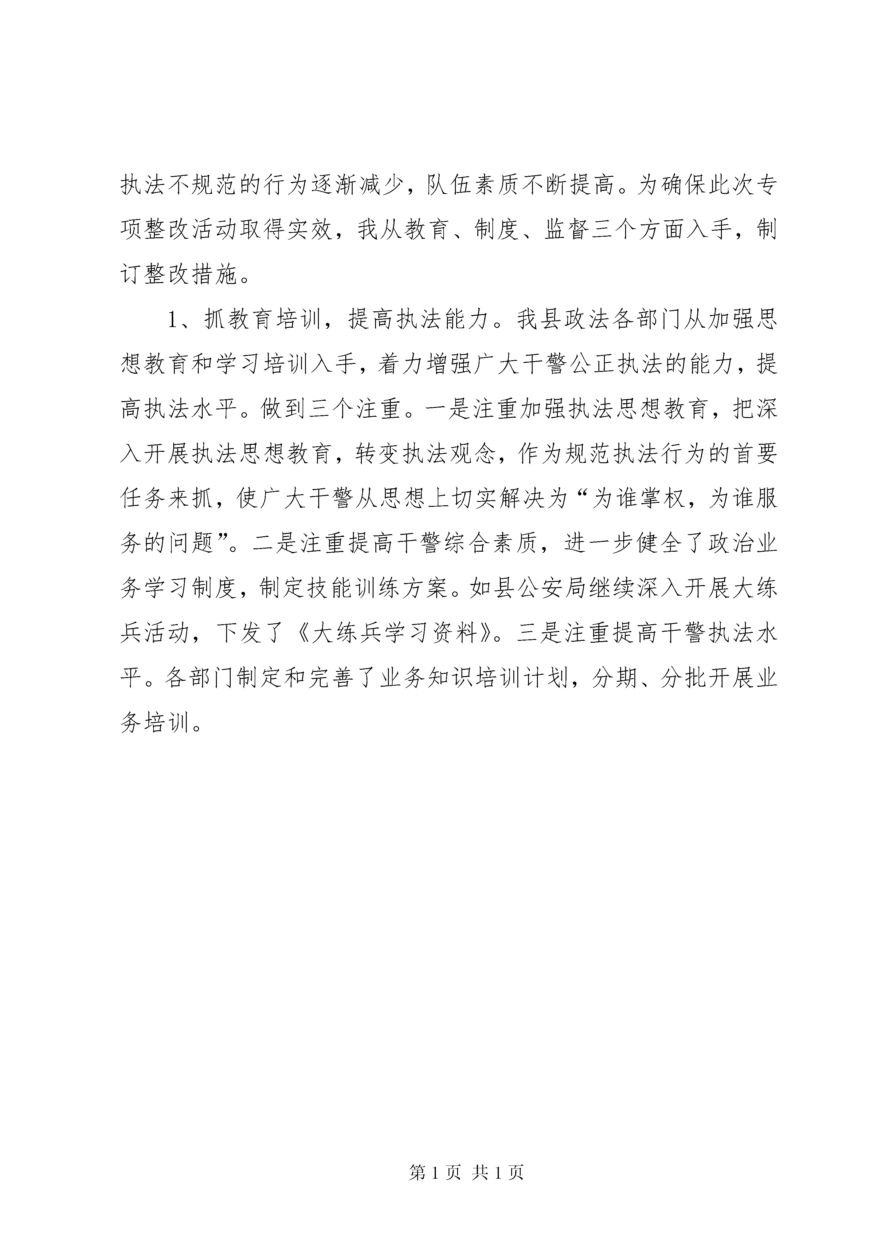 县“规范执法行为,促进执法公正”专项整改工作汇报按照地委政法委关于开展“规范执法行为,促进执法公正”专项整改活动的工作部署,我县迅速行动,周密部署,及时启动专项整改活动,工作中,坚持整改与建制并重,治标与治本兼顾,紧紧围绕政法部门存在的重点问题,深刻查摆,制定整改措施,扎实开展“规范执法行为,促进执法公正”专项整改活动,取得了初步成效。集中阶段我县涉法涉诉上访案件明显下降,同比下降20,人民群众对政法队伍和社会治安满意率提高。目前“规范执法行为,促进执法公正”专项整改活动已完成集中整改阶段的工作任务。现将第一阶段工作开展情况汇报如下:一、精心部署,扎实推进整改活动地委“规范执法行为,促进执法公正”专项整改活动动员会议结束后,我县于7月2日召开延石县政法系统专项整改活动动员大会,对全县政法各部门的整改活动提出了具体要求,制定下发了开展专项整改活动的《实施方案》,成立了延石县“规范执法行为,促进执法公正”专项整改活动领导小组,与政法各部门主要领导签订了《专项整改活动责任书》。与此同时,政法各部门也成立了由一把手负责的专项整改活动领导小组,落实了责任单位和责任人,制定了活动方案,完善了自上而下的专项整改活动组织体系和工作机制,为专项整改活动的顺利开展提供了强有力的组织保障。政法各部门先后召开了党委(组)会、干警动员大会、基层科所室庭会等三个层次的会议,明确了专项整改活动的目标和具体整改方向,使全体政法干警深化了对活动重要意义的认识,增强了参与活动的责任意识、大局意识。政法各部门还充分运用宣传载体,通过宣传板报、专题工作简报等进行宣传教育,营造了浓厚的活动氛围。为进一步加大对专项整改活动的指导,我县结合自身实际,下发了《专项整改活动联系点工作意见》。政法委员会成员分别确定了一个基层政法单位作为联系点,政法各部门主要领导也相应确定了一个基层单位作为联系点,对这些单位开展专项整改活动进行具体指导。二、深挖问题,找准差距,突出重点为确保专项整改活动取得实效,政法各部门立足实际,统筹规划,对活动的总体要求、整改的重点岗位和问题、分工职责、阶段工作内容、活动计划项目作了周密的安排,增强了活动的针对性、实效性。针对集中整改时间紧,任务重,政法各部门在动员部署之后,马上进入查找问题阶段。一是进一步梳理先进性教育中征求到的意见。二是以涉诉涉法信访案件和群众投诉案件为基础依据,筛选其中执法不规范,不公正的案例。如:县公安局开展了上访案件回头看活动,对群众长期上访的案件逐一审查,对存在的问题,制定整改措施,明确责任人。三是结合部门自身实际,查找重点岗位、重点环节上存在的问题。如:县公安局确定了交警、治安、刑侦部门为重点整改岗位;检察院确定了批捕、起诉为重点岗位;司法局确定公证、律师为重点岗位。同时,各部门也相应确定了本部门的重点问题整改问题。如:法院确定了民商事和执行案件中存在的问题为重点。在查找问题的方式上,一是横向广泛征求意见。采取了设置意见箱、召开座谈会、发放问卷调查等形式,了解政法各部门在公正执法、文明执法以及党风廉政建设等方面存在的主要问题,征询规范干警执法行为和促进公正执法、树立良好社会形象的合理化建议。我县政法各部门共设置征求意见箱4个,召开座谈会4次,发放征求意见表100余份;二是纵向上深入查找问题。政法各部对照各自的职责,认真查找本部门各基层办案单位工作中存在的问题和执法工作中的薄弱环节,以对照办案程序、办案质量、行使职权的规范性查找问题。政法干警则主要排查思想道德、执法观念、管理手段、纪律作风、宗旨意识、进取意识、廉政意识、大局意识等方面问题。对查摆出的问题进行了认真的梳理归纳,对问题根源进行了深入剖析,在此基础上制定出了切合本部门实际的整改措施,明确了努力方向,为整改和第二阶段的工作开展打下了牢固的基础。三、强化措施,落实整改,确保实效政法各部门十分重视这次专项整改的机会,在整改措施上始终以转变工作作风,促进队伍建设,树立政法队伍良好形象为切入点,以人民满意为标准。通过整改活动使群众涉法上访下降,执法不规范的行为逐渐减少,队伍素质不断提高。为确保此次专项整改活动取得实效,我从教育、制度、监督三个方面入手,制订整改措施。1、抓教育培训,提高执法能力。我县政法各部门从加强思想教育和学习培训入手,着力增强广大干警公正执法的能力,提高执法水平。做到三个注重。一是注重加强执法思想教育,把深入开展执法思想教育,转变执法观念,作为规范执法行为的首要任务来抓,使广大干警从思想上切实解决为“为谁掌权,为谁服务的问题”。二是注重提高干警综合素质,进一步健全了政治业务学习制度,制定技能训练方案。如县公安局继续深入开展大练兵活动,下发了《大练兵学习资料》。三是注重提高干警执法水平。各部门制定和完善了业务知识培训计划,分期、分批开展