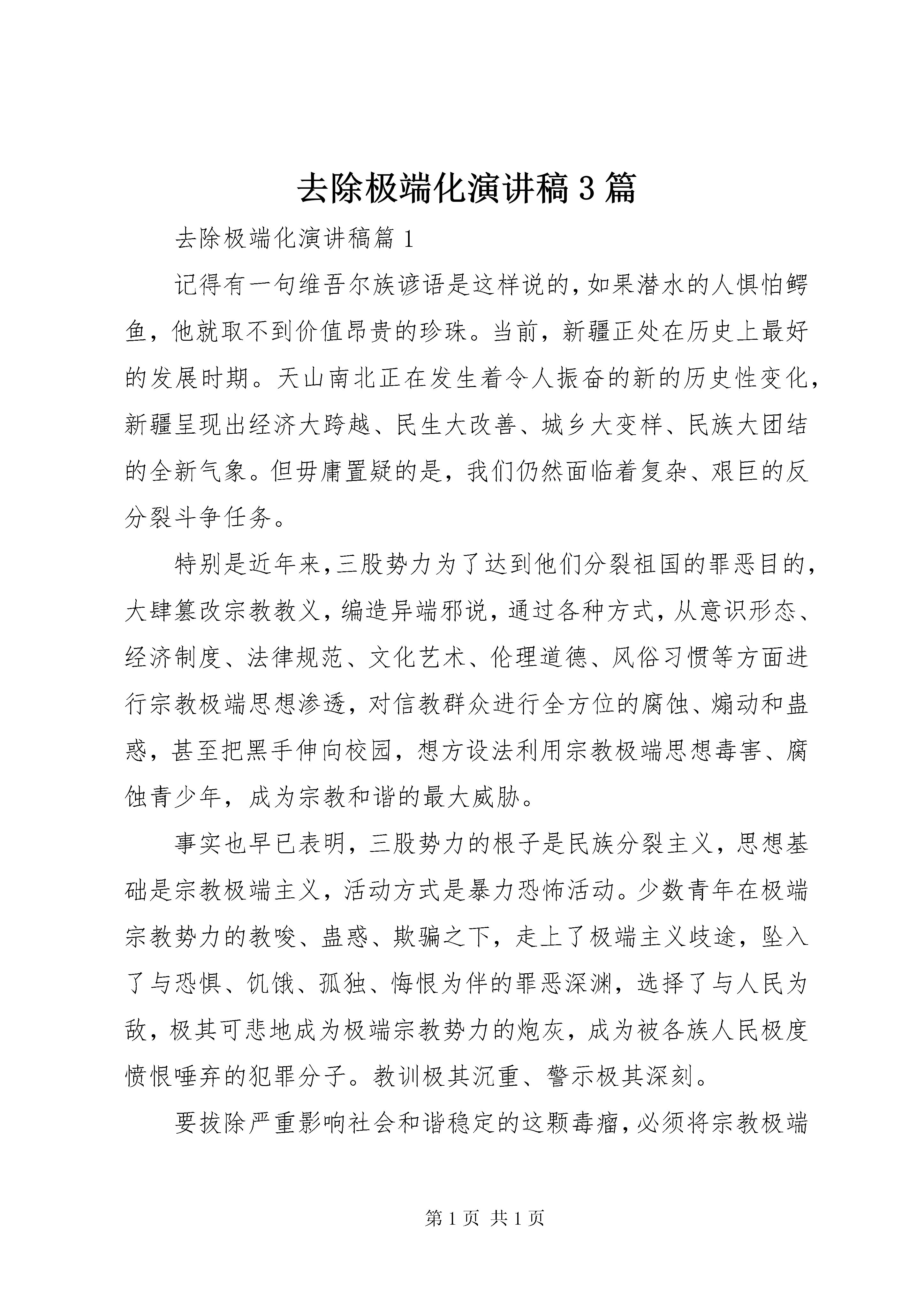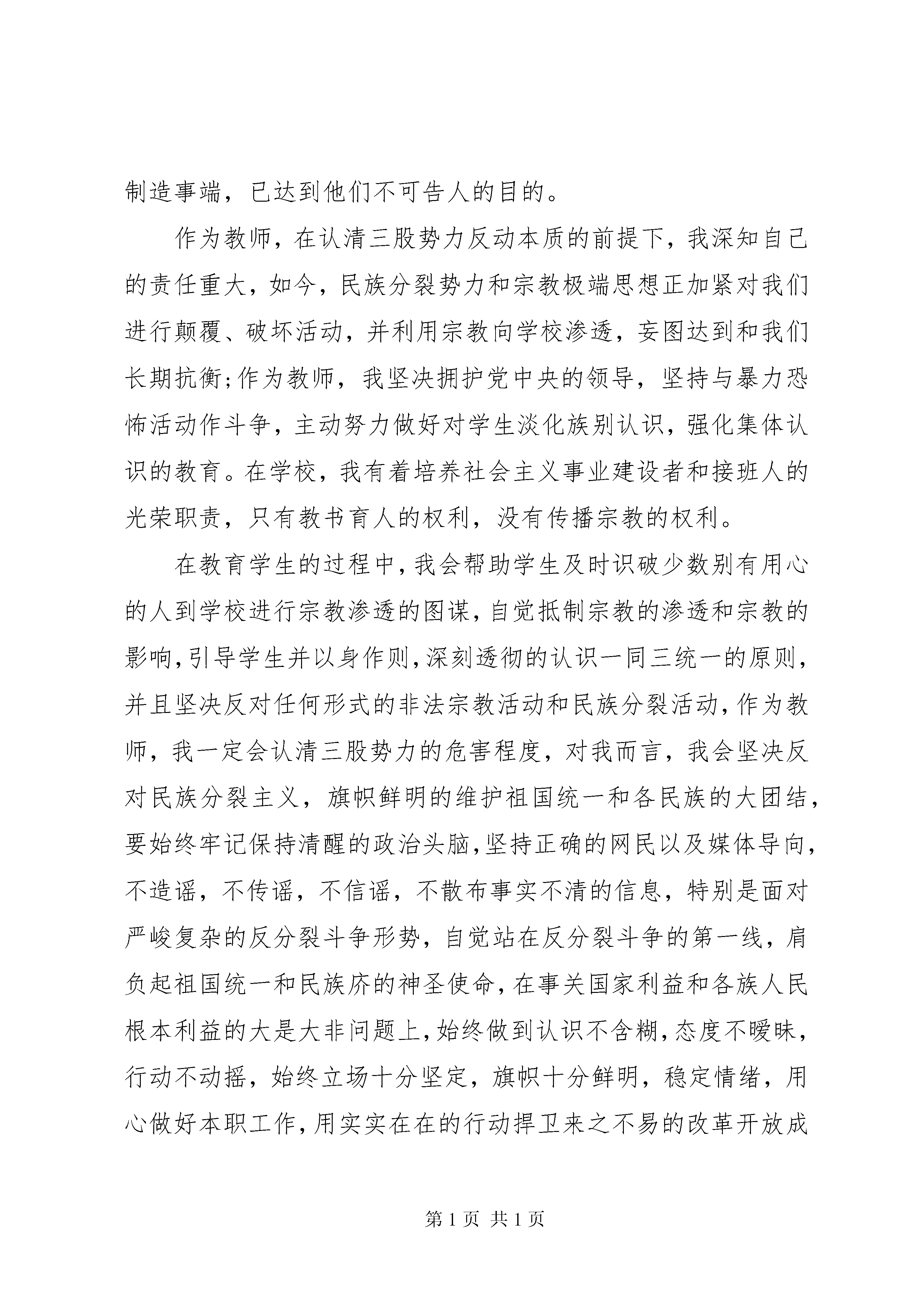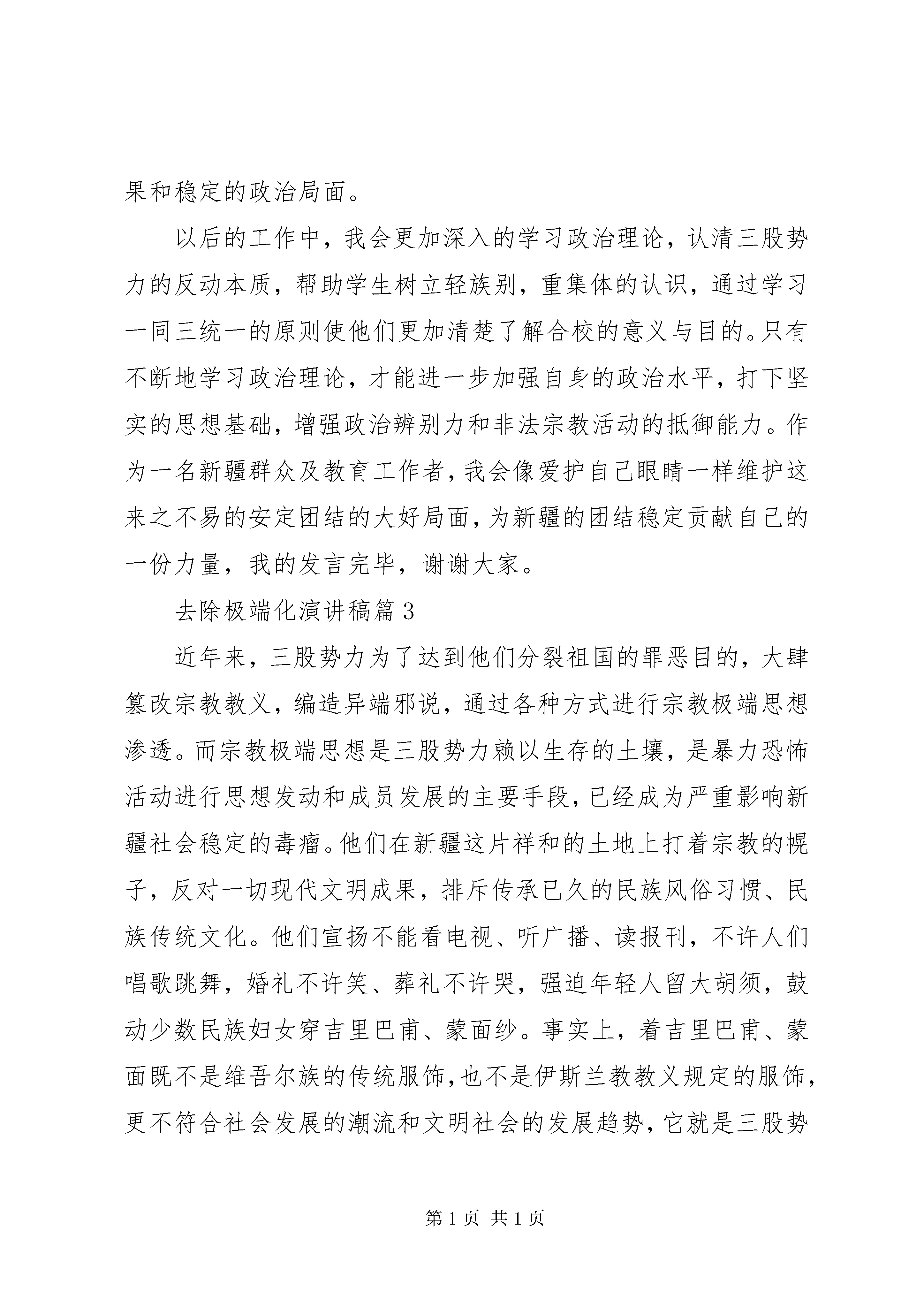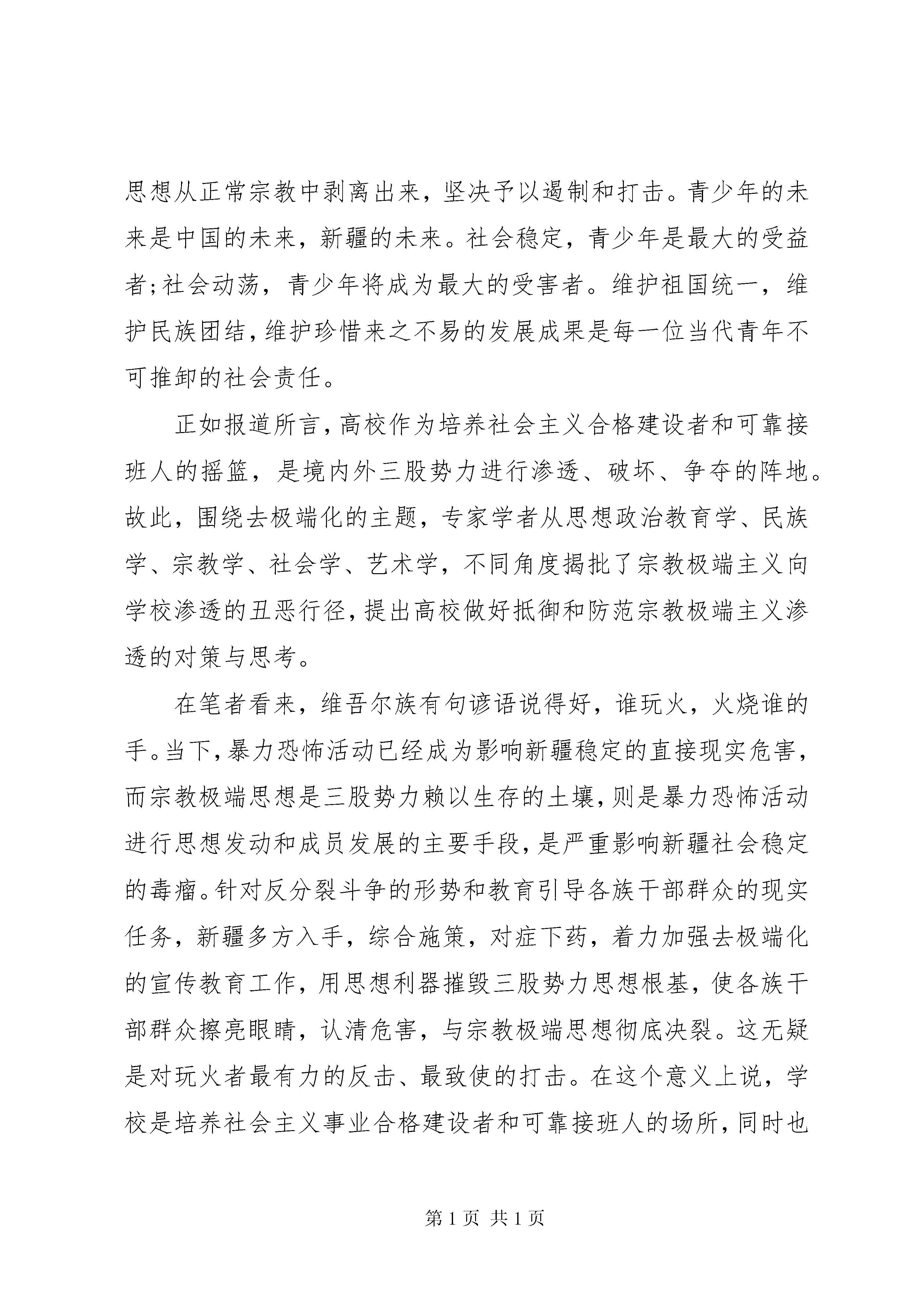去除极端化演讲稿3篇去除极端化演讲稿篇1记得有一句维吾尔族谚语是这样说的,如果潜水的人惧怕鳄鱼,他就取不到价值昂贵的珍珠。当前,新疆正处在历史上最好的发展时期。天山南北正在发生着令人振奋的新的历史性变化,新疆呈现出经济大跨越、民生大改善、城乡大变样、民族大团结的全新气象。但毋庸置疑的是,我们仍然面临着复杂、艰巨的反分裂斗争任务。特别是近年来,三股势力为了达到他们分裂祖国的罪恶目的,大肆篡改宗教教义,编造异端邪说,通过各种方式,从意识形态、经济制度、法律规范、文化艺术、伦理道德、风俗习惯等方面进行宗教极端思想渗透,对信教群众进行全方位的腐蚀、煽动和蛊惑,甚至把黑手伸向校园,想方设法利用宗教极端思想毒害、腐蚀青少年,成为宗教和谐的最大威胁。事实也早已表明,三股势力的根子是民族分裂主义,思想基础是宗教极端主义,活动方式是暴力恐怖活动。少数青年在极端宗教势力的教唆、蛊惑、欺骗之下,走上了极端主义歧途,坠入了与恐惧、饥饿、孤独、悔恨为伴的罪恶深渊,选择了与人民为敌,极其可悲地成为极端宗教势力的炮灰,成为被各族人民极度愤恨唾弃的犯罪分子。教训极其沉重、警示极其深刻。要拔除严重影响社会和谐稳定的这颗毒瘤,必须将宗教极端思想从正常宗教中剥离出来,坚决予以遏制和打击。青少年的未来是中国的未来,新疆的未来。社会稳定,青少年是最大的受益者;社会动荡,青少年将成为最大的受害者。维护祖国统一,维护民族团结,维护珍惜来之不易的发展成果是每一位当代青年不可推卸的社会责任。正如报道所言,高校作为培养社会主义合格建设者和可靠接班人的摇篮,是境内外三股势力进行渗透、破坏、争夺的阵地。故此,围绕去极端化的主题,专家学者从思想政治教育学、民族学、宗教学、社会学、艺术学,不同角度揭批了宗教极端主义向学校渗透的丑恶行径,提出高校做好抵御和防范宗教极端主义渗透的对策与思考。在笔者看来,维吾尔族有句谚语说得好,谁玩火,火烧谁的手。当下,暴力恐怖活动已经成为影响新疆稳定的直接现实危害,而宗教极端思想是三股势力赖以生存的土壤,则是暴力恐怖活动进行思想发动和成员发展的主要手段,是严重影响新疆社会稳定的毒瘤。针对反分裂斗争的形势和教育引导各族干部群众的现实任务,新疆多方入手,综合施策,对症下药,着力加强去极端化的宣传教育工作,用思想利器摧毁三股势力思想根基,使各族干部群众擦亮眼睛,认清危害,与宗教极端思想彻底决裂。这无疑是对玩火者最有力的反击、最致使的打击。在这个意义上说,学校是培养社会主义事业合格建设者和可靠接班人的场所,同时也是抵御敌对势力对青少年进行宗教极端思想渗透的重要阵地,11位专家学者集体发声亮剑:坚决抵御宗教极端主义在高校渗透,其导向和引领意义是显而易见的。只要全疆上下人人争当践行先进文化的模范,争当文明的传播者,争当去极端化的践行者,那么,豌豆跳得再高,也砸不透铁锅,深入推进去极端化,就能以摧枯拉朽之势,将宗教极端思想扫入历史的垃圾堆。去除极端化演讲稿篇2尊敬的各位领导,亲爱的各位老师:大家上午好。为认清三股势力、暴力恐怖活动的实质,我校在8月6日至8月31日期间对全校教职工进行了集中教育学习。学习把揭露本质、揭穿谎言作为重点,用雄辩的实施揭露和批判三股势力的谎言。通过学习,使我对三股势力反分裂的反动实质有了更加深刻、更加清楚的认识,在校领导、年级领导的教育下,在与同事交流讨论的过程中,使自己在理论和思想上都有了很大的提高。下面,就自己的学习心得与大家交流。所谓三股势力准确的说就是宗教极端势力,民族分裂势力和暴力恐怖势力。他们不择手段,通过制造暴力恐怖事件残忍的杀害无辜百姓和各组干部。虽然他们的阴谋一次次被我们挫败,但一次次的卷土重来正说明他们处心积虑,千方百计企图打开缺口,制造事端,已达到他们不可告人的目的。作为教师,在认清三股势力反动本质的前提下,我深知自己的责任重大,如今,民族分裂势力和宗教极端思想正加紧对我们进行颠覆、破坏活动,并利用宗教向学校渗透,妄图达到和我们长期抗衡;作为教师,我坚决拥护党中央的领导,坚持与暴力恐怖活动作斗争,主动努力做好对学生淡化族别认识,强化集体认识的教育。在学校,我有着培养社会主义事业建设者和接班人的光荣职责,只有教书育人的权利,没有传播宗教的权利。在教育学生的过程中,我会帮助学生及时识破少数别有用心的人到学校进行宗教渗透的图谋,自觉抵制宗教的渗透和宗教的影响,引导学生并以身作则,深刻透彻的认识一同三统一的原则,并且坚决反对任何形式的非法宗教活动和民族分裂活动,作为教师,我一定会认清三股势力的危害程度,对我而言,我会坚决反对民族分裂主义,旗帜鲜明的维护祖国统一和各民族的大团结,要始终牢记保持清醒的政治头脑,坚持正确的网民以及媒体导向,不造谣,不传谣,不信谣,不散布事实不清的信息,特别是面对严峻复杂的反分裂