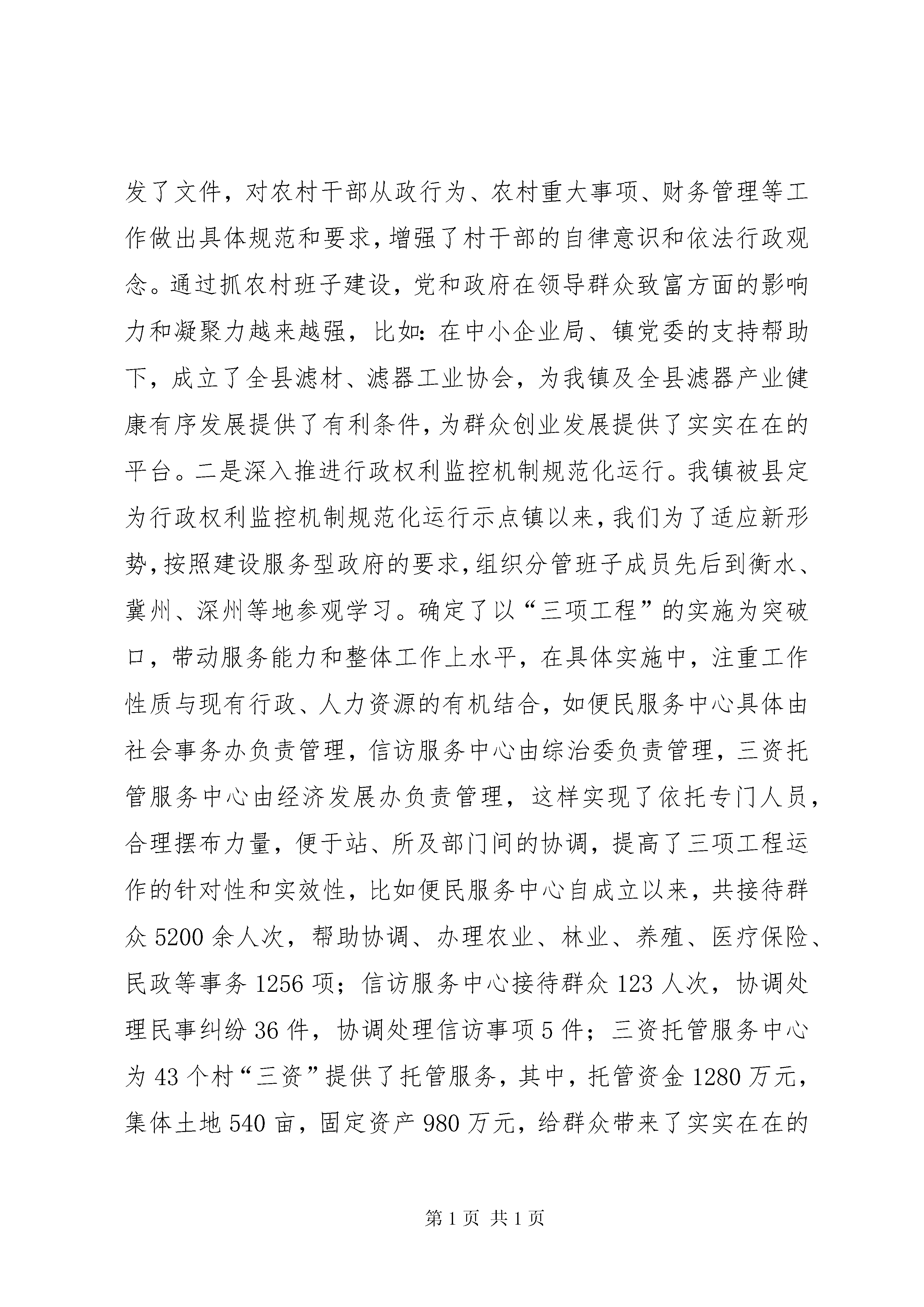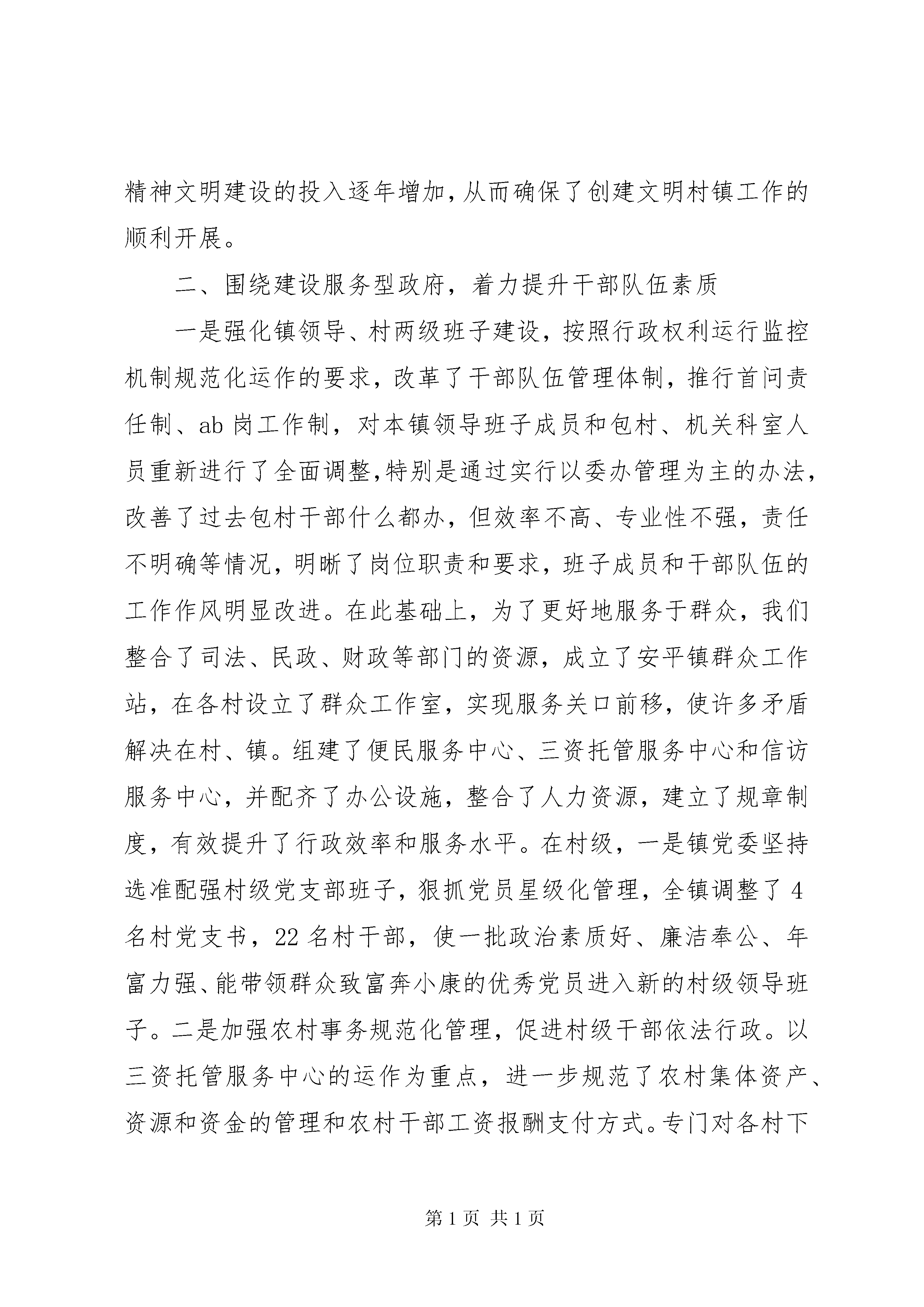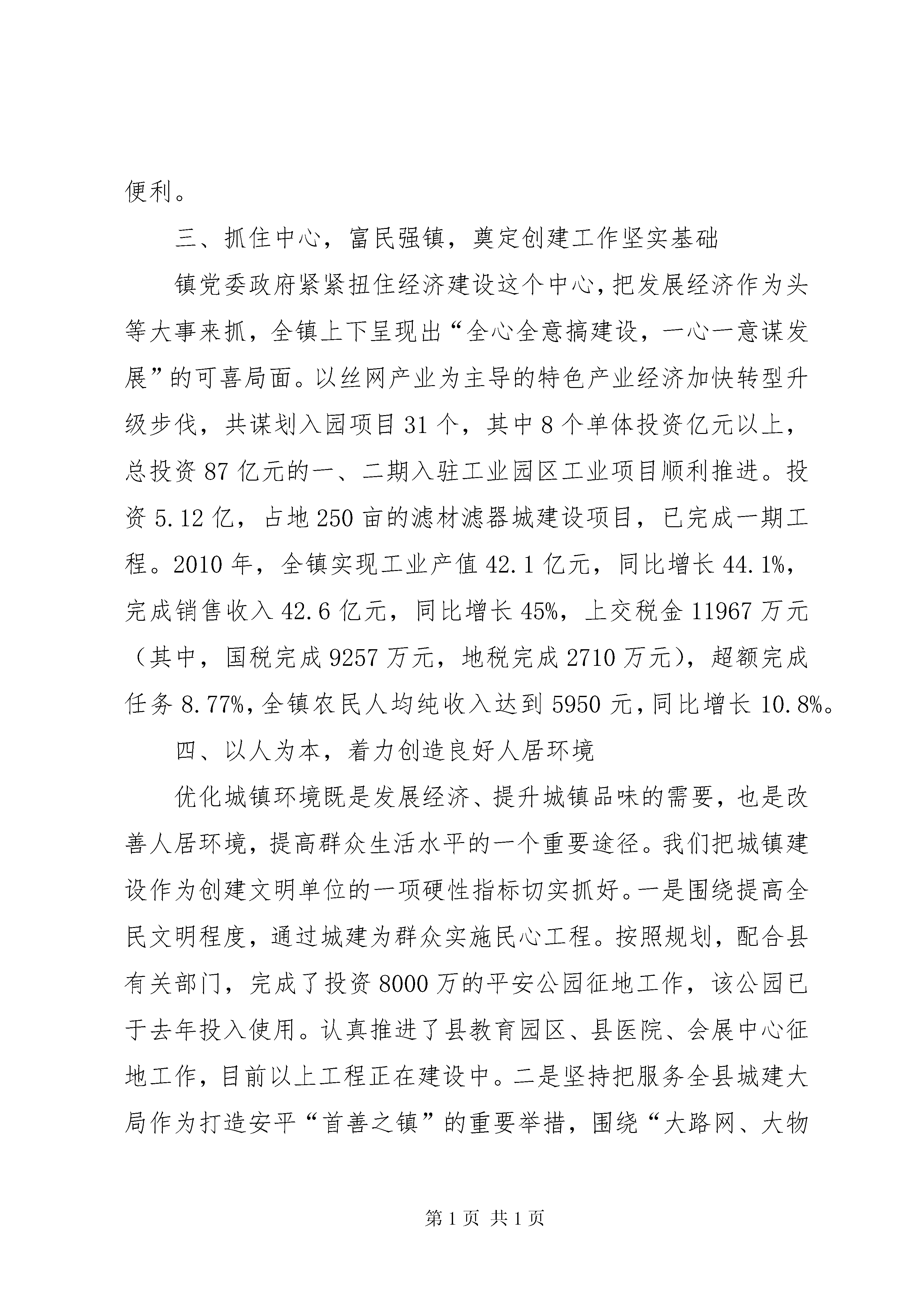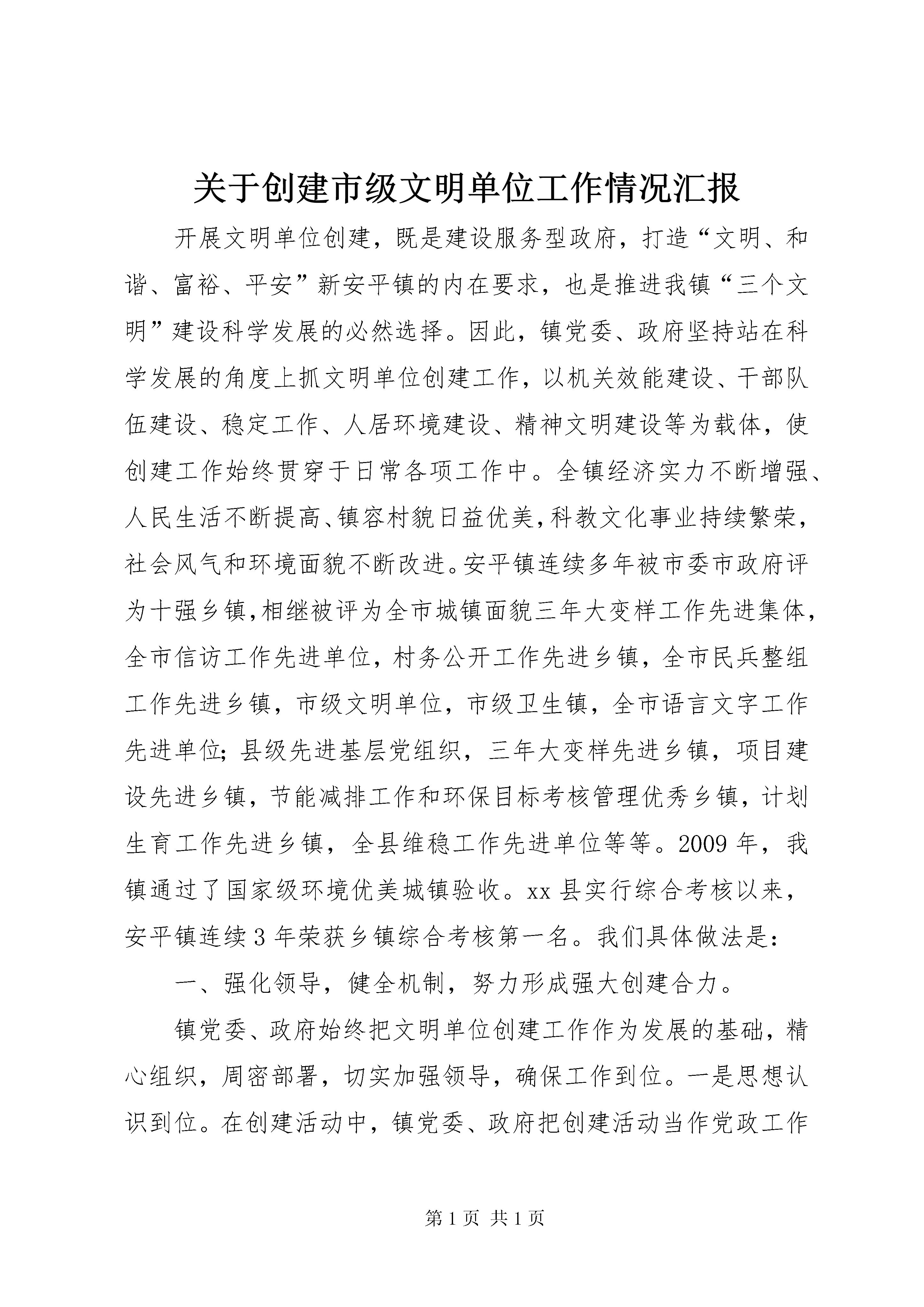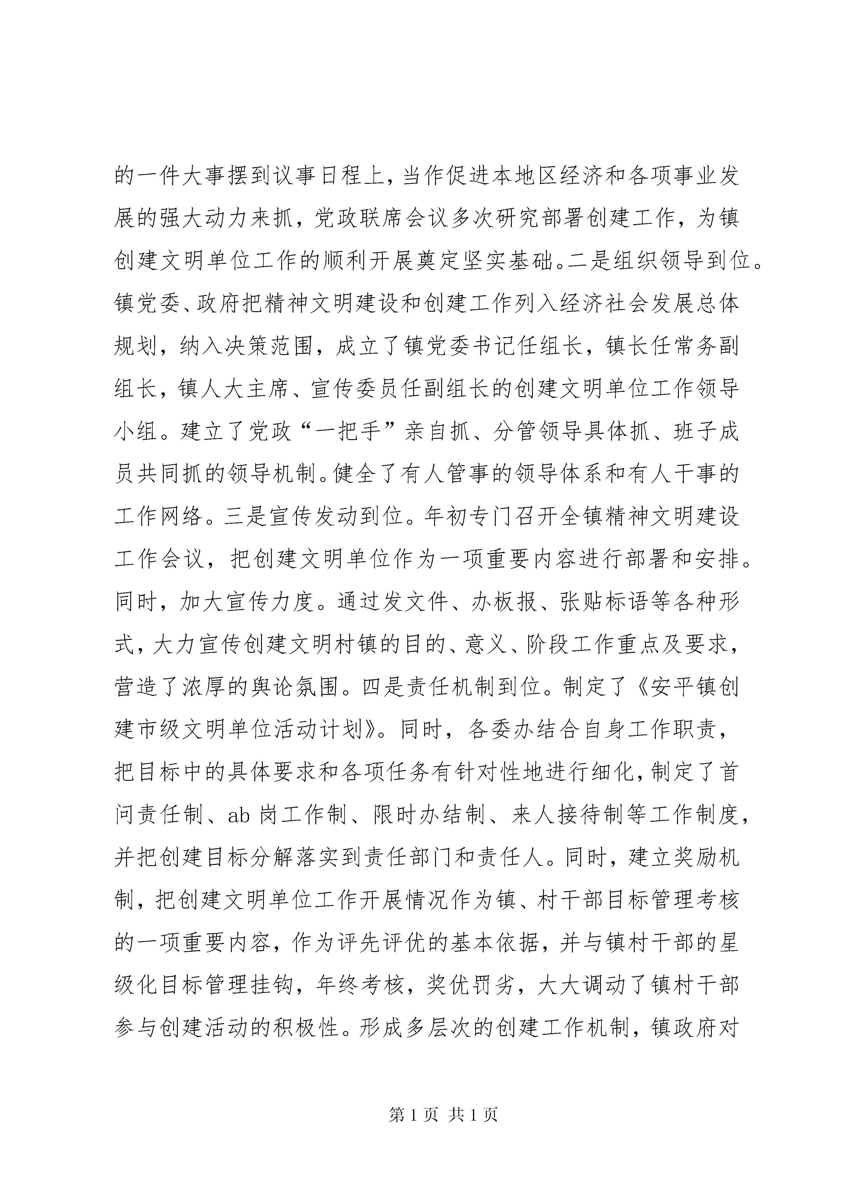 关于创建市级文明单位工作情况汇报开展文明单位创建,既是建设服务型政府,打造“文明、和谐、富裕、平安”新安平镇的内在要求,也是推进我镇“三个文明”建设科学发展的必然选择。因此,镇党委、政府坚持站在科学发展的角度上抓文明单位创建工作,以机关效能建设、干部队伍建设、稳定工作、人居环境建设、精神文明建设等为载体,使创建工作始终贯穿于日常各项工作中。全镇经济实力不断增强、人民生活不断提高、镇容村貌日益优美,科教文化事业持续繁荣,社会风气和环境面貌不断改进。安平镇连续多年被市委市政府评为十强乡镇,相继被评为全市城镇面貌三年大变样工作先进集体,全市信访工作先进单位,村务公开工作先进乡镇,全市民兵整组工作先进乡镇,市级文明单位,市级卫生镇,全市语言文字工作先进单位;县级先进基层党组织,三年大变样先进乡镇,项目建设先进乡镇,节能减排工作和环保目标考核管理优秀乡镇,计划生育工作先进乡镇,全县维稳工作先进单位等等。2009年,我镇通过了国家级环境优美城镇验收。xx县实行综合考核以来,安平镇连续3年荣获乡镇综合考核第一名。我们具体做法是:一、强化领导,健全机制,努力形成强大创建合力。镇党委、政府始终把文明单位创建工作作为发展的基础,精心组织,周密部署,切实加强领导,确保工作到位。一是思想认识到位。在创建活动中,镇党委、政府把创建活动当作党政工作的一件大事摆到议事日程上,当作促进本地区经济和各项事业发展的强大动力来抓,党政联席会议多次研究部署创建工作,为镇创建文明单位工作的顺利开展奠定坚实基础。二是组织领导到位。镇党委、政府把精神文明建设和创建工作列入经济社会发展总体规划,纳入决策范围,成立了镇党委书记任组长,镇长任常务副组长,镇人大主席、宣传委员任副组长的创建文明单位工作领导小组。建立了党政“一把手”亲自抓、分管领导具体抓、班子成员共同抓的领导机制。健全了有人管事的领导体系和有人干事的工作网络。三是宣传发动到位。年初专门召开全镇精神文明建设工作会议,把创建文明单位作为一项重要内容进行部署和安排。同时,加大宣传力度。通过发文件、办板报、张贴标语等各种形式,大力宣传创建文明村镇的目的、意义、阶段工作重点及要求,营造了浓厚的舆论氛围。四是责任机制到位。制定了《安平镇创建市级文明单位活动计划》。同时,各委办结合自身工作职责,把目标中的具体要求和各项任务有针对性地进行细化,制定了首问责任制、ab岗工作制、限时办结制、来人接待制等工作制度,并把创建目标分解落实到责任部门和责任人。同时,建立奖励机制,把创建文明单位工作开展情况作为镇、村干部目标管理考核的一项重要内容,作为评先评优的基本依据,并与镇村干部的星级化目标管理挂钩,年终考核,奖优罚劣,大大调动了镇村干部参与创建活动的积极性。形成多层次的创建工作机制,镇政府对精神文明建设的投入逐年增加,从而确保了创建文明村镇工作的顺利开展。二、围绕建设服务型政府,着力提升干部队伍素质一是强化镇领导、村两级班子建设,按照行政权利运行监控机制规范化运作的要求,改革了干部队伍管理体制,推行首问责任制、ab岗工作制,对本镇领导班子成员和包村、机关科室人员重新进行了全面调整,特别是通过实行以委办管理为主的办法,改善了过去包村干部什么都办,但效率不高、专业性不强,责任不明确等情况,明晰了岗位职责和要求,班子成员和干部队伍的工作作风明显改进。在此基础上,为了更好地服务于群众,我们整合了司法、民政、财政等部门的资源,成立了安平镇群众工作站,在各村设立了群众工作室,实现服务关口前移,使许多矛盾解决在村、镇。组建了便民服务中心、三资托管服务中心和信访服务中心,并配齐了办公设施,整合了人力资源,建立了规章制度,有效提升了行政效率和服务水平。在村级,一是镇党委坚持选准配强村级党支部班子,狠抓党员星级化管理,全镇调整了4名村党支书,22名村干部,使一批政治素质好、廉洁奉公、年富力强、能带领群众致富奔小康的优秀党员进入新的村级领导班子。二是加强农村事务规范化管理,促进村级干部依法行政。以三资托管服务中心的运作为重点,进一步规范了农村集体资产、资源和资金的管理和农村干部工资报酬支付方式。专门对各村下发了文件,对农村干部从政行为、农村重大事项、财务管理等工作做出具体规范和要求,增强了村干部的自律意识和依法行政观念。通过抓农村班子建设,党和政府在领导群众致富方面的影响力和凝聚力越来越强,比如:在中小企业局、镇党委的支持帮助下,成立了全县滤材、滤器工业协会,为我镇及全县滤器产业健康有序发展提供了有利条件,为群众创业发展提供了实实在在的平台。二是深入推进行政权利监控机制规范化运行。我镇被县定为行政权利监控机制规范化运行示点镇以来,我们为了适应新形势,按照建设服务型政府的要求,组织分管班子成员先后到衡水、冀州、深州等地参观学习。确定了以