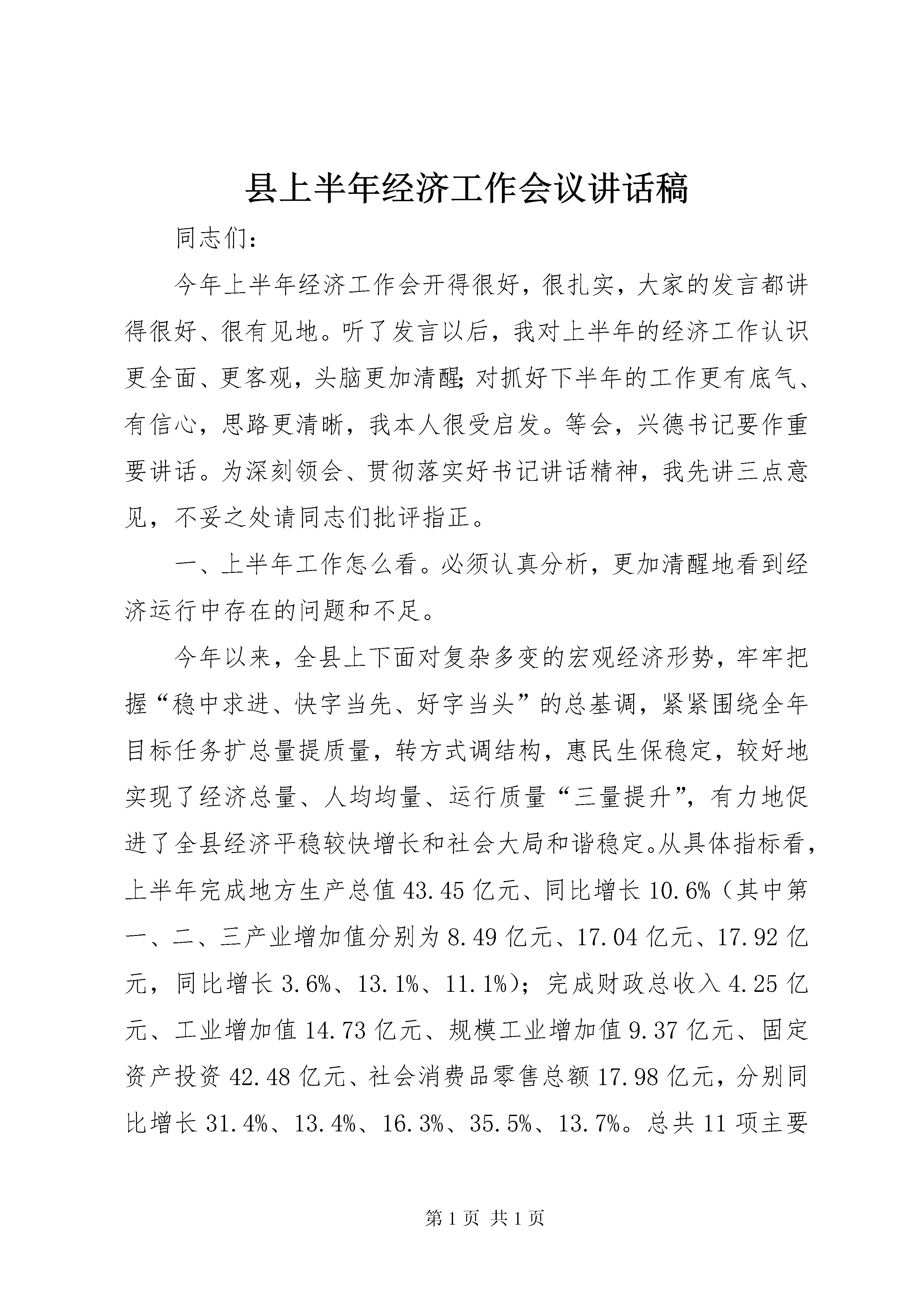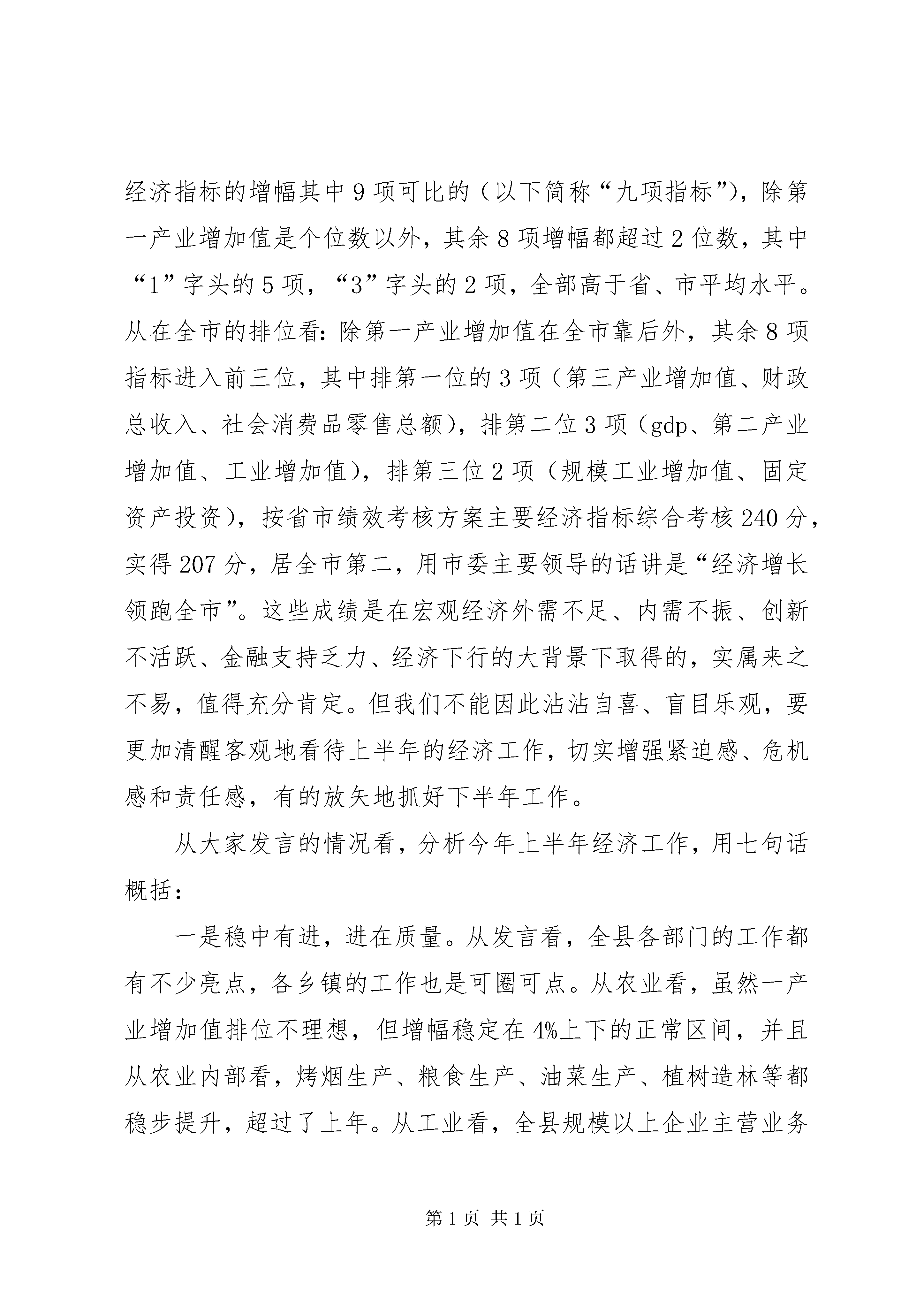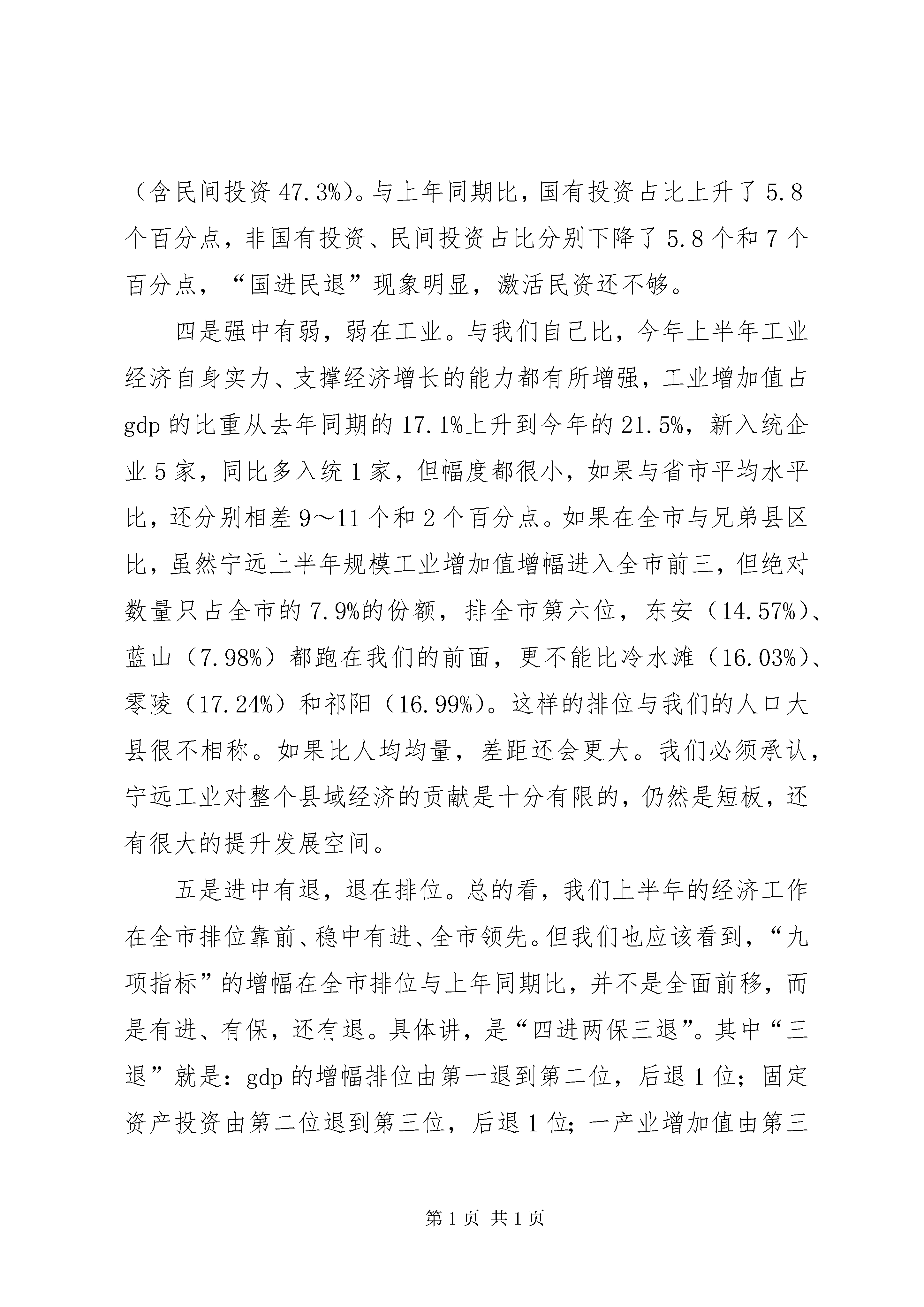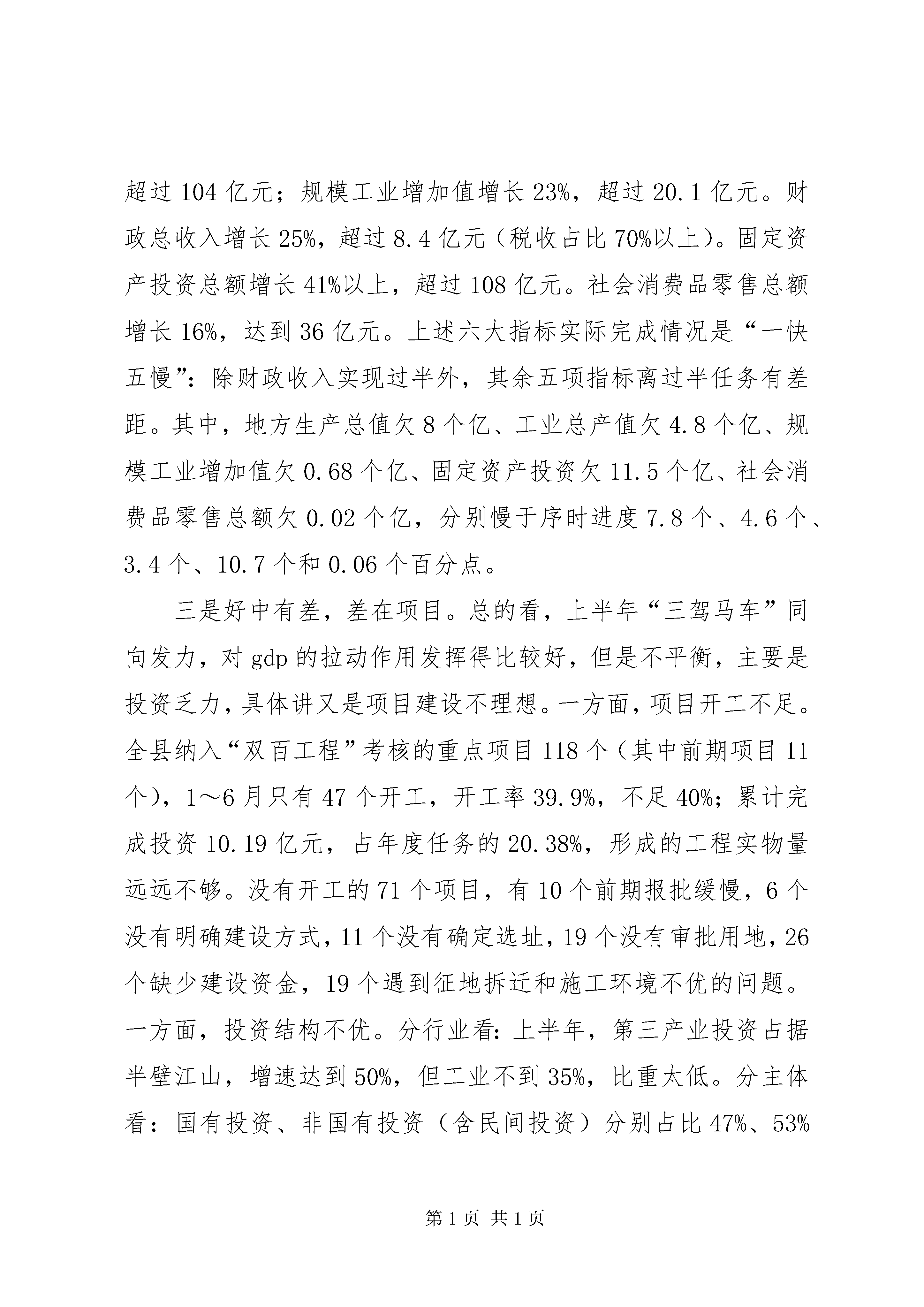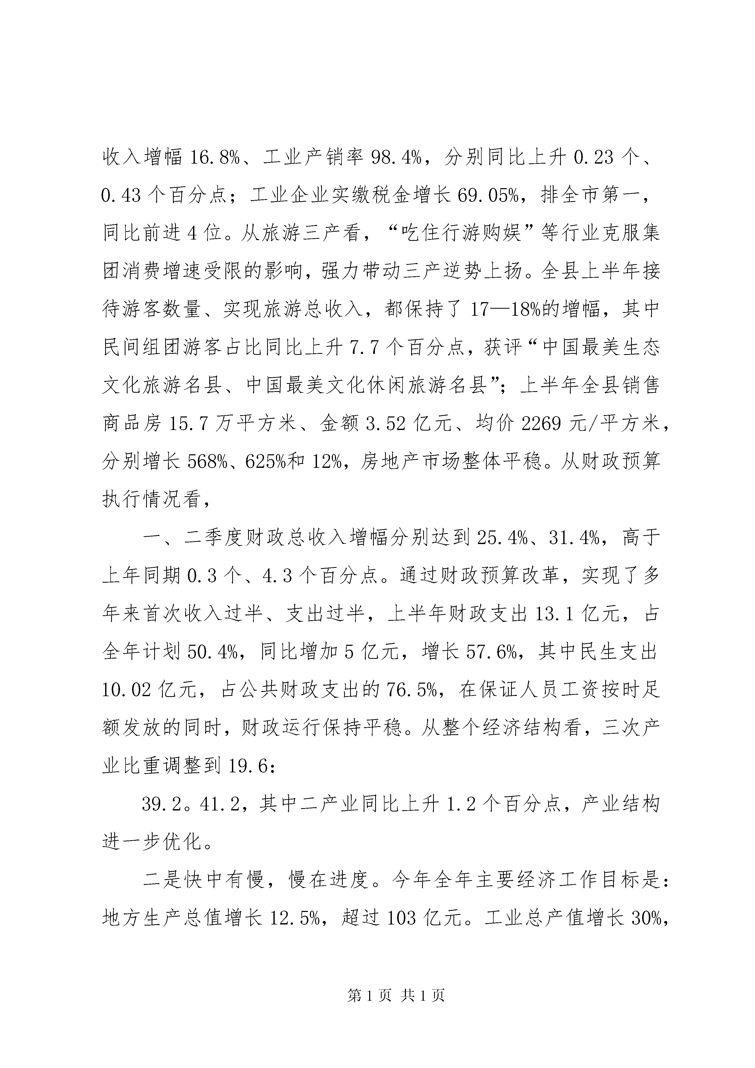县上半年经济工作会议讲话稿同志们:今年上半年经济工作会开得很好,很扎实,大家的发言都讲得很好、很有见地。听了发言以后,我对上半年的经济工作认识更全面、更客观,头脑更加清醒;对抓好下半年的工作更有底气、有信心,思路更清晰,我本人很受启发。等会,兴德书记要作重要讲话。为深刻领会、贯彻落实好书记讲话精神,我先讲三点意见,不妥之处请同志们批评指正。一、上半年工作怎么看。必须认真分析,更加清醒地看到经济运行中存在的问题和不足。今年以来,全县上下面对复杂多变的宏观经济形势,牢牢把握“稳中求进、快字当先、好字当头”的总基调,紧紧围绕全年目标任务扩总量提质量,转方式调结构,惠民生保稳定,较好地实现了经济总量、人均均量、运行质量“三量提升”,有力地促进了全县经济平稳较快增长和社会大局和谐稳定。从具体指标看,上半年完成地方生产总值43.45亿元、同比增长10.6%(其中第一、二、三产业增加值分别为8.49亿元、17.04亿元、17.92亿元,同比增长3.6%、13.1%、11.1%);完成财政总收入4.25亿元、工业增加值14.73亿元、规模工业增加值9.37亿元、固定资产投资42.48亿元、社会消费品零售总额17.98亿元,分别同比增长31.4%、13.4%、16.3%、35.5%、13.7%。总共11项主要经济指标的增幅其中9项可比的(以下简称“九项指标”),除第一产业增加值是个位数以外,其余8项增幅都超过2位数,其中“1”字头的5项,“3”字头的2项,全部高于省、市平均水平。从在全市的排位看:除第一产业增加值在全市靠后外,其余8项指标进入前三位,其中排第一位的3项(第三产业增加值、财政总收入、社会消费品零售总额),排第二位3项(gdp、第二产业增加值、工业增加值),排第三位2项(规模工业增加值、固定资产投资),按省市绩效考核方案主要经济指标综合考核240分,实得207分,居全市第二,用市委主要领导的话讲是“经济增长领跑全市”。这些成绩是在宏观经济外需不足、内需不振、创新不活跃、金融支持乏力、经济下行的大背景下取得的,实属来之不易,值得充分肯定。但我们不能因此沾沾自喜、盲目乐观,要更加清醒客观地看待上半年的经济工作,切实增强紧迫感、危机感和责任感,有的放矢地抓好下半年工作。从大家发言的情况看,分析今年上半年经济工作,用七句话概括:一是稳中有进,进在质量。从发言看,全县各部门的工作都有不少亮点,各乡镇的工作也是可圈可点。从农业看,虽然一产业增加值排位不理想,但增幅稳定在4%上下的正常区间,并且从农业内部看,烤烟生产、粮食生产、油菜生产、植树造林等都稳步提升,超过了上年。从工业看,全县规模以上企业主营业务收入增幅16.8%、工业产销率98.4%,分别同比上升0.23个、0.43个百分点;工业企业实缴税金增长69.05%,排全市第一,同比前进4位。从旅游三产看,“吃住行游购娱”等行业克服集团消费增速受限的影响,强力带动三产逆势上扬。全县上半年接待游客数量、实现旅游总收入,都保持了17—18%的增幅,其中民间组团游客占比同比上升7.7个百分点,获评“中国最美生态文化旅游名县、中国最美文化休闲旅游名县”;上半年全县销售商品房15.7万平方米、金额3.52亿元、均价2269元/平方米,分别增长568%、625%和12%,房地产市场整体平稳。从财政预算执行情况看,一、二季度财政总收入增幅分别达到25.4%、31.4%,高于上年同期0.3个、4.3个百分点。通过财政预算改革,实现了多年来首次收入过半、支出过半,上半年财政支出13.1亿元,占全年计划50.4%,同比增加5亿元,增长57.6%,其中民生支出10.02亿元,占公共财政支出的76.5%,在保证人员工资按时足额发放的同时,财政运行保持平稳。从整个经济结构看,三次产业比重调整到19.6:39.2。41.2,其中二产业同比上升1.2个百分点,产业结构进一步优化。二是快中有慢,慢在进度。今年全年主要经济工作目标是:地方生产总值增长12.5%,超过103亿元。工业总产值增长30%,超过104亿元;规模工业增加值增长23%,超过20.1亿元。财政总收入增长25%,超过8.4亿元(税收占比70%以上)。固定资产投资总额增长41%以上,超过108亿元。社会消费品零售总额增长16%,达到36亿元。上述六大指标实际完成情况是“一快五慢”:除财政收入实现过半外,其余五项指标离过半任务有差距。其中,地方生产总值欠8个亿、工业总产值欠4.8个亿、规模工业增加值欠0.68个亿、固定资产投资欠11.5个亿、社会消费品零售总额欠0.02个亿,分别慢于序时进度7.8个、4.6个、3.4个、10.7个和0.06个百分点。三是好中有差,差在项目。总的看,上半年“三驾马车”同向发力,对gdp的拉动作用发挥得比较好