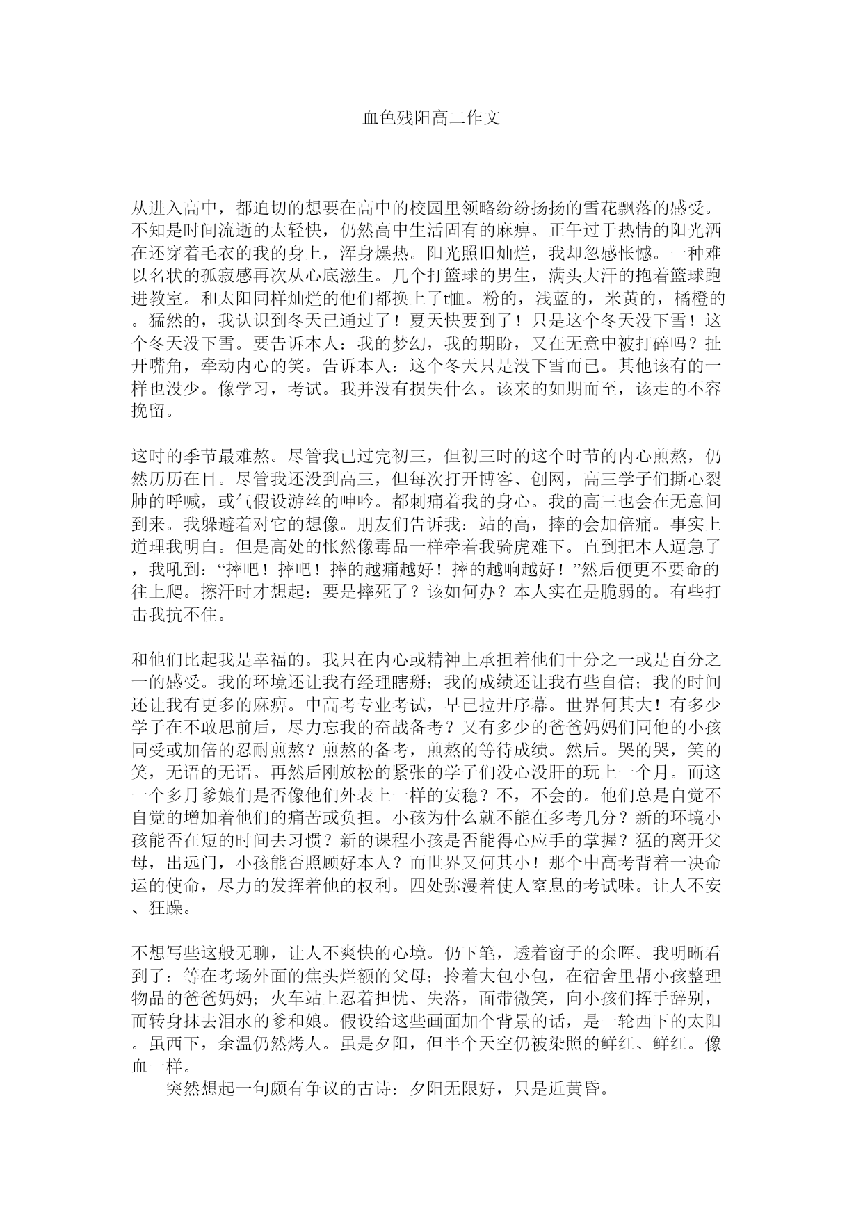 血色残阳高二作文 从进入高中,都迫切的想要在高中的校园里领略纷纷扬扬的雪花飘落的感受。不知是时间流逝的太轻快,仍然高中生活固有的麻痹。正午过于热情的阳光洒在还穿着毛衣的我的身上,浑身燥热。阳光照旧灿烂,我却忽感怅憾。一种难以名状的孤寂感再次从心底滋生。几个打篮球的男生,满头大汗的抱着篮球跑进教室。和太阳同样灿烂的他们都换上了t恤。粉的,浅蓝的,米黄的,橘橙的。猛然的,我认识到冬天已通过了!夏天快要到了!只是这个冬天没下雪!这个冬天没下雪。要告诉本人:我的梦幻,我的期盼,又在无意中被打碎吗?扯开嘴角,牵动内心的笑。告诉本人:这个冬天只是没下雪而已。其他该有的一样也没少。像学习,考试。我并没有损失什么。该来的如期而至,该走的不容挽留。 这时的季节最难熬。尽管我已过完初三,但初三时的这个时节的内心煎熬,仍然历历在目。尽管我还没到高三,但每次打开博客、创网,高三学子们撕心裂肺的呼喊,或气假设游丝的呻吟。都刺痛着我的身心。我的高三也会在无意间到来。我躲避着对它的想像。朋友们告诉我:站的高,摔的会加倍痛。事实上道理我明白。但是高处的怅然像毒品一样牵着我骑虎难下。直到把本人逼急了,我吼到:“摔吧!摔吧!摔的越痛越好!摔的越响越好!”然后便更不要命的往上爬。擦汗时才想起:要是摔死了?该如何办?本人实在是脆弱的。有些打击我抗不住。 和他们比起我是幸福的。我只在内心或精神上承担着他们十分之一或是百分之一的感受。我的环境还让我有经理瞎掰;我的成绩还让我有些自信;我的时间还让我有更多的麻痹。中高考专业考试,早已拉开序幕。世界何其大!有多少学子在不敢思前后,尽力忘我的奋战备考?又有多少的爸爸妈妈们同他的小孩同受或加倍的忍耐煎熬?煎熬的备考,煎熬的等待成绩。然后。哭的哭,笑的笑,无语的无语。再然后刚放松的紧张的学子们没心没肝的玩上一个月。而这一个多月爹娘们是否像他们外表上一样的安稳?不,不会的。他们总是自觉不自觉的增加着他们的痛苦或负担。小孩为什么就不能在多考几分?新的环境小孩能否在短的时间去习惯?新的课程小孩是否能得心应手的掌握?猛的离开父母,出远门,小孩能否照顾好本人?而世界又何其小!那个中高考背着一决命运的使命,尽力的发挥着他的权利。四处弥漫着使人窒息的考试味。让人不安、狂躁。 不想写些这般无聊,让人不爽快的心境。仍下笔,透着窗子的余晖。我明晰看到了:等在考场外面的焦头烂额的父母;拎着大包小包,在宿舍里帮小孩整理物品的爸爸妈妈;火车站上忍着担忧、失落,面带微笑,向小孩们挥手辞别,而转身抹去泪水的爹和娘。假设给这些画面加个背景的话,是一轮西下的太阳。虽西下,余温仍然烤人。虽是夕阳,但半个天空仍被染照的鲜红、鲜红。像血一样。 突然想起一句颇有争议的古诗:夕阳无限好,只是近黄昏。