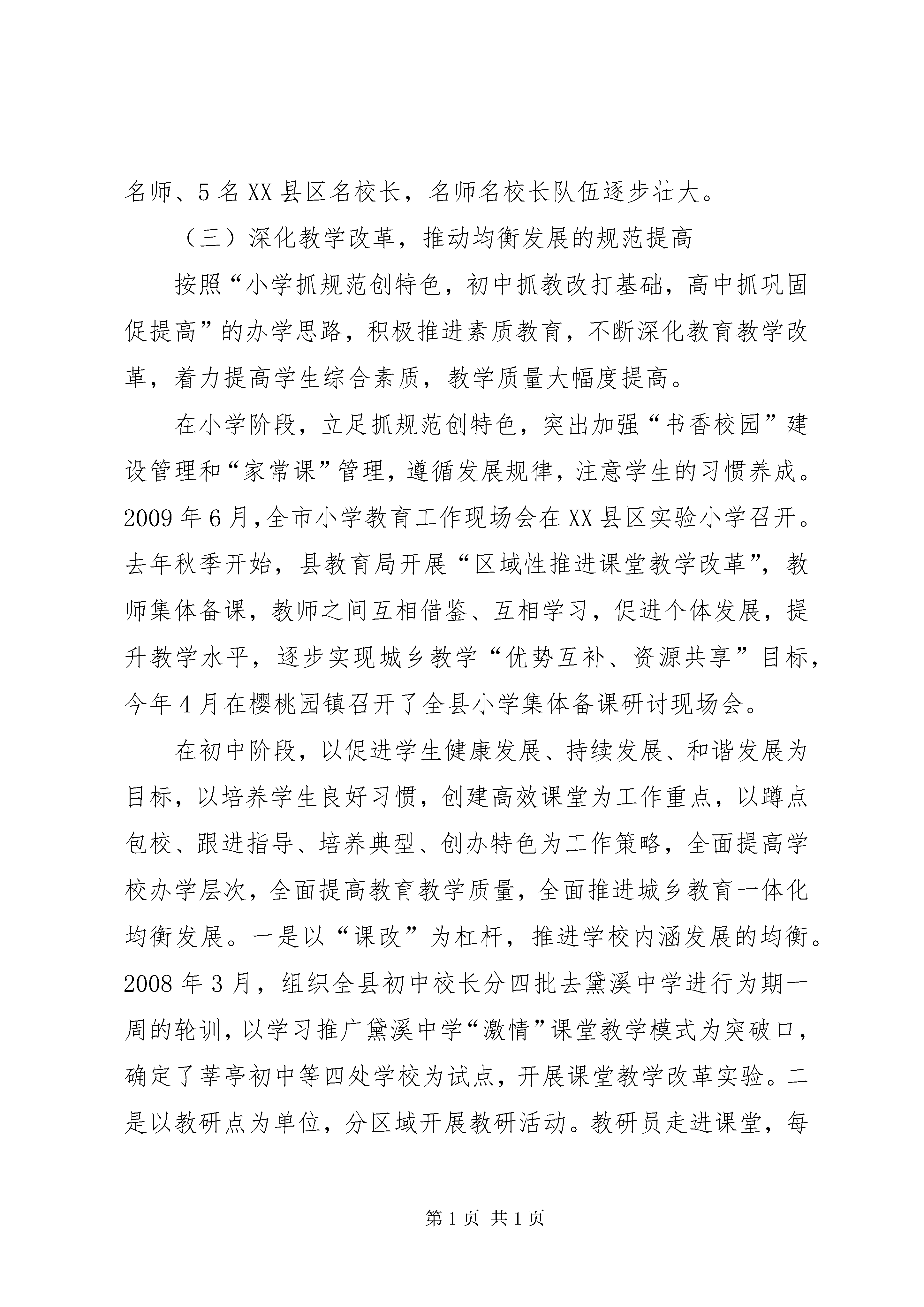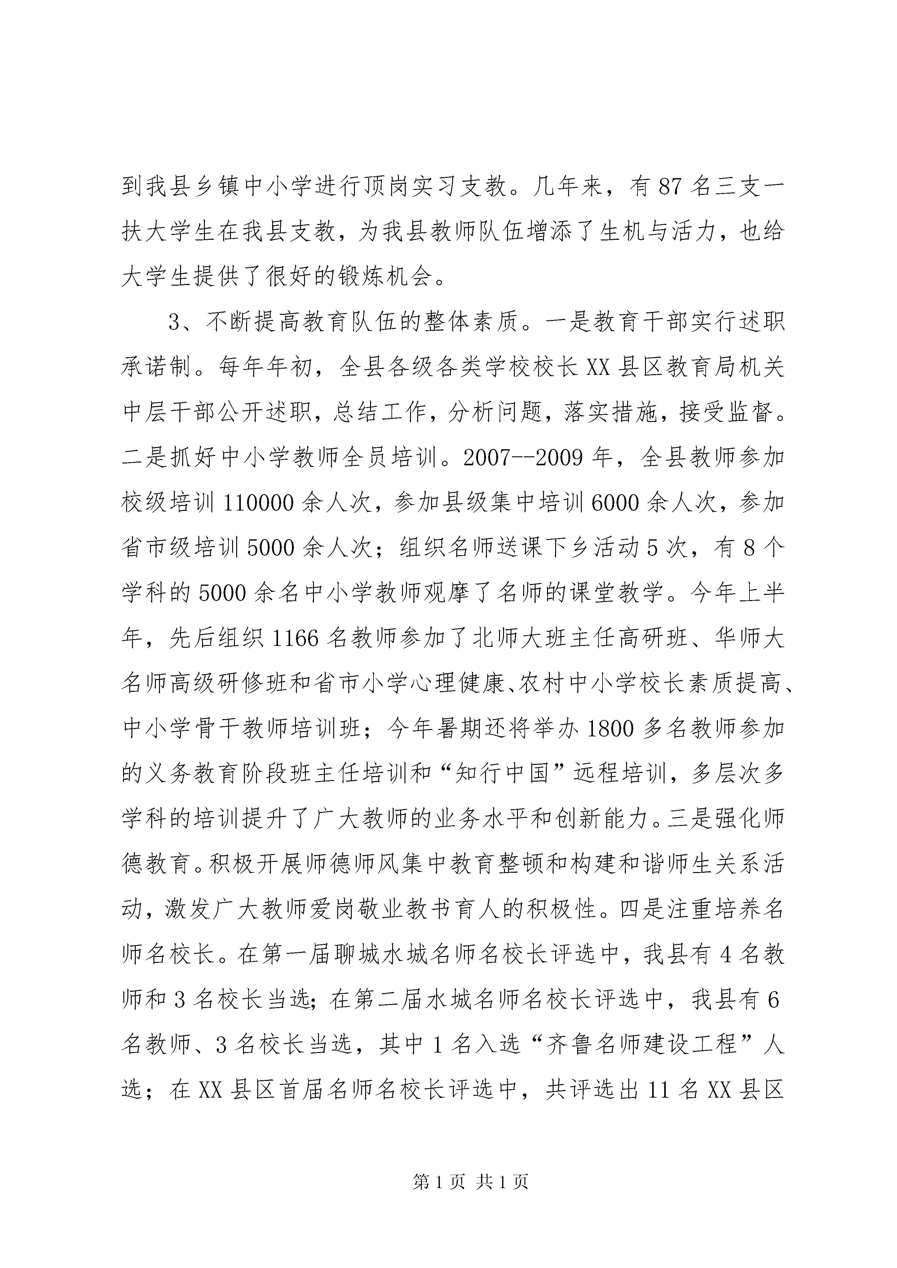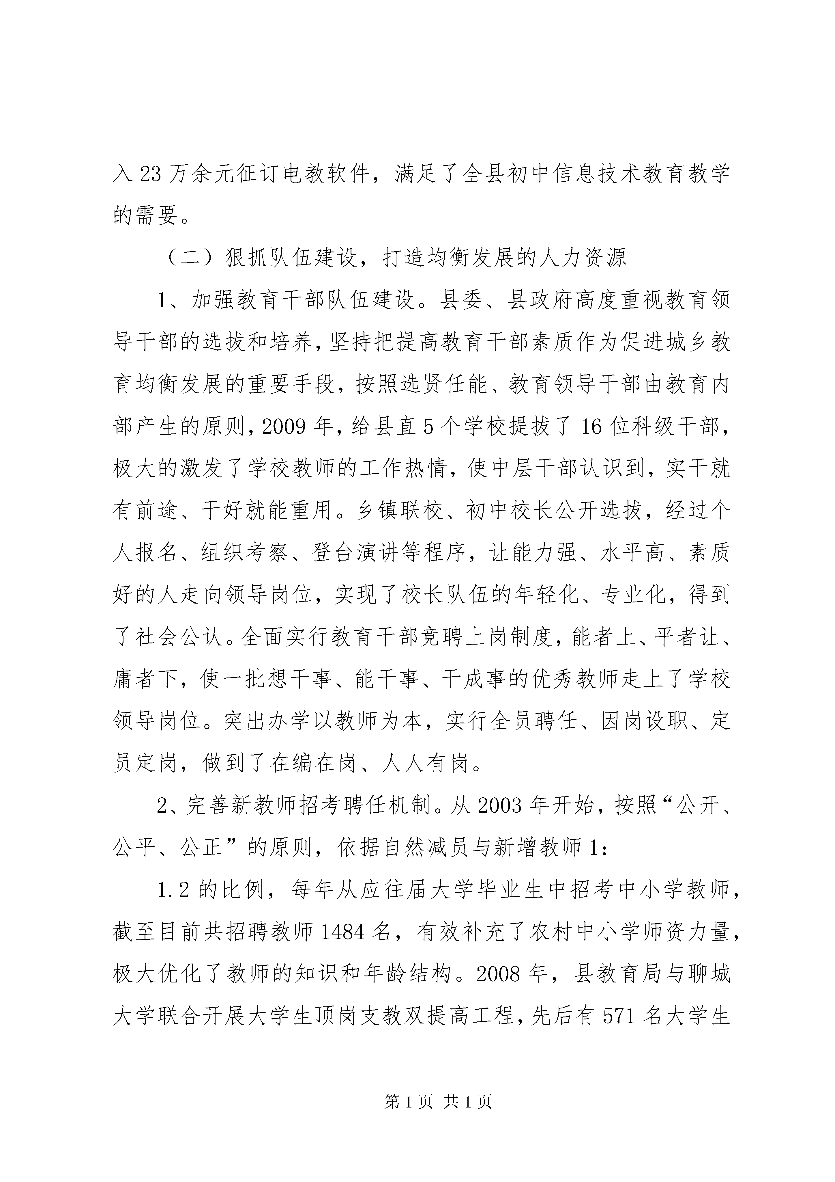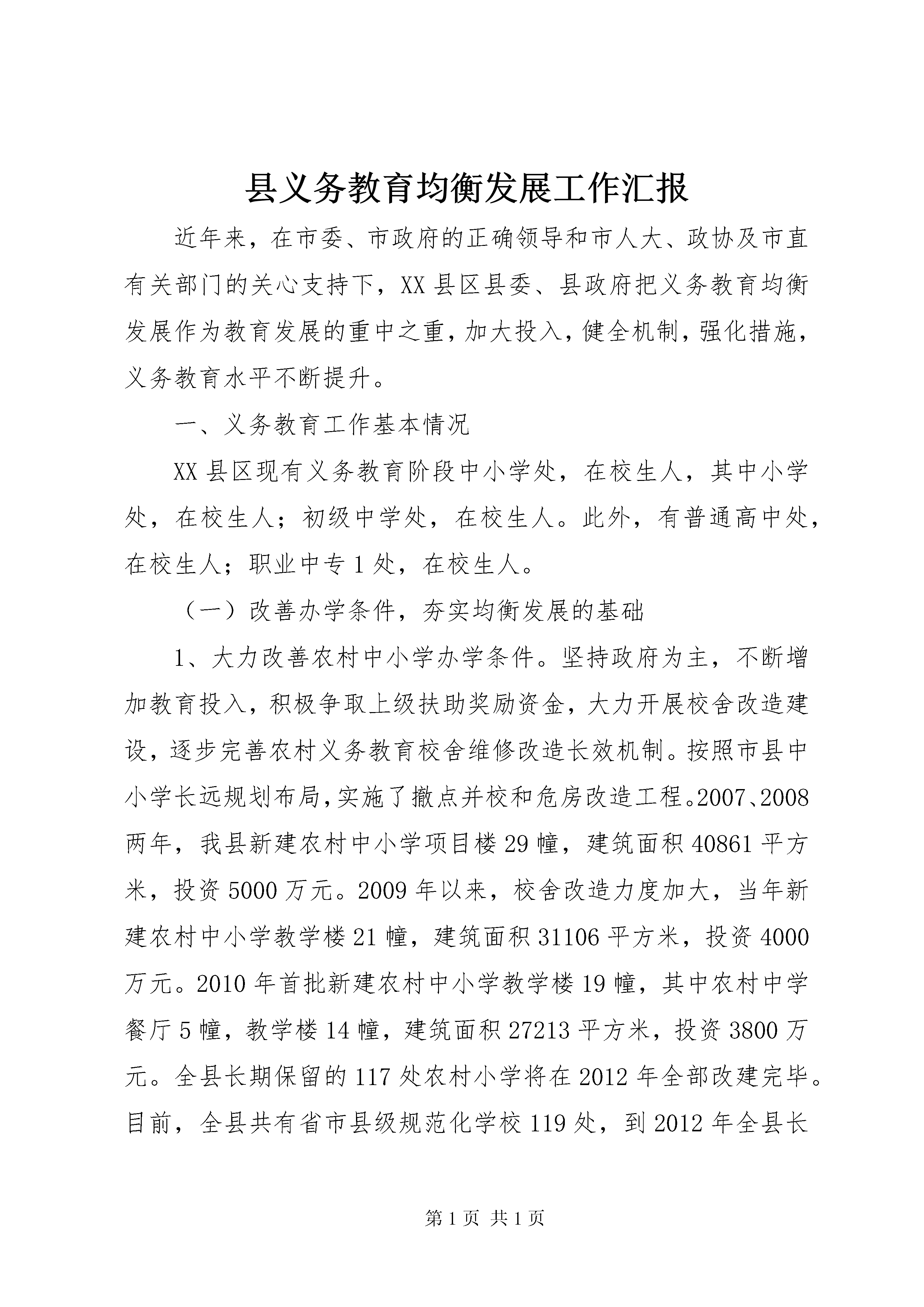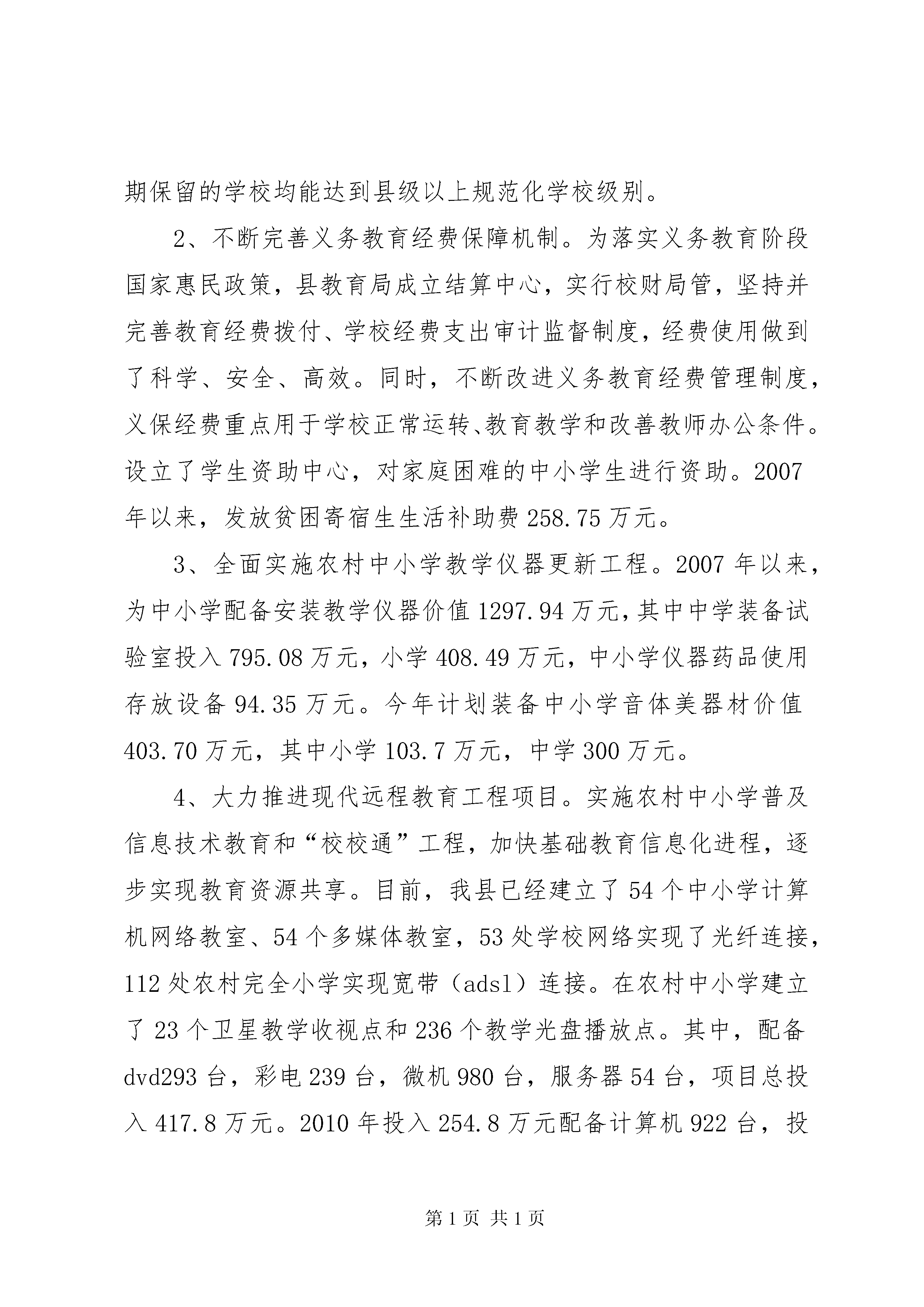 县义务教育均衡发展工作汇报近年来,在市委、市政府的正确领导和市人大、政协及市直有关部门的关心支持下,XX县区县委、县政府把义务教育均衡发展作为教育发展的重中之重,加大投入,健全机制,强化措施,义务教育水平不断提升。一、义务教育工作基本情况XX县区现有义务教育阶段中小学处,在校生人,其中小学处,在校生人;初级中学处,在校生人。此外,有普通高中处,在校生人;职业中专1处,在校生人。(一)改善办学条件,夯实均衡发展的基础1、大力改善农村中小学办学条件。坚持政府为主,不断增加教育投入,积极争取上级扶助奖励资金,大力开展校舍改造建设,逐步完善农村义务教育校舍维修改造长效机制。按照市县中小学长远规划布局,实施了撤点并校和危房改造工程。2007、2008两年,我县新建农村中小学项目楼29幢,建筑面积40861平方米,投资5000万元。2009年以来,校舍改造力度加大,当年新建农村中小学教学楼21幢,建筑面积31106平方米,投资4000万元。2010年首批新建农村中小学教学楼19幢,其中农村中学餐厅5幢,教学楼14幢,建筑面积27213平方米,投资3800万元。全县长期保留的117处农村小学将在2012年全部改建完毕。目前,全县共有省市县级规范化学校119处,到2012年全县长期保留的学校均能达到县级以上规范化学校级别。2、不断完善义务教育经费保障机制。为落实义务教育阶段国家惠民政策,县教育局成立结算中心,实行校财局管,坚持并完善教育经费拨付、学校经费支出审计监督制度,经费使用做到了科学、安全、高效。同时,不断改进义务教育经费管理制度,义保经费重点用于学校正常运转、教育教学和改善教师办公条件。设立了学生资助中心,对家庭困难的中小学生进行资助。2007年以来,发放贫困寄宿生生活补助费258.75万元。3、全面实施农村中小学教学仪器更新工程。2007年以来,为中小学配备安装教学仪器价值1297.94万元,其中中学装备试验室投入795.08万元,小学408.49万元,中小学仪器药品使用存放设备94.35万元。今年计划装备中小学音体美器材价值403.70万元,其中小学103.7万元,中学300万元。4、大力推进现代远程教育工程项目。实施农村中小学普及信息技术教育和“校校通”工程,加快基础教育信息化进程,逐步实现教育资源共享。目前,我县已经建立了54个中小学计算机网络教室、54个多媒体教室,53处学校网络实现了光纤连接,112处农村完全小学实现宽带(adsl)连接。在农村中小学建立了23个卫星教学收视点和236个教学光盘播放点。其中,配备dvd293台,彩电239台,微机980台,服务器54台,项目总投入417.8万元。2010年投入254.8万元配备计算机922台,投入23万余元征订电教软件,满足了全县初中信息技术教育教学的需要。(二)狠抓队伍建设,打造均衡发展的人力资源1、加强教育干部队伍建设。县委、县政府高度重视教育领导干部的选拔和培养,坚持把提高教育干部素质作为促进城乡教育均衡发展的重要手段,按照选贤任能、教育领导干部由教育内部产生的原则,2009年,给县直5个学校提拔了16位科级干部,极大的激发了学校教师的工作热情,使中层干部认识到,实干就有前途、干好就能重用。乡镇联校、初中校长公开选拔,经过个人报名、组织考察、登台演讲等程序,让能力强、水平高、素质好的人走向领导岗位,实现了校长队伍的年轻化、专业化,得到了社会公认。全面实行教育干部竞聘上岗制度,能者上、平者让、庸者下,使一批想干事、能干事、干成事的优秀教师走上了学校领导岗位。突出办学以教师为本,实行全员聘任、因岗设职、定员定岗,做到了在编在岗、人人有岗。2、完善新教师招考聘任机制。从2003年开始,按照“公开、公平、公正”的原则,依据自然减员与新增教师1:1.2的比例,每年从应往届大学毕业生中招考中小学教师,截至目前共招聘教师1484名,有效补充了农村中小学师资力量,极大优化了教师的知识和年龄结构。2008年,县教育局与聊城大学联合开展大学生顶岗支教双提高工程,先后有571名大学生到我县乡镇中小学进行顶岗实习支教。几年来,有87名三支一扶大学生在我县支教,为我县教师队伍增添了生机与活力,也给大学生提供了很好的锻炼机会。3、不断提高教育队伍的整体素质。一是教育干部实行述职承诺制。每年年初,全县各级各类学校校长XX县区教育局机关中层干部公开述职,总结工作,分析问题,落实措施,接受监督。二是抓好中小学教师全员培训。2007--2009年,全县教师参加校级培训110000余人次,参加县级集中培训6000余人次,参加省市级培训5000余人次;组织名师送课下乡活动5次,有8个学科的5000余名中小学教师观摩了名师的课堂教学。今年上半年,先后组织1166名教师参加了北师大班主任
