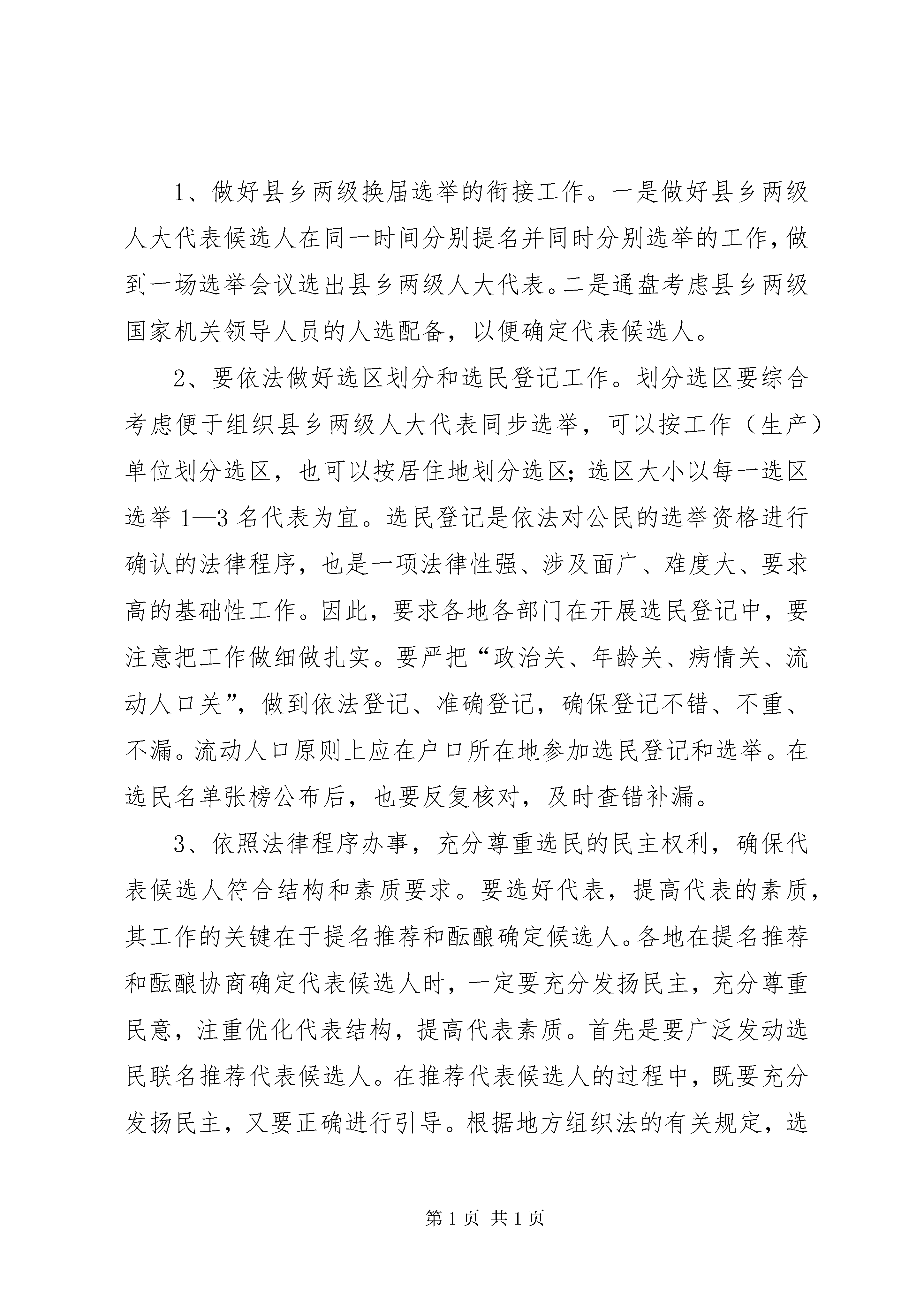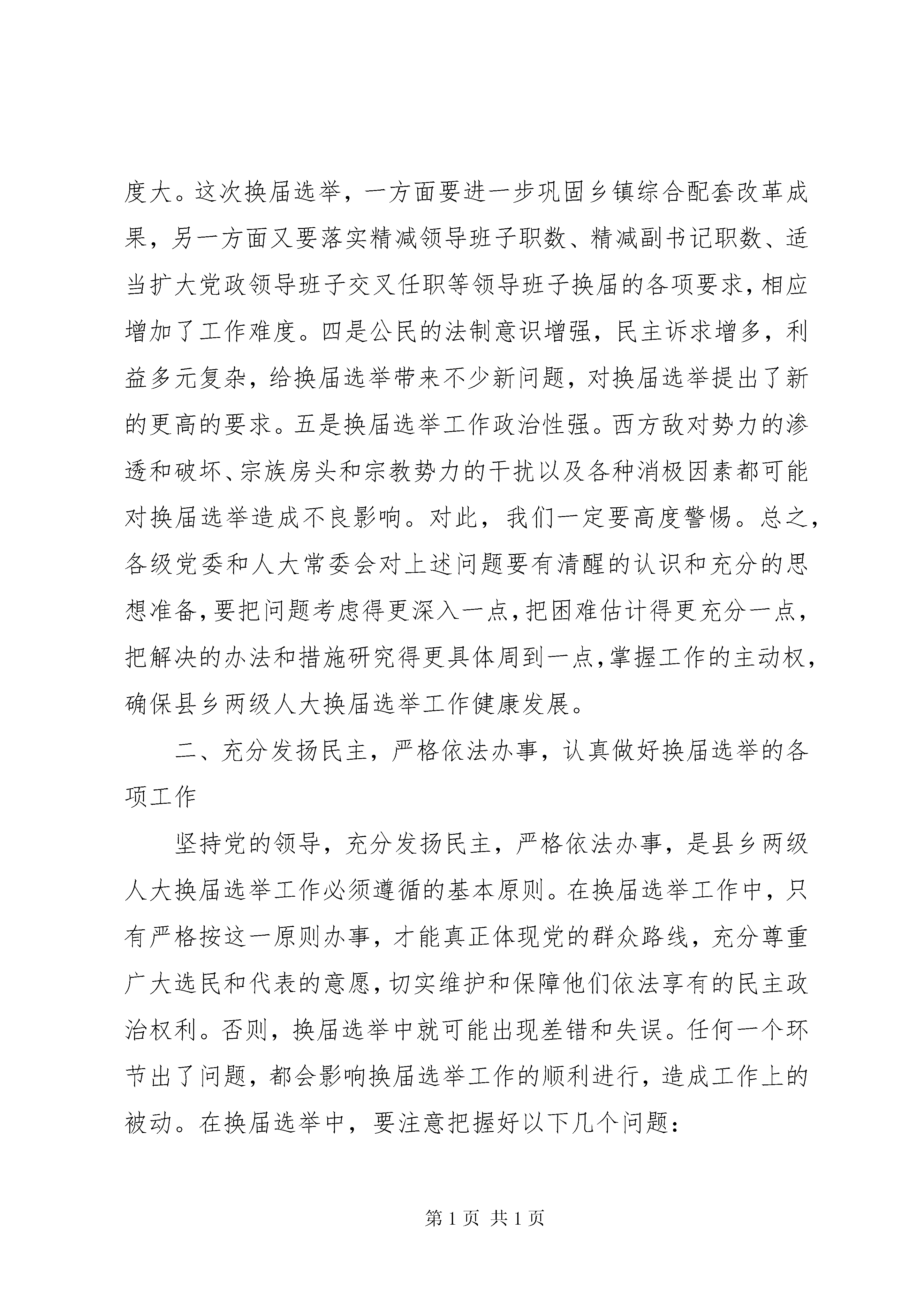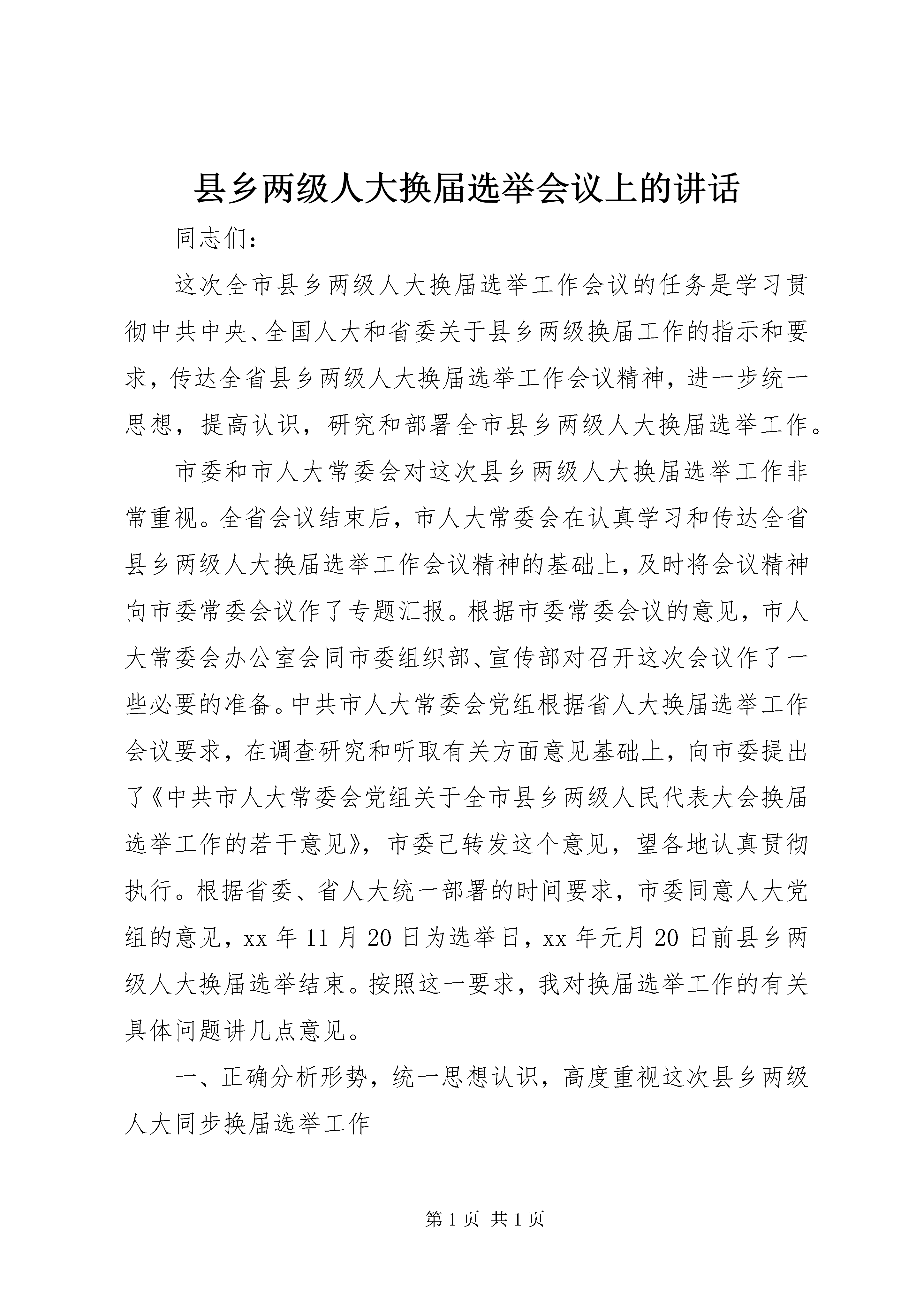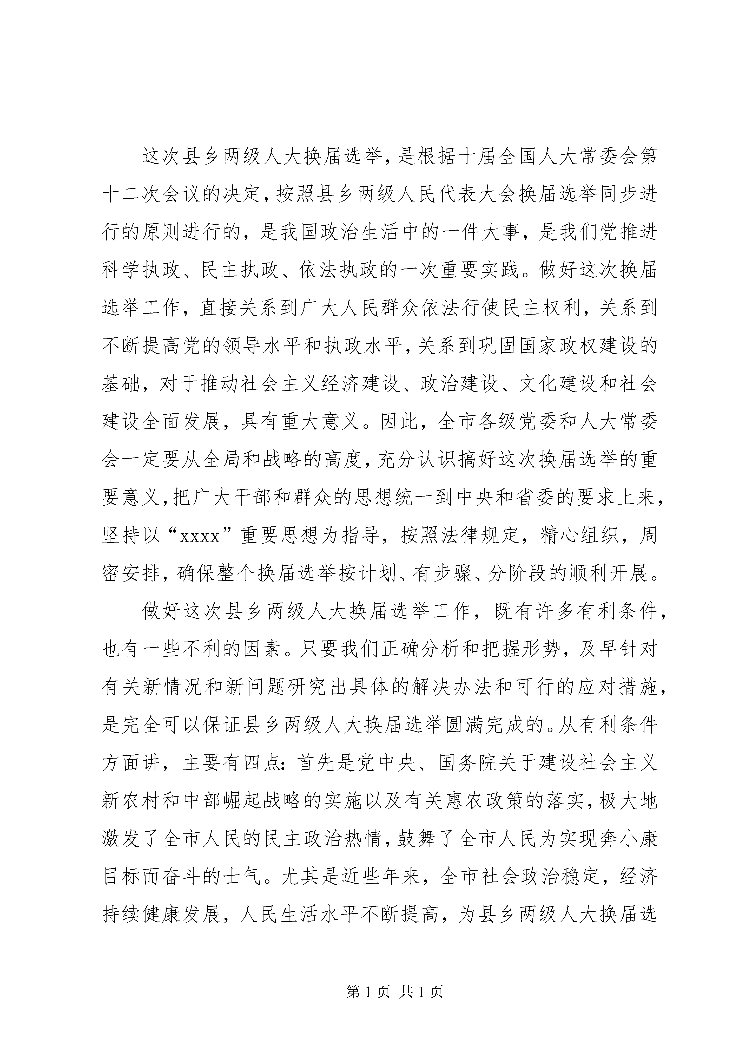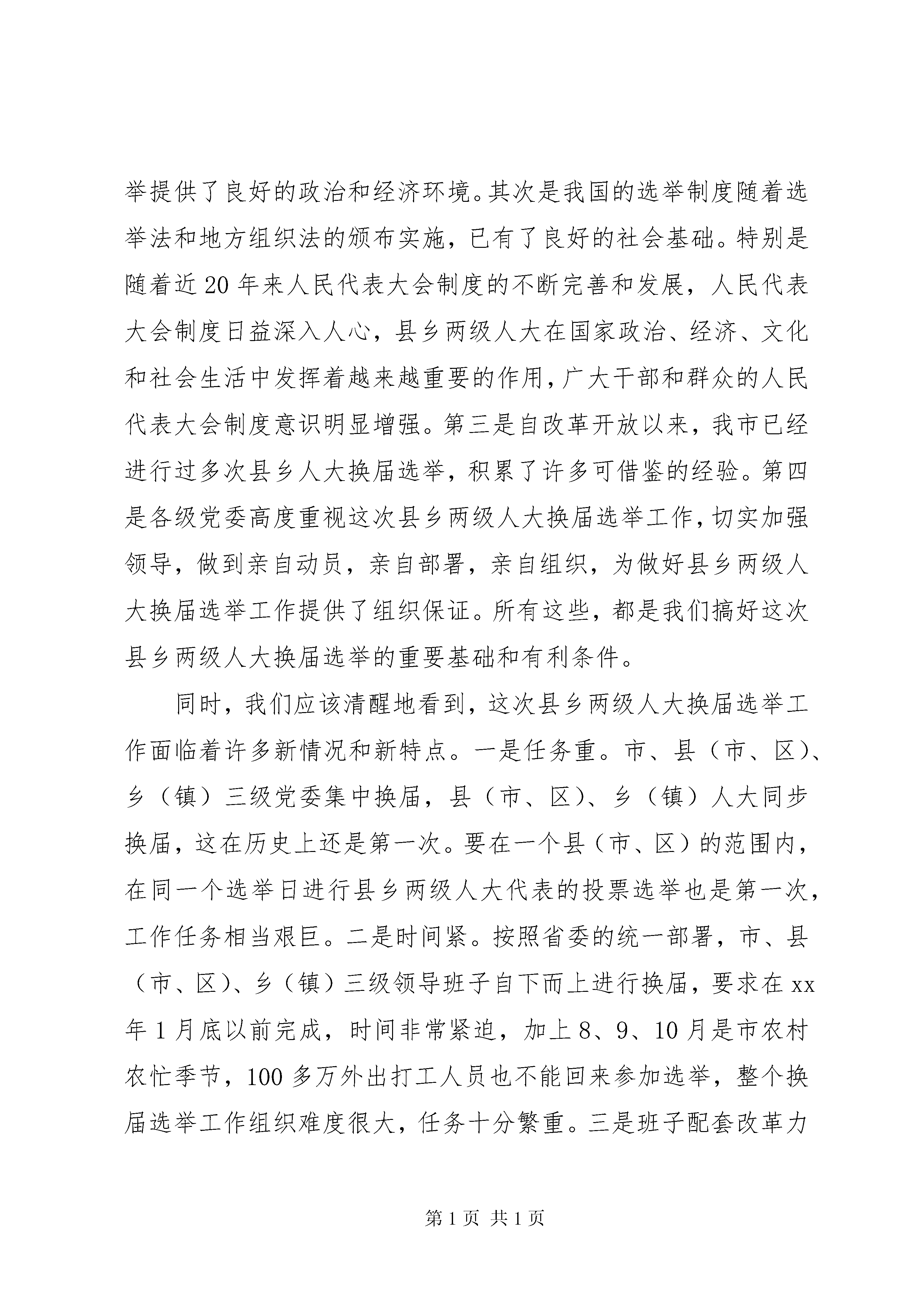 县乡两级人大换届选举会议上的讲话同志们:这次全市县乡两级人大换届选举工作会议的任务是学习贯彻中共中央、全国人大和省委关于县乡两级换届工作的指示和要求,传达全省县乡两级人大换届选举工作会议精神,进一步统一思想,提高认识,研究和部署全市县乡两级人大换届选举工作。市委和市人大常委会对这次县乡两级人大换届选举工作非常重视。全省会议结束后,市人大常委会在认真学习和传达全省县乡两级人大换届选举工作会议精神的基础上,及时将会议精神向市委常委会议作了专题汇报。根据市委常委会议的意见,市人大常委会办公室会同市委组织部、宣传部对召开这次会议作了一些必要的准备。中共市人大常委会党组根据省人大换届选举工作会议要求,在调查研究和听取有关方面意见基础上,向市委提出了《中共市人大常委会党组关于全市县乡两级人民代表大会换届选举工作的若干意见》,市委己转发这个意见,望各地认真贯彻执行。根据省委、省人大统一部署的时间要求,市委同意人大党组的意见,xx年11月20日为选举日,xx年元月20日前县乡两级人大换届选举结束。按照这一要求,我对换届选举工作的有关具体问题讲几点意见。一、正确分析形势,统一思想认识,高度重视这次县乡两级人大同步换届选举工作这次县乡两级人大换届选举,是根据十届全国人大常委会第十二次会议的决定,按照县乡两级人民代表大会换届选举同步进行的原则进行的,是我国政治生活中的一件大事,是我们党推进科学执政、民主执政、依法执政的一次重要实践。做好这次换届选举工作,直接关系到广大人民群众依法行使民主权利,关系到不断提高党的领导水平和执政水平,关系到巩固国家政权建设的基础,对于推动社会主义经济建设、政治建设、文化建设和社会建设全面发展,具有重大意义。因此,全市各级党委和人大常委会一定要从全局和战略的高度,充分认识搞好这次换届选举的重要意义,把广大干部和群众的思想统一到中央和省委的要求上来,坚持以“xxxx”重要思想为指导,按照法律规定,精心组织,周密安排,确保整个换届选举按计划、有步骤、分阶段的顺利开展。做好这次县乡两级人大换届选举工作,既有许多有利条件,也有一些不利的因素。只要我们正确分析和把握形势,及早针对有关新情况和新问题研究出具体的解决办法和可行的应对措施,是完全可以保证县乡两级人大换届选举圆满完成的。从有利条件方面讲,主要有四点:首先是党中央、国务院关于建设社会主义新农村和中部崛起战略的实施以及有关惠农政策的落实,极大地激发了全市人民的民主政治热情,鼓舞了全市人民为实现奔小康目标而奋斗的士气。尤其是近些年来,全市社会政治稳定,经济持续健康发展,人民生活水平不断提高,为县乡两级人大换届选举提供了良好的政治和经济环境。其次是我国的选举制度随着选举法和地方组织法的颁布实施,已有了良好的社会基础。特别是随着近20年来人民代表大会制度的不断完善和发展,人民代表大会制度日益深入人心,县乡两级人大在国家政治、经济、文化和社会生活中发挥着越来越重要的作用,广大干部和群众的人民代表大会制度意识明显增强。第三是自改革开放以来,我市已经进行过多次县乡人大换届选举,积累了许多可借鉴的经验。第四是各级党委高度重视这次县乡两级人大换届选举工作,切实加强领导,做到亲自动员,亲自部署,亲自组织,为做好县乡两级人大换届选举工作提供了组织保证。所有这些,都是我们搞好这次县乡两级人大换届选举的重要基础和有利条件。同时,我们应该清醒地看到,这次县乡两级人大换届选举工作面临着许多新情况和新特点。一是任务重。市、县(市、区)、乡(镇)三级党委集中换届,县(市、区)、乡(镇)人大同步换届,这在历史上还是第一次。要在一个县(市、区)的范围内,在同一个选举日进行县乡两级人大代表的投票选举也是第一次,工作任务相当艰巨。二是时间紧。按照省委的统一部署,市、县(市、区)、乡(镇)三级领导班子自下而上进行换届,要求在xx年1月底以前完成,时间非常紧迫,加上8、9、10月是市农村农忙季节,100多万外出打工人员也不能回来参加选举,整个换届选举工作组织难度很大,任务十分繁重。三是班子配套改革力度大。这次换届选举,一方面要进一步巩固乡镇综合配套改革成果,另一方面又要落实精减领导班子职数、精减副书记职数、适当扩大党政领导班子交叉任职等领导班子换届的各项要求,相应增加了工作难度。四是公民的法制意识增强,民主诉求增多,利益多元复杂,给换届选举带来不少新问题,对换届选举提出了新的更高的要求。五是换届选举工作政治性强。西方敌对势力的渗透和破坏、宗族房头和宗教势力的干扰以及各种消极因素都可能对换届选举造成不良影响。对此,我们一定要高度警惕。总之,各级党委和人大常委会对上述问题要有清醒的认识和充分的思想准备,要把问题考虑得更深入一点,把困难估计得更充分一点,把解决的办法和措施研究得更具体周到一点,掌握工