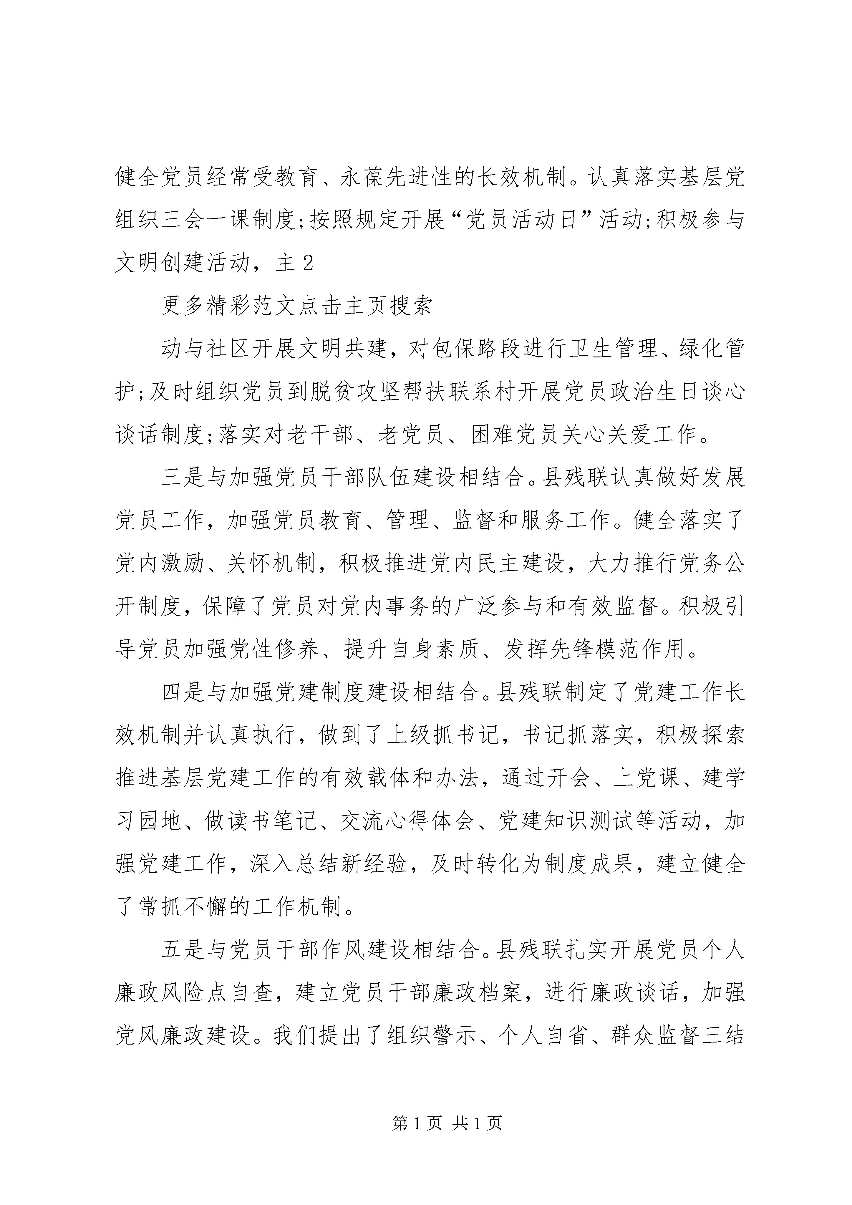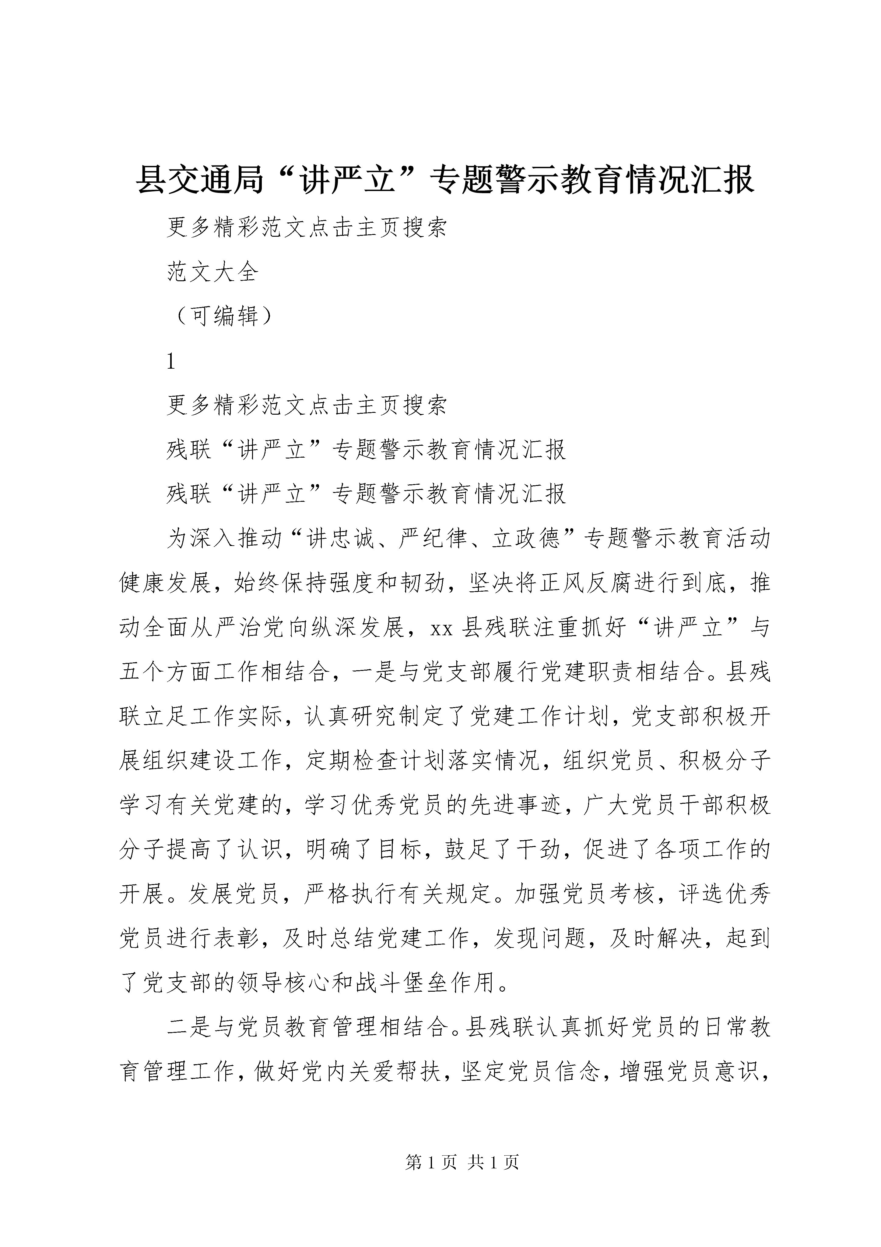 县交通局“讲严立”专题警示教育情况汇报更多精彩范文点击主页搜索范文大全(可编辑)1更多精彩范文点击主页搜索残联“讲严立”专题警示教育情况汇报残联“讲严立”专题警示教育情况汇报为深入推动“讲忠诚、严纪律、立政德”专题警示教育活动健康发展,始终保持强度和韧劲,坚决将正风反腐进行到底,推动全面从严治党向纵深发展,xx县残联注重抓好“讲严立”与五个方面工作相结合,一是与党支部履行党建职责相结合。县残联立足工作实际,认真研究制定了党建工作计划,党支部积极开展组织建设工作,定期检查计划落实情况,组织党员、积极分子学习有关党建的,学习优秀党员的先进事迹,广大党员干部积极分子提高了认识,明确了目标,鼓足了干劲,促进了各项工作的开展。发展党员,严格执行有关规定。加强党员考核,评选优秀党员进行表彰,及时总结党建工作,发现问题,及时解决,起到了党支部的领导核心和战斗堡垒作用。二是与党员教育管理相结合。县残联认真抓好党员的日常教育管理工作,做好党内关爱帮扶,坚定党员信念,增强党员意识,健全党员经常受教育、永葆先进性的长效机制。认真落实基层党组织三会一课制度;按照规定开展“党员活动日”活动;积极参与文明创建活动,主2更多精彩范文点击主页搜索动与社区开展文明共建,对包保路段进行卫生管理、绿化管护;及时组织党员到脱贫攻坚帮扶联系村开展党员政治生日谈心谈话制度;落实对老干部、老党员、困难党员关心关爱工作。三是与加强党员干部队伍建设相结合。县残联认真做好发展党员工作,加强党员教育、管理、监督和服务工作。健全落实了党内激励、关怀机制,积极推进党内民主建设,大力推行党务公开制度,保障了党员对党内事务的广泛参与和有效监督。积极引导党员加强党性修养、提升自身素质、发挥先锋模范作用。四是与加强党建制度建设相结合。县残联制定了党建工作长效机制并认真执行,做到了上级抓书记,书记抓落实,积极探索推进基层党建工作的有效载体和办法,通过开会、上党课、建学习园地、做读书笔记、交流心得体会、党建知识测试等活动,加强党建工作,深入总结新经验,及时转化为制度成果,建立健全了常抓不懈的工作机制。五是与党员干部作风建设相结合。县残联扎实开展党员个人廉政风险点自查,建立党员干部廉政档案,进行廉政谈话,加强党风廉政建设。我们提出了组织警示、个人自省、群众监督三结合的廉政措施,教育党员干部践行廉洁自律,以求真务实的作风推进各项工作,积极营造风清气正的良好工作氛围。3更多精彩范文点击主页搜索4