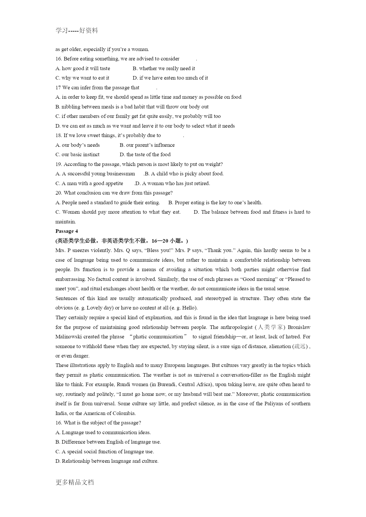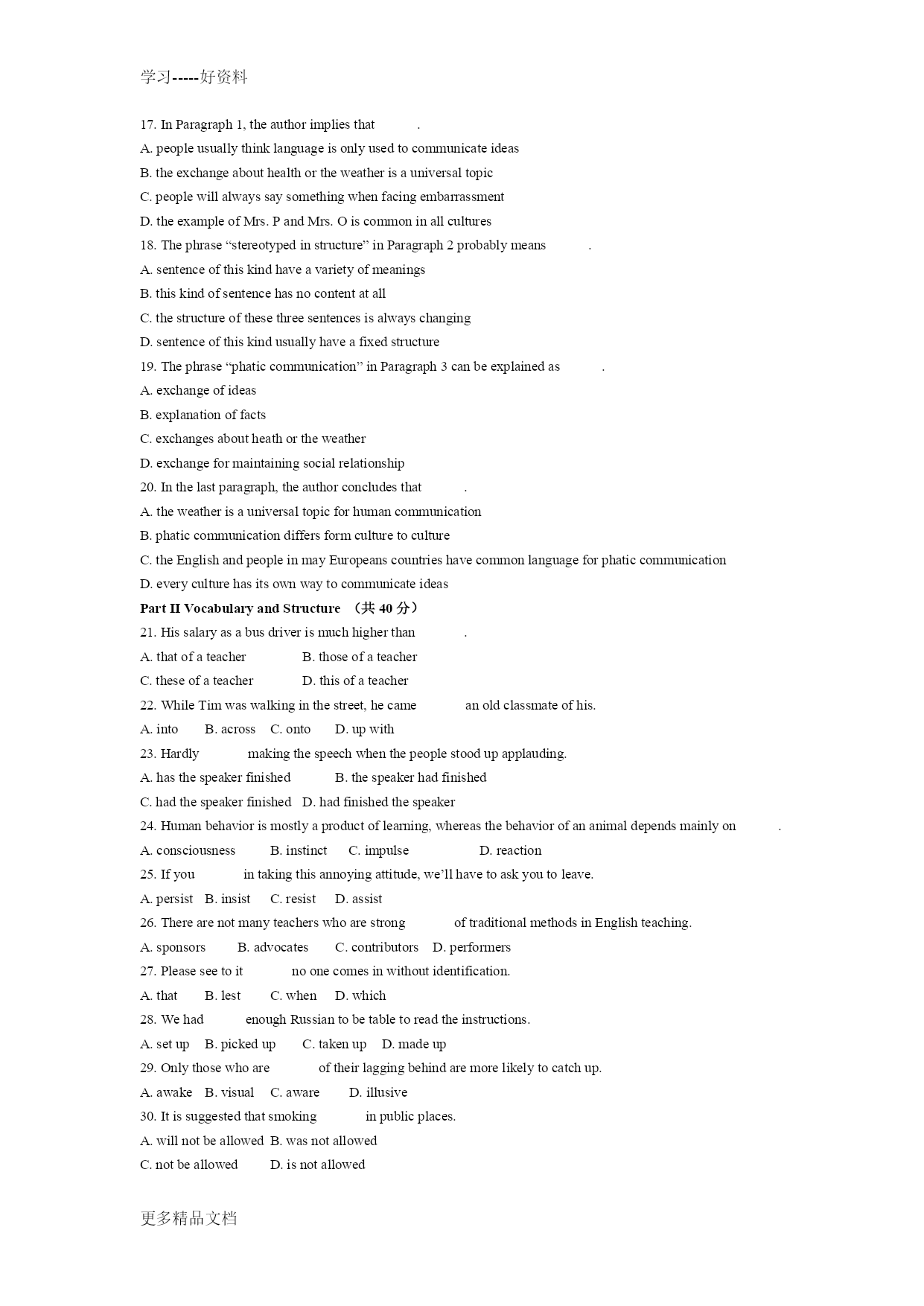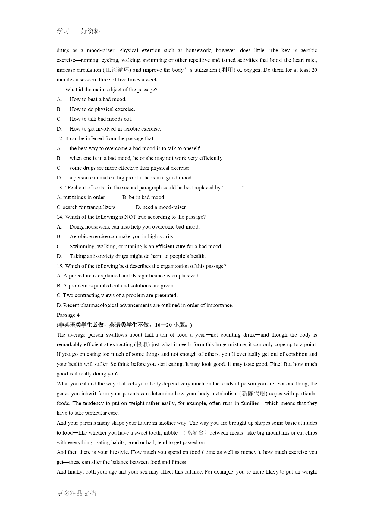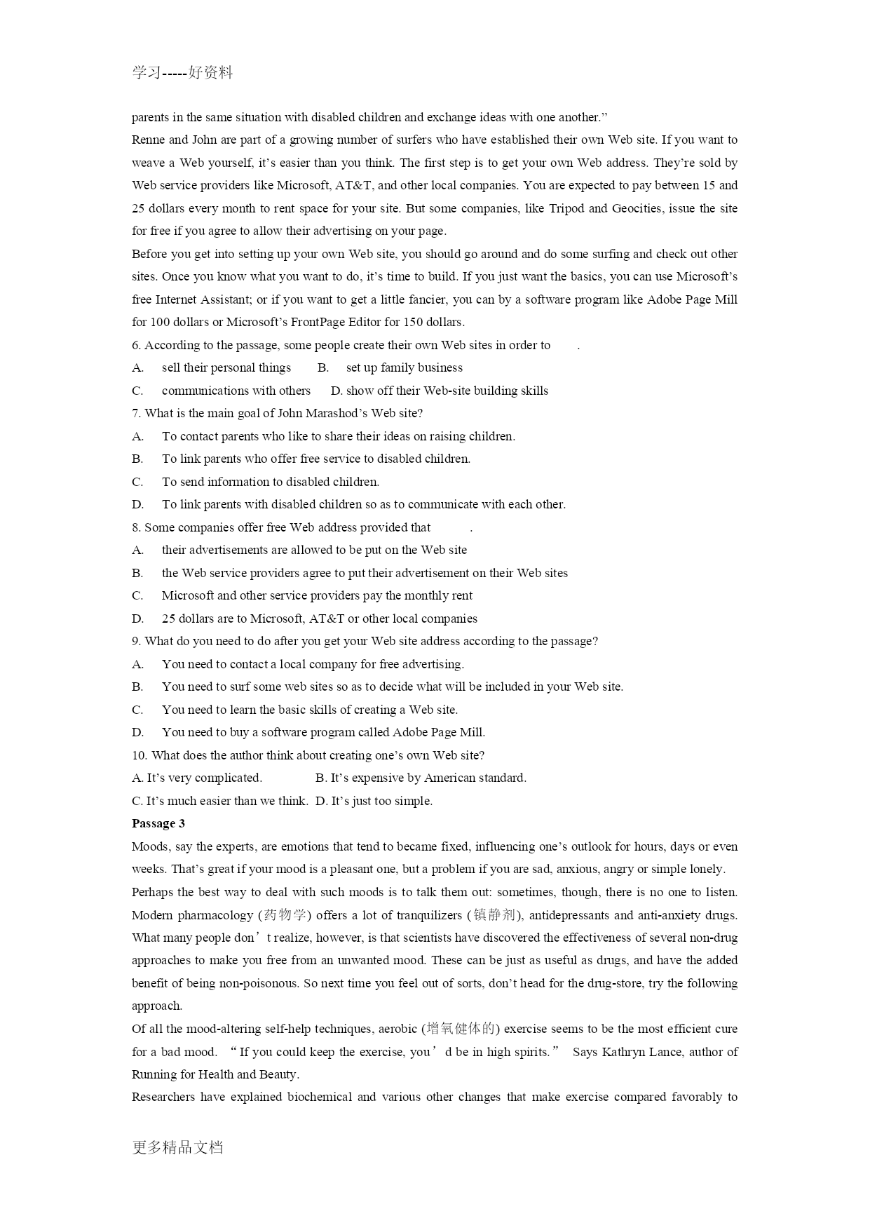 学习-----好资料 学习-----好资料 更多精品文档 更多精品文档 学习-----好资料 更多精品文档 2008年江苏省普通高校“专转本”统一考试 大学英语 本试卷分第I卷(客观题)和第II卷(主观题)两部分。满分150分。考试时间120分钟。 卷中未注明做大对象的试题为英语类和非英语类学生共同作答的试题,注明作答对象的试题按规定作答。第I卷(共100分) PartIReadingComprehension(共40分) Passage1 Sometimes,peoplesimplydonotrealizetheyarebeingillmannered.TakeTed,forexample.Heprideshimselfonspeakinghismind,andhassomethingtosayoneverything.Buthisfranknessisoftenextremelyembarrassing. Heisincapableofsaying,“Ithoughtthatlastadvertisingcampaignhadalotofgoodideasinit,butperhapsnexttimewecouldgivethecopymorevitality(活力).”Instead,hecouldsay,“Thatcampaignwasadisaster.Achildofthreecouldhavedonebetter!” Thefactthatheisoftenrightdoesnothelp.Otheremployeesdislikehismannerevenmore,heistoosensitivetonotice. Anothercharacteramongthelistofill-manneredemployeesisSally,whoseemstoregardjustbeingatworkasaseverepunishment.Everythingisdoneunwillingly.Askinghertodoataskbeyondherbasicjobdescriptionisoftennotworththetrouble.Itwillbedone,buthalf-heartedly. Fergusisjusttheopposite.Heshowsanover-familiaritytohisboss.Whenanimportantvisitorisshownintothemanager’soffice,Ferguscannottakethehintandleave.Insteadhew3illattempttotakepartintheconversation,declaring,“Youcantalkinfontofme.HenryandIdon’thavemanysecrets,dowe?”OvertheyearsPergushasfallenbehindhisformerequals.Butheseekstomaintainthesamecloserelationshipthatheimaginesexistedintheiryoungerdays. 1.WhichofthefollowingwordsdescribesTedbest? A.Cold B.Tactless C.Stupid D.Warm-hearted 2.ItcanbeinferredfromthepassagethatTed. A. iswell-knownforhishonestlyB. tendstoblameothersratherthanhimself C. oftengivestherightideainthewrongwayD. istreatedunfairlybythemanagement 3.WhichofthefollowingistrueaboutSally? A. Shethinksit’sunfairtohavesomuchworktodo.B. Sheisunhappytohelpothers. C. Shehatesbeingorderedabout.D. Shedoeseverythinghalf-heartedly. 4.Formthepassage,wecaninferthatFergus. A. wasonceclosetoallhiscolleaguesB. hasremainedinthesamepositionforyears C. doesn’tknowwhatahintisD. knowseverythingthathappensintheoffice 5.Thewriteris