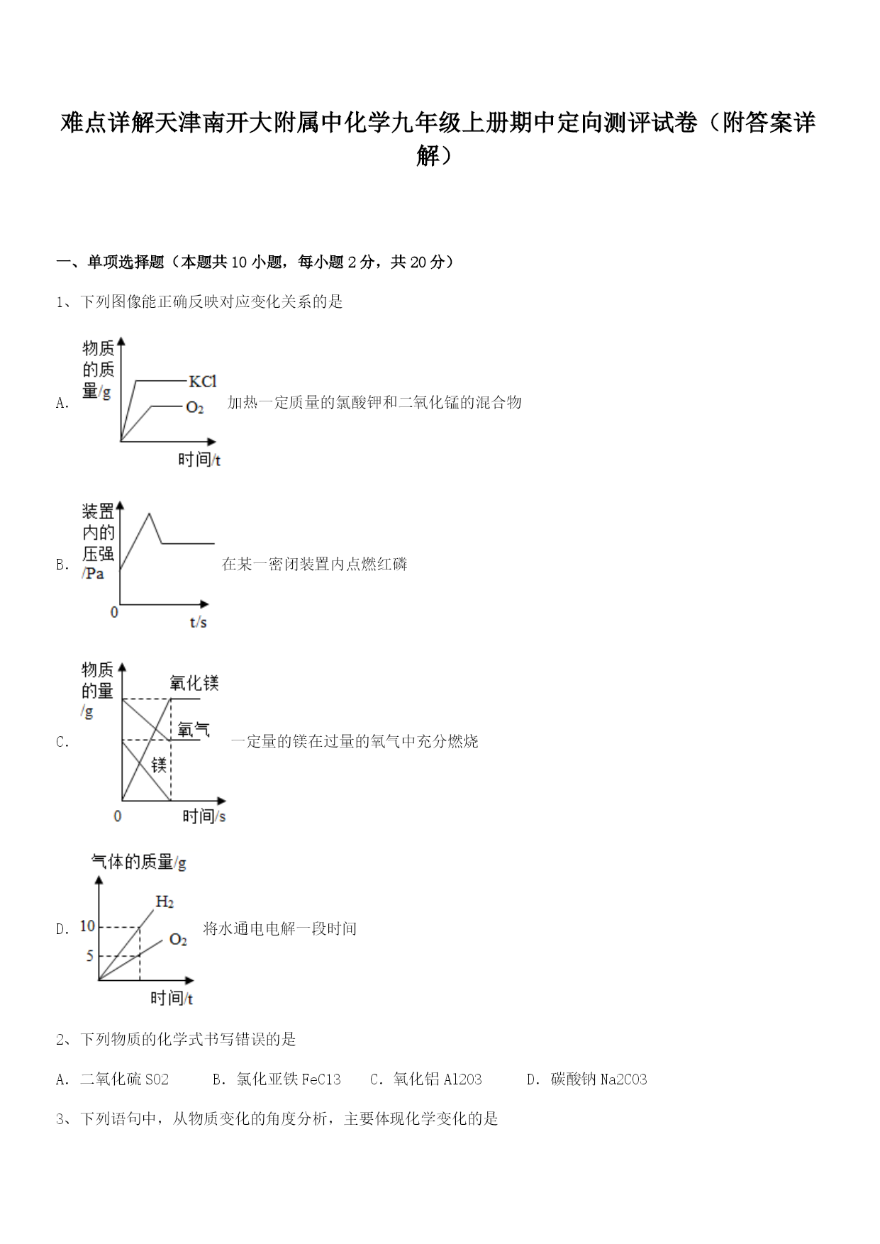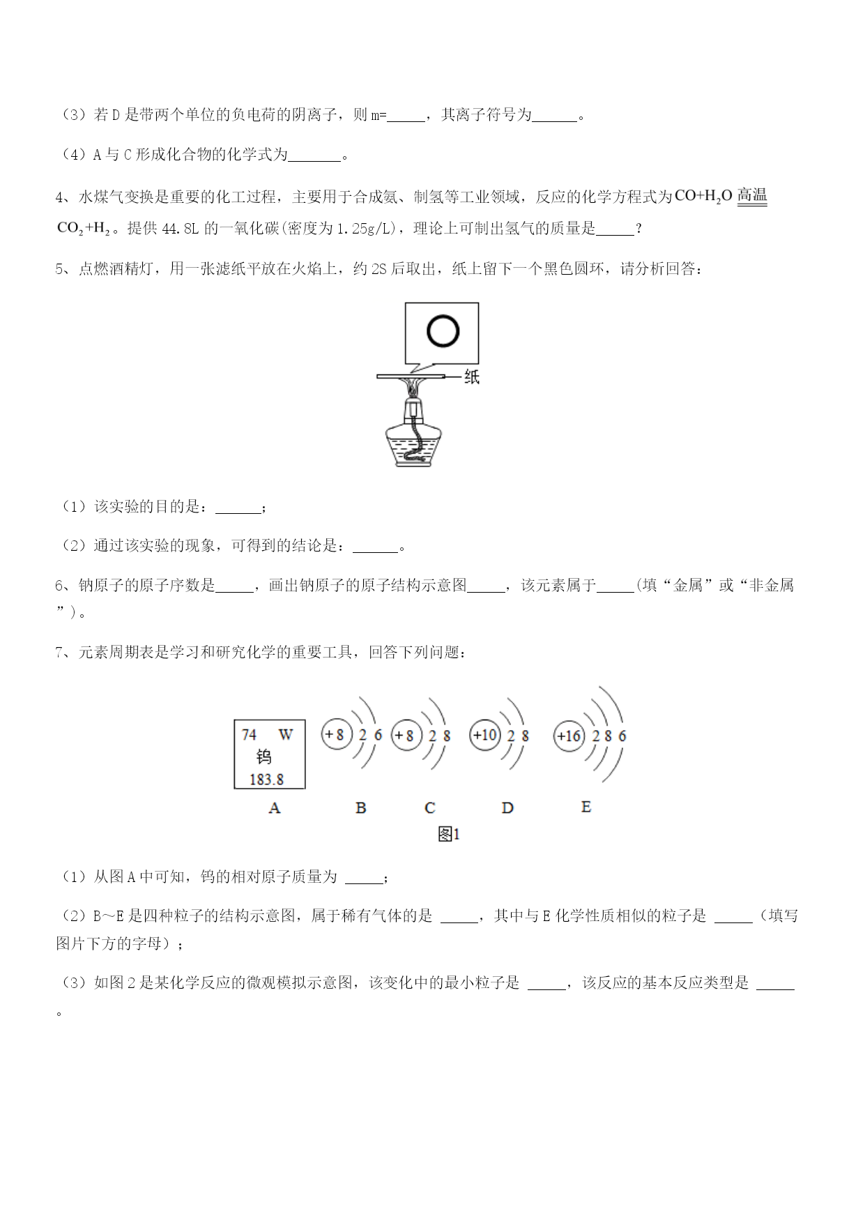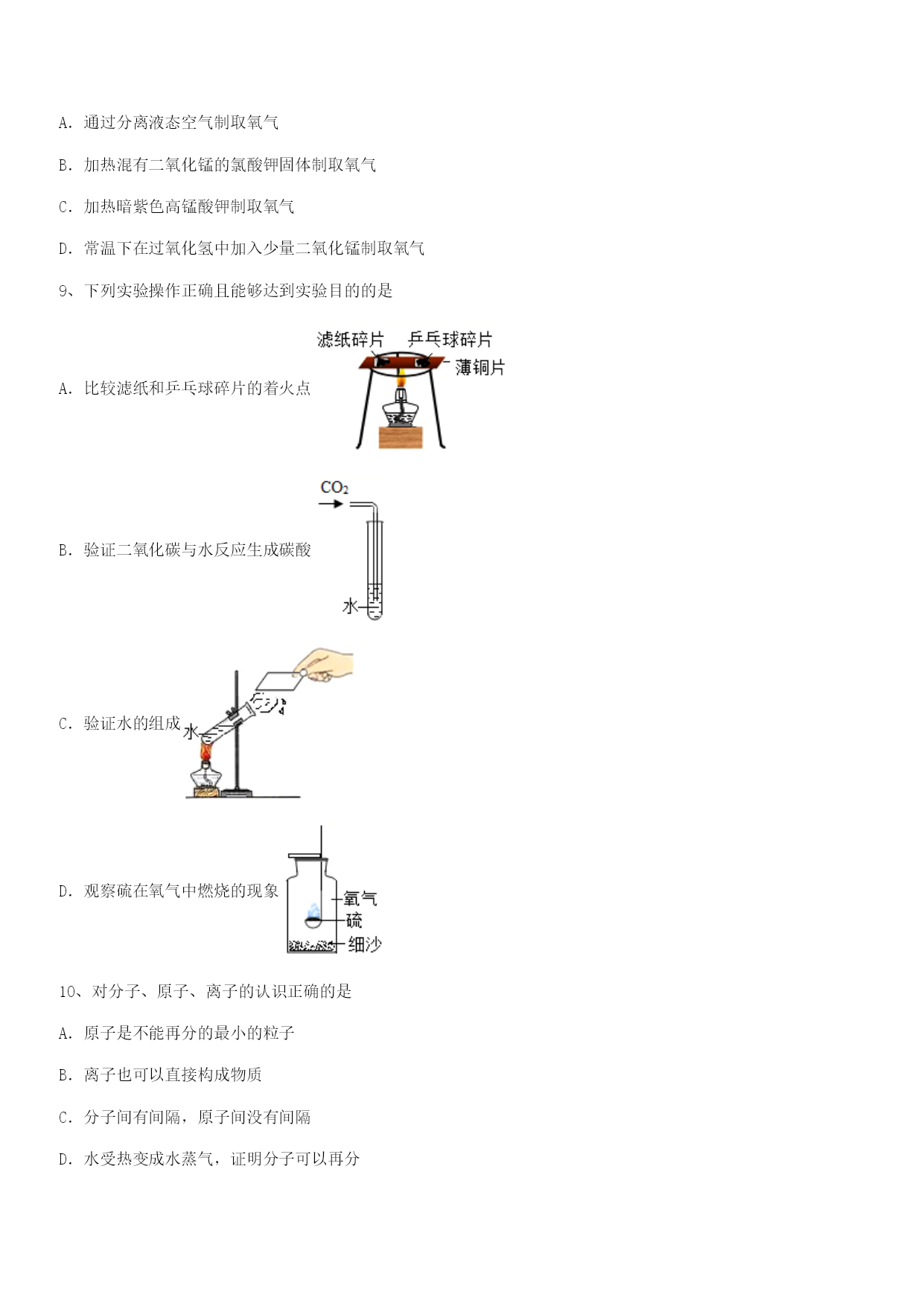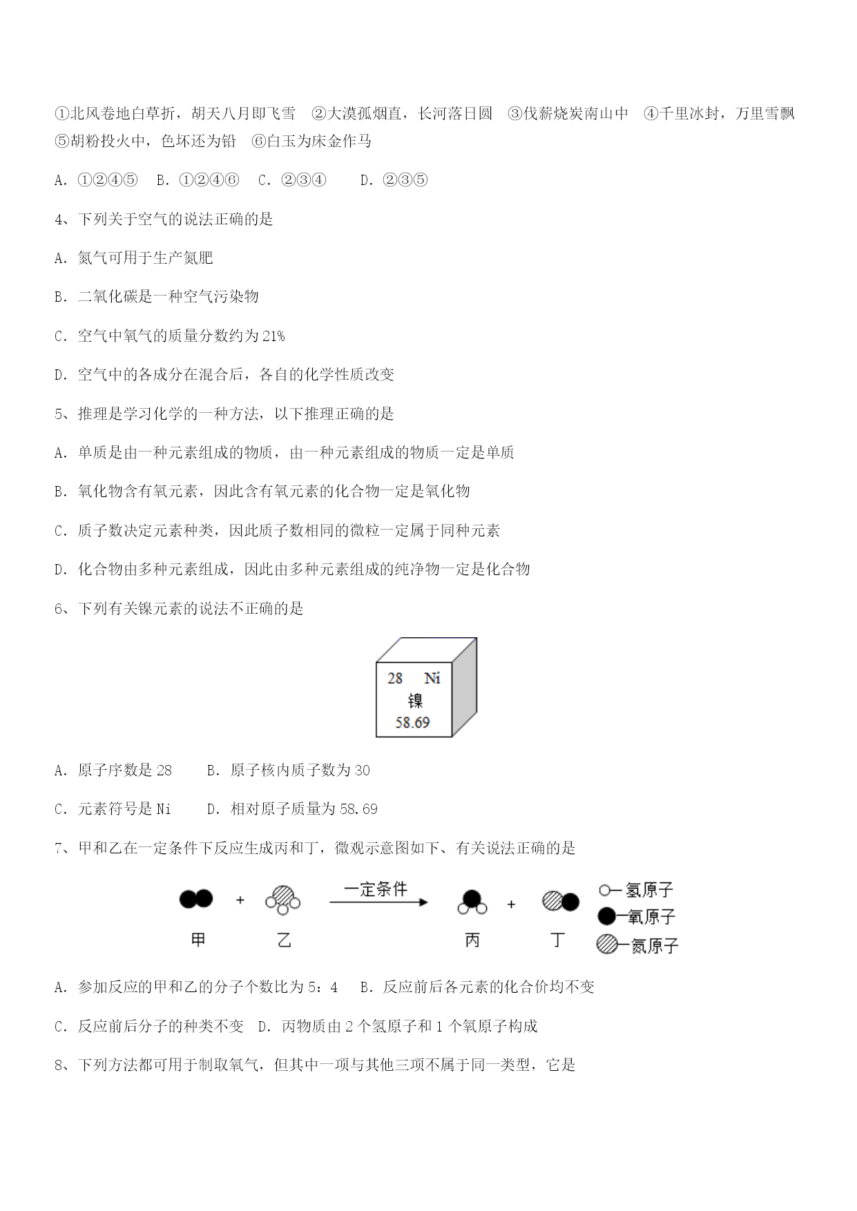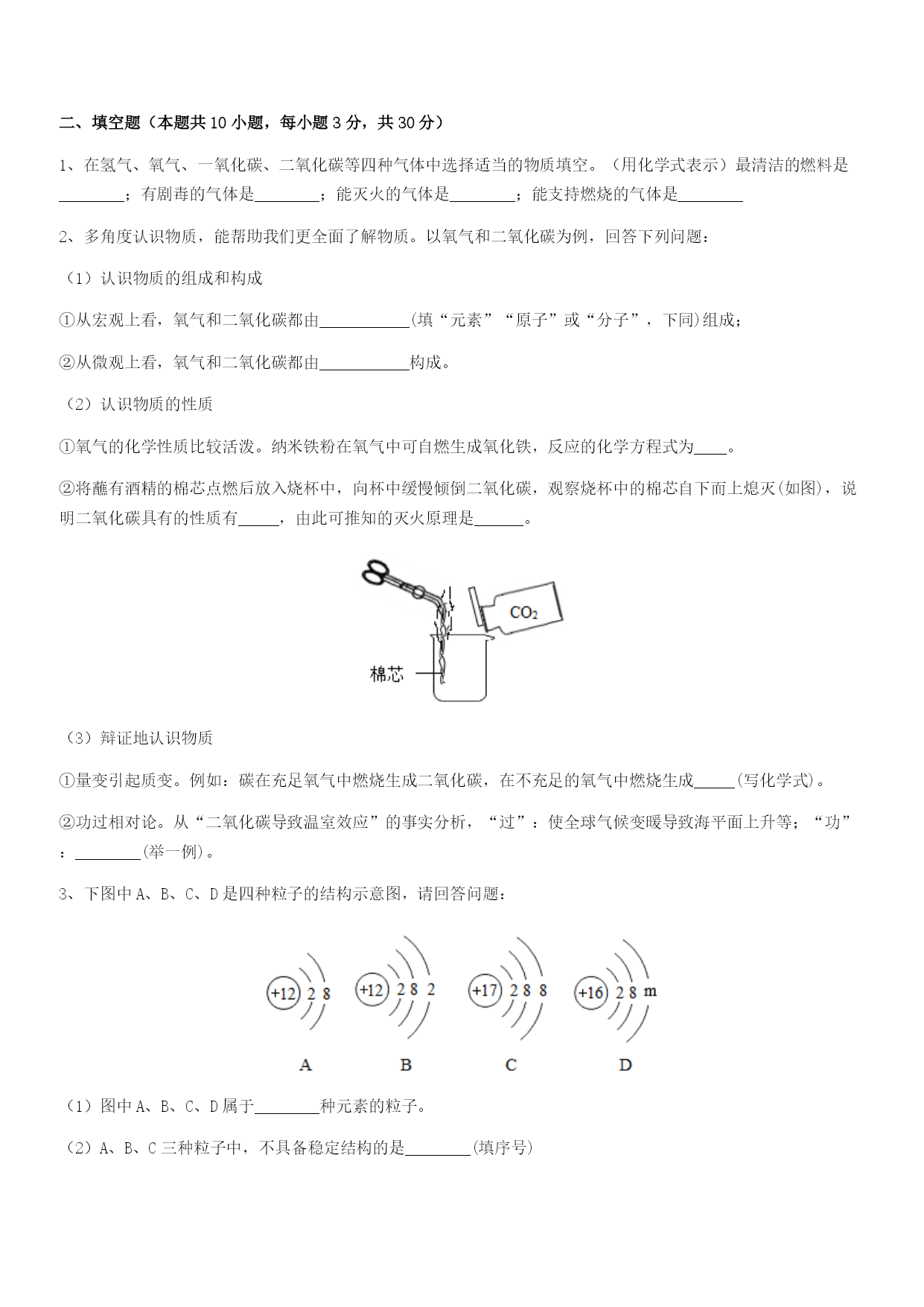 难点详解天津南开大附属中化学九年级上册期中定向测评试卷(附答案详解) 一、单项选择题(本题共10小题,每小题2分,共20分) 1、下列图像能正确反映对应变化关系的是 A.加热一定质量的氯酸钾和二氧化锰的混合物 B.在某一密闭装置内点燃红磷 C.一定量的镁在过量的氧气中充分燃烧 D.将水通电电解一段时间 2、下列物质的化学式书写错误的是 A.二氧化硫SO2 B.氯化亚铁FeC13 C.氧化铝Al2O3 D.碳酸钠Na2CO3 3、下列语句中,从物质变化的角度分析,主要体现化学变化的是 ①北风卷地白草折,胡天八月即飞雪②大漠孤烟直,长河落日圆③伐薪烧炭南山中④千里冰封,万里雪飘⑤胡粉投火中,色坏还为铅⑥白玉为床金作马 A.①②④⑤ B.①②④⑥ C.②③④ D.②③⑤ 4、下列关于空气的说法正确的是 A.氮气可用于生产氮肥 B.二氧化碳是一种空气污染物 C.空气中氧气的质量分数约为21% D.空气中的各成分在混合后,各自的化学性质改变 5、推理是学习化学的一种方法,以下推理正确的是 A.单质是由一种元素组成的物质,由一种元素组成的物质一定是单质 B.氧化物含有氧元素,因此含有氧元素的化合物一定是氧化物 C.质子数决定元素种类,因此质子数相同的微粒一定属于同种元素 D.化合物由多种元素组成,因此由多种元素组成的纯净物一定是化合物 6、下列有关镍元素的说法不正确的是 A.原子序数是28 B.原子核内质子数为30 C.元素符号是Ni D.相对原子质量为58.69 7、甲和乙在一定条件下反应生成丙和丁,微观示意图如下、有关说法正确的是 A.参加反应的甲和乙的分子个数比为5:4 B.反应前后各元素的化合价均不变 C.反应前后分子的种类不变 D.丙物质由2个氢原子和1个氧原子构成 8、下列方法都可用于制取氧气,但其中一项与其他三项不属于同一类型,它是 A.通过分离液态空气制取氧气 B.加热混有二氧化锰的氯酸钾固体制取氧气 C.加热暗紫色高锰酸钾制取氧气 D.常温下在过氧化氢中加入少量二氧化锰制取氧气 9、下列实验操作正确且能够达到实验目的的是 A.比较滤纸和乒乓球碎片的着火点 B.验证二氧化碳与水反应生成碳酸 C.验证水的组成 D.观察硫在氧气中燃烧的现象 10、对分子、原子、离子的认识正确的是 A.原子是不能再分的最小的粒子 B.离子也可以直接构成物质 C.分子间有间隔,原子间没有间隔 D.水受热变成水蒸气,证明分子可以再分 二、填空题(本题共10小题,每小题3分,共30分) 1、在氢气、氧气、一氧化碳、二氧化碳等四种气体中选择适当的物质填空。(用化学式表示)最清洁的燃料是________;有剧毒的气体是________;能灭火的气体是________;能支持燃烧的气体是________ 2、多角度认识物质,能帮助我们更全面了解物质。以氧气和二氧化碳为例,回答下列问题: (1)认识物质的组成和构成 ①从宏观上看,氧气和二氧化碳都由___________(填“元素”“原子”或“分子”,下同)组成; ②从微观上看,氧气和二氧化碳都由___________构成。 (2)认识物质的性质 ①氧气的化学性质比较活泼。纳米铁粉在氧气中可自燃生成氧化铁,反应的化学方程式为____。 ②将蘸有酒精的棉芯点燃后放入烧杯中,向杯中缓慢倾倒二氧化碳,观察烧杯中的棉芯自下而上熄灭(如图),说明二氧化碳具有的性质有_____,由此可推知的灭火原理是______。 (3)辩证地认识物质 ①量变引起质变。例如:碳在充足氧气中燃烧生成二氧化碳,在不充足的氧气中燃烧生成_____(写化学式)。 ②功过相对论。从“二氧化碳导致温室效应”的事实分析,“过”:使全球气候变暖导致海平面上升等;“功”:________(举一例)。 3、下图中A、B、C、D是四种粒子的结构示意图,请回答问题: (1)图中A、B、C、D属于________种元素的粒子。 (2)A、B、C三种粒子中,不具备稳定结构的是________(填序号) (3)若D是带两个单位的负电荷的阴离子,则m=_____,其离子符号为______。 (4)A与C形成化合物的化学式为_______。 4、水煤气变换是重要的化工过程,主要用于合成氨、制氢等工业领域,反应的化学方程式为。提供44.8L的一氧化碳(密度为1.25g/L),理论上可制出氢气的质量是_____? 5、点燃酒精灯,用一张滤纸平放在火焰上,约2S后取出,纸上留下一个黑色圆环,请分析回答: (1)该实验的目的是:______; (2)通过该实验的现象,可得到的结论是:______。 6、钠原子的原子序数是_____,画出钠原子的原子结构示意图_____,该元素属于_____(填“金属”或“非金属”)。 7、元素周期表是学习和研究化学的重要工具,回答
