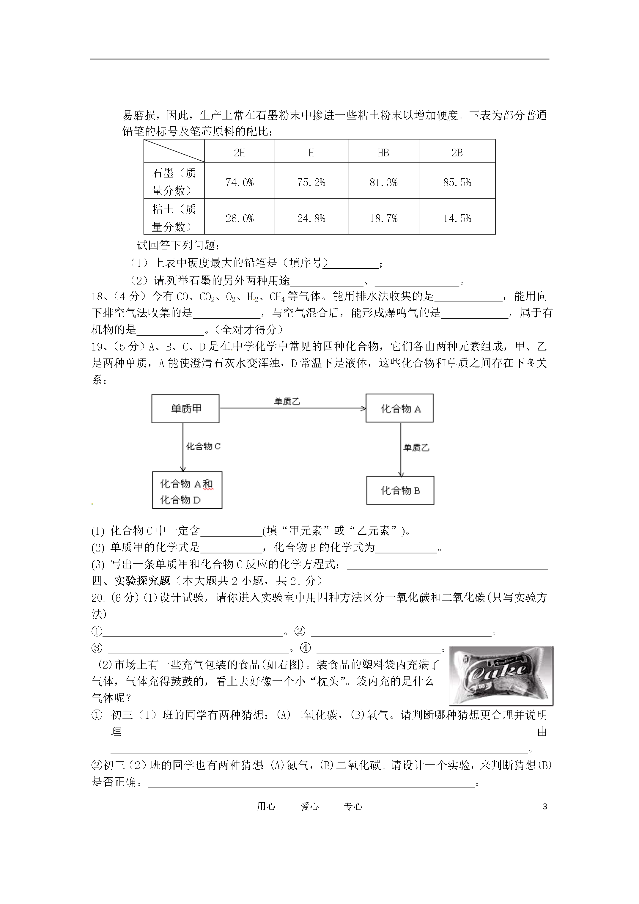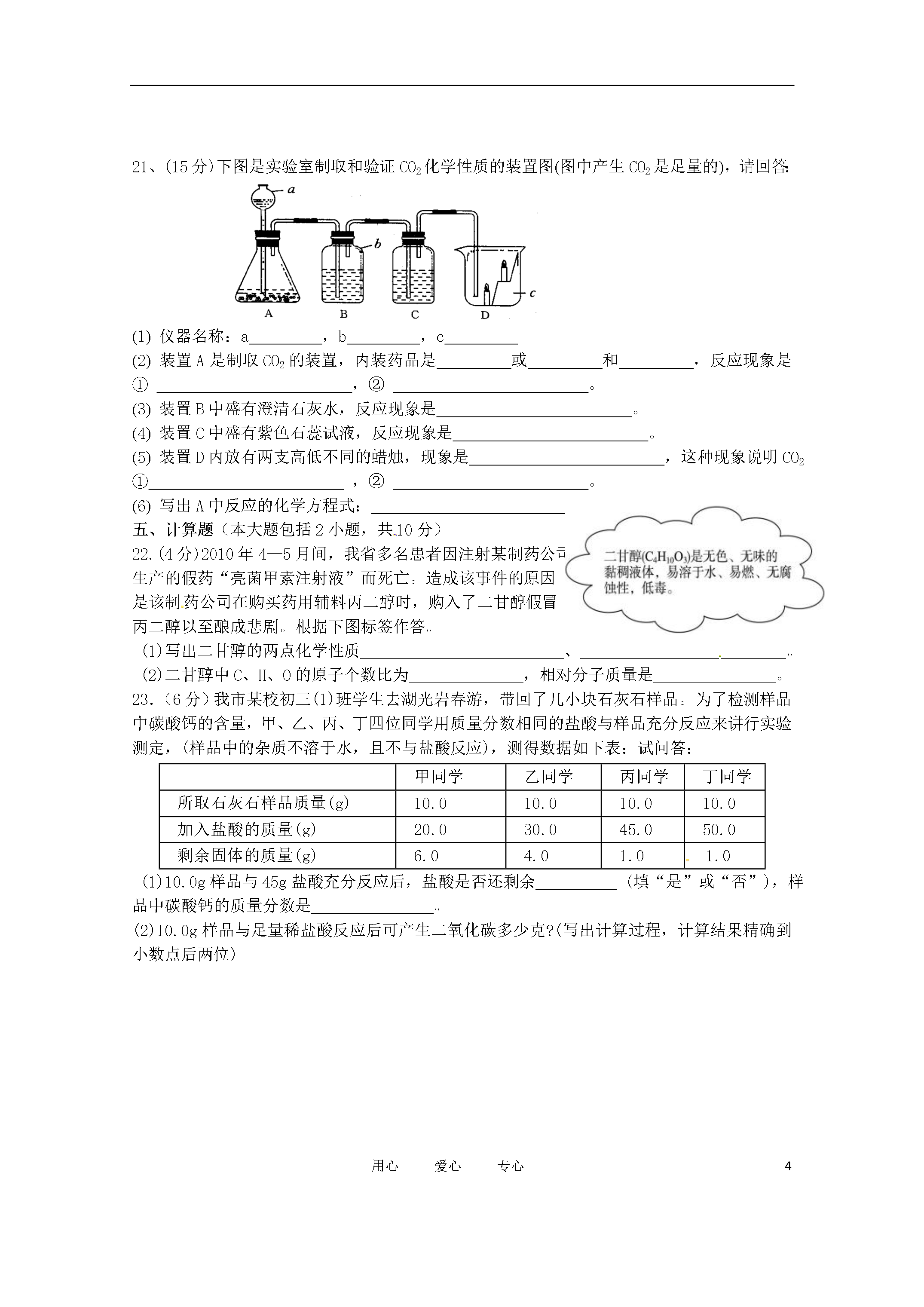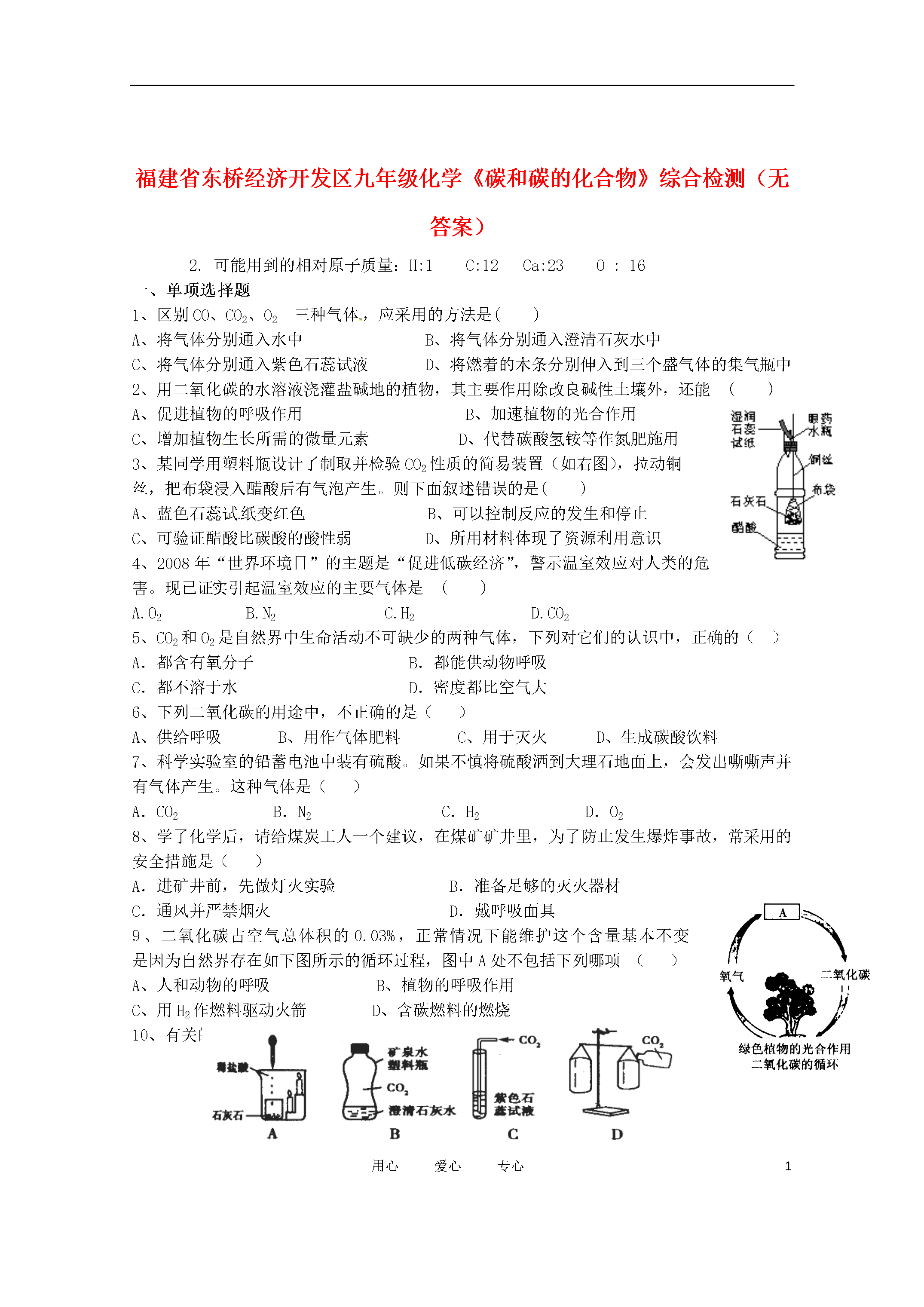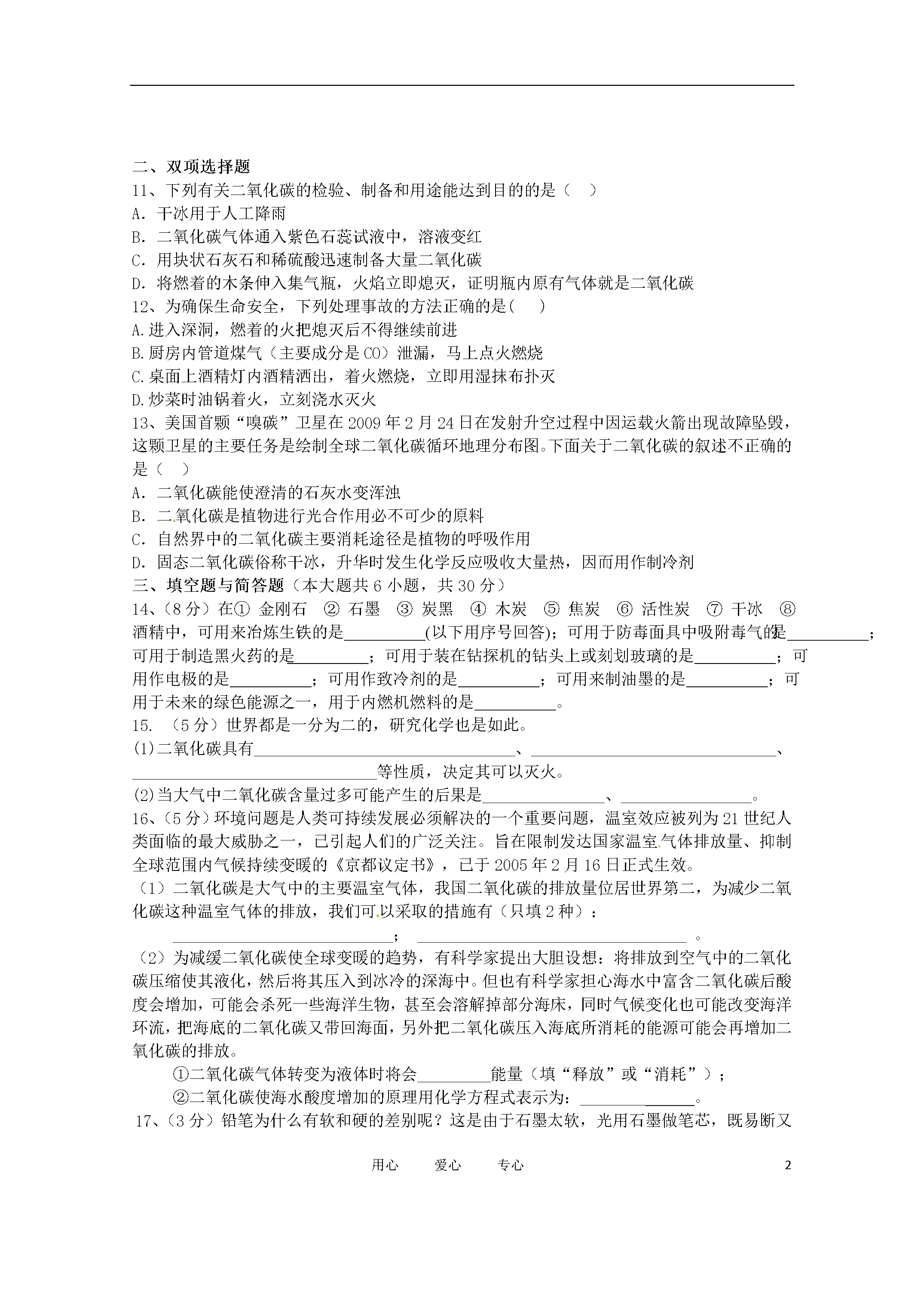 4用心爱心专心福建省东桥经济开发区九年级化学《碳和碳的化合物》综合检测(无答案)2.可能用到的相对原子质量:H:1C:12Ca:23O:16一、单项选择题1、区别CO、CO2、O2三种气体,应采用的方法是()A、将气体分别通入水中B、将气体分别通入澄清石灰水中C、将气体分别通入紫色石蕊试液D、将燃着的木条分别伸入到三个盛气体的集气瓶中2、用二氧化碳的水溶液浇灌盐碱地的植物,其主要作用除改良碱性土壤外,还能()A、促进植物的呼吸作用B、加速植物的光合作用C、增加植物生长所需的微量元素D、代替碳酸氢铵等作氮肥施用3、某同学用塑料瓶设计了制取并检验CO2性质的简易装置(如右图),拉动铜丝,把布袋浸入醋酸后有气泡产生。则下面叙述错误的是()A、蓝色石蕊试纸变红色B、可以控制反应的发生和停止C、可验证醋酸比碳酸的酸性弱D、所用材料体现了资源利用意识4、2008年“世界环境日”的主题是“促进低碳经济”,警示温室效应对人类的危害。现已证实引起温室效应的主要气体是()A.O2B.N2C.H2D.CO25、CO2和O2是自然界中生命活动不可缺少的两种气体,下列对它们的认识中,正确的()A.都含有氧分子B.都能供动物呼吸C.都不溶于水D.密度都比空气大6、下列二氧化碳的用途中,不正确的是()A、供给呼吸B、用作气体肥料C、用于灭火D、生成碳酸饮料7、科学实验室的铅蓄电池中装有硫酸。如果不慎将硫酸洒到大理石地面上,会发出嘶嘶声并有气体产生。这种气体是()A.CO2B.N2C.H2D.O28、学了化学后,请给煤炭工人一个建议,在煤矿矿井里,为了防止发生爆炸事故,常采用的安全措施是()A.进矿井前,先做灯火实验B.准备足够的灭火器材C.通风并严禁烟火D.戴呼吸面具9、二氧化碳占空气总体积的0.03%,正常情况下能维护这个含量基本不变是因为自然界存在如下图所示的循环过程,图中A处不包括下列哪项()A、人和动物的呼吸B、植物的呼吸作用C、用H2作燃料驱动火箭D、含碳燃料的燃烧10、有关的CO2实验如下,只能证明CO2物理性质的是()二、双项选择题11、下列有关二氧化碳的检验、制备和用途能达到目的的是()A.干冰用于人工降雨B.二氧化碳气体通入紫色石蕊试液中,溶液变红C.用块状石灰石和稀硫酸迅速制备大量二氧化碳D.将燃着的木条伸入集气瓶,火焰立即熄灭,证明瓶内原有气体就是二氧化碳12、为确保生命安全,下列处理事故的方法正确的是()A.进入深洞,燃着的火把熄灭后不得继续前进B.厨房内管道煤气(主要成分是CO)泄漏,马上点火燃烧C.桌面上酒精灯内酒精洒出,着火燃烧,立即用湿抹布扑灭D.炒菜时油锅着火,立刻浇水灭火13、美国首颗“嗅碳”卫星在2009年2月24日在发射升空过程中因运载火箭出现故障坠毁,这颗卫星的主要任务是绘制全球二氧化碳循环地理分布图。下面关于二氧化碳的叙述不正确的是()A.二氧化碳能使澄清的石灰水变浑浊B.二氧化碳是植物进行光合作用必不可少的原料C.自然界中的二氧化碳主要消耗途径是植物的呼吸作用D.固态二氧化碳俗称干冰,升华时发生化学反应吸收大量热,因而用作制冷剂三、填空题与简答题(本大题共6小题,共30分)14、(8分)在①金刚石②石墨③炭黑④木炭⑤焦炭⑥活性炭⑦干冰⑧酒精中,可用来冶炼生铁的是以下用序号回答;可用于防毒面具中吸附毒气的是;可用于制造黑火药的是;可用于装在钻探机的钻头上或刻划玻璃的是;可用作电极的是;可用作致冷剂的是;可用来制油墨的是;可用于未来的绿色能源之一,用于内燃机燃料的是。15.(5分)世界都是一分为二的,研究化学也是如此。(1)二氧化碳具有________________________________、______________________________、______________________________等性质,决定其可以灭火。(2)当大气中二氧化碳含量过多可能产生的后果是_______________、________________。16、(5分)环境问题是人类可持续发展必须解决的一个重要问题,温室效应被列为21世纪人类面临的最大威胁之一,已引起人们的广泛关注。旨在限制发达国家温室气体排放量、抑制全球范围内气候持续变暖的《京都议定书》,已于2005年2月16日正式生效。(1)二氧化碳是大气中的主要温室气体,我国二氧化碳的排放量位居世界第二,为减少二氧化碳这种温室气体的排放,我们可以采取的措施有(只填2种):___________________________;_________________________________。(2)为减缓二氧化碳使全球变暖的趋势,有科学家提出大胆设想:将排放到空气中的二氧化碳压缩使其液化,然后将其压入到冰冷的深海中。但也有科学家担心海水中富含二氧化碳后酸度
