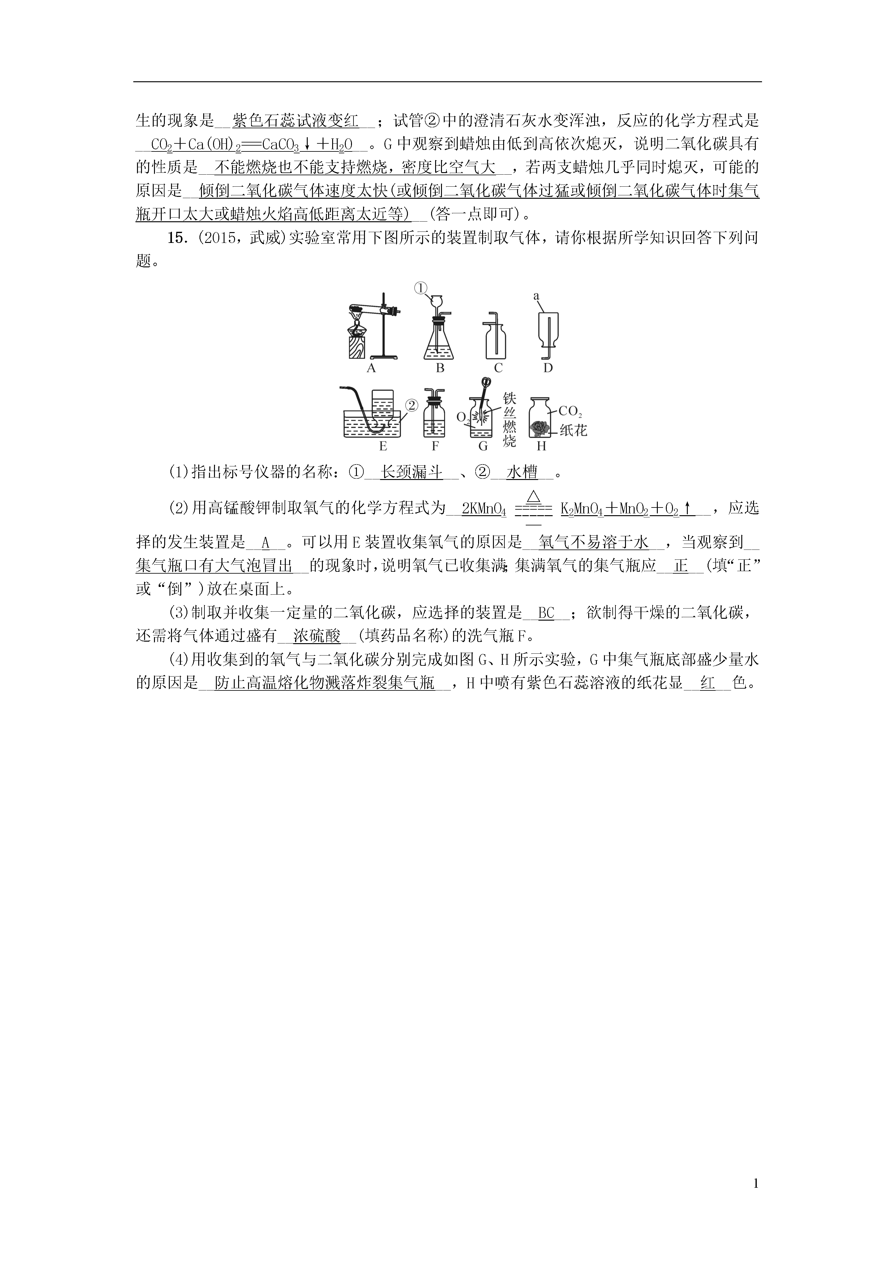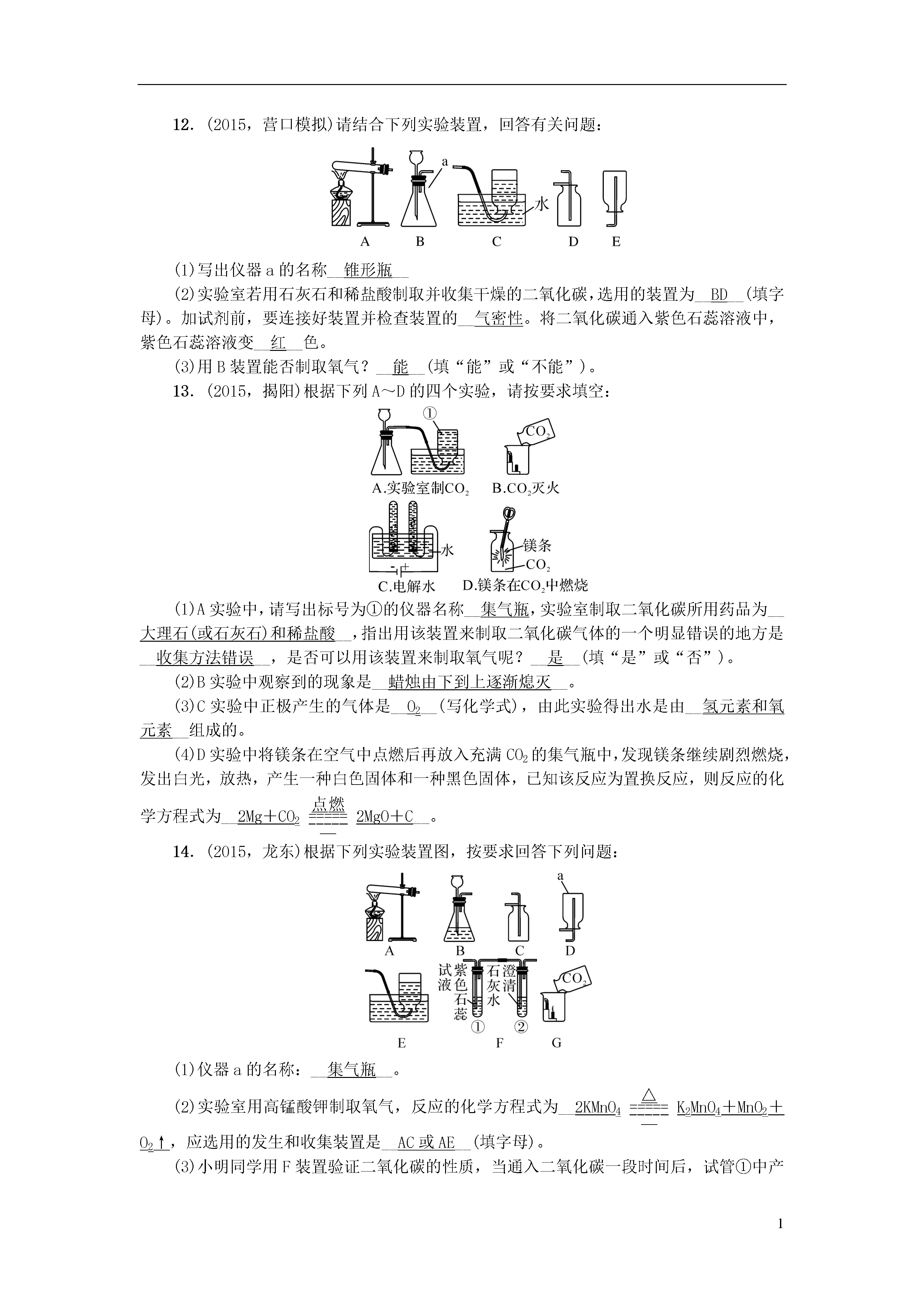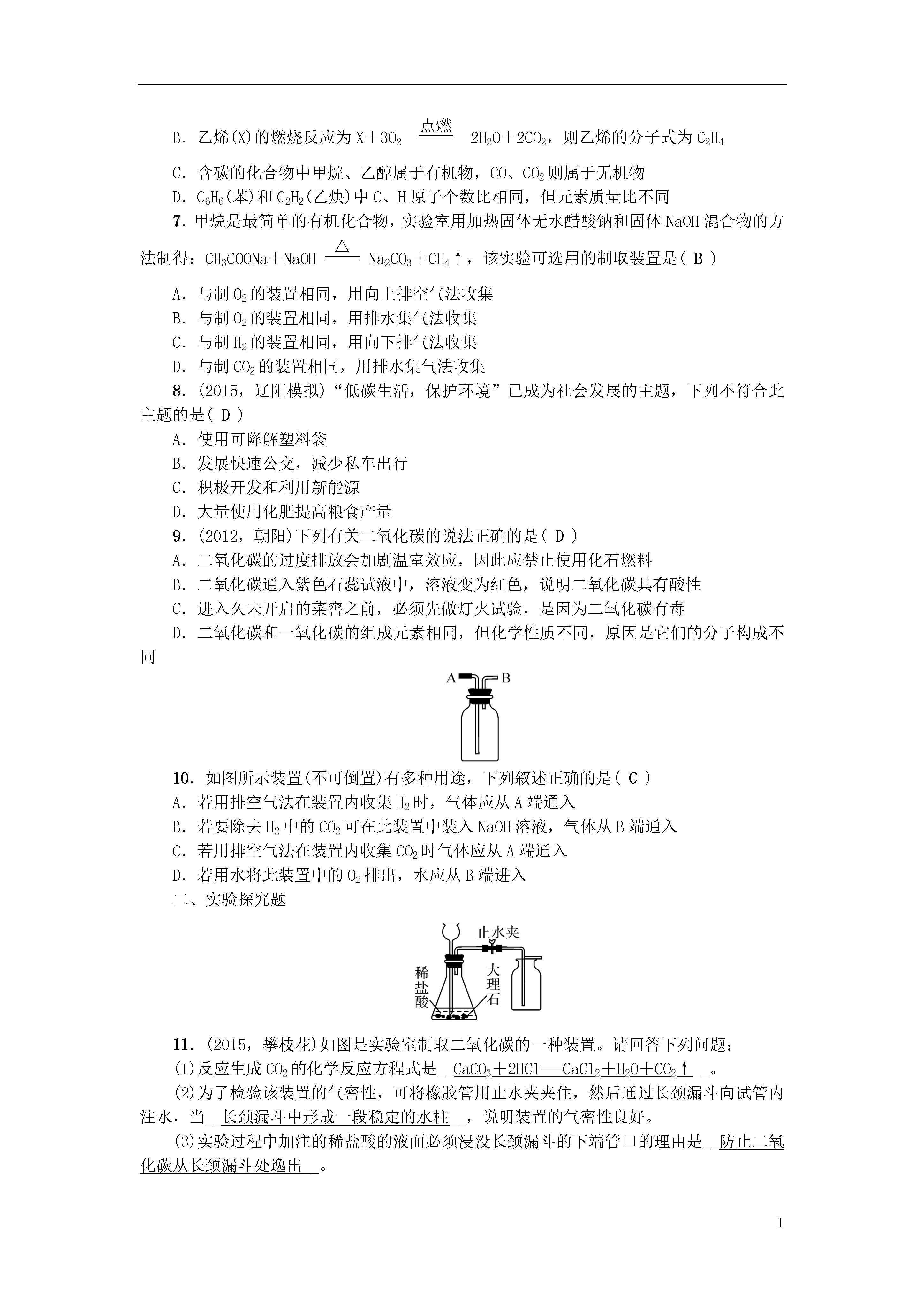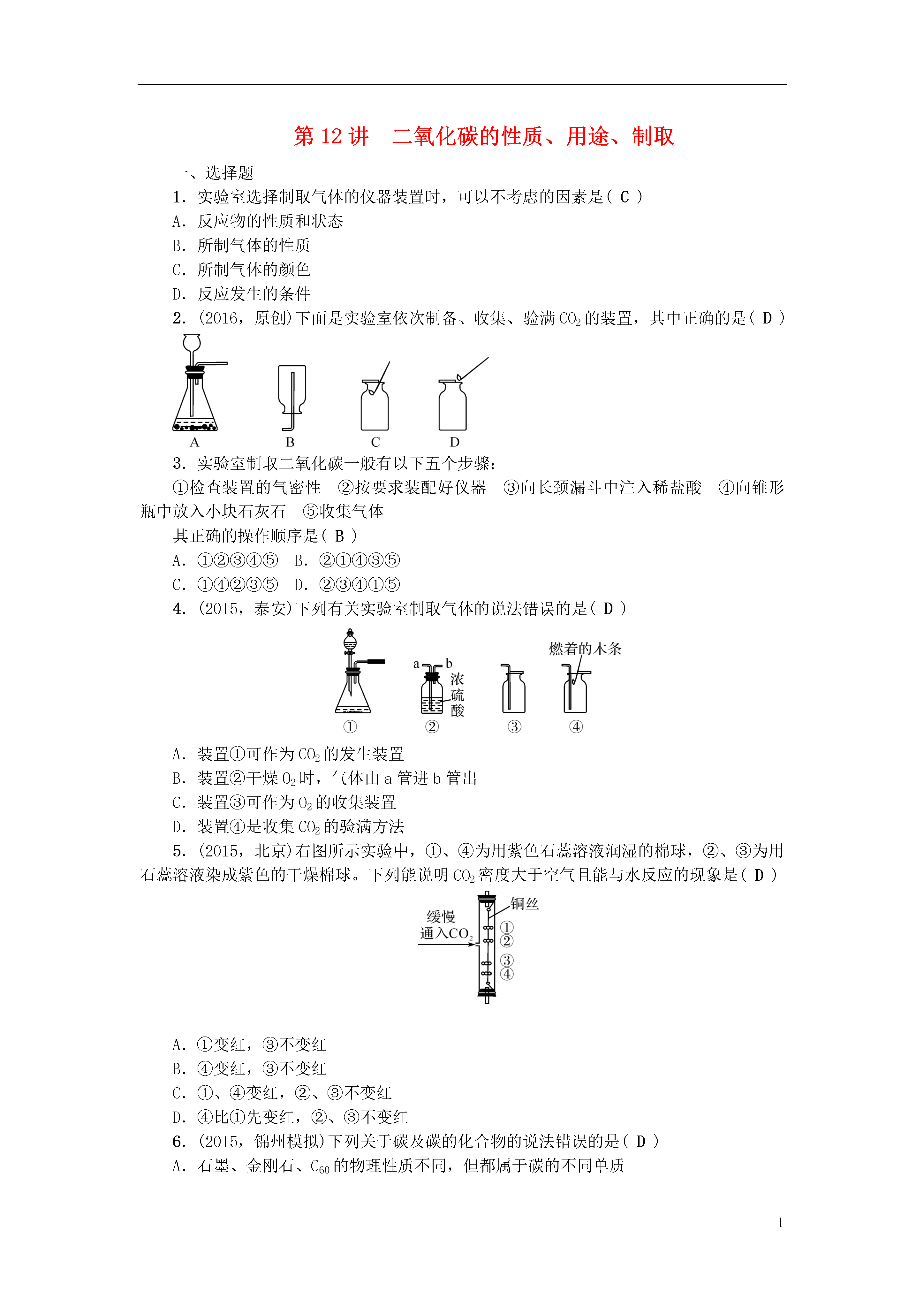 1第12讲二氧化碳的性质、用途、制取一、选择题1.实验室选择制取气体的仪器装置时,可以不考虑的因素是(C)A.反应物的性质和状态B.所制气体的性质C.所制气体的颜色D.反应发生的条件2.(2016,原创)下面是实验室依次制备、收集、验满CO2的装置,其中正确的是(D)3.实验室制取二氧化碳一般有以下五个步骤:①检查装置的气密性②按要求装配好仪器③向长颈漏斗中注入稀盐酸④向锥形瓶中放入小块石灰石⑤收集气体其正确的操作顺序是(B)A.①②③④⑤B.②①④③⑤C.①④②③⑤D.②③④①⑤4.(2015,泰安)下列有关实验室制取气体的说法错误的是(D)A.装置①可作为CO2的发生装置B.装置②干燥O2时,气体由a管进b管出C.装置③可作为O2的收集装置D.装置④是收集CO2的验满方法5.(2015,北京)右图所示实验中,①、④为用紫色石蕊溶液润湿的棉球,②、③为用石蕊溶液染成紫色的干燥棉球。下列能说明CO2密度大于空气且能与水反应的现象是(D)A.①变红,③不变红B.④变红,③不变红C.①、④变红,②、③不变红D.④比①先变红,②、③不变红6.(2015,锦州模拟)下列关于碳及碳的化合物的说法错误的是(D)A.石墨、金刚石、C60的物理性质不同,但都属于碳的不同单质B.乙烯(X)的燃烧反应为X+3O2eq\o(=====,\s\up7(点燃))2H2O+2CO2,则乙烯的分子式为C2H4C.含碳的化合物中甲烷、乙醇属于有机物,CO、CO2则属于无机物D.C6H6(苯)和C2H2(乙炔)中C、H原子个数比相同,但元素质量比不同7.甲烷是最简单的有机化合物,实验室用加热固体无水醋酸钠和固体NaOH混合物的方法制得:CH3COONa+NaOHeq\o(=====,\s\up7(△))Na2CO3+CH4↑,该实验可选用的制取装置是(B)A.与制O2的装置相同,用向上排空气法收集B.与制O2的装置相同,用排水集气法收集C.与制H2的装置相同,用向下排气法收集D.与制CO2的装置相同,用排水集气法收集8.(2015,辽阳模拟)“低碳生活,保护环境”已成为社会发展的主题,下列不符合此主题的是(D)A.使用可降解塑料袋B.发展快速公交,减少私车出行C.积极开发和利用新能源D.大量使用化肥提高粮食产量9.(2012,朝阳)下列有关二氧化碳的说法正确的是(D)A.二氧化碳的过度排放会加剧温室效应,因此应禁止使用化石燃料B.二氧化碳通入紫色石蕊试液中,溶液变为红色,说明二氧化碳具有酸性C.进入久未开启的菜窖之前,必须先做灯火试验,是因为二氧化碳有毒D.二氧化碳和一氧化碳的组成元素相同,但化学性质不同,原因是它们的分子构成不同10.如图所示装置(不可倒置)有多种用途,下列叙述正确的是(C)A.若用排空气法在装置内收集H2时,气体应从A端通入B.若要除去H2中的CO2可在此装置中装入NaOH溶液,气体从B端通入C.若用排空气法在装置内收集CO2时气体应从A端通入D.若用水将此装置中的O2排出,水应从B端进入二、实验探究题11.(2015,攀枝花)如图是实验室制取二氧化碳的一种装置。请回答下列问题:(1)反应生成CO2的化学反应方程式是__CaCO3+2HCl===CaCl2+H2O+CO2↑__。(2)为了检验该装置的气密性,可将橡胶管用止水夹夹住,然后通过长颈漏斗向试管内注水,当__长颈漏斗中形成一段稳定的水柱__,说明装置的气密性良好。(3)实验过程中加注的稀盐酸的液面必须浸没长颈漏斗的下端管口的理由是__防止二氧化碳从长颈漏斗处逸出__。12.(2015,营口模拟)请结合下列实验装置,回答有关问题:(1)写出仪器a的名称__锥形瓶__(2)实验室若用石灰石和稀盐酸制取并收集干燥的二氧化碳,选用的装置为__BD__(填字母)。加试剂前,要连接好装置并检查装置的__气密性。将二氧化碳通入紫色石蕊溶液中,紫色石蕊溶液变__红__色。(3)用B装置能否制取氧气?__能__(填“能”或“不能”)。13.(2015,揭阳)根据下列A~D的四个实验,请按要求填空:(1)A实验中,请写出标号为①的仪器名称__集气瓶,实验室制取二氧化碳所用药品为__大理石(或石灰石)和稀盐酸__,指出用该装置来制取二氧化碳气体的一个明显错误的地方是__收集方法错误__,是否可以用该装置来制取氧气呢?__是__(填“是”或“否”)。(2)B实验中观察到的现象是__蜡烛由下到上逐渐熄灭__。(3)C实验中正极产生的气体是__O2__(写化学式),由此实验得出水是由__氢元素和氧元素__组成的。(4)D实验中将镁条在空气中点燃后