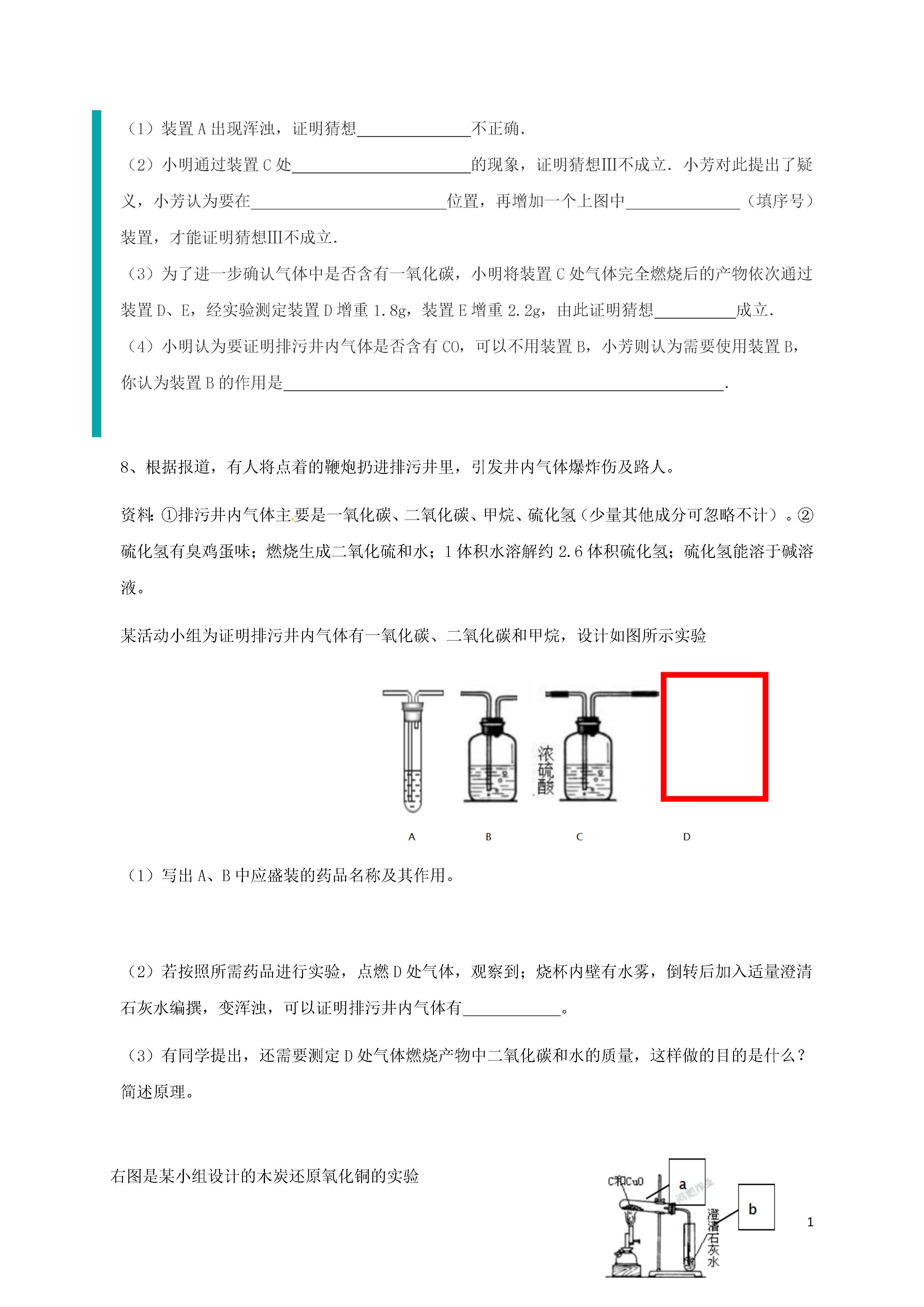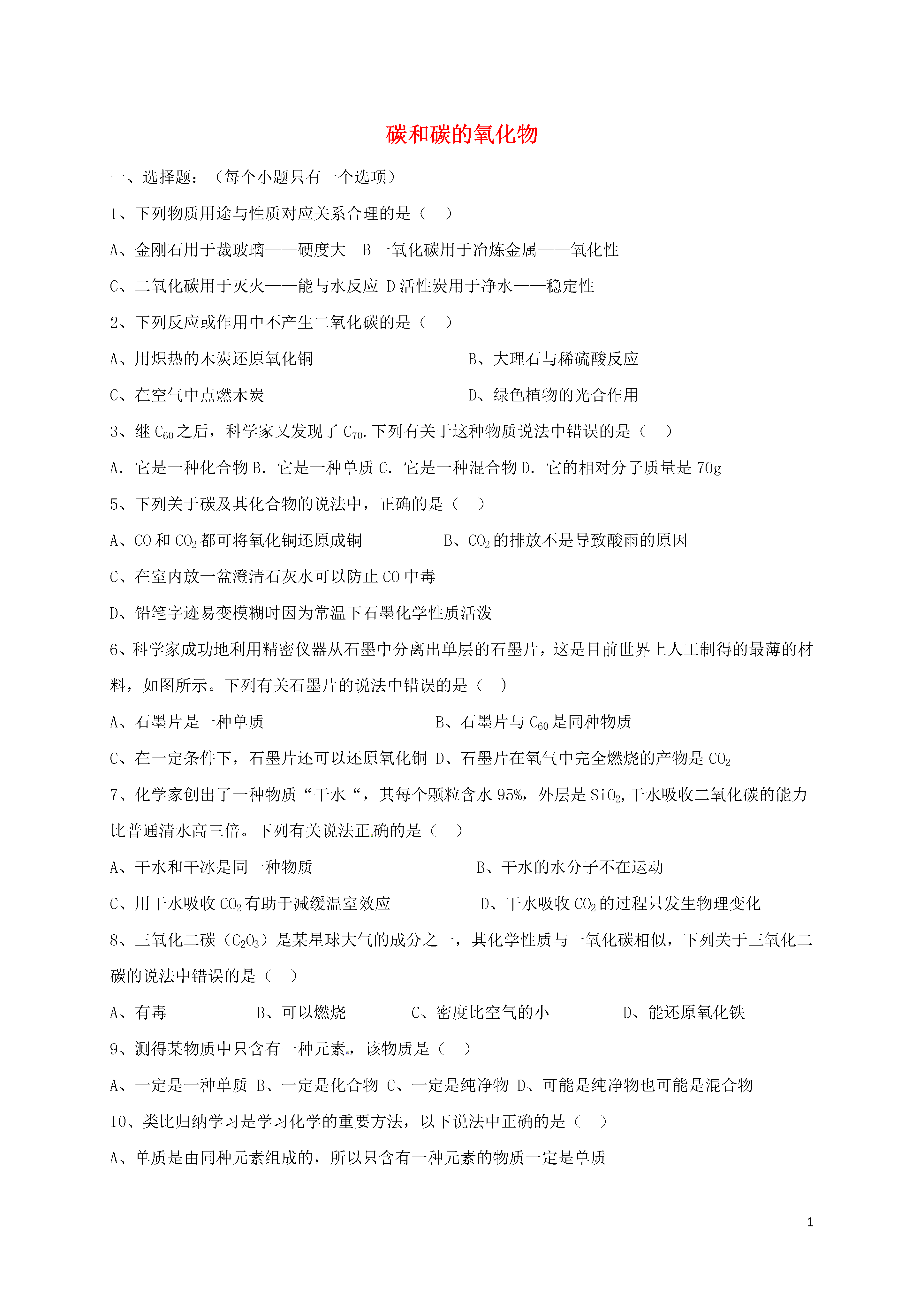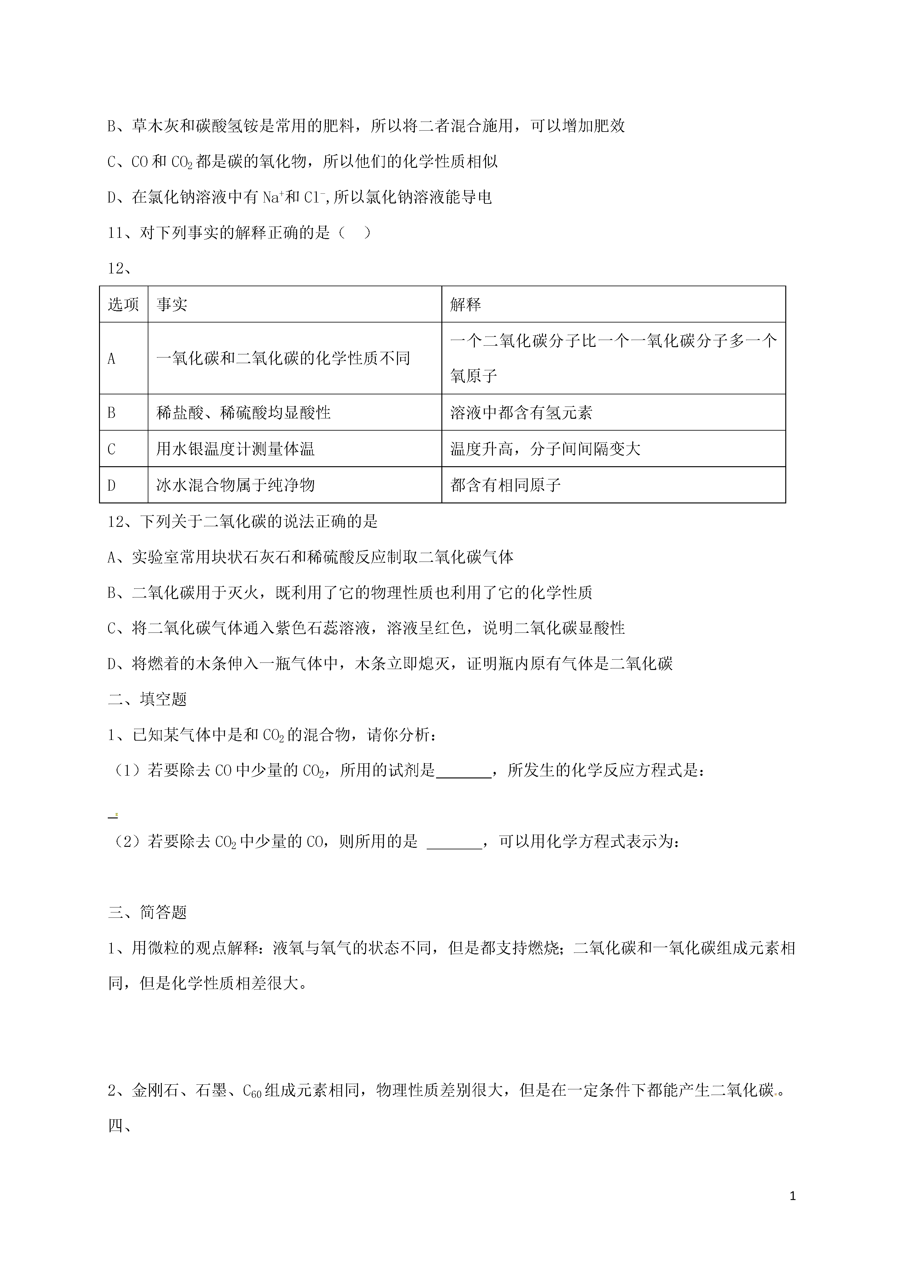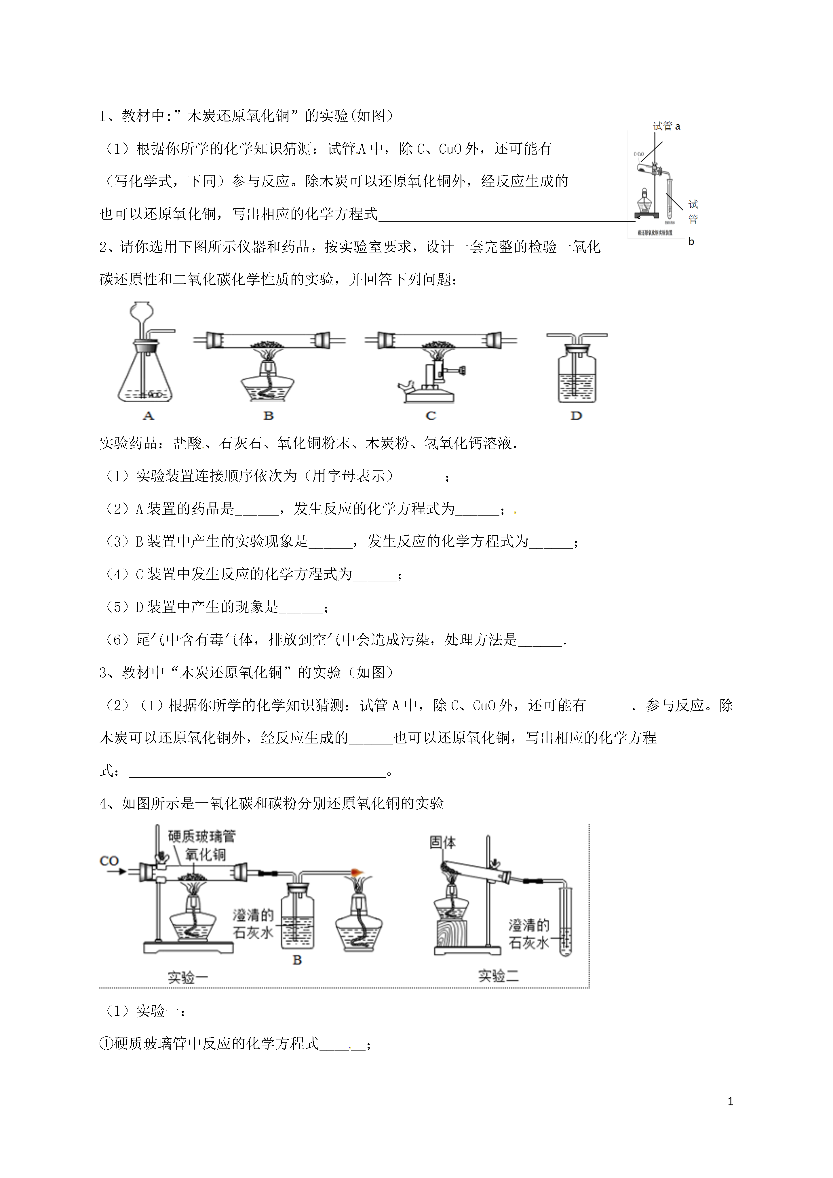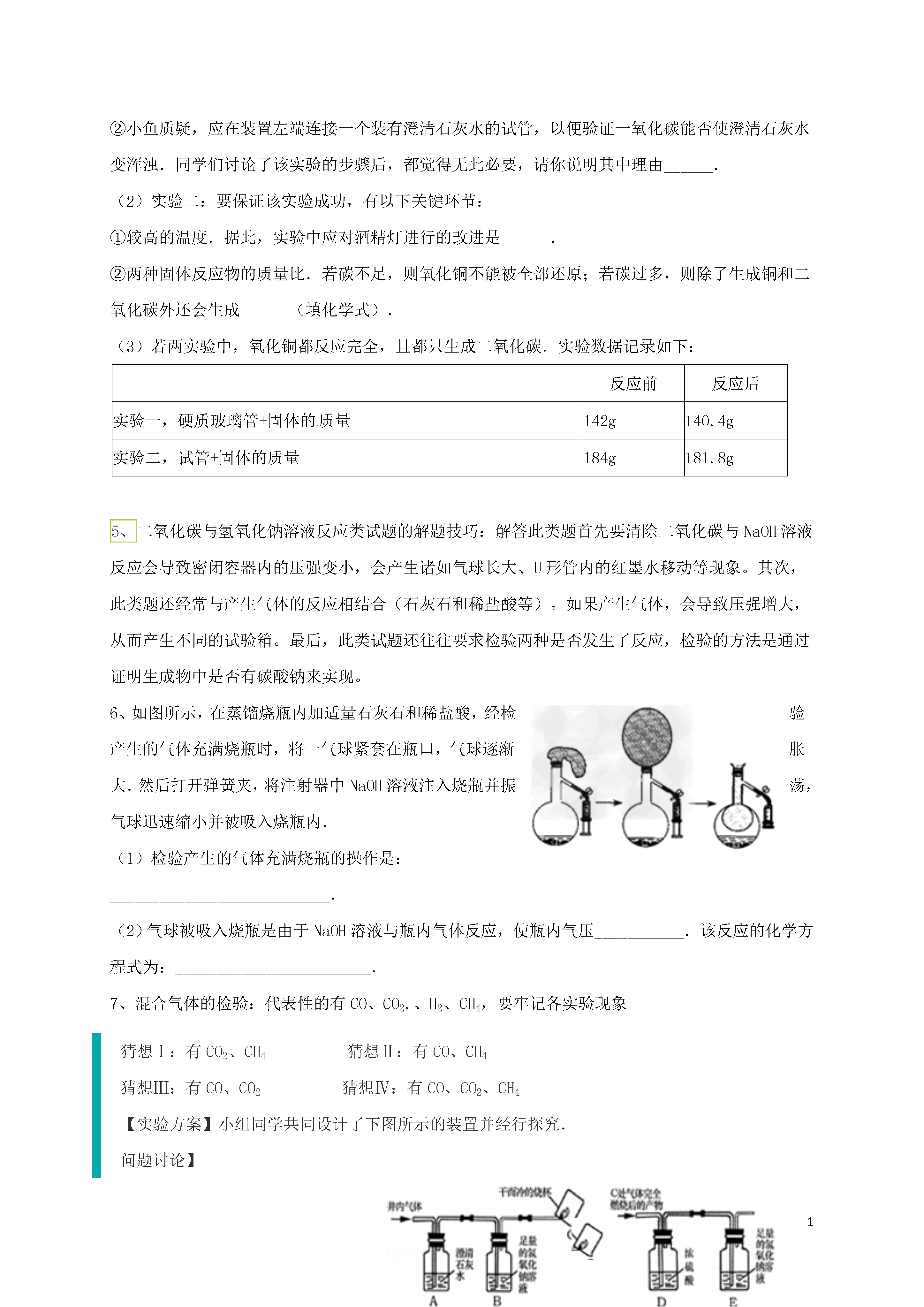 1碳和碳的氧化物一、选择题:(每个小题只有一个选项)下列物质用途与性质对应关系合理的是()金刚石用于裁玻璃——硬度大B一氧化碳用于冶炼金属——氧化性C、二氧化碳用于灭火——能与水反应D活性炭用于净水——稳定性下列反应或作用中不产生二氧化碳的是()用炽热的木炭还原氧化铜B、大理石与稀硫酸反应C、在空气中点燃木炭D、绿色植物的光合作用3、继C60之后,科学家又发现了C70.下列有关于这种物质说法中错误的是()它是一种化合物B.它是一种单质C.它是一种混合物D.它的相对分子质量是70g下列关于碳及其化合物的说法中,正确的是()CO和CO2都可将氧化铜还原成铜B、CO2的排放不是导致酸雨的原因C、在室内放一盆澄清石灰水可以防止CO中毒D、铅笔字迹易变模糊时因为常温下石墨化学性质活泼科学家成功地利用精密仪器从石墨中分离出单层的石墨片,这是目前世界上人工制得的最薄的材料,如图所示。下列有关石墨片的说法中错误的是()石墨片是一种单质B、石墨片与C60是同种物质C、在一定条件下,石墨片还可以还原氧化铜D、石墨片在氧气中完全燃烧的产物是CO2化学家创出了一种物质“干水“,其每个颗粒含水95%,外层是SiO2,干水吸收二氧化碳的能力比普通清水高三倍。下列有关说法正确的是()干水和干冰是同一种物质B、干水的水分子不在运动C、用干水吸收CO2有助于减缓温室效应D、干水吸收CO2的过程只发生物理变化三氧化二碳(C2O3)是某星球大气的成分之一,其化学性质与一氧化碳相似,下列关于三氧化二碳的说法中错误的是()有毒B、可以燃烧C、密度比空气的小D、能还原氧化铁测得某物质中只含有一种元素,该物质是()一定是一种单质B、一定是化合物C、一定是纯净物D、可能是纯净物也可能是混合物类比归纳学习是学习化学的重要方法,以下说法中正确的是()单质是由同种元素组成的,所以只含有一种元素的物质一定是单质草木灰和碳酸氢铵是常用的肥料,所以将二者混合施用,可以增加肥效CO和CO2都是碳的氧化物,所以他们的化学性质相似在氯化钠溶液中有Na+和Cl-,所以氯化钠溶液能导电对下列事实的解释正确的是()选项事实解释A一氧化碳和二氧化碳的化学性质不同一个二氧化碳分子比一个一氧化碳分子多一个氧原子B稀盐酸、稀硫酸均显酸性溶液中都含有氢元素C用水银温度计测量体温温度升高,分子间间隔变大D冰水混合物属于纯净物都含有相同原子下列关于二氧化碳的说法正确的是实验室常用块状石灰石和稀硫酸反应制取二氧化碳气体二氧化碳用于灭火,既利用了它的物理性质也利用了它的化学性质将二氧化碳气体通入紫色石蕊溶液,溶液呈红色,说明二氧化碳显酸性将燃着的木条伸入一瓶气体中,木条立即熄灭,证明瓶内原有气体是二氧化碳填空题已知某气体中是和CO2的混合物,请你分析:若要除去CO中少量的CO2,所用的试剂是,所发生的化学反应方程式是:若要除去CO2中少量的CO,则所用的是,可以用化学方程式表示为:简答题1、用微粒的观点解释:液氧与氧气的状态不同,但是都支持燃烧;二氧化碳和一氧化碳组成元素相同,但是化学性质相差很大。2、金刚石、石墨、C60组成元素相同,物理性质差别很大,但是在一定条件下都能产生二氧化碳。1、教材中:”木炭还原氧化铜”的实验(如图)根据你所学的化学知识猜测:试管A中,除C、CuO外,还可能有(写化学式,下同)参与反应。除木炭可以还原氧化铜外,经反应生成的也可以还原氧化铜,写出相应的化学方程式。请你选用下图所示仪器和药品,按实验室要求,设计一套完整的检验一氧化碳还原性和二氧化碳化学性质的实验,并回答下列问题:实验药品:盐酸、石灰石、氧化铜粉末、木炭粉、氢氧化钙溶液.(1)实验装置连接顺序依次为(用字母表示)______;(2)A装置的药品是______,发生反应的化学方程式为______;(3)B装置中产生的实验现象是______,发生反应的化学方程式为______;(4)C装置中发生反应的化学方程式为______;(5)D装置中产生的现象是______;(6)尾气中含有毒气体,排放到空气中会造成污染,处理方法是______.教材中“木炭还原氧化铜”的实验(如图)(1)根据你所学的化学知识猜测:试管A中,除C、CuO外,还可能有______.参与反应。除木炭可以还原氧化铜外,经反应生成的______也可以还原氧化铜,写出相应的化学方程式:。4、如图所示是一氧化碳和碳粉分别还原氧化铜的实验(1)实验一:①硬质玻璃管中反应的化学方程式______;②小鱼质疑,应在装置左端连接一个装有澄清石灰水的试管,以便验证一氧化碳能否使澄清石灰水变浑浊.同学们讨论了该实验的步骤后,都觉得无此必要,请你说明其中理由
