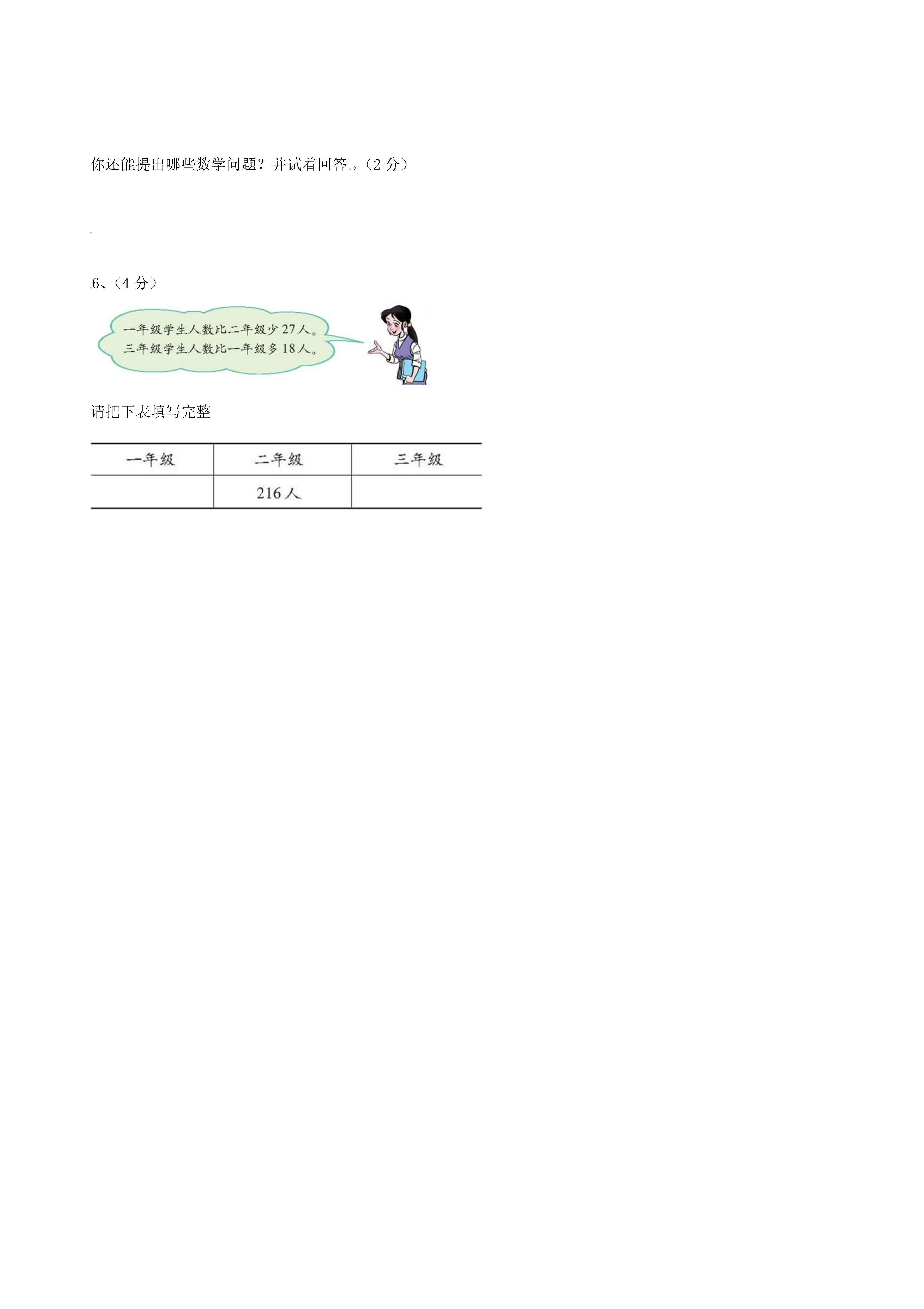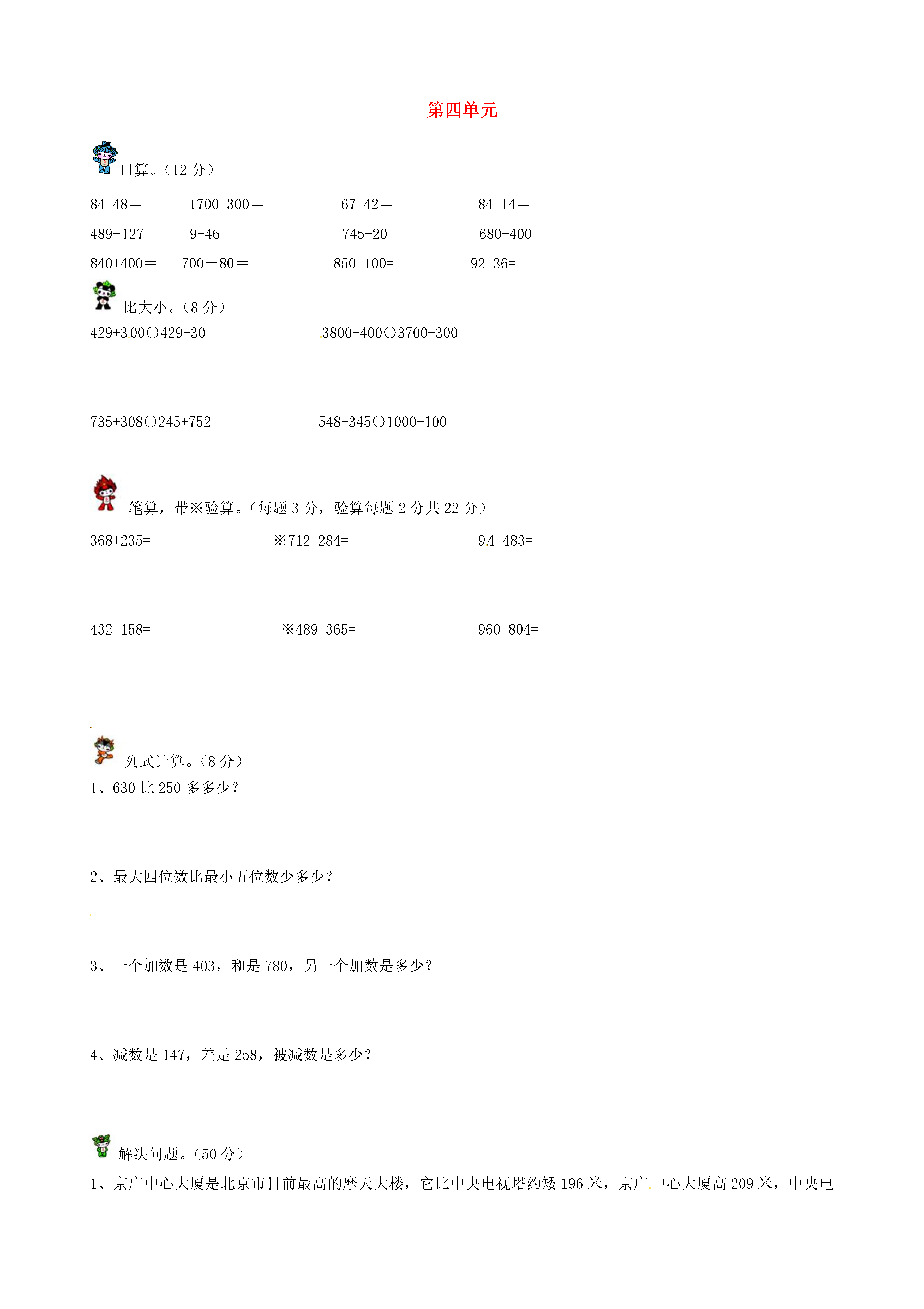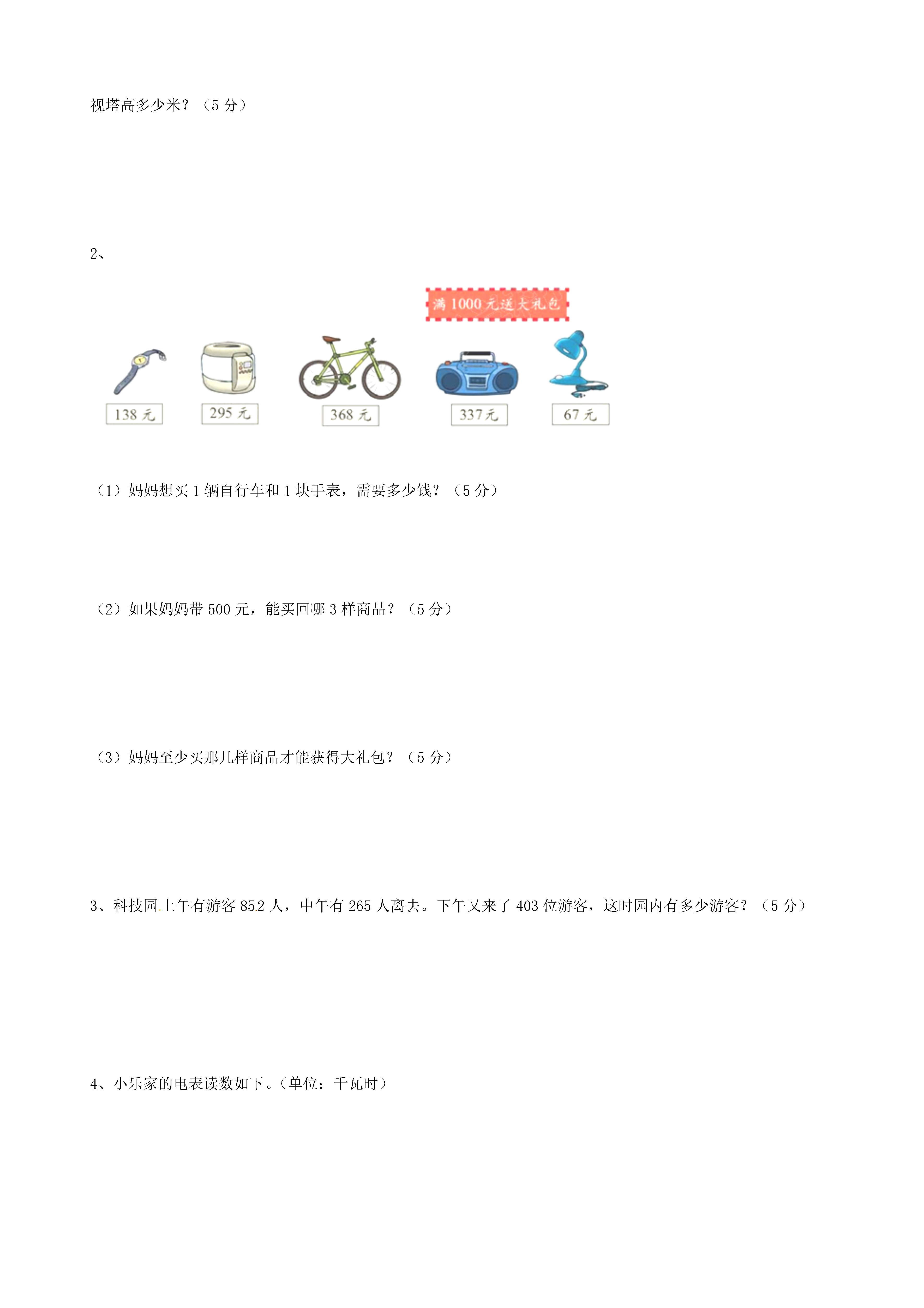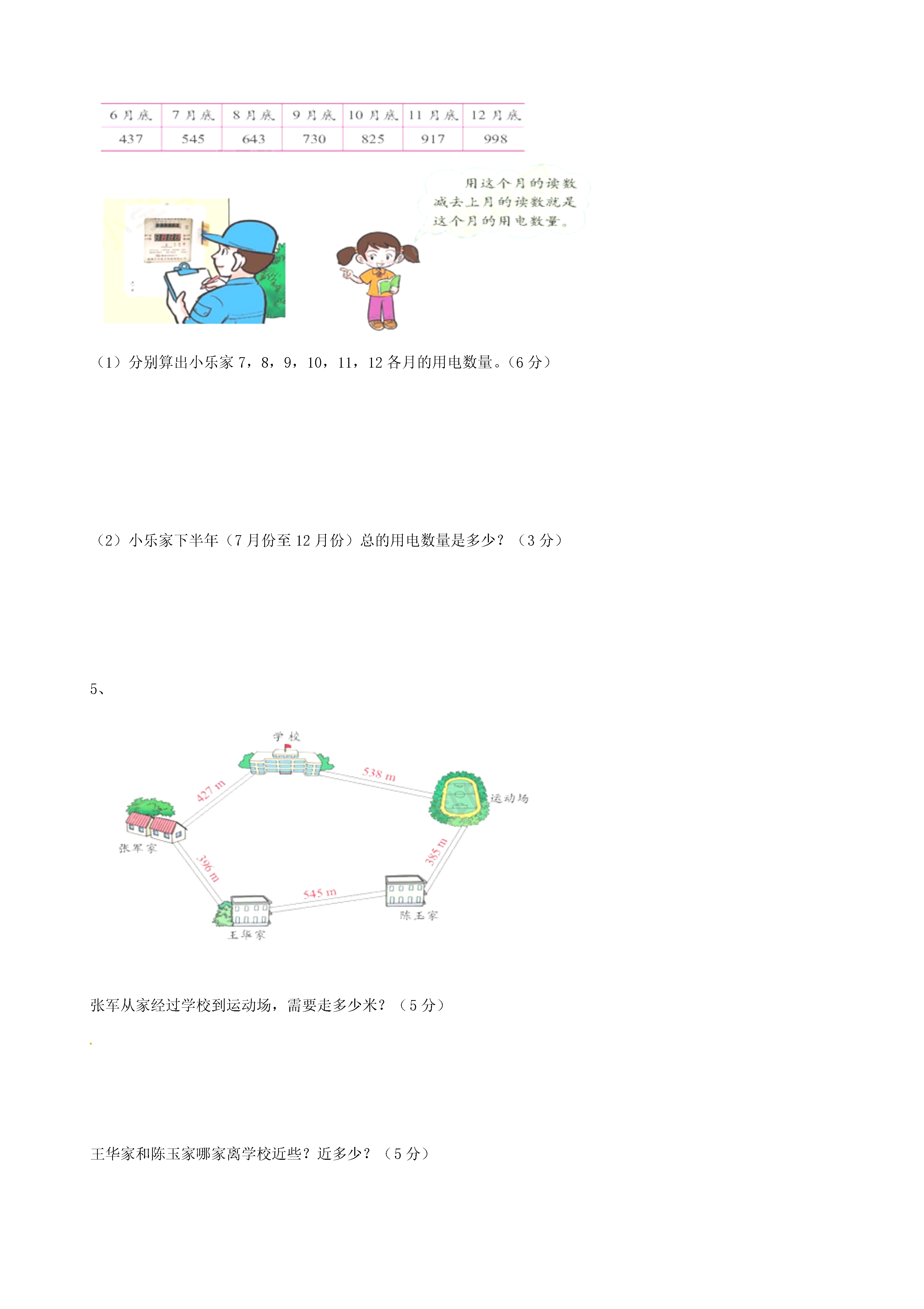 第四单元口算。(12分)84-48=1700+300=67-42=84+14=489-127=9+46=745-20=680-400=840+400=700-80=850+100=92-36=比大小。(8分)429+300○429+303800-400○3700-300735+308○245+752548+345○1000-100笔算,带※验算。(每题3分,验算每题2分共22分)368+235=※712-284=94+483=432-158=※489+365=960-804=列式计算。(8分)1、630比250多多少?2、最大四位数比最小五位数少多少?3、一个加数是403,和是780,另一个加数是多少?4、减数是147,差是258,被减数是多少?解决问题。(50分)1、京广中心大厦是北京市目前最高的摩天大楼,它比中央电视塔约矮196米,京广中心大厦高209米,中央电视塔高多少米?(5分)2、(1)妈妈想买1辆自行车和1块手表,需要多少钱?(5分)(2)如果妈妈带500元,能买回哪3样商品?(5分)(3)妈妈至少买那几样商品才能获得大礼包?(5分)3、科技园上午有游客852人,中午有265人离去。下午又来了403位游客,这时园内有多少游客?(5分)4、小乐家的电表读数如下。(单位:千瓦时)(1)分别算出小乐家7,8,9,10,11,12各月的用电数量。(6分)(2)小乐家下半年(7月份至12月份)总的用电数量是多少?(3分)5、张军从家经过学校到运动场,需要走多少米?(5分)王华家和陈玉家哪家离学校近些?近多少?(5分)你还能提出哪些数学问题?并试着回答。(2分)6、(4分)请把下表填写完整