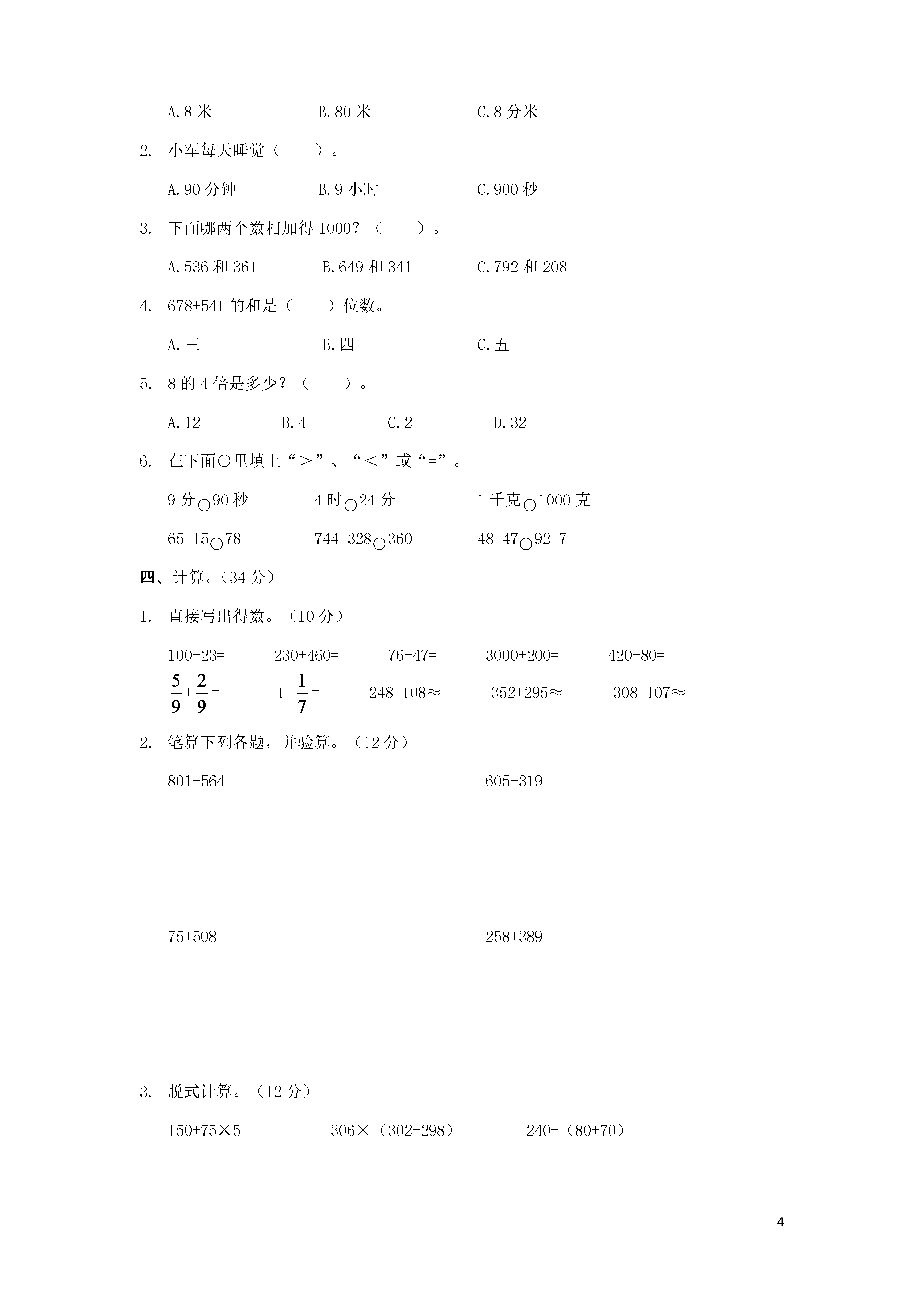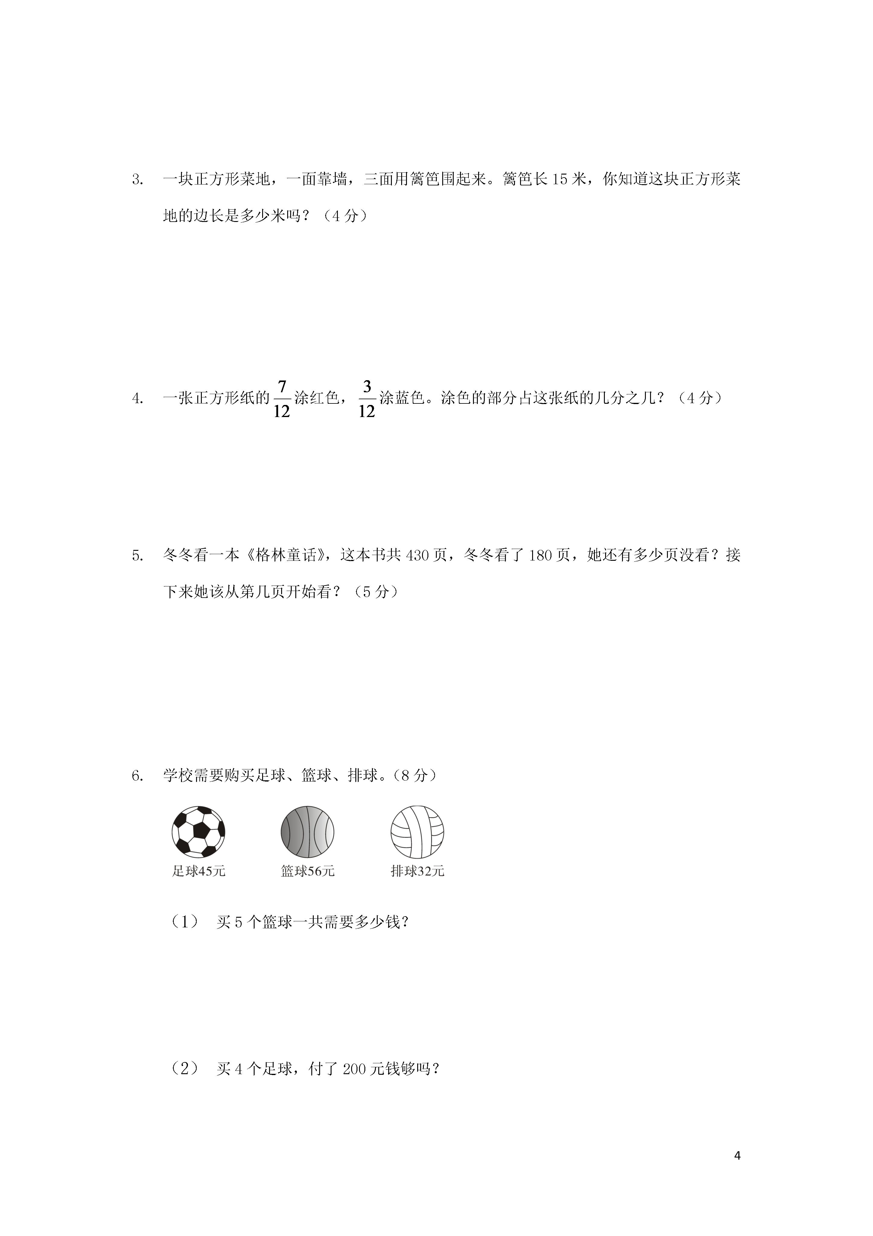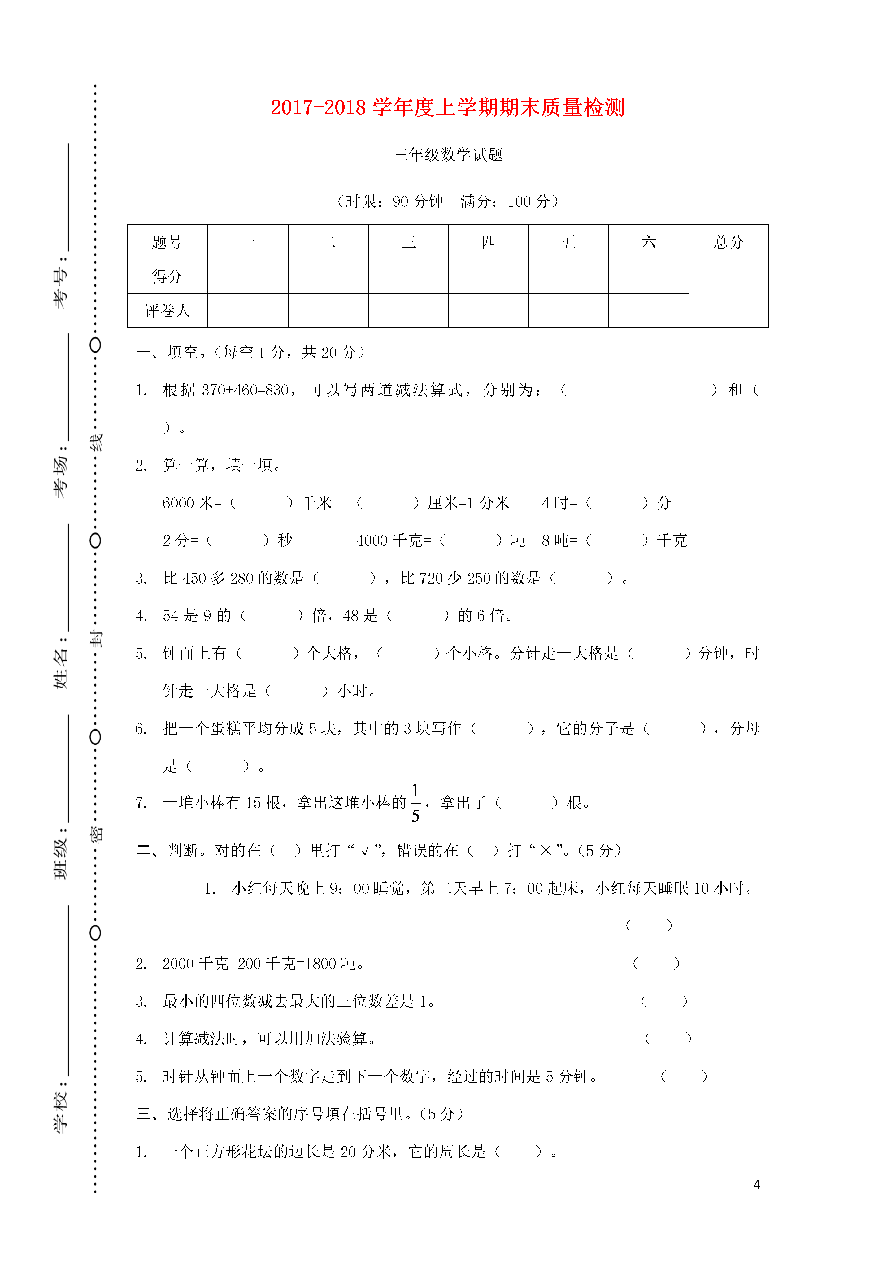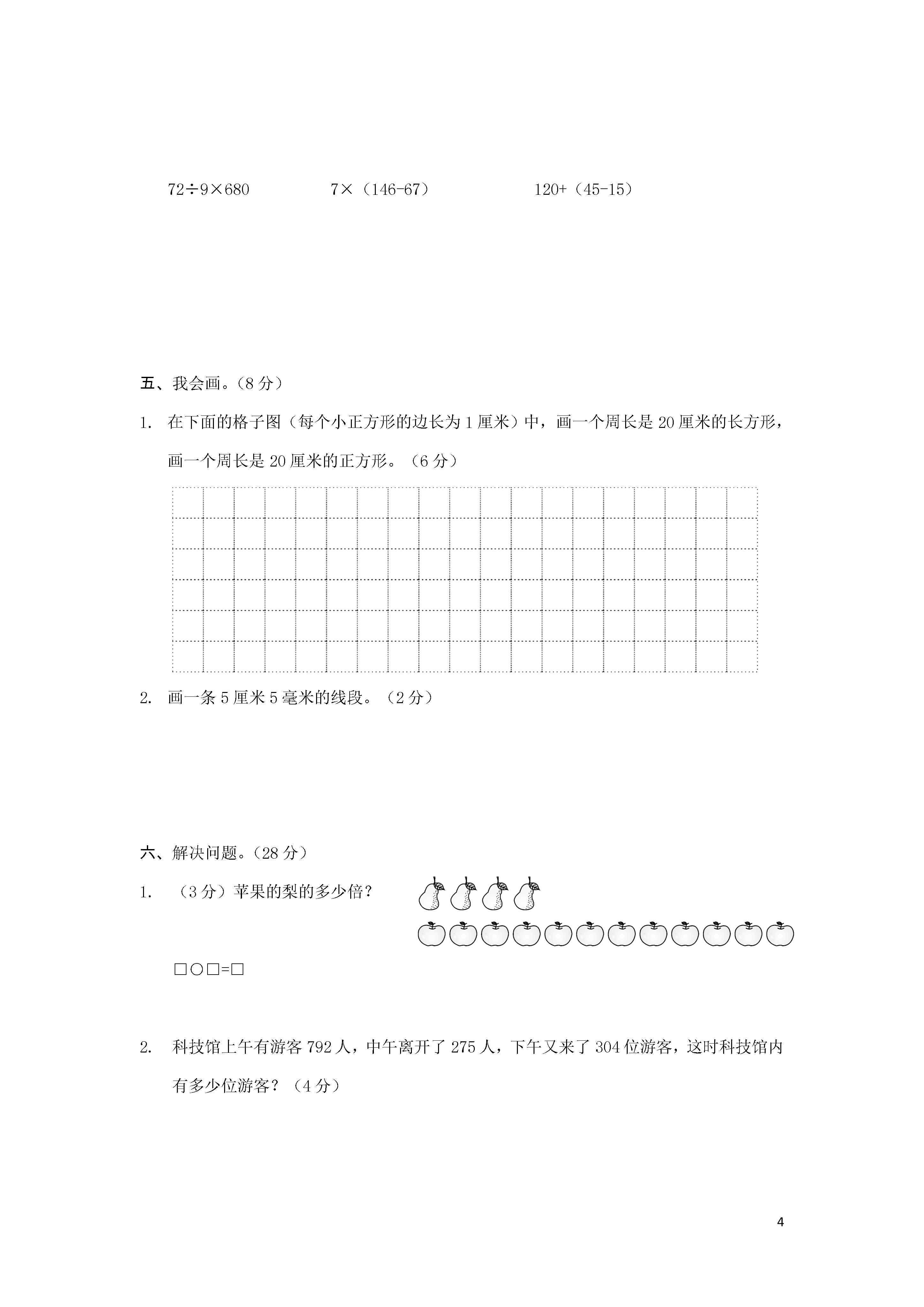 42017-2018学年度上学期期末质量检测三年级数学试题(时限:90分钟满分:100分)题号一二三四五六总分得分评卷人填空。(每空1分,共20分)根据370+460=830,可以写两道减法算式,分别为:()和()。算一算,填一填。6000米=()千米()厘米=1分米4时=()分2分=()秒4000千克=()吨8吨=()千克比450多280的数是(),比720少250的数是()。54是9的()倍,48是()的6倍。钟面上有()个大格,()个小格。分针走一大格是()分钟,时针走一大格是()小时。把一个蛋糕平均分成5块,其中的3块写作(),它的分子是(),分母是()。一堆小棒有15根,拿出这堆小棒的,拿出了()根。判断。对的在()里打“√”,错误的在()打“×”。(5分)小红每天晚上9:00睡觉,第二天早上7:00起床,小红每天睡眠10小时。()2000千克-200千克=1800吨。()最小的四位数减去最大的三位数差是1。()计算减法时,可以用加法验算。()时针从钟面上一个数字走到下一个数字,经过的时间是5分钟。()选择将正确答案的序号填在括号里。(5分)一个正方形花坛的边长是20分米,它的周长是()。A.8米B.80米C.8分米小军每天睡觉()。A.90分钟B.9小时C.900秒下面哪两个数相加得1000?()。A.536和361B.649和341C.792和208678+541的和是()位数。A.三B.四C.五8的4倍是多少?()。A.12B.4C.2D.32在下面○里填上“>”、“<”或“=”。9分○90秒4时○24分1千克○1000克65-15○78744-328○36048+47○92-7计算。(34分)直接写出得数。(10分)100-23=230+460=76-47=3000+200=420-80=+=1-=248-108≈352+295≈308+107≈笔算下列各题,并验算。(12分)801-564605-31975+508258+389脱式计算。(12分)150+75×5306×(302-298)240-(80+70)72÷9×6807×(146-67)120+(45-15)我会画。(8分)在下面的格子图(每个小正方形的边长为1厘米)中,画一个周长是20厘米的长方形,画一个周长是20厘米的正方形。(6分)画一条5厘米5毫米的线段。(2分)解决问题。(28分)(3分)苹果的梨的多少倍?□○□=□科技馆上午有游客792人,中午离开了275人,下午又来了304位游客,这时科技馆内有多少位游客?(4分)一块正方形菜地,一面靠墙,三面用篱笆围起来。篱笆长15米,你知道这块正方形菜地的边长是多少米吗?(4分)一张正方形纸的涂红色,涂蓝色。涂色的部分占这张纸的几分之几?(4分)冬冬看一本《格林童话》,这本书,冬冬看了180页,她还有多少页没看?接下来她该从第几页开始看?(5分)学校需要购买足球、篮球、排球。(8分)买5个篮球一共需要多少钱?买4个足球,付了200元钱够吗?
