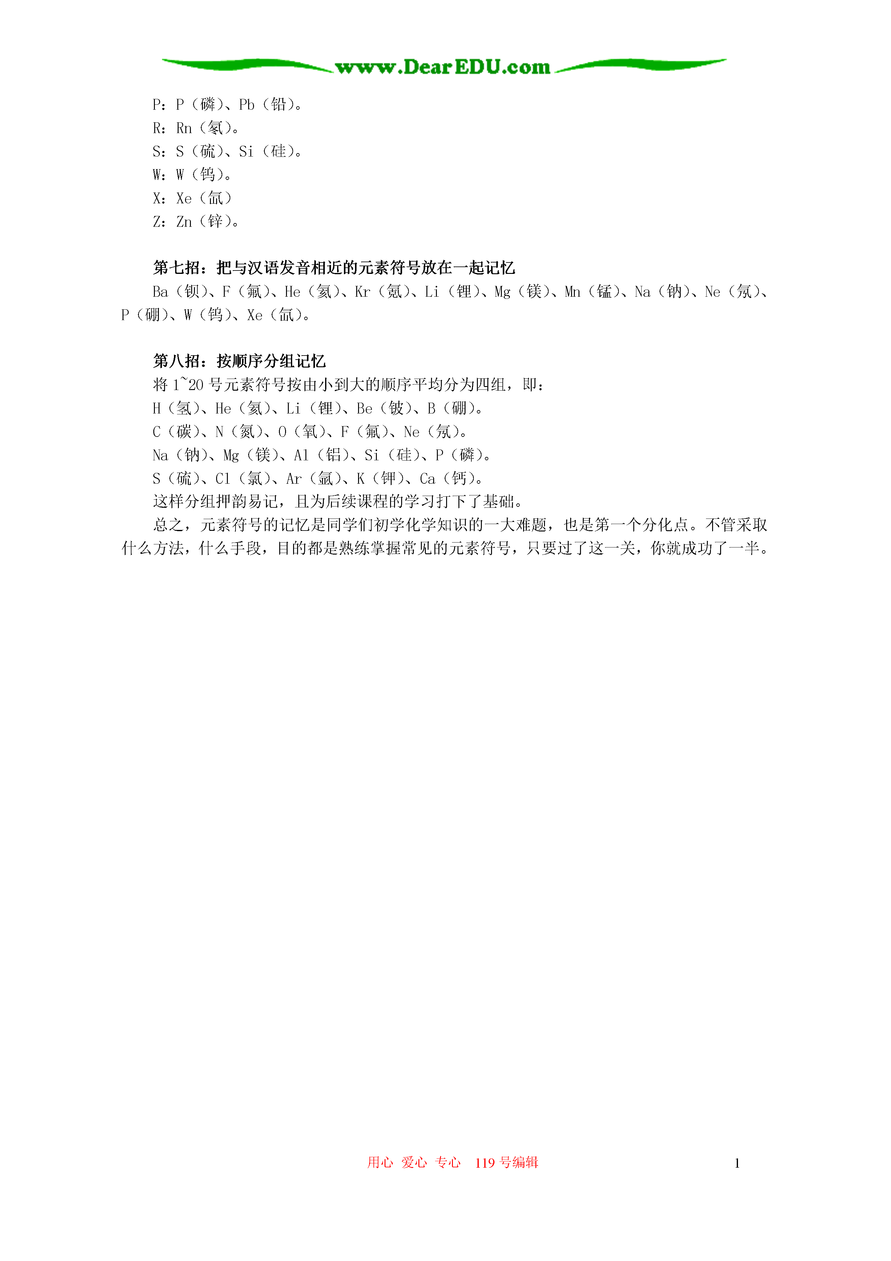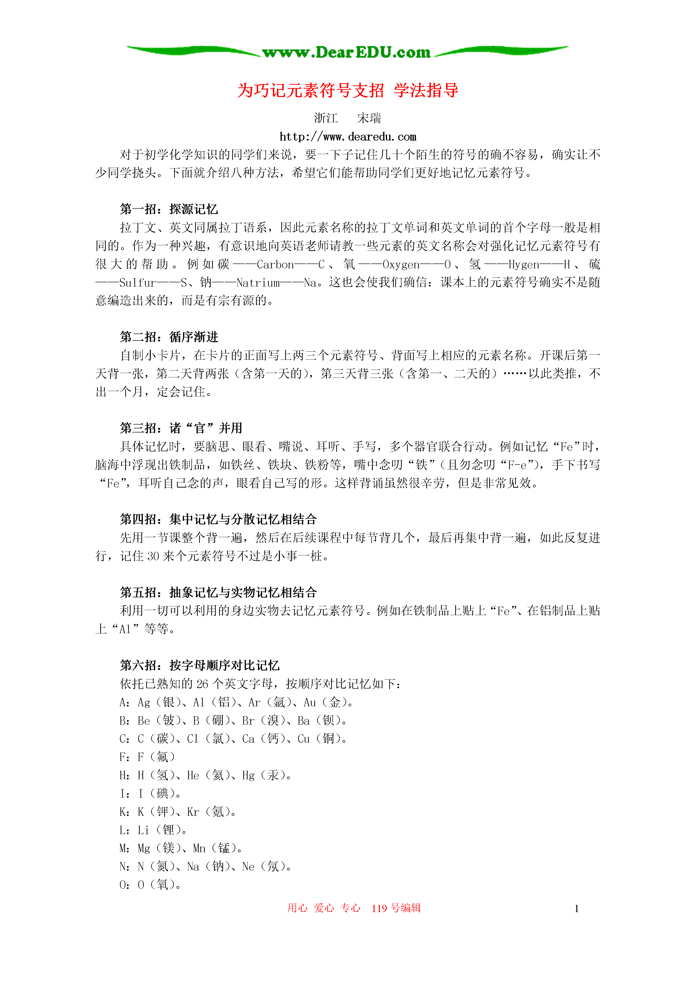 用心爱心专心119号编辑1为巧记元素符号支招学法指导浙江宋瑞http://www.dearedu.com对于初学化学知识的同学们来说,要一下子记住几十个陌生的符号的确不容易,确实让不少同学挠头。下面就介绍八种方法,希望它们能帮助同学们更好地记忆元素符号。第一招:探源记忆拉丁文、英文同属拉丁语系,因此元素名称的拉丁文单词和英文单词的首个字母一般是相同的。作为一种兴趣,有意识地向英语老师请教一些元素的英文名称会对强化记忆元素符号有很大的帮助。例如碳——Carbon——C、氧——Oxygen——O、氢——Hygen——H、硫——Sulfur——S、钠——Natrium——Na。这也会使我们确信:课本上的元素符号确实不是随意编造出来的,而是有宗有源的。第二招:循序渐进自制小卡片,在卡片的正面写上两三个元素符号、背面写上相应的元素名称。开课后第一天背一张,第二天背两张(含第一天的),第三天背三张(含第一、二天的)……以此类推,不出一个月,定会记住。第三招:诸“官”并用具体记忆时,要脑思、眼看、嘴说、耳听、手写,多个器官联合行动。例如记忆“Fe”时,脑海中浮现出铁制品,如铁丝、铁块、铁粉等,嘴中念叨“铁”(且勿念叨“F-e”),手下书写“Fe”,耳听自己念的声,眼看自己写的形。这样背诵虽然很辛劳,但是非常见效。第四招:集中记忆与分散记忆相结合先用一节课整个背一遍,然后在后续课程中每节背几个,最后再集中背一遍,如此反复进行,记住30来个元素符号不过是小事一桩。第五招:抽象记忆与实物记忆相结合利用一切可以利用的身边实物去记忆元素符号。例如在铁制品上贴上“Fe”、在铝制品上贴上“Al”等等。第六招:按字母顺序对比记忆依托已熟知的26个英文字母,按顺序对比记忆如下:A:Ag(银)、Al(铝)、Ar(氩)、Au(金)。B:Be(铍)、B(硼)、Br(溴)、Ba(钡)。C:C(碳)、Cl(氯)、Ca(钙)、Cu(铜)。F:F(氟)H:H(氢)、He(氦)、Hg(汞)。I:I(碘)。K:K(钾)、Kr(氪)。L:Li(锂)。M:Mg(镁)、Mn(锰)。N:N(氮)、Na(钠)、Ne(氖)。O:O(氧)。P:P(磷)、Pb(铅)。R:Rn(氡)。S:S(硫)、Si(硅)。W:W(钨)。X:Xe(氙)Z:Zn(锌)。第七招:把与汉语发音相近的元素符号放在一起记忆Ba(钡)、F(氟)、He(氦)、Kr(氪)、Li(锂)、Mg(镁)、Mn(锰)、Na(钠)、Ne(氖)、P(硼)、W(钨)、Xe(氙)。第八招:按顺序分组记忆将1~20号元素符号按由小到大的顺序平均分为四组,即:H(氢)、He(氦)、Li(锂)、Be(铍)、B(硼)。C(碳)、N(氮)、O(氧)、F(氟)、Ne(氖)。Na(钠)、Mg(镁)、Al(铝)、Si(硅)、P(磷)。S(硫)、Cl(氯)、Ar(氩)、K(钾)、Ca(钙)。这样分组押韵易记,且为后续课程的学习打下了基础。总之,元素符号的记忆是同学们初学化学知识的一大难题,也是第一个分化点。不管采取什么方法,什么手段,目的都是熟练掌握常见的元素符号,只要过了这一关,你就成功了一半。
