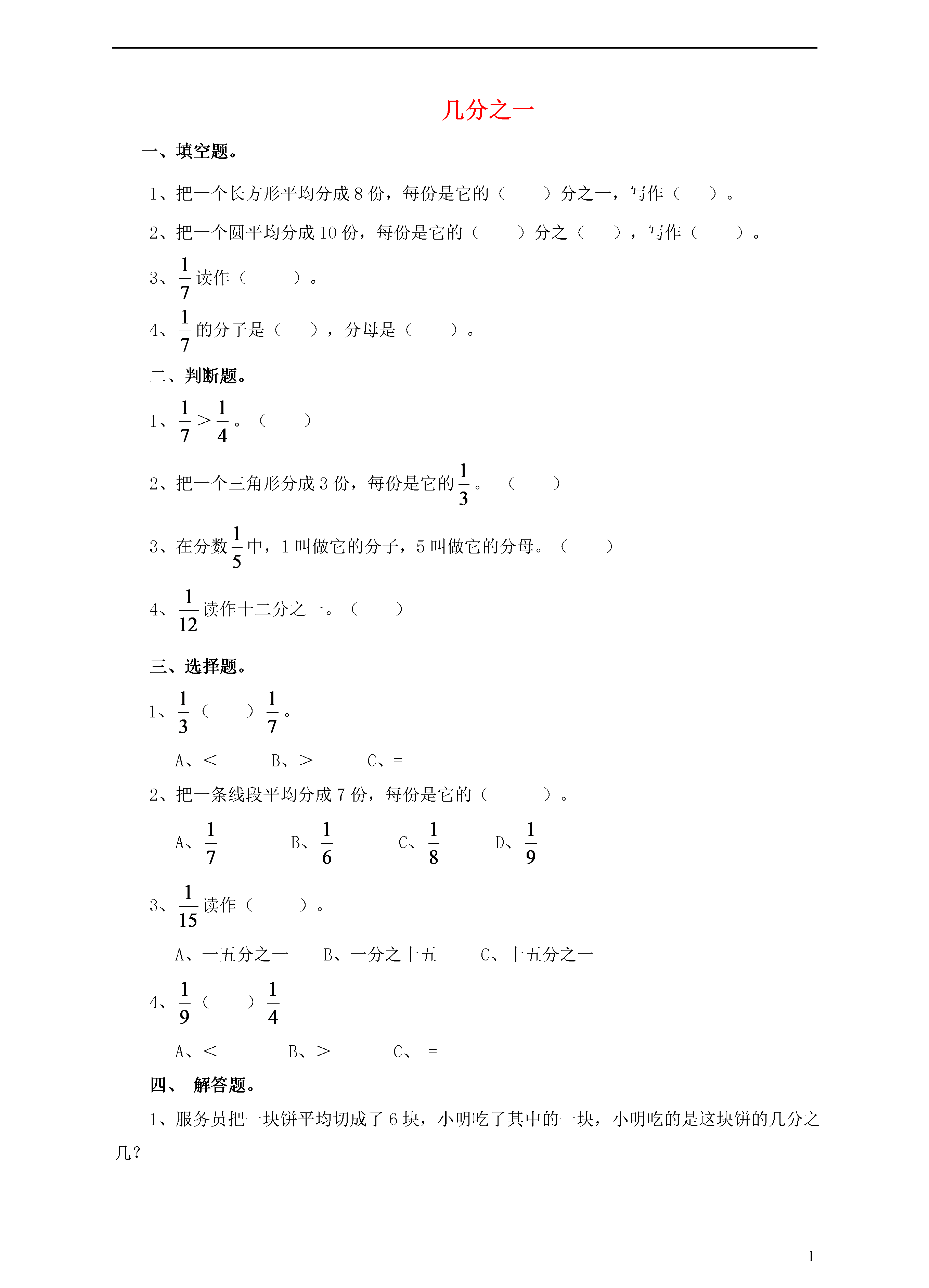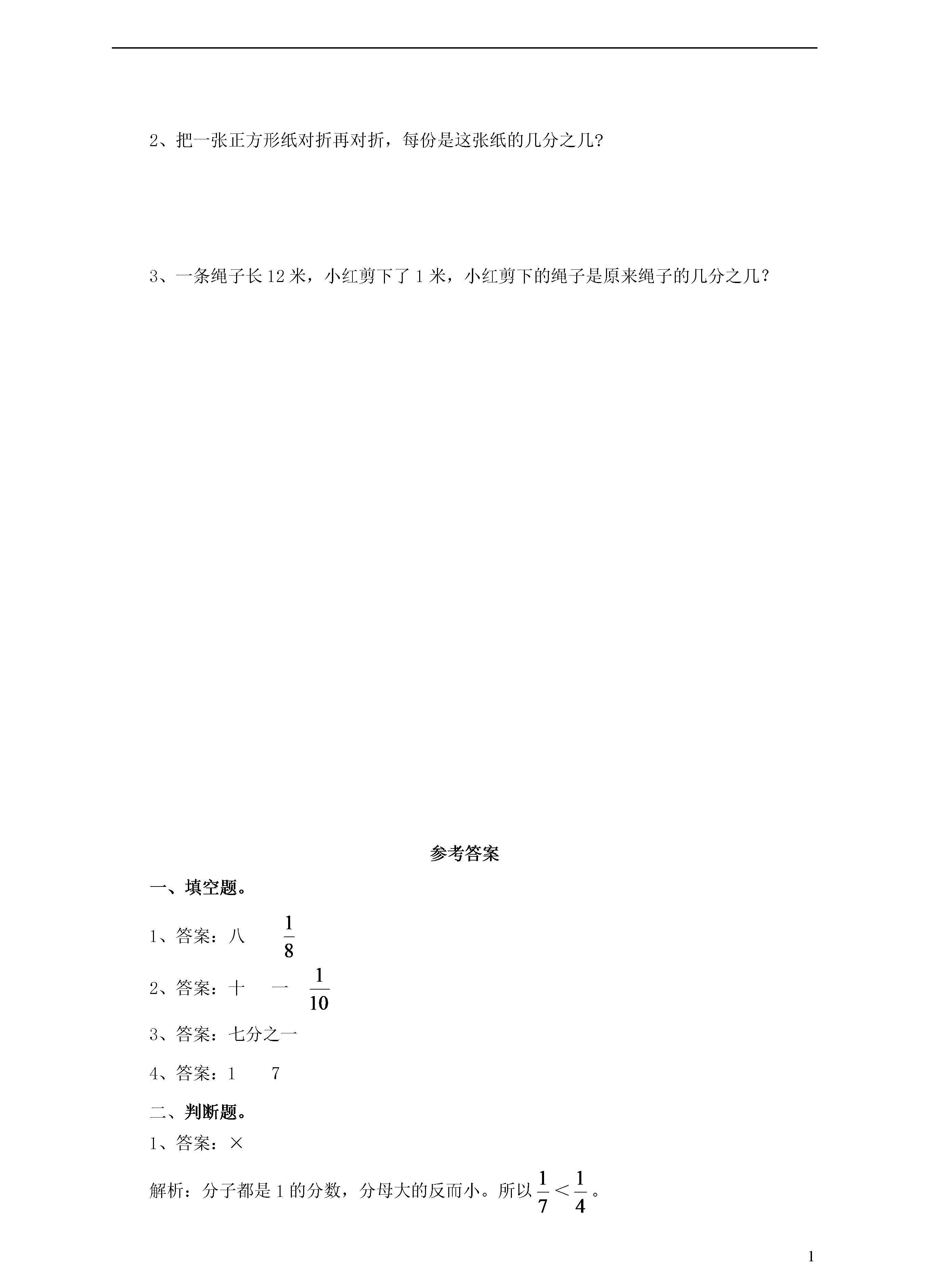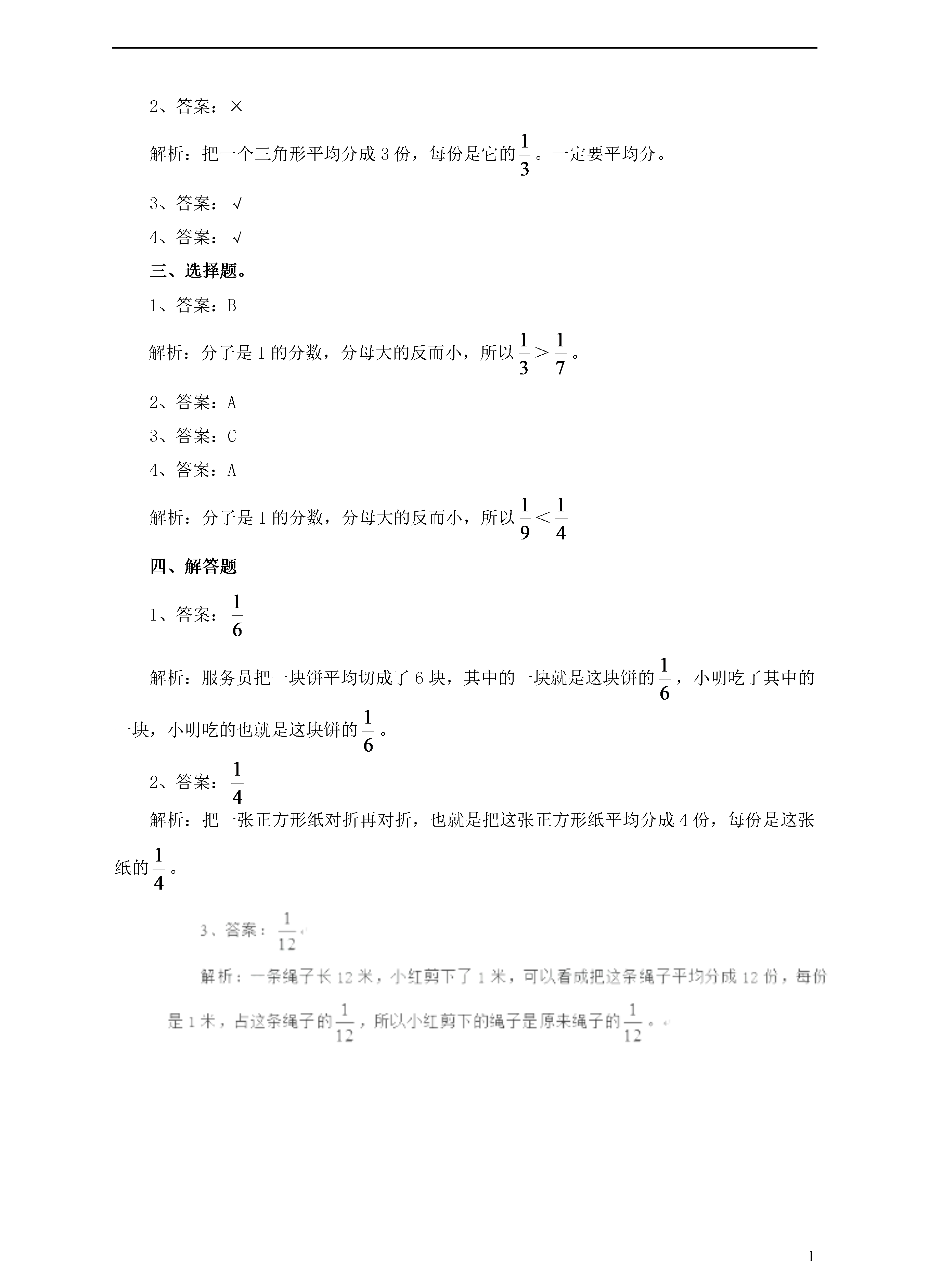 1几分之一一、填空题。1、把一个长方形平均分成8份,每份是它的()分之一,写作()。2、把一个圆平均分成10份,每份是它的()分之(),写作()。3、读作()。4、的分子是(),分母是()。二、判断题。1、>。()2、把一个三角形分成3份,每份是它的。()3、在分数中,1叫做它的分子,5叫做它的分母。()4、读作十二分之一。()三、选择题。1、()。A、<B、>C、=2、把一条线段平均分成7份,每份是它的()。A、B、C、D、3、读作()。A、一五分之一B、一分之十五C、十五分之一4、()A、<B、>C、=解答题。1、服务员把一块饼平均切成了6块,小明吃了其中的一块,小明吃的是这块饼的几分之几?2、把一张正方形纸对折再对折,每份是这张纸的几分之几?3、一条绳子长12米,小红剪下了1米,小红剪下的绳子是原来绳子的几分之几?参考答案一、填空题。1、答案:八2、答案:十一3、答案:七分之一4、答案:17二、判断题。1、答案:×解析:分子都是1的分数,分母大的反而小。所以<。2、答案:×解析:把一个三角形平均分成3份,每份是它的。一定要平均分。3、答案:√4、答案:√三、选择题。1、答案:B解析:分子是1的分数,分母大的反而小,所以>。答案:A答案:C4、答案:A解析:分子是1的分数,分母大的反而小,所以<四、解答题1、答案:解析:服务员把一块饼平均切成了6块,其中的一块就是这块饼的,小明吃了其中的一块,小明吃的也就是这块饼的。2、答案:解析:把一张正方形纸对折再对折,也就是把这张正方形纸平均分成4份,每份是这张纸的。
