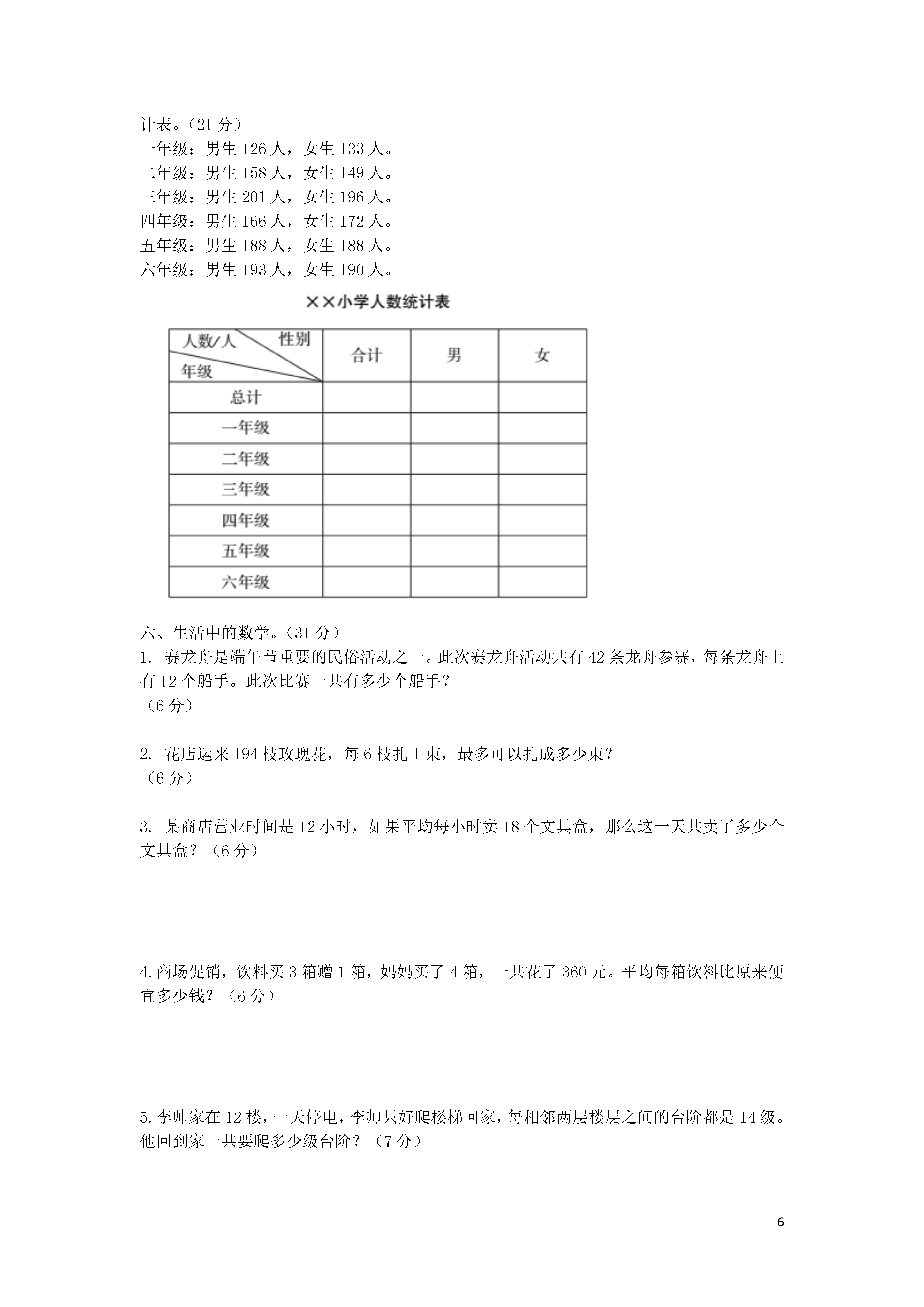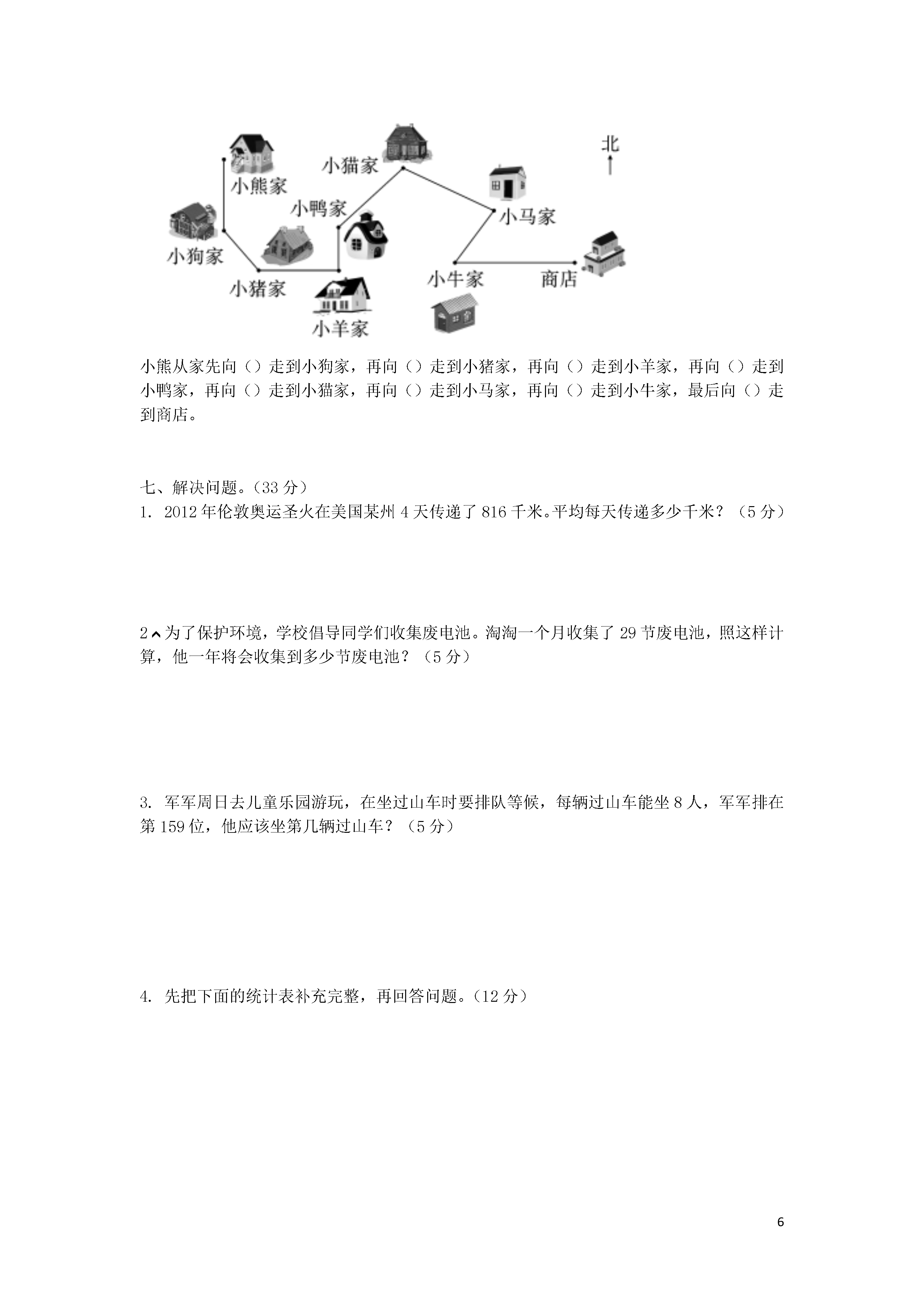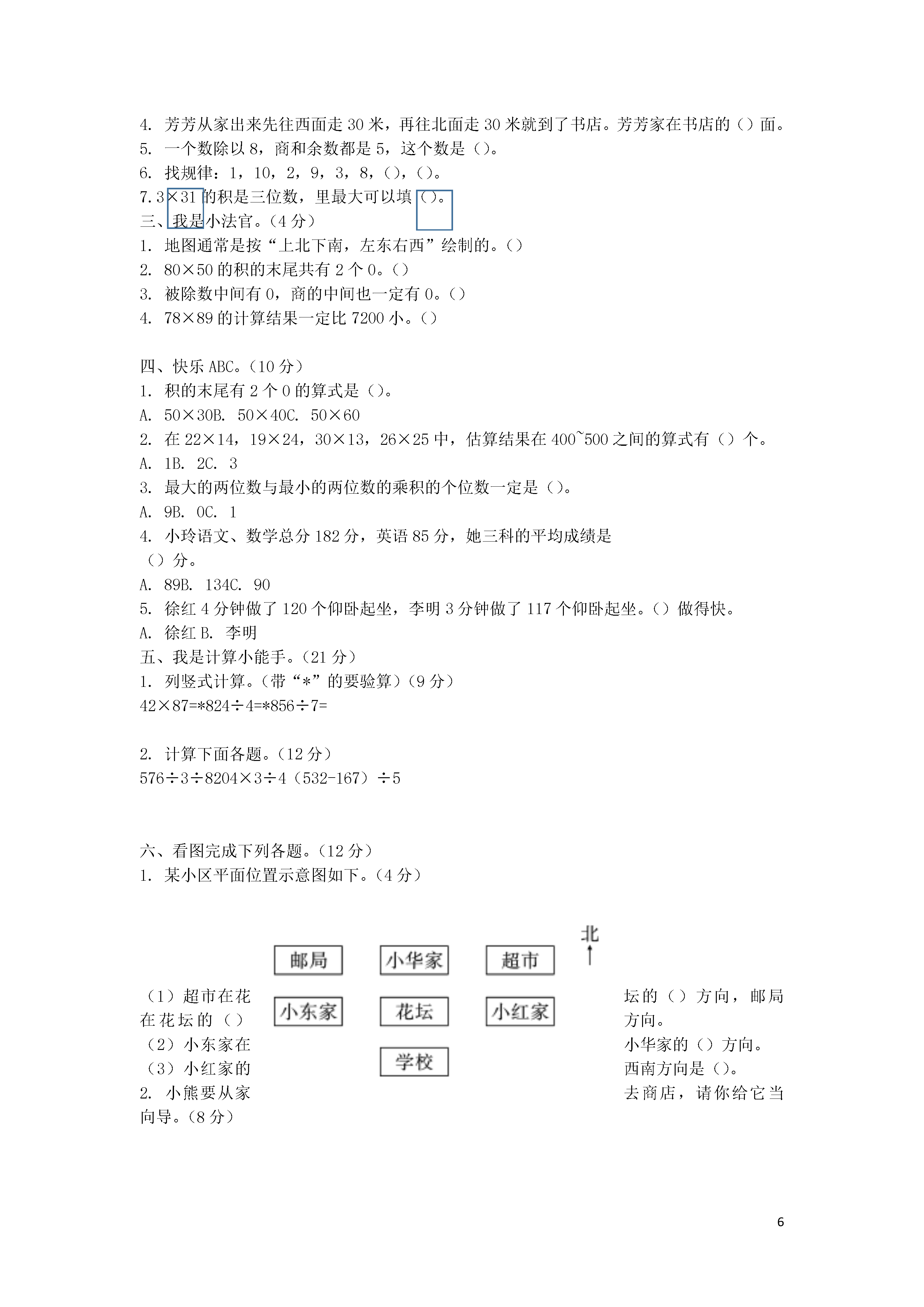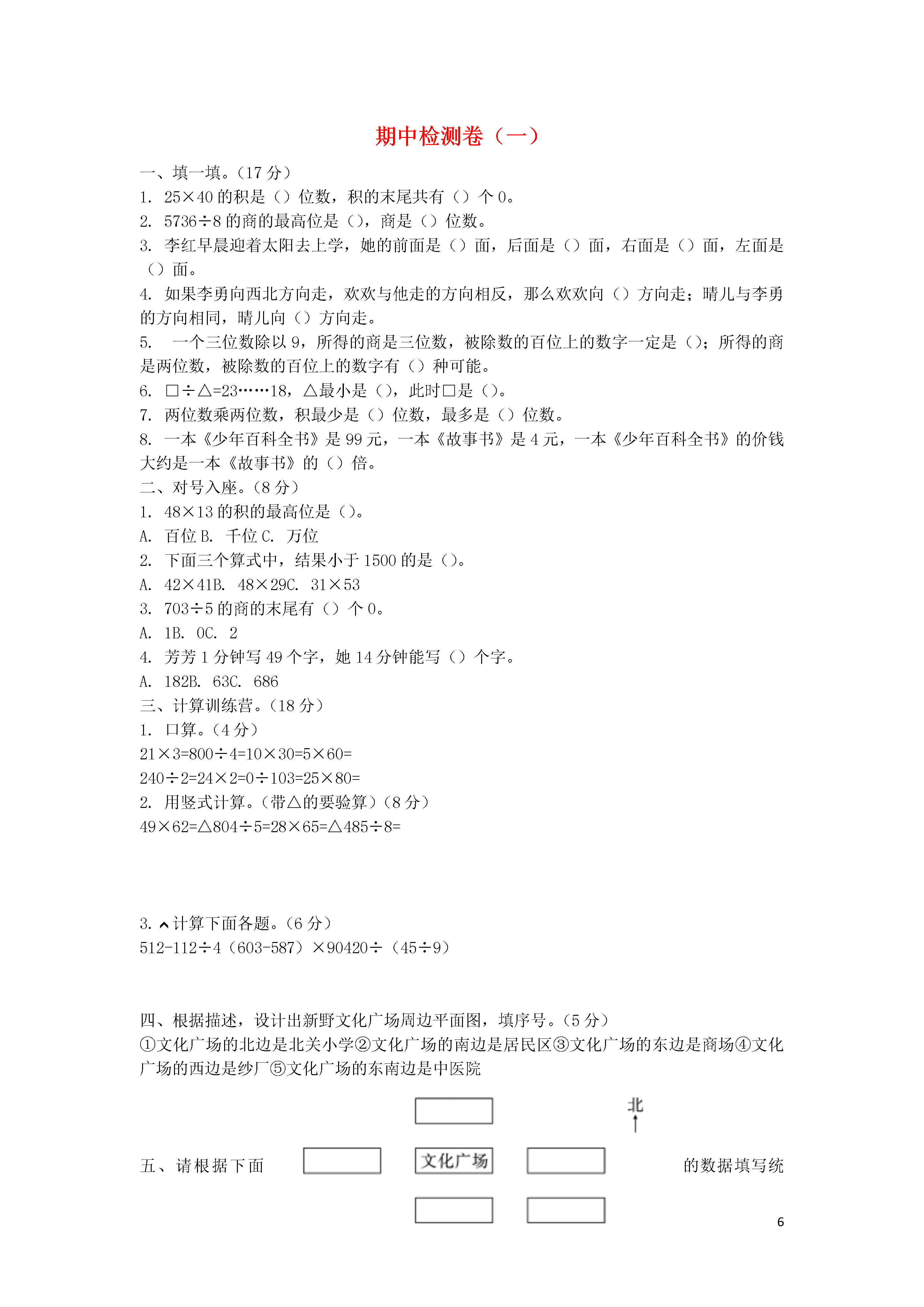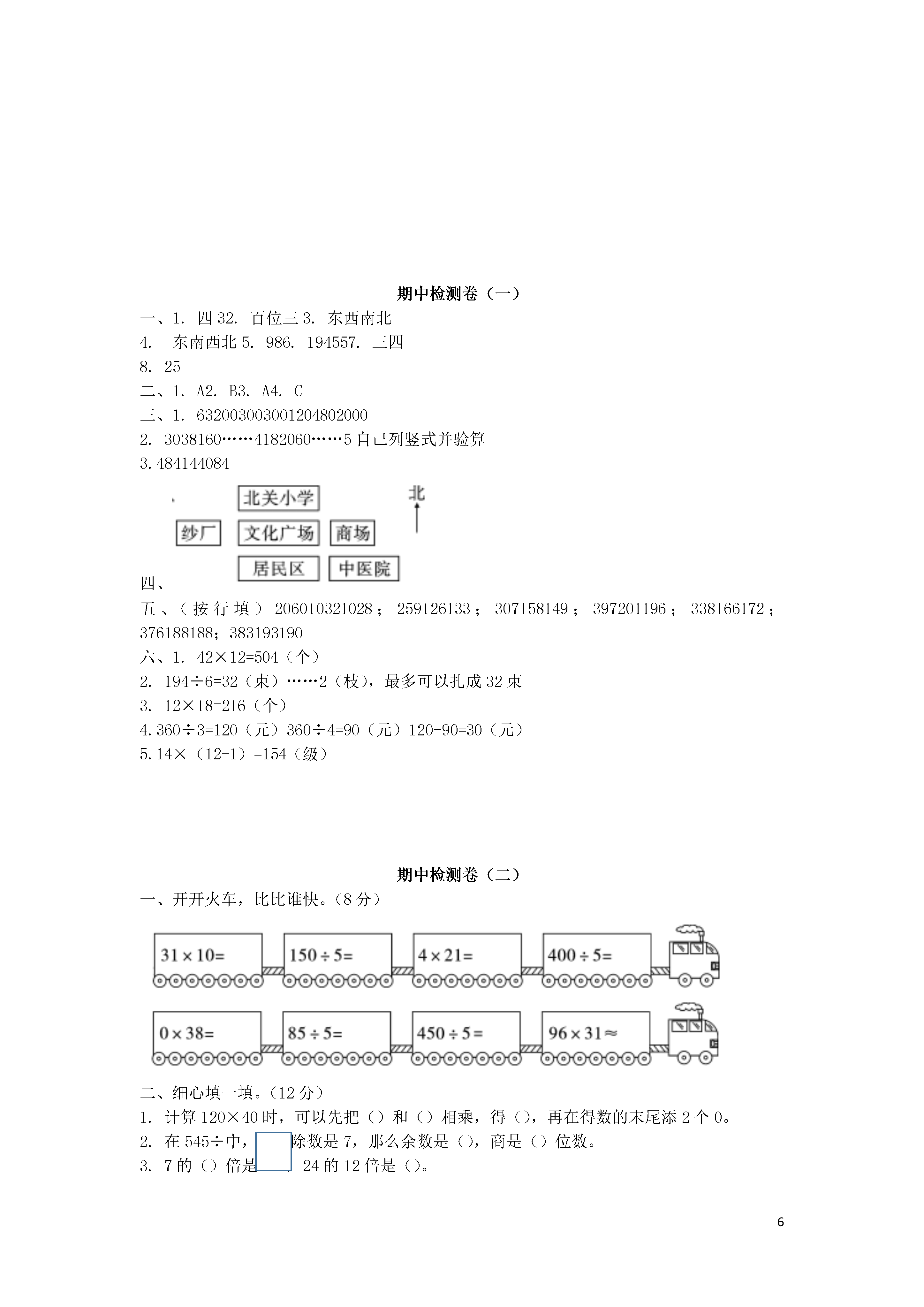 6期中检测卷(一)一、填一填。(17分)1.25×40的积是()位数,积的末尾共有()个0。2.5736÷8的商的最高位是(),商是()位数。3.李红早晨迎着太阳去上学,她的前面是()面,后面是()面,右面是()面,左面是()面。4.如果李勇向西北方向走,欢欢与他走的方向相反,那么欢欢向()方向走;晴儿与李勇的方向相同,晴儿向()方向走。5.一个三位数除以9,所得的商是三位数,被除数的百位上的数字一定是();所得的商是两位数,被除数的百位上的数字有()种可能。6.□÷△=23……18,△最小是(),此时□是()。7.两位数乘两位数,积最少是()位数,最多是()位数。8.一本《少年百科全书》是99元,一本《故事书》是4元,一本《少年百科全书》的价钱大约是一本《故事书》的()倍。二、对号入座。(8分)1.48×13的积的最高位是()。A.百位B.千位C.万位2.下面三个算式中,结果小于1500的是()。A.42×41B.48×29C.31×533.703÷5的商的末尾有()个0。A.1B.0C.24.芳芳1分钟写49个字,她14分钟能写()个字。A.182B.63C.686三、计算训练营。(18分)1.口算。(4分)21×3=800÷4=10×30=5×60=240÷2=24×2=0÷103=25×80=2.用竖式计算。(带△的要验算)(8分)49×62=△804÷5=28×65=△485÷8=3.计算下面各题。(6分)512-112÷4(603-587)×90420÷(45÷9)四、根据描述,设计出新野文化广场周边平面图,填序号。(5分)①文化广场的北边是北关小学②文化广场的南边是居民区③文化广场的东边是商场④文化广场的西边是纱厂⑤文化广场的东南边是中医院五、请根据下面的数据填写统计表。(21分)一年级:男生126人,女生133人。二年级:男生158人,女生149人。三年级:男生201人,女生196人。四年级:男生166人,女生172人。五年级:男生188人,女生188人。六年级:男生193人,女生190人。六、生活中的数学。(31分)1.赛龙舟是端午节重要的民俗活动之一。此次赛龙舟活动共有42条龙舟参赛,每条龙舟上有12个船手。此次比赛一共有多少个船手?(6分)花店运来194枝玫瑰花,每6枝扎1束,最多可以扎成多少束?(6分)3.某商店营业时间是12小时,如果平均每小时卖18个文具盒,那么这一天共卖了多少个文具盒?(6分)4.商场促销,饮料买3箱赠1箱,妈妈买了4箱,一共花了360元。平均每箱饮料比原来便宜多少钱?(6分)5.李帅家在12楼,一天停电,李帅只好爬楼梯回家,每相邻两层楼层之间的台阶都是14级。他回到家一共要爬多少级台阶?(7分)期中检测卷(一)一、1.四32.百位三3.东西南北4.东南西北5.986.194557.三四8.25二、1.A2.B3.A4.C三、1.6320030030012048020003038160……4182060……5自己列竖式并验算3.484144084四、五、(按行填)206010321028;259126133;307158149;397201196;338166172;376188188;383193190六、1.42×12=504(个)2.194÷6=32(束)……2(枝),最多可以扎成32束3.12×18=216(个)4.360÷3=120(元)360÷4=90(元)120-90=30(元)5.14×(12-1)=154(级)期中检测卷(二)一、开开火车,比比谁快。(8分)二、细心填一填。(12分)1.计算120×40时,可以先把()和()相乘,得(),再在得数的末尾添2个0。2.在545÷中,如果除数是7,那么余数是(),商是()位数。3.7的()倍是126,24的12倍是()。4.芳芳从家出来先往西面走30米,再往北面走30米就到了书店。芳芳家在书店的()面。5.一个数除以8,商和余数都是5,这个数是()。6.找规律:1,10,2,9,3,8,(),()。7.3×31的积是三位数,里最大可以填()。三、我是小法官。(4分)1.地图通常是按“上北下南,左东右西”绘制的。()2.80×50的积的末尾共有2个0。()3.被除数中间有0,商的中间也一定有0。()4.78×89的计算结果一定比7200小。()四、快乐ABC。(10分)1.积的末尾有2个0的算式是()。A.50×30B.50×40C.50×602.在22×14,19×24,30×13,26×25